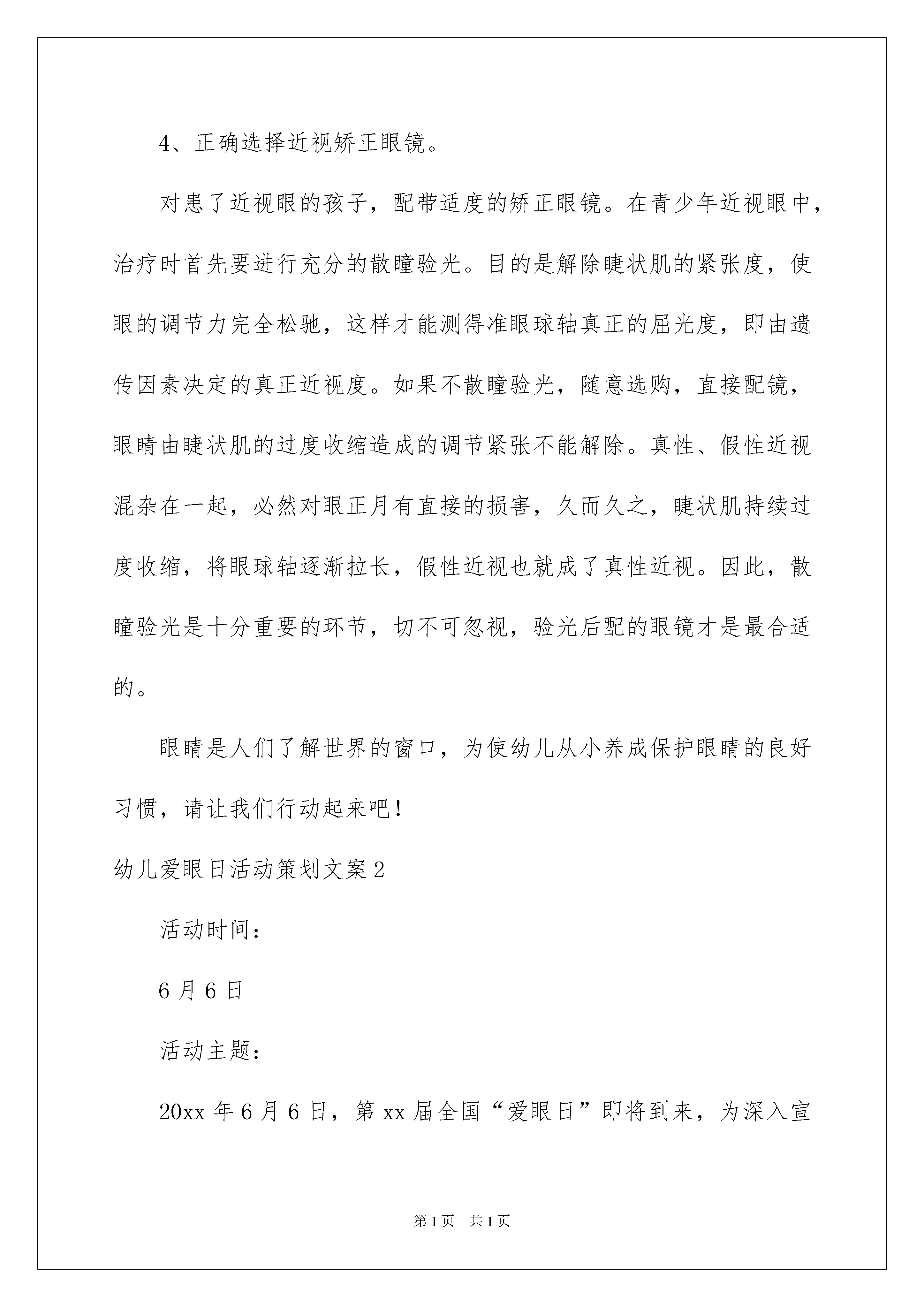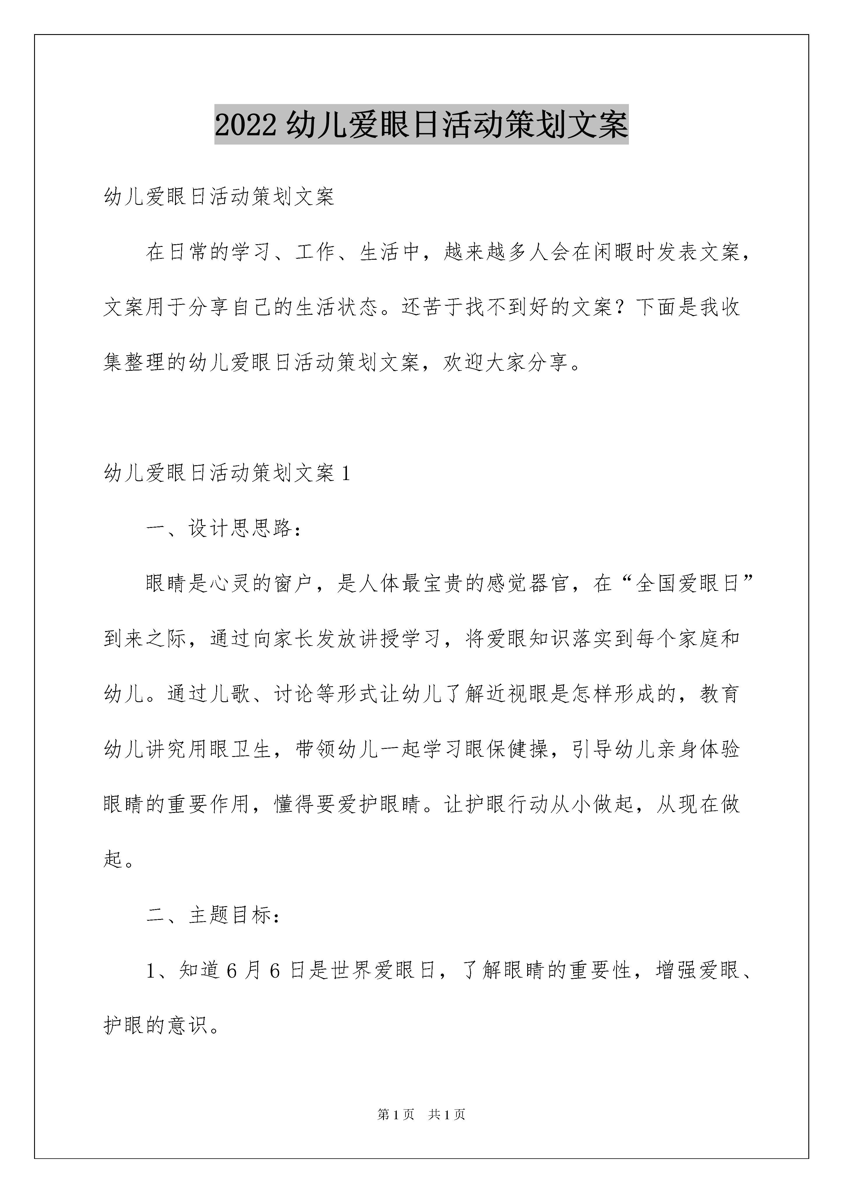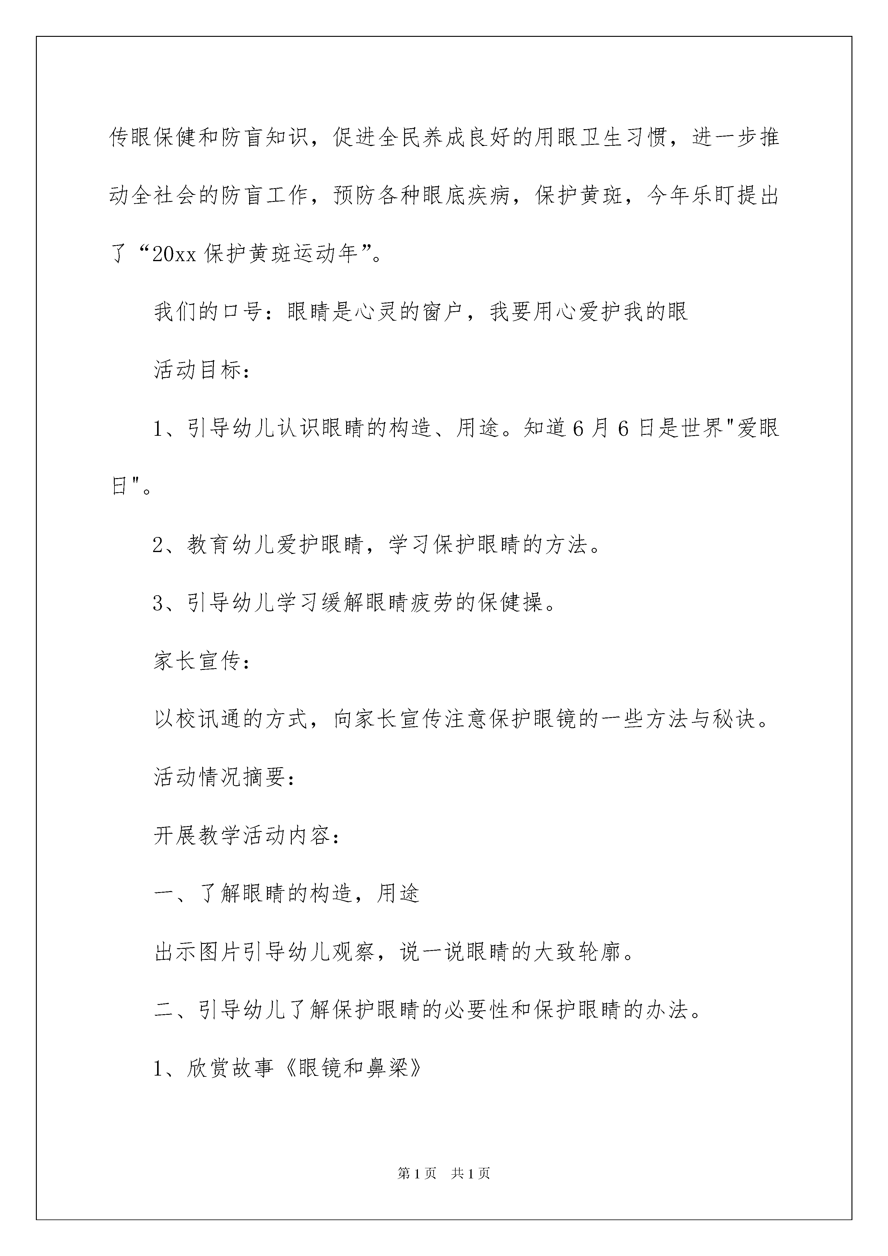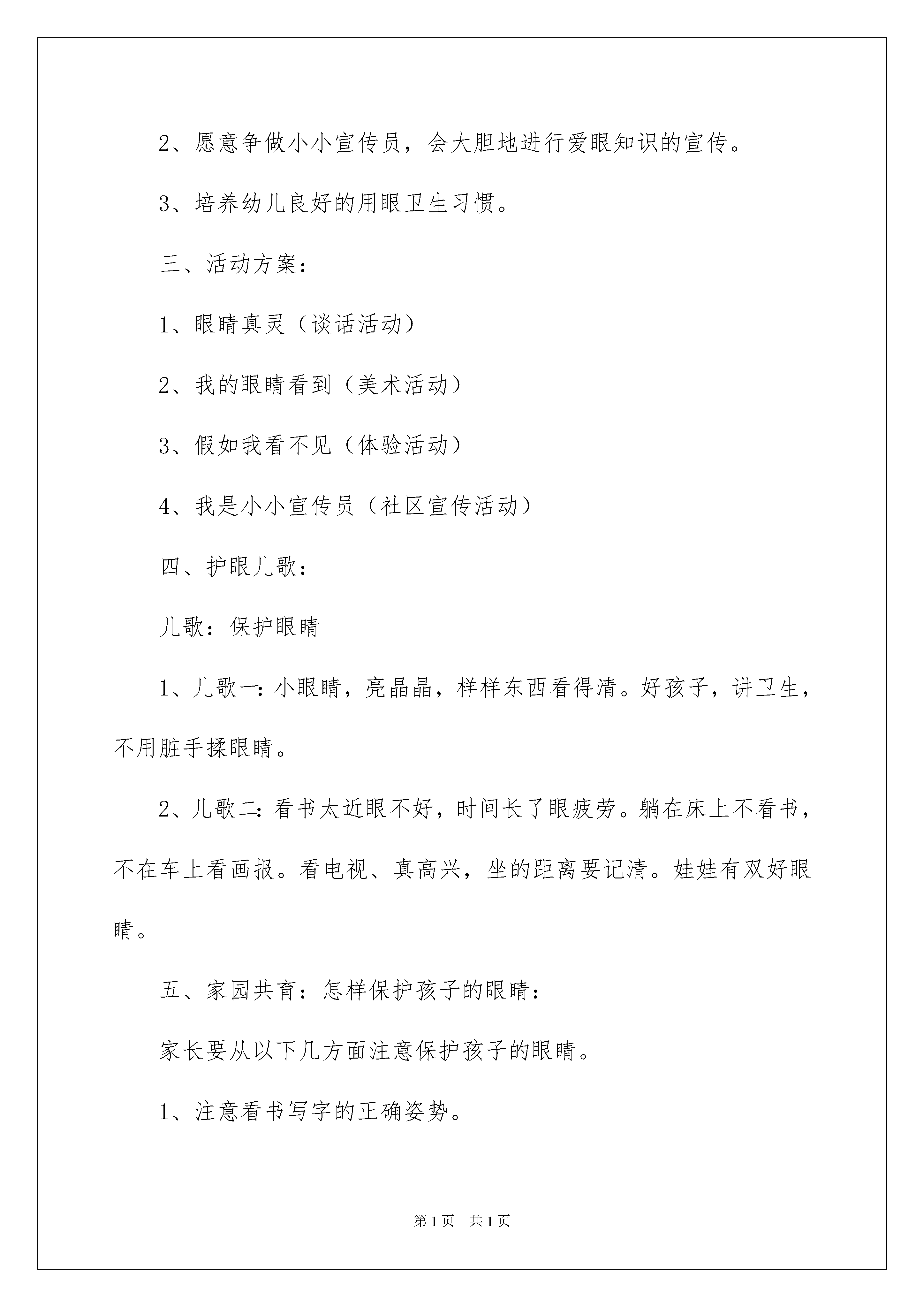 2022幼儿爱眼日活动策划文案幼儿爱眼日活动策划文案在日常的学习、工作、生活中,越来越多人会在闲暇时发表文案,文案用于分享自己的生活状态。还苦于找不到好的文案?下面是我收集整理的幼儿爱眼日活动策划文案,欢迎大家分享。幼儿爱眼日活动策划文案1一、设计思思路:眼睛是心灵的窗户,是人体最宝贵的感觉器官,在“全国爱眼日”到来之际,通过向家长发放讲授学习,将爱眼知识落实到每个家庭和幼儿。通过儿歌、讨论等形式让幼儿了解近视眼是怎样形成的,教育幼儿讲究用眼卫生,带领幼儿一起学习眼保健操,引导幼儿亲身体验眼睛的重要作用,懂得要爱护眼睛。让护眼行动从小做起,从现在做起。二、主题目标:1、知道6月6日是世界爱眼日,了解眼睛的重要性,增强爱眼、护眼的意识。2、愿意争做小小宣传员,会大胆地进行爱眼知识的宣传。3、培养幼儿良好的用眼卫生习惯。三、活动方案:1、眼睛真灵(谈话活动)2、我的眼睛看到(美术活动)3、假如我看不见(体验活动)4、我是小小宣传员(社区宣传活动)四、护眼儿歌:儿歌:保护眼睛1、儿歌一:小眼睛,亮晶晶,样样东西看得清。好孩子,讲卫生,不用脏手揉眼睛。2、儿歌二:看书太近眼不好,时间长了眼疲劳。躺在床上不看书,不在车上看画报。看电视、真高兴,坐的距离要记清。娃娃有双好眼睛。五、家园共育:怎样保护孩子的眼睛:家长要从以下几方面注意保护孩子的眼睛。1、注意看书写字的正确姿势。孩子看书写字姿势很重要,尤其是刚刚上学的孩子,必须养成一个好的习惯。身体坐直,书或要写的笔记本离开孩子眼睛的距离是33厘米,不能太近或趴在桌子上看书、写字。否则时间长了容易造成驼背,还会影响视力。2、收看电视要注意保持一定的距离。收看电视节目,是调剂神经、消除疲劳、增进知识、欣赏艺术的一种正当的娱乐活动。如果看得时间过长,电视距离不适当,也会影响孩子的视力。特别是玩电子游戏机比看电视更能损害孩子的眼睛,家长必须提高警惕。看电视若想不损坏视力,人与电视机的距离保持在电视屏幕尺寸的6~8倍,并以看不清屏幕上横向细线条为好。同时还要注意孩子的坐位,使眼睛与屏幕尽量保持在水平位置,并让孩子坐在中间。电视机的亮度、对比度应调节适宜,使图像清晰、柔和,而不能开得过亮或过暗。室内开一个3瓦左右的小电灯,可防止眼睛疲劳。3、注意照明条件。孩子看书或写字时,要注意室内的照明条件让光线从左边射来,光线不要太强、太弱,防止刺眼,台灯效果比较好。4、正确选择近视矫正眼镜。对患了近视眼的孩子,配带适度的矫正眼镜。在青少年近视眼中,治疗时首先要进行充分的散瞳验光。目的是解除睫状肌的紧张度,使眼的调节力完全松驰,这样才能测得准眼球轴真正的屈光度,即由遗传因素决定的真正近视度。如果不散瞳验光,随意选购,直接配镜,眼睛由睫状肌的过度收缩造成的调节紧张不能解除。真性、假性近视混杂在一起,必然对眼正月有直接的损害,久而久之,睫状肌持续过度收缩,将眼球轴逐渐拉长,假性近视也就成了真性近视。因此,散瞳验光是十分重要的环节,切不可忽视,验光后配的眼镜才是最合适的。眼睛是人们了解世界的窗口,为使幼儿从小养成保护眼睛的良好习惯,请让我们行动起来吧!幼儿爱眼日活动策划文案2活动时间:6月6日活动主题:20xx年6月6日,第xx届全国“爱眼日”即将到来,为深入宣传眼保健和防盲知识,促进全民养成良好的用眼卫生习惯,进一步推动全社会的防盲工作,预防各种眼底疾病,保护黄斑,今年乐盯提出了“20xx保护黄斑运动年”。我们的口号:眼睛是心灵的窗户,我要用心爱护我的眼活动目标:1、引导幼儿认识眼睛的构造、用途。知道6月6日是世界"爱眼日"。2、教育幼儿爱护眼睛,学习保护眼睛的方法。3、引导幼儿学习缓解眼睛疲劳的保健操。家长宣传:以校讯通的方式,向家长宣传注意保护眼镜的一些方法与秘诀。活动情况摘要:开展教学活动内容:一、了解眼睛的构造,用途出示图片引导幼儿观察,说一说眼睛的大致轮廓。二、引导幼儿了解保护眼睛的必要性和保护眼睛的办法。1、欣赏故事《眼镜和鼻梁》2、回答相关问题,让幼儿懂得道理:小朋友的脏手上有很多的细菌,如果用脏手揉眼睛会让眼睛生红眼病,我们如果感到眼睛不舒服可以用干净的毛巾、手绢或者卫生纸擦。三、引导幼儿做简单的锻炼眼睛的保健操。幼儿爱眼日活动策划文案3一、活动背景眼睛是我们心灵的窗口,是我们的通向美丽新世界的桥梁,是获得光明的器官,所以我们应该珍爱自己的眼睛,在全国第十六个全国“爱眼日”到来之际邢台市十中团委以“爱护眼睛,珍爱光明”为主题开展有关保护我们眼睛的宣传活动。二、活动目标及主题20xx年6月6日是第xx个全国“爱眼日”,今年“爱眼日”活动的目标确定为