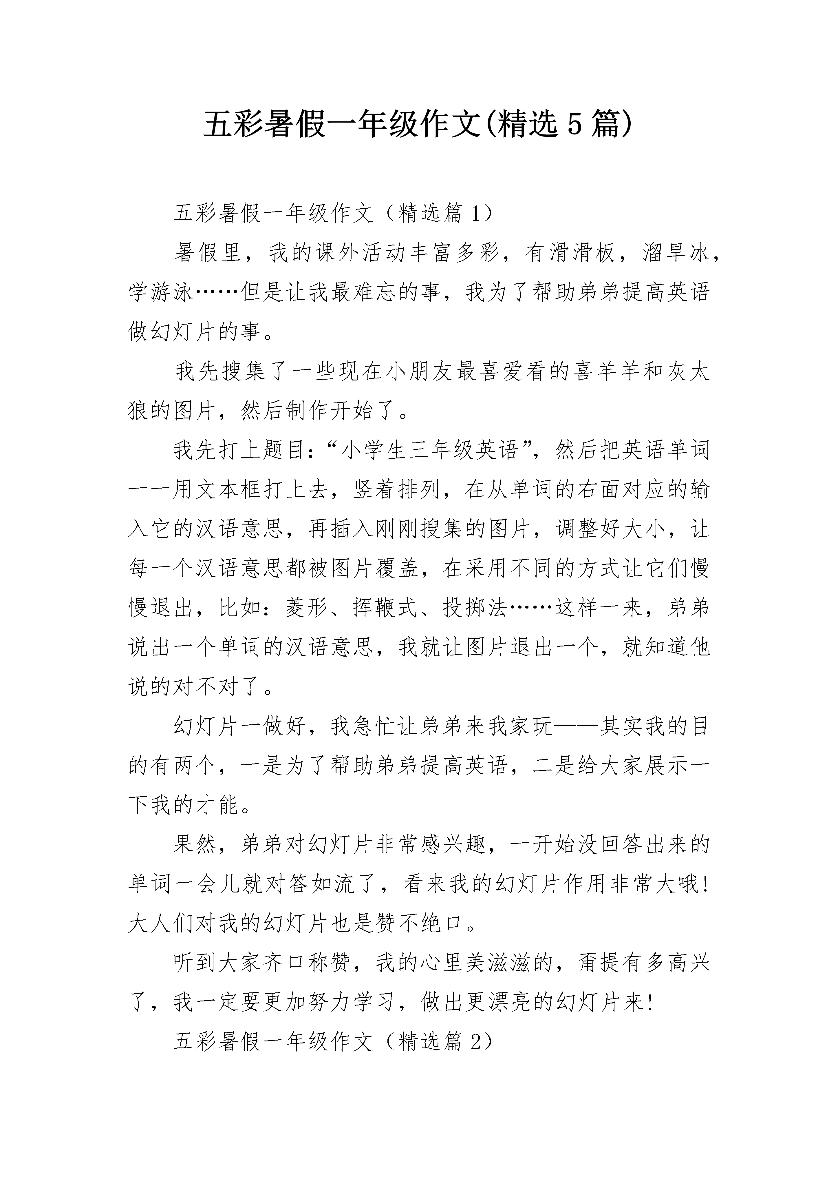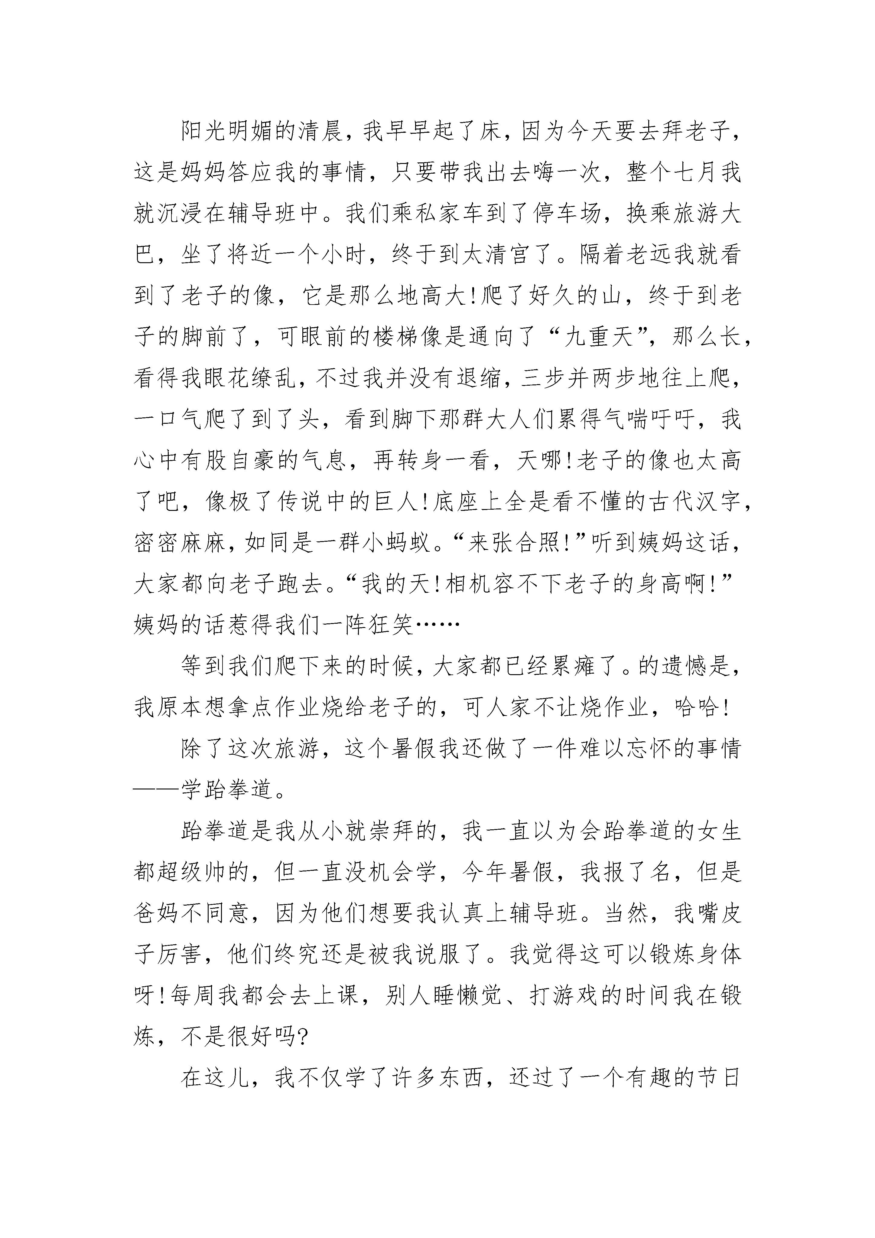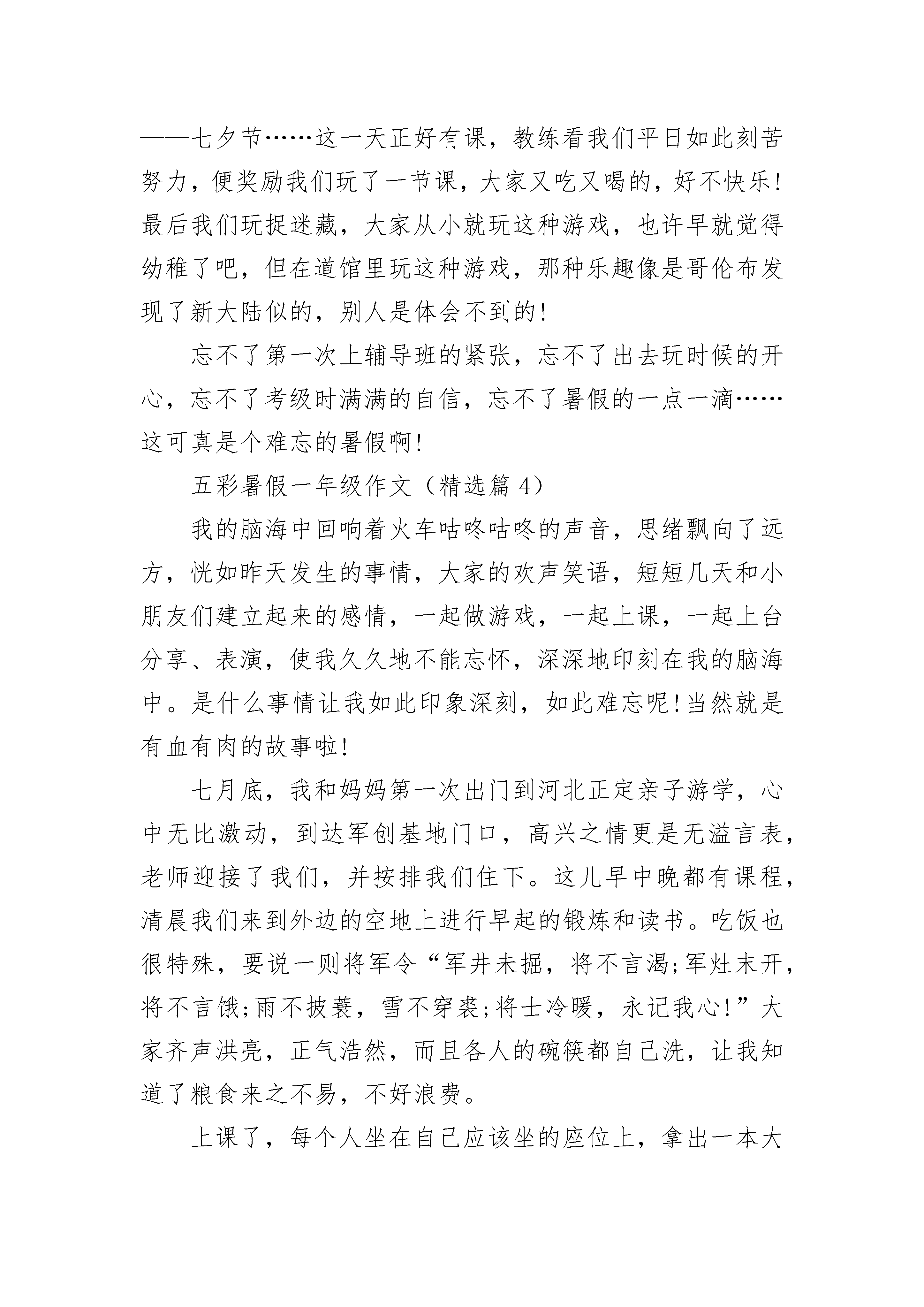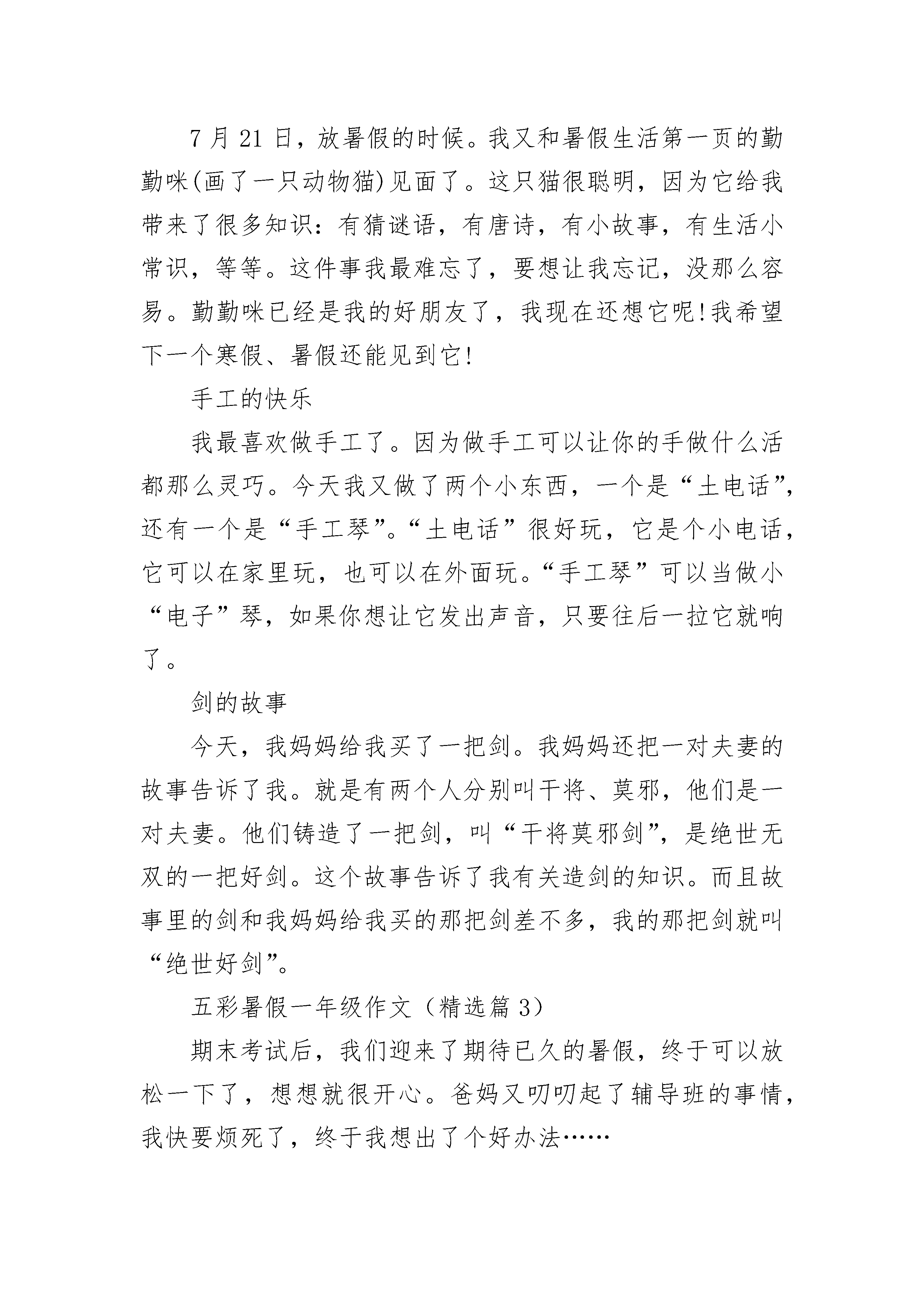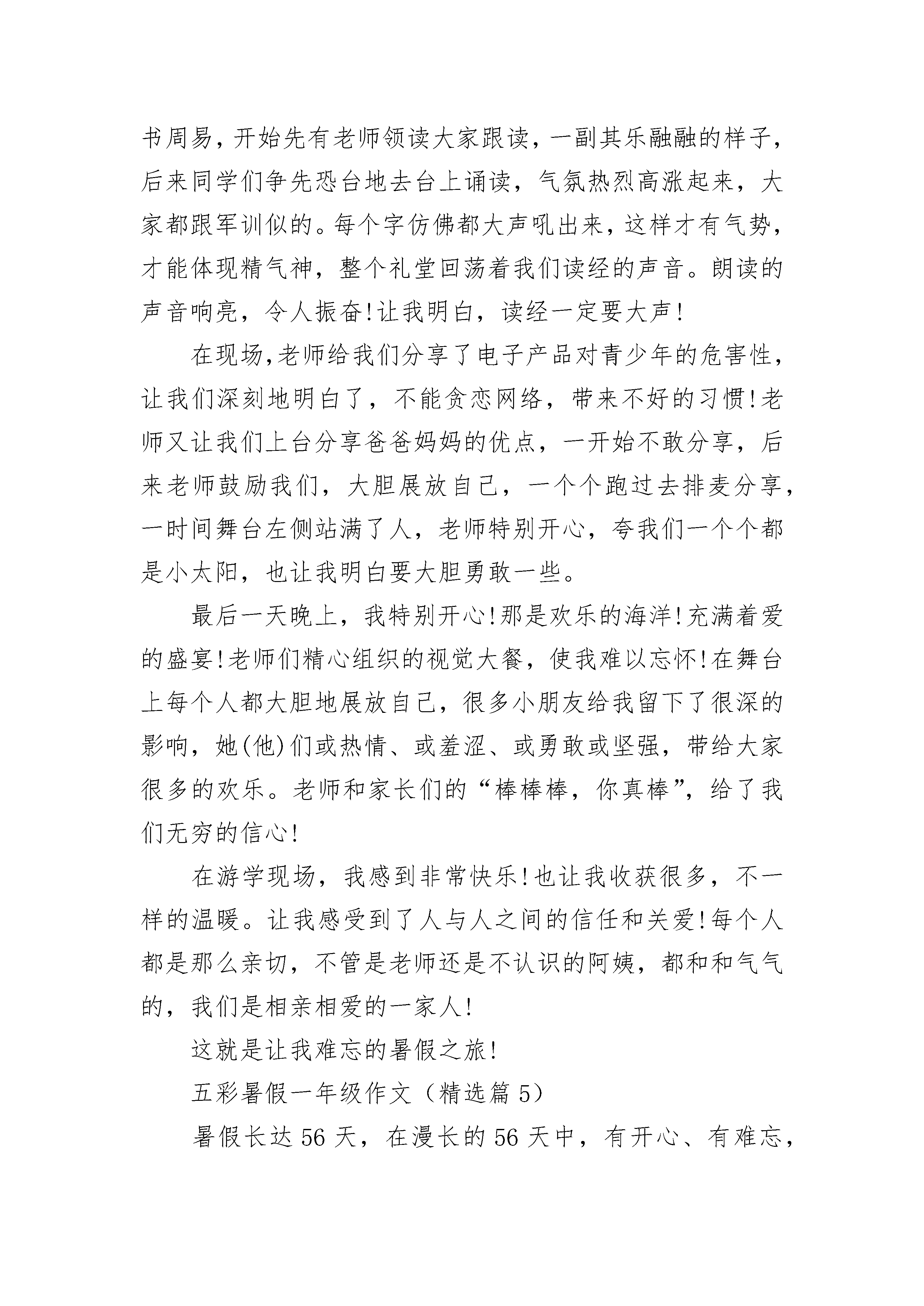 五彩暑假一年级作文(精选5篇)五彩暑假一年级作文(精选篇1)暑假里,我的课外活动丰富多彩,有滑滑板,溜旱冰,学游泳……但是让我最难忘的事,我为了帮助弟弟提高英语做幻灯片的事。我先搜集了一些现在小朋友最喜爱看的喜羊羊和灰太狼的图片,然后制作开始了。我先打上题目:“小学生三年级英语”,然后把英语单词一一用文本框打上去,竖着排列,在从单词的右面对应的输入它的汉语意思,再插入刚刚搜集的图片,调整好大小,让每一个汉语意思都被图片覆盖,在采用不同的方式让它们慢慢退出,比如:菱形、挥鞭式、投掷法……这样一来,弟弟说出一个单词的汉语意思,我就让图片退出一个,就知道他说的对不对了。幻灯片一做好,我急忙让弟弟来我家玩——其实我的目的有两个,一是为了帮助弟弟提高英语,二是给大家展示一下我的才能。果然,弟弟对幻灯片非常感兴趣,一开始没回答出来的单词一会儿就对答如流了,看来我的幻灯片作用非常大哦!大人们对我的幻灯片也是赞不绝口。听到大家齐口称赞,我的心里美滋滋的,甭提有多高兴了,我一定要更加努力学习,做出更漂亮的幻灯片来!五彩暑假一年级作文(精选篇2)7月21日,放暑假的时候。我又和暑假生活第一页的勤勤咪(画了一只动物猫)见面了。这只猫很聪明,因为它给我带来了很多知识:有猜谜语,有唐诗,有小故事,有生活小常识,等等。这件事我最难忘了,要想让我忘记,没那么容易。勤勤咪已经是我的好朋友了,我现在还想它呢!我希望下一个寒假、暑假还能见到它!手工的快乐我最喜欢做手工了。因为做手工可以让你的手做什么活都那么灵巧。今天我又做了两个小东西,一个是“土电话”,还有一个是“手工琴”。“土电话”很好玩,它是个小电话,它可以在家里玩,也可以在外面玩。“手工琴”可以当做小“电子”琴,如果你想让它发出声音,只要往后一拉它就响了。剑的故事今天,我妈妈给我买了一把剑。我妈妈还把一对夫妻的故事告诉了我。就是有两个人分别叫干将、莫邪,他们是一对夫妻。他们铸造了一把剑,叫“干将莫邪剑”,是绝世无双的一把好剑。这个故事告诉了我有关造剑的知识。而且故事里的剑和我妈妈给我买的那把剑差不多,我的那把剑就叫“绝世好剑”。五彩暑假一年级作文(精选篇3)期末考试后,我们迎来了期待已久的暑假,终于可以放松一下了,想想就很开心。爸妈又叨叨起了辅导班的事情,我快要烦死了,终于我想出了个好办法……阳光明媚的清晨,我早早起了床,因为今天要去拜老子,这是妈妈答应我的事情,只要带我出去嗨一次,整个七月我就沉浸在辅导班中。我们乘私家车到了停车场,换乘旅游大巴,坐了将近一个小时,终于到太清宫了。隔着老远我就看到了老子的像,它是那么地高大!爬了好久的山,终于到老子的脚前了,可眼前的楼梯像是通向了“九重天”,那么长,看得我眼花缭乱,不过我并没有退缩,三步并两步地往上爬,一口气爬了到了头,看到脚下那群大人们累得气喘吁吁,我心中有股自豪的气息,再转身一看,天哪!老子的像也太高了吧,像极了传说中的巨人!底座上全是看不懂的古代汉字,密密麻麻,如同是一群小蚂蚁。“来张合照!”听到姨妈这话,大家都向老子跑去。“我的天!相机容不下老子的身高啊!”姨妈的话惹得我们一阵狂笑……等到我们爬下来的时候,大家都已经累瘫了。的遗憾是,我原本想拿点作业烧给老子的,可人家不让烧作业,哈哈!除了这次旅游,这个暑假我还做了一件难以忘怀的事情——学跆拳道。跆拳道是我从小就崇拜的,我一直以为会跆拳道的女生都超级帅的,但一直没机会学,今年暑假,我报了名,但是爸妈不同意,因为他们想要我认真上辅导班。当然,我嘴皮子厉害,他们终究还是被我说服了。我觉得这可以锻炼身体呀!每周我都会去上课,别人睡懒觉、打游戏的时间我在锻炼,不是很好吗?在这儿,我不仅学了许多东西,还过了一个有趣的节日——七夕节……这一天正好有课,教练看我们平日如此刻苦努力,便奖励我们玩了一节课,大家又吃又喝的,好不快乐!最后我们玩捉迷藏,大家从小就玩这种游戏,也许早就觉得幼稚了吧,但在道馆里玩这种游戏,那种乐趣像是哥伦布发现了新大陆似的,别人是体会不到的!忘不了第一次上辅导班的紧张,忘不了出去玩时候的开心,忘不了考级时满满的自信,忘不了暑假的一点一滴……这可真是个难忘的暑假啊!五彩暑假一年级作文(精选篇4)我的脑海中回响着火车咕咚咕咚的声音,思绪飘向了远方,恍如昨天发生的事情,大家的欢声笑语,短短几天和小朋友们建立起来的感情,一起做游戏,一起上课,一起上台分享、表演,使我久久地不能忘怀,深深地印刻在我的脑海中。是什么事情让我如此印象深刻,如此难忘呢!当然就是有血有肉的故事啦!七月底,我和妈妈第一次出门到河北正定亲子游学,心中无比激动,到达军创基地门口,高兴之情更是无溢言表,老师迎接了我们,并按排我们住下。这儿早中晚都有课程,清晨我们来到外边的空地上进行早起的锻炼和读书。吃饭也很特殊,要说一则将军令“军
