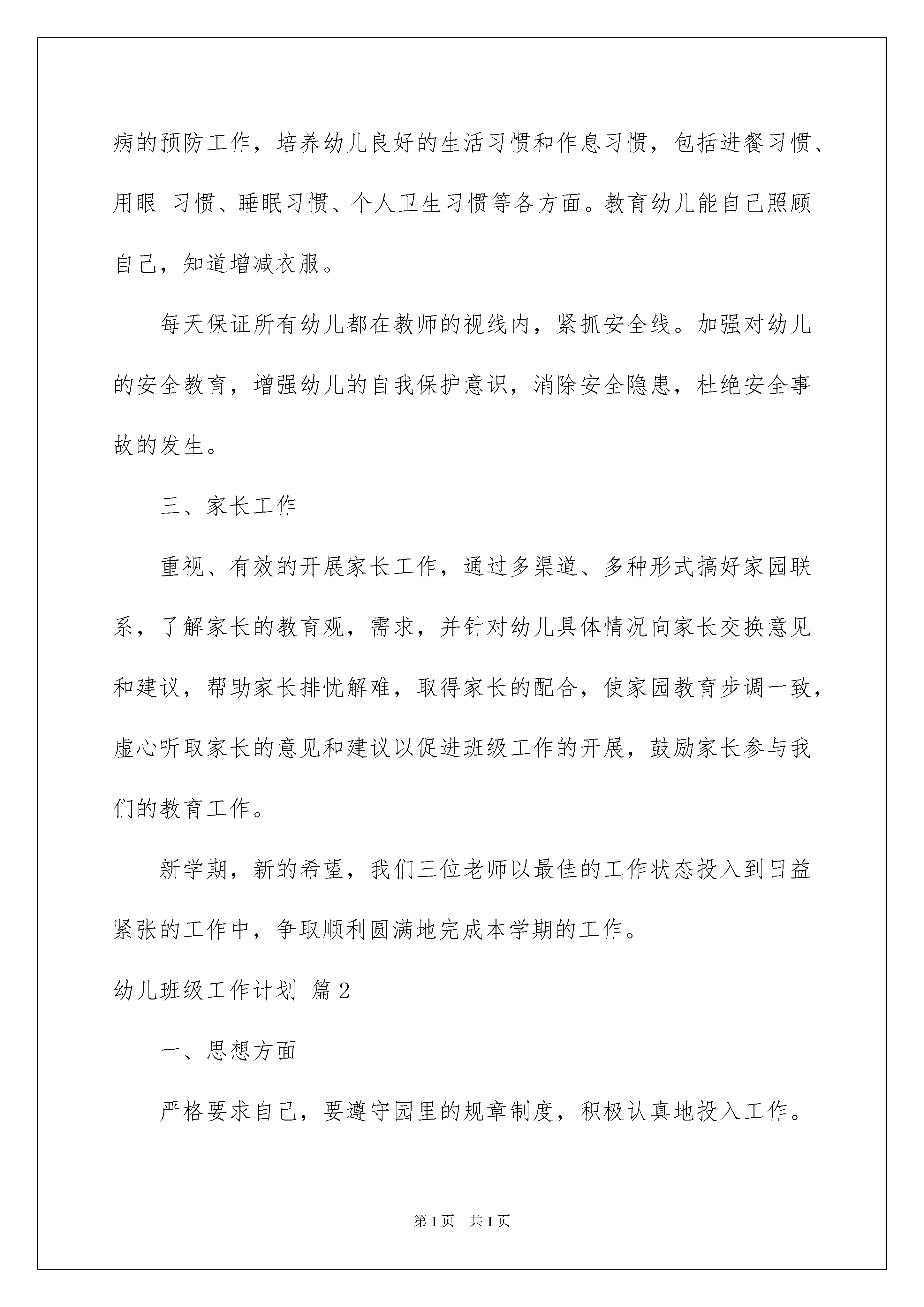 2022幼儿班级工作计划模板10篇幼儿班级工作计划模板10篇光阴的迅速,一眨眼就过去了,又迎来了一个全新的起点,现在这个时候,你会有怎样的计划呢?可是到底什么样的工作计划才是适合自己的呢?下面是我帮大家整理的幼儿班级工作计划10篇,仅供参考,欢迎大家阅读。幼儿班级工作计划篇1认真听取园务工作计划,及学习《幼儿园工作条例》、《幼儿园工作规程》、《幼儿园教育指导纲要(试行)》和《3-6岁儿童学习与发展指南》,积极贯彻落实幼儿园的各项规章制度,以安全工作为主线,以教育教学为重点,班级教师相互协调好工作,与家长进行有效沟通,做好家园共育。结合教材,联系实际,开展一些具有班级特色的,适合大班幼儿年龄特点的教育教学活动,积极为幼儿营造一个轻松、愉快、舒适、安全的环境。一、教育教学工作:1.积极为幼儿营造轻松、快乐的游戏学习生活氛围,合理地布置安排各个区角,为幼儿提供自选、自主活动的条件与机会,让幼儿井然有序地愉快活动。2.开展丰富多彩的体育活动,保证每天1个小时的户外体育活动时间。有针对性地开展跳大绳、小绳、花样拍球、转呼啦圈等训练活动,多动员家长在家和幼儿一起练习,重视幼儿健康体质的培养和教给幼儿适应各种环境的技能。3.利用节日开展形式多样丰富多彩的综合主题活动,充分调动孩子们学习的积极性。4.开展幼小衔接的准备工作,开展阅读、计算、识字、等活动,教师要做到提前备课,课前准备好教具。二、班级常规工作良好的常规是顺利开展工作的前提,本学期,将重视幼儿常规的培养.建立良好的师生关系,加强师生间的互动与交流。关注每一个孩子,了解他们的需求。我们三位老师严格按幼儿园的要求最好常规工作。三、卫生保健及安全教育工作:我们将全力认真完成卫生工作,认真做好每日的卫生消毒及清扫,为幼儿提供一个安全、舒适、整洁的生活环境。配合保健室做好传染病的预防工作,培养幼儿良好的生活习惯和作息习惯,包括进餐习惯、用眼习惯、睡眠习惯、个人卫生习惯等各方面。教育幼儿能自己照顾自己,知道增减衣服。每天保证所有幼儿都在教师的视线内,紧抓安全线。加强对幼儿的安全教育,增强幼儿的自我保护意识,消除安全隐患,杜绝安全事故的发生。三、家长工作重视、有效的开展家长工作,通过多渠道、多种形式搞好家园联系,了解家长的教育观,需求,并针对幼儿具体情况向家长交换意见和建议,帮助家长排忧解难,取得家长的配合,使家园教育步调一致,虚心听取家长的意见和建议以促进班级工作的开展,鼓励家长参与我们的教育工作。新学期,新的希望,我们三位老师以最佳的工作状态投入到日益紧张的工作中,争取顺利圆满地完成本学期的工作。幼儿班级工作计划篇2一、思想方面严格要求自己,要遵守园里的规章制度,积极认真地投入工作。要平等对待每位儿童,以饱满的热情参与园里安排的各项活动,用谦逊好学的态度与同事相处共事。坚持正确的观,以下面教育为主,要向儿童讲明道理再让他们自觉自愿学习。二、学习方面为了充实自己,便于教学,我会积极学习各种教育理论,加强思想业务学习和职业道德学习,规范自己的言行,用自己的一言一行、一举一动去带动形成良好的习惯。平时在工作中遇到了问题,我会向有经验的请教,与搭班老师共同商量并解决,认真参加教研活动,树立“终身学习”的目标,向前辈们“取经问道”并虚心接受同事和领导对我的意见及建议,不断学习,不断完善自己。三、工作方面这是初次接触幼教工作,因此我有很多很多需要学习和积累的东西。经验有限的我,在日后的工作中会努力做到主动、积极、踏实、勇于承担责任。对幼儿有爱心、耐心,会细心地观察幼儿以做到对每个幼儿因材施教,跟幼儿建立一种平等、信任、尊重的关系,给孩子一个舒适、优美、良好的生活和学习环境,让孩子喜欢上我这位新老师,继续喜欢甚至更加喜欢“家有宝贝”幼儿园,对真诚热情,及时向每个家长了解幼儿在家的情况,并反馈幼儿在园时的表现给家长,做到对每个幼儿心中有数,在这样“家园共育”的配合下,让幼儿健康和谐地身心全面发展。上班时我一定做到,不迟到、不早退。按时完成工作任务,认真准备和组织好班级的教学活动,活动后认真分析和反思活动的效果。仔细填写家园联系手册,做好家访工作后要有记录,抓好教育教学工作。四、家长方面家长会已经召开过,家访工作也正进行中,我会借此途径好好了解幼儿,收集家长的宝贵意见,也及时向家长反馈幼儿的,加强互动沟通,共同配合教育好幼儿,让家长们信任,放心,明白把孩子交给家有宝贝是明智的选择!五、个人努力方向我认为喊再多口号也抵不过小小的实际行动,我会努力用行动来证明自己。对孩子再多点爱心再多点耐心,使孩子在各方面有更大进步。辅助抓好班级的常规工作,使得大(2)班有