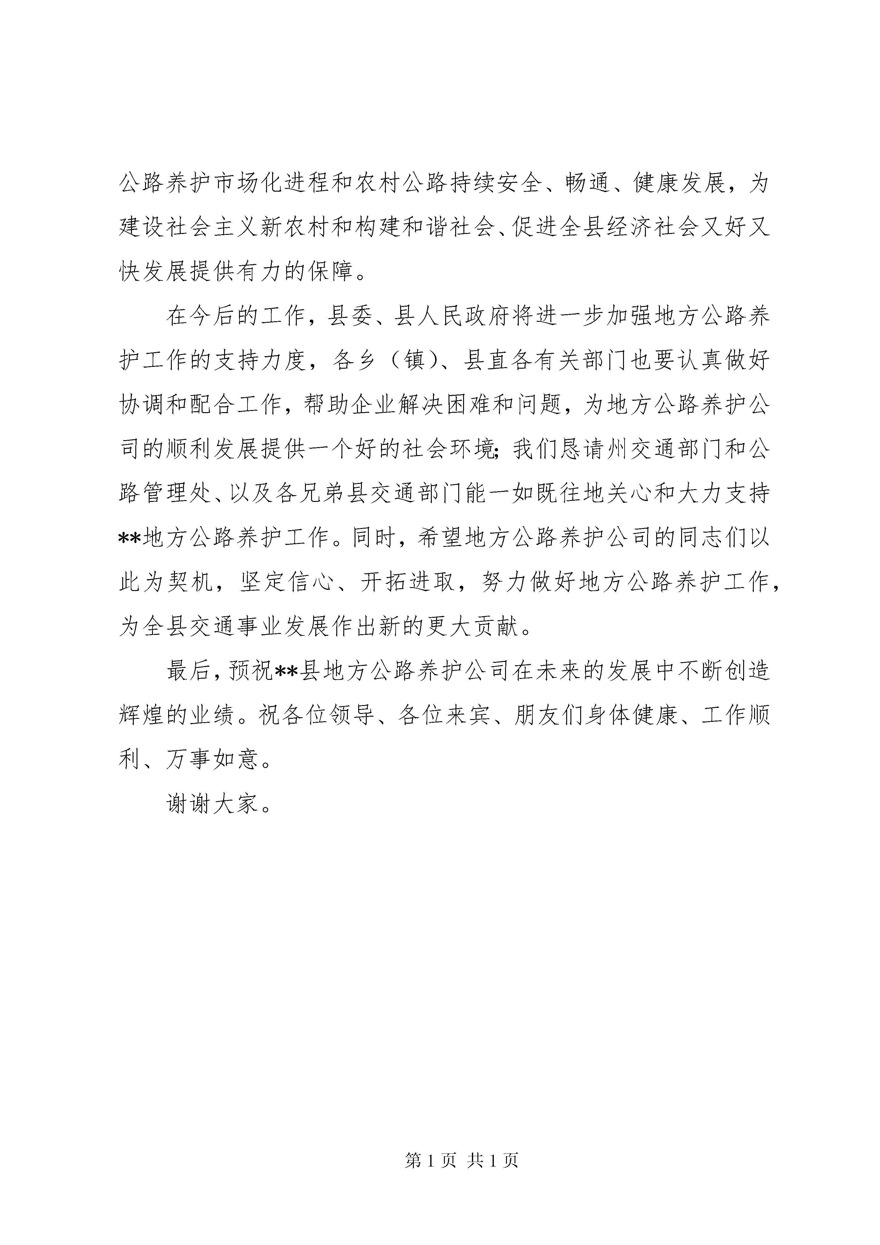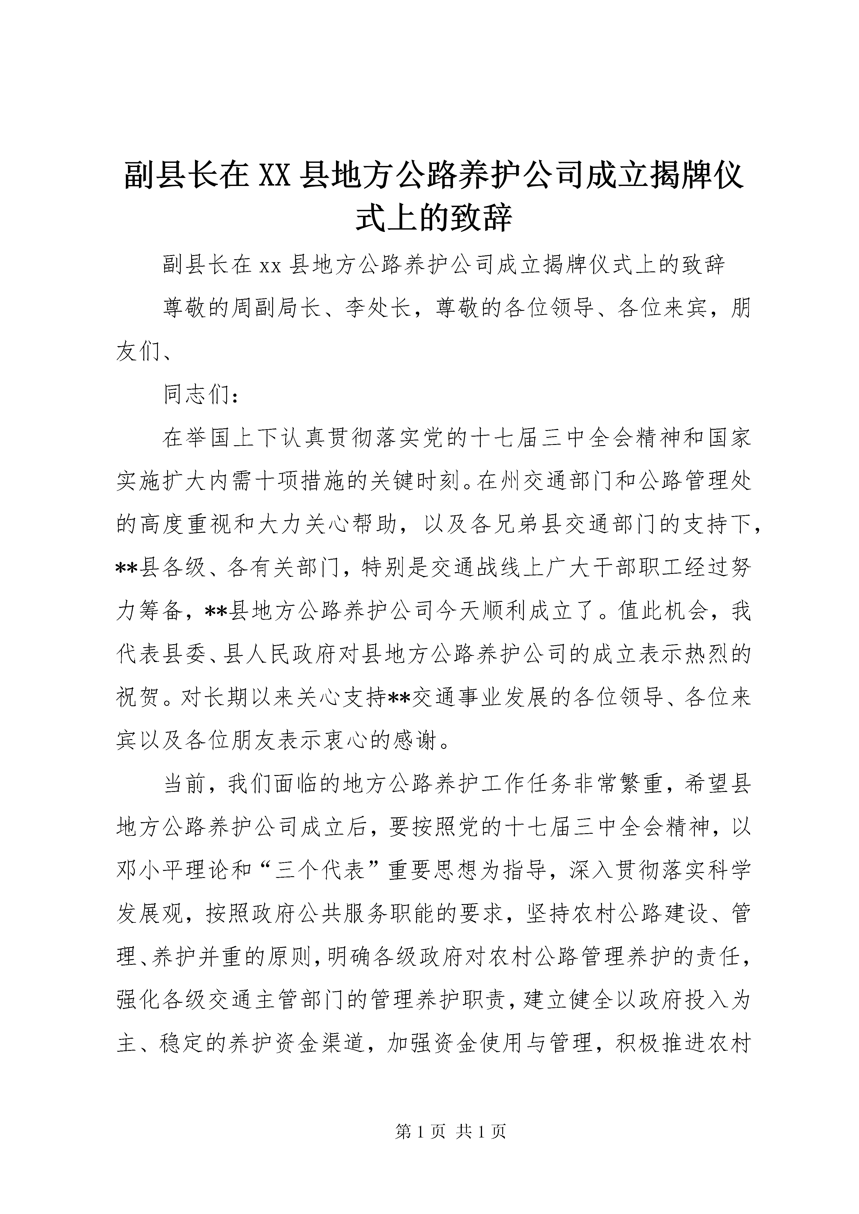 副县长在XX县地方公路养护公司成立揭牌仪式上的致辞副县长在xx县地方公路养护公司成立揭牌仪式上的致辞尊敬的周副局长、李处长,尊敬的各位领导、各位来宾,朋友们、同志们:在举国上下认真贯彻落实党的十七届三中全会精神和国家实施扩大内需十项措施的关键时刻。在州交通部门和公路管理处的高度重视和大力关心帮助,以及各兄弟县交通部门的支持下,**县各级、各有关部门,特别是交通战线上广大干部职工经过努力筹备,**县地方公路养护公司今天顺利成立了。值此机会,我代表县委、县人民政府对县地方公路养护公司的成立表示热烈的祝贺。对长期以来关心支持**交通事业发展的各位领导、各位来宾以及各位朋友表示衷心的感谢。当前,我们面临的地方公路养护工作任务非常繁重,希望县地方公路养护公司成立后,要按照党的十七届三中全会精神,以邓小平理论和“三个代表”重要思想为指导,深入贯彻落实科学发展观,按照政府公共服务职能的要求,坚持农村公路建设、管理、养护并重的原则,明确各级政府对农村公路管理养护的责任,强化各级交通主管部门的管理养护职责,建立健全以政府投入为主、稳定的养护资金渠道,加强资金使用与管理,积极推进农村公路养护市场化进程和农村公路持续安全、畅通、健康发展,为建设社会主义新农村和构建和谐社会、促进全县经济社会又好又快发展提供有力的保障。在今后的工作,县委、县人民政府将进一步加强地方公路养护工作的支持力度,各乡(镇)、县直各有关部门也要认真做好协调和配合工作,帮助企业解决困难和问题,为地方公路养护公司的顺利发展提供一个好的社会环境;我们恳请州交通部门和公路管理处、以及各兄弟县交通部门能一如既往地关心和大力支持**地方公路养护工作。同时,希望地方公路养护公司的同志们以此为契机,坚定信心、开拓进取,努力做好地方公路养护工作,为全县交通事业发展作出新的更大贡献。最后,预祝**县地方公路养护公司在未来的发展中不断创造辉煌的业绩。祝各位领导、各位来宾、朋友们身体健康、工作顺利、万事如意。谢谢大家。