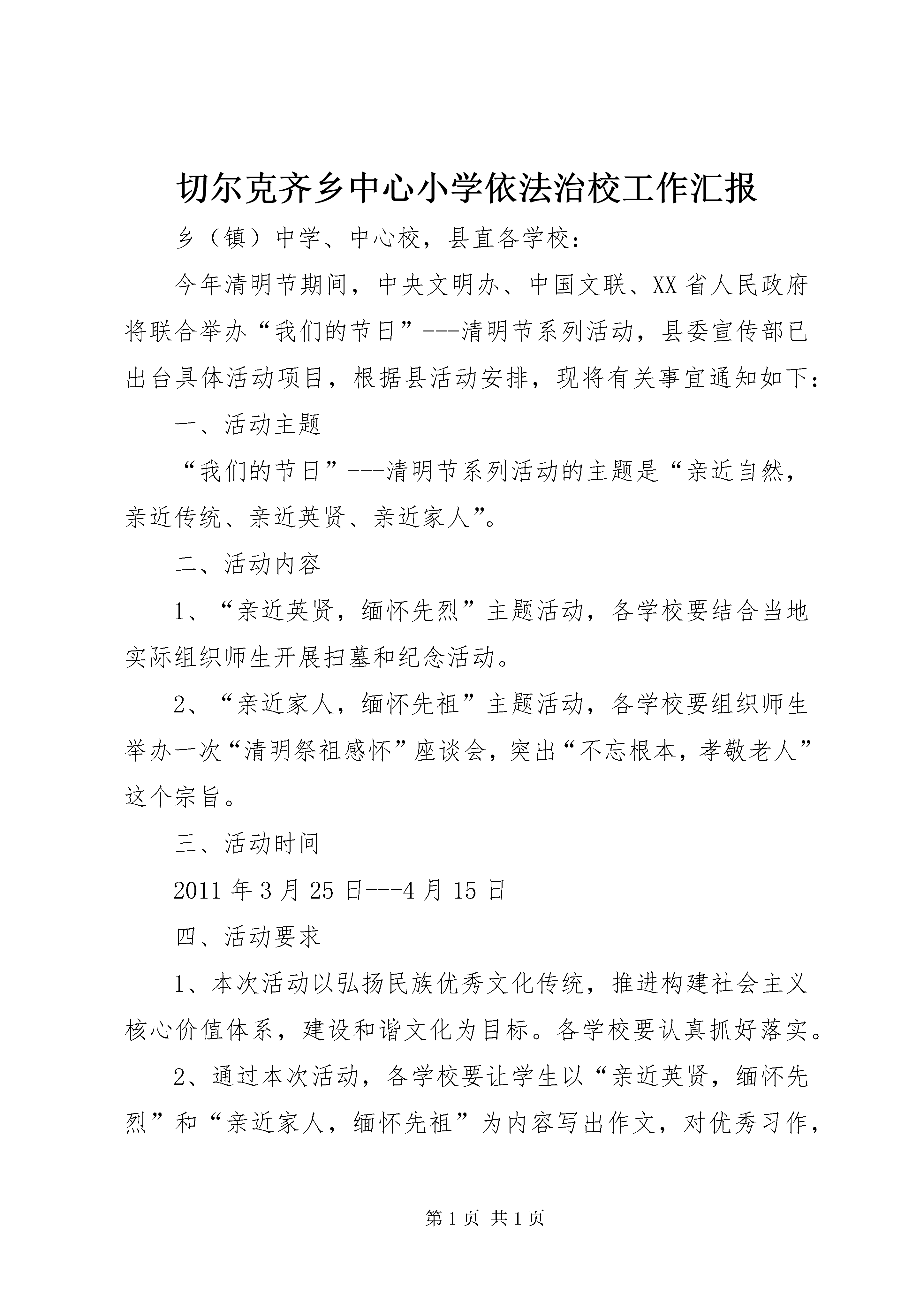 切尔克齐乡中心小学依法治校工作汇报乡(镇)中学、中心校,县直各学校:今年清明节期间,中央文明办、中国文联、XX省人民政府将联合举办“我们的节日”---清明节系列活动,县委宣传部已出台具体活动项目,根据县活动安排,现将有关事宜通知如下:一、活动主题“我们的节日”---清明节系列活动的主题是“亲近自然,亲近传统、亲近英贤、亲近家人”。二、活动内容1、“亲近英贤,缅怀先烈”主题活动,各学校要结合当地实际组织师生开展扫墓和纪念活动。2、“亲近家人,缅怀先祖”主题活动,各学校要组织师生举办一次“清明祭祖感怀”座谈会,突出“不忘根本,孝敬老人”这个宗旨。三、活动时间2011年3月25日---4月15日四、活动要求1、本次活动以弘扬民族优秀文化传统,推进构建社会主义核心价值体系,建设和谐文化为目标。各学校要认真抓好落实。2、通过本次活动,各学校要让学生以“亲近英贤,缅怀先烈”和“亲近家人,缅怀先祖”为内容写出作文,对优秀习作,教师要加评语,注明教师和习作作者姓名报县局政教股。要求。中心校、中学上报3篇,县直小学上报2篇。(文本、电子稿)截止时间为4月18日,优秀作文在全县评选并公布。3、各学校要认真组织开展活动,活动结束后,要将活动情况报县局政教股。2011年3月25日