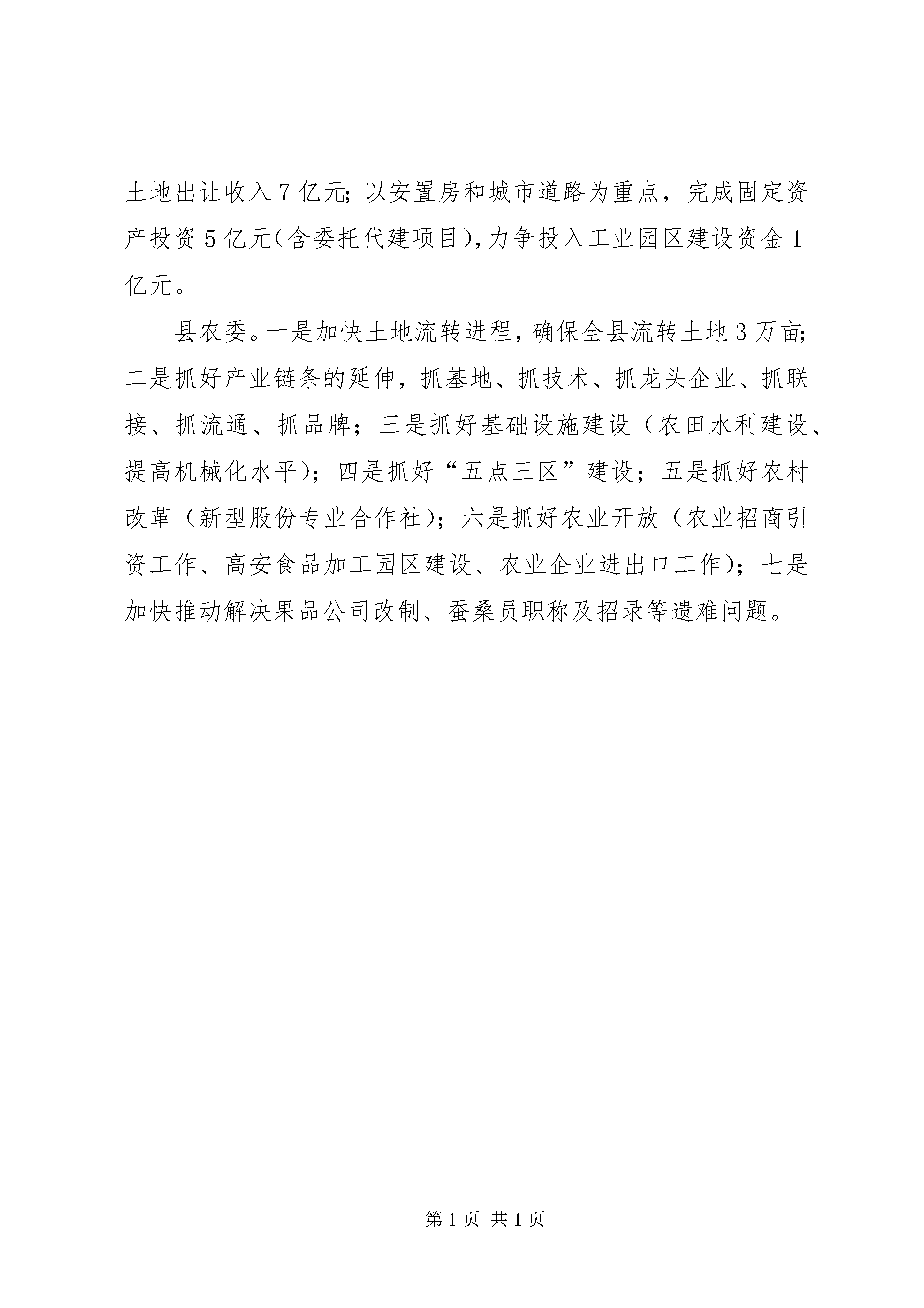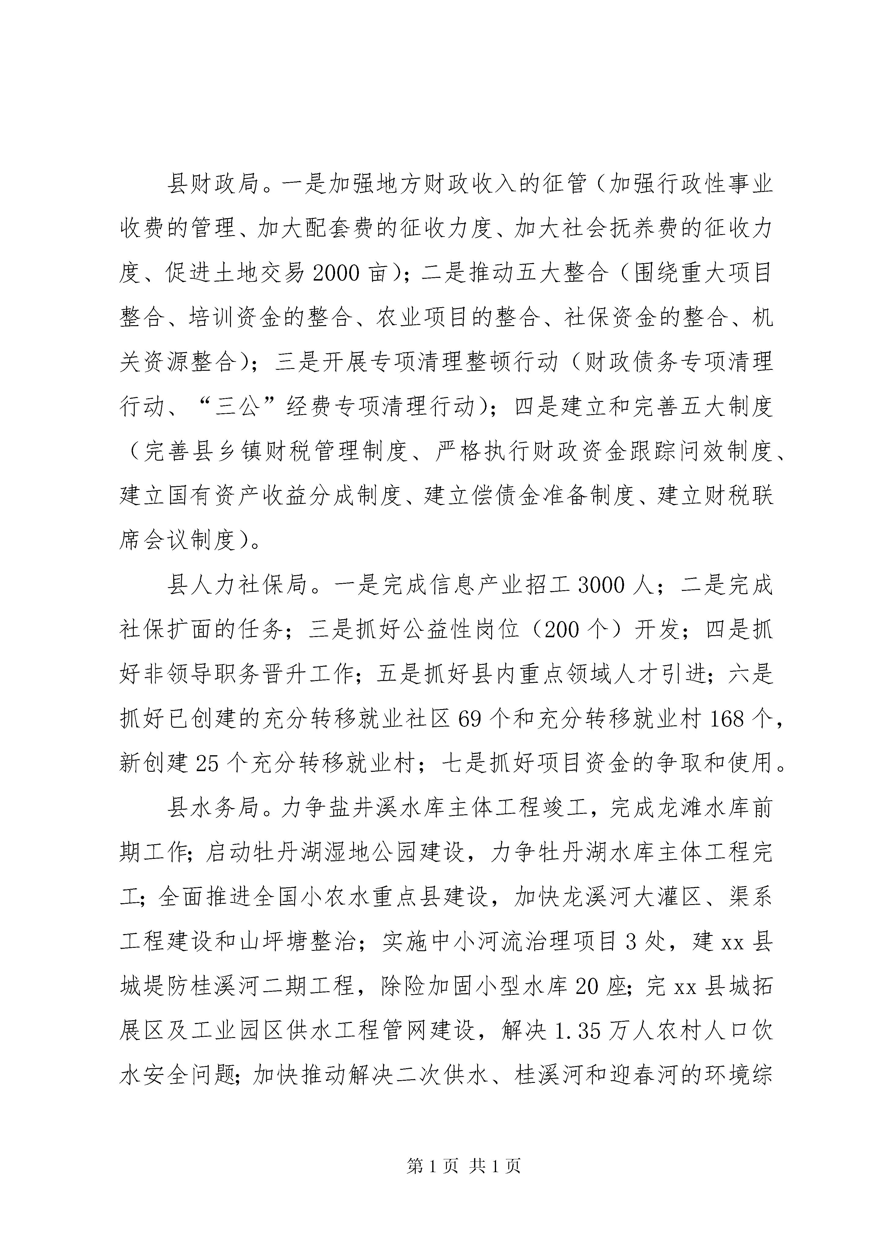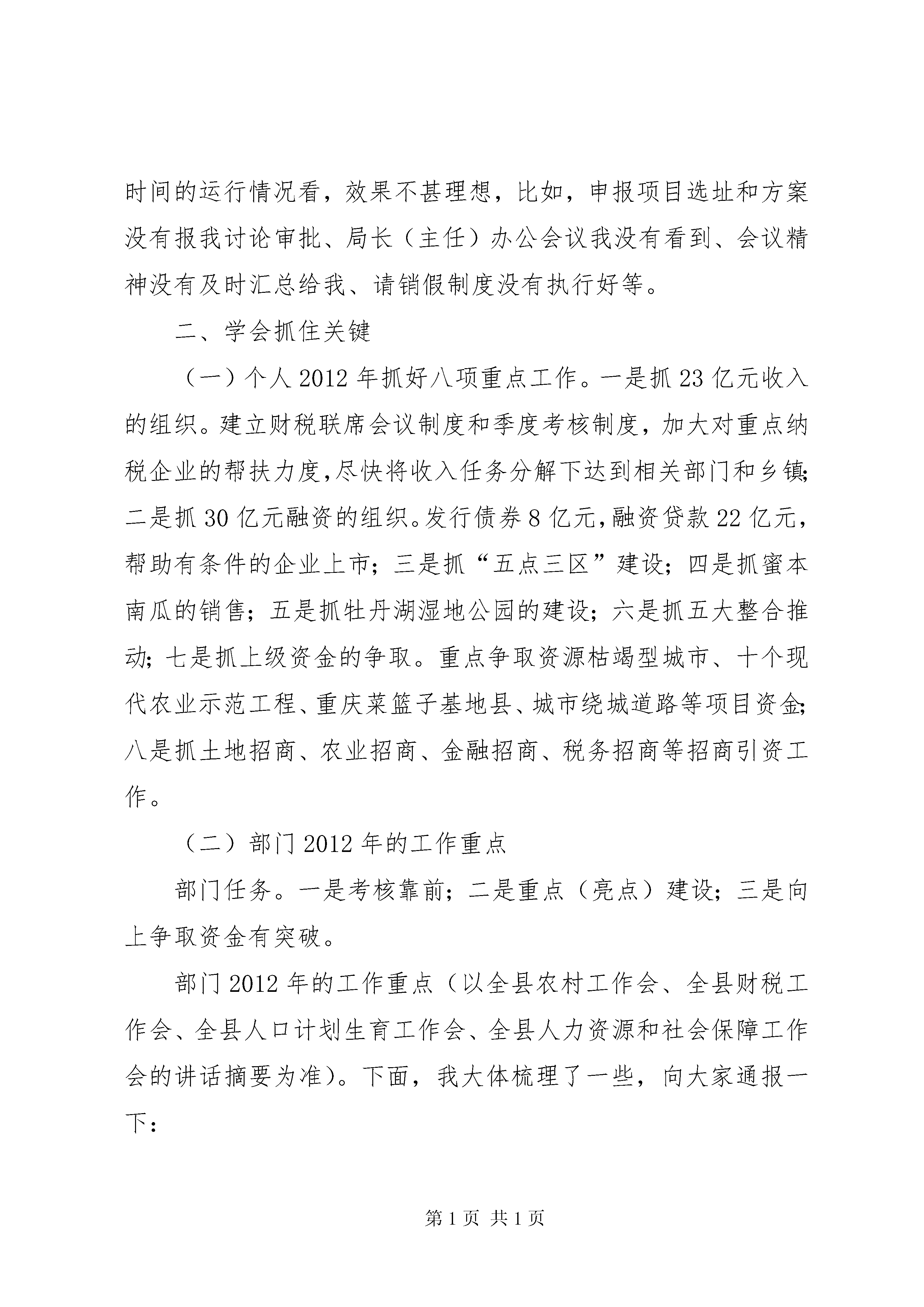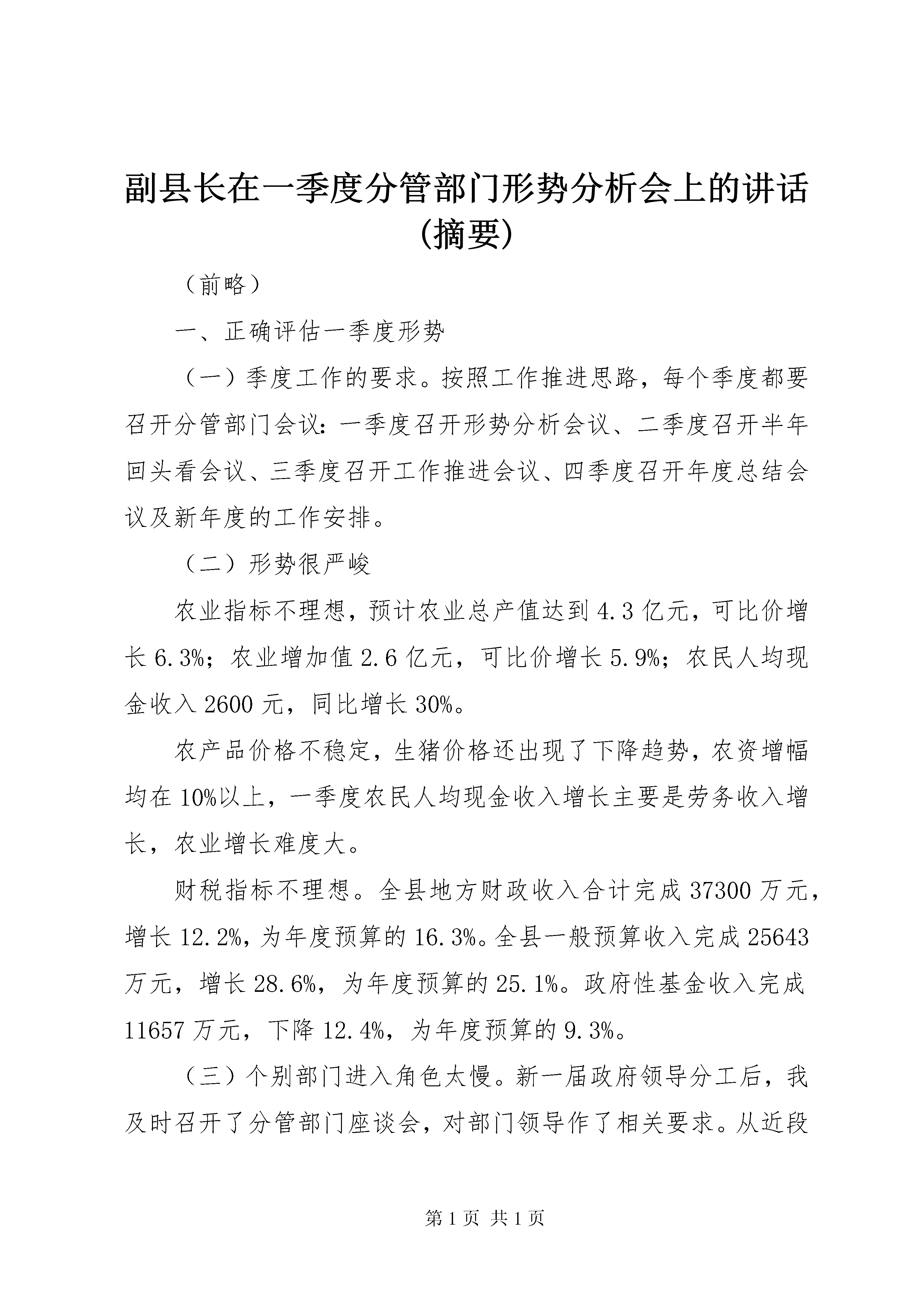 副县长在一季度分管部门形势分析会上的讲话(摘要)(前略)一、正确评估一季度形势(一)季度工作的要求。按照工作推进思路,每个季度都要召开分管部门会议:一季度召开形势分析会议、二季度召开半年回头看会议、三季度召开工作推进会议、四季度召开年度总结会议及新年度的工作安排。(二)形势很严峻农业指标不理想,预计农业总产值达到4.3亿元,可比价增长6.3%;农业增加值2.6亿元,可比价增长5.9%;农民人均现金收入2600元,同比增长30%。农产品价格不稳定,生猪价格还出现了下降趋势,农资增幅均在10%以上,一季度农民人均现金收入增长主要是劳务收入增长,农业增长难度大。财税指标不理想。全县地方财政收入合计完成37300万元,增长12.2%,为年度预算的16.3%。全县一般预算收入完成25643万元,增长28.6%,为年度预算的25.1%。政府性基金收入完成11657万元,下降12.4%,为年度预算的9.3%。(三)个别部门进入角色太慢。新一届政府领导分工后,我及时召开了分管部门座谈会,对部门领导作了相关要求。从近段时间的运行情况看,效果不甚理想,比如,申报项目选址和方案没有报我讨论审批、局长(主任)办公会议我没有看到、会议精神没有及时汇总给我、请销假制度没有执行好等。二、学会抓住关键(一)个人2012年抓好八项重点工作。一是抓23亿元收入的组织。建立财税联席会议制度和季度考核制度,加大对重点纳税企业的帮扶力度,尽快将收入任务分解下达到相关部门和乡镇;二是抓30亿元融资的组织。发行债券8亿元,融资贷款22亿元,帮助有条件的企业上市;三是抓“五点三区”建设;四是抓蜜本南瓜的销售;五是抓牡丹湖湿地公园的建设;六是抓五大整合推动;七是抓上级资金的争取。重点争取资源枯竭型城市、十个现代农业示范工程、重庆菜篮子基地县、城市绕城道路等项目资金;八是抓土地招商、农业招商、金融招商、税务招商等招商引资工作。(二)部门2012年的工作重点部门任务。一是考核靠前;二是重点(亮点)建设;三是向上争取资金有突破。部门2012年的工作重点(以全县农村工作会、全县财税工作会、全县人口计划生育工作会、全县人力资源和社会保障工作会的讲话摘要为准)。下面,我大体梳理了一些,向大家通报一下:县财政局。一是加强地方财政收入的征管(加强行政性事业收费的管理、加大配套费的征收力度、加大社会抚养费的征收力度、促进土地交易2000亩);二是推动五大整合(围绕重大项目整合、培训资金的整合、农业项目的整合、社保资金的整合、机关资源整合);三是开展专项清理整顿行动(财政债务专项清理行动、“三公”经费专项清理行动);四是建立和完善五大制度(完善县乡镇财税管理制度、严格执行财政资金跟踪问效制度、建立国有资产收益分成制度、建立偿债金准备制度、建立财税联席会议制度)。县人力社保局。一是完成信息产业招工3000人;二是完成社保扩面的任务;三是抓好公益性岗位(200个)开发;四是抓好非领导职务晋升工作;五是抓好县内重点领域人才引进;六是抓好已创建的充分转移就业社区69个和充分转移就业村168个,新创建25个充分转移就业村;七是抓好项目资金的争取和使用。县水务局。力争盐井溪水库主体工程竣工,完成龙滩水库前期工作;启动牡丹湖湿地公园建设,力争牡丹湖水库主体工程完工;全面推进全国小农水重点县建设,加快龙溪河大灌区、渠系工程建设和山坪塘整治;实施中小河流治理项目3处,建xx县城堤防桂溪河二期工程,除险加固小型水库20座;完xx县城拓展区及工业园区供水工程管网建设,解决1.35万人农村人口饮水安全问题;加快推动解决二次供水、桂溪河和迎春河的环境综合整治、农村水价倒挂、红旗水库污染源取缔等水污染源的整治、农村面源污染控制等遗难问题。县国资委。一是完成国有企业产权清理工作;二是制定国有企业人事管理、资产管理、重点企业绩效考核制度;三是做好企业国有资本经营收益工作。县人口计生委。一是保持高压查处态势。重点加大对名人、富人等特殊人群违法生育的查处力度;二是加大宣传力度;三是及时兑现计生奖励扶助政策;四是加强人口与计生基础工作;五是探索流动人口管理;六是抓好三支队伍,包括计生干部队伍、计生专干队伍、计生协会队伍。县金融办。一是积极争取银行融资和社会投入,确保全年完成渝垫公司融资15亿元,力争发行集合债券8亿元;二是推进银企对接,引导金融机构支持实体经济,全力打造和谐金融生态环境,力争实现贷款余额新增15亿元;三是加大金融业招商引资力度,积极引进1-2家股份制商业银行、小额贷款公司和担保公司入驻垫江;四是实现垫江银座村镇银行、垫江兴农融资担保公司年内开业运行;五是推进农村金融服务体系建设,完成“三权”抵押贷款5亿元;六是制定支持实体企业措施,积极谋划企业上市;七是建小金融财富中心。渝垫国资公司。全年计