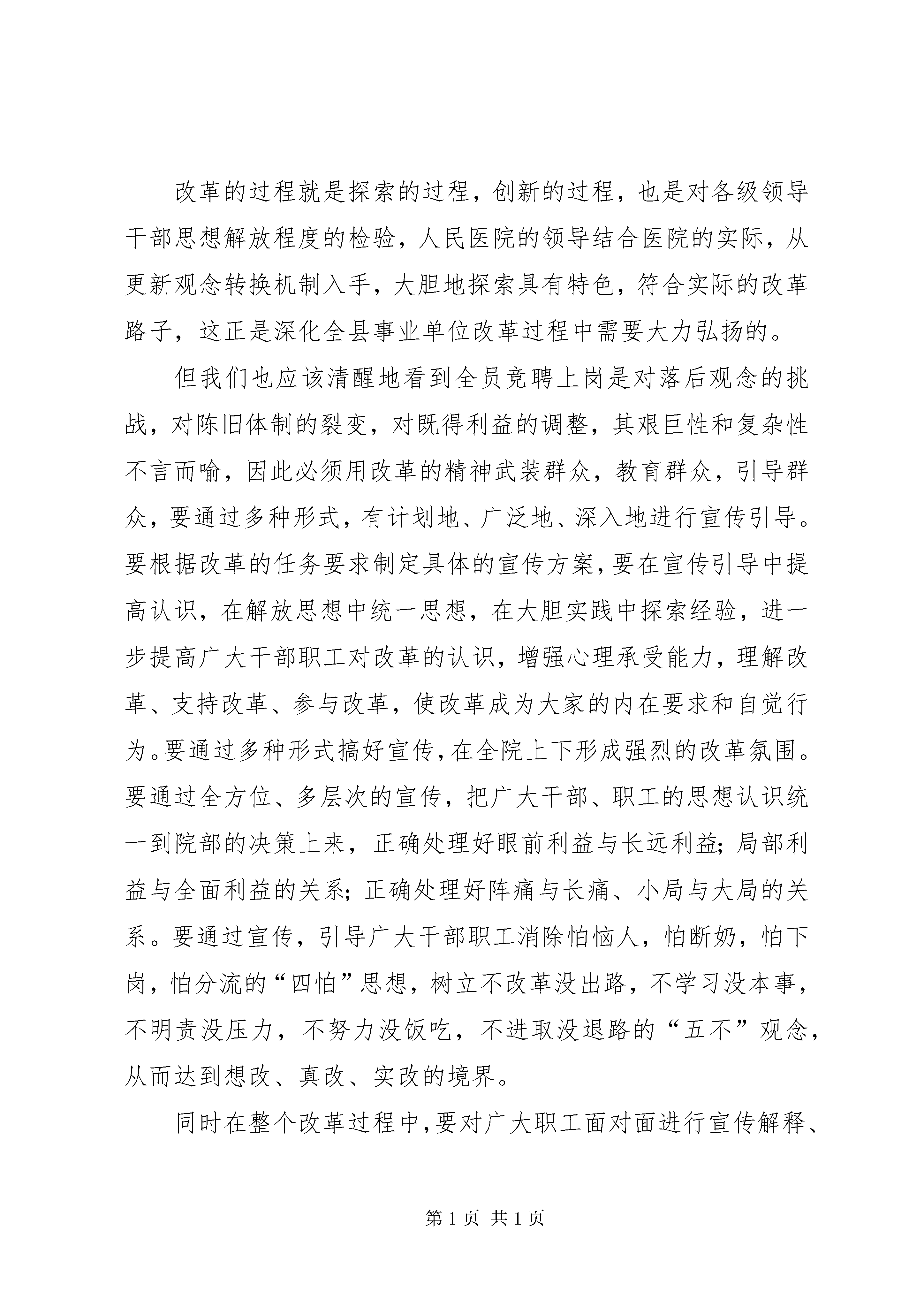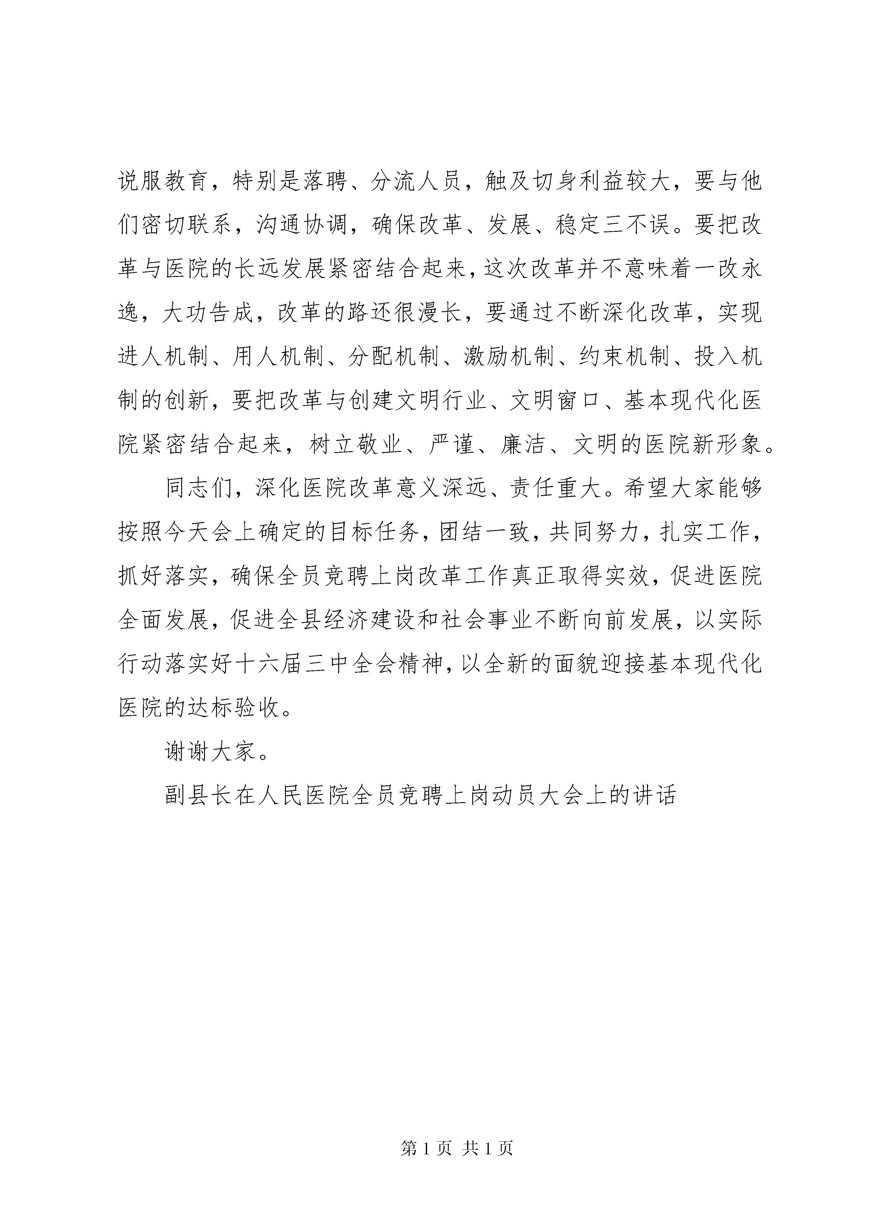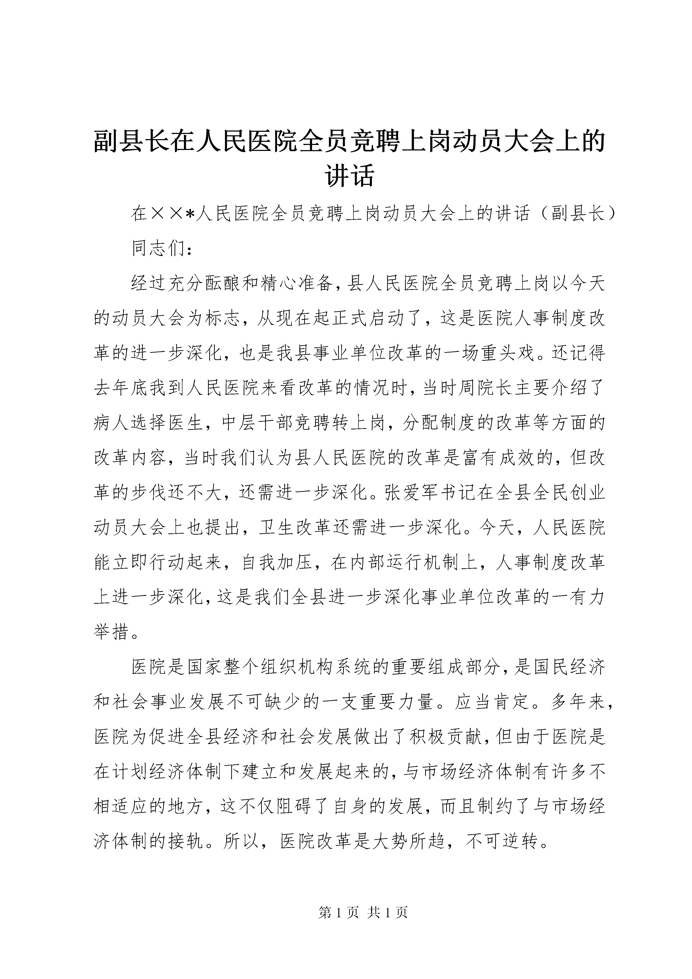副县长在人民医院全员竞聘上岗动员大会上的讲话在××*人民医院全员竞聘上岗动员大会上的讲话(副县长)同志们:经过充分酝酿和精心准备,县人民医院全员竞聘上岗以今天的动员大会为标志,从现在起正式启动了,这是医院人事制度改革的进一步深化,也是我县事业单位改革的一场重头戏。还记得去年底我到人民医院来看改革的情况时,当时周院长主要介绍了病人选择医生,中层干部竞聘转上岗,分配制度的改革等方面的改革内容,当时我们认为县人民医院的改革是富有成效的,但改革的步伐还不大,还需进一步深化。张爱军书记在全县全民创业动员大会上也提出,卫生改革还需进一步深化。今天,人民医院能立即行动起来,自我加压,在内部运行机制上,人事制度改革上进一步深化,这是我们全县进一步深化事业单位改革的一有力举措。医院是国家整个组织机构系统的重要组成部分,是国民经济和社会事业发展不可缺少的一支重要力量。应当肯定。多年来,医院为促进全县经济和社会发展做出了积极贡献,但由于医院是在计划经济体制下建立和发展起来的,与市场经济体制有许多不相适应的地方,这不仅阻碍了自身的发展,而且制约了与市场经济体制的接轨。所以,医院改革是大势所趋,不可逆转。改革的过程就是探索的过程,创新的过程,也是对各级领导干部思想解放程度的检验,人民医院的领导结合医院的实际,从更新观念转换机制入手,大胆地探索具有特色,符合实际的改革路子,这正是深化全县事业单位改革过程中需要大力弘扬的。但我们也应该清醒地看到全员竞聘上岗是对落后观念的挑战,对陈旧体制的裂变,对既得利益的调整,其艰巨性和复杂性不言而喻,因此必须用改革的精神武装群众,教育群众,引导群众,要通过多种形式,有计划地、广泛地、深入地进行宣传引导。要根据改革的任务要求制定具体的宣传方案,要在宣传引导中提高认识,在解放思想中统一思想,在大胆实践中探索经验,进一步提高广大干部职工对改革的认识,增强心理承受能力,理解改革、支持改革、参与改革,使改革成为大家的内在要求和自觉行为。要通过多种形式搞好宣传,在全院上下形成强烈的改革氛围。要通过全方位、多层次的宣传,把广大干部、职工的思想认识统一到院部的决策上来,正确处理好眼前利益与长远利益;局部利益与全面利益的关系;正确处理好阵痛与长痛、小局与大局的关系。要通过宣传,引导广大干部职工消除怕恼人,怕断奶,怕下岗,怕分流的“四怕”思想,树立不改革没出路,不学习没本事,不明责没压力,不努力没饭吃,不进取没退路的“五不”观念,从而达到想改、真改、实改的境界。同时在整个改革过程中,要对广大职工面对面进行宣传解释、说服教育,特别是落聘、分流人员,触及切身利益较大,要与他们密切联系,沟通协调,确保改革、发展、稳定三不误。要把改革与医院的长远发展紧密结合起来,这次改革并不意味着一改永逸,大功告成,改革的路还很漫长,要通过不断深化改革,实现进人机制、用人机制、分配机制、激励机制、约束机制、投入机制的创新,要把改革与创建文明行业、文明窗口、基本现代化医院紧密结合起来,树立敬业、严谨、廉洁、文明的医院新形象。同志们,深化医院改革意义深远、责任重大。希望大家能够按照今天会上确定的目标任务,团结一致,共同努力,扎实工作,抓好落实,确保全员竞聘上岗改革工作真正取得实效,促进医院全面发展,促进全县经济建设和社会事业不断向前发展,以实际行动落实好十六届三中全会精神,以全新的面貌迎接基本现代化医院的达标验收。谢谢大家。副县长在人民医院全员竞聘上岗动员大会上的讲话