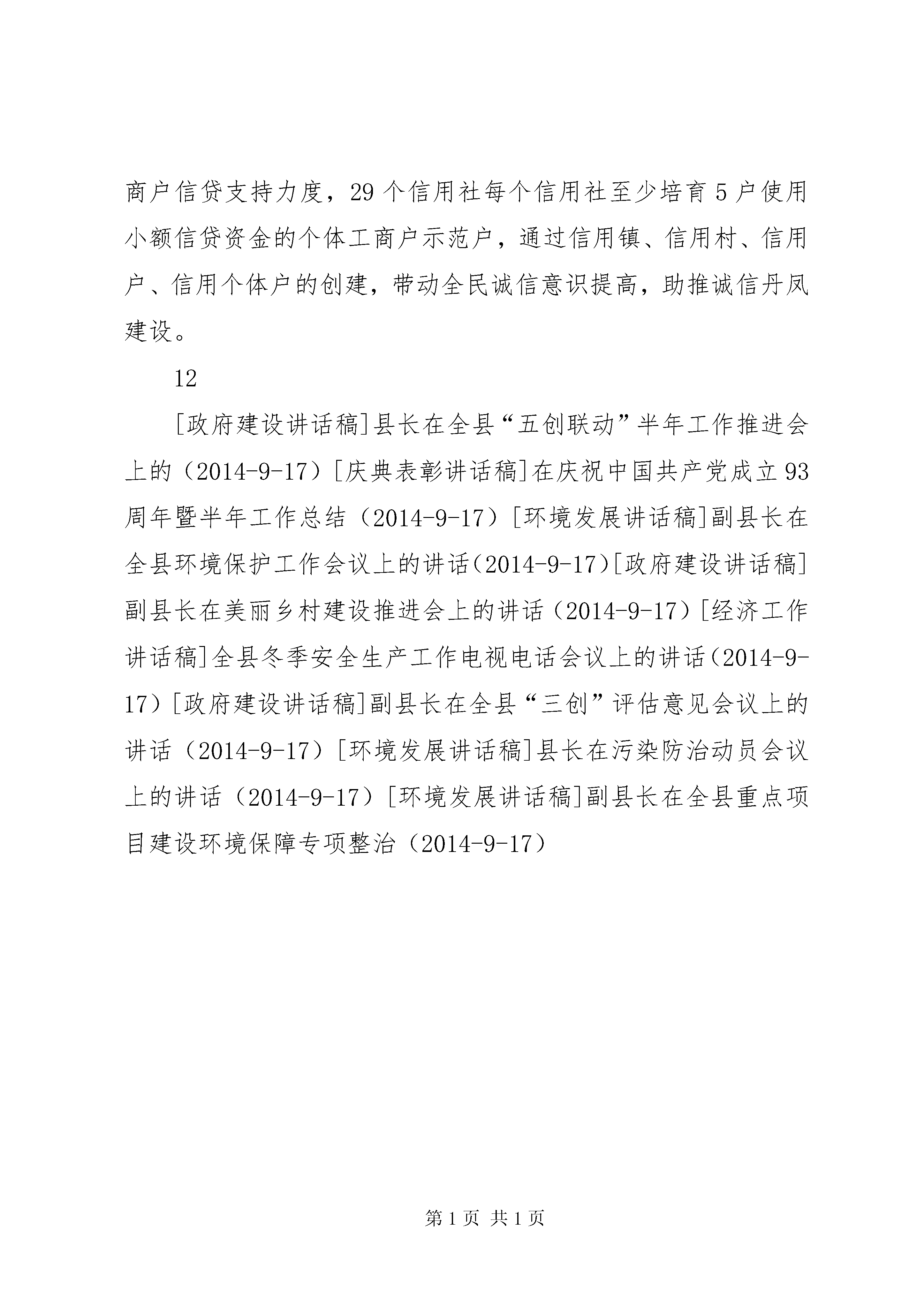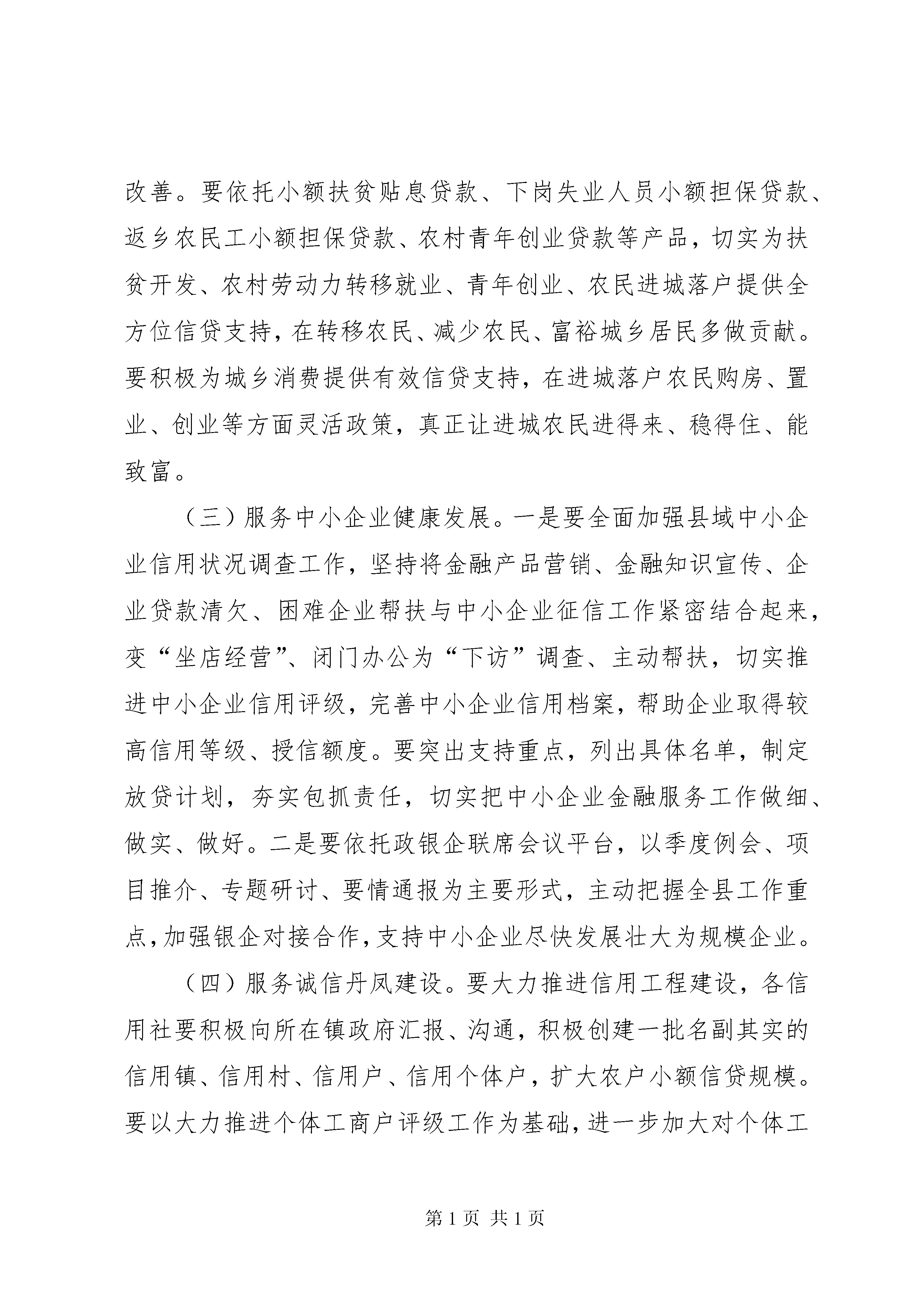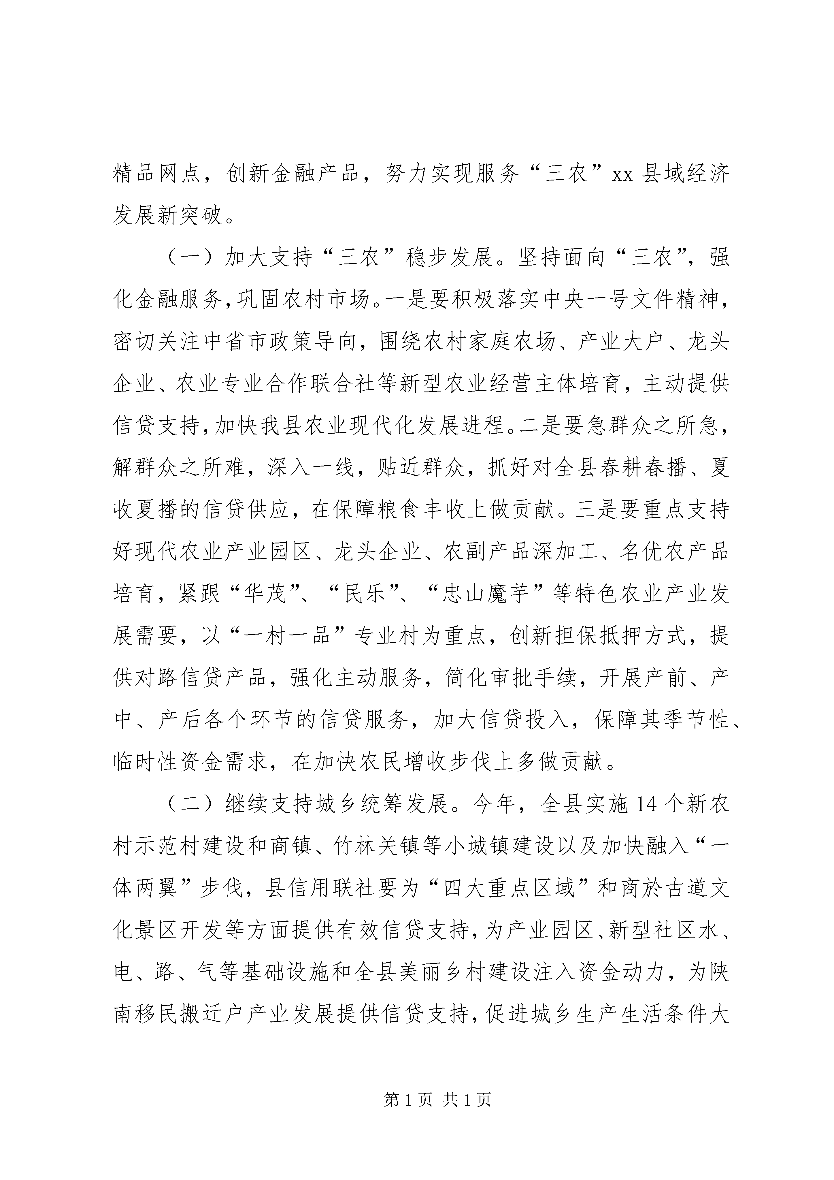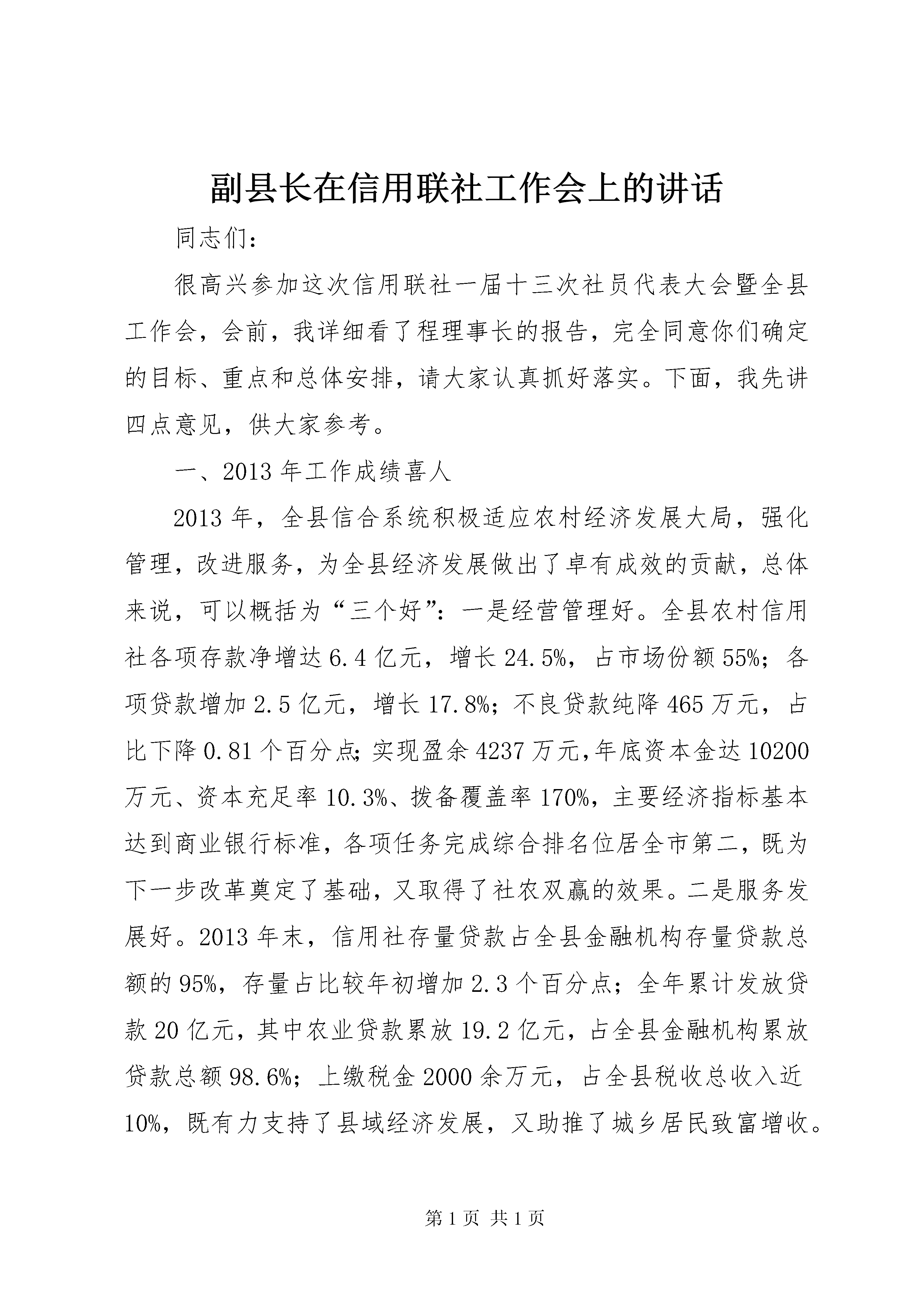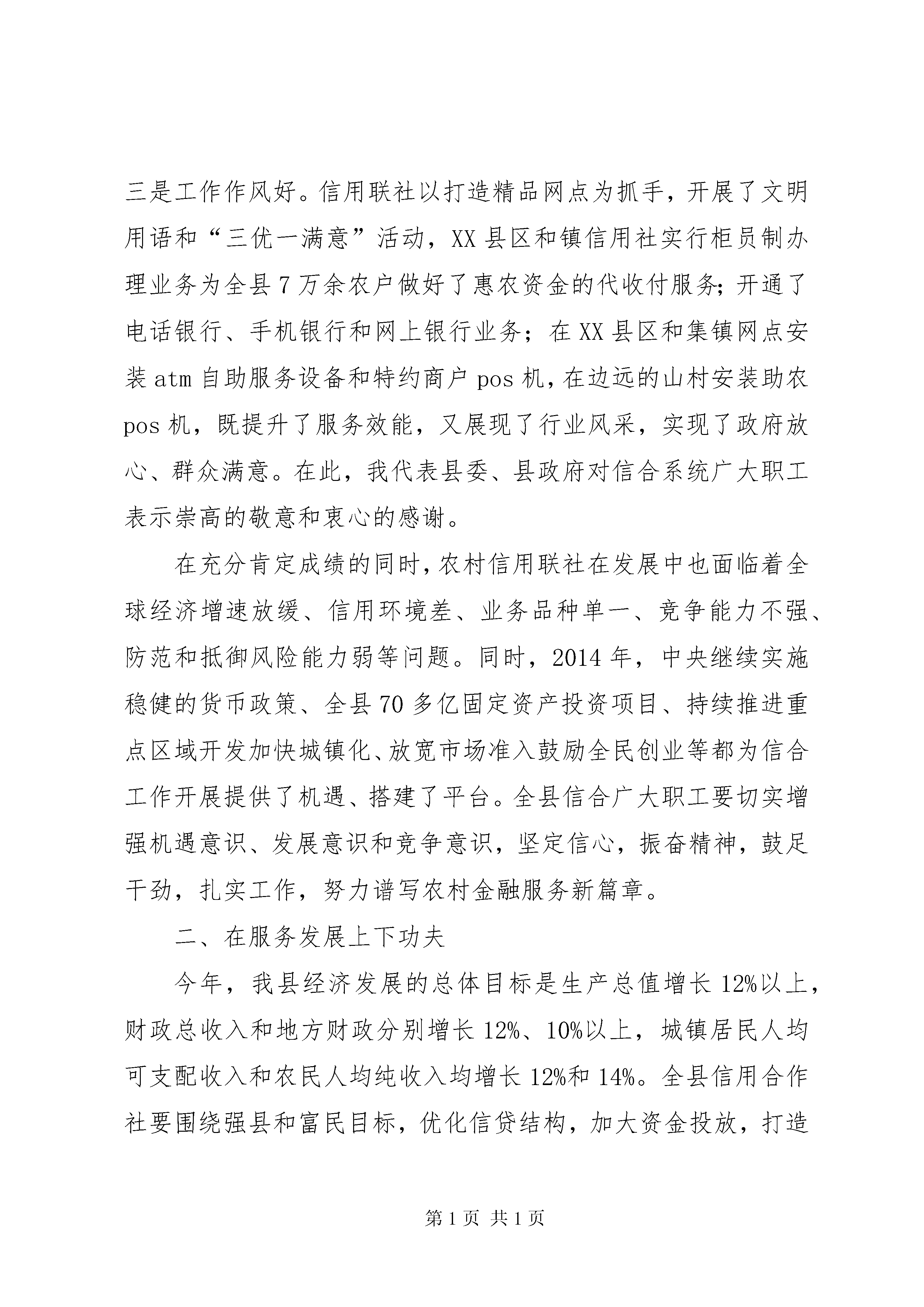 副县长在信用联社工作会上的讲话同志们:很高兴参加这次信用联社一届十三次社员代表大会暨全县工作会,会前,我详细看了程理事长的报告,完全同意你们确定的目标、重点和总体安排,请大家认真抓好落实。下面,我先讲四点意见,供大家参考。一、2013年工作成绩喜人2013年,全县信合系统积极适应农村经济发展大局,强化管理,改进服务,为全县经济发展做出了卓有成效的贡献,总体来说,可以概括为“三个好”:一是经营管理好。全县农村信用社各项存款净增达6.4亿元,增长24.5%,占市场份额55%;各项贷款增加2.5亿元,增长17.8%;不良贷款纯降465万元,占比下降0.81个百分点;实现盈余4237万元,年底资本金达10200万元、资本充足率10.3%、拨备覆盖率170%,主要经济指标基本达到商业银行标准,各项任务完成综合排名位居全市第二,既为下一步改革奠定了基础,又取得了社农双赢的效果。二是服务发展好。2013年末,信用社存量贷款占全县金融机构存量贷款总额的95%,存量占比较年初增加2.3个百分点;全年累计发放贷款20亿元,其中农业贷款累放19.2亿元,占全县金融机构累放贷款总额98.6%;上缴税金2000余万元,占全县税收总收入近10%,既有力支持了县域经济发展,又助推了城乡居民致富增收。三是工作作风好。信用联社以打造精品网点为抓手,开展了文明用语和“三优一满意”活动,XX县区和镇信用社实行柜员制办理业务为全县7万余农户做好了惠农资金的代收付服务;开通了电话银行、手机银行和网上银行业务;在XX县区和集镇网点安装atm自助服务设备和特约商户pos机,在边远的山村安装助农pos机,既提升了服务效能,又展现了行业风采,实现了政府放心、群众满意。在此,我代表县委、县政府对信合系统广大职工表示崇高的敬意和衷心的感谢。在充分肯定成绩的同时,农村信用联社在发展中也面临着全球经济增速放缓、信用环境差、业务品种单一、竞争能力不强、防范和抵御风险能力弱等问题。同时,2014年,中央继续实施稳健的货币政策、全县70多亿固定资产投资项目、持续推进重点区域开发加快城镇化、放宽市场准入鼓励全民创业等都为信合工作开展提供了机遇、搭建了平台。全县信合广大职工要切实增强机遇意识、发展意识和竞争意识,坚定信心,振奋精神,鼓足干劲,扎实工作,努力谱写农村金融服务新篇章。二、在服务发展上下功夫今年,我县经济发展的总体目标是生产总值增长12%以上,财政总收入和地方财政分别增长12%、10%以上,城镇居民人均可支配收入和农民人均纯收入均增长12%和14%。全县信用合作社要围绕强县和富民目标,优化信贷结构,加大资金投放,打造精品网点,创新金融产品,努力实现服务“三农”xx县域经济发展新突破。(一)加大支持“三农”稳步发展。坚持面向“三农”,强化金融服务,巩固农村市场。一是要积极落实中央一号文件精神,密切关注中省市政策导向,围绕农村家庭农场、产业大户、龙头企业、农业专业合作联合社等新型农业经营主体培育,主动提供信贷支持,加快我县农业现代化发展进程。二是要急群众之所急,解群众之所难,深入一线,贴近群众,抓好对全县春耕春播、夏收夏播的信贷供应,在保障粮食丰收上做贡献。三是要重点支持好现代农业产业园区、龙头企业、农副产品深加工、名优农产品培育,紧跟“华茂”、“民乐”、“忠山魔芋”等特色农业产业发展需要,以“一村一品”专业村为重点,创新担保抵押方式,提供对路信贷产品,强化主动服务,简化审批手续,开展产前、产中、产后各个环节的信贷服务,加大信贷投入,保障其季节性、临时性资金需求,在加快农民增收步伐上多做贡献。(二)继续支持城乡统筹发展。今年,全县实施14个新农村示范村建设和商镇、竹林关镇等小城镇建设以及加快融入“一体两翼”步伐,县信用联社要为“四大重点区域”和商於古道文化景区开发等方面提供有效信贷支持,为产业园区、新型社区水、电、路、气等基础设施和全县美丽乡村建设注入资金动力,为陕南移民搬迁户产业发展提供信贷支持,促进城乡生产生活条件大改善。要依托小额扶贫贴息贷款、下岗失业人员小额担保贷款、返乡农民工小额担保贷款、农村青年创业贷款等产品,切实为扶贫开发、农村劳动力转移就业、青年创业、农民进城落户提供全方位信贷支持,在转移农民、减少农民、富裕城乡居民多做贡献。要积极为城乡消费提供有效信贷支持,在进城落户农民购房、置业、创业等方面灵活政策,真正让进城农民进得来、稳得住、能致富。(三)服务中小企业健康发展。一是要全面加强县域中小企业信用状况调查工作,坚持将金融产品营销、金融知识宣传、企业贷款清欠、困难企业帮扶与中小企业征信工作紧密结合起来,变“坐店经营”、闭门办公为“下访”调查、主动帮扶,切实推进中小企业信用评级,完善中小企业信用档案,帮助企业取得较高信用等级、授信额度。要突出支持重