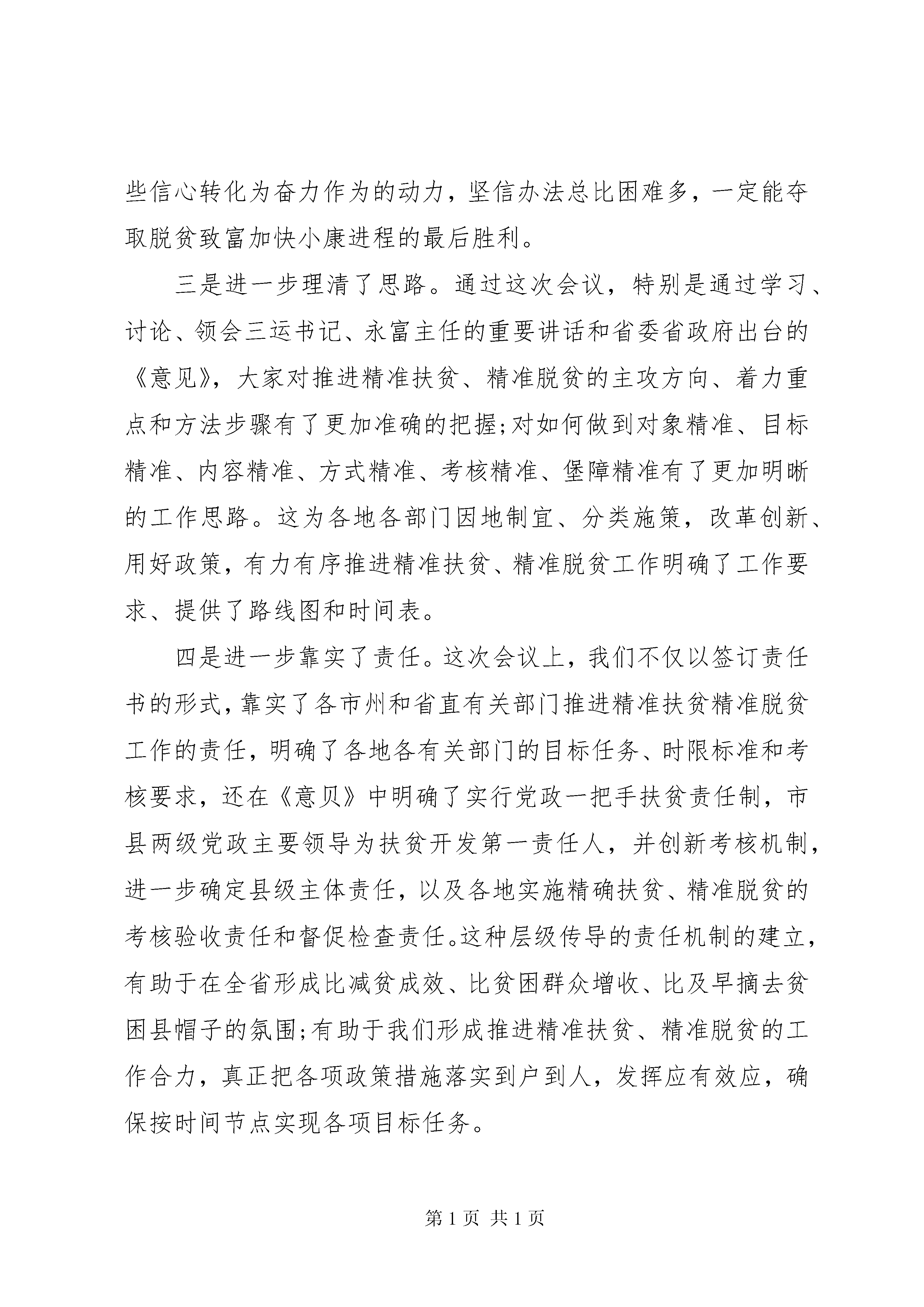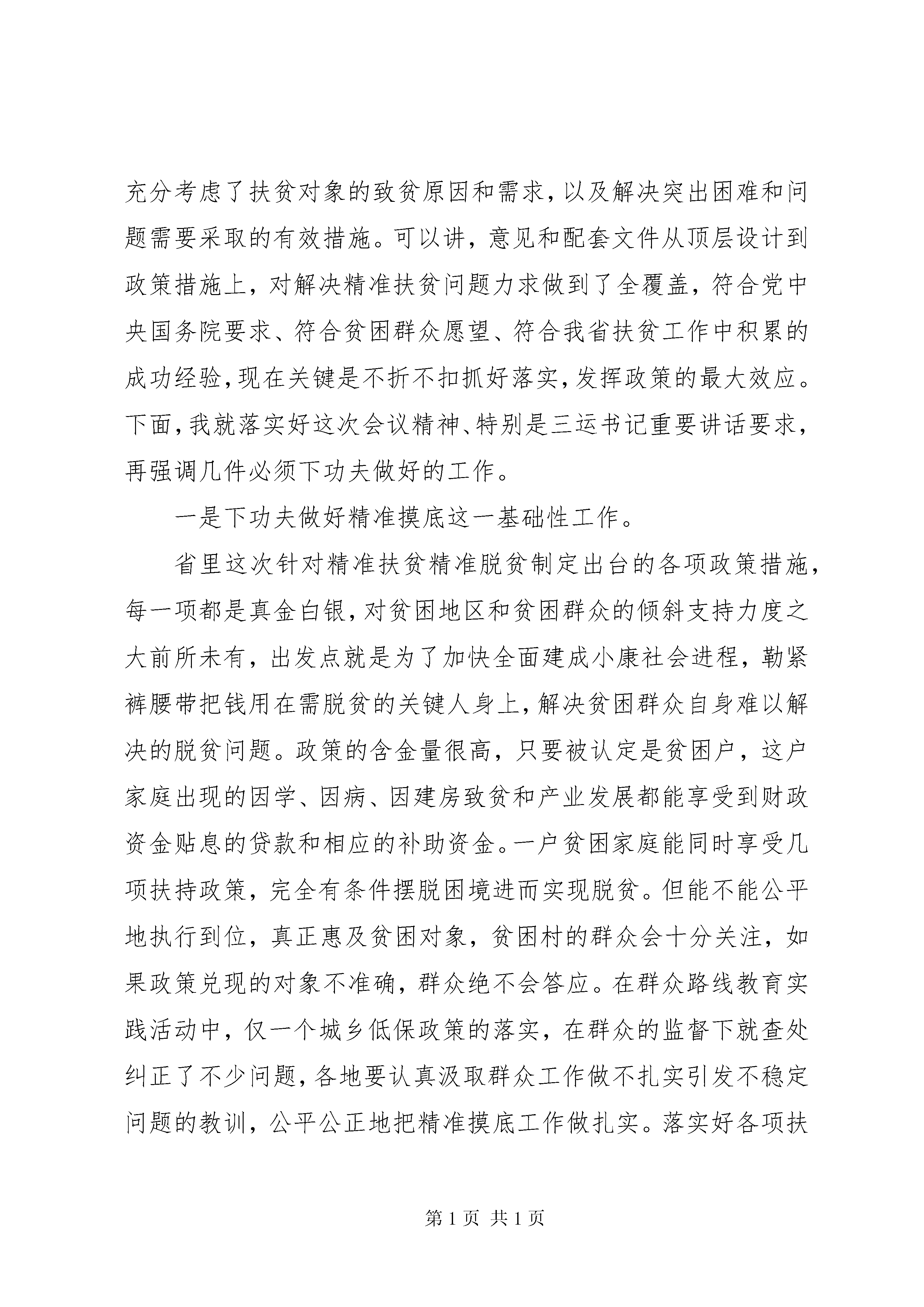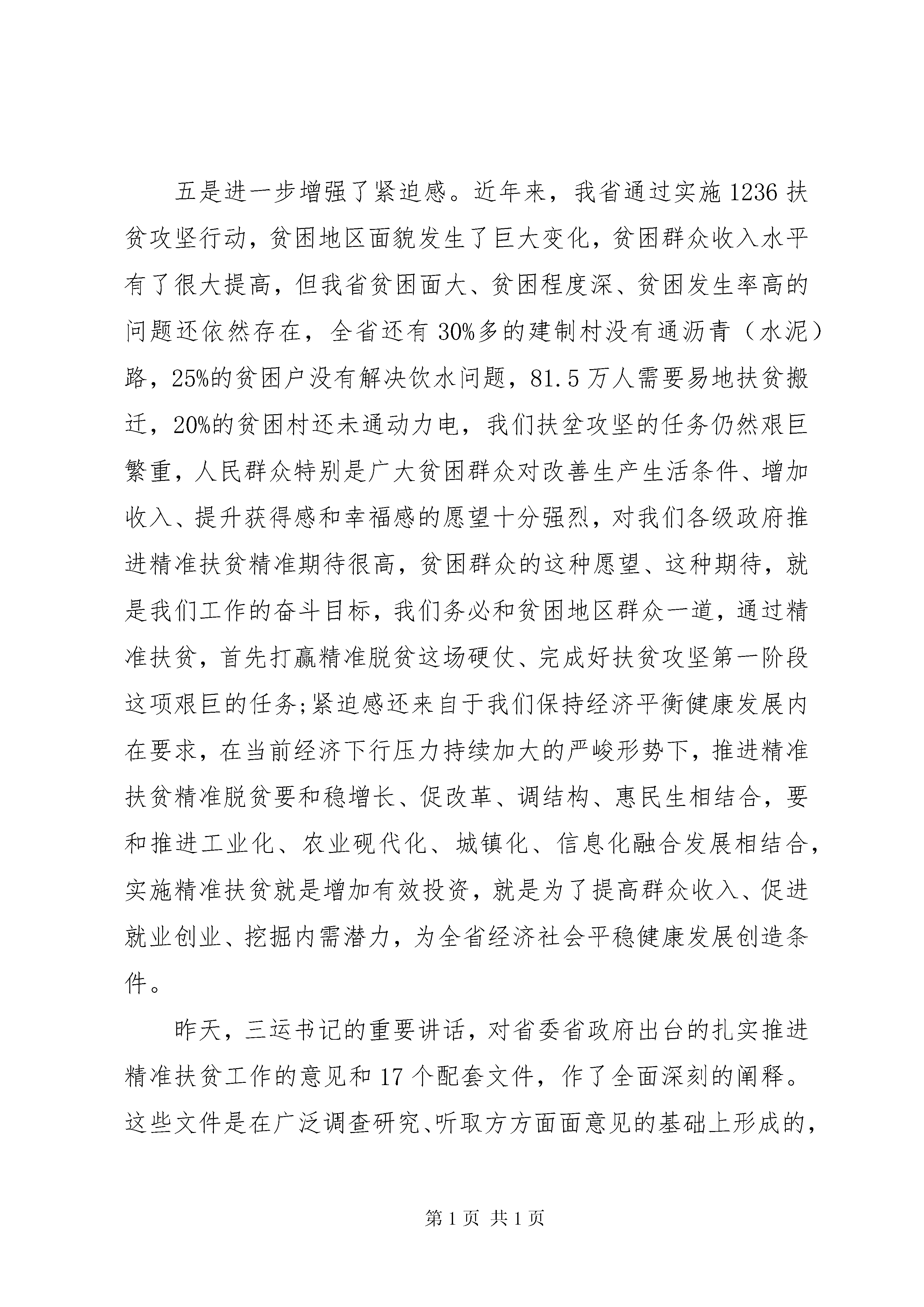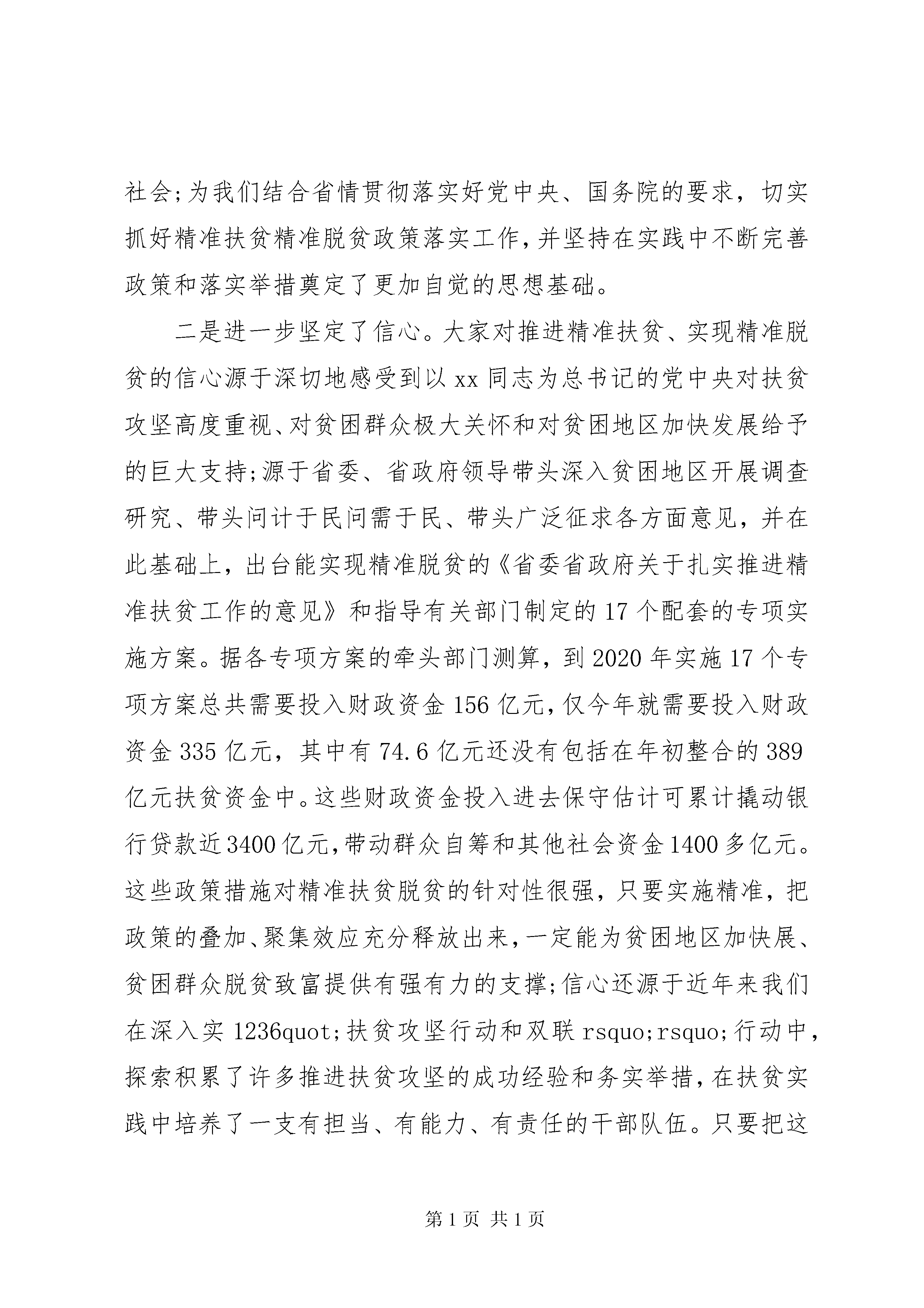 刘伟平精准扶贫调研报告这次全省精准扶贫精准脱贫工作会议,是我省从省情出发,以实际行动落实中央四个全面战略布局的重大举措;是深入贯彻xx总书记扶贫开发战略思想、特别是在陕甘宁革命老区脱贫致富座谈会上的讲话和视察我省时提出的八个着力重要指示的一次再部署;是我们全面系统总结多年扶贫开发成功经验,对1236quot;扶贫攻坚行动和双联行动的一次深化拓展;是动员全省上下坚决打赢精准扶贫精准脱攻坚战和大决战的誓师会。昨天下午会议分组讨论了三运书记和永富主任的重要讲话,昨天晚上又围绕如何贯彻落实省委、省政府《关于扎实推进精准扶贫工作的意见》及17个专项方案进行了讨论,今天上午部分市州和省直有关部门的负责同志作了表态发言,刚才省委、省政府还与市州和省直有关部门签订了责任书。会议取得的成果可以用五个进一步来概括。一是进一步统一了思想。通过学习讨论,大家对总书记所讲的小康不小康关键看老乡、没有贫困地区的小康就没有全面建成小康社会有了更加深刻的理解,增强了做好扶贫开发工作的责任感和使命感;有助于各地各部门更加自觉主动地把工作重点放在精准扶贫精准脱贫上,在到2020年仅剩的几年内,努力缩小我省全面小康进程与全国平均水平的差距,不断提升贫困群众的获得感和幸福感,使贫困群众与全国、全省人民一道进入全面小康社会;为我们结合省情贯彻落实好党中央、国务院的要求,切实抓好精准扶贫精准脱贫政策落实工作,并坚持在实践中不断完善政策和落实举措奠定了更加自觉的思想基础。二是进一步坚定了信心。大家对推进精准扶贫、实现精准脱贫的信心源于深切地感受到以xx同志为总书记的党中央对扶贫攻坚高度重视、对贫困群众极大关怀和对贫困地区加快发展给予的巨大支持;源于省委、省政府领导带头深入贫困地区开展调查研究、带头问计于民问需于民、带头广泛征求各方面意见,并在此基础上,出台能实现精准脱贫的《省委省政府关于扎实推进精准扶贫工作的意见》和指导有关部门制定的17个配套的专项实施方案。据各专项方案的牵头部门测算,到2020年实施17个专项方案总共需要投入财政资金156亿元,仅今年就需要投入财政资金335亿元,其中有74.6亿元还没有包括在年初整合的389亿元扶贫资金中。这些财政资金投入进去保守估计可累计撬动银行贷款近3400亿元,带动群众自筹和其他社会资金1400多亿元。这些政策措施对精准扶贫脱贫的针对性很强,只要实施精准,把政策的叠加、聚集效应充分释放出来,一定能为贫困地区加快展、贫困群众脱贫致富提供有强有力的支撑;信心还源于近年来我们在深入实1236quot;扶贫攻坚行动和双联rsquo;rsquo;行动中,探索积累了许多推进扶贫攻坚的成功经验和务实举措,在扶贫实践中培养了一支有担当、有能力、有责任的干部队伍。只要把这些信心转化为奋力作为的动力,坚信办法总比困难多,一定能夺取脱贫致富加快小康进程的最后胜利。三是进一步理清了思路。通过这次会议,特别是通过学习、讨论、领会三运书记、永富主任的重要讲话和省委省政府出台的《意见》,大家对推进精准扶贫、精准脱贫的主攻方向、着力重点和方法步骤有了更加准确的把握;对如何做到对象精准、目标精准、内容精准、方式精准、考核精准、堡障精准有了更加明晰的工作思路。这为各地各部门因地制宜、分类施策,改革创新、用好政策,有力有序推进精准扶贫、精准脱贫工作明确了工作要求、提供了路线图和时间表。四是进一步靠实了责任。这次会议上,我们不仅以签订责任书的形式,靠实了各市州和省直有关部门推进精准扶贫精准脱贫工作的责任,明确了各地各有关部门的目标任务、时限标准和考核要求,还在《意贝》中明确了实行党政一把手扶贫责任制,市县两级党政主要领导为扶贫开发第一责任人,并创新考核机制,进一步确定县级主体责任,以及各地实施精确扶贫、精准脱贫的考核验收责任和督促检查责任。这种层级传导的责任机制的建立,有助于在全省形成比减贫成效、比贫困群众增收、比及早摘去贫困县帽子的氛围;有助于我们形成推进精准扶贫、精准脱贫的工作合力,真正把各项政策措施落实到户到人,发挥应有效应,确保按时间节点实现各项目标任务。五是进一步增强了紧迫感。近年来,我省通过实施1236扶贫攻坚行动,贫困地区面貌发生了巨大变化,贫困群众收入水平有了很大提高,但我省贫困面大、贫困程度深、贫困发生率高的问题还依然存在,全省还有30%多的建制村没有通沥青(水泥)路,25%的贫困户没有解决饮水问题,81.5万人需要易地扶贫搬迁,20%的贫困村还未通动力电,我们扶坌攻坚的任务仍然艰巨繁重,人民群众特别是广大贫困群众对改善生产生活条件、增加收入、提升获得感和幸福感的愿望十分强烈,对我们各级政府推进精准扶贫精准期待很高,贫困群众的这种愿望、这种期待,就是我们工作的奋斗目标,我们务必和贫困地区群众一道,通过精准扶贫,首先打赢精准脱