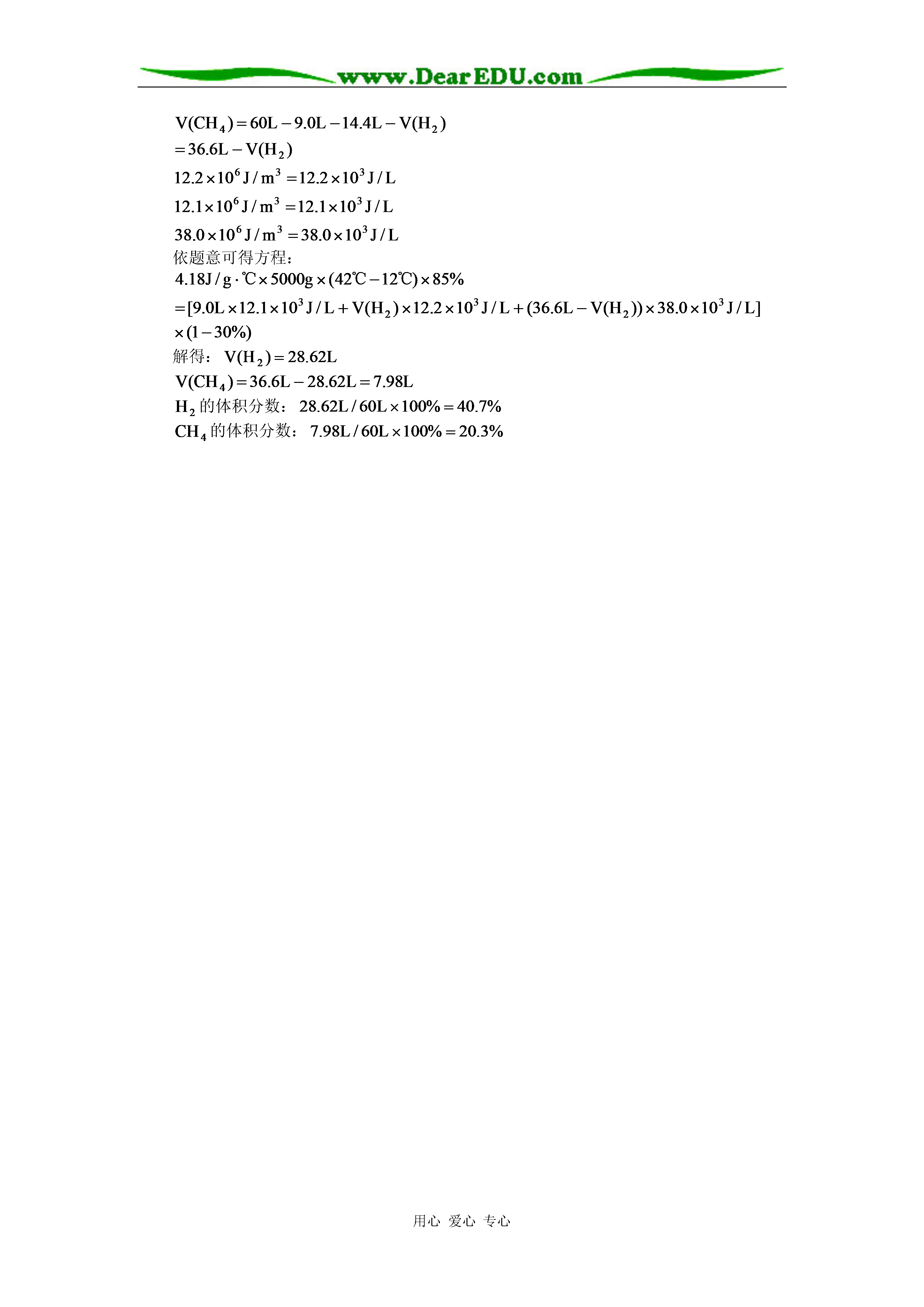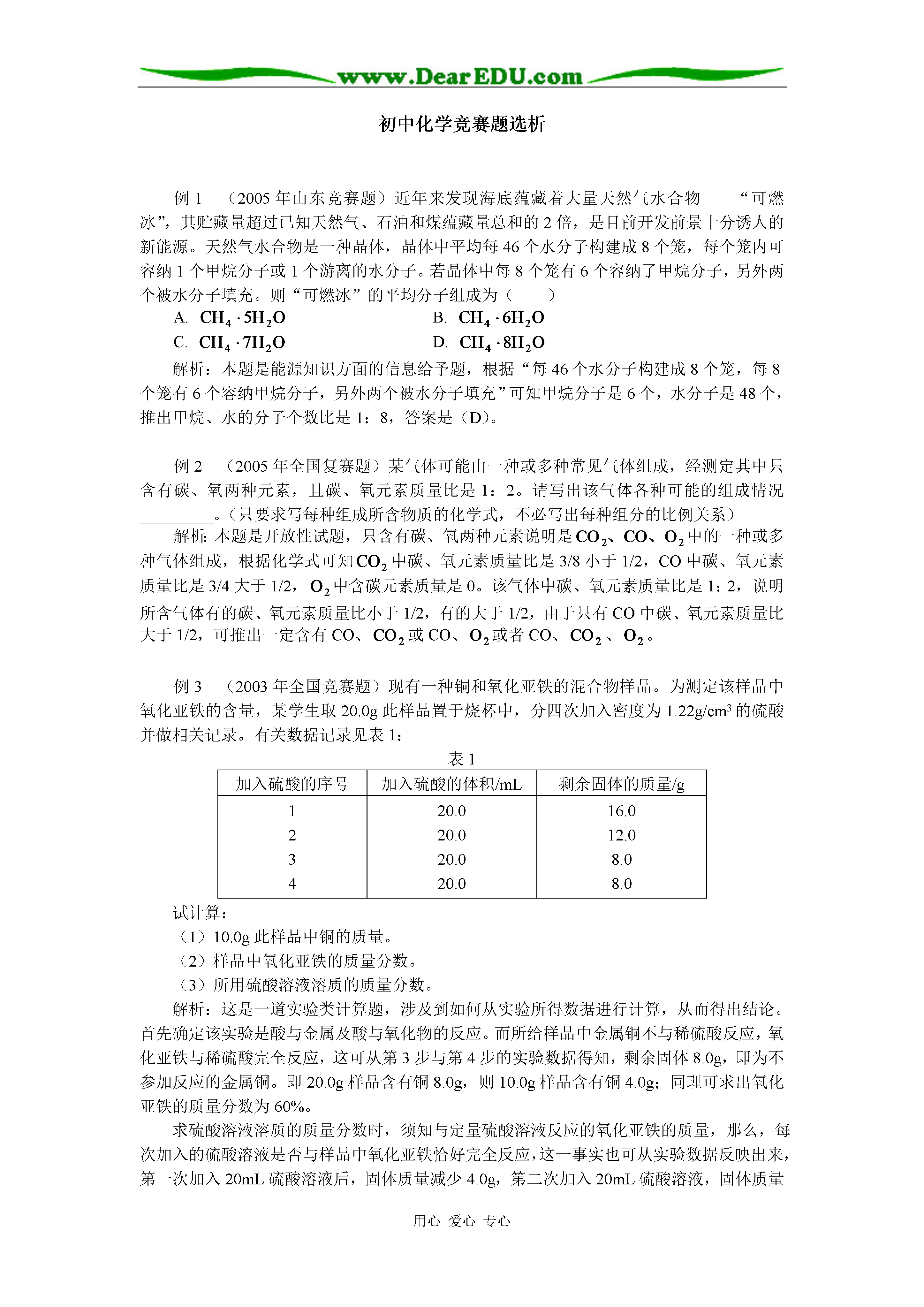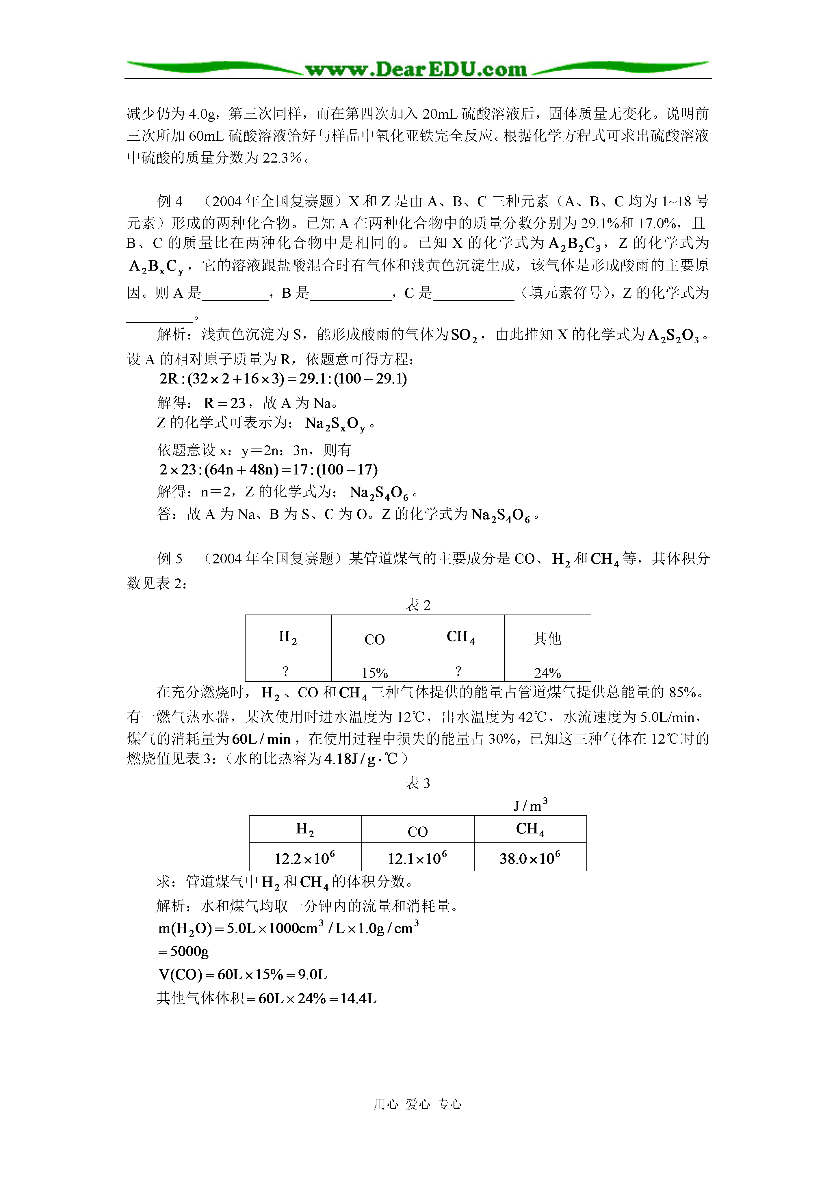 用心爱心专心初中化学竞赛题选析例1(2005年山东竞赛题)近年来发现海底蕴藏着大量天然气水合物——“可燃冰”,其贮藏量超过已知天然气、石油和煤蕴藏量总和的2倍,是目前开发前景十分诱人的新能源。天然气水合物是一种晶体,晶体中平均每46个水分子构建成8个笼,每个笼内可容纳1个甲烷分子或1个游离的水分子。若晶体中每8个笼有6个容纳了甲烷分子,另外两个被水分子填充。则“可燃冰”的平均分子组成为()A.B.C.D.解析:本题是能源知识方面的信息给予题,根据“每46个水分子构建成8个笼,每8个笼有6个容纳甲烷分子,另外两个被水分子填充”可知甲烷分子是6个,水分子是48个,推出甲烷、水的分子个数比是1:8,答案是(D)。例2(2005年全国复赛题)某气体可能由一种或多种常见气体组成,经测定其中只含有碳、氧两种元素,且碳、氧元素质量比是1:2。请写出该气体各种可能的组成情况_________。(只要求写每种组成所含物质的化学式,不必写出每种组分的比例关系)解析:本题是开放性试题,只含有碳、氧两种元素说明是中的一种或多种气体组成,根据化学式可知中碳、氧元素质量比是3/8小于1/2,CO中碳、氧元素质量比是3/4大于1/2,中含碳元素质量是0。该气体中碳、氧元素质量比是1:2,说明所含气体有的碳、氧元素质量比小于1/2,有的大于1/2,由于只有CO中碳、氧元素质量比大于1/2,可推出一定含有CO、或CO、或者CO、、。例3(2003年全国竞赛题)现有一种铜和氧化亚铁的混合物样品。为测定该样品中氧化亚铁的含量,某学生取20.0g此样品置于烧杯中,分四次加入密度为1.22g/cm3的硫酸并做相关记录。有关数据记录见表1:表1加入硫酸的序号加入硫酸的体积/mL剩余固体的质量/g123420.020.020.020.016.012.08.08.0试计算:(1)10.0g此样品中铜的质量。(2)样品中氧化亚铁的质量分数。(3)所用硫酸溶液溶质的质量分数。解析:这是一道实验类计算题,涉及到如何从实验所得数据进行计算,从而得出结论。首先确定该实验是酸与金属及酸与氧化物的反应。而所给样品中金属铜不与稀硫酸反应,氧化亚铁与稀硫酸完全反应,这可从第3步与第4步的实验数据得知,剩余固体8.0g,即为不参加反应的金属铜。即20.0g样品含有铜8.0g,则10.0g样品含有铜4.0g;同理可求出氧化亚铁的质量分数为60%。求硫酸溶液溶质的质量分数时,须知与定量硫酸溶液反应的氧化亚铁的质量,那么,每次加入的硫酸溶液是否与样品中氧化亚铁恰好完全反应,这一事实也可从实验数据反映出来,第一次加入20mL硫酸溶液后,固体质量减少4.0g,第二次加入20mL硫酸溶液,固体质量减少仍为4.0g,第三次同样,而在第四次加入20mL硫酸溶液后,固体质量无变化。说明前三次所加60mL硫酸溶液恰好与样品中氧化亚铁完全反应。根据化学方程式可求出硫酸溶液中硫酸的质量分数为22.3%。例4(2004年全国复赛题)X和Z是由A、B、C三种元素(A、B、C均为1~18号元素)形成的两种化合物。已知A在两种化合物中的质量分数分别为29.1%和17.0%,且B、C的质量比在两种化合物中是相同的。已知X的化学式为,Z的化学式为,它的溶液跟盐酸混合时有气体和浅黄色沉淀生成,该气体是形成酸雨的主要原因。则A是_________,B是___________,C是___________(填元素符号),Z的化学式为_________。解析:浅黄色沉淀为S,能形成酸雨的气体为,由此推知X的化学式为。设A的相对原子质量为R,依题意可得方程:解得:,故A为Na。Z的化学式可表示为:。依题意设x:y=2n:3n,则有解得:n=2,Z的化学式为:。答:故A为Na、B为S、C为O。Z的化学式为。例5(2004年全国复赛题)某管道煤气的主要成分是CO、和等,其体积分数见表2:表2CO其他?15%?24%在充分燃烧时,、CO和三种气体提供的能量占管道煤气提供总能量的85%。有一燃气热水器,某次使用时进水温度为12℃,出水温度为42℃,水流速度为5.0L/min,煤气的消耗量为,在使用过程中损失的能量占30%,已知这三种气体在12℃时的燃烧值见表3:(水的比热容为)表3CO求:管道煤气中和的体积分数。解析:水和煤气均取一分钟内的流量和消耗量。其他气体体积依题意可得方程:解得:的体积分数:的体积分数: