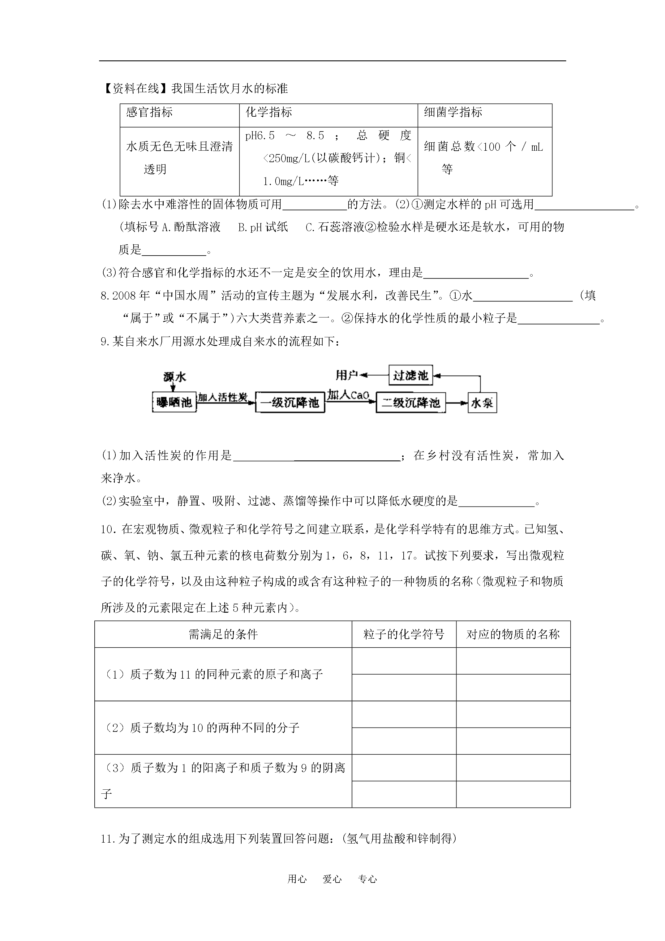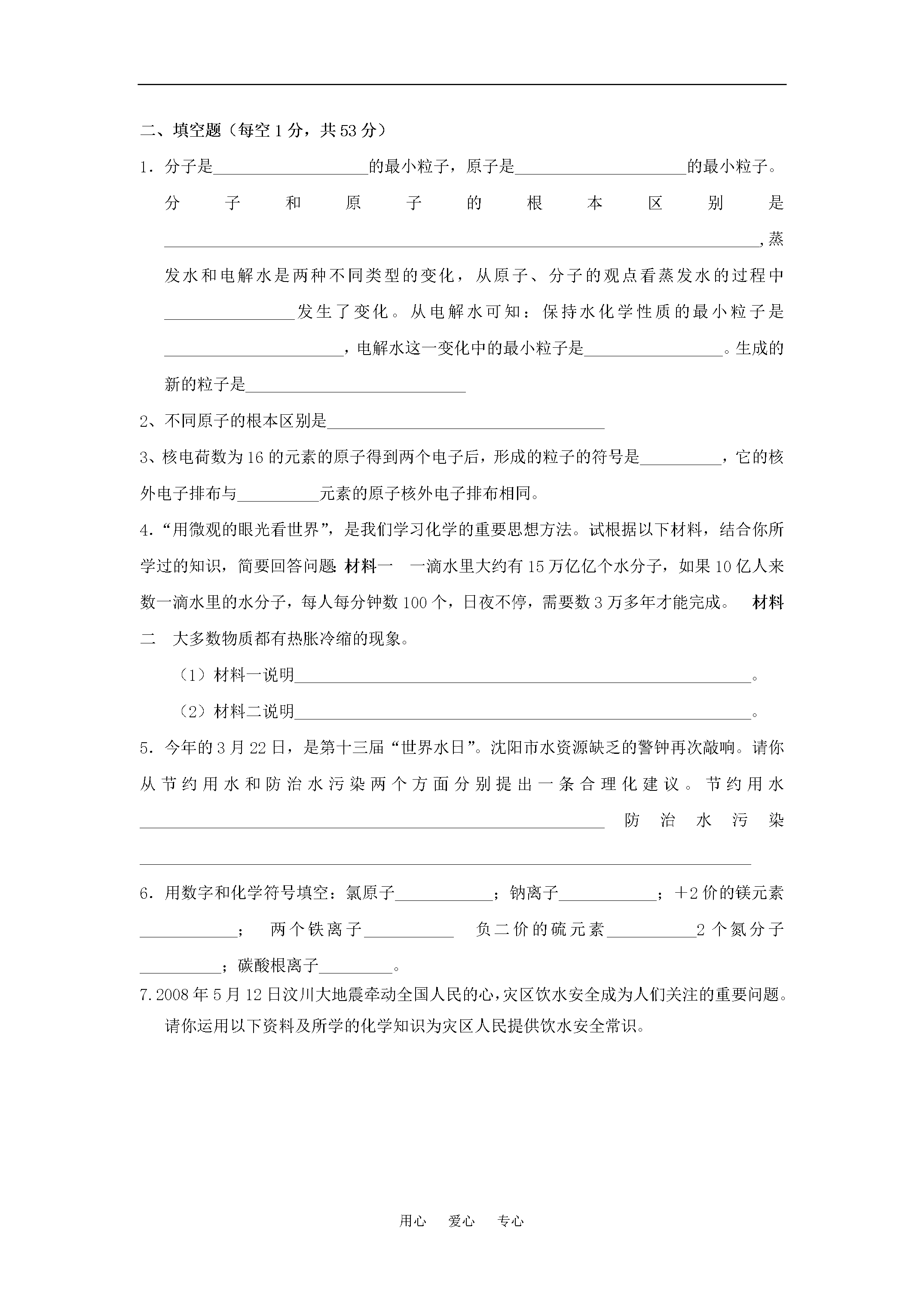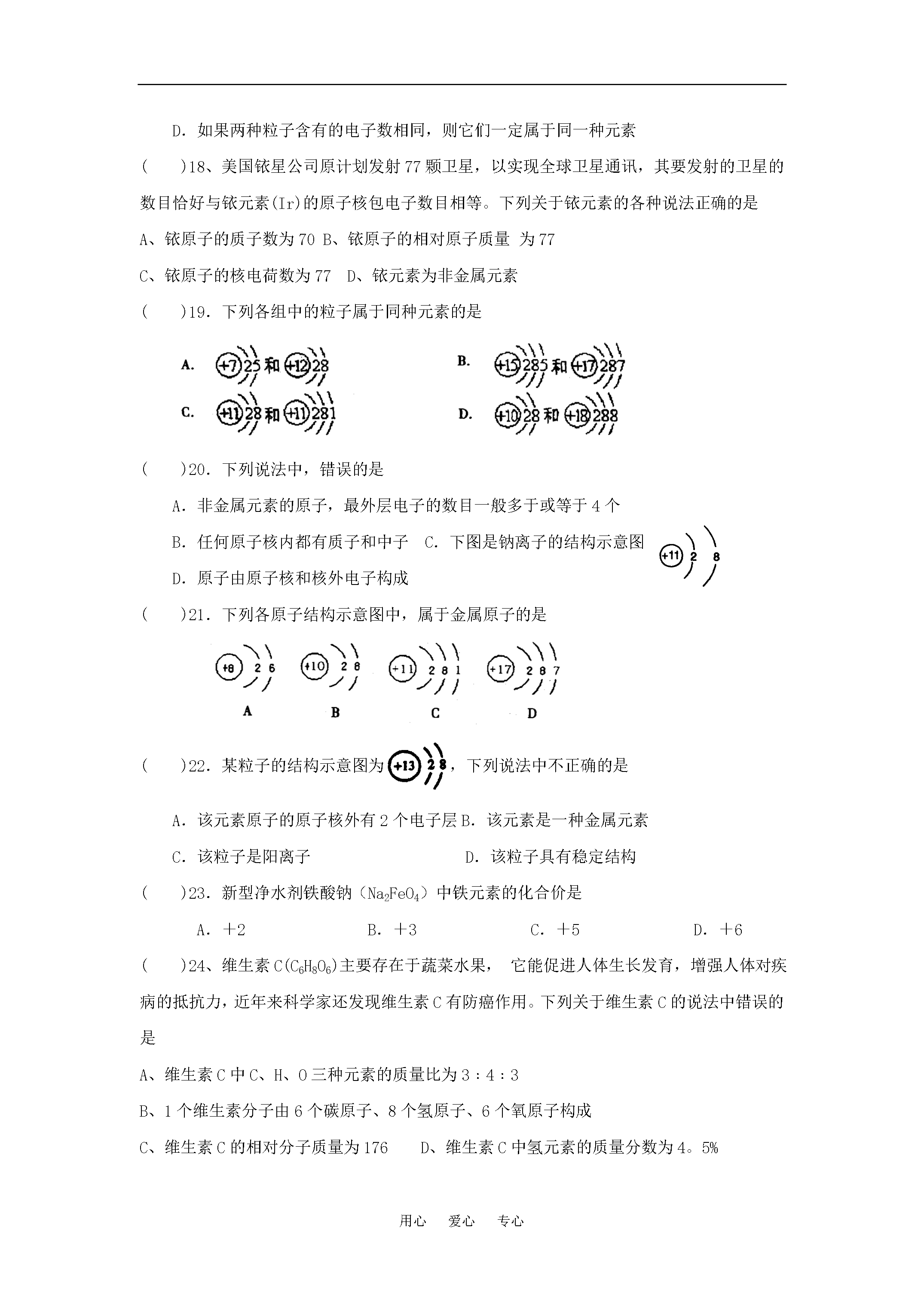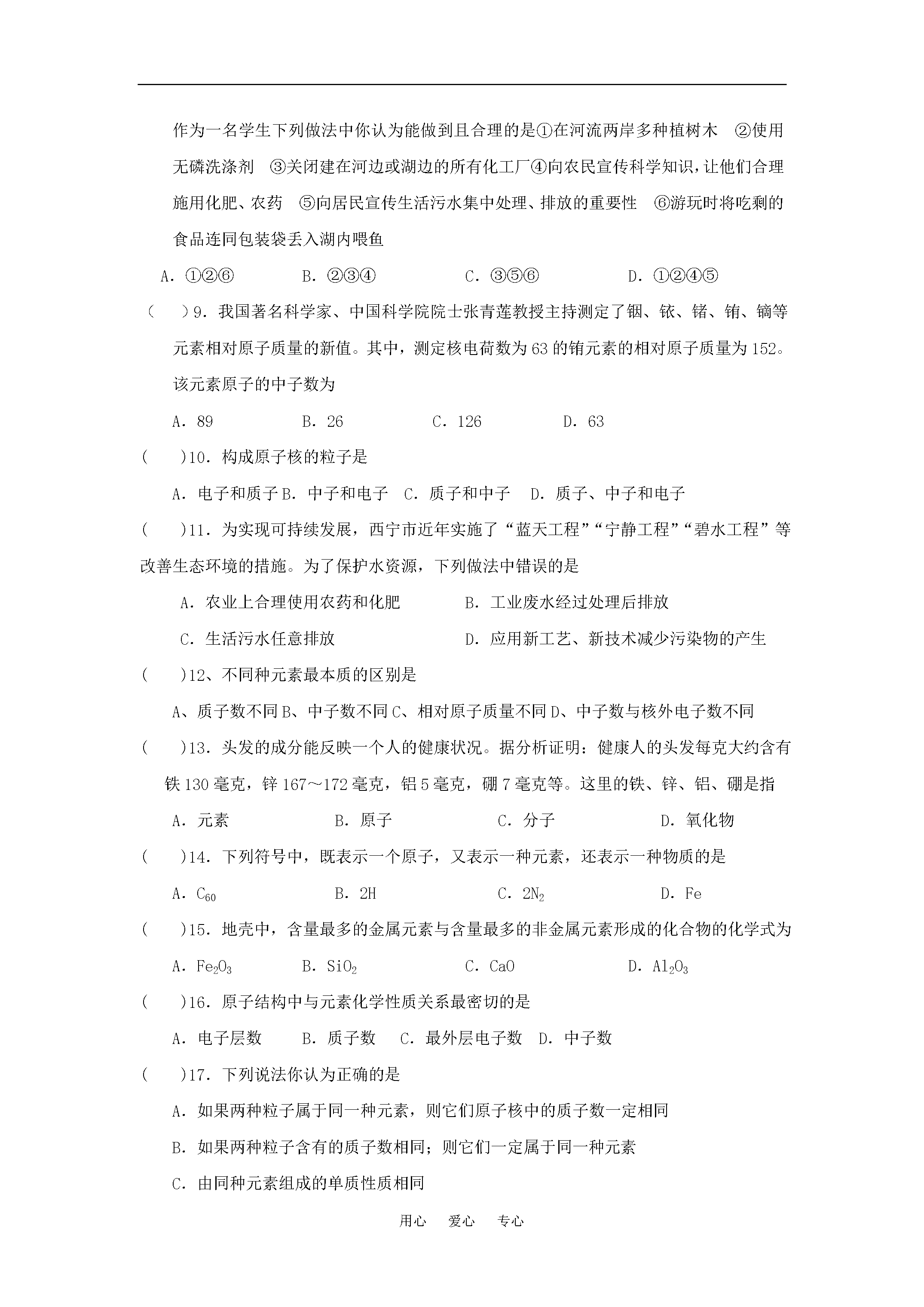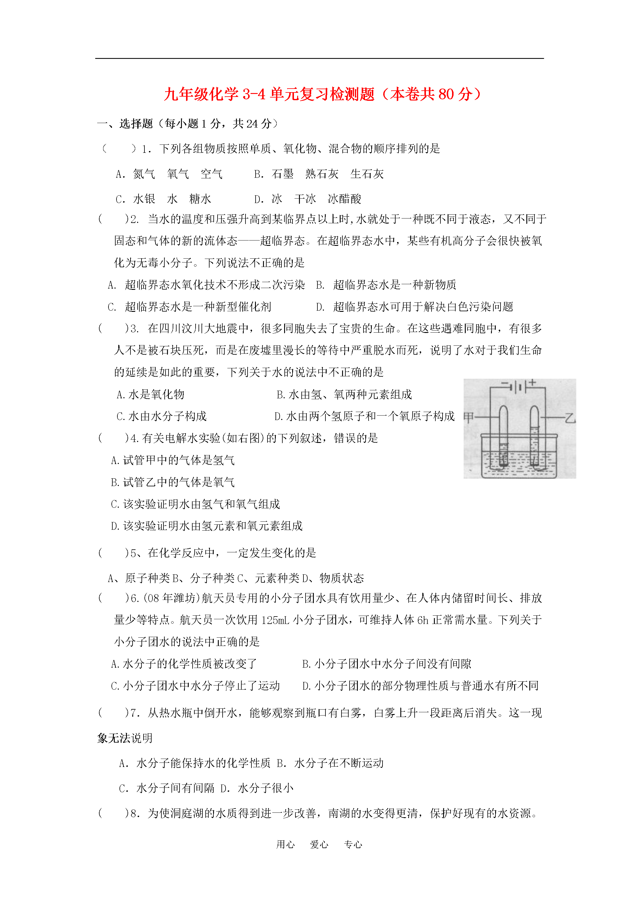 用心爱心专心九年级化学3-4单元复习检测题(本卷共80分)一、选择题(每小题1分,共24分)()1.下列各组物质按照单质、氧化物、混合物的顺序排列的是A.氮气氧气空气B.石墨熟石灰生石灰C.水银水糖水D.冰干冰冰醋酸()2.当水的温度和压强升高到某临界点以上时,水就处于一种既不同于液态,又不同于固态和气体的新的流体态——超临界态。在超临界态水中,某些有机高分子会很快被氧化为无毒小分子。下列说法不正确的是A.超临界态水氧化技术不形成二次污染B.超临界态水是一种新物质C.超临界态水是一种新型催化剂D.超临界态水可用于解决白色污染问题()3.在四川汶川大地震中,很多同胞失去了宝贵的生命。在这些遇难同胞中,有很多人不是被石块压死,而是在废墟里漫长的等待中严重脱水而死,说明了水对于我们生命的延续是如此的重要,下列关于水的说法中不正确的是A.水是氧化物B.水由氢、氧两种元素组成C.水由水分子构成D.水由两个氢原子和一个氧原子构成()4.有关电解水实验(如右图)的下列叙述,错误的是A.试管甲中的气体是氢气B.试管乙中的气体是氧气C.该实验证明水由氢气和氧气组成D.该实验证明水由氢元素和氧元素组成()5、在化学反应中,一定发生变化的是A、原子种类B、分子种类C、元素种类D、物质状态()6.(08年潍坊)航天员专用的小分子团水具有饮用量少、在人体内储留时间长、排放量少等特点。航天员一次饮用125mL小分子团水,可维持人体6h正常需水量。下列关于小分子团水的说法中正确的是A.水分子的化学性质被改变了B.小分子团水中水分子间没有间隙C.小分子团水中水分子停止了运动D.小分子团水的部分物理性质与普通水有所不同()7.从热水瓶中倒开水,能够观察到瓶口有白雾,白雾上升一段距离后消失。这一现象无法说明A.水分子能保持水的化学性质B.水分子在不断运动C.水分子间有间隔D.水分子很小()8.为使洞庭湖的水质得到进一步改善,南湖的水变得更清,保护好现有的水资源。作为一名学生下列做法中你认为能做到且合理的是①在河流两岸多种植树木②使用无磷洗涤剂③关闭建在河边或湖边的所有化工厂④向农民宣传科学知识,让他们合理施用化肥、农药⑤向居民宣传生活污水集中处理、排放的重要性⑥游玩时将吃剩的食品连同包装袋丢入湖内喂鱼A.①②⑥B.②③④C.③⑤⑥D.①②④⑤()9.我国著名科学家、中国科学院院士张青莲教授主持测定了铟、铱、锗、铕、镝等元素相对原子质量的新值。其中,测定核电荷数为63的铕元素的相对原子质量为152。该元素原子的中子数为A.89B.26C.126D.63()10.构成原子核的粒子是A.电子和质子B.中子和电子C.质子和中子D.质子、中子和电子()11.为实现可持续发展,西宁市近年实施了“蓝天工程”“宁静工程”“碧水工程”等改善生态环境的措施。为了保护水资源,下列做法中错误的是A.农业上合理使用农药和化肥B.工业废水经过处理后排放C.生活污水任意排放D.应用新工艺、新技术减少污染物的产生()12、不同种元素最本质的区别是A、质子数不同B、中子数不同C、相对原子质量不同D、中子数与核外电子数不同()13.头发的成分能反映一个人的健康状况。据分析证明:健康人的头发每克大约含有铁130毫克,锌167~172毫克,铝5毫克,硼7毫克等。这里的铁、锌、铝、硼是指A.元素B.原子C.分子D.氧化物()14.下列符号中,既表示一个原子,又表示一种元素,还表示一种物质的是A.C60B.2HC.2N2D.Fe()15.地壳中,含量最多的金属元素与含量最多的非金属元素形成的化合物的化学式为A.Fe2O3B.SiO2C.CaOD.Al2O3()16.原子结构中与元素化学性质关系最密切的是A.电子层数B.质子数C.最外层电子数D.中子数()17.下列说法你认为正确的是A.如果两种粒子属于同一种元素,则它们原子核中的质子数一定相同B.如果两种粒子含有的质子数相同;则它们一定属于同一种元素C.由同种元素组成的单质性质相同D.如果两种粒子含有的电子数相同,则它们一定属于同一种元素()18、美国铱星公司原计划发射77颗卫星,以实现全球卫星通讯,其要发射的卫星的数目恰好与铱元素(Ir)的原子核包电子数目相等。下列关于铱元素的各种说法正确的是A、铱原子的质子数为70B、铱原子的相对原子质量为77C、铱原子的核电荷数为77D、铱元素为非金属元素()19.下列各组中的粒子属于同种元素的是()20.下列说法中,错误的是A.非金属元素的原子,最外层电子的数目一般多于或等于4个B.任何原子核内都有质子和中子C.下图是钠离子的结构示意图D.原子由原子核和核外电子构成()21.下列各原子结构示意图中,属于金属原子的是()22.某粒子的结构示意图为,下列说法中不正确的是A.该元素原子的原子核外有2个电子层B.该元素是一