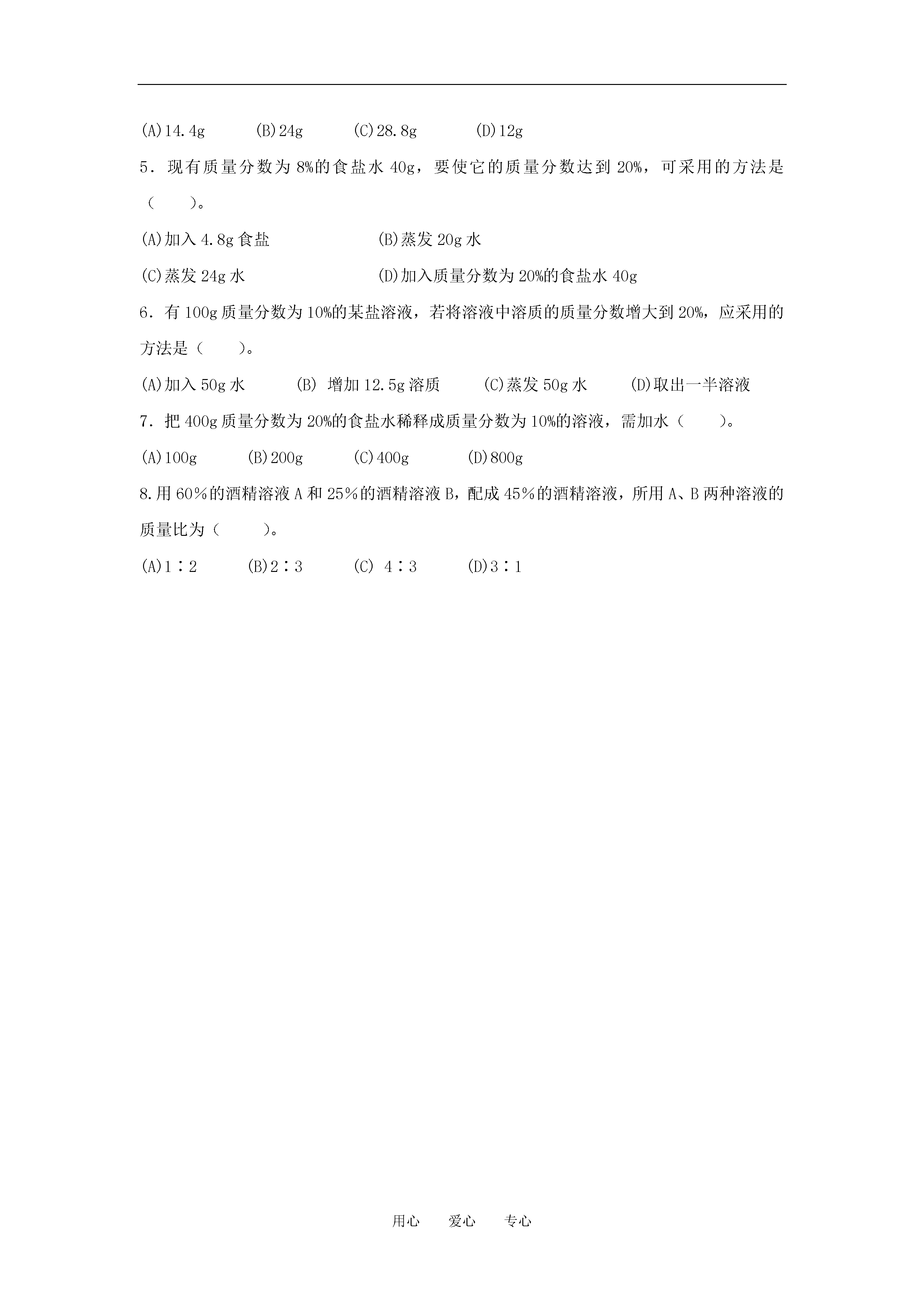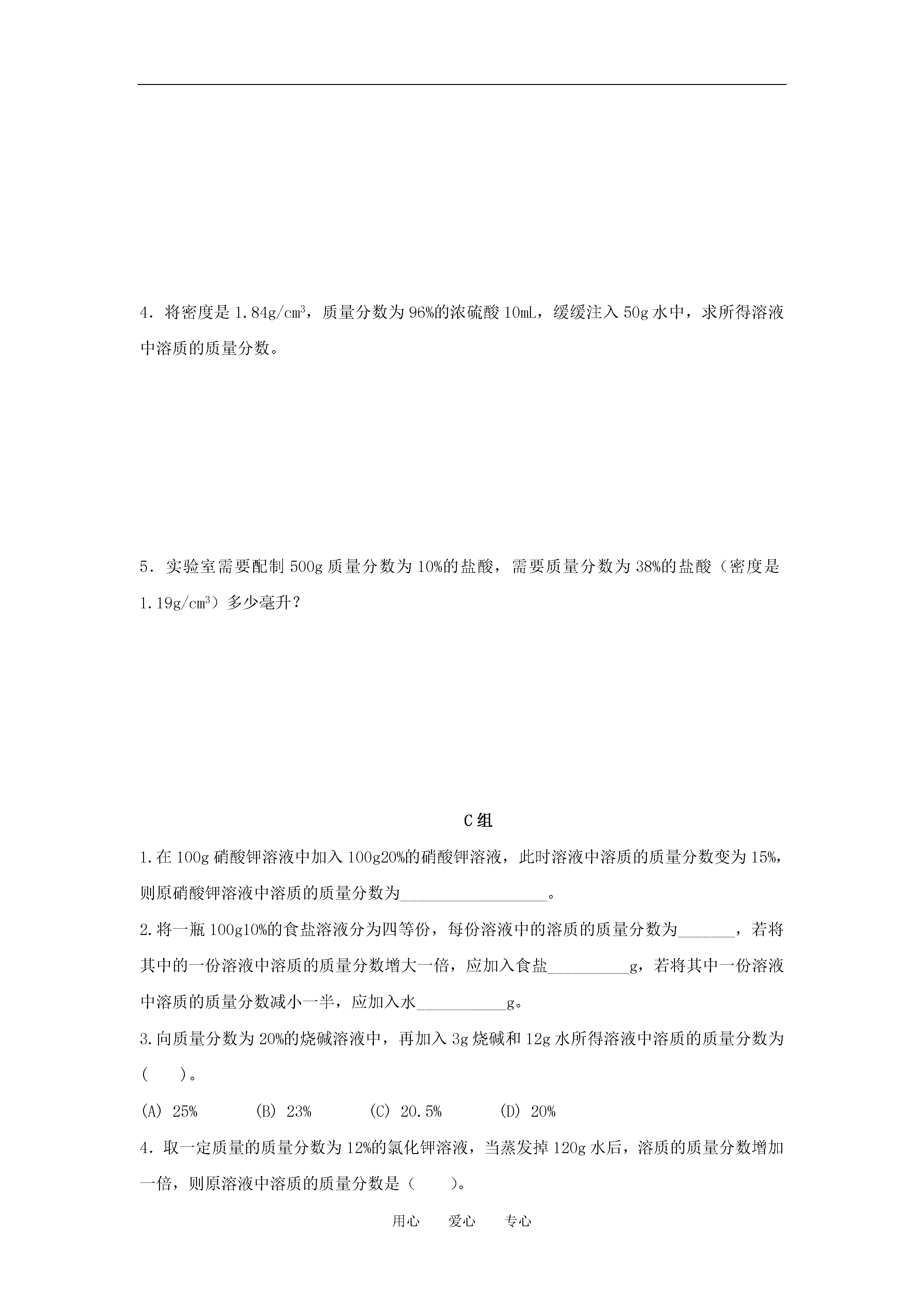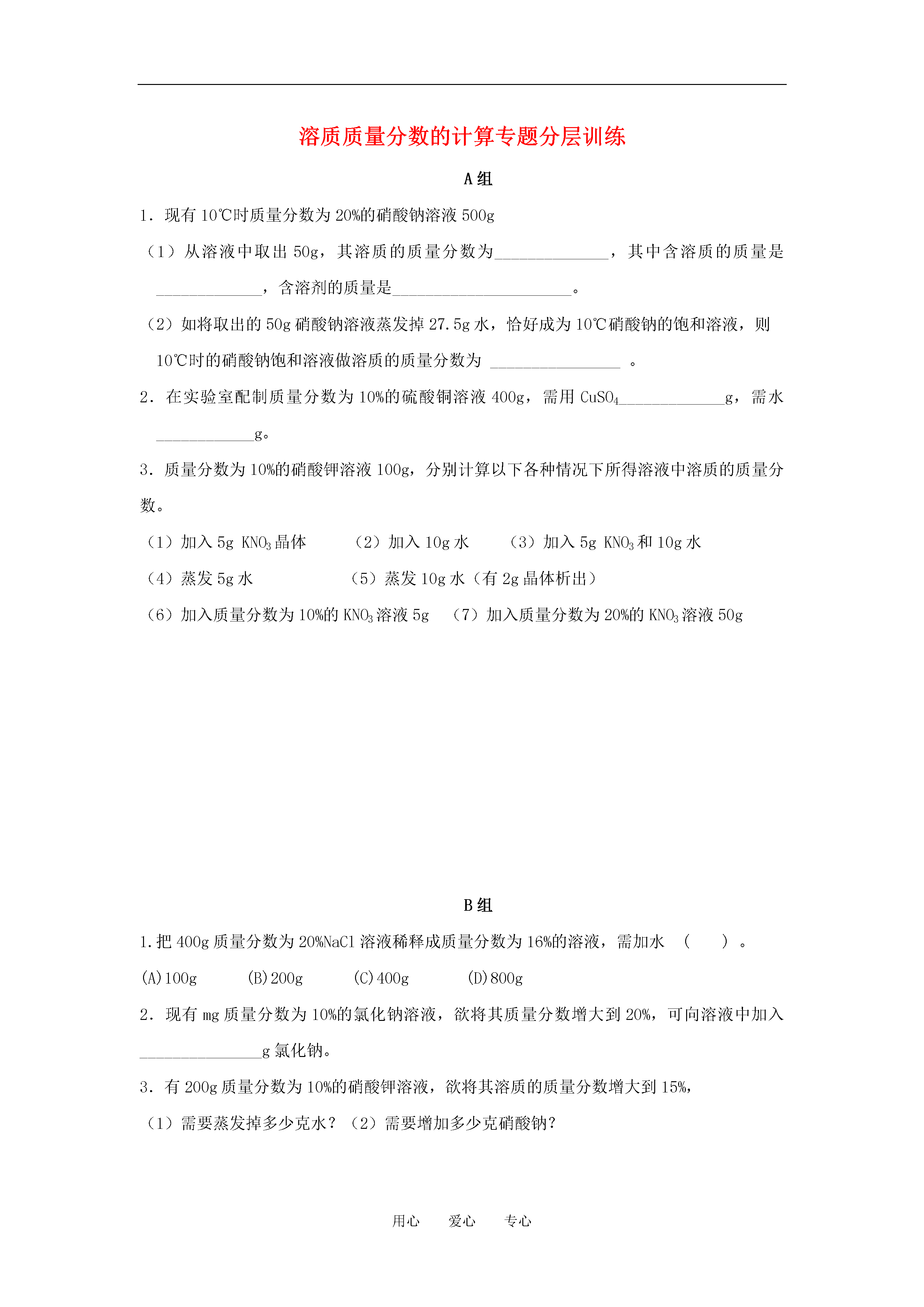 用心爱心专心溶质质量分数的计算专题分层训练A组1.现有10℃时质量分数为20%的硝酸钠溶液500g(1)从溶液中取出50g,其溶质的质量分数为______________,其中含溶质的质量是_____________,含溶剂的质量是______________________。(2)如将取出的50g硝酸钠溶液蒸发掉27.5g水,恰好成为10℃硝酸钠的饱和溶液,则10℃时的硝酸钠饱和溶液做溶质的质量分数为________________。2.在实验室配制质量分数为10%的硫酸铜溶液400g,需用CuSO4_____________g,需水____________g。3.质量分数为10%的硝酸钾溶液100g,分别计算以下各种情况下所得溶液中溶质的质量分数。(1)加入5gKNO3晶体(2)加入10g水(3)加入5gKNO3和10g水(4)蒸发5g水(5)蒸发10g水(有2g晶体析出)(6)加入质量分数为10%的KNO3溶液5g(7)加入质量分数为20%的KNO3溶液50gB组1.把400g质量分数为20%NaCl溶液稀释成质量分数为16%的溶液,需加水()。(A)100g(B)200g(C)400g(D)800g2.现有mg质量分数为10%的氯化钠溶液,欲将其质量分数增大到20%,可向溶液中加入_______________g氯化钠。3.有200g质量分数为10%的硝酸钾溶液,欲将其溶质的质量分数增大到15%,(1)需要蒸发掉多少克水?(2)需要增加多少克硝酸钠?4.将密度是1.84g/cm3,质量分数为96%的浓硫酸10mL,缓缓注入50g水中,求所得溶液中溶质的质量分数。5.实验室需要配制500g质量分数为10%的盐酸,需要质量分数为38%的盐酸(密度是1.19g/cm3)多少毫升?C组1.在100g硝酸钾溶液中加入100g20%的硝酸钾溶液,此时溶液中溶质的质量分数变为15%,则原硝酸钾溶液中溶质的质量分数为__________________。2.将一瓶100g10%的食盐溶液分为四等份,每份溶液中的溶质的质量分数为_______,若将其中的一份溶液中溶质的质量分数增大一倍,应加入食盐__________g,若将其中一份溶液中溶质的质量分数减小一半,应加入水___________g。3.向质量分数为20%的烧碱溶液中,再加入3g烧碱和12g水所得溶液中溶质的质量分数为()。(A)25%(B)23%(C)20.5%(D)20%4.取一定质量的质量分数为12%的氯化钾溶液,当蒸发掉120g水后,溶质的质量分数增加一倍,则原溶液中溶质的质量分数是()。(A)14.4g(B)24g(C)28.8g(D)12g5.现有质量分数为8%的食盐水40g,要使它的质量分数达到20%,可采用的方法是()。(A)加入4.8g食盐(B)蒸发20g水(C)蒸发24g水(D)加入质量分数为20%的食盐水40g6.有100g质量分数为10%的某盐溶液,若将溶液中溶质的质量分数增大到20%,应采用的方法是()。(A)加入50g水(B)增加12.5g溶质(C)蒸发50g水(D)取出一半溶液7.把400g质量分数为20%的食盐水稀释成质量分数为10%的溶液,需加水()。(A)100g(B)200g(C)400g(D)800g8.用60%的酒精溶液A和25%的酒精溶液B,配成45%的酒精溶液,所用A、B两种溶液的质量比为()。(A)1∶2(B)2∶3(C)4∶3(D)3∶1