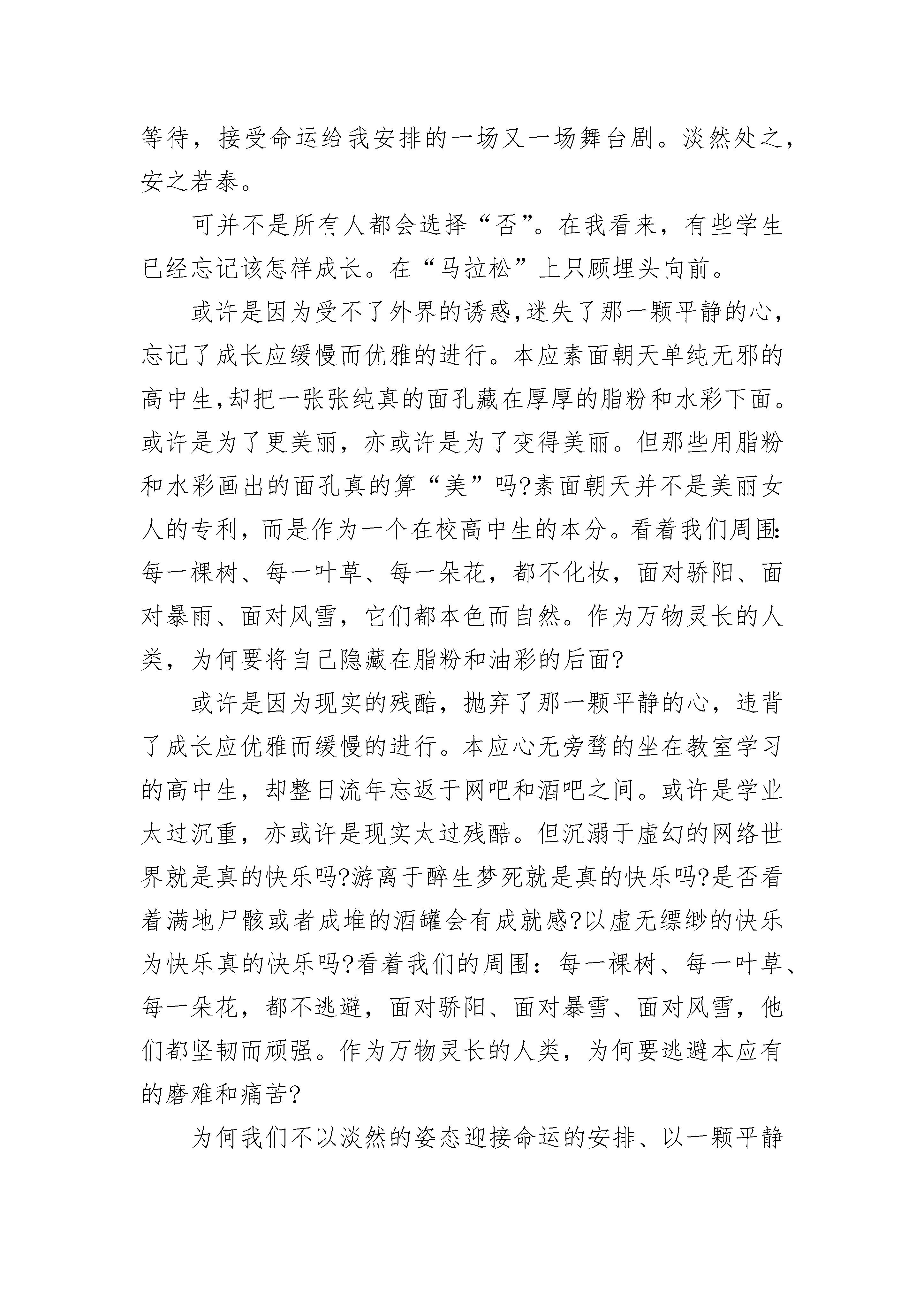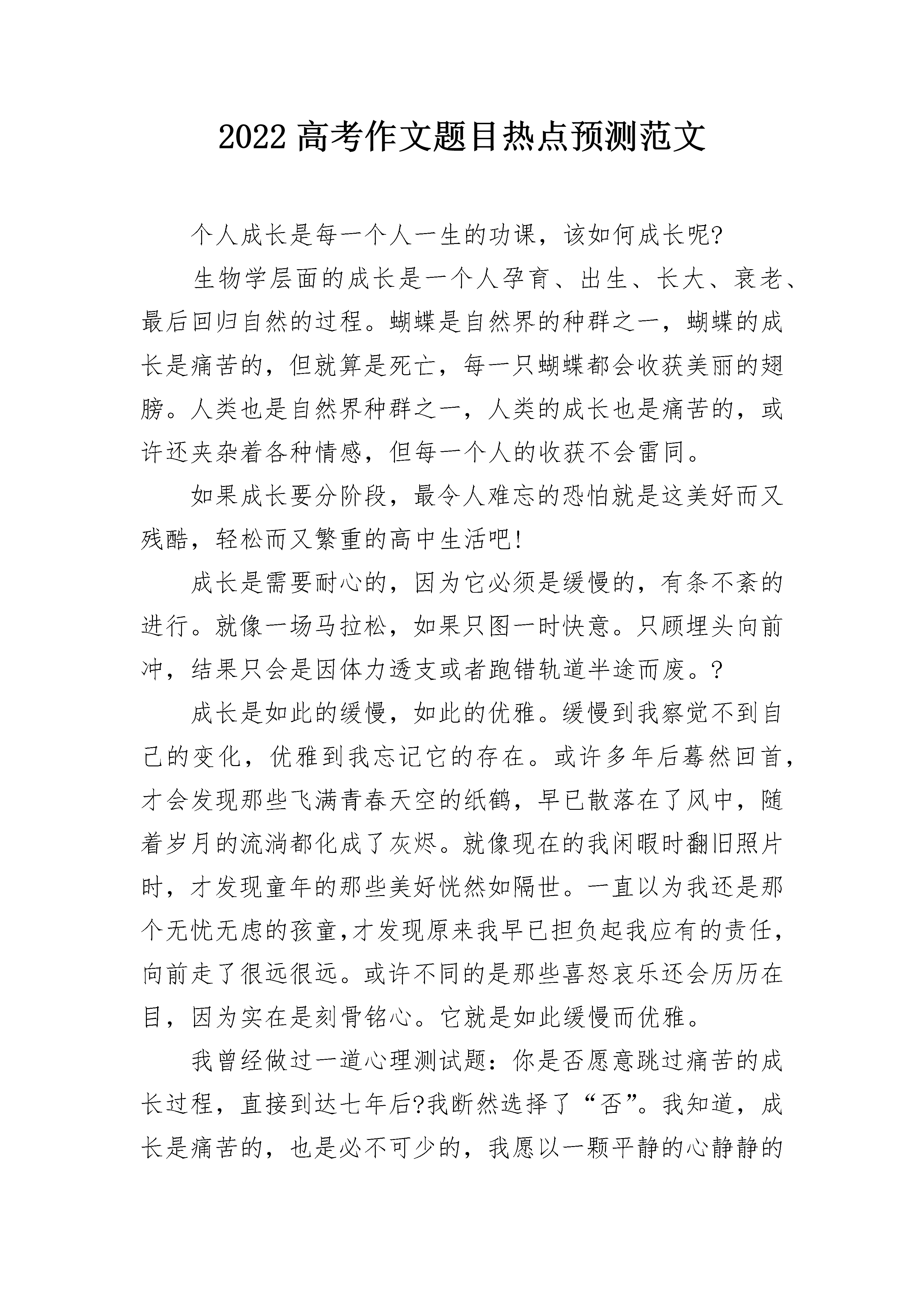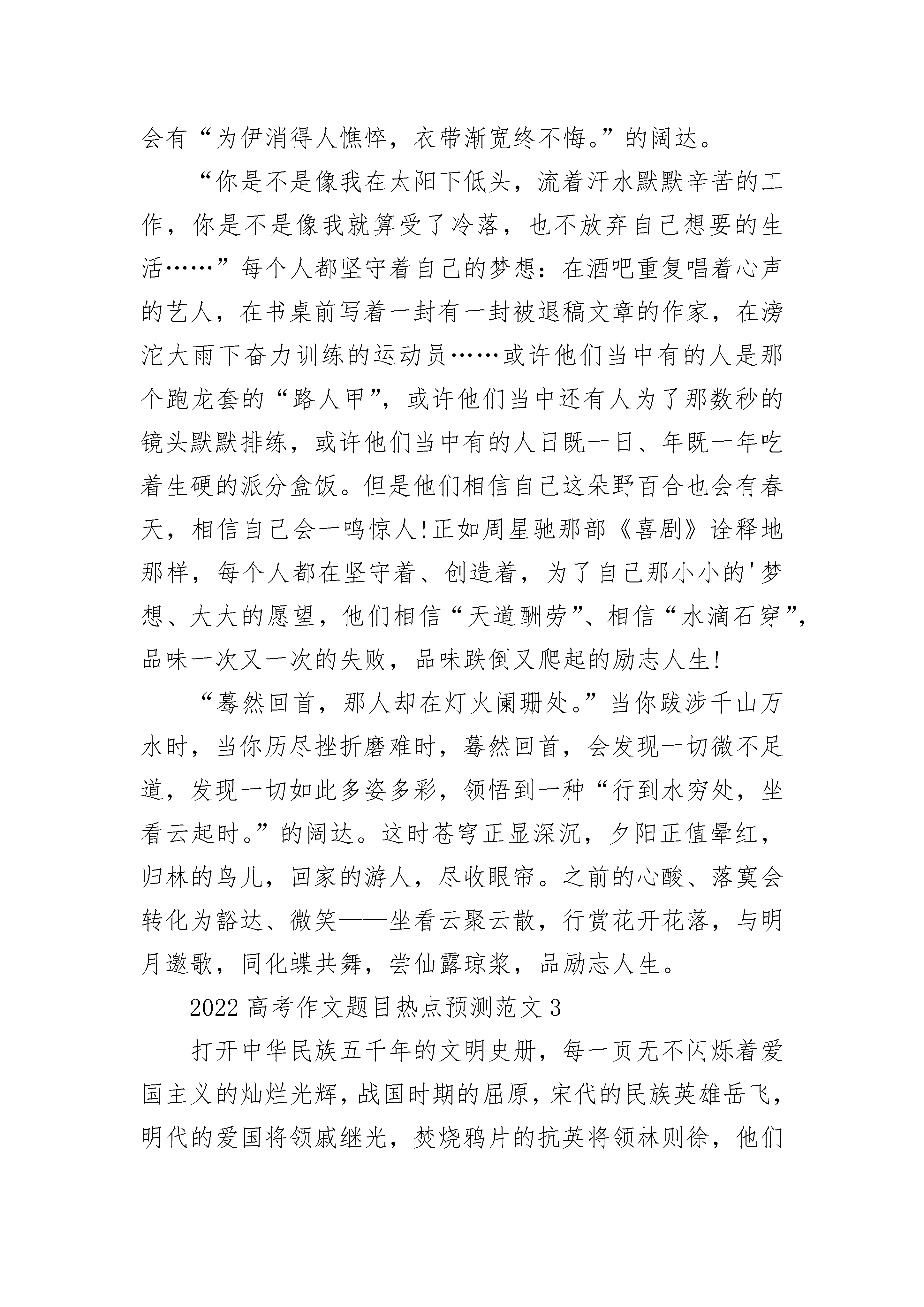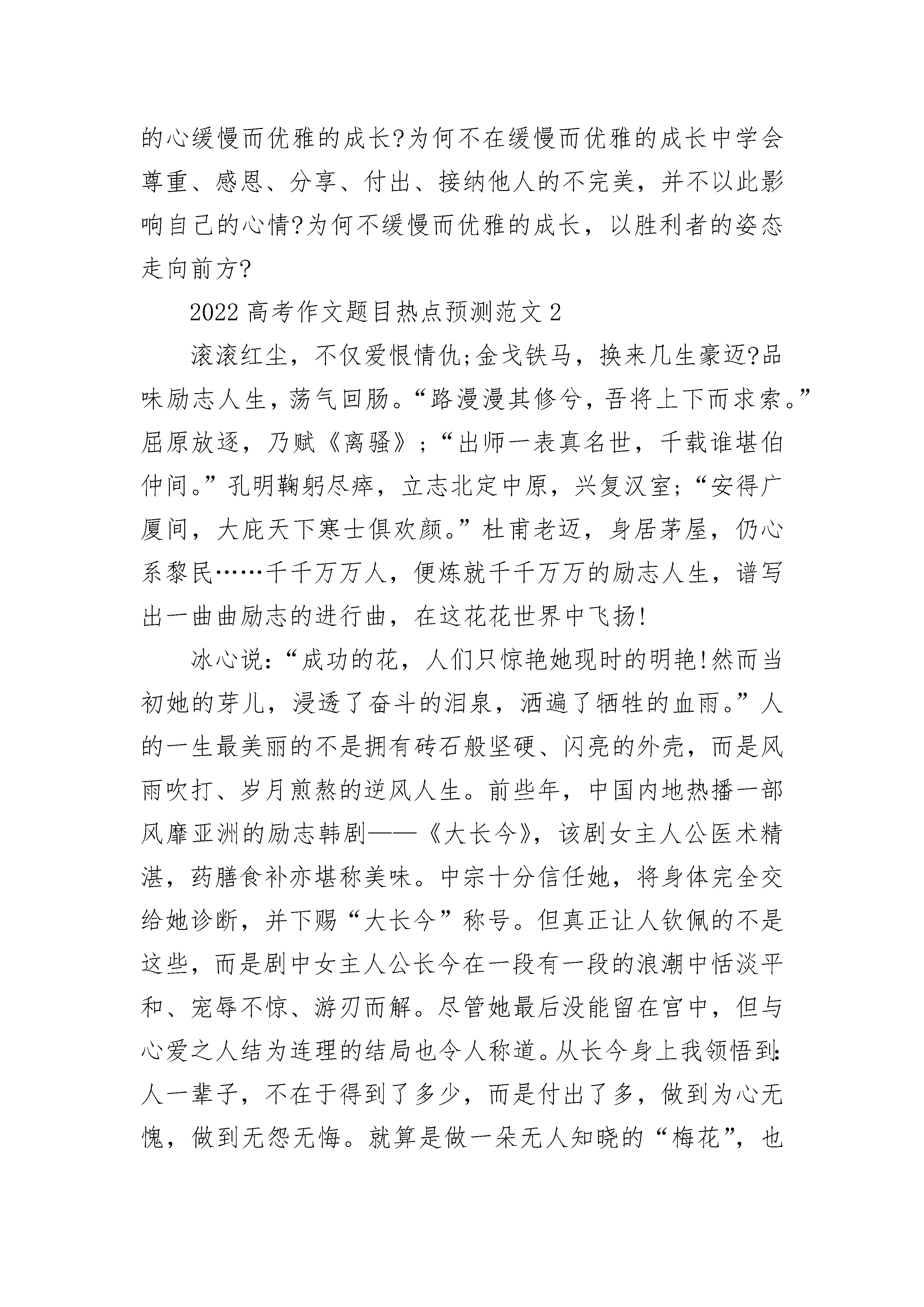 2022高考作文题目热点预测范文个人成长是每一个人一生的功课,该如何成长呢?生物学层面的成长是一个人孕育、出生、长大、衰老、最后回归自然的过程。蝴蝶是自然界的种群之一,蝴蝶的成长是痛苦的,但就算是死亡,每一只蝴蝶都会收获美丽的翅膀。人类也是自然界种群之一,人类的成长也是痛苦的,或许还夹杂着各种情感,但每一个人的收获不会雷同。如果成长要分阶段,最令人难忘的恐怕就是这美好而又残酷,轻松而又繁重的高中生活吧!成长是需要耐心的,因为它必须是缓慢的,有条不紊的进行。就像一场马拉松,如果只图一时快意。只顾埋头向前冲,结果只会是因体力透支或者跑错轨道半途而废。?成长是如此的缓慢,如此的优雅。缓慢到我察觉不到自己的变化,优雅到我忘记它的存在。或许多年后蓦然回首,才会发现那些飞满青春天空的纸鹤,早已散落在了风中,随着岁月的流淌都化成了灰烬。就像现在的我闲暇时翻旧照片时,才发现童年的那些美好恍然如隔世。一直以为我还是那个无忧无虑的孩童,才发现原来我早已担负起我应有的责任,向前走了很远很远。或许不同的是那些喜怒哀乐还会历历在目,因为实在是刻骨铭心。它就是如此缓慢而优雅。我曾经做过一道心理测试题:你是否愿意跳过痛苦的成长过程,直接到达七年后?我断然选择了“否”。我知道,成长是痛苦的,也是必不可少的,我愿以一颗平静的心静静的等待,接受命运给我安排的一场又一场舞台剧。淡然处之,安之若泰。可并不是所有人都会选择“否”。在我看来,有些学生已经忘记该怎样成长。在“马拉松”上只顾埋头向前。或许是因为受不了外界的诱惑,迷失了那一颗平静的心,忘记了成长应缓慢而优雅的进行。本应素面朝天单纯无邪的高中生,却把一张张纯真的面孔藏在厚厚的脂粉和水彩下面。或许是为了更美丽,亦或许是为了变得美丽。但那些用脂粉和水彩画出的面孔真的算“美”吗?素面朝天并不是美丽女人的专利,而是作为一个在校高中生的本分。看着我们周围:每一棵树、每一叶草、每一朵花,都不化妆,面对骄阳、面对暴雨、面对风雪,它们都本色而自然。作为万物灵长的人类,为何要将自己隐藏在脂粉和油彩的后面?或许是因为现实的残酷,抛弃了那一颗平静的心,违背了成长应优雅而缓慢的进行。本应心无旁骛的坐在教室学习的高中生,却整日流年忘返于网吧和酒吧之间。或许是学业太过沉重,亦或许是现实太过残酷。但沉溺于虚幻的网络世界就是真的快乐吗?游离于醉生梦死就是真的快乐吗?是否看着满地尸骸或者成堆的酒罐会有成就感?以虚无缥缈的快乐为快乐真的快乐吗?看着我们的周围:每一棵树、每一叶草、每一朵花,都不逃避,面对骄阳、面对暴雪、面对风雪,他们都坚韧而顽强。作为万物灵长的人类,为何要逃避本应有的磨难和痛苦?为何我们不以淡然的姿态迎接命运的安排、以一颗平静的心缓慢而优雅的成长?为何不在缓慢而优雅的成长中学会尊重、感恩、分享、付出、接纳他人的不完美,并不以此影响自己的心情?为何不缓慢而优雅的成长,以胜利者的姿态走向前方?2022高考作文题目热点预测范文2滚滚红尘,不仅爱恨情仇;金戈铁马,换来几生豪迈?品味励志人生,荡气回肠。“路漫漫其修兮,吾将上下而求索。”屈原放逐,乃赋《离骚》;“出师一表真名世,千载谁堪伯仲间。”孔明鞠躬尽瘁,立志北定中原,兴复汉室;“安得广厦间,大庇天下寒士俱欢颜。”杜甫老迈,身居茅屋,仍心系黎民……千千万万人,便炼就千千万万的励志人生,谱写出一曲曲励志的进行曲,在这花花世界中飞扬!冰心说:“成功的花,人们只惊艳她现时的明艳!然而当初她的芽儿,浸透了奋斗的泪泉,洒遍了牺牲的血雨。”人的一生最美丽的不是拥有砖石般坚硬、闪亮的外壳,而是风雨吹打、岁月煎熬的逆风人生。前些年,中国内地热播一部风靡亚洲的励志韩剧——《大长今》,该剧女主人公医术精湛,药膳食补亦堪称美味。中宗十分信任她,将身体完全交给她诊断,并下赐“大长今”称号。但真正让人钦佩的不是这些,而是剧中女主人公长今在一段有一段的浪潮中恬淡平和、宠辱不惊、游刃而解。尽管她最后没能留在宫中,但与心爱之人结为连理的结局也令人称道。从长今身上我领悟到:人一辈子,不在于得到了多少,而是付出了多,做到为心无愧,做到无怨无悔。就算是做一朵无人知晓的“梅花”,也会有“为伊消得人憔悴,衣带渐宽终不悔。”的阔达。“你是不是像我在太阳下低头,流着汗水默默辛苦的工作,你是不是像我就算受了冷落,也不放弃自己想要的生活……”每个人都坚守着自己的梦想:在酒吧重复唱着心声的艺人,在书桌前写着一封有一封被退稿文章的作家,在滂沱大雨下奋力训练的运动员……或许他们当中有的人是那个跑龙套的“路人甲”,或许他们当中还有人为了那数秒的镜头默默排练,或许他们当中有的人日既一日、年既一年吃着生硬的派分盒饭。但是他们相信自己这朵野百合也会有春天,相信自己会一鸣惊人!正如周星驰那部《喜剧》诠释地那样,每个人都在坚守着、创造着,为了自己那小