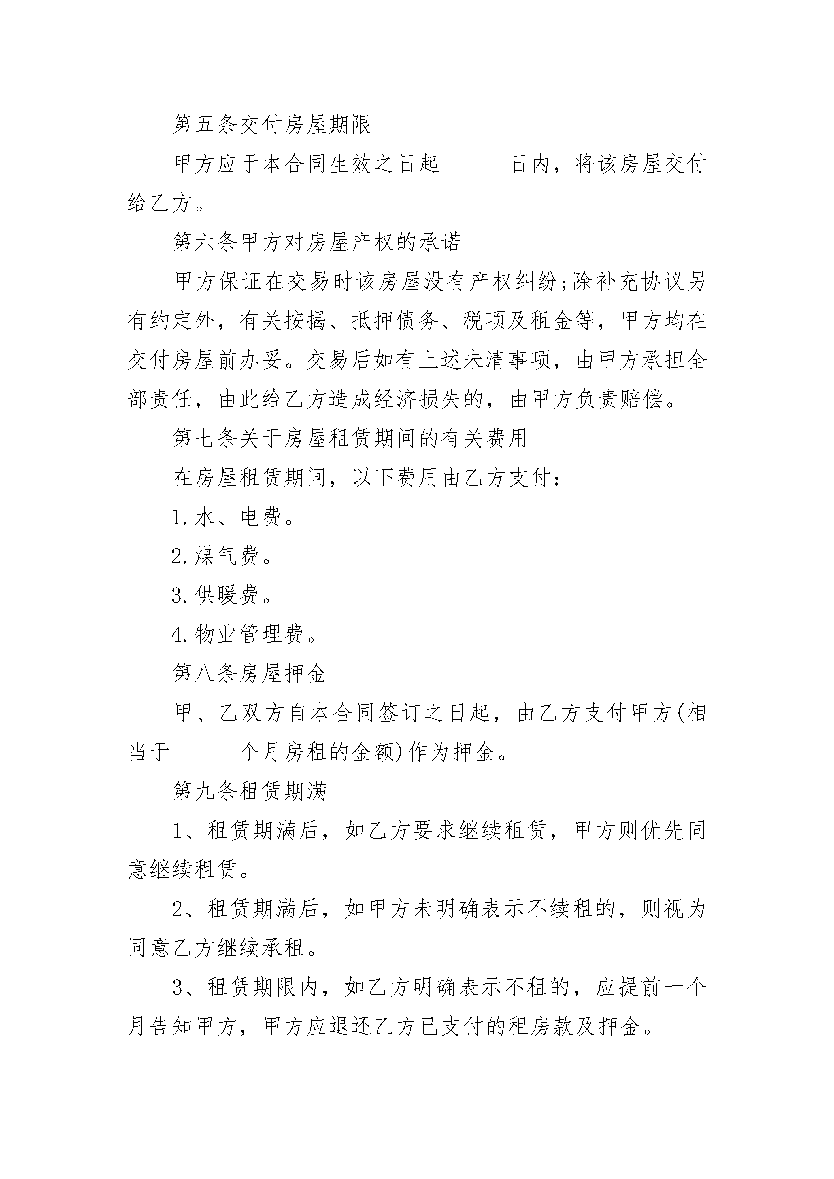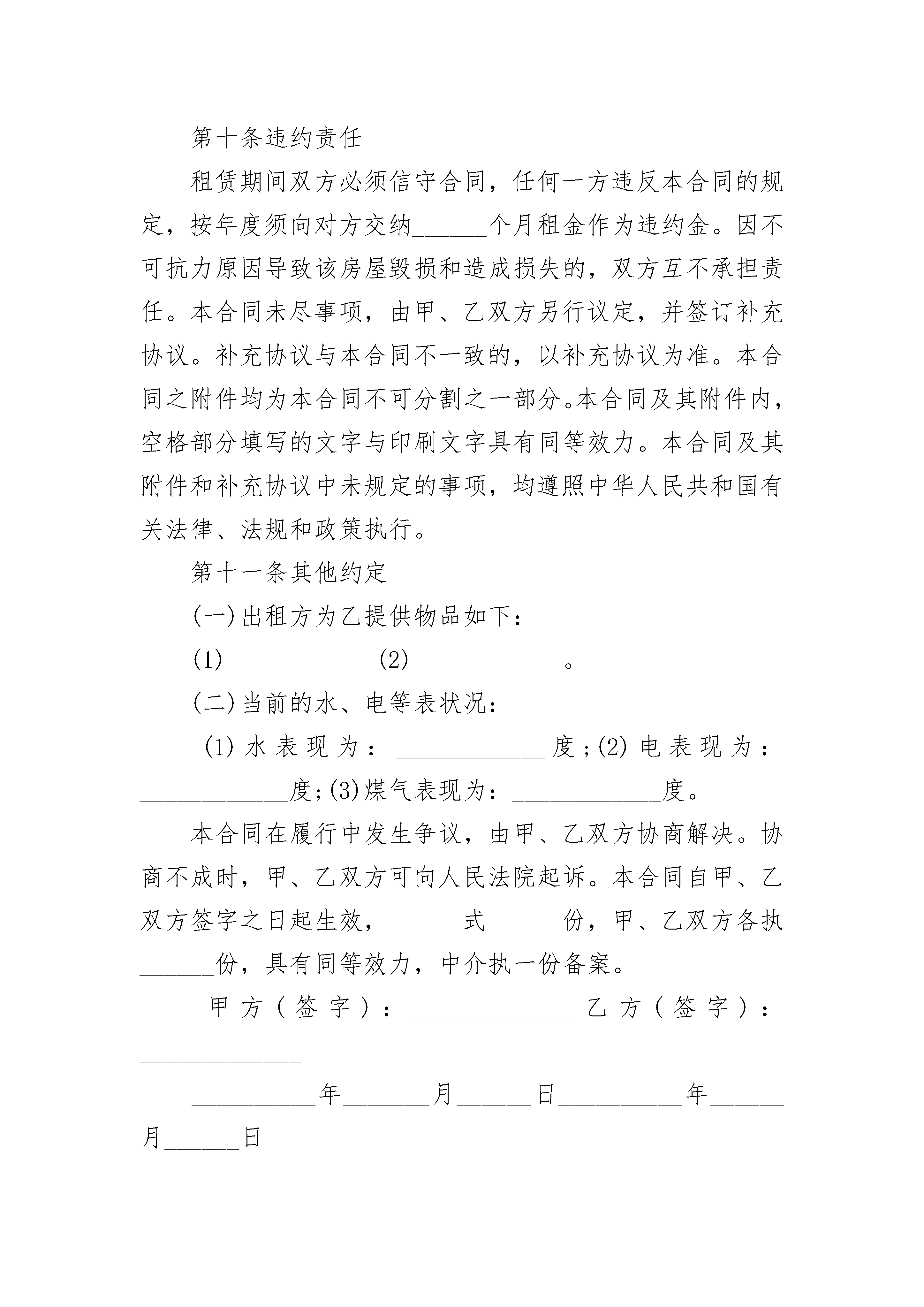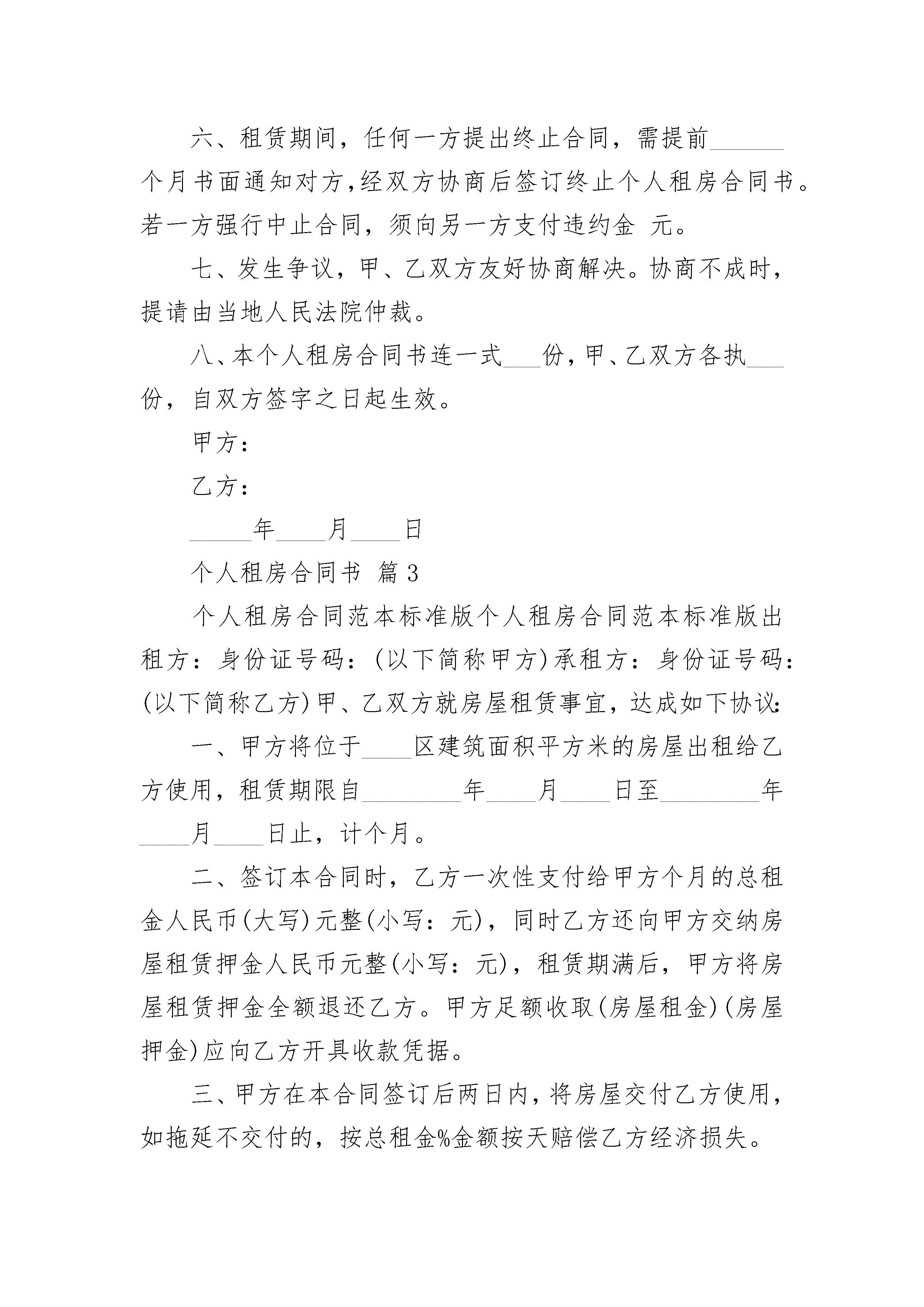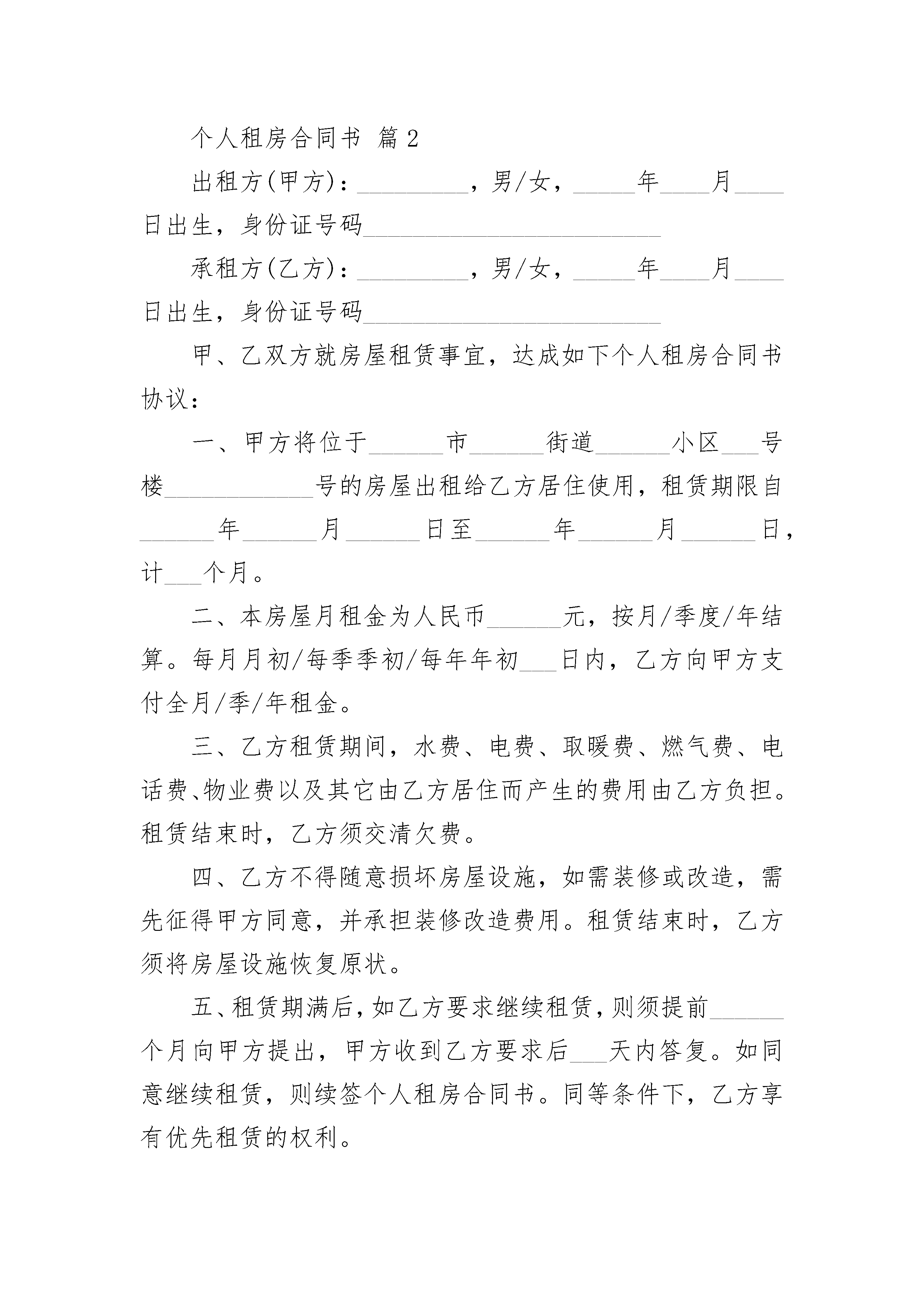 个人租房合同书个人租房合同书(精选24篇)个人租房合同书篇1甲方(租赁人):_________身份证号:_________________乙方(承租人):_________身份证号:_________________甲、乙双方就下列房屋的租赁达成如下协议:第一条房屋基本情况甲方房屋(以下简称该房屋)坐落于__________________市______区______路,位于____________第________层,______号。第二条房屋用途该房屋用途为租赁住房。除双方另有约定外,乙方不得任意改变房屋用途。第三条租赁期限租赁期限自_________年______月______日至_________年______月______日止。第四条租金该房屋月租金为(人民币)______千______百______拾______元整。租赁期间,如遇到国家有关政策调整,则按新政策规定调整租金标准;除此之外,出租方不得以任何理由任意调整租金。第五条交付房屋期限甲方应于本合同生效之日起______日内,将该房屋交付给乙方。第六条甲方对房屋产权的承诺甲方保证在交易时该房屋没有产权纠纷;除补充协议另有约定外,有关按揭、抵押债务、税项及租金等,甲方均在交付房屋前办妥。交易后如有上述未清事项,由甲方承担全部责任,由此给乙方造成经济损失的,由甲方负责赔偿。第七条关于房屋租赁期间的有关费用在房屋租赁期间,以下费用由乙方支付:1.水、电费。2.煤气费。3.供暖费。4.物业管理费。第八条房屋押金甲、乙双方自本合同签订之日起,由乙方支付甲方(相当于______个月房租的金额)作为押金。第九条租赁期满1、租赁期满后,如乙方要求继续租赁,甲方则优先同意继续租赁。2、租赁期满后,如甲方未明确表示不续租的,则视为同意乙方继续承租。3、租赁期限内,如乙方明确表示不租的,应提前一个月告知甲方,甲方应退还乙方已支付的租房款及押金。第十条违约责任租赁期间双方必须信守合同,任何一方违反本合同的规定,按年度须向对方交纳______个月租金作为违约金。因不可抗力原因导致该房屋毁损和造成损失的,双方互不承担责任。本合同未尽事项,由甲、乙双方另行议定,并签订补充协议。补充协议与本合同不一致的,以补充协议为准。本合同之附件均为本合同不可分割之一部分。本合同及其附件内,空格部分填写的文字与印刷文字具有同等效力。本合同及其附件和补充协议中未规定的事项,均遵照中华人民共和国有关法律、法规和政策执行。第十一条其他约定(一)出租方为乙提供物品如下:(1)____________(2)____________。(二)当前的水、电等表状况:(1)水表现为:____________度;(2)电表现为:____________度;(3)煤气表现为:____________度。本合同在履行中发生争议,由甲、乙双方协商解决。协商不成时,甲、乙双方可向人民法院起诉。本合同自甲、乙双方签字之日起生效,______式______份,甲、乙双方各执______份,具有同等效力,中介执一份备案。甲方(签字):_____________乙方(签字):_______________________年_______月______日__________年______月______日个人租房合同书篇2出租方(甲方):_________,男/女,_____年____月____日出生,身份证号码________________________承租方(乙方):_________,男/女,_____年____月____日出生,身份证号码________________________甲、乙双方就房屋租赁事宜,达成如下个人租房合同书协议:一、甲方将位于______市______街道______小区___号楼____________号的房屋出租给乙方居住使用,租赁期限自______年______月______日至______年______月______日,计___个月。二、本房屋月租金为人民币______元,按月/季度/年结算。每月月初/每季季初/每年年初___日内,乙方向甲方支付全月/季/年租金。三、乙方租赁期间,水费、电费、取暖费、燃气费、电话费、物业费以及其它由乙方居住而产生的费用由乙方负担。租赁结束时,乙方须交清欠费。四、乙方不得随意损坏房屋设施,如需装修或改造,需先征得甲方同意,并承担装修改造费用。租赁结束时,乙方须将房屋设施恢复原状。五、租赁期满后,如乙方要求继续租赁,则须提前______个月向甲方提出,甲方收到乙方要求后___天内答复。如同意继续租赁,则续签个人租房合同书。同等条件下,乙方享有优先租赁的权利。六、租赁期间,任何一方提出终止合同,需提前______个月书面通知对方,经双方协商后签订终止个人租房合同书。若