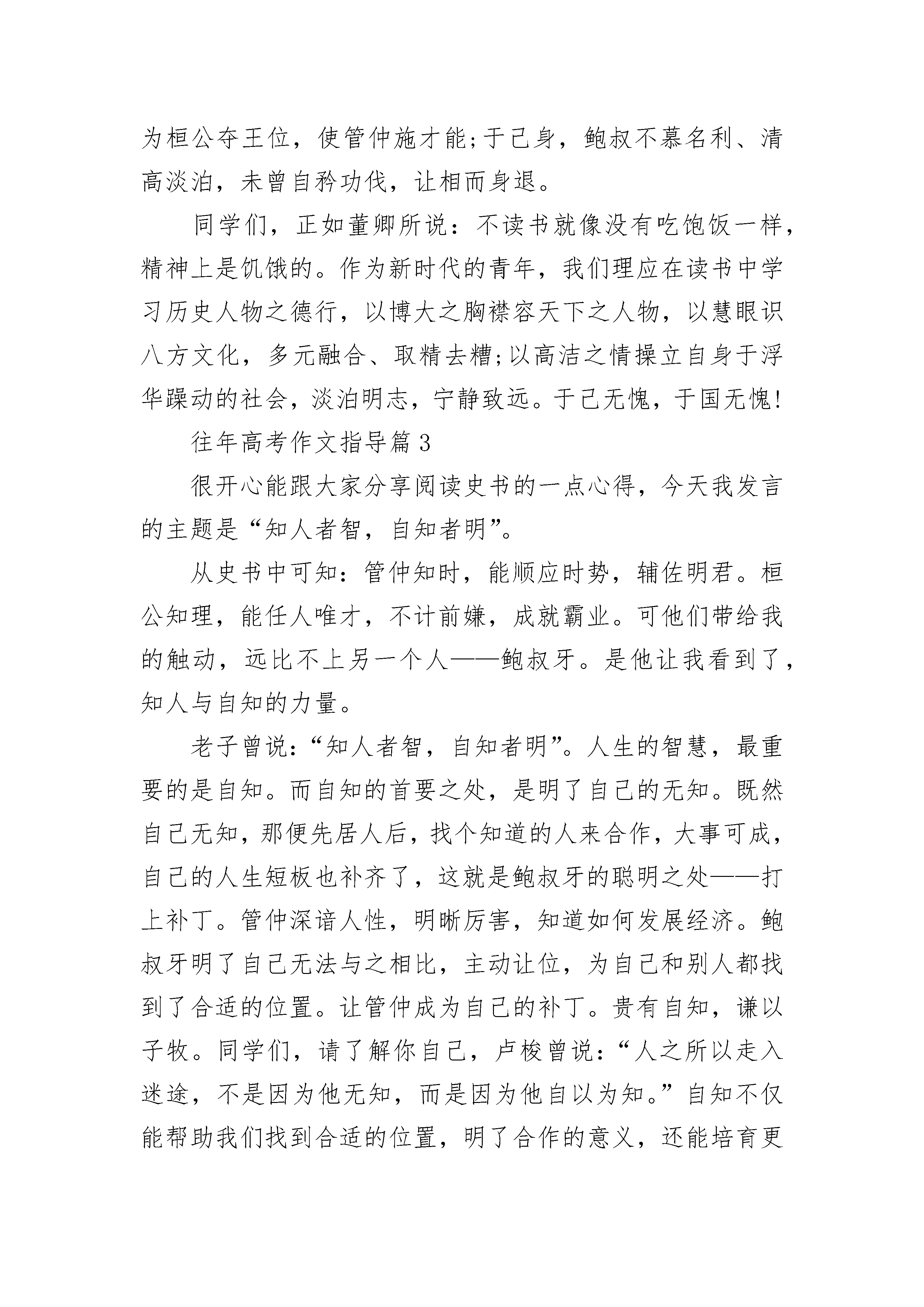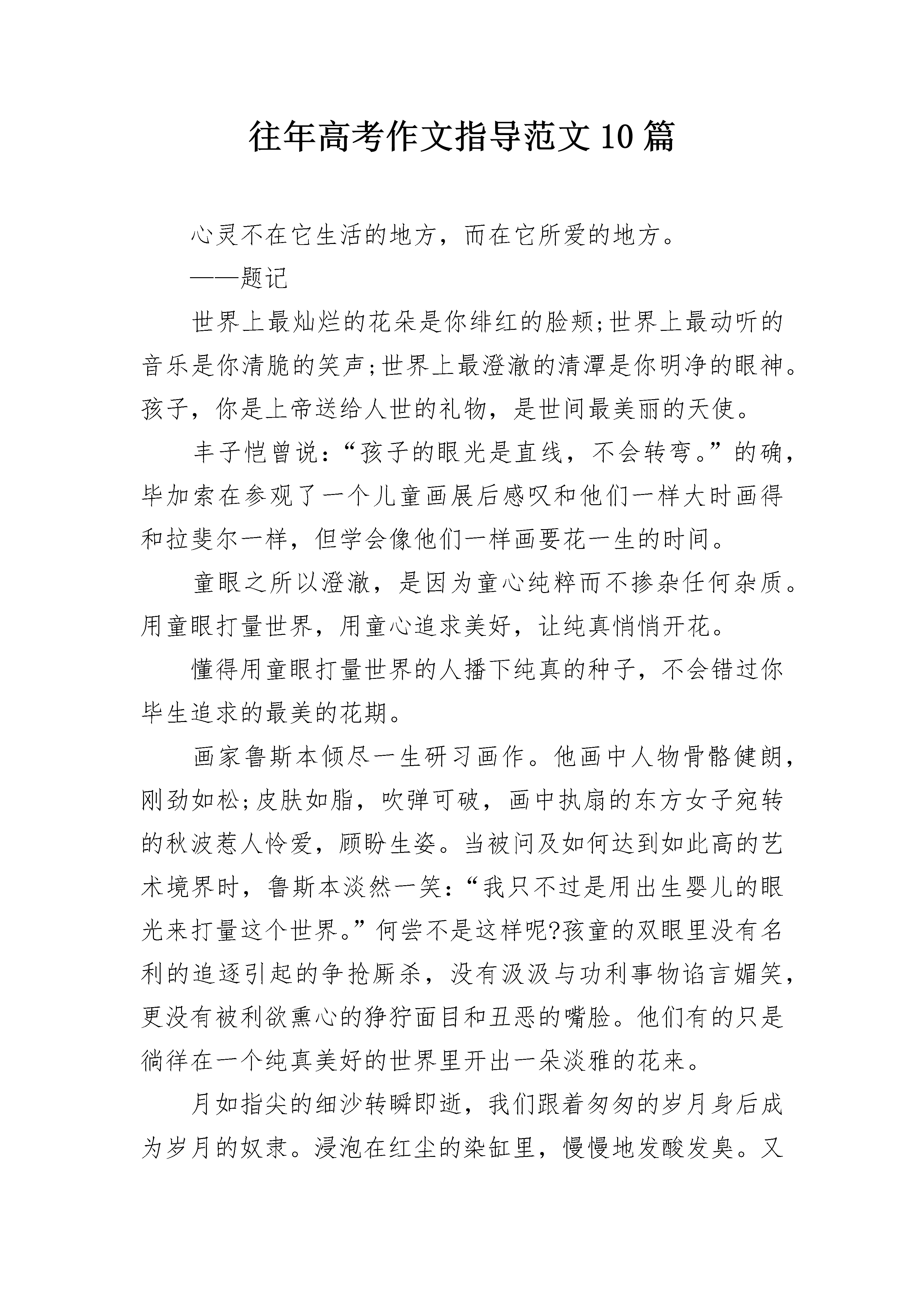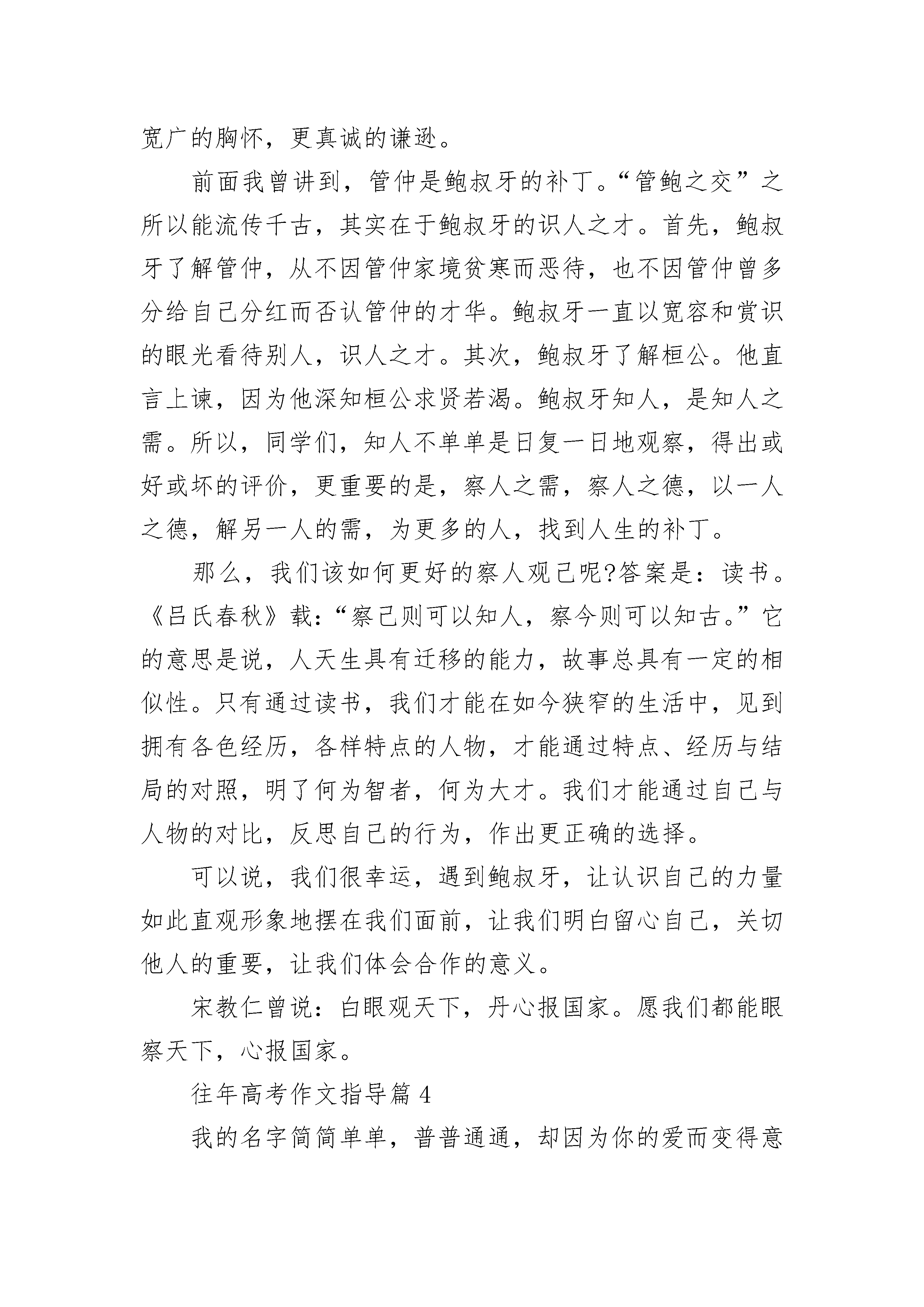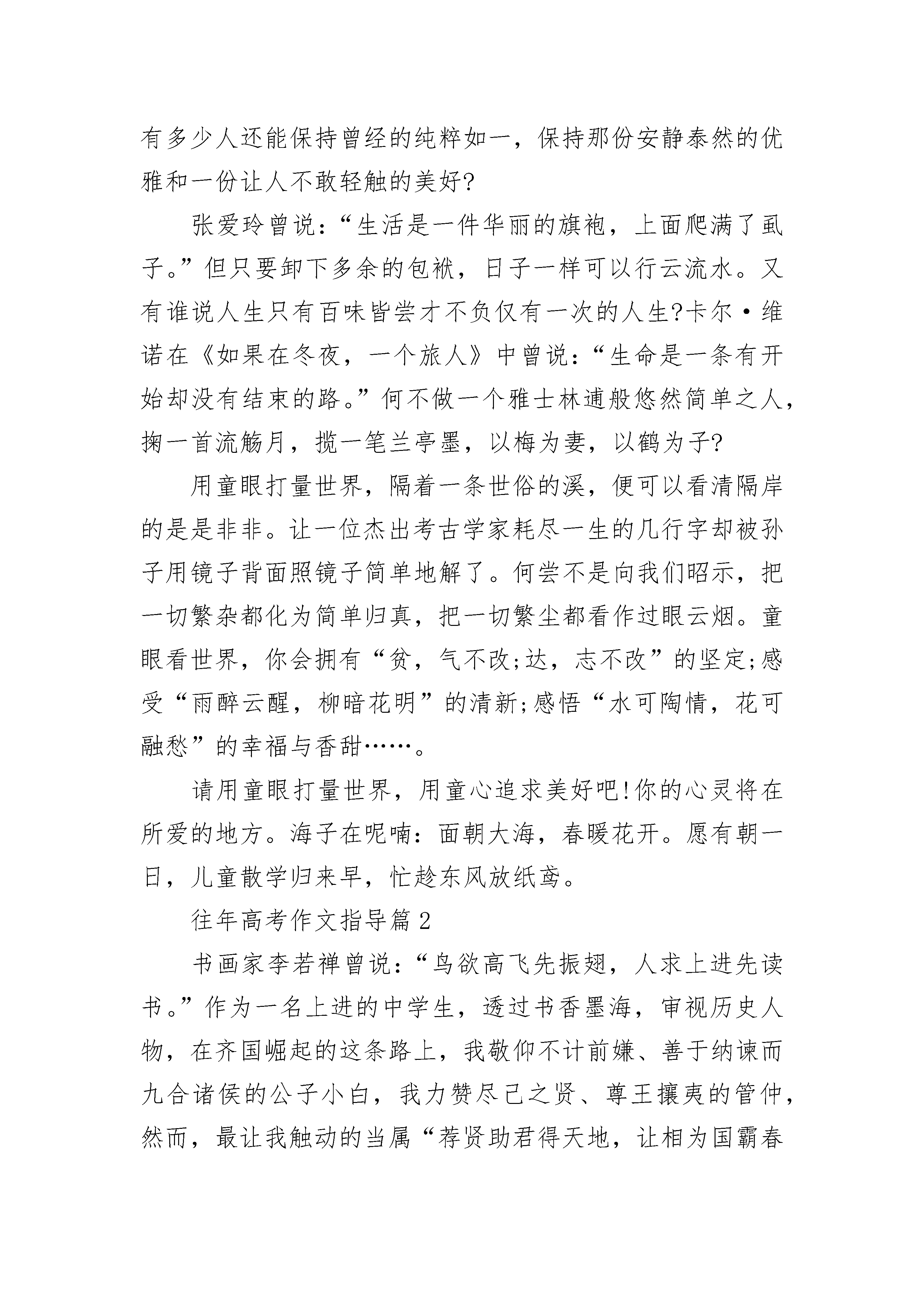往年高考作文指导范文10篇心灵不在它生活的地方,而在它所爱的地方。——题记世界上最灿烂的花朵是你绯红的脸颊;世界上最动听的音乐是你清脆的笑声;世界上最澄澈的清潭是你明净的眼神。孩子,你是上帝送给人世的礼物,是世间最美丽的天使。丰子恺曾说:“孩子的眼光是直线,不会转弯。”的确,毕加索在参观了一个儿童画展后感叹和他们一样大时画得和拉斐尔一样,但学会像他们一样画要花一生的时间。童眼之所以澄澈,是因为童心纯粹而不掺杂任何杂质。用童眼打量世界,用童心追求美好,让纯真悄悄开花。懂得用童眼打量世界的人播下纯真的种子,不会错过你毕生追求的最美的花期。画家鲁斯本倾尽一生研习画作。他画中人物骨骼健朗,刚劲如松;皮肤如脂,吹弹可破,画中执扇的东方女子宛转的秋波惹人怜爱,顾盼生姿。当被问及如何达到如此高的艺术境界时,鲁斯本淡然一笑:“我只不过是用出生婴儿的眼光来打量这个世界。”何尝不是这样呢?孩童的双眼里没有名利的追逐引起的争抢厮杀,没有汲汲与功利事物谄言媚笑,更没有被利欲熏心的狰狞面目和丑恶的嘴脸。他们有的只是徜徉在一个纯真美好的世界里开出一朵淡雅的花来。月如指尖的细沙转瞬即逝,我们跟着匆匆的岁月身后成为岁月的奴隶。浸泡在红尘的染缸里,慢慢地发酸发臭。又有多少人还能保持曾经的纯粹如一,保持那份安静泰然的优雅和一份让人不敢轻触的美好?张爱玲曾说:“生活是一件华丽的旗袍,上面爬满了虱子。”但只要卸下多余的包袱,日子一样可以行云流水。又有谁说人生只有百味皆尝才不负仅有一次的人生?卡尔·维诺在《如果在冬夜,一个旅人》中曾说:“生命是一条有开始却没有结束的路。”何不做一个雅士林逋般悠然简单之人,掬一首流觞月,揽一笔兰亭墨,以梅为妻,以鹤为子?用童眼打量世界,隔着一条世俗的溪,便可以看清隔岸的是是非非。让一位杰出考古学家耗尽一生的几行字却被孙子用镜子背面照镜子简单地解了。何尝不是向我们昭示,把一切繁杂都化为简单归真,把一切繁尘都看作过眼云烟。童眼看世界,你会拥有“贫,气不改;达,志不改”的坚定;感受“雨醉云醒,柳暗花明”的清新;感悟“水可陶情,花可融愁”的幸福与香甜……。请用童眼打量世界,用童心追求美好吧!你的心灵将在所爱的地方。海子在呢喃:面朝大海,春暖花开。愿有朝一日,儿童散学归来早,忙趁东风放纸鸢。往年高考作文指导篇2书画家李若禅曾说:“鸟欲高飞先振翅,人求上进先读书。”作为一名上进的中学生,透过书香墨海,审视历史人物,在齐国崛起的这条路上,我敬仰不计前嫌、善于纳谏而九合诸侯的公子小白,我力赞尽己之贤、尊王攘夷的管仲,然而,最让我触动的当属“荐贤助君得天地,让相为国霸春秋”的鲍叔。接下来就跟大家交流一下我的浅见。胸襟博大,鲍叔知人善任而勇荐旧敌。“治天下者,用人非止一端,故取士不以一路”,欧阳修这句话可很好形容鲍叔。公子纠和公子小白争夺齐国王位之时,鲍叔和管仲亦身居双方阵营的高位,甚至小白几乎为管仲所杀害,可当公子纠失败、桓公即位后,鲍叔却能发现与己与国曾有深仇大恨的管仲的才能,并为此直言纳谏,使其辅佐桓公成大业。“天下不多管仲之贤而多鲍叔能知人也”,同学们,请设想一下,假如没有鲍叔之知人善任及包容心胸,齐国人才中何来一位彪炳千古的管仲,又何来齐国今后之崛起?所以,管仲造就了齐国的荣光,而鲍叔造就了管仲之辉煌。情操高洁,鲍叔知己不及而谦让相位。“夫人者,己欲立而立人,己欲达而达人”,在春秋战国这样礼崩乐坏的时代中,诸侯将相们都沉沦于名利,贪念着霸权,齐桓公亦是如此。在管仲俯首称臣后,作为齐国之相的鲍叔却并未居高视之,反而称自己“贤不如管仲”而将相位谦让于其,自己甘居其下,终成一段千古佳话。“甘居下者位未卑”,虽然桓公终成五霸之首,但其与手足相争、与诸侯相杀,比起鲍叔却少了一分淡然与平静。同学们,我们深知,只有不迷恋权力,不陶醉富贵,鲍叔才如乱世之中的一抹清流,以己之行诠释了君子之德。同学们,管仲虽贤,论胸怀其不如鲍叔;桓公虽能,论情操其亦不如鲍叔。故三人中,我首推鲍叔——荐贤助君得天地,让相为国霸春秋:于国家,鲍叔选贤举能、慧眼识精,为桓公夺王位,使管仲施才能;于己身,鲍叔不慕名利、清高淡泊,未曾自矜功伐,让相而身退。同学们,正如董卿所说:不读书就像没有吃饱饭一样,精神上是饥饿的。作为新时代的青年,我们理应在读书中学习历史人物之德行,以博大之胸襟容天下之人物,以慧眼识八方文化,多元融合、取精去糟;以高洁之情操立自身于浮华躁动的社会,淡泊明志,宁静致远。于己无愧,于国无愧!往年高考作文指导篇3很开心能跟大家分享阅读史书的一点心得,今天我发言的主题是“知人者智,自知者明”。从史书中可知:管仲知时,能顺应时势,辅佐明君。桓公知理,能任人唯才,不计前嫌,成就霸业。可他们带给我的触动,远比不上另一个人——鲍叔牙。是他让我看到了,知人与自知的力量。老子曾说:“知
