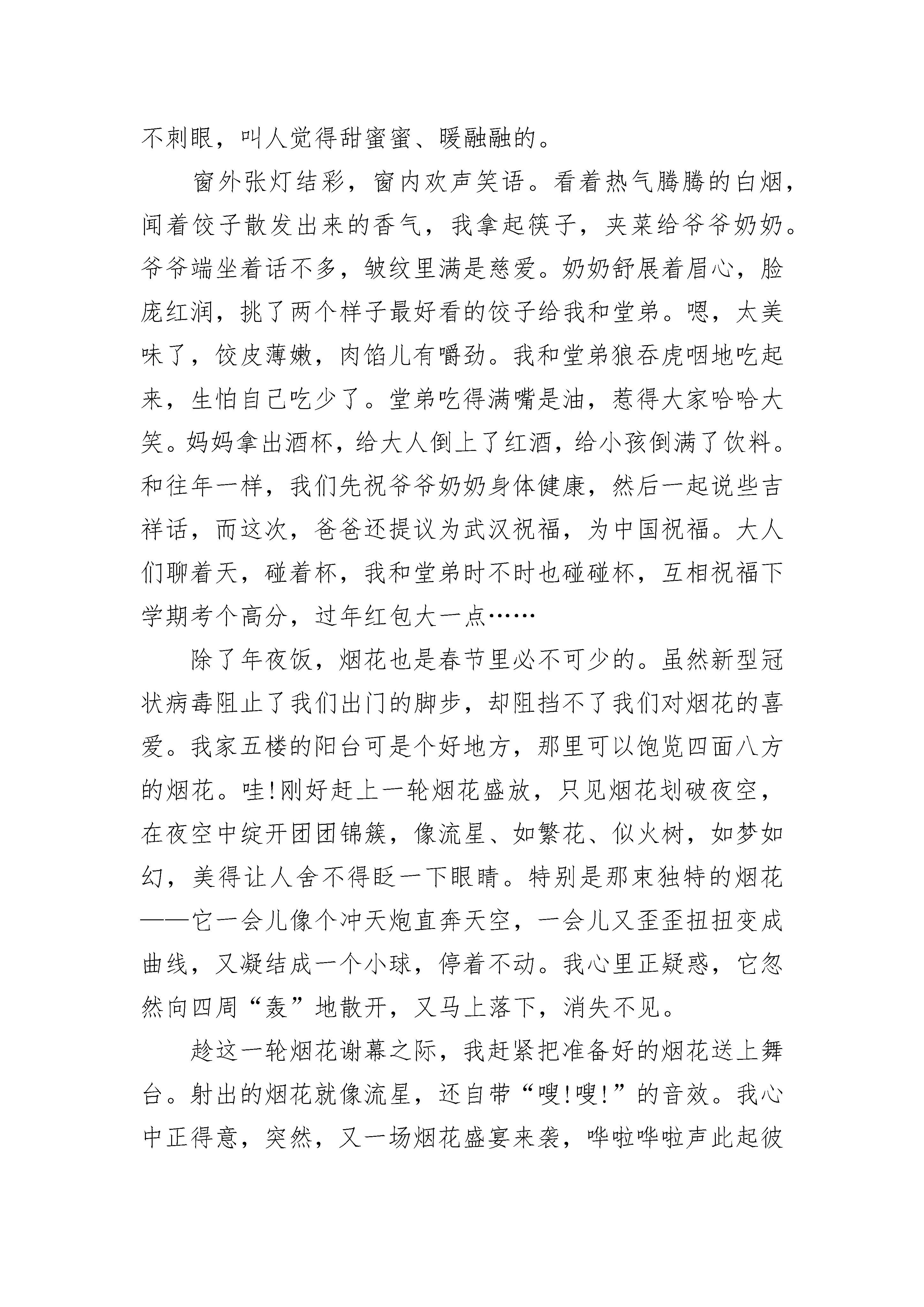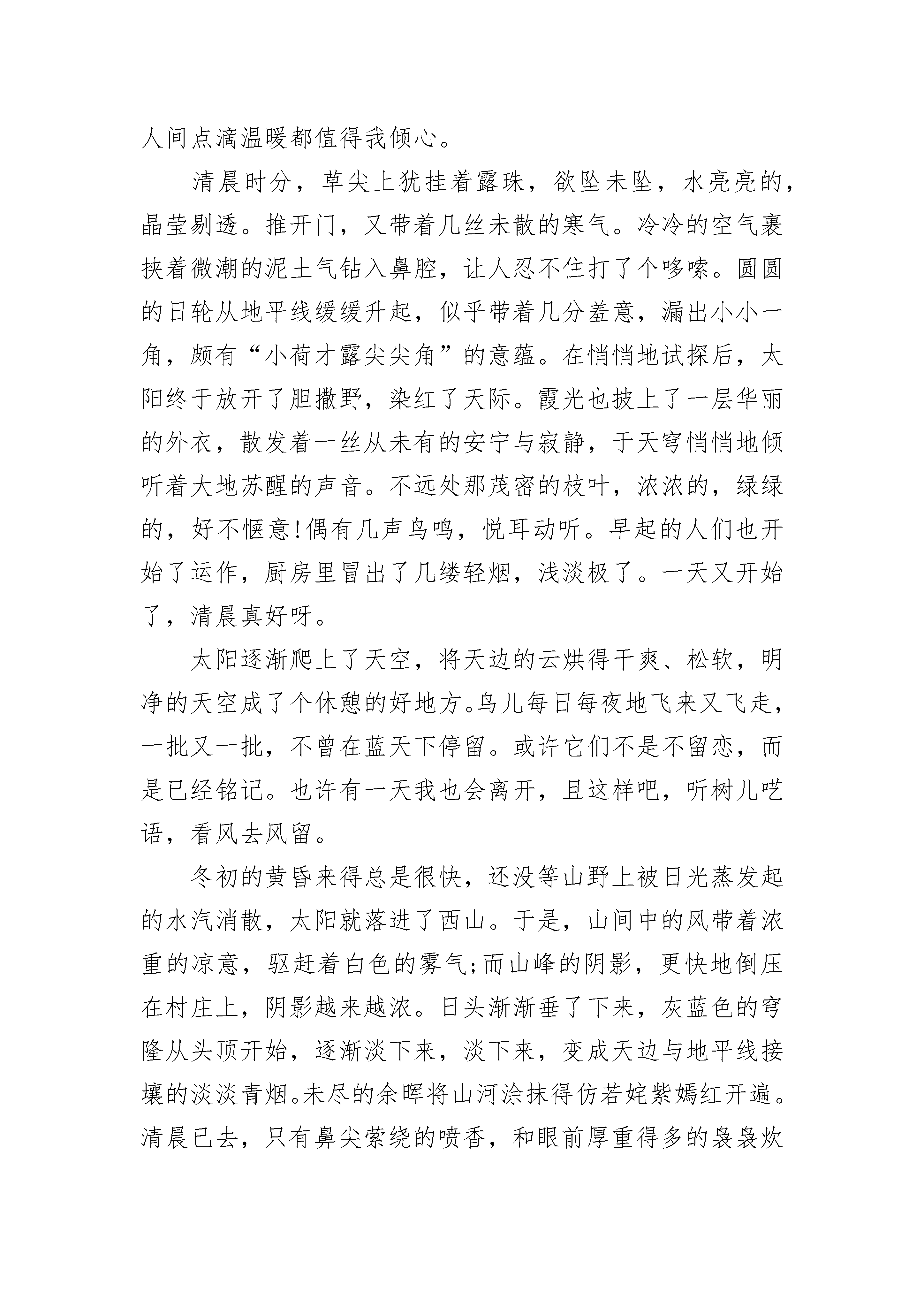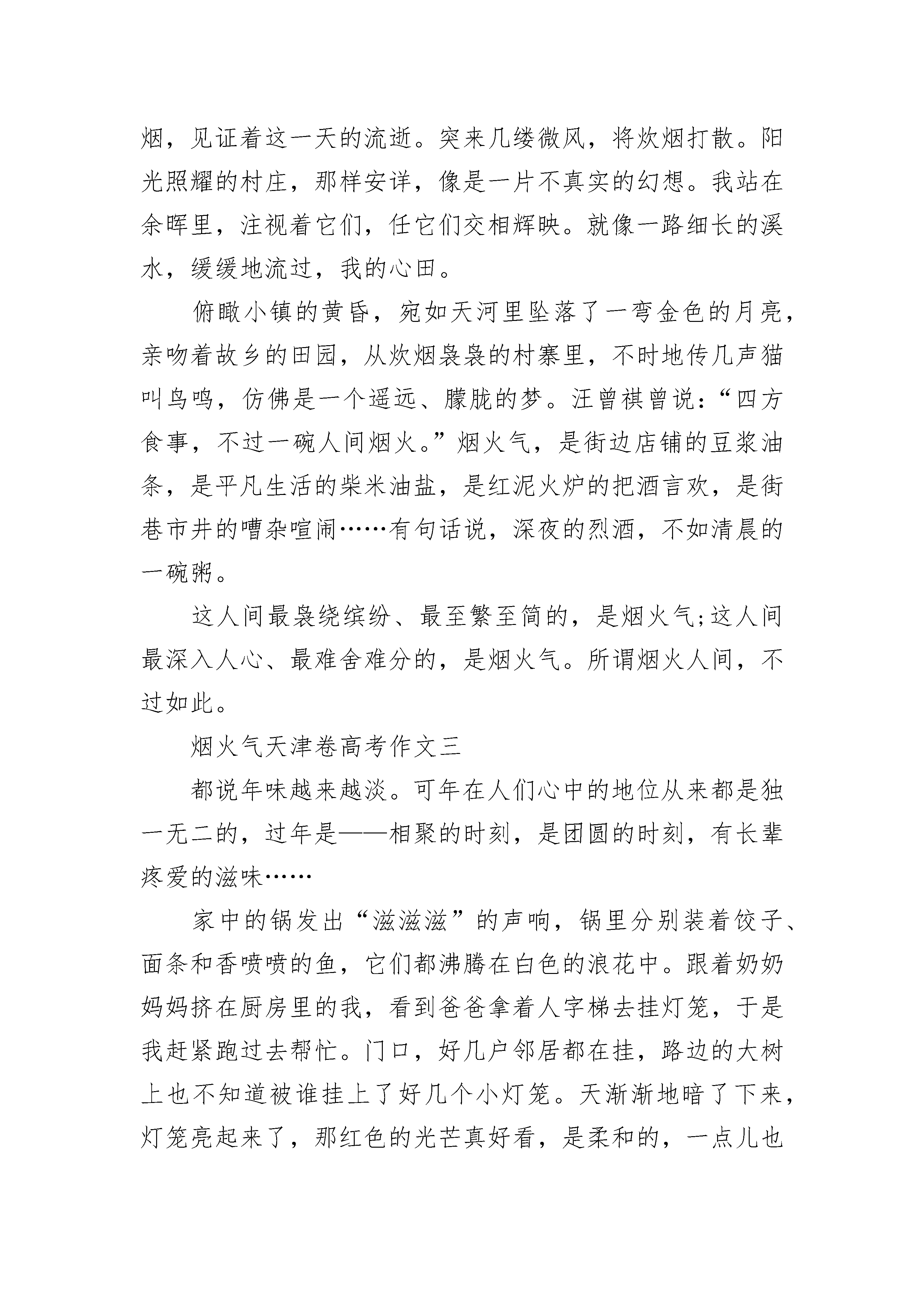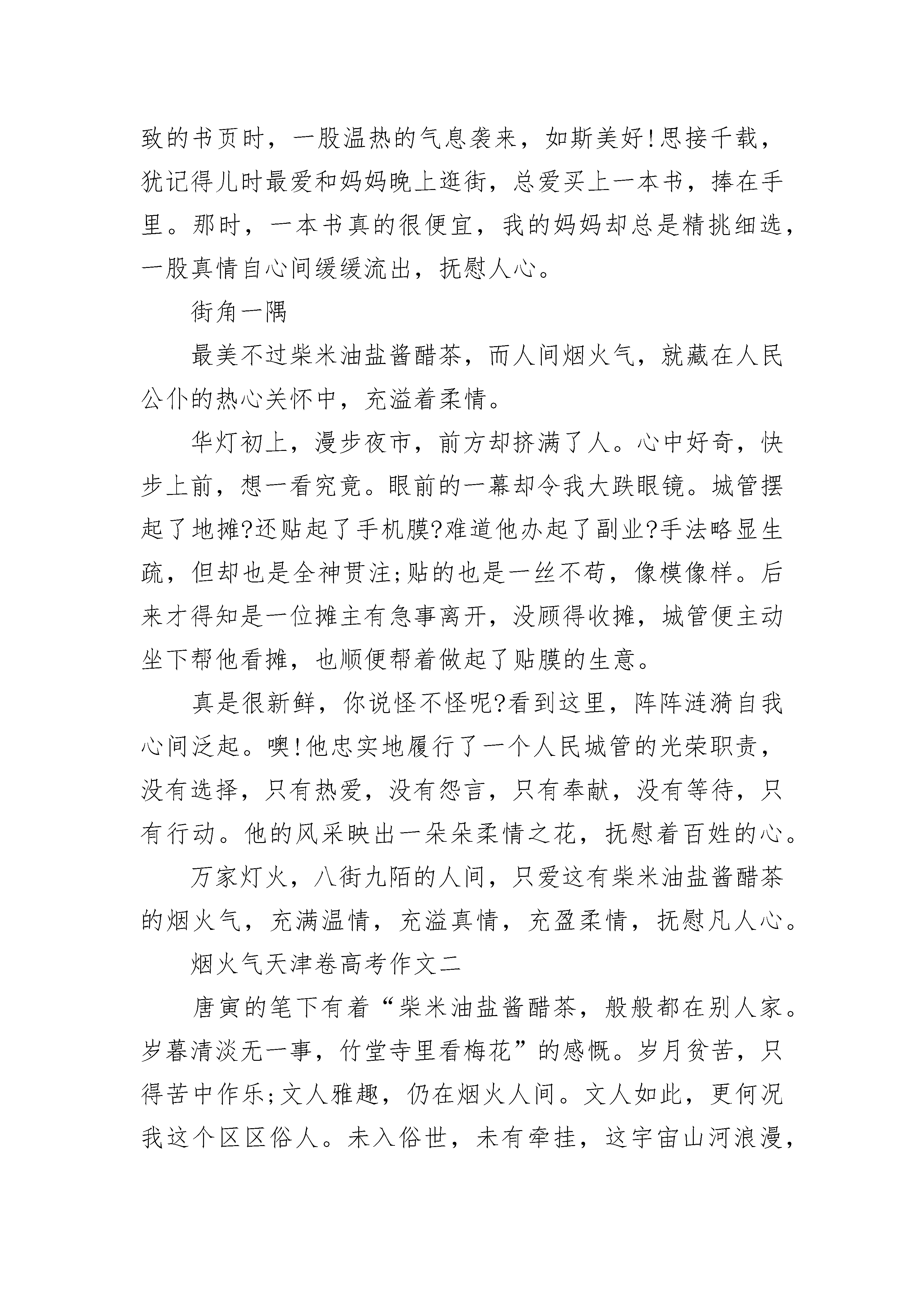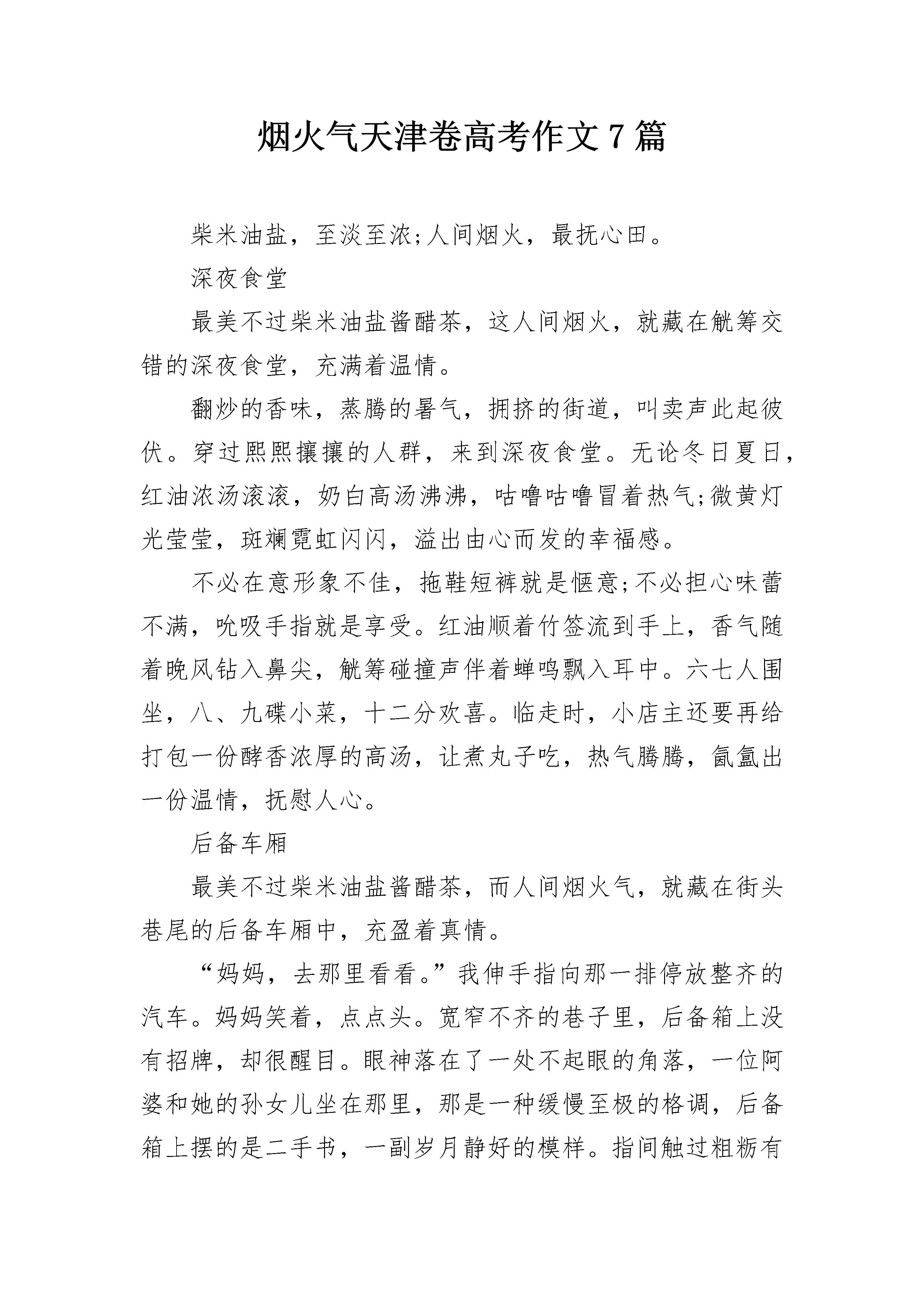烟火气天津卷高考作文7篇柴米油盐,至淡至浓;人间烟火,最抚心田。深夜食堂最美不过柴米油盐酱醋茶,这人间烟火,就藏在觥筹交错的深夜食堂,充满着温情。翻炒的香味,蒸腾的暑气,拥挤的街道,叫卖声此起彼伏。穿过熙熙攘攘的人群,来到深夜食堂。无论冬日夏日,红油浓汤滚滚,奶白高汤沸沸,咕噜咕噜冒着热气;微黄灯光莹莹,斑斓霓虹闪闪,溢出由心而发的幸福感。不必在意形象不佳,拖鞋短裤就是惬意;不必担心味蕾不满,吮吸手指就是享受。红油顺着竹签流到手上,香气随着晚风钻入鼻尖,觥筹碰撞声伴着蝉鸣飘入耳中。六七人围坐,八、九碟小菜,十二分欢喜。临走时,小店主还要再给打包一份酵香浓厚的高汤,让煮丸子吃,热气腾腾,氤氲出一份温情,抚慰人心。后备车厢最美不过柴米油盐酱醋茶,而人间烟火气,就藏在街头巷尾的后备车厢中,充盈着真情。“妈妈,去那里看看。”我伸手指向那一排停放整齐的汽车。妈妈笑着,点点头。宽窄不齐的巷子里,后备箱上没有招牌,却很醒目。眼神落在了一处不起眼的角落,一位阿婆和她的孙女儿坐在那里,那是一种缓慢至极的格调,后备箱上摆的是二手书,一副岁月静好的模样。指间触过粗粝有致的书页时,一股温热的气息袭来,如斯美好!思接千载,犹记得儿时最爱和妈妈晚上逛街,总爱买上一本书,捧在手里。那时,一本书真的很便宜,我的妈妈却总是精挑细选,一股真情自心间缓缓流出,抚慰人心。街角一隅最美不过柴米油盐酱醋茶,而人间烟火气,就藏在人民公仆的热心关怀中,充溢着柔情。华灯初上,漫步夜市,前方却挤满了人。心中好奇,快步上前,想一看究竟。眼前的一幕却令我大跌眼镜。城管摆起了地摊?还贴起了手机膜?难道他办起了副业?手法略显生疏,但却也是全神贯注;贴的也是一丝不苟,像模像样。后来才得知是一位摊主有急事离开,没顾得收摊,城管便主动坐下帮他看摊,也顺便帮着做起了贴膜的生意。真是很新鲜,你说怪不怪呢?看到这里,阵阵涟漪自我心间泛起。噢!他忠实地履行了一个人民城管的光荣职责,没有选择,只有热爱,没有怨言,只有奉献,没有等待,只有行动。他的风采映出一朵朵柔情之花,抚慰着百姓的心。万家灯火,八街九陌的人间,只爱这有柴米油盐酱醋茶的烟火气,充满温情,充溢真情,充盈柔情,抚慰凡人心。烟火气天津卷高考作文二唐寅的笔下有着“柴米油盐酱醋茶,般般都在别人家。岁暮清淡无一事,竹堂寺里看梅花”的感慨。岁月贫苦,只得苦中作乐;文人雅趣,仍在烟火人间。文人如此,更何况我这个区区俗人。未入俗世,未有牵挂,这宇宙山河浪漫,人间点滴温暖都值得我倾心。清晨时分,草尖上犹挂着露珠,欲坠未坠,水亮亮的,晶莹剔透。推开门,又带着几丝未散的寒气。冷冷的空气裹挟着微潮的泥土气钻入鼻腔,让人忍不住打了个哆嗦。圆圆的日轮从地平线缓缓升起,似乎带着几分羞意,漏出小小一角,颇有“小荷才露尖尖角”的意蕴。在悄悄地试探后,太阳终于放开了胆撒野,染红了天际。霞光也披上了一层华丽的外衣,散发着一丝从未有的安宁与寂静,于天穹悄悄地倾听着大地苏醒的声音。不远处那茂密的枝叶,浓浓的,绿绿的,好不惬意!偶有几声鸟鸣,悦耳动听。早起的人们也开始了运作,厨房里冒出了几缕轻烟,浅淡极了。一天又开始了,清晨真好呀。太阳逐渐爬上了天空,将天边的云烘得干爽、松软,明净的天空成了个休憩的好地方。鸟儿每日每夜地飞来又飞走,一批又一批,不曾在蓝天下停留。或许它们不是不留恋,而是已经铭记。也许有一天我也会离开,且这样吧,听树儿呓语,看风去风留。冬初的黄昏来得总是很快,还没等山野上被日光蒸发起的水汽消散,太阳就落进了西山。于是,山间中的风带着浓重的凉意,驱赶着白色的雾气;而山峰的阴影,更快地倒压在村庄上,阴影越来越浓。日头渐渐垂了下来,灰蓝色的穹隆从头顶开始,逐渐淡下来,淡下来,变成天边与地平线接壤的淡淡青烟。未尽的余晖将山河涂抹得仿若姹紫嫣红开遍。清晨已去,只有鼻尖萦绕的喷香,和眼前厚重得多的袅袅炊烟,见证着这一天的流逝。突来几缕微风,将炊烟打散。阳光照耀的村庄,那样安详,像是一片不真实的幻想。我站在余晖里,注视着它们,任它们交相辉映。就像一路细长的溪水,缓缓地流过,我的心田。俯瞰小镇的黄昏,宛如天河里坠落了一弯金色的月亮,亲吻着故乡的田园,从炊烟袅袅的村寨里,不时地传几声猫叫鸟鸣,仿佛是一个遥远、朦胧的梦。汪曾祺曾说:“四方食事,不过一碗人间烟火。”烟火气,是街边店铺的豆浆油条,是平凡生活的柴米油盐,是红泥火炉的把酒言欢,是街巷市井的嘈杂喧闹……有句话说,深夜的烈酒,不如清晨的一碗粥。这人间最袅绕缤纷、最至繁至简的,是烟火气;这人间最深入人心、最难舍难分的,是烟火气。所谓烟火人间,不过如此。烟火气天津卷高考作文三都说年味越来越淡。可年在人们心中的地位从来都是独一无二的,过年是——相聚的时刻,是团圆的时刻,有长辈疼爱的滋味……家中的锅发出“滋滋滋”的声响,锅里分别装着饺子