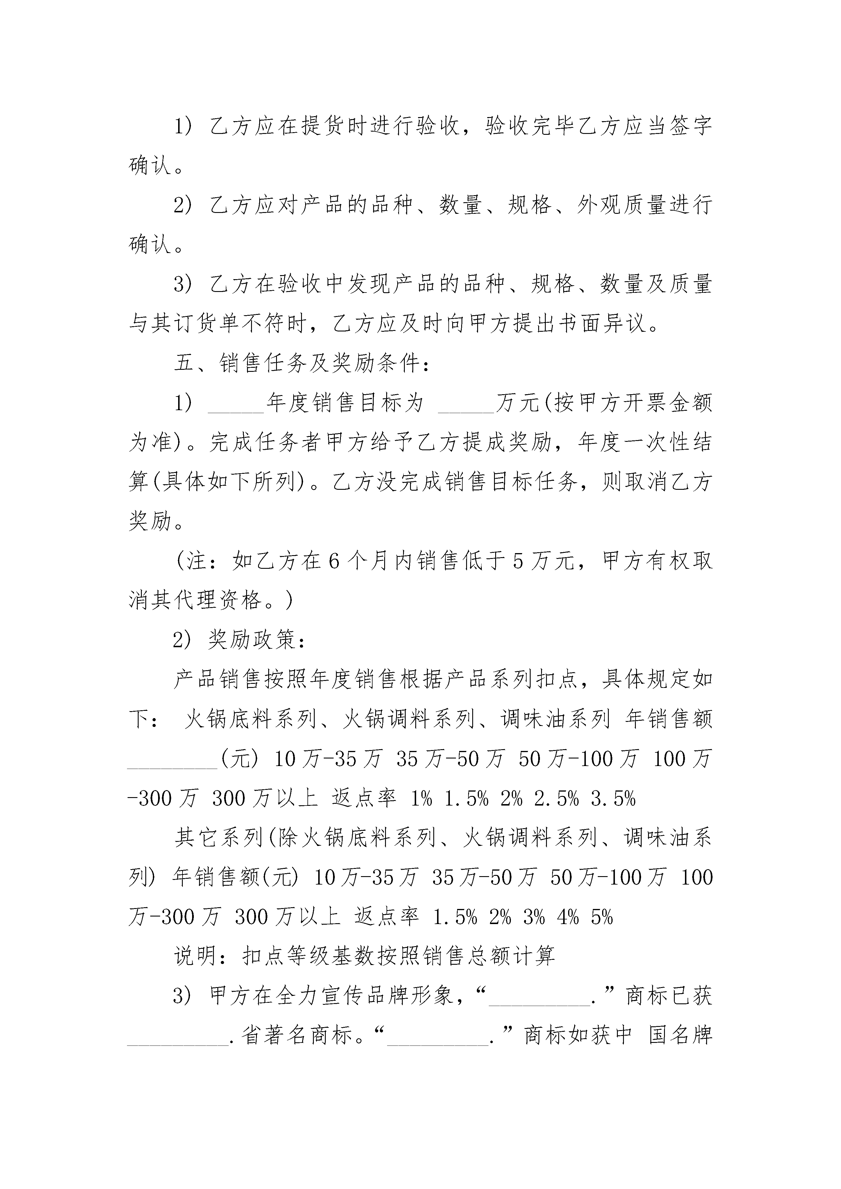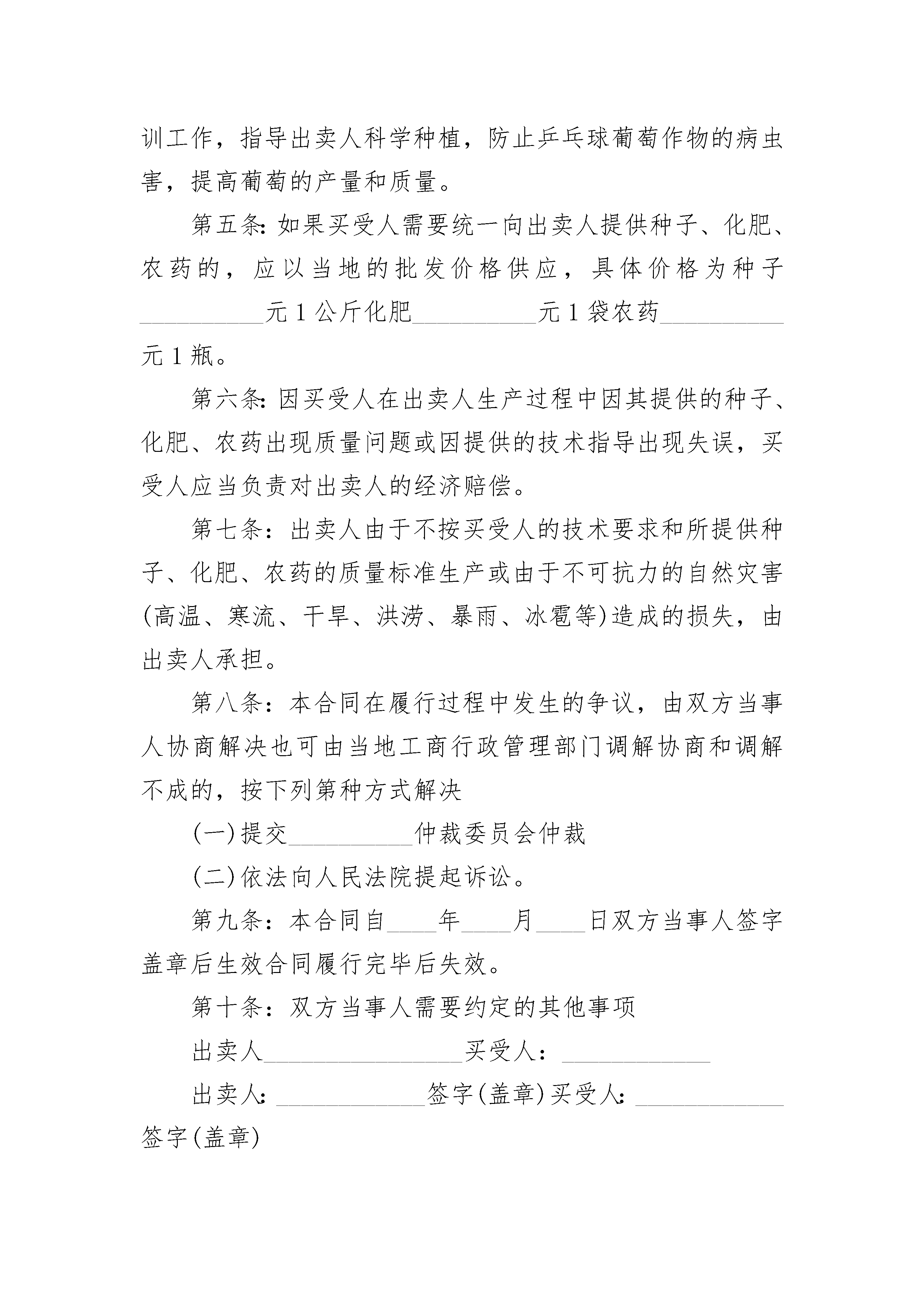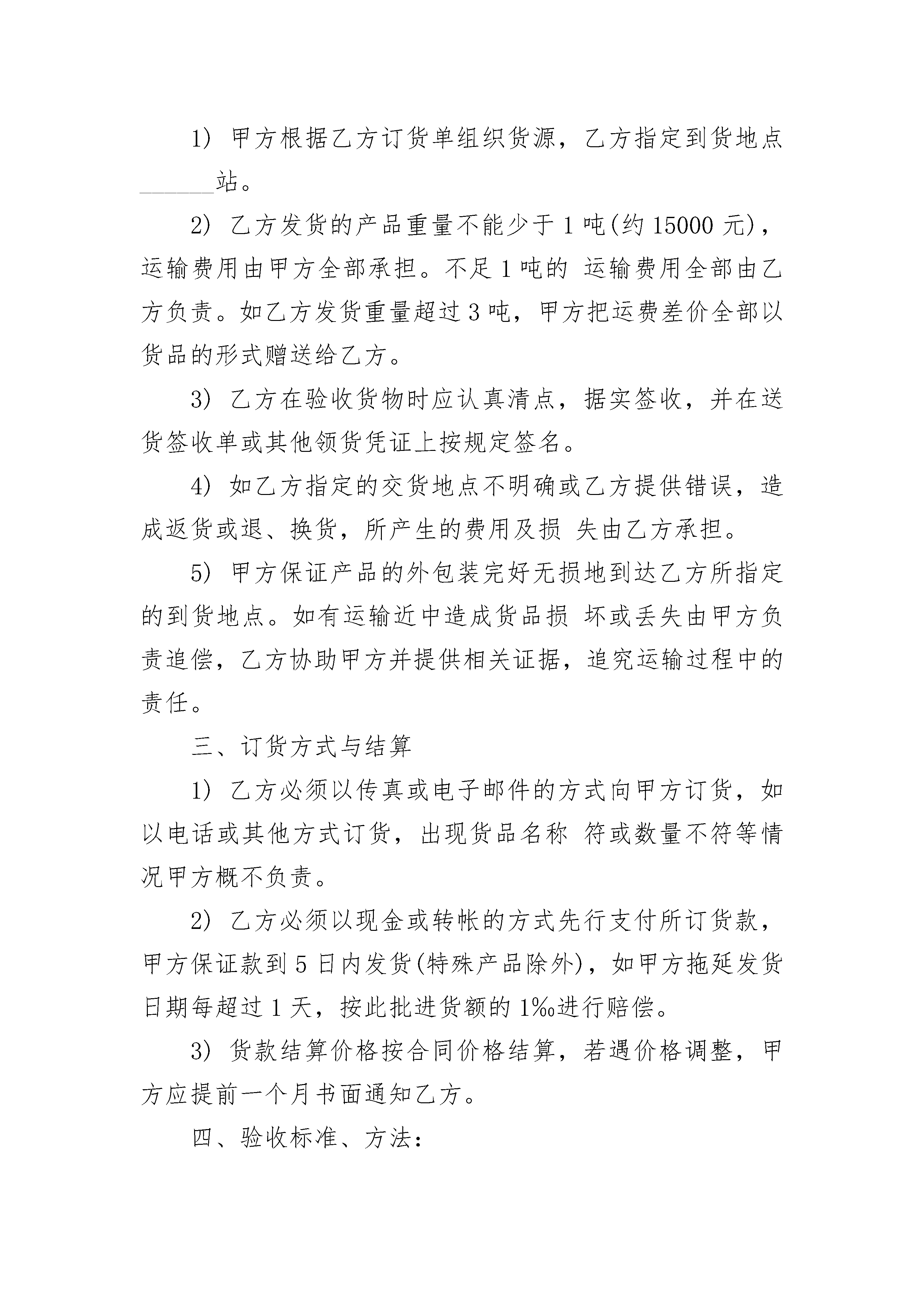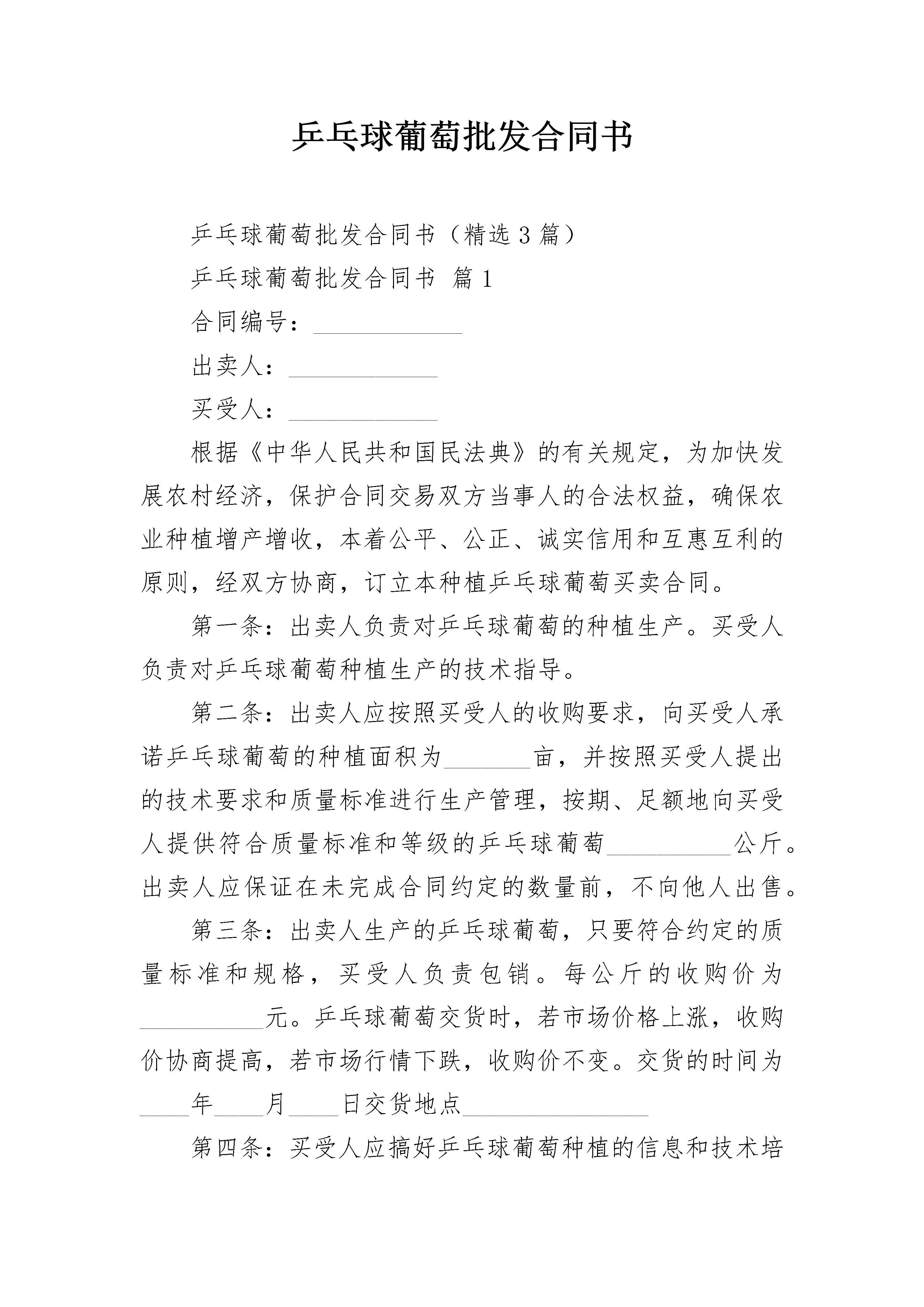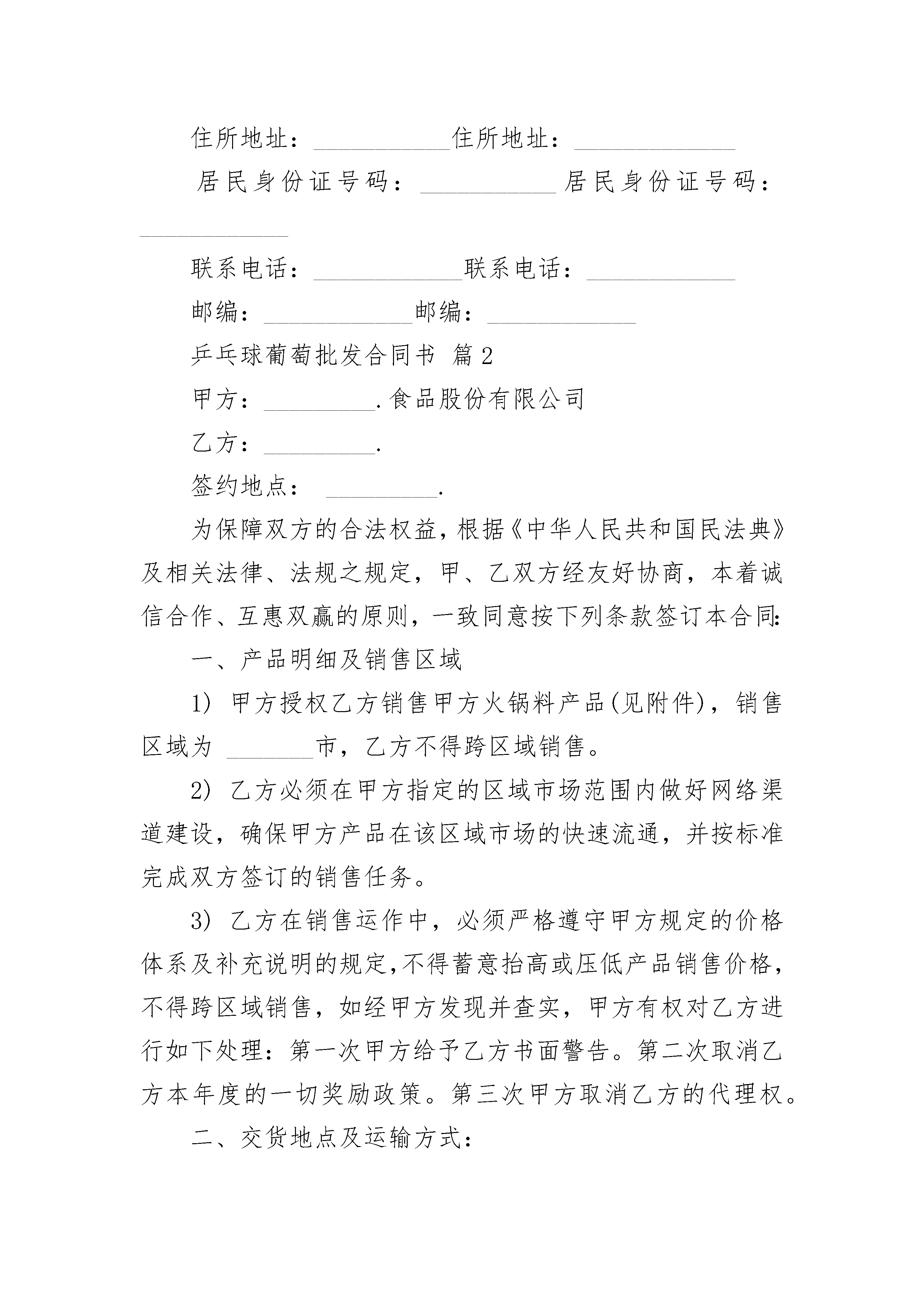 乒乓球葡萄批发合同书乒乓球葡萄批发合同书(精选3篇)乒乓球葡萄批发合同书篇1合同编号:____________出卖人:____________买受人:____________根据《中华人民共和国民法典》的有关规定,为加快发展农村经济,保护合同交易双方当事人的合法权益,确保农业种植增产增收,本着公平、公正、诚实信用和互惠互利的原则,经双方协商,订立本种植乒乓球葡萄买卖合同。第一条:出卖人负责对乒乓球葡萄的种植生产。买受人负责对乒乓球葡萄种植生产的技术指导。第二条:出卖人应按照买受人的收购要求,向买受人承诺乒乓球葡萄的种植面积为_______亩,并按照买受人提出的技术要求和质量标准进行生产管理,按期、足额地向买受人提供符合质量标准和等级的乒乓球葡萄__________公斤。出卖人应保证在未完成合同约定的数量前,不向他人出售。第三条:出卖人生产的乒乓球葡萄,只要符合约定的质量标准和规格,买受人负责包销。每公斤的收购价为__________元。乒乓球葡萄交货时,若市场价格上涨,收购价协商提高,若市场行情下跌,收购价不变。交货的时间为____年____月____日交货地点_______________第四条:买受人应搞好乒乓球葡萄种植的信息和技术培训工作,指导出卖人科学种植,防止乒乓球葡萄作物的病虫害,提高葡萄的产量和质量。第五条:如果买受人需要统一向出卖人提供种子、化肥、农药的,应以当地的批发价格供应,具体价格为种子__________元1公斤化肥__________元1袋农药__________元1瓶。第六条:因买受人在出卖人生产过程中因其提供的种子、化肥、农药出现质量问题或因提供的技术指导出现失误,买受人应当负责对出卖人的经济赔偿。第七条:出卖人由于不按买受人的技术要求和所提供种子、化肥、农药的质量标准生产或由于不可抗力的自然灾害(高温、寒流、干旱、洪涝、暴雨、冰雹等)造成的损失,由出卖人承担。第八条:本合同在履行过程中发生的争议,由双方当事人协商解决也可由当地工商行政管理部门调解协商和调解不成的,按下列第种方式解决(一)提交__________仲裁委员会仲裁(二)依法向人民法院提起诉讼。第九条:本合同自____年____月____日双方当事人签字盖章后生效合同履行完毕后失效。第十条:双方当事人需要约定的其他事项出卖人________________买受人:____________出卖人:____________签字(盖章)买受人:____________签字(盖章)住所地址:___________住所地址:_____________居民身份证号码:___________居民身份证号码:____________联系电话:____________联系电话:____________邮编:____________邮编:____________乒乓球葡萄批发合同书篇2甲方:_________.食品股份有限公司乙方:_________.签约地点:_________.为保障双方的合法权益,根据《中华人民共和国民法典》及相关法律、法规之规定,甲、乙双方经友好协商,本着诚信合作、互惠双赢的原则,一致同意按下列条款签订本合同:一、产品明细及销售区域1)甲方授权乙方销售甲方火锅料产品(见附件),销售区域为_______市,乙方不得跨区域销售。2)乙方必须在甲方指定的区域市场范围内做好网络渠道建设,确保甲方产品在该区域市场的快速流通,并按标准完成双方签订的销售任务。3)乙方在销售运作中,必须严格遵守甲方规定的价格体系及补充说明的规定,不得蓄意抬高或压低产品销售价格,不得跨区域销售,如经甲方发现并查实,甲方有权对乙方进行如下处理:第一次甲方给予乙方书面警告。第二次取消乙方本年度的一切奖励政策。第三次甲方取消乙方的代理权。二、交货地点及运输方式:1)甲方根据乙方订货单组织货源,乙方指定到货地点______站。2)乙方发货的产品重量不能少于1吨(约15000元),运输费用由甲方全部承担。不足1吨的运输费用全部由乙方负责。如乙方发货重量超过3吨,甲方把运费差价全部以货品的形式赠送给乙方。3)乙方在验收货物时应认真清点,据实签收,并在送货签收单或其他领货凭证上按规定签名。4)如乙方指定的交货地点不明确或乙方提供错误,造成返货或退、换货,所产生的费用及损失由乙方承担。5)甲方保证产品的外包装完好无损地到达乙方所指定的到货地点。如有运输近中造成货品损坏或丢失由甲方负责追偿,乙方协助甲方并提供相关证据,追究运输过程中的责任。三、订货方式与结算1)乙方必须以传真或电子邮件的方式向甲方订货,如以电话或其他方式订货,出现货品名称符或数量不符等情况甲方概不负责。2)乙方必须以现金或转帐的方式先行支付所订货款,甲方保证款到5日内发货(特殊产品除外),如甲方拖延发货日期每超过