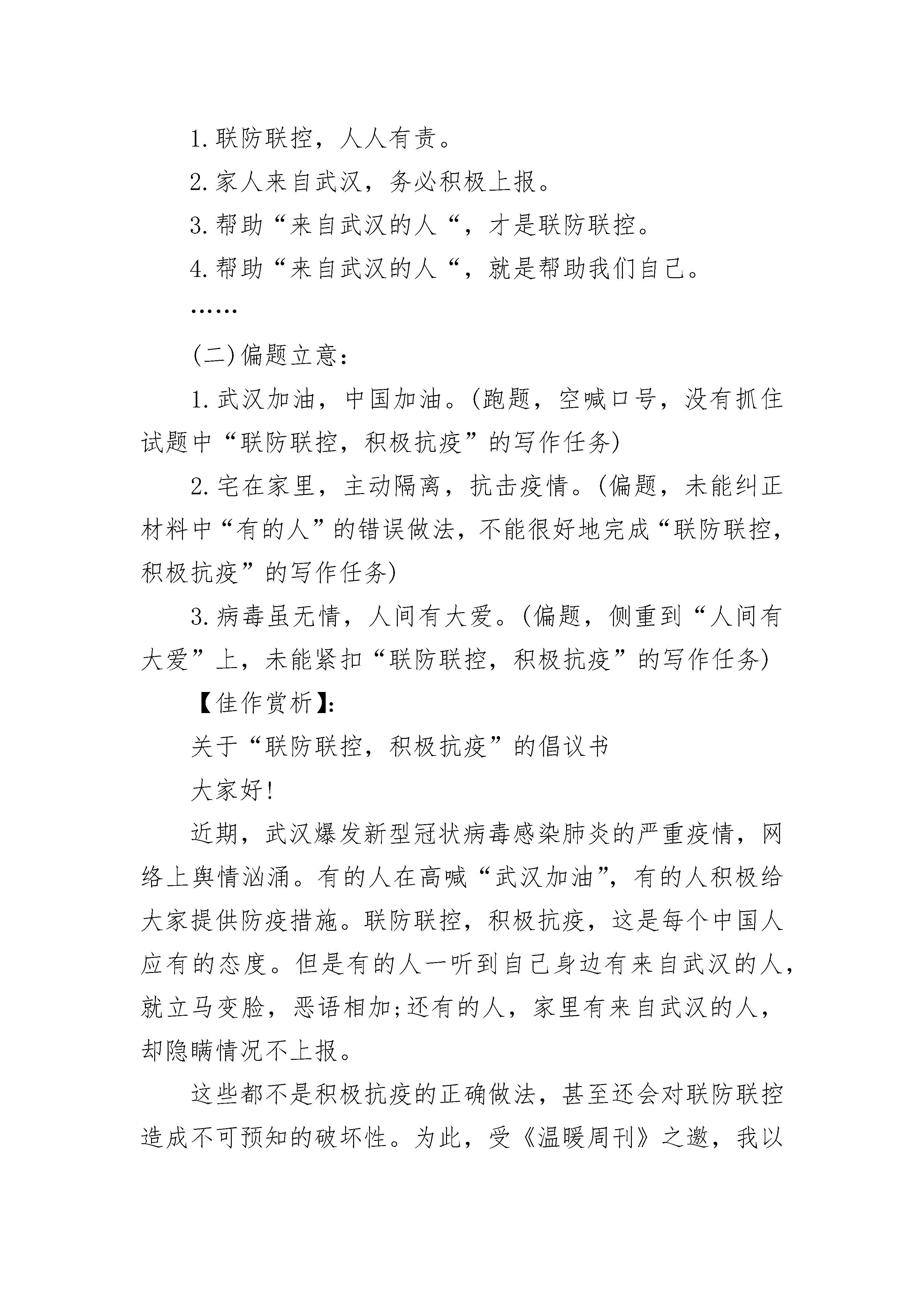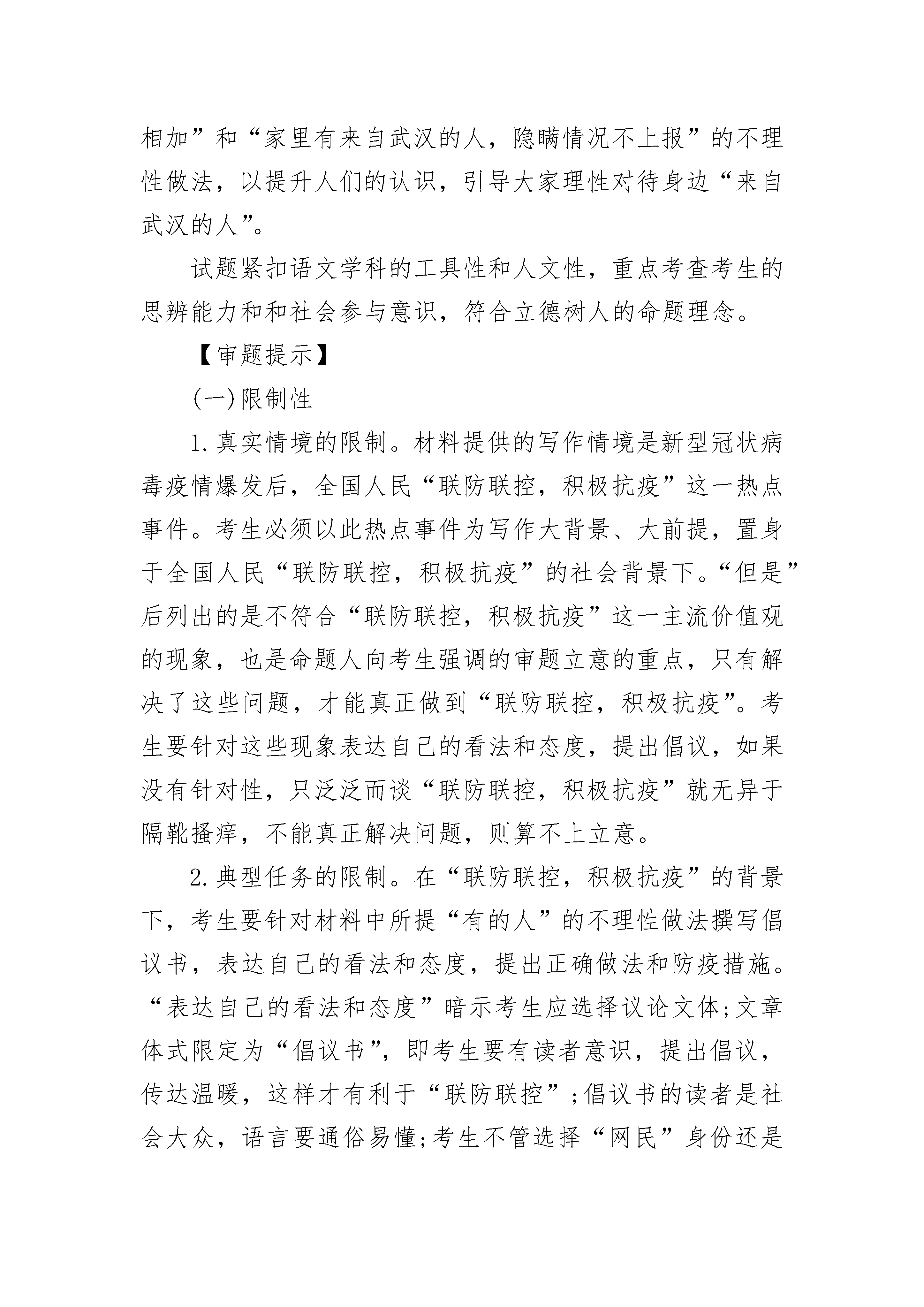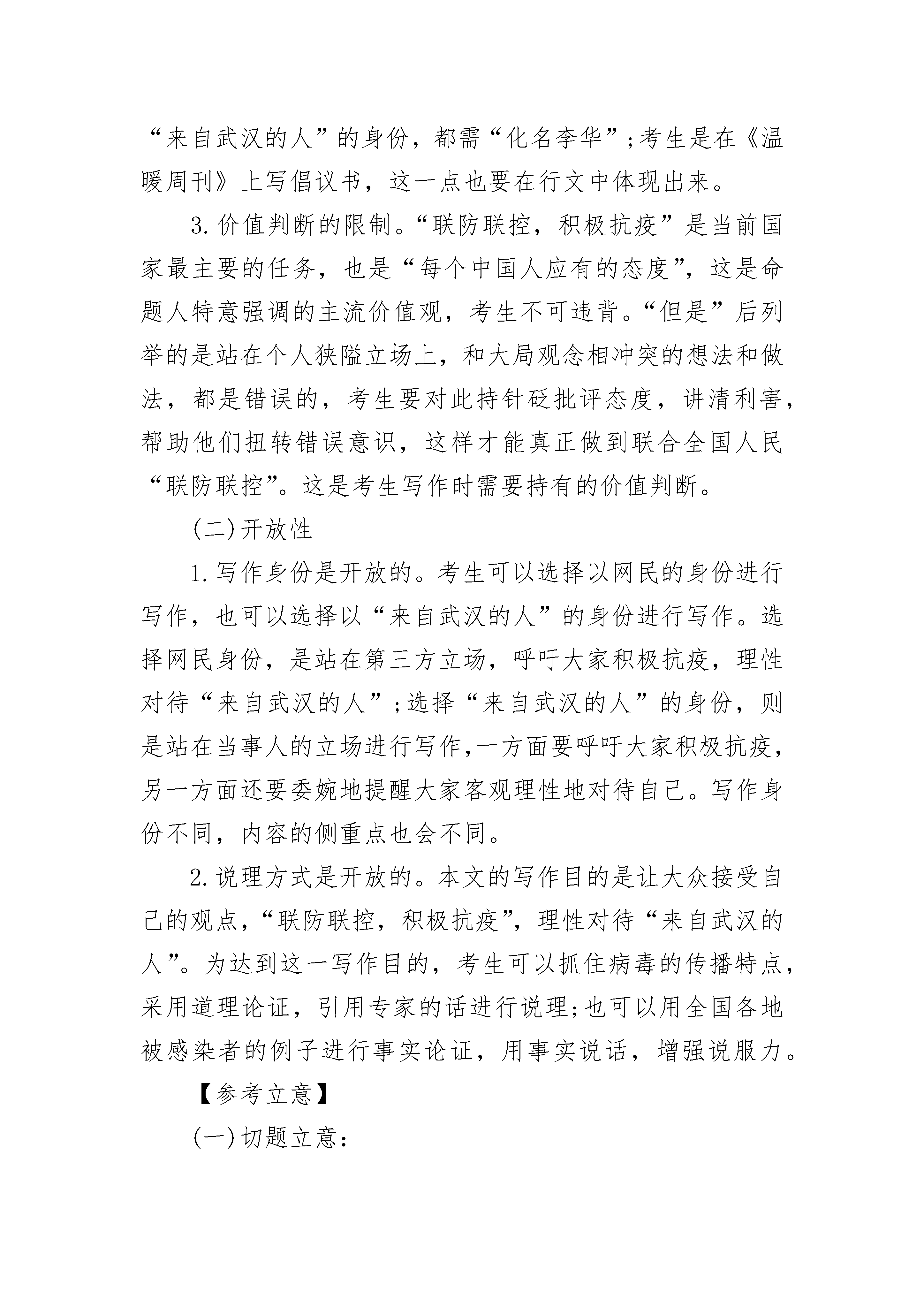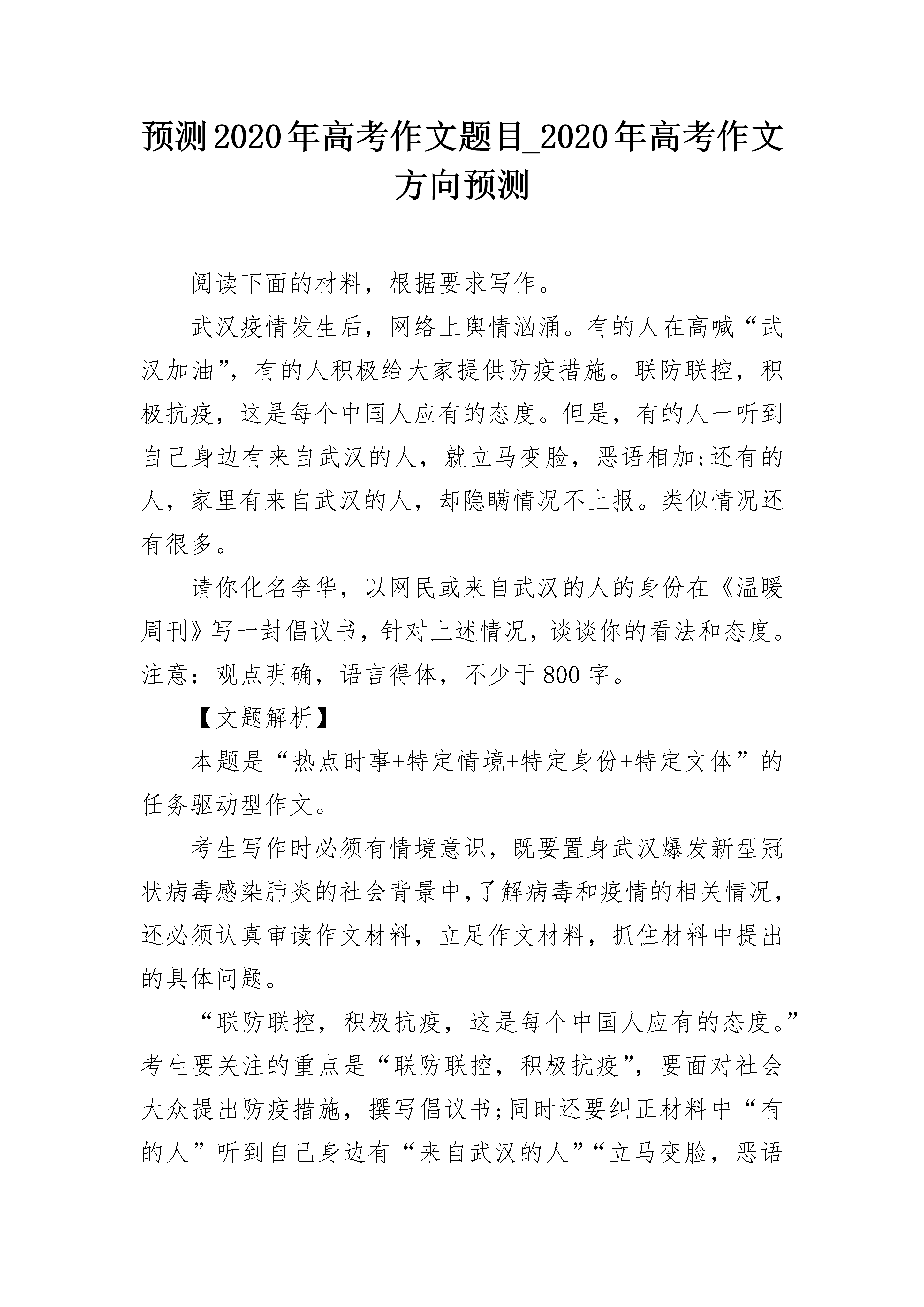 预测2020年高考作文题目_2020年高考作文方向预测阅读下面的材料,根据要求写作。武汉疫情发生后,网络上舆情汹涌。有的人在高喊“武汉加油”,有的人积极给大家提供防疫措施。联防联控,积极抗疫,这是每个中国人应有的态度。但是,有的人一听到自己身边有来自武汉的人,就立马变脸,恶语相加;还有的人,家里有来自武汉的人,却隐瞒情况不上报。类似情况还有很多。请你化名李华,以网民或来自武汉的人的身份在《温暖周刊》写一封倡议书,针对上述情况,谈谈你的看法和态度。注意:观点明确,语言得体,不少于800字。【文题解析】本题是“热点时事+特定情境+特定身份+特定文体”的任务驱动型作文。考生写作时必须有情境意识,既要置身武汉爆发新型冠状病毒感染肺炎的社会背景中,了解病毒和疫情的相关情况,还必须认真审读作文材料,立足作文材料,抓住材料中提出的具体问题。“联防联控,积极抗疫,这是每个中国人应有的态度。”考生要关注的重点是“联防联控,积极抗疫”,要面对社会大众提出防疫措施,撰写倡议书;同时还要纠正材料中“有的人”听到自己身边有“来自武汉的人”“立马变脸,恶语相加”和“家里有来自武汉的人,隐瞒情况不上报”的不理性做法,以提升人们的认识,引导大家理性对待身边“来自武汉的人”。试题紧扣语文学科的工具性和人文性,重点考查考生的思辨能力和和社会参与意识,符合立德树人的命题理念。【审题提示】(一)限制性1.真实情境的限制。材料提供的写作情境是新型冠状病毒疫情爆发后,全国人民“联防联控,积极抗疫”这一热点事件。考生必须以此热点事件为写作大背景、大前提,置身于全国人民“联防联控,积极抗疫”的社会背景下。“但是”后列出的是不符合“联防联控,积极抗疫”这一主流价值观的现象,也是命题人向考生强调的审题立意的重点,只有解决了这些问题,才能真正做到“联防联控,积极抗疫”。考生要针对这些现象表达自己的看法和态度,提出倡议,如果没有针对性,只泛泛而谈“联防联控,积极抗疫”就无异于隔靴搔痒,不能真正解决问题,则算不上立意。2.典型任务的限制。在“联防联控,积极抗疫”的背景下,考生要针对材料中所提“有的人”的不理性做法撰写倡议书,表达自己的看法和态度,提出正确做法和防疫措施。“表达自己的看法和态度”暗示考生应选择议论文体;文章体式限定为“倡议书”,即考生要有读者意识,提出倡议,传达温暖,这样才有利于“联防联控”;倡议书的读者是社会大众,语言要通俗易懂;考生不管选择“网民”身份还是“来自武汉的人”的身份,都需“化名李华”;考生是在《温暖周刊》上写倡议书,这一点也要在行文中体现出来。3.价值判断的限制。“联防联控,积极抗疫”是当前国家最主要的任务,也是“每个中国人应有的态度”,这是命题人特意强调的主流价值观,考生不可违背。“但是”后列举的是站在个人狭隘立场上,和大局观念相冲突的想法和做法,都是错误的,考生要对此持针砭批评态度,讲清利害,帮助他们扭转错误意识,这样才能真正做到联合全国人民“联防联控”。这是考生写作时需要持有的价值判断。(二)开放性1.写作身份是开放的。考生可以选择以网民的身份进行写作,也可以选择以“来自武汉的人”的身份进行写作。选择网民身份,是站在第三方立场,呼吁大家积极抗疫,理性对待“来自武汉的人”;选择“来自武汉的人”的身份,则是站在当事人的立场进行写作,一方面要呼吁大家积极抗疫,另一方面还要委婉地提醒大家客观理性地对待自己。写作身份不同,内容的侧重点也会不同。2.说理方式是开放的。本文的写作目的是让大众接受自己的观点,“联防联控,积极抗疫”,理性对待“来自武汉的人”。为达到这一写作目的,考生可以抓住病毒的传播特点,采用道理论证,引用专家的话进行说理;也可以用全国各地被感染者的例子进行事实论证,用事实说话,增强说服力。【参考立意】(一)切题立意:1.联防联控,人人有责。2.家人来自武汉,务必积极上报。3.帮助“来自武汉的人“,才是联防联控。4.帮助“来自武汉的人“,就是帮助我们自己。……(二)偏题立意:1.武汉加油,中国加油。(跑题,空喊口号,没有抓住试题中“联防联控,积极抗疫”的写作任务)2.宅在家里,主动隔离,抗击疫情。(偏题,未能纠正材料中“有的人”的错误做法,不能很好地完成“联防联控,积极抗疫”的写作任务)3.病毒虽无情,人间有大爱。(偏题,侧重到“人间有大爱”上,未能紧扣“联防联控,积极抗疫”的写作任务)【佳作赏析】:关于“联防联控,积极抗疫”的倡议书大家好!近期,武汉爆发新型冠状病毒感染肺炎的严重疫情,网络上舆情汹涌。有的人在高喊“武汉加油”,有的人积极给大家提供防疫措施。联防联控,积极抗疫,这是每个中国人应有的态度。但是有的人一听到自己身边有来自武汉的人,就立马变脸,恶语相加;还有的人,家里有来自武汉的人,却隐瞒情况不上报。这些都不是积极抗疫的正确做法,甚至