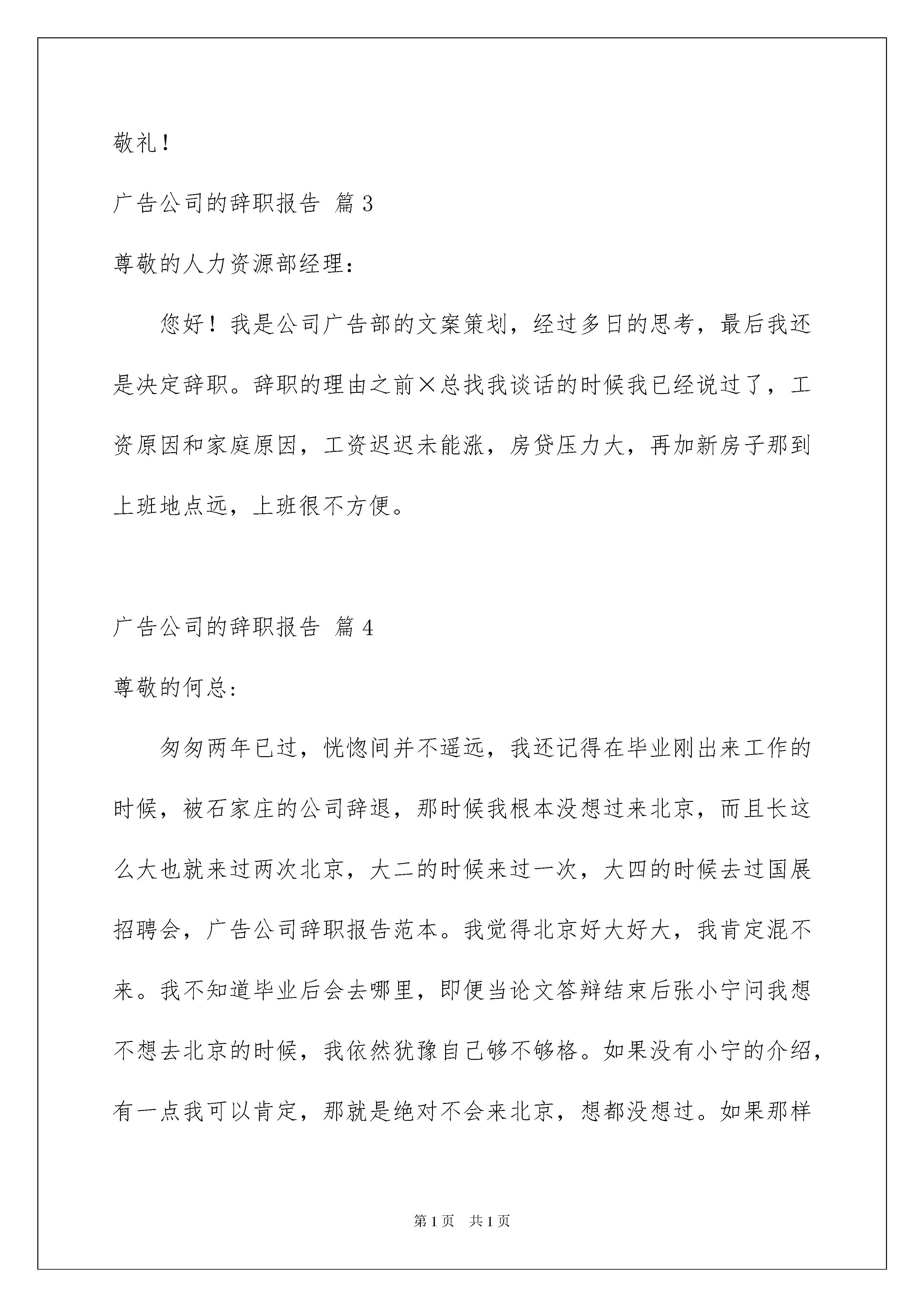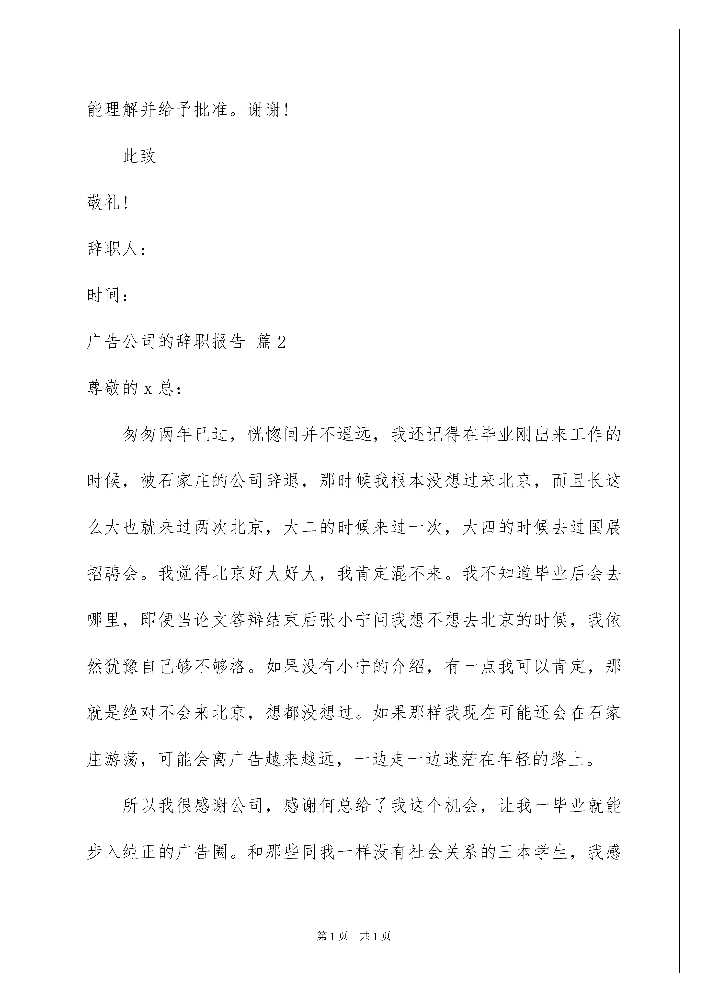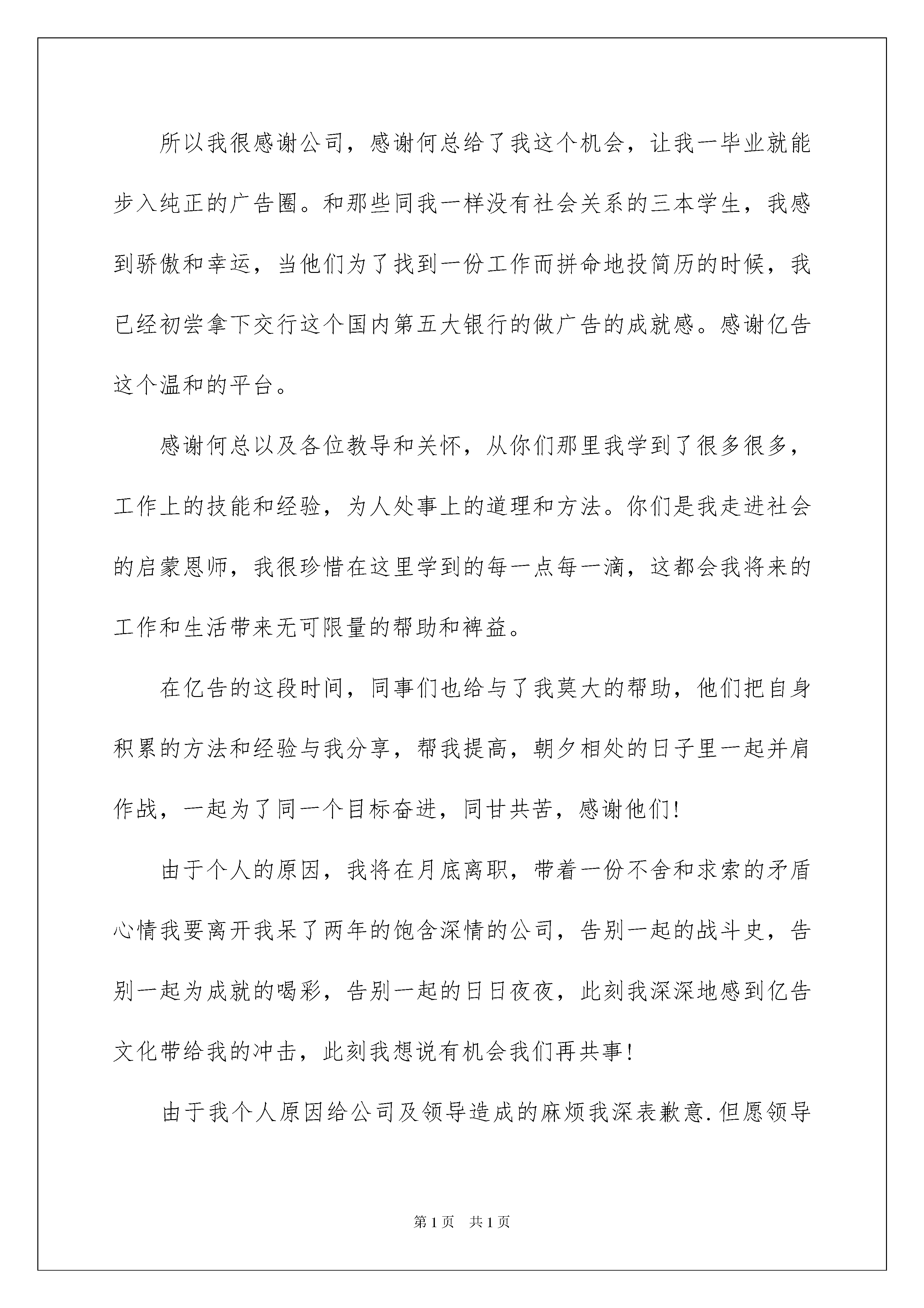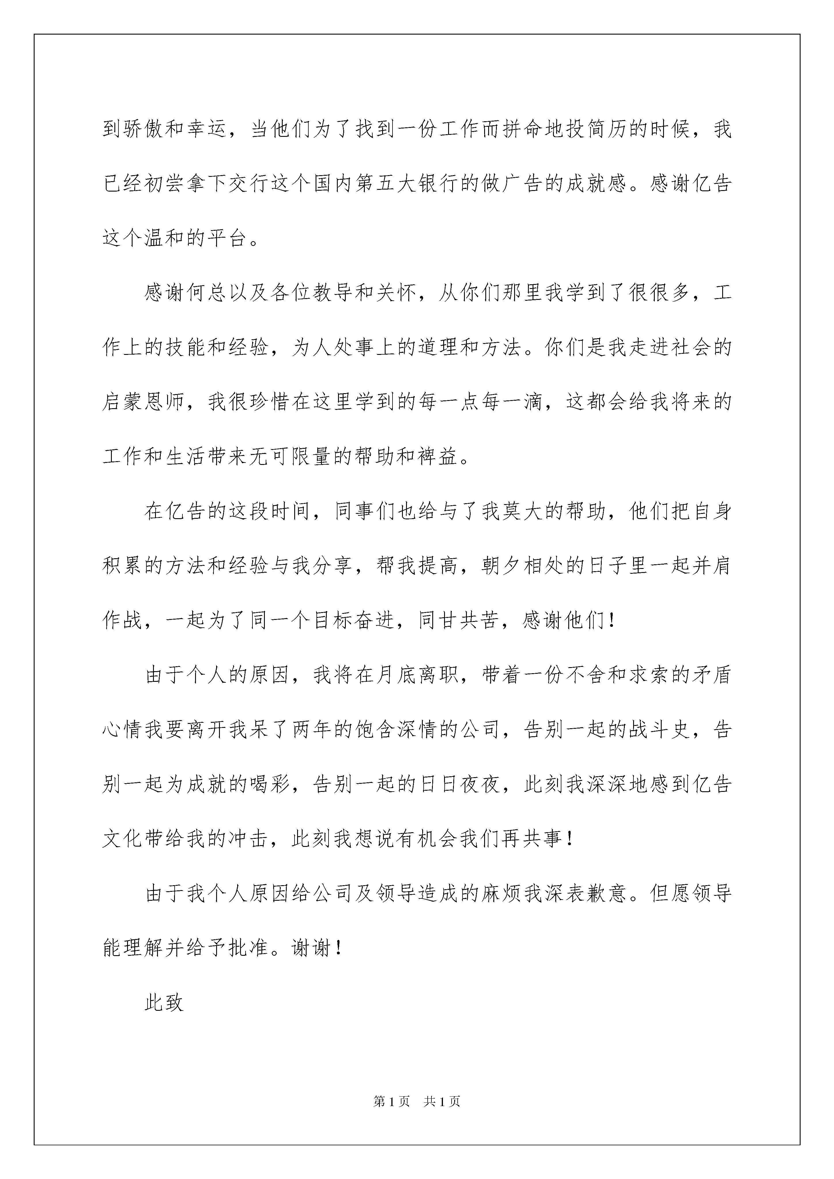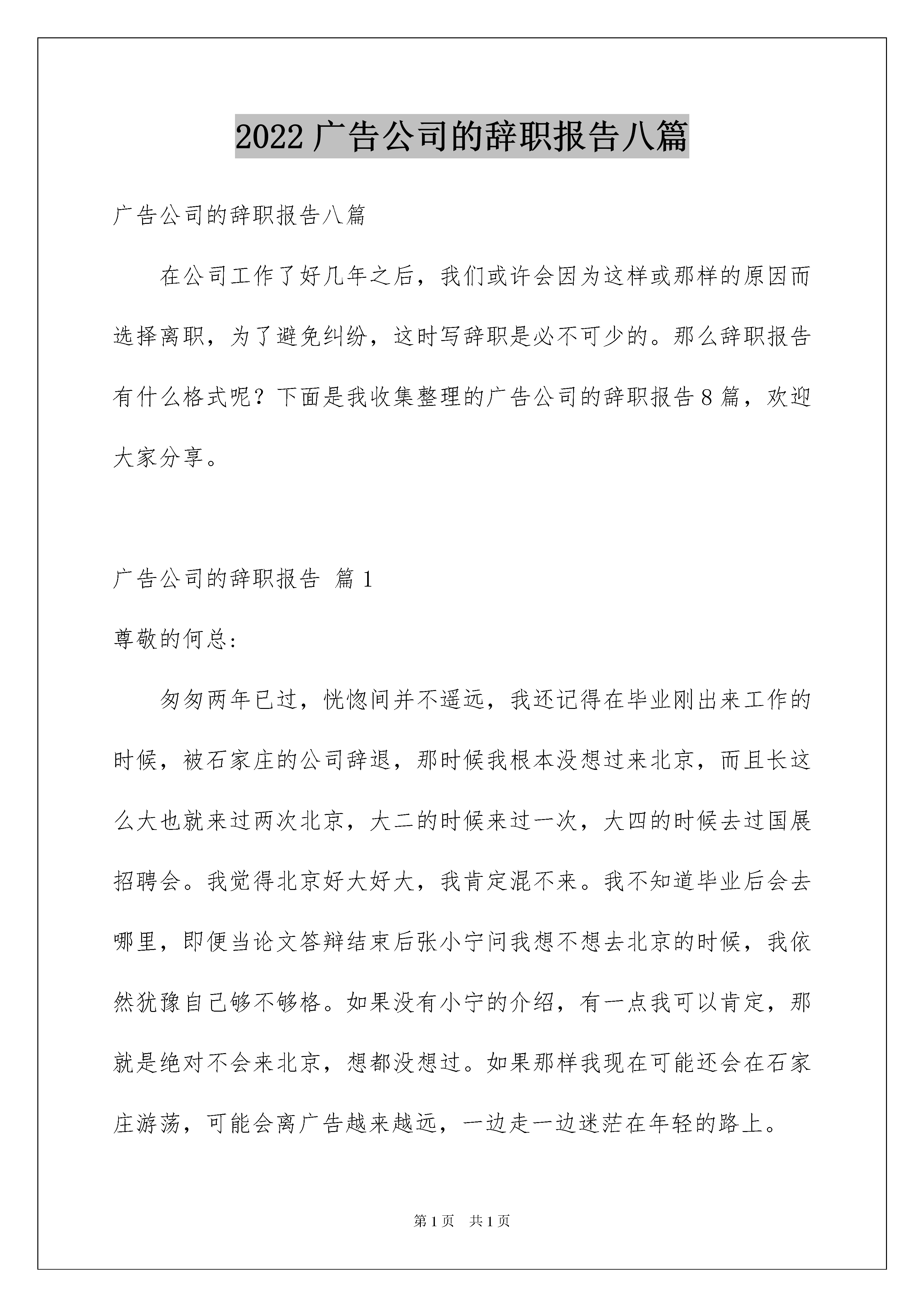 2022广告公司的辞职报告八篇广告公司的辞职报告八篇在公司工作了好几年之后,我们或许会因为这样或那样的原因而选择离职,为了避免纠纷,这时写辞职是必不可少的。那么辞职报告有什么格式呢?下面是我收集整理的广告公司的辞职报告8篇,欢迎大家分享。广告公司的辞职报告篇1尊敬的何总:匆匆两年已过,恍惚间并不遥远,我还记得在毕业刚出来工作的时候,被石家庄的公司辞退,那时候我根本没想过来北京,而且长这么大也就来过两次北京,大二的时候来过一次,大四的时候去过国展招聘会。我觉得北京好大好大,我肯定混不来。我不知道毕业后会去哪里,即便当论文答辩结束后张小宁问我想不想去北京的时候,我依然犹豫自己够不够格。如果没有小宁的介绍,有一点我可以肯定,那就是绝对不会来北京,想都没想过。如果那样我现在可能还会在石家庄游荡,可能会离广告越来越远,一边走一边迷茫在年轻的路上。所以我很感谢公司,感谢何总给了我这个机会,让我一毕业就能步入纯正的广告圈。和那些同我一样没有社会关系的三本学生,我感到骄傲和幸运,当他们为了找到一份工作而拼命地投简历的时候,我已经初尝拿下交行这个国内第五大银行的做广告的成就感。感谢亿告这个温和的平台。感谢何总以及各位教导和关怀,从你们那里我学到了很多很多,工作上的技能和经验,为人处事上的道理和方法。你们是我走进社会的启蒙恩师,我很珍惜在这里学到的每一点每一滴,这都会我将来的工作和生活带来无可限量的帮助和裨益。在亿告的这段时间,同事们也给与了我莫大的帮助,他们把自身积累的方法和经验与我分享,帮我提高,朝夕相处的日子里一起并肩作战,一起为了同一个目标奋进,同甘共苦,感谢他们!由于个人的原因,我将在月底离职,带着一份不舍和求索的矛盾心情我要离开我呆了两年的饱含深情的公司,告别一起的战斗史,告别一起为成就的喝彩,告别一起的日日夜夜,此刻我深深地感到亿告文化带给我的冲击,此刻我想说有机会我们再共事!由于我个人原因给公司及领导造成的麻烦我深表歉意.但愿领导能理解并给予批准。谢谢!此致敬礼!辞职人:时间:广告公司的辞职报告篇2尊敬的x总:匆匆两年已过,恍惚间并不遥远,我还记得在毕业刚出来工作的时候,被石家庄的公司辞退,那时候我根本没想过来北京,而且长这么大也就来过两次北京,大二的时候来过一次,大四的时候去过国展招聘会。我觉得北京好大好大,我肯定混不来。我不知道毕业后会去哪里,即便当论文答辩结束后张小宁问我想不想去北京的时候,我依然犹豫自己够不够格。如果没有小宁的介绍,有一点我可以肯定,那就是绝对不会来北京,想都没想过。如果那样我现在可能还会在石家庄游荡,可能会离广告越来越远,一边走一边迷茫在年轻的路上。所以我很感谢公司,感谢何总给了我这个机会,让我一毕业就能步入纯正的广告圈。和那些同我一样没有社会关系的三本学生,我感到骄傲和幸运,当他们为了找到一份工作而拼命地投简历的时候,我已经初尝拿下交行这个国内第五大银行的做广告的成就感。感谢亿告这个温和的平台。感谢何总以及各位教导和关怀,从你们那里我学到了很很多,工作上的技能和经验,为人处事上的道理和方法。你们是我走进社会的启蒙恩师,我很珍惜在这里学到的每一点每一滴,这都会给我将来的工作和生活带来无可限量的帮助和裨益。在亿告的这段时间,同事们也给与了我莫大的帮助,他们把自身积累的方法和经验与我分享,帮我提高,朝夕相处的日子里一起并肩作战,一起为了同一个目标奋进,同甘共苦,感谢他们!由于个人的原因,我将在月底离职,带着一份不舍和求索的矛盾心情我要离开我呆了两年的饱含深情的公司,告别一起的战斗史,告别一起为成就的喝彩,告别一起的日日夜夜,此刻我深深地感到亿告文化带给我的冲击,此刻我想说有机会我们再共事!由于我个人原因给公司及领导造成的麻烦我深表歉意。但愿领导能理解并给予批准。谢谢!此致敬礼!广告公司的辞职报告篇3尊敬的人力资源部经理:您好!我是公司广告部的文案策划,经过多日的思考,最后我还是决定辞职。辞职的理由之前×总找我谈话的时候我已经说过了,工资原因和家庭原因,工资迟迟未能涨,房贷压力大,再加新房子那到上班地点远,上班很不方便。广告公司的辞职报告篇4尊敬的何总:匆匆两年已过,恍惚间并不遥远,我还记得在毕业刚出来工作的时候,被石家庄的公司辞退,那时候我根本没想过来北京,而且长这么大也就来过两次北京,大二的时候来过一次,大四的时候去过国展招聘会,广告公司辞职报告范本。我觉得北京好大好大,我肯定混不来。我不知道毕业后会去哪里,即便当论文答辩结束后张小宁问我想不想去北京的时候,我依然犹豫自己够不够格。如果没有小宁的介绍,有一点我可以肯定,那就是绝对不会来北京,想都没想过。