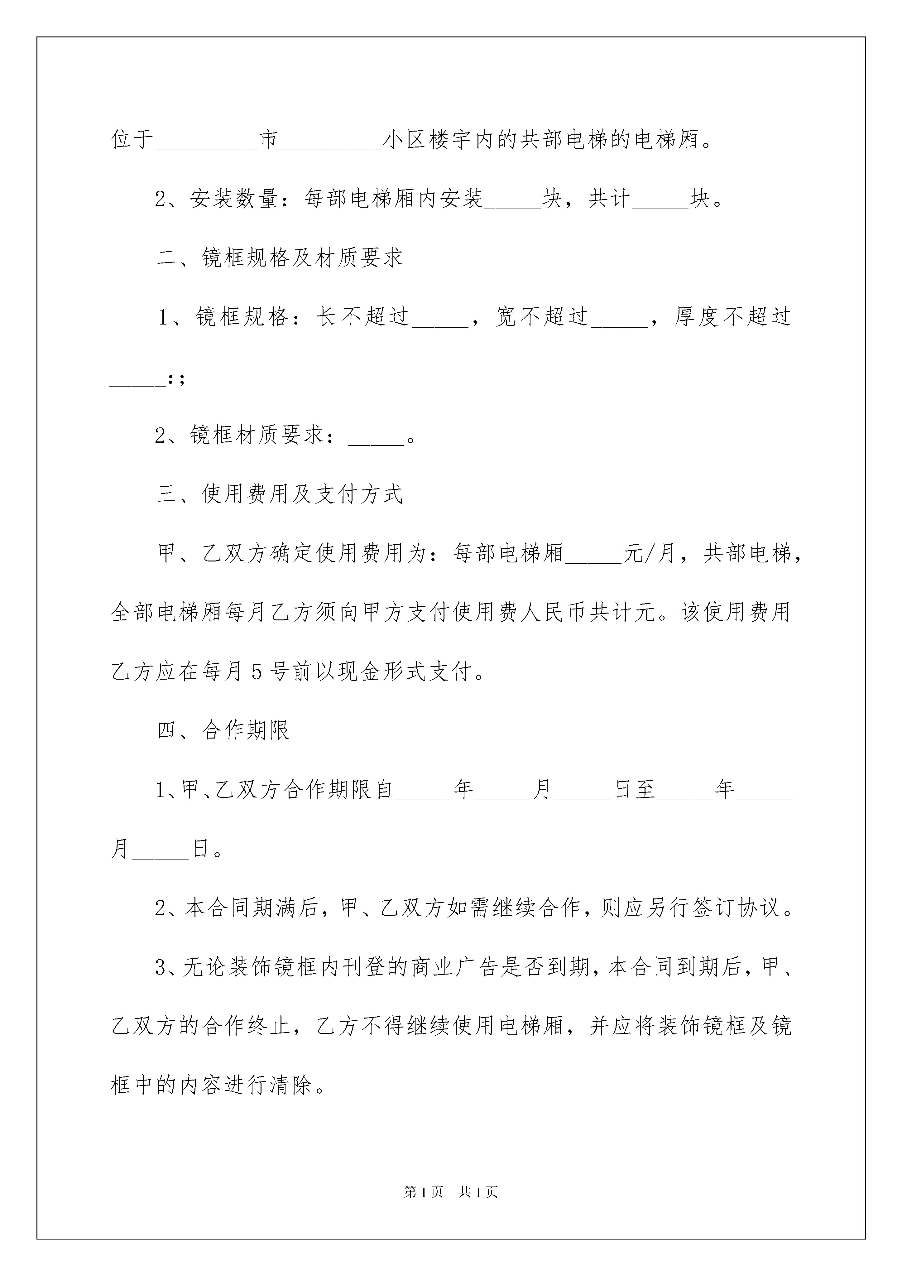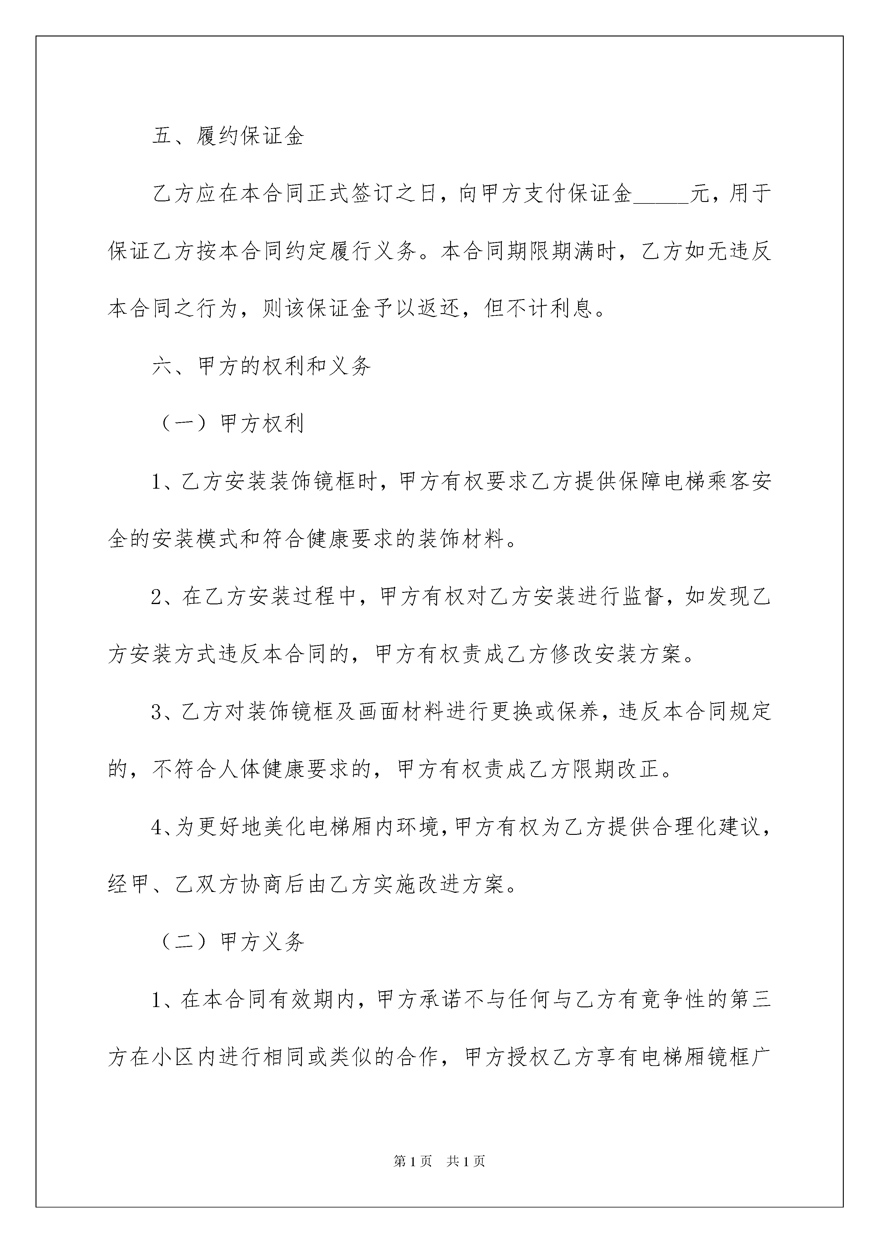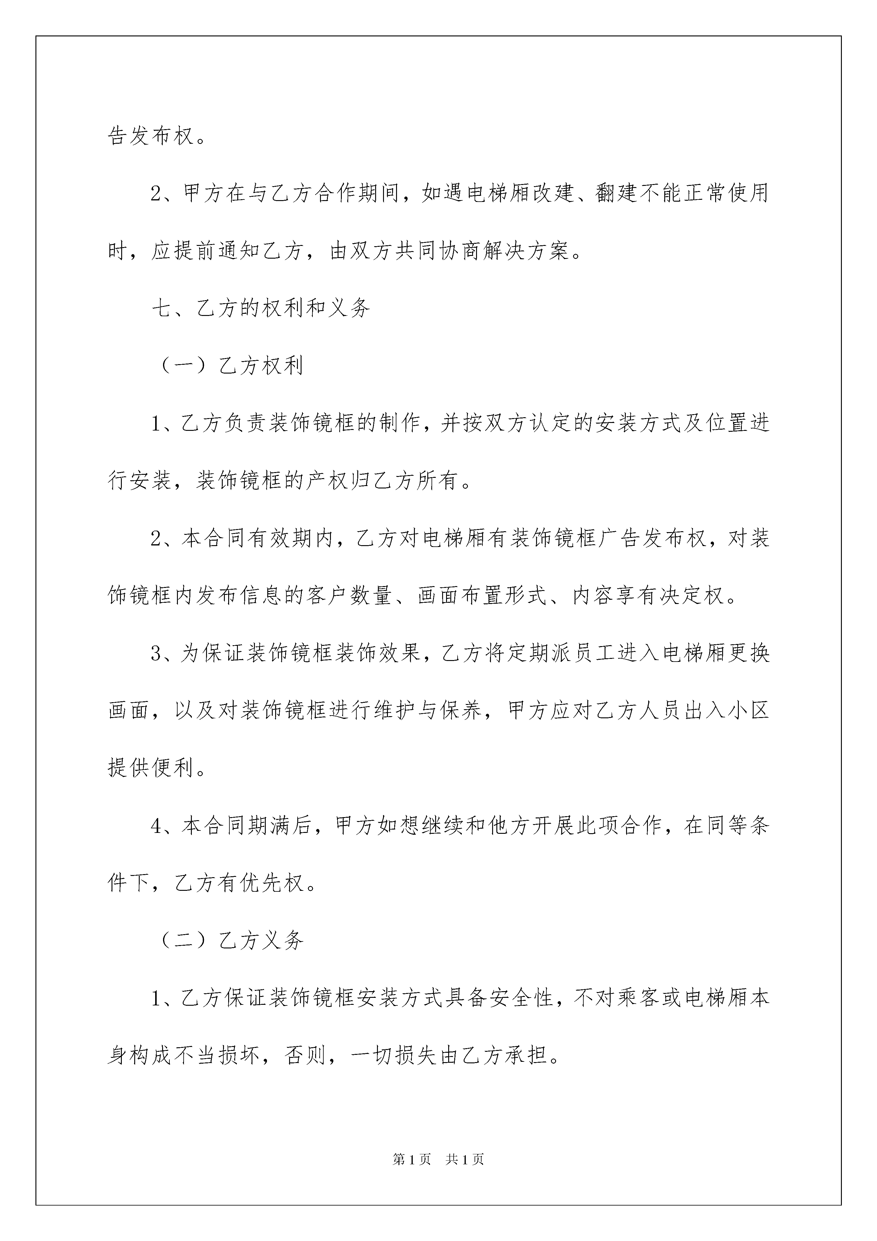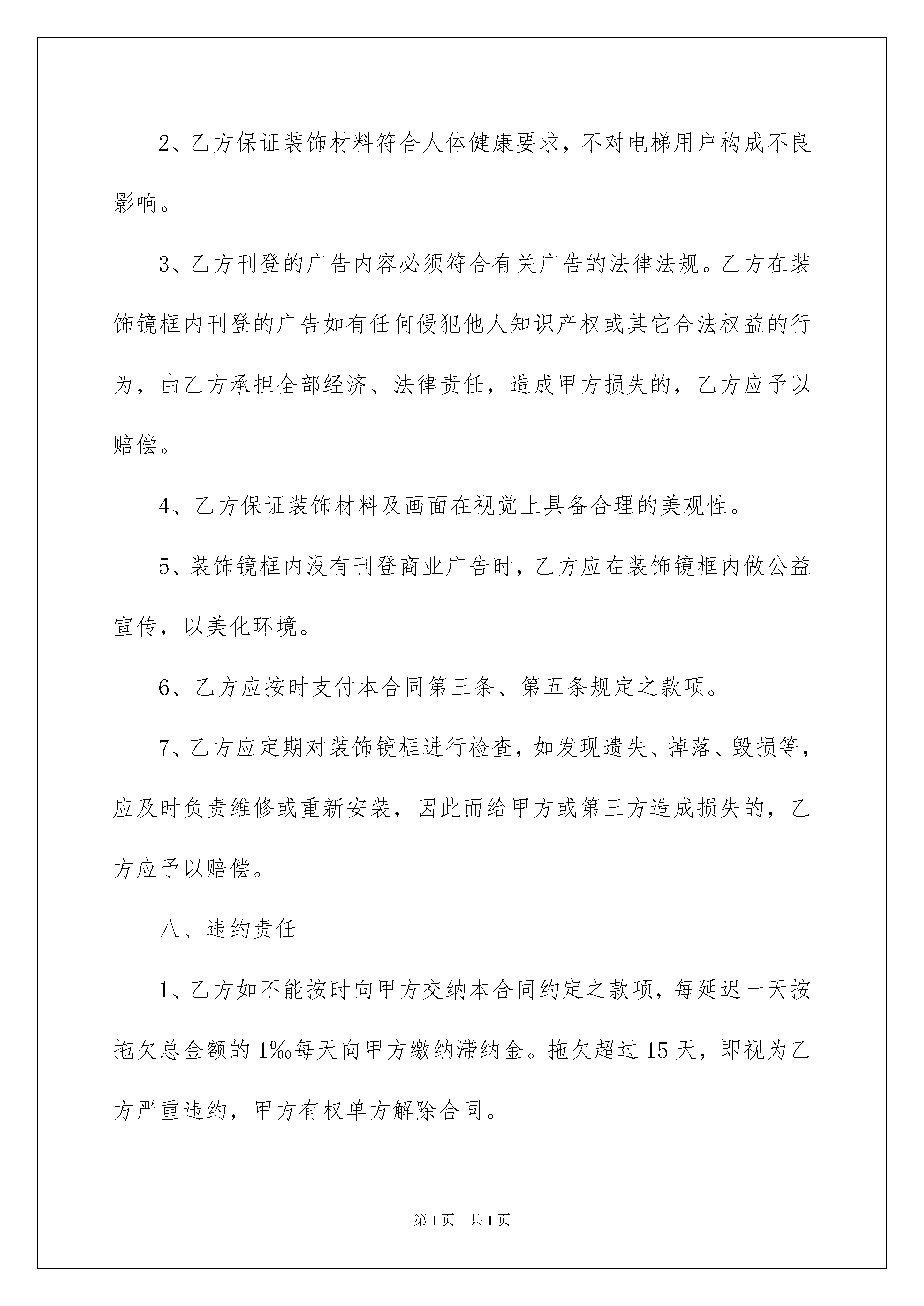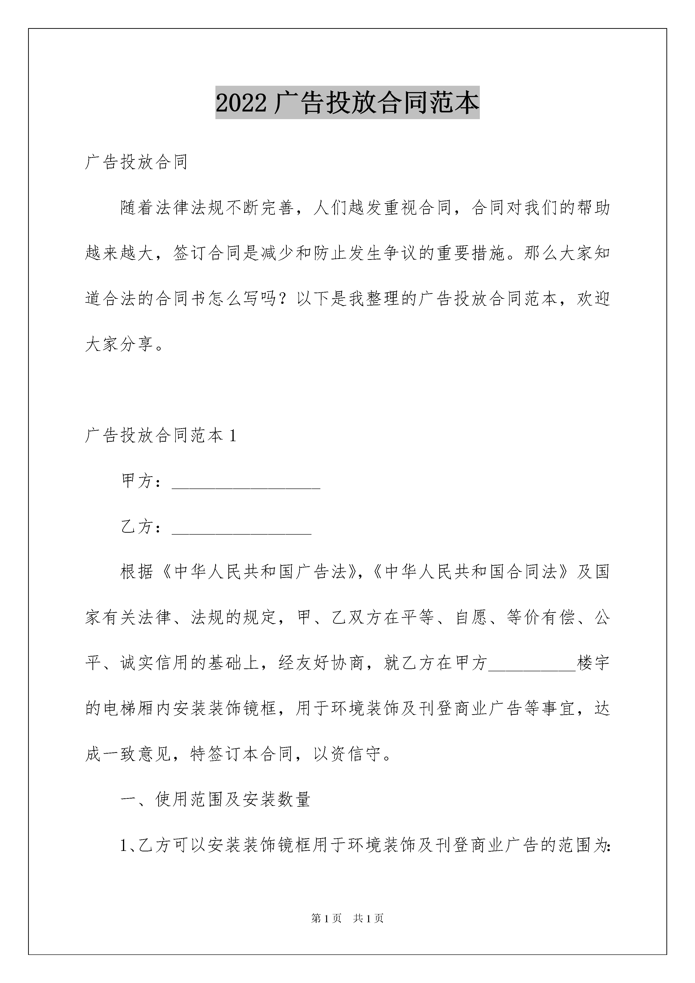 2022广告投放合同范本广告投放合同随着法律法规不断完善,人们越发重视合同,合同对我们的帮助越来越大,签订合同是减少和防止发生争议的重要措施。那么大家知道合法的合同书怎么写吗?以下是我整理的广告投放合同范本,欢迎大家分享。广告投放合同范本1甲方:_________________乙方:________________根据《中华人民共和国广告法》,《中华人民共和国合同法》及国家有关法律、法规的规定,甲、乙双方在平等、自愿、等价有偿、公平、诚实信用的基础上,经友好协商,就乙方在甲方__________楼宇的电梯厢内安装装饰镜框,用于环境装饰及刊登商业广告等事宜,达成一致意见,特签订本合同,以资信守。一、使用范围及安装数量1、乙方可以安装装饰镜框用于环境装饰及刊登商业广告的范围为:位于_________市_________小区楼宇内的共部电梯的电梯厢。2、安装数量:每部电梯厢内安装_____块,共计_____块。二、镜框规格及材质要求1、镜框规格:长不超过_____,宽不超过_____,厚度不超过_____:;2、镜框材质要求:_____。三、使用费用及支付方式甲、乙双方确定使用费用为:每部电梯厢_____元/月,共部电梯,全部电梯厢每月乙方须向甲方支付使用费人民币共计元。该使用费用乙方应在每月5号前以现金形式支付。四、合作期限1、甲、乙双方合作期限自_____年_____月_____日至_____年_____月_____日。2、本合同期满后,甲、乙双方如需继续合作,则应另行签订协议。3、无论装饰镜框内刊登的商业广告是否到期,本合同到期后,甲、乙双方的合作终止,乙方不得继续使用电梯厢,并应将装饰镜框及镜框中的内容进行清除。五、履约保证金乙方应在本合同正式签订之日,向甲方支付保证金_____元,用于保证乙方按本合同约定履行义务。本合同期限期满时,乙方如无违反本合同之行为,则该保证金予以返还,但不计利息。六、甲方的权利和义务(一)甲方权利1、乙方安装装饰镜框时,甲方有权要求乙方提供保障电梯乘客安全的安装模式和符合健康要求的装饰材料。2、在乙方安装过程中,甲方有权对乙方安装进行监督,如发现乙方安装方式违反本合同的,甲方有权责成乙方修改安装方案。3、乙方对装饰镜框及画面材料进行更换或保养,违反本合同规定的,不符合人体健康要求的,甲方有权责成乙方限期改正。4、为更好地美化电梯厢内环境,甲方有权为乙方提供合理化建议,经甲、乙双方协商后由乙方实施改进方案。(二)甲方义务1、在本合同有效期内,甲方承诺不与任何与乙方有竟争性的第三方在小区内进行相同或类似的合作,甲方授权乙方享有电梯厢镜框广告发布权。2、甲方在与乙方合作期间,如遇电梯厢改建、翻建不能正常使用时,应提前通知乙方,由双方共同协商解决方案。七、乙方的权利和义务(一)乙方权利1、乙方负责装饰镜框的制作,并按双方认定的安装方式及位置进行安装,装饰镜框的产权归乙方所有。2、本合同有效期内,乙方对电梯厢有装饰镜框广告发布权,对装饰镜框内发布信息的客户数量、画面布置形式、内容享有决定权。3、为保证装饰镜框装饰效果,乙方将定期派员工进入电梯厢更换画面,以及对装饰镜框进行维护与保养,甲方应对乙方人员出入小区提供便利。4、本合同期满后,甲方如想继续和他方开展此项合作,在同等条件下,乙方有优先权。(二)乙方义务1、乙方保证装饰镜框安装方式具备安全性,不对乘客或电梯厢本身构成不当损坏,否则,一切损失由乙方承担。2、乙方保证装饰材料符合人体健康要求,不对电梯用户构成不良影响。3、乙方刊登的广告内容必须符合有关广告的法律法规。乙方在装饰镜框内刊登的广告如有任何侵犯他人知识产权或其它合法权益的行为,由乙方承担全部经济、法律责任,造成甲方损失的,乙方应予以赔偿。4、乙方保证装饰材料及画面在视觉上具备合理的美观性。5、装饰镜框内没有刊登商业广告时,乙方应在装饰镜框内做公益宣传,以美化环境。6、乙方应按时支付本合同第三条、第五条规定之款项。7、乙方应定期对装饰镜框进行检查,如发现遗失、掉落、毁损等,应及时负责维修或重新安装,因此而给甲方或第三方造成损失的,乙方应予以赔偿。八、违约责任1、乙方如不能按时向甲方交纳本合同约定之款项,每延迟一天按拖欠总金额的1‰每天向甲方缴纳滞纳金。拖欠超过15天,即视为乙方严重违约,甲方有权单方解除合同。2.除本合同约定的条款外,任何一方提出解除本合同,应提前一个月书面通知对方,并向对方支付违约金人民币元。3、因提前解除合同或合同期满双方未续签合同的,乙方须在合同解除或期满后十日内,完成装饰镜框及镜框中内容的清除等工作,若逾期未清除的则须