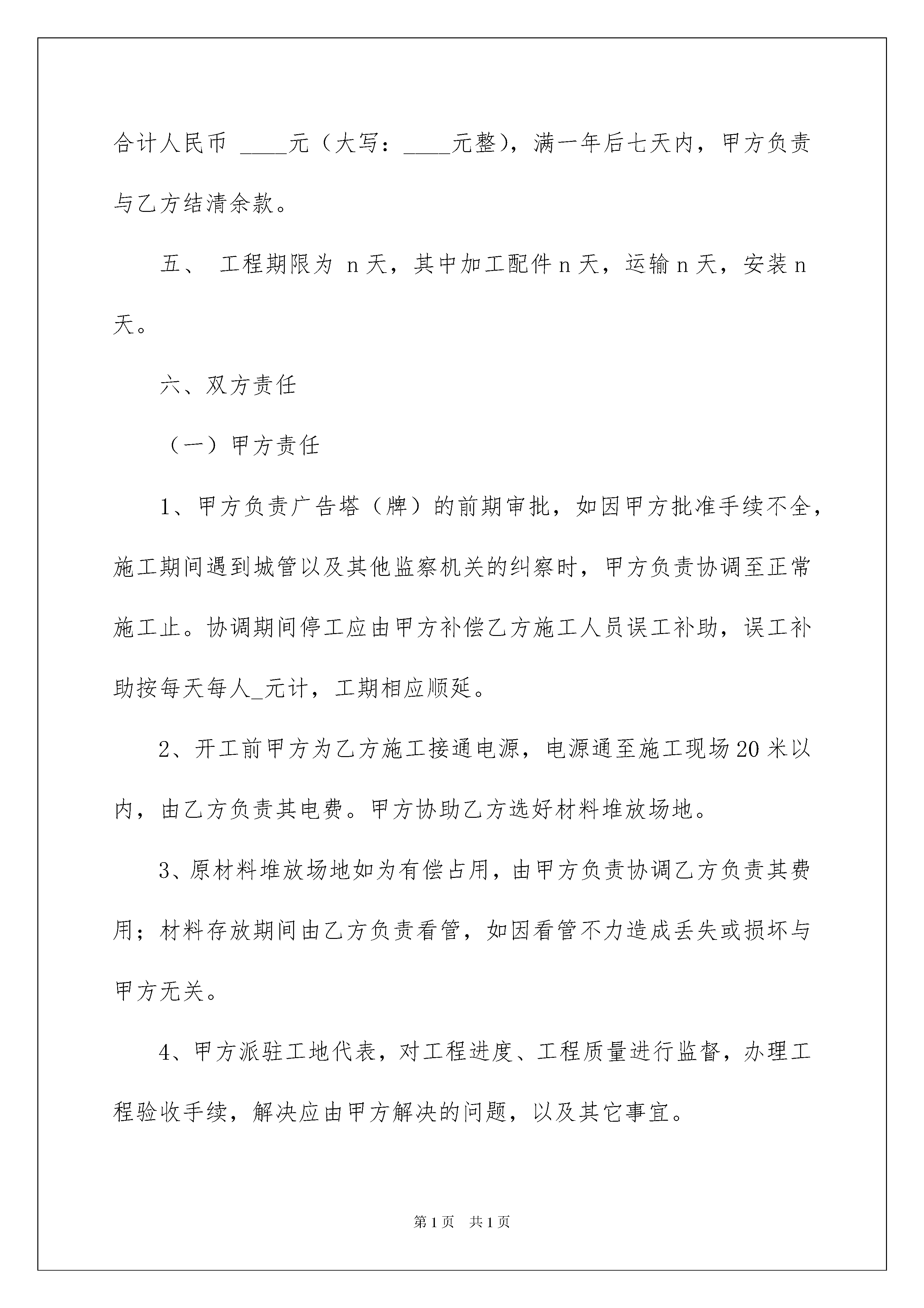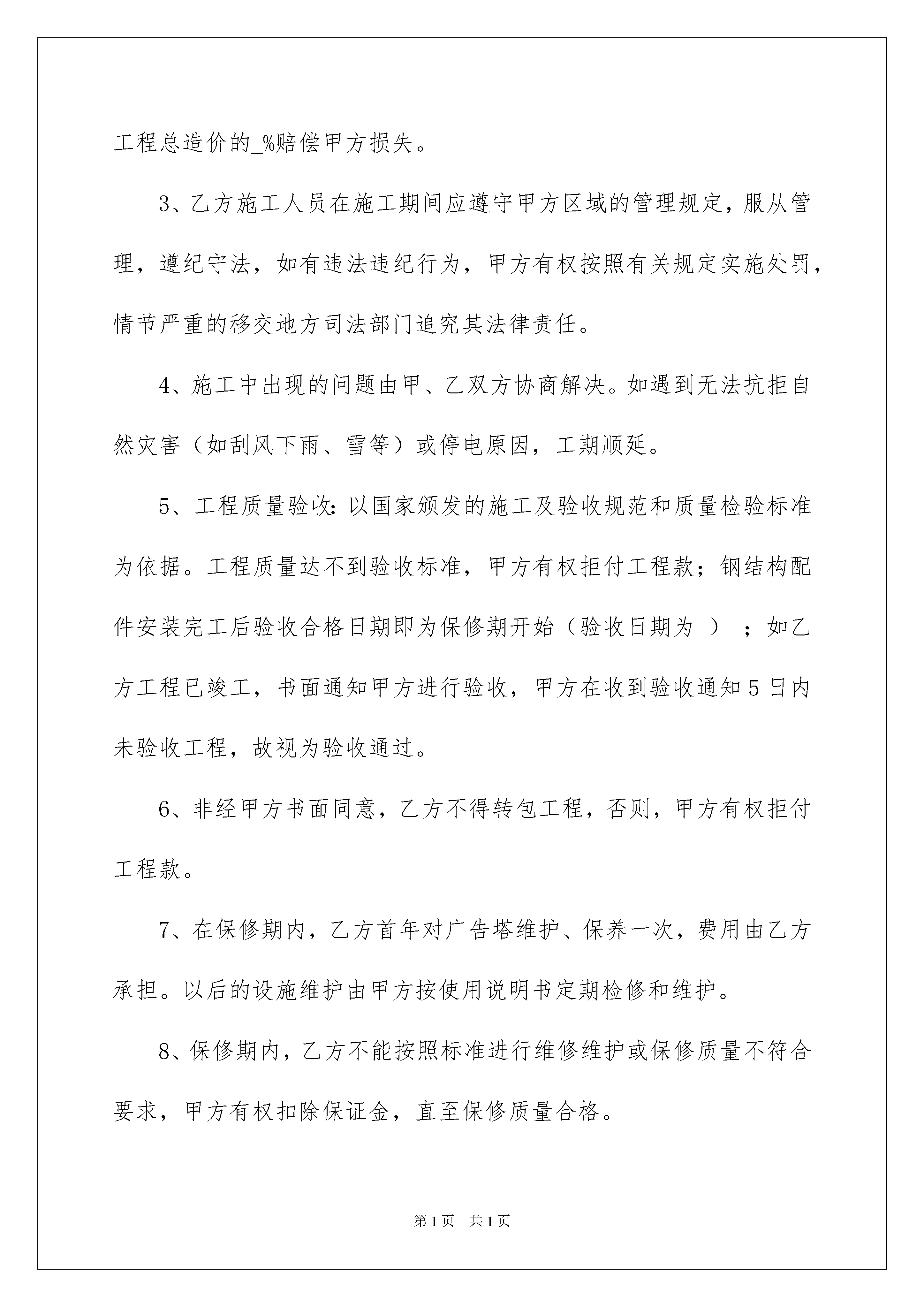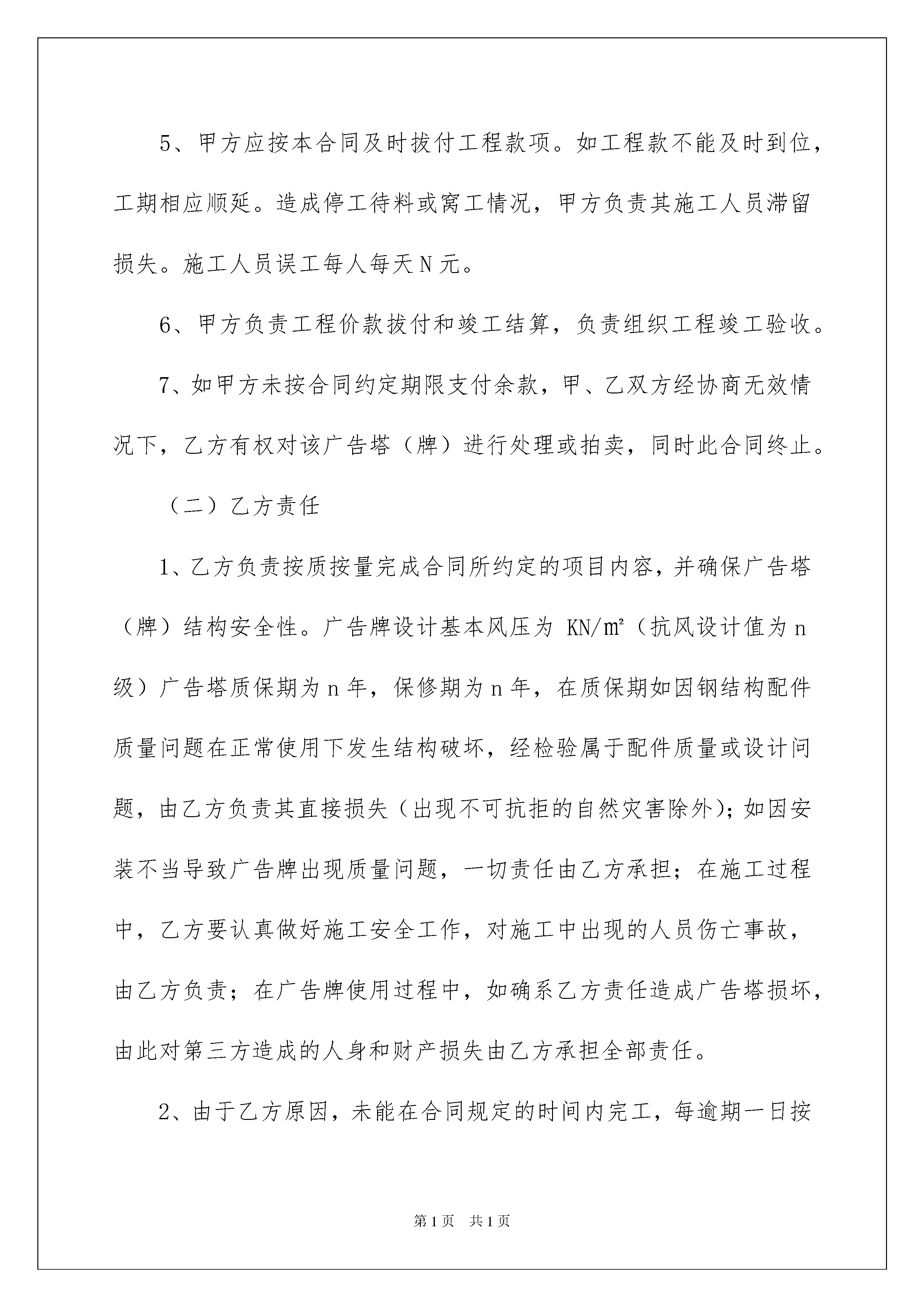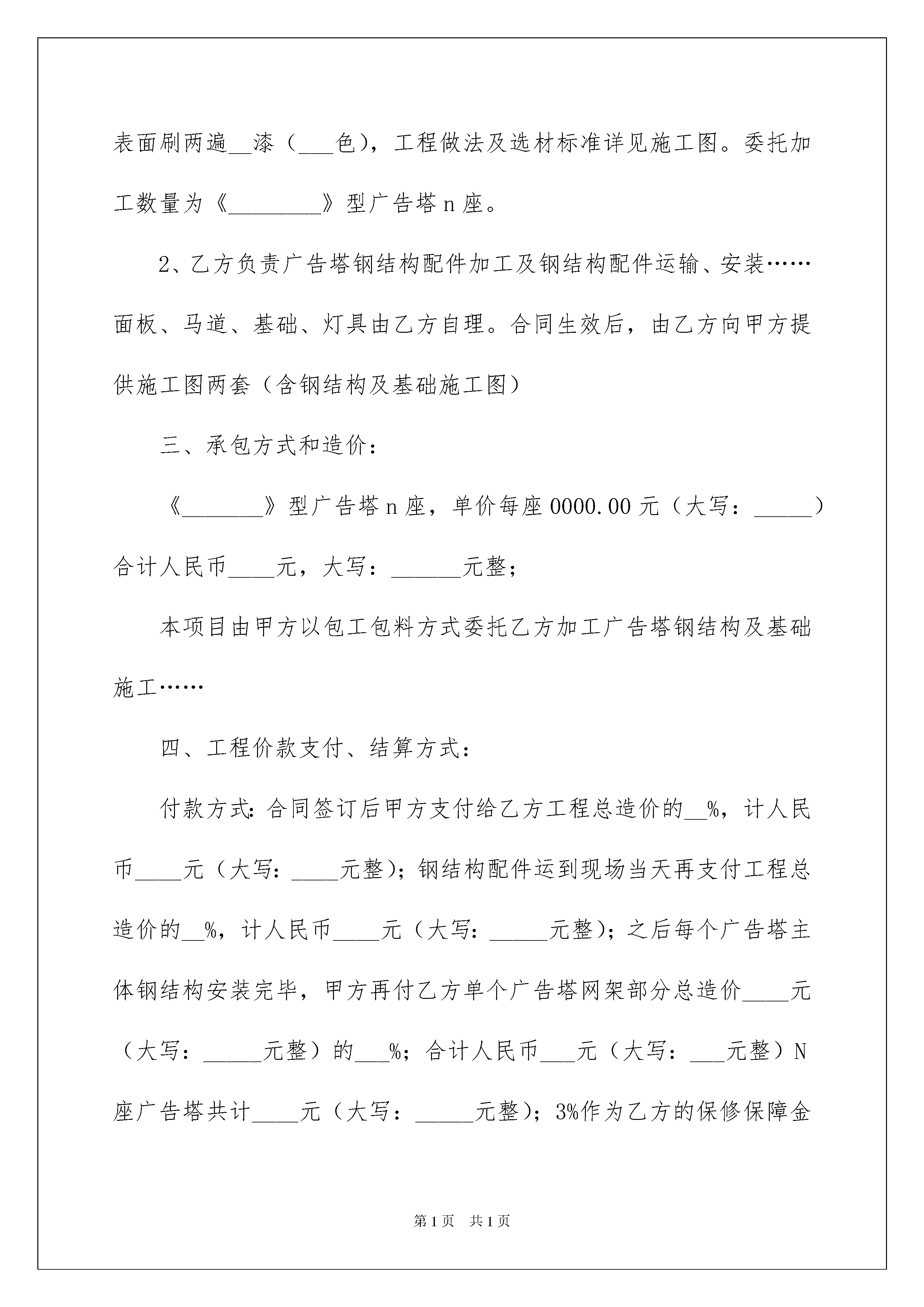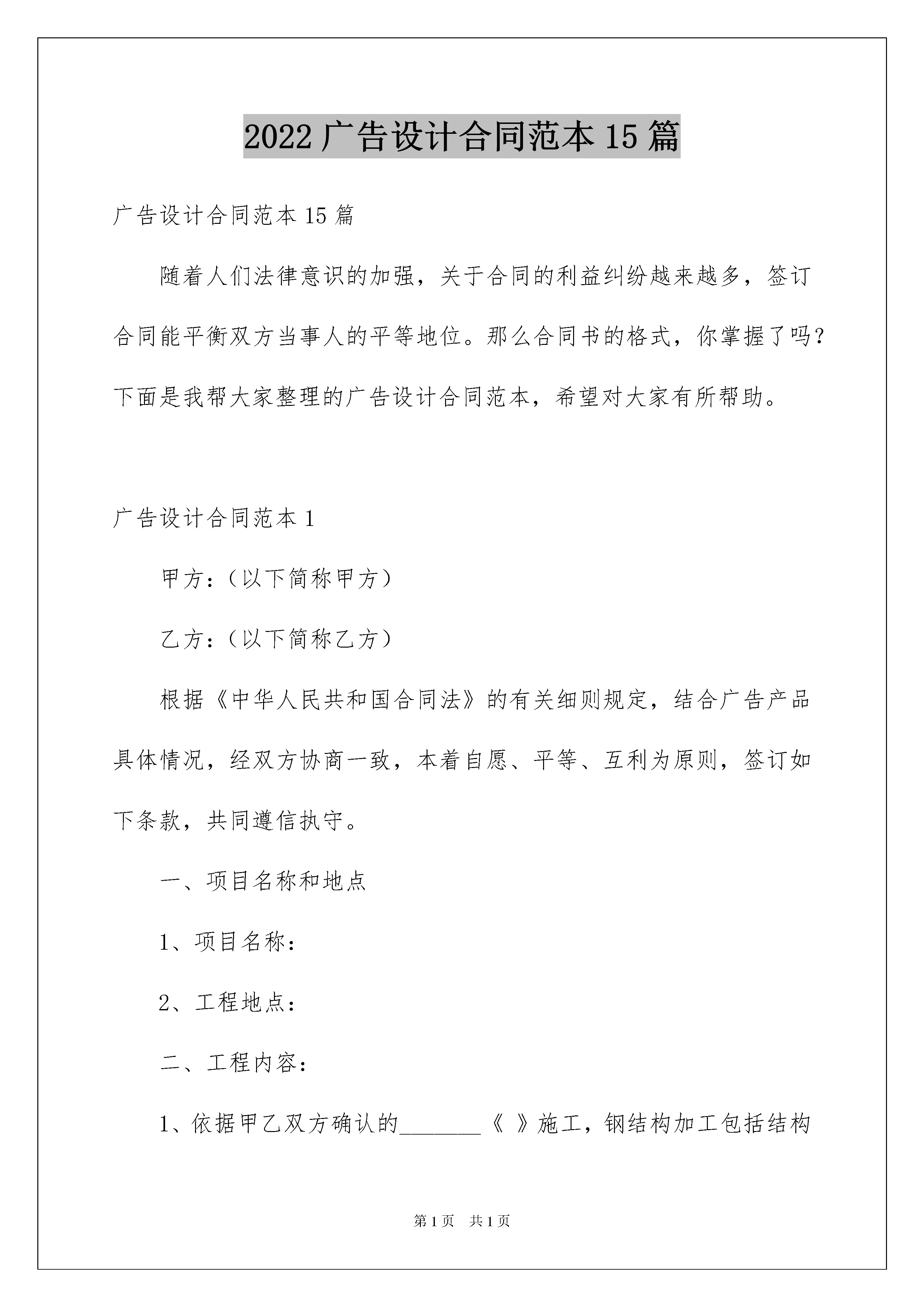 2022广告设计合同范本15篇广告设计合同范本15篇随着人们法律意识的加强,关于合同的利益纠纷越来越多,签订合同能平衡双方当事人的平等地位。那么合同书的格式,你掌握了吗?下面是我帮大家整理的广告设计合同范本,希望对大家有所帮助。广告设计合同范本1甲方:(以下简称甲方)乙方:(以下简称乙方)根据《中华人民共和国合同法》的有关细则规定,结合广告产品具体情况,经双方协商一致,本着自愿、平等、互利为原则,签订如下条款,共同遵信执守。一、项目名称和地点1、项目名称:2、工程地点:二、工程内容:1、依据甲乙双方确认的_______《》施工,钢结构加工包括结构表面刷两遍__漆(___色),工程做法及选材标准详见施工图。委托加工数量为《________》型广告塔n座。2、乙方负责广告塔钢结构配件加工及钢结构配件运输、安装……面板、马道、基础、灯具由乙方自理。合同生效后,由乙方向甲方提供施工图两套(含钢结构及基础施工图)三、承包方式和造价:《_______》型广告塔n座,单价每座0000.00元(大写:_____)合计人民币____元,大写:______元整;本项目由甲方以包工包料方式委托乙方加工广告塔钢结构及基础施工……四、工程价款支付、结算方式:付款方式:合同签订后甲方支付给乙方工程总造价的__%,计人民币____元(大写:____元整);钢结构配件运到现场当天再支付工程总造价的__%,计人民币____元(大写:_____元整);之后每个广告塔主体钢结构安装完毕,甲方再付乙方单个广告塔网架部分总造价____元(大写:_____元整)的___%;合计人民币___元(大写:___元整)N座广告塔共计____元(大写:_____元整);3%作为乙方的保修保障金合计人民币____元(大写:____元整),满一年后七天内,甲方负责与乙方结清余款。五、工程期限为n天,其中加工配件n天,运输n天,安装n天。六、双方责任(一)甲方责任1、甲方负责广告塔(牌)的前期审批,如因甲方批准手续不全,施工期间遇到城管以及其他监察机关的纠察时,甲方负责协调至正常施工止。协调期间停工应由甲方补偿乙方施工人员误工补助,误工补助按每天每人_元计,工期相应顺延。2、开工前甲方为乙方施工接通电源,电源通至施工现场20米以内,由乙方负责其电费。甲方协助乙方选好材料堆放场地。3、原材料堆放场地如为有偿占用,由甲方负责协调乙方负责其费用;材料存放期间由乙方负责看管,如因看管不力造成丢失或损坏与甲方无关。4、甲方派驻工地代表,对工程进度、工程质量进行监督,办理工程验收手续,解决应由甲方解决的问题,以及其它事宜。5、甲方应按本合同及时拔付工程款项。如工程款不能及时到位,工期相应顺延。造成停工待料或窝工情况,甲方负责其施工人员滞留损失。施工人员误工每人每天N元。6、甲方负责工程价款拔付和竣工结算,负责组织工程竣工验收。7、如甲方未按合同约定期限支付余款,甲、乙双方经协商无效情况下,乙方有权对该广告塔(牌)进行处理或拍卖,同时此合同终止。(二)乙方责任1、乙方负责按质按量完成合同所约定的项目内容,并确保广告塔(牌)结构安全性。广告牌设计基本风压为KN/㎡(抗风设计值为n级)广告塔质保期为n年,保修期为n年,在质保期如因钢结构配件质量问题在正常使用下发生结构破坏,经检验属于配件质量或设计问题,由乙方负责其直接损失(出现不可抗拒的自然灾害除外);如因安装不当导致广告牌出现质量问题,一切责任由乙方承担;在施工过程中,乙方要认真做好施工安全工作,对施工中出现的人员伤亡事故,由乙方负责;在广告牌使用过程中,如确系乙方责任造成广告塔损坏,由此对第三方造成的人身和财产损失由乙方承担全部责任。2、由于乙方原因,未能在合同规定的时间内完工,每逾期一日按工程总造价的_%赔偿甲方损失。3、乙方施工人员在施工期间应遵守甲方区域的管理规定,服从管理,遵纪守法,如有违法违纪行为,甲方有权按照有关规定实施处罚,情节严重的移交地方司法部门追究其法律责任。4、施工中出现的问题由甲、乙双方协商解决。如遇到无法抗拒自然灾害(如刮风下雨、雪等)或停电原因,工期顺延。5、工程质量验收:以国家颁发的施工及验收规范和质量检验标准为依据。工程质量达不到验收标准,甲方有权拒付工程款;钢结构配件安装完工后验收合格日期即为保修期开始(验收日期为);如乙方工程已竣工,书面通知甲方进行验收,甲方在收到验收通知5日内未验收工程,故视为验收通过。6、非经甲方书面同意,乙方不得转包工程,否则,甲方有权拒付工程款。7、在保修期内,乙方首年对广告塔维护、保养一次,费用由乙方承担。以后的设施维护由甲方按使