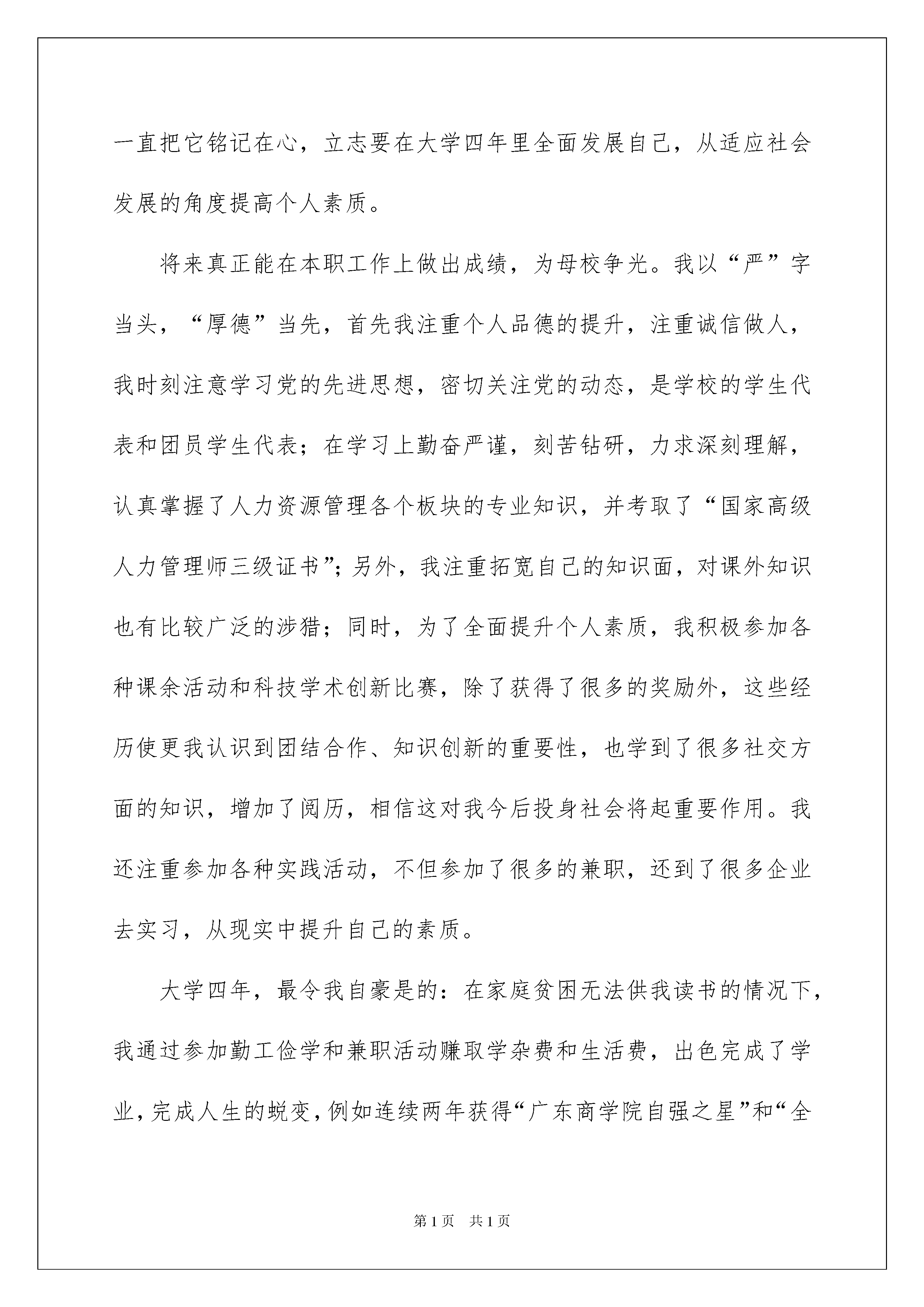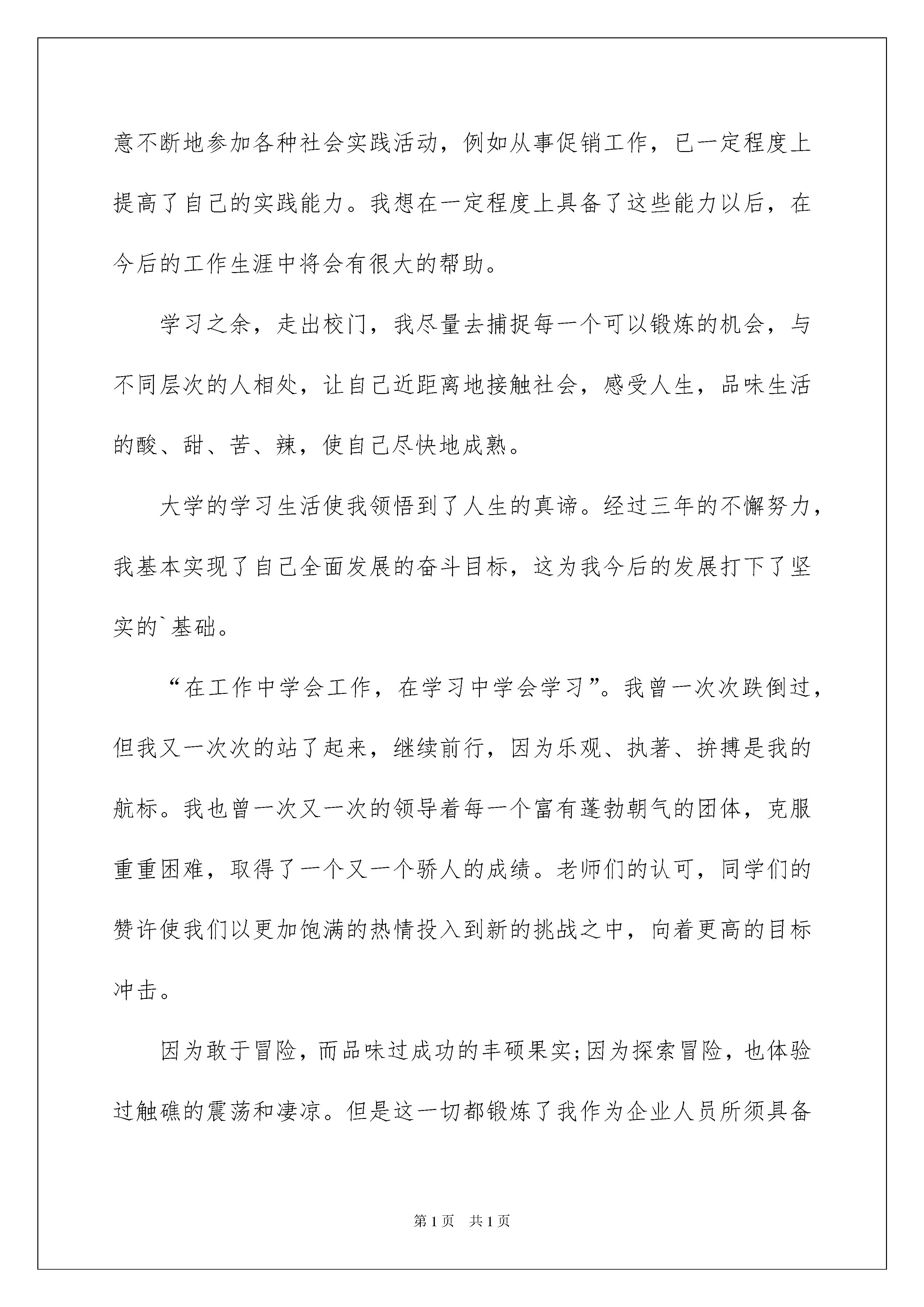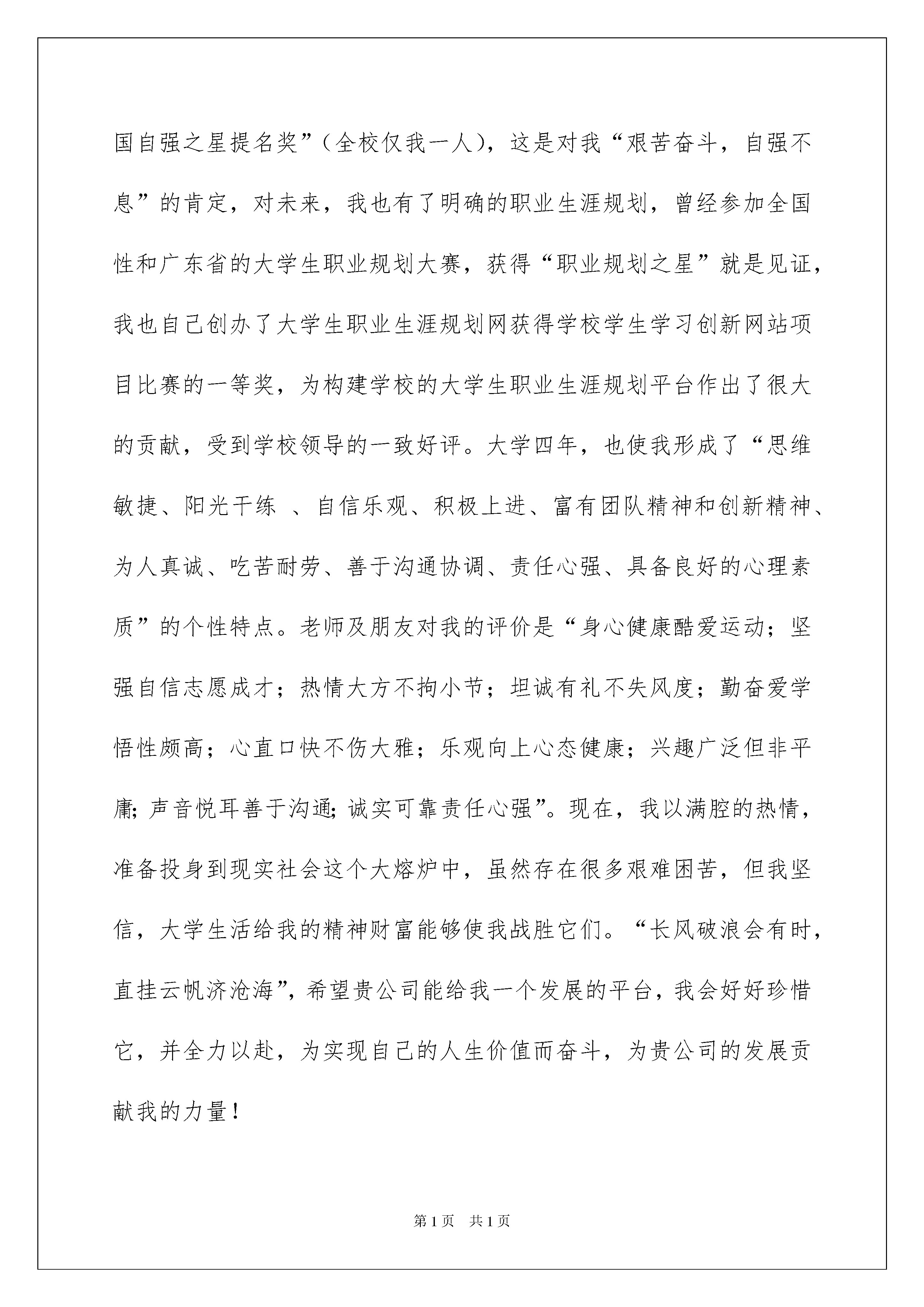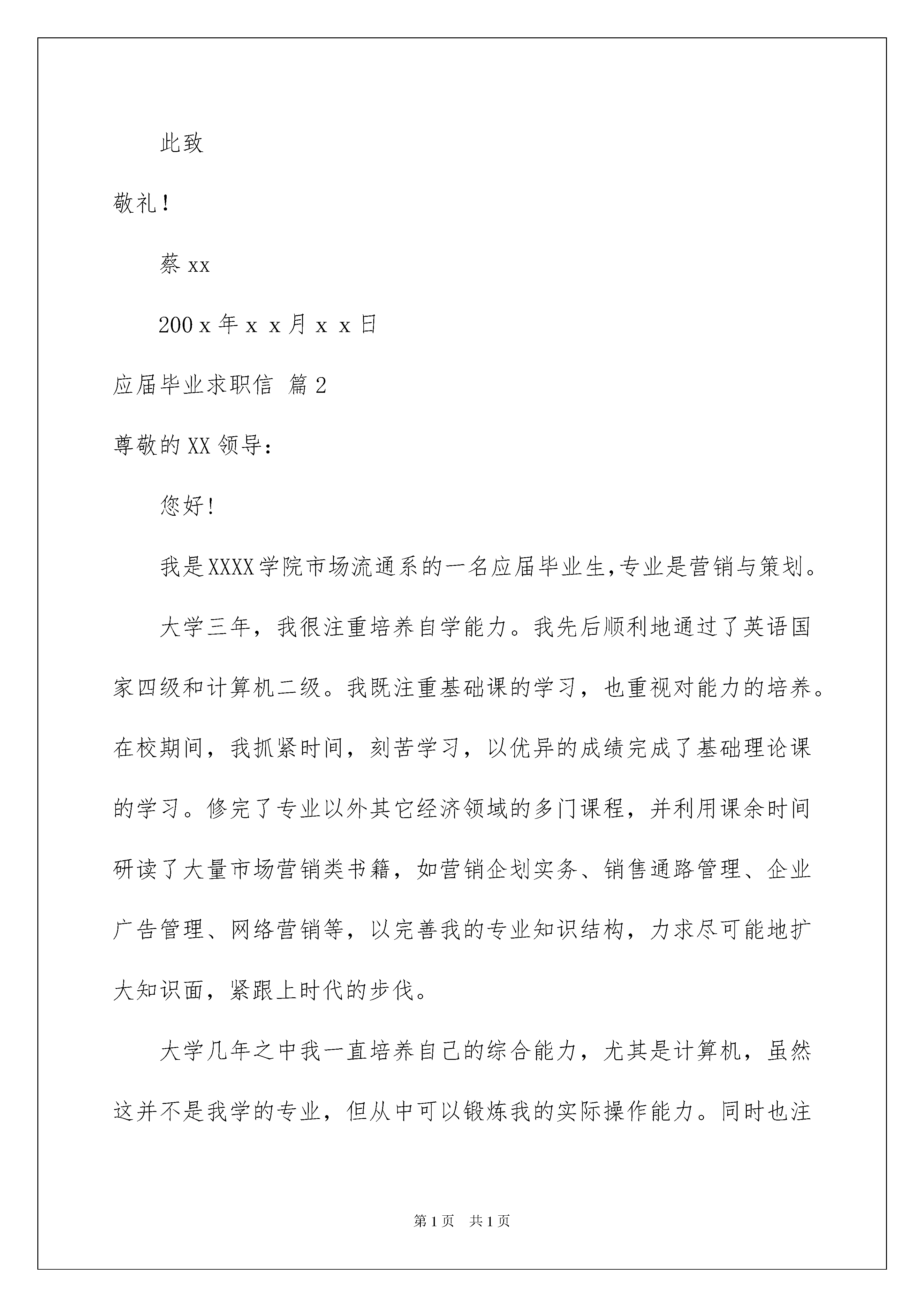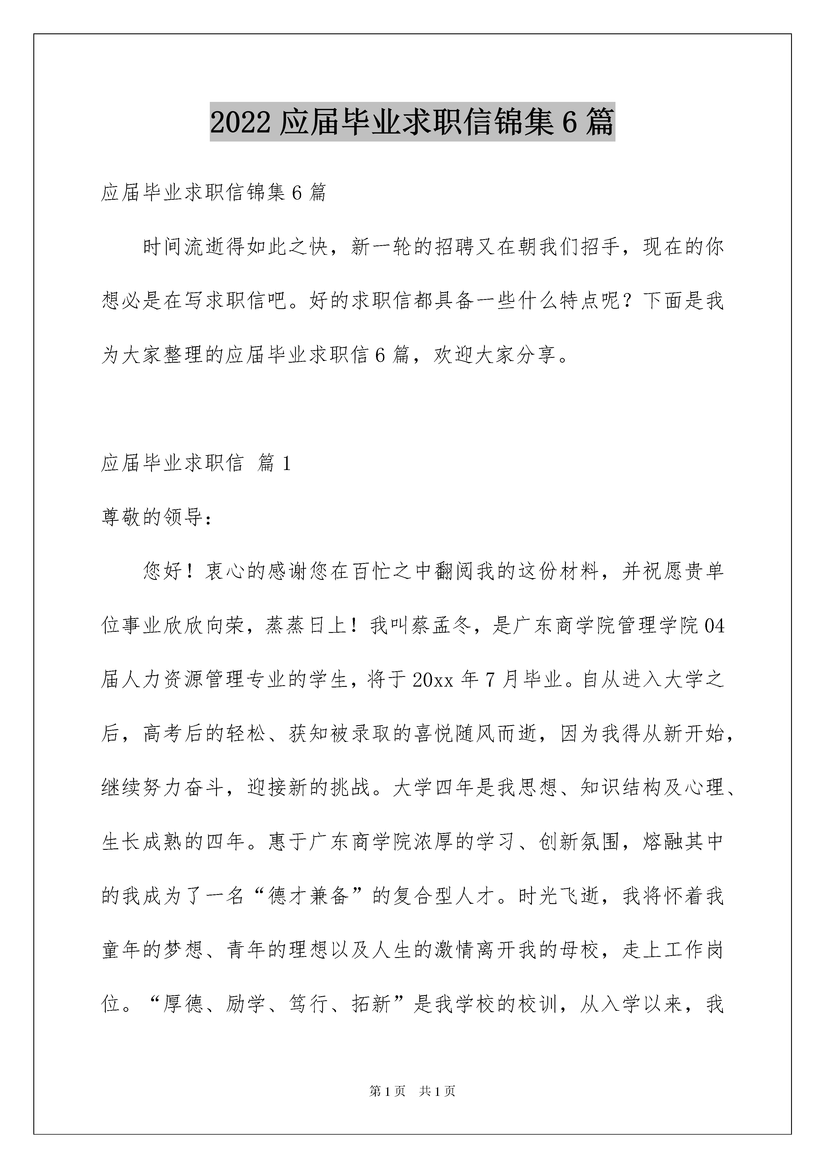 2022应届毕业求职信锦集6篇应届毕业求职信锦集6篇时间流逝得如此之快,新一轮的招聘又在朝我们招手,现在的你想必是在写求职信吧。好的求职信都具备一些什么特点呢?下面是我为大家整理的应届毕业求职信6篇,欢迎大家分享。应届毕业求职信篇1尊敬的领导:您好!衷心的感谢您在百忙之中翻阅我的这份材料,并祝愿贵单位事业欣欣向荣,蒸蒸日上!我叫蔡孟冬,是广东商学院管理学院04届人力资源管理专业的学生,将于20xx年7月毕业。自从进入大学之后,高考后的轻松、获知被录取的喜悦随风而逝,因为我得从新开始,继续努力奋斗,迎接新的挑战。大学四年是我思想、知识结构及心理、生长成熟的四年。惠于广东商学院浓厚的学习、创新氛围,熔融其中的我成为了一名“德才兼备”的复合型人才。时光飞逝,我将怀着我童年的梦想、青年的理想以及人生的激情离开我的母校,走上工作岗位。“厚德、励学、笃行、拓新”是我学校的校训,从入学以来,我一直把它铭记在心,立志要在大学四年里全面发展自己,从适应社会发展的角度提高个人素质。将来真正能在本职工作上做出成绩,为母校争光。我以“严”字当头,“厚德”当先,首先我注重个人品德的提升,注重诚信做人,我时刻注意学习党的先进思想,密切关注党的动态,是学校的学生代表和团员学生代表;在学习上勤奋严谨,刻苦钻研,力求深刻理解,认真掌握了人力资源管理各个板块的专业知识,并考取了“国家高级人力管理师三级证书”;另外,我注重拓宽自己的知识面,对课外知识也有比较广泛的涉猎;同时,为了全面提升个人素质,我积极参加各种课余活动和科技学术创新比赛,除了获得了很多的奖励外,这些经历使更我认识到团结合作、知识创新的重要性,也学到了很多社交方面的知识,增加了阅历,相信这对我今后投身社会将起重要作用。我还注重参加各种实践活动,不但参加了很多的兼职,还到了很多企业去实习,从现实中提升自己的素质。大学四年,最令我自豪是的:在家庭贫困无法供我读书的情况下,我通过参加勤工俭学和兼职活动赚取学杂费和生活费,出色完成了学业,完成人生的蜕变,例如连续两年获得“广东商学院自强之星”和“全国自强之星提名奖”(全校仅我一人),这是对我“艰苦奋斗,自强不息”的肯定,对未来,我也有了明确的职业生涯规划,曾经参加全国性和广东省的大学生职业规划大赛,获得“职业规划之星”就是见证,我也自己创办了大学生职业生涯规划网获得学校学生学习创新网站项目比赛的一等奖,为构建学校的大学生职业生涯规划平台作出了很大的贡献,受到学校领导的一致好评。大学四年,也使我形成了“思维敏捷、阳光干练、自信乐观、积极上进、富有团队精神和创新精神、为人真诚、吃苦耐劳、善于沟通协调、责任心强、具备良好的心理素质”的个性特点。老师及朋友对我的评价是“身心健康酷爱运动;坚强自信志愿成才;热情大方不拘小节;坦诚有礼不失风度;勤奋爱学悟性颇高;心直口快不伤大雅;乐观向上心态健康;兴趣广泛但非平庸;声音悦耳善于沟通;诚实可靠责任心强”。现在,我以满腔的热情,准备投身到现实社会这个大熔炉中,虽然存在很多艰难困苦,但我坚信,大学生活给我的精神财富能够使我战胜它们。“长风破浪会有时,直挂云帆济沧海”,希望贵公司能给我一个发展的平台,我会好好珍惜它,并全力以赴,为实现自己的人生价值而奋斗,为贵公司的发展贡献我的力量!此致敬礼!蔡xx200x年xx月xx日应届毕业求职信篇2尊敬的XX领导:您好!我是XXXX学院市场流通系的一名应届毕业生,专业是营销与策划。大学三年,我很注重培养自学能力。我先后顺利地通过了英语国家四级和计算机二级。我既注重基础课的学习,也重视对能力的培养。在校期间,我抓紧时间,刻苦学习,以优异的成绩完成了基础理论课的学习。修完了专业以外其它经济领域的多门课程,并利用课余时间研读了大量市场营销类书籍,如营销企划实务、销售通路管理、企业广告管理、网络营销等,以完善我的专业知识结构,力求尽可能地扩大知识面,紧跟上时代的步伐。大学几年之中我一直培养自己的综合能力,尤其是计算机,虽然这并不是我学的专业,但从中可以锻炼我的实际操作能力。同时也注意不断地参加各种社会实践活动,例如从事促销工作,已一定程度上提高了自己的实践能力。我想在一定程度上具备了这些能力以后,在今后的工作生涯中将会有很大的帮助。学习之余,走出校门,我尽量去捕捉每一个可以锻炼的机会,与不同层次的人相处,让自己近距离地接触社会,感受人生,品味生活的酸、甜、苦、辣,使自己尽快地成熟。大学的学习生活使我领悟到了人生的真谛。经过三年的不懈努力,我基本实现了自己全面发展的奋斗目标,这为我今后的发展打下了坚实的`基础。“在工作中学会工作,在学习中学会学