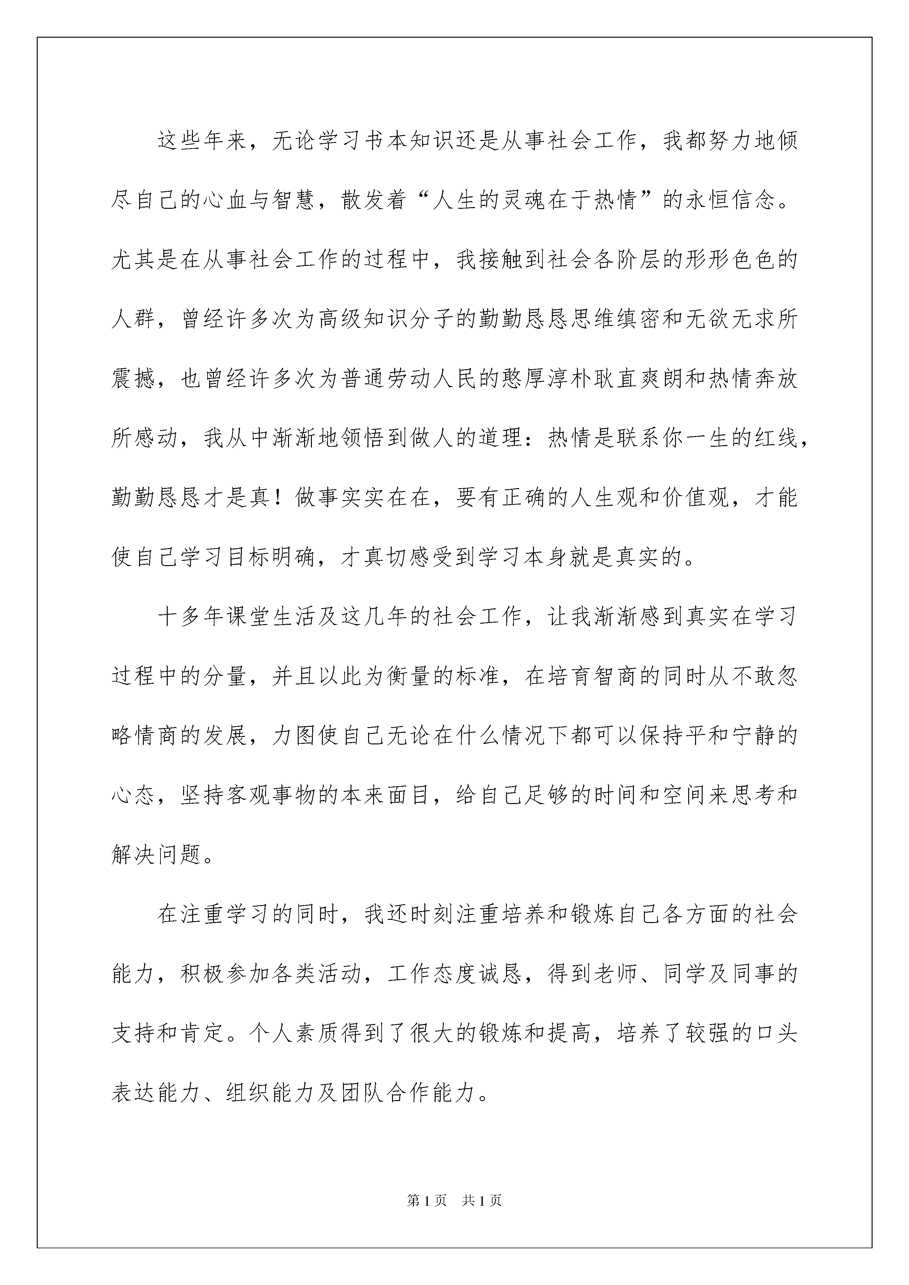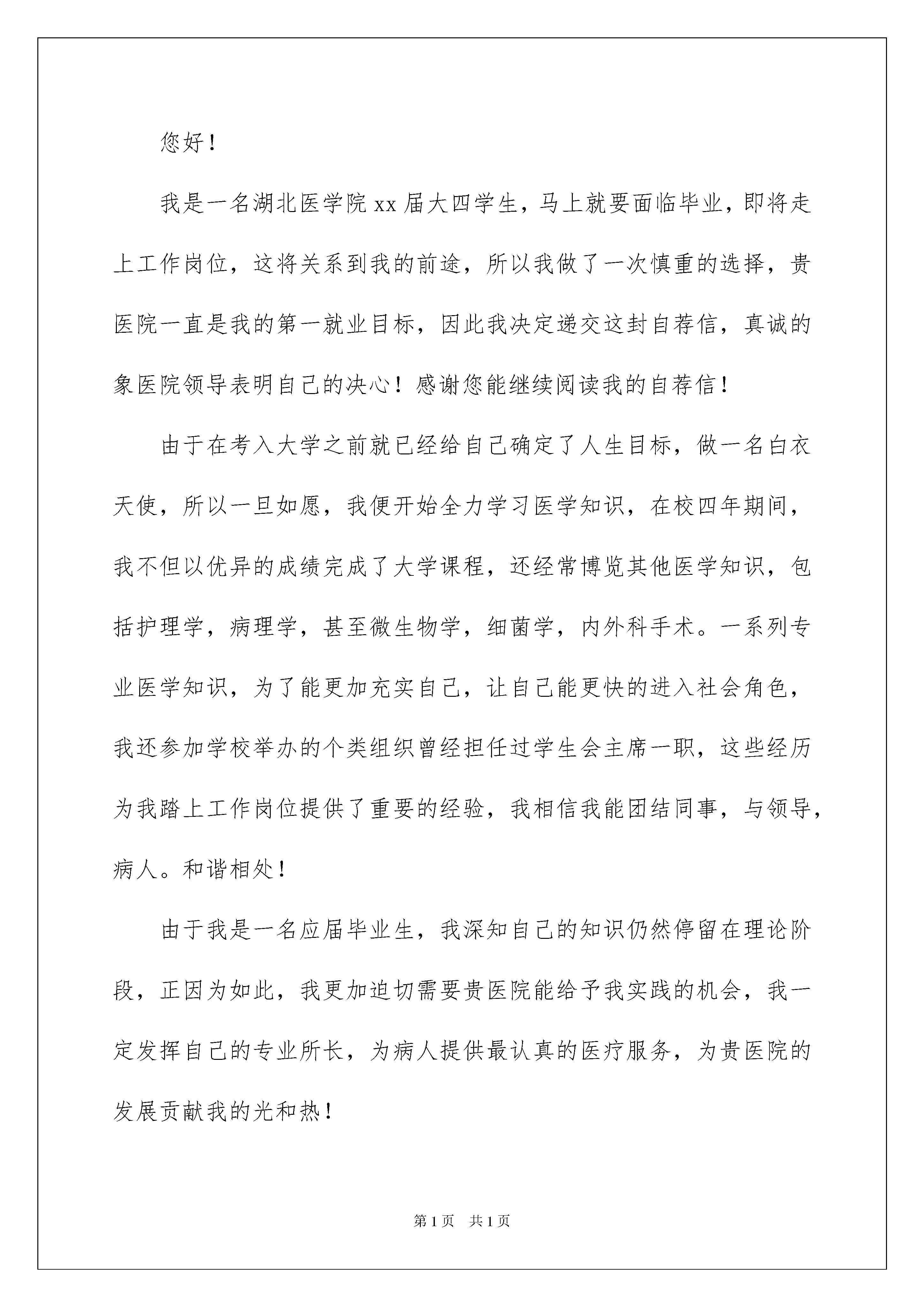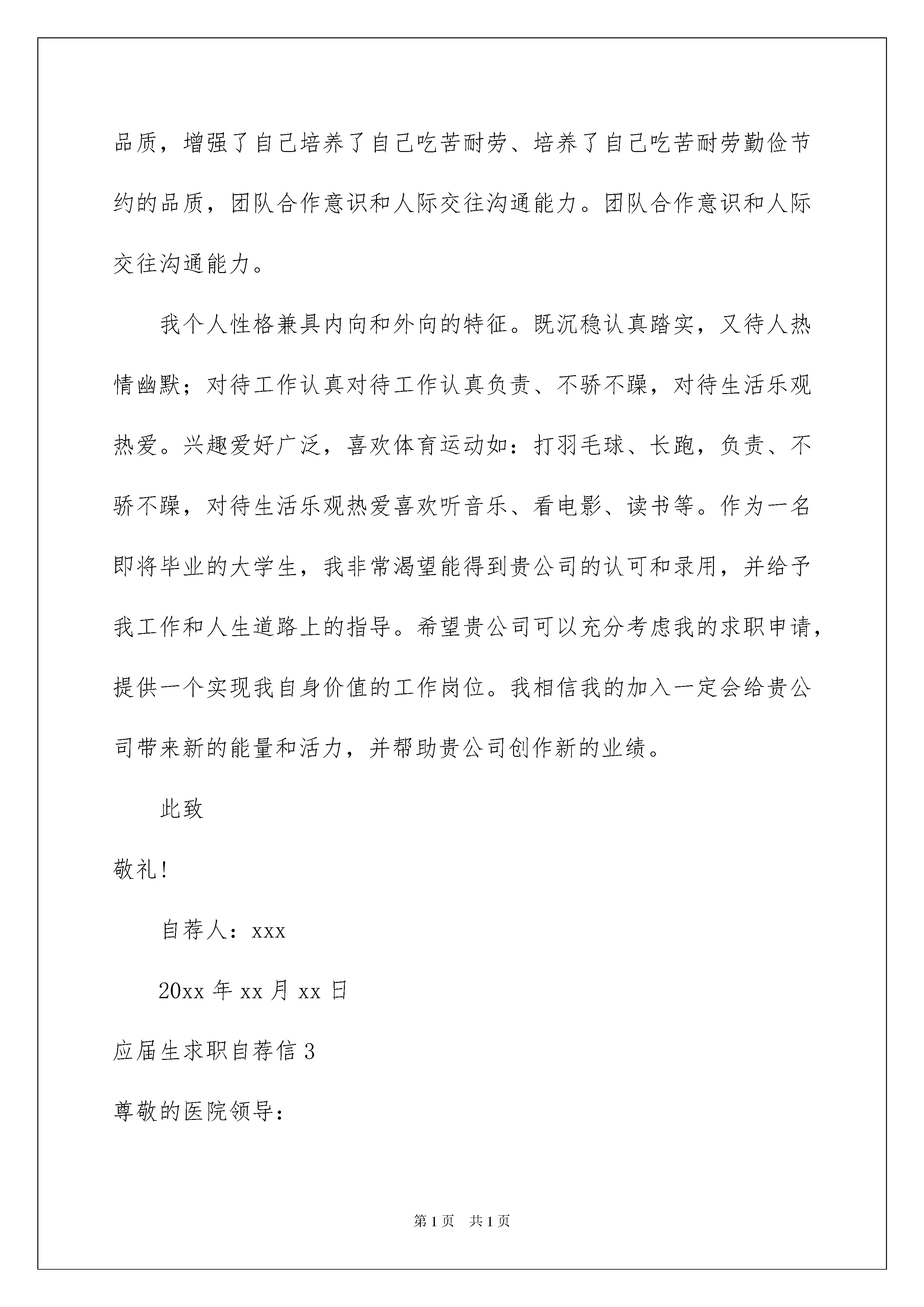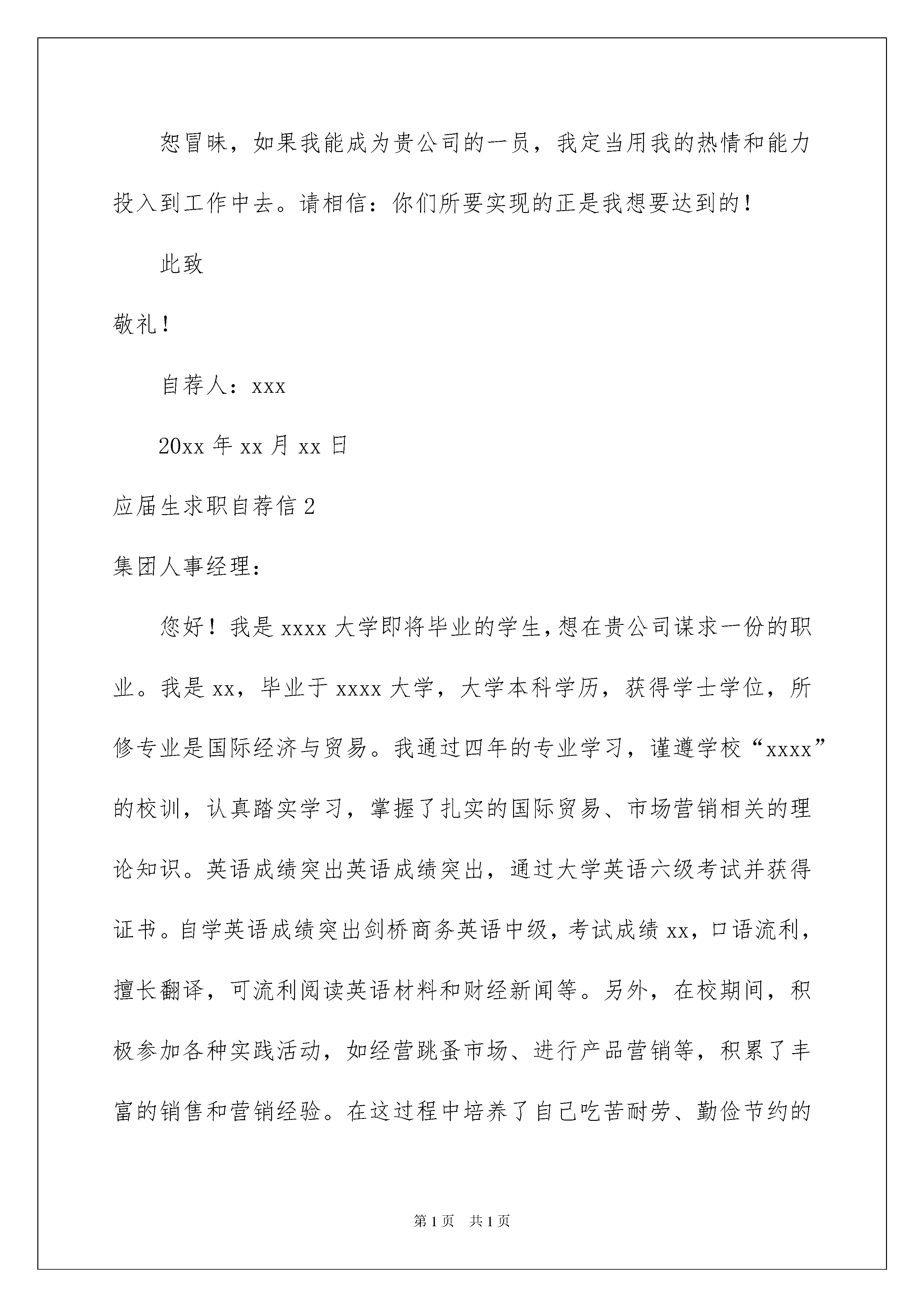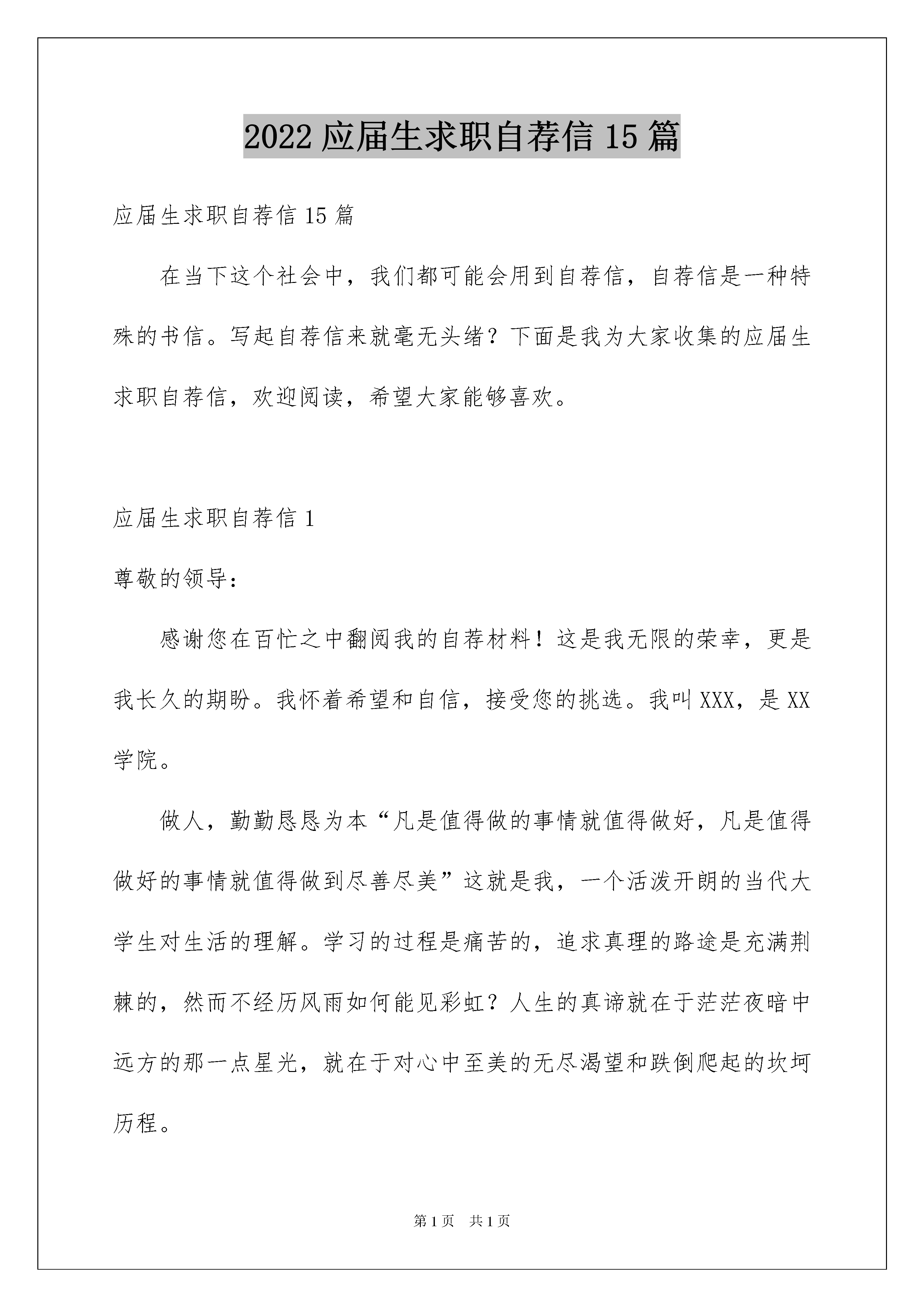 2022应届生求职自荐信15篇应届生求职自荐信15篇在当下这个社会中,我们都可能会用到自荐信,自荐信是一种特殊的书信。写起自荐信来就毫无头绪?下面是我为大家收集的应届生求职自荐信,欢迎阅读,希望大家能够喜欢。应届生求职自荐信1尊敬的领导:感谢您在百忙之中翻阅我的自荐材料!这是我无限的荣幸,更是我长久的期盼。我怀着希望和自信,接受您的挑选。我叫XXX,是XX学院。做人,勤勤恳恳为本“凡是值得做的事情就值得做好,凡是值得做好的事情就值得做到尽善尽美”这就是我,一个活泼开朗的当代大学生对生活的理解。学习的过程是痛苦的,追求真理的路途是充满荆棘的,然而不经历风雨如何能见彩虹?人生的真谛就在于茫茫夜暗中远方的那一点星光,就在于对心中至美的无尽渴望和跌倒爬起的坎坷历程。这些年来,无论学习书本知识还是从事社会工作,我都努力地倾尽自己的心血与智慧,散发着“人生的灵魂在于热情”的永恒信念。尤其是在从事社会工作的过程中,我接触到社会各阶层的形形色色的人群,曾经许多次为高级知识分子的勤勤恳恳思维缜密和无欲无求所震撼,也曾经许多次为普通劳动人民的憨厚淳朴耿直爽朗和热情奔放所感动,我从中渐渐地领悟到做人的道理:热情是联系你一生的红线,勤勤恳恳才是真!做事实实在在,要有正确的人生观和价值观,才能使自己学习目标明确,才真切感受到学习本身就是真实的。十多年课堂生活及这几年的社会工作,让我渐渐感到真实在学习过程中的分量,并且以此为衡量的标准,在培育智商的同时从不敢忽略情商的发展,力图使自己无论在什么情况下都可以保持平和宁静的心态,坚持客观事物的本来面目,给自己足够的时间和空间来思考和解决问题。在注重学习的同时,我还时刻注重培养和锻炼自己各方面的社会能力,积极参加各类活动,工作态度诚恳,得到老师、同学及同事的支持和肯定。个人素质得到了很大的锻炼和提高,培养了较强的口头表达能力、组织能力及团队合作能力。恕冒昧,如果我能成为贵公司的一员,我定当用我的热情和能力投入到工作中去。请相信:你们所要实现的正是我想要达到的!此致敬礼!自荐人:xxx20xx年xx月xx日应届生求职自荐信2集团人事经理:您好!我是xxxx大学即将毕业的学生,想在贵公司谋求一份的职业。我是xx,毕业于xxxx大学,大学本科学历,获得学士学位,所修专业是国际经济与贸易。我通过四年的专业学习,谨遵学校“xxxx”的校训,认真踏实学习,掌握了扎实的国际贸易、市场营销相关的理论知识。英语成绩突出英语成绩突出,通过大学英语六级考试并获得证书。自学英语成绩突出剑桥商务英语中级,考试成绩xx,口语流利,擅长翻译,可流利阅读英语材料和财经新闻等。另外,在校期间,积极参加各种实践活动,如经营跳蚤市场、进行产品营销等,积累了丰富的销售和营销经验。在这过程中培养了自己吃苦耐劳、勤俭节约的品质,增强了自己培养了自己吃苦耐劳、培养了自己吃苦耐劳勤俭节约的品质,团队合作意识和人际交往沟通能力。团队合作意识和人际交往沟通能力。我个人性格兼具内向和外向的特征。既沉稳认真踏实,又待人热情幽默;对待工作认真对待工作认真负责、不骄不躁,对待生活乐观热爱。兴趣爱好广泛,喜欢体育运动如:打羽毛球、长跑,负责、不骄不躁,对待生活乐观热爱喜欢听音乐、看电影、读书等。作为一名即将毕业的大学生,我非常渴望能得到贵公司的认可和录用,并给予我工作和人生道路上的指导。希望贵公司可以充分考虑我的求职申请,提供一个实现我自身价值的工作岗位。我相信我的加入一定会给贵公司带来新的能量和活力,并帮助贵公司创作新的业绩。此致敬礼!自荐人:xxx20xx年xx月xx日应届生求职自荐信3尊敬的医院领导:您好!我是一名湖北医学院xx届大四学生,马上就要面临毕业,即将走上工作岗位,这将关系到我的前途,所以我做了一次慎重的选择,贵医院一直是我的第一就业目标,因此我决定递交这封自荐信,真诚的象医院领导表明自己的决心!感谢您能继续阅读我的自荐信!由于在考入大学之前就已经给自己确定了人生目标,做一名白衣天使,所以一旦如愿,我便开始全力学习医学知识,在校四年期间,我不但以优异的成绩完成了大学课程,还经常博览其他医学知识,包括护理学,病理学,甚至微生物学,细菌学,内外科手术。一系列专业医学知识,为了能更加充实自己,让自己能更快的进入社会角色,我还参加学校举办的个类组织曾经担任过学生会主席一职,这些经历为我踏上工作岗位提供了重要的经验,我相信我能团结同事,与领导,病人。和谐相处!由于我是一名应届毕业生,我深知自己的知识仍然停留在理论阶段,正因为如此,我更加迫切需要贵医院能给予我实践的机会,我一定发挥自己的专业所长,为病人提供最认真