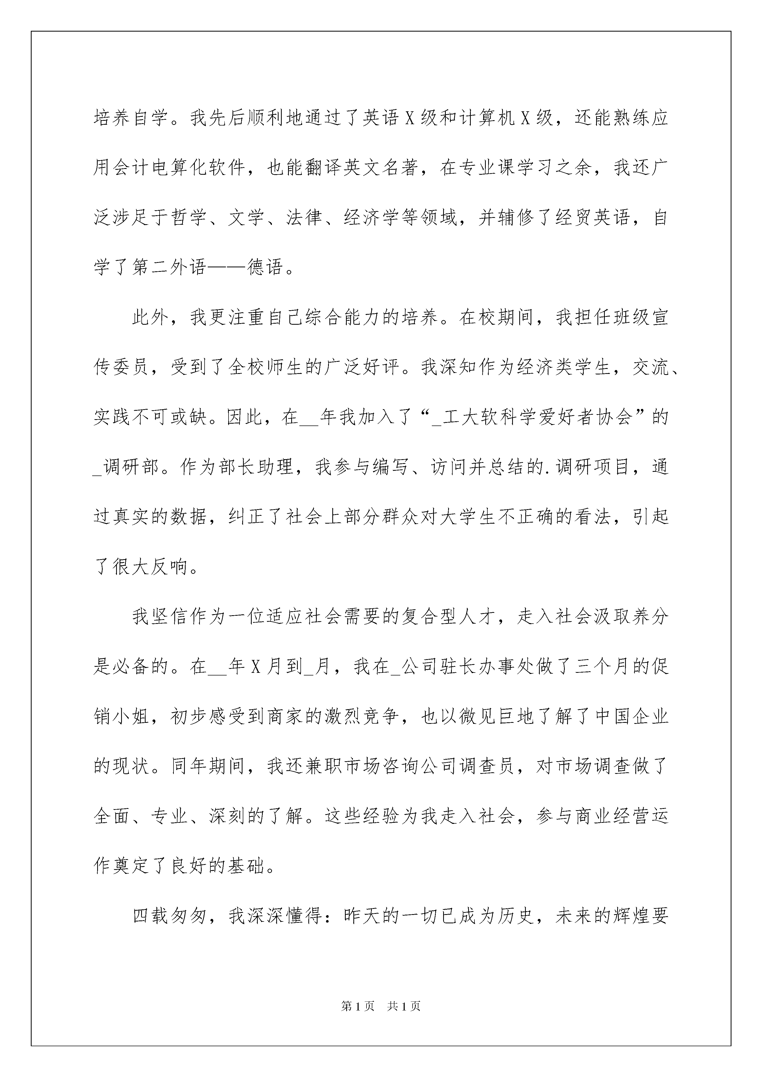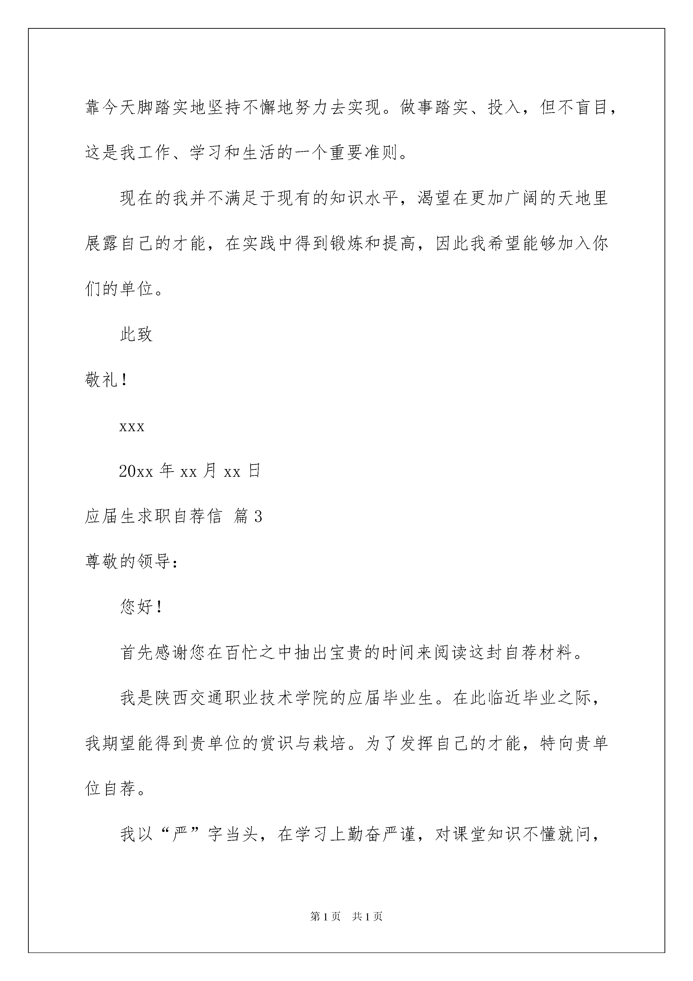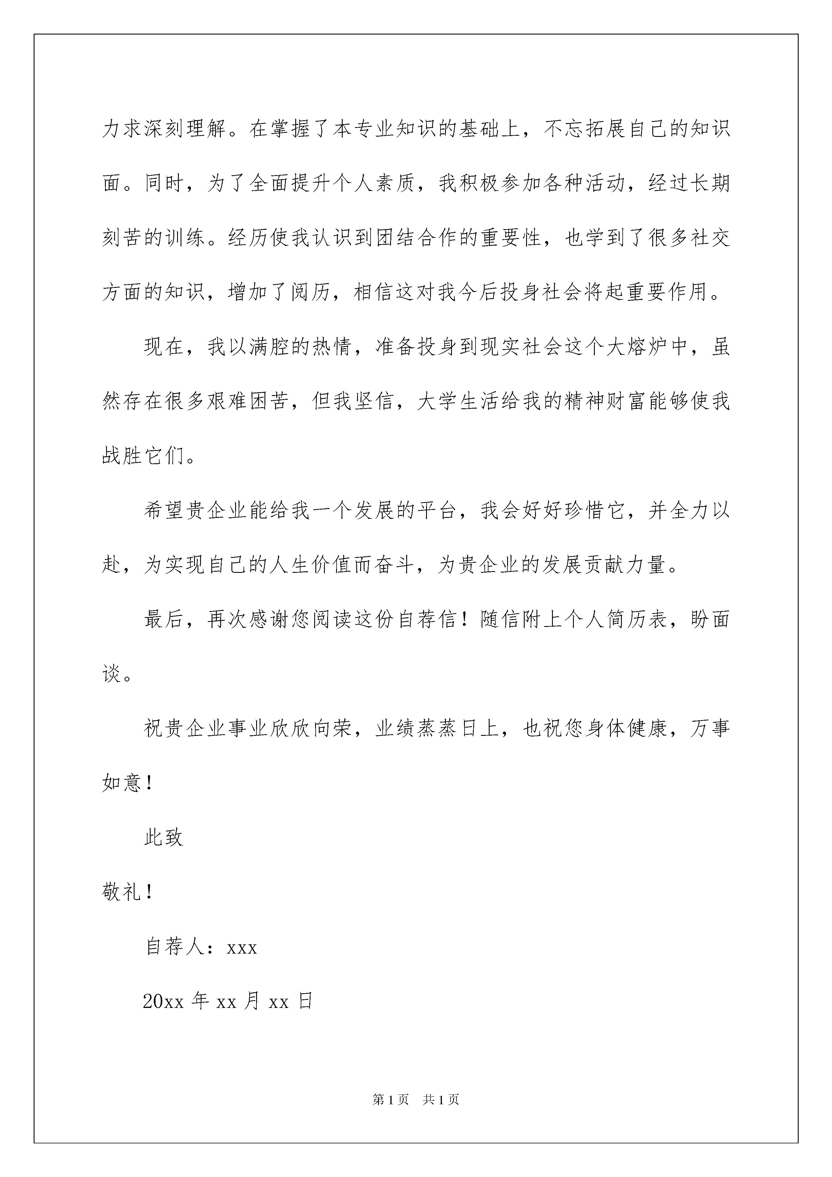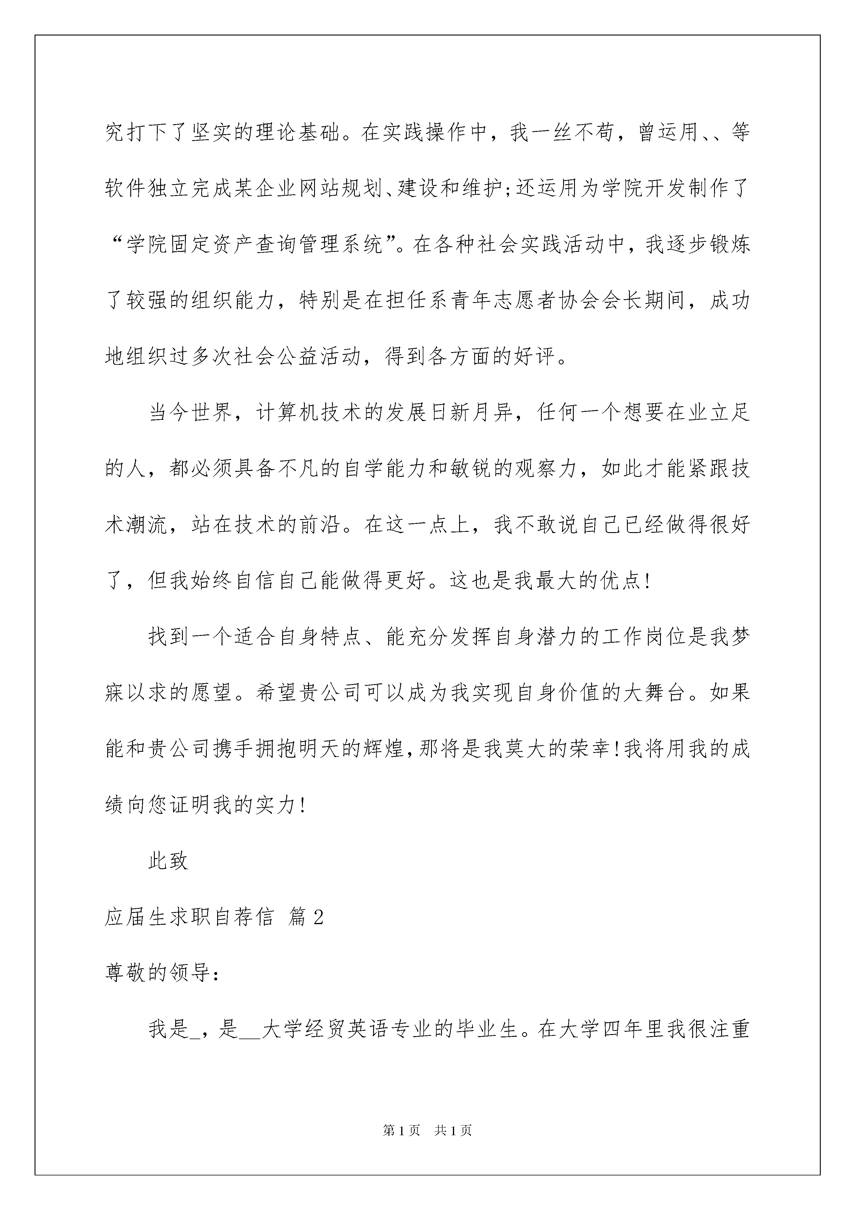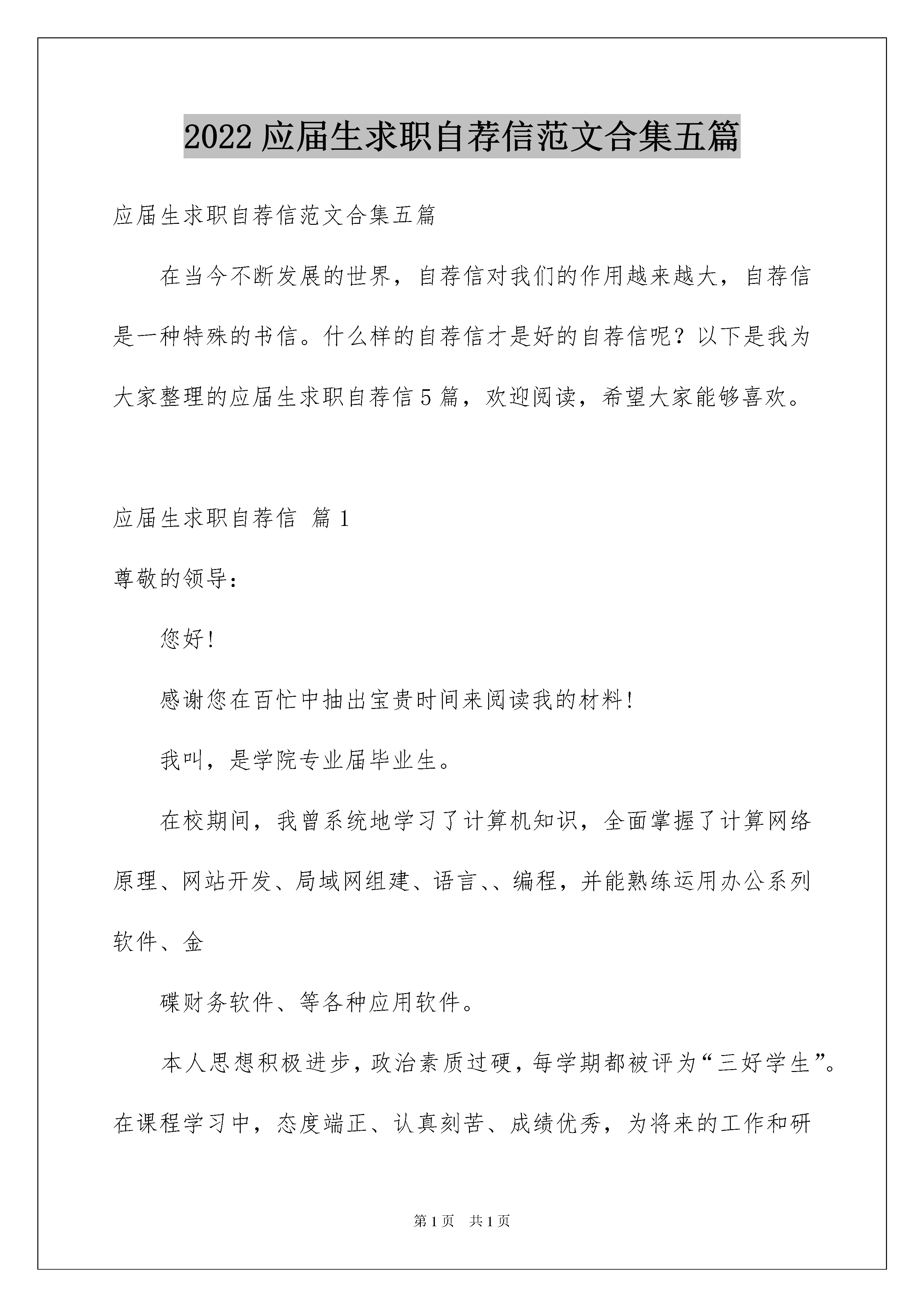 2022应届生求职自荐信范文合集五篇应届生求职自荐信范文合集五篇在当今不断发展的世界,自荐信对我们的作用越来越大,自荐信是一种特殊的书信。什么样的自荐信才是好的自荐信呢?以下是我为大家整理的应届生求职自荐信5篇,欢迎阅读,希望大家能够喜欢。应届生求职自荐信篇1尊敬的领导:您好!感谢您在百忙中抽出宝贵时间来阅读我的材料!我叫,是学院专业届毕业生。在校期间,我曾系统地学习了计算机知识,全面掌握了计算网络原理、网站开发、局域网组建、语言、、编程,并能熟练运用办公系列软件、金碟财务软件、等各种应用软件。本人思想积极进步,政治素质过硬,每学期都被评为“三好学生”。在课程学习中,态度端正、认真刻苦、成绩优秀,为将来的工作和研究打下了坚实的理论基础。在实践操作中,我一丝不苟,曾运用、、等软件独立完成某企业网站规划、建设和维护;还运用为学院开发制作了“学院固定资产查询管理系统”。在各种社会实践活动中,我逐步锻炼了较强的组织能力,特别是在担任系青年志愿者协会会长期间,成功地组织过多次社会公益活动,得到各方面的好评。当今世界,计算机技术的发展日新月异,任何一个想要在业立足的人,都必须具备不凡的自学能力和敏锐的观察力,如此才能紧跟技术潮流,站在技术的前沿。在这一点上,我不敢说自己已经做得很好了,但我始终自信自己能做得更好。这也是我最大的优点!找到一个适合自身特点、能充分发挥自身潜力的工作岗位是我梦寐以求的愿望。希望贵公司可以成为我实现自身价值的大舞台。如果能和贵公司携手拥抱明天的辉煌,那将是我莫大的荣幸!我将用我的成绩向您证明我的实力!此致应届生求职自荐信篇2尊敬的领导:我是_,是__大学经贸英语专业的毕业生。在大学四年里我很注重培养自学。我先后顺利地通过了英语X级和计算机X级,还能熟练应用会计电算化软件,也能翻译英文名著,在专业课学习之余,我还广泛涉足于哲学、文学、法律、经济学等领域,并辅修了经贸英语,自学了第二外语——德语。此外,我更注重自己综合能力的培养。在校期间,我担任班级宣传委员,受到了全校师生的广泛好评。我深知作为经济类学生,交流、实践不可或缺。因此,在__年我加入了“_工大软科学爱好者协会”的_调研部。作为部长助理,我参与编写、访问并总结的.调研项目,通过真实的数据,纠正了社会上部分群众对大学生不正确的看法,引起了很大反响。我坚信作为一位适应社会需要的复合型人才,走入社会汲取养分是必备的。在__年X月到_月,我在_公司驻长办事处做了三个月的促销小姐,初步感受到商家的激烈竞争,也以微见巨地了解了中国企业的现状。同年期间,我还兼职市场咨询公司调查员,对市场调查做了全面、专业、深刻的了解。这些经验为我走入社会,参与商业经营运作奠定了良好的基础。四载匆匆,我深深懂得:昨天的一切已成为历史,未来的辉煌要靠今天脚踏实地坚持不懈地努力去实现。做事踏实、投入,但不盲目,这是我工作、学习和生活的一个重要准则。现在的我并不满足于现有的知识水平,渴望在更加广阔的天地里展露自己的才能,在实践中得到锻炼和提高,因此我希望能够加入你们的单位。此致敬礼!xxx20xx年xx月xx日应届生求职自荐信篇3尊敬的领导:您好!首先感谢您在百忙之中抽出宝贵的时间来阅读这封自荐材料。我是陕西交通职业技术学院的应届毕业生。在此临近毕业之际,我期望能得到贵单位的赏识与栽培。为了发挥自己的才能,特向贵单位自荐。我以“严”字当头,在学习上勤奋严谨,对课堂知识不懂就问,力求深刻理解。在掌握了本专业知识的基础上,不忘拓展自己的知识面。同时,为了全面提升个人素质,我积极参加各种活动,经过长期刻苦的训练。经历使我认识到团结合作的重要性,也学到了很多社交方面的知识,增加了阅历,相信这对我今后投身社会将起重要作用。现在,我以满腔的热情,准备投身到现实社会这个大熔炉中,虽然存在很多艰难困苦,但我坚信,大学生活给我的精神财富能够使我战胜它们。希望贵企业能给我一个发展的平台,我会好好珍惜它,并全力以赴,为实现自己的人生价值而奋斗,为贵企业的发展贡献力量。最后,再次感谢您阅读这份自荐信!随信附上个人简历表,盼面谈。祝贵企业事业欣欣向荣,业绩蒸蒸日上,也祝您身体健康,万事如意!此致敬礼!自荐人:xxx20xx年xx月xx日应届生求职自荐信篇4尊敬的**企业领导:您好!感谢您的百忙之中审阅我的求职申请,下面,我就自己的实际情况向您作简单的:入校以来,我坚持刻苦学习,通过三年的积累,拥有了作为一名学生应该掌握的理论基础知识和专业知识。在学校期间,注重锻炼自己的协调合作能力,积极热情的参加学校的团体活动,并获得了一些荣誉称号。同时我也利用课余时间加强对自己