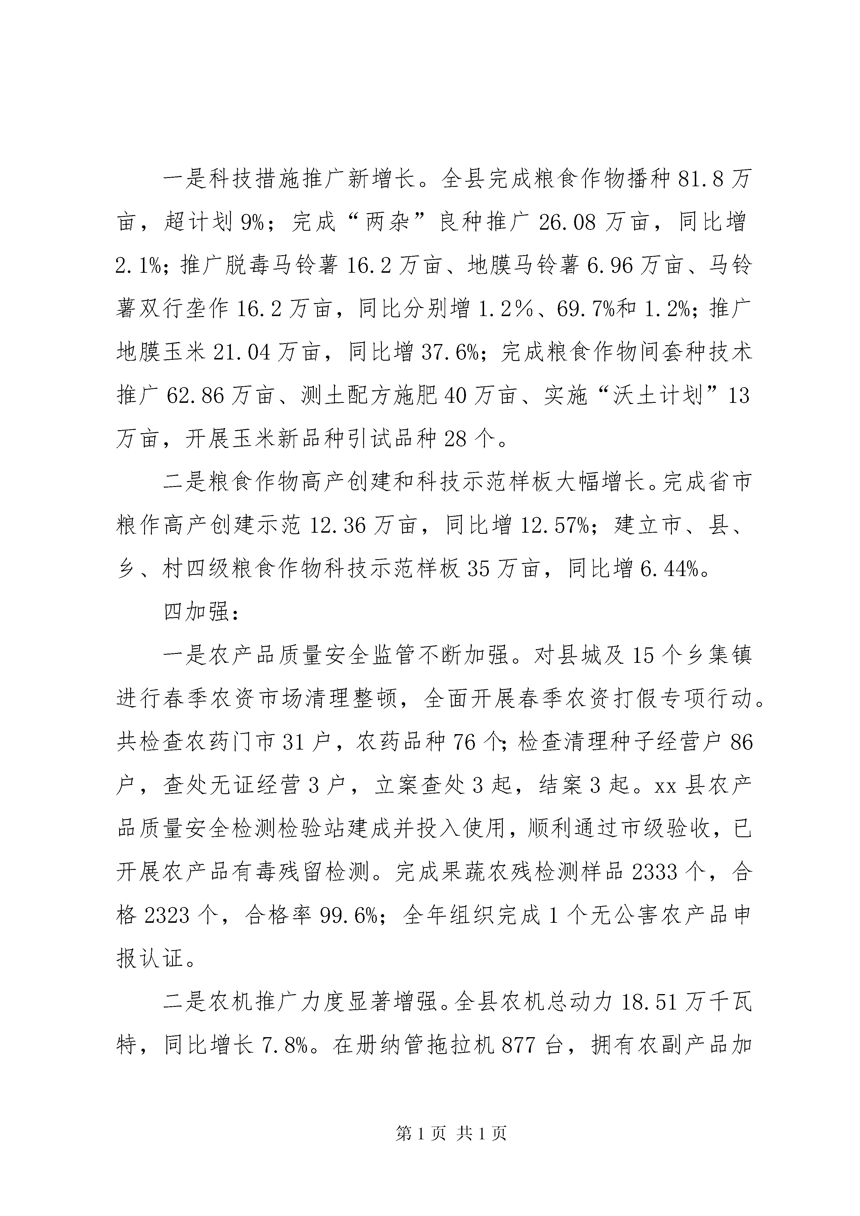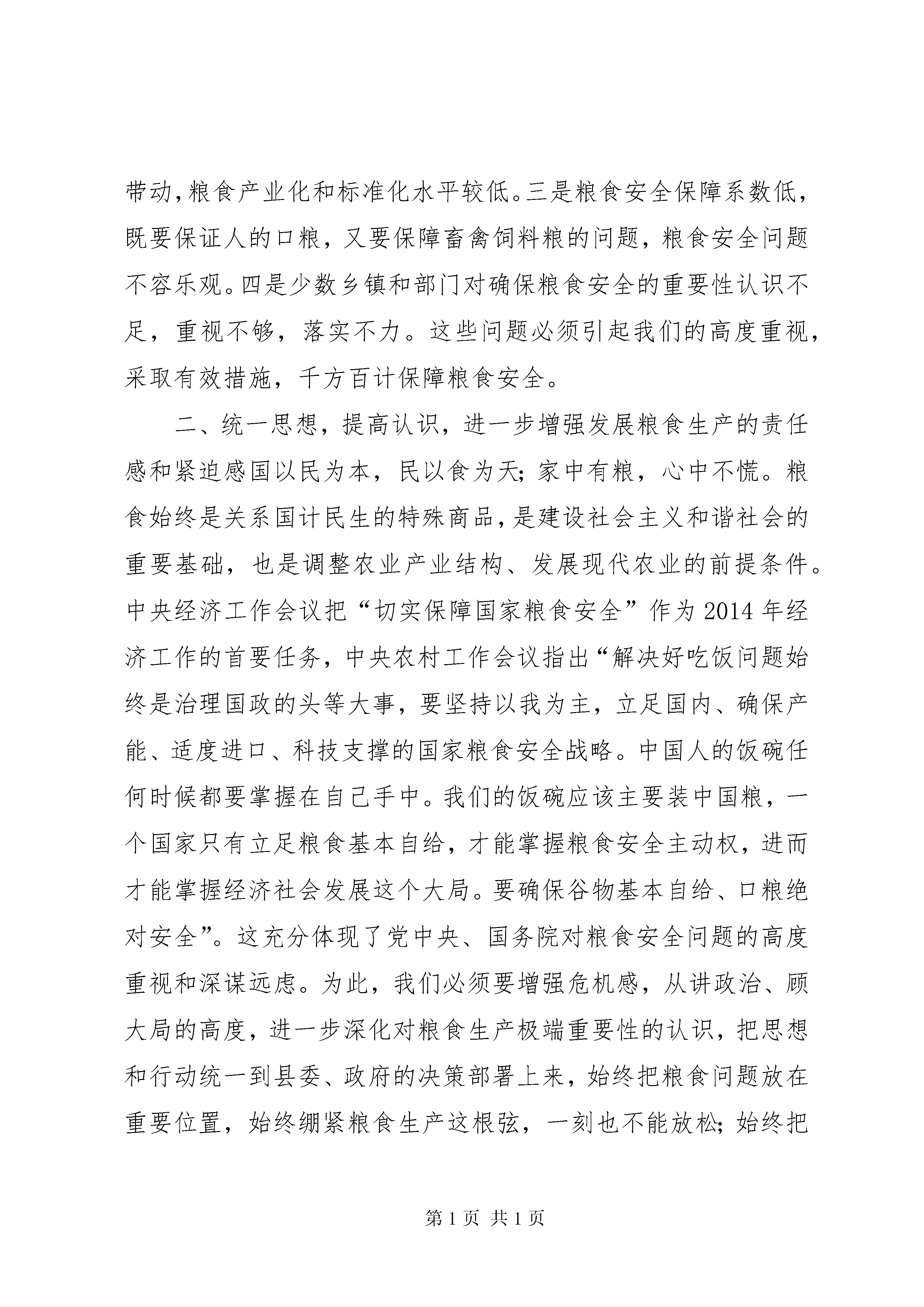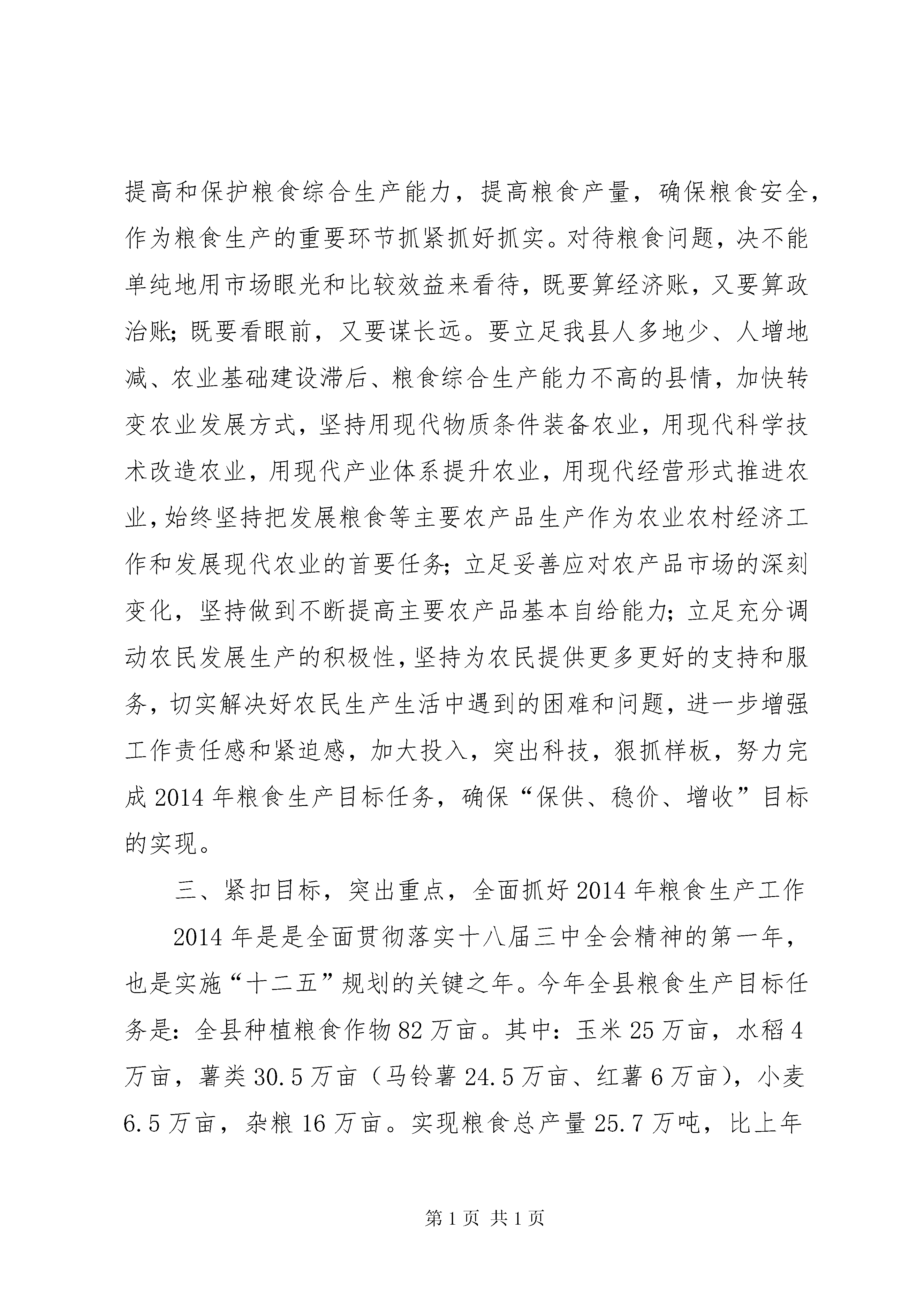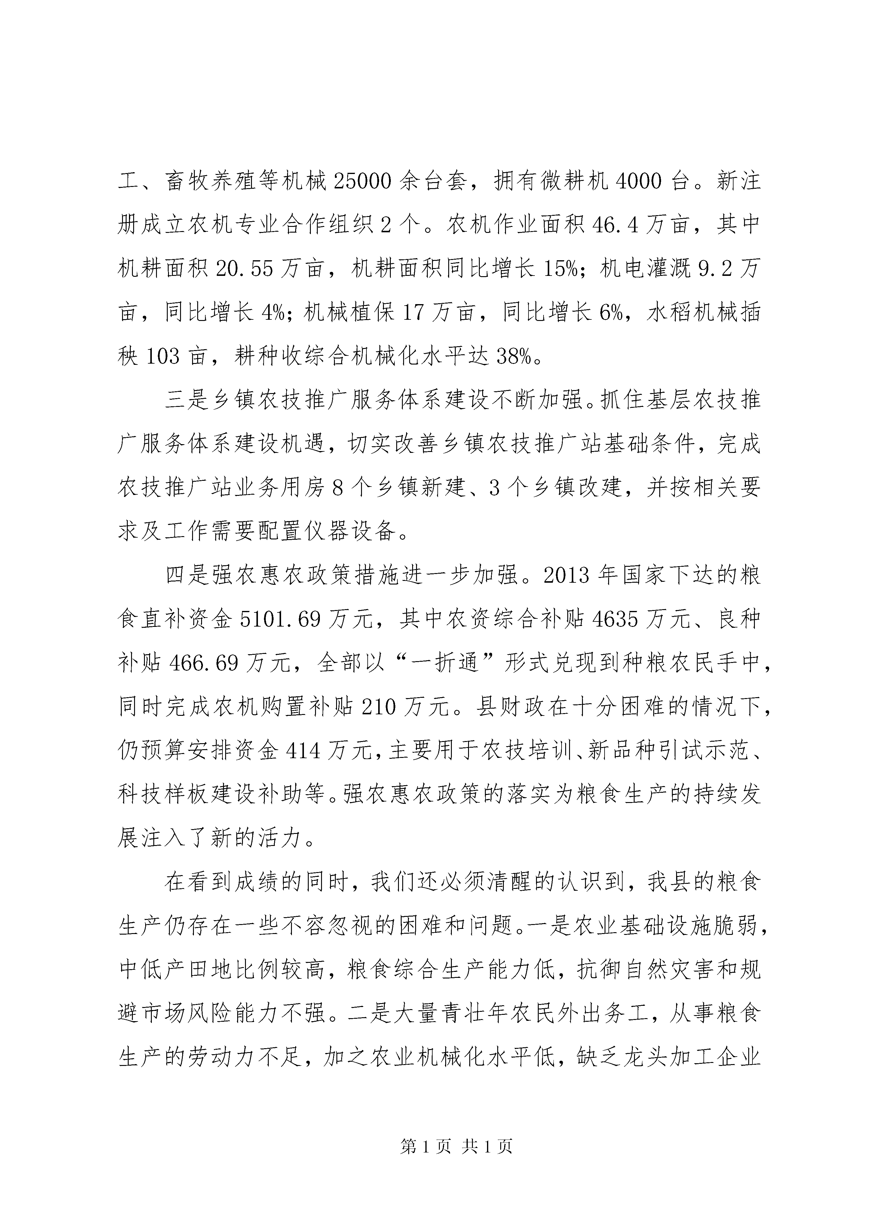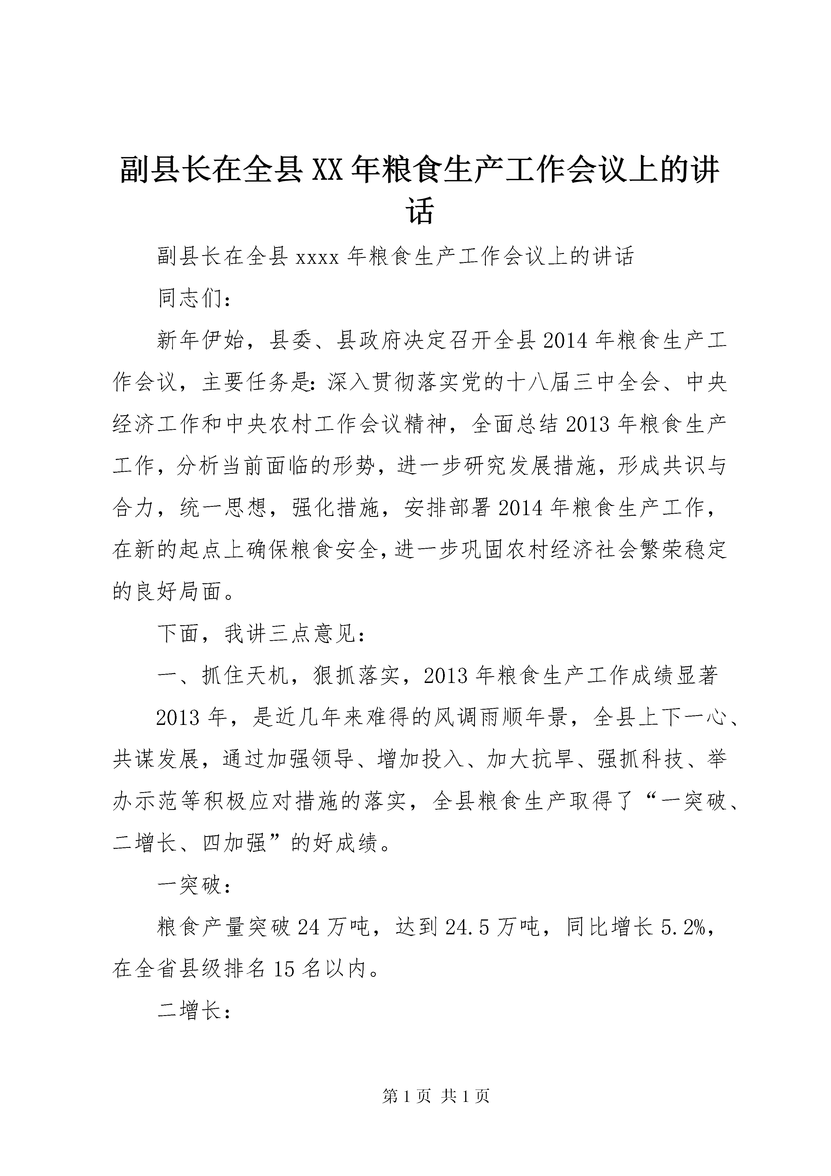 副县长在全县XX年粮食生产工作会议上的讲话副县长在全县xxxx年粮食生产工作会议上的讲话同志们:新年伊始,县委、县政府决定召开全县2014年粮食生产工作会议,主要任务是:深入贯彻落实党的十八届三中全会、中央经济工作和中央农村工作会议精神,全面总结2013年粮食生产工作,分析当前面临的形势,进一步研究发展措施,形成共识与合力,统一思想,强化措施,安排部署2014年粮食生产工作,在新的起点上确保粮食安全,进一步巩固农村经济社会繁荣稳定的良好局面。下面,我讲三点意见:一、抓住天机,狠抓落实,2013年粮食生产工作成绩显著2013年,是近几年来难得的风调雨顺年景,全县上下一心、共谋发展,通过加强领导、增加投入、加大抗旱、强抓科技、举办示范等积极应对措施的落实,全县粮食生产取得了“一突破、二增长、四加强”的好成绩。一突破:粮食产量突破24万吨,达到24.5万吨,同比增长5.2%,在全省县级排名15名以内。二增长:一是科技措施推广新增长。全县完成粮食作物播种81.8万亩,超计划9%;完成“两杂”良种推广26.08万亩,同比增2.1%;推广脱毒马铃薯16.2万亩、地膜马铃薯6.96万亩、马铃薯双行垄作16.2万亩,同比分别增1.2%、69.7%和1.2%;推广地膜玉米21.04万亩,同比增37.6%;完成粮食作物间套种技术推广62.86万亩、测土配方施肥40万亩、实施“沃土计划”13万亩,开展玉米新品种引试品种28个。二是粮食作物高产创建和科技示范样板大幅增长。完成省市粮作高产创建示范12.36万亩,同比增12.57%;建立市、县、乡、村四级粮食作物科技示范样板35万亩,同比增6.44%。四加强:一是农产品质量安全监管不断加强。对县城及15个乡集镇进行春季农资市场清理整顿,全面开展春季农资打假专项行动。共检查农药门市31户,农药品种76个;检查清理种子经营户86户,查处无证经营3户,立案查处3起,结案3起。xx县农产品质量安全检测检验站建成并投入使用,顺利通过市级验收,已开展农产品有毒残留检测。完成果蔬农残检测样品2333个,合格2323个,合格率99.6%;全年组织完成1个无公害农产品申报认证。二是农机推广力度显著增强。全县农机总动力18.51万千瓦特,同比增长7.8%。在册纳管拖拉机877台,拥有农副产品加工、畜牧养殖等机械25000余台套,拥有微耕机4000台。新注册成立农机专业合作组织2个。农机作业面积46.4万亩,其中机耕面积20.55万亩,机耕面积同比增长15%;机电灌溉9.2万亩,同比增长4%;机械植保17万亩,同比增长6%,水稻机械插秧103亩,耕种收综合机械化水平达38%。三是乡镇农技推广服务体系建设不断加强。抓住基层农技推广服务体系建设机遇,切实改善乡镇农技推广站基础条件,完成农技推广站业务用房8个乡镇新建、3个乡镇改建,并按相关要求及工作需要配置仪器设备。四是强农惠农政策措施进一步加强。2013年国家下达的粮食直补资金5101.69万元,其中农资综合补贴4635万元、良种补贴466.69万元,全部以“一折通”形式兑现到种粮农民手中,同时完成农机购置补贴210万元。县财政在十分困难的情况下,仍预算安排资金414万元,主要用于农技培训、新品种引试示范、科技样板建设补助等。强农惠农政策的落实为粮食生产的持续发展注入了新的活力。在看到成绩的同时,我们还必须清醒的认识到,我县的粮食生产仍存在一些不容忽视的困难和问题。一是农业基础设施脆弱,中低产田地比例较高,粮食综合生产能力低,抗御自然灾害和规避市场风险能力不强。二是大量青壮年农民外出务工,从事粮食生产的劳动力不足,加之农业机械化水平低,缺乏龙头加工企业带动,粮食产业化和标准化水平较低。三是粮食安全保障系数低,既要保证人的口粮,又要保障畜禽饲料粮的问题,粮食安全问题不容乐观。四是少数乡镇和部门对确保粮食安全的重要性认识不足,重视不够,落实不力。这些问题必须引起我们的高度重视,采取有效措施,千方百计保障粮食安全。二、统一思想,提高认识,进一步增强发展粮食生产的责任感和紧迫感国以民为本,民以食为天;家中有粮,心中不慌。粮食始终是关系国计民生的特殊商品,是建设社会主义和谐社会的重要基础,也是调整农业产业结构、发展现代农业的前提条件。中央经济工作会议把“切实保障国家粮食安全”作为2014年经济工作的首要任务,中央农村工作会议指出“解决好吃饭问题始终是治理国政的头等大事,要坚持以我为主,立足国内、确保产能、适度进口、科技支撑的国家粮食安全战略。中国人的饭碗任何时候都要掌握在自己手中。我们的饭碗应该主要装中国粮,一个国家只有立足粮食基本自给,才能掌握粮食安全主动权,进而才能掌握经济社会发展这个大局。要确保谷物基本自给、口粮绝对安全”。这充分体现了党中央、国务院对粮食