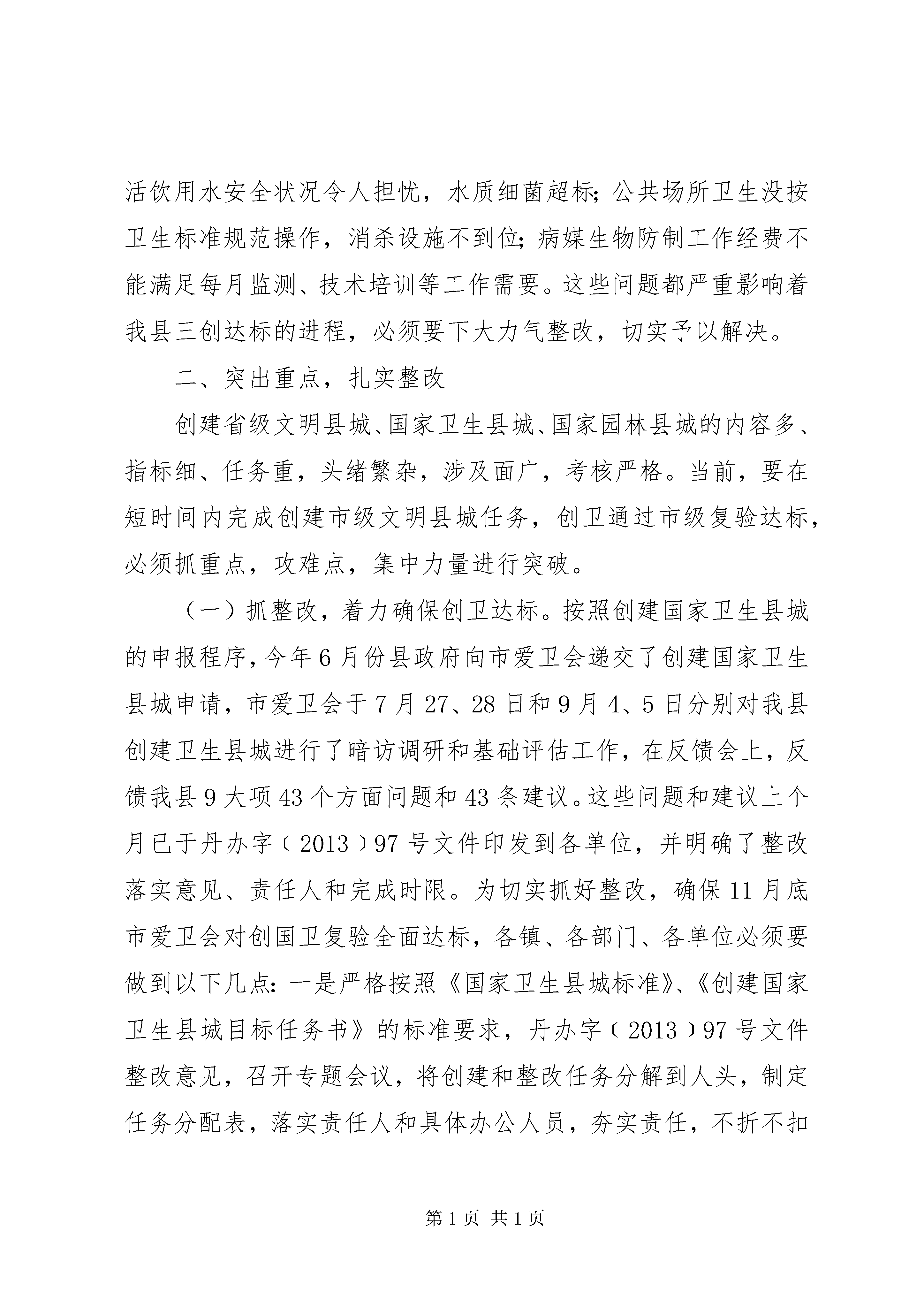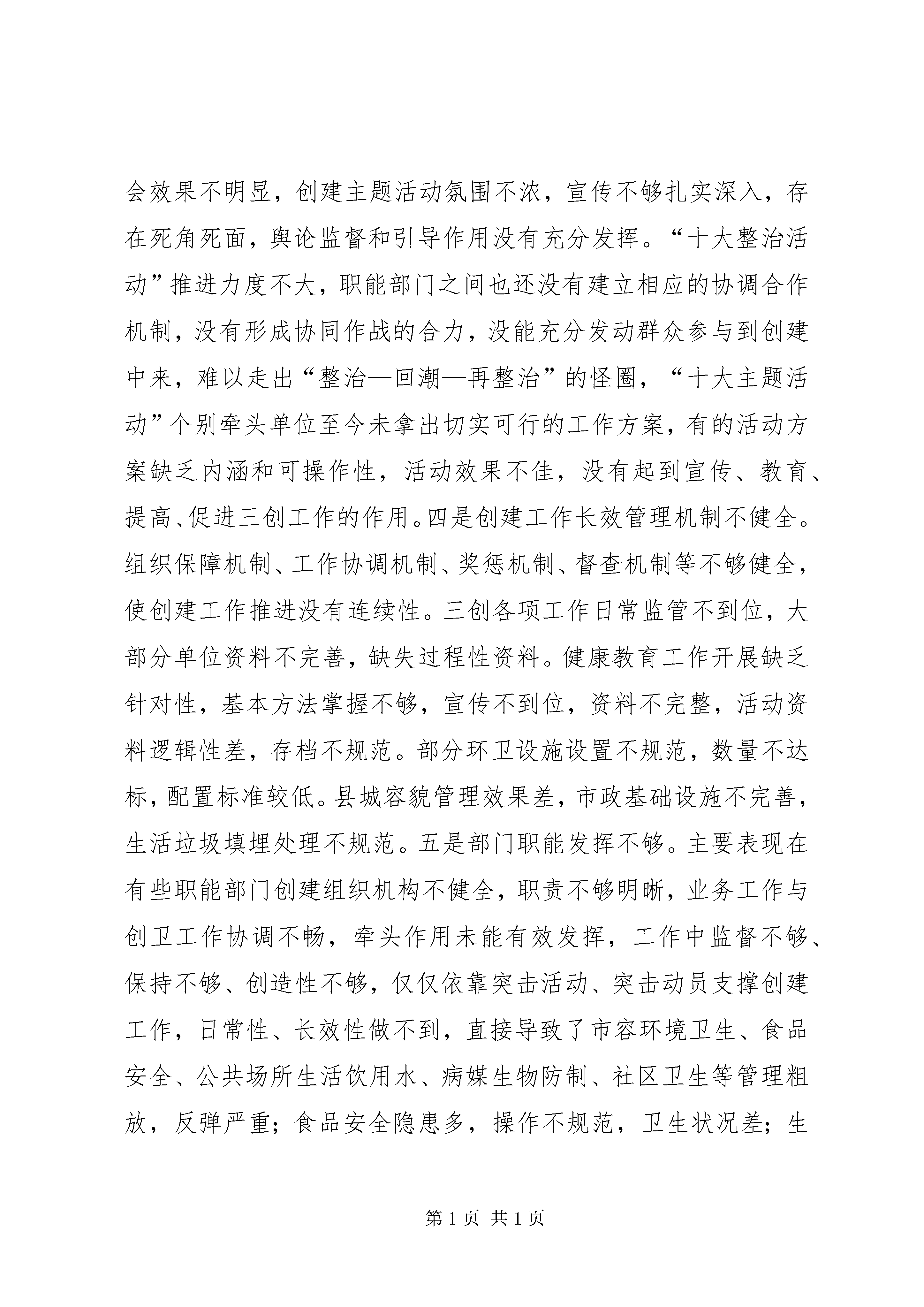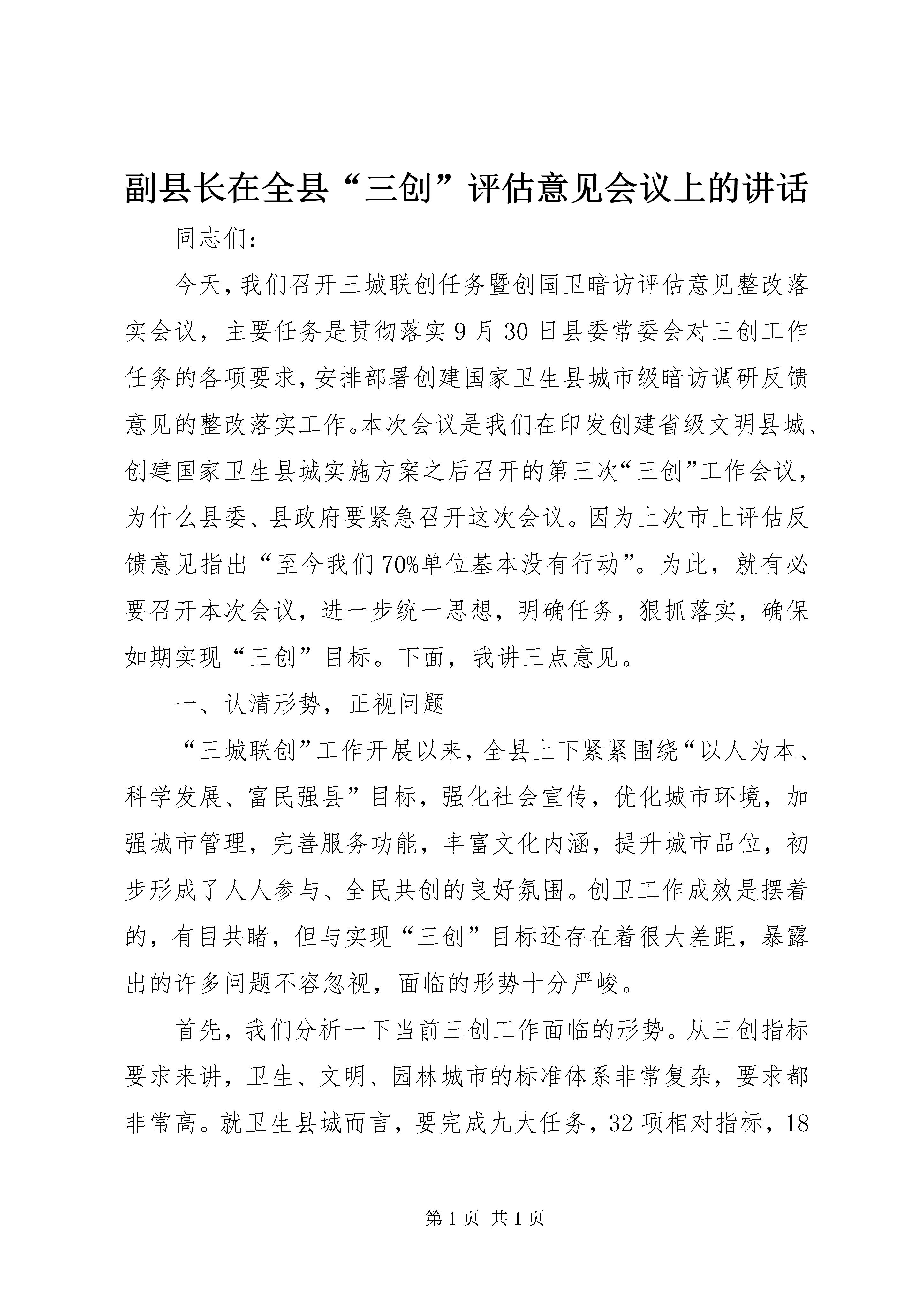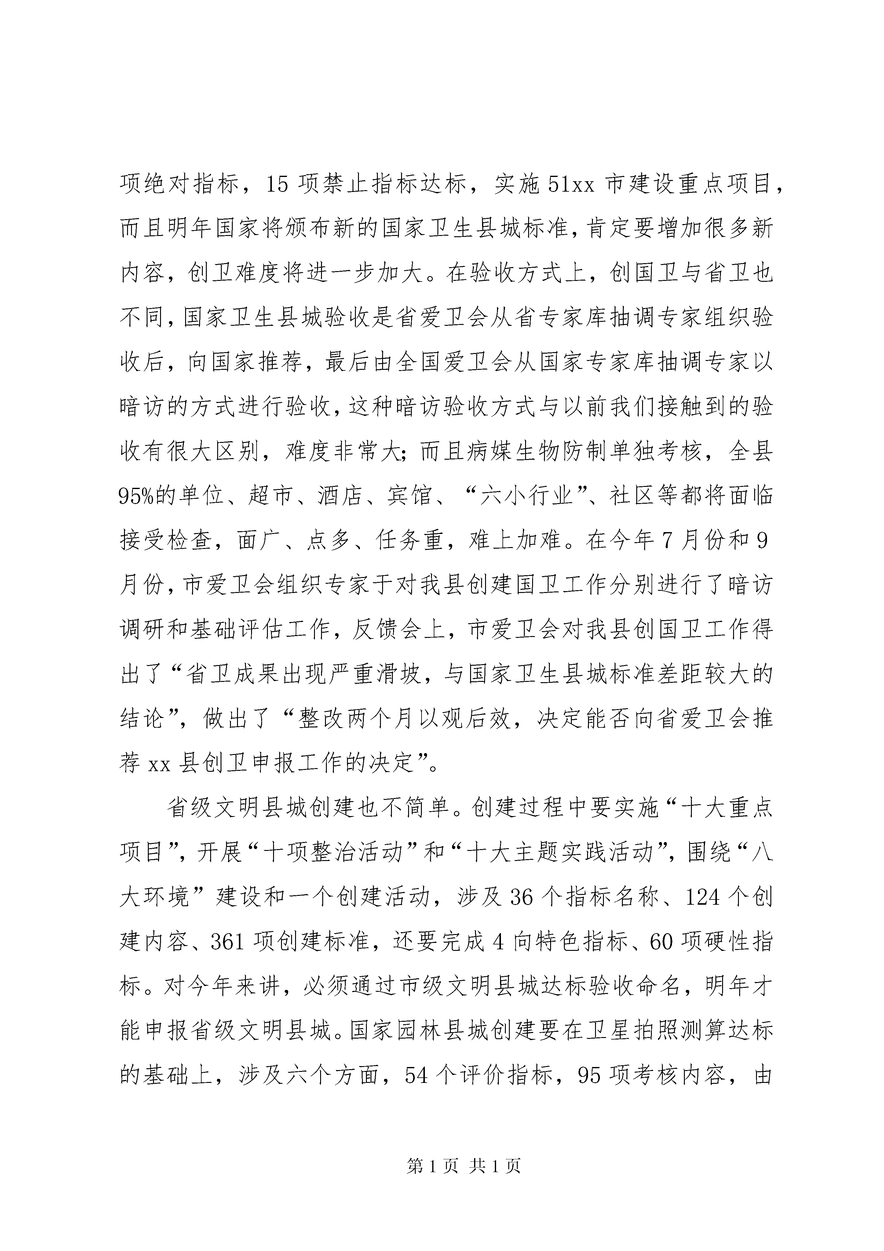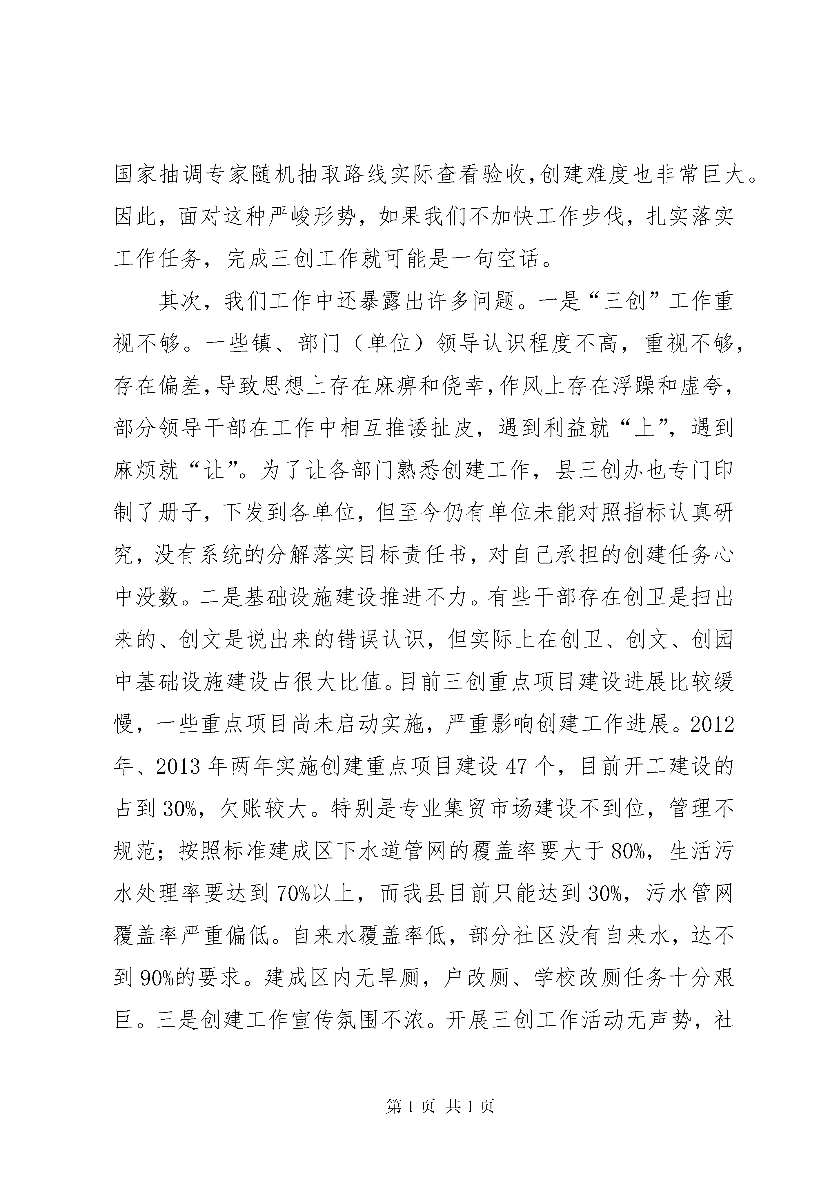 副县长在全县“三创”评估意见会议上的讲话同志们:今天,我们召开三城联创任务暨创国卫暗访评估意见整改落实会议,主要任务是贯彻落实9月30日县委常委会对三创工作任务的各项要求,安排部署创建国家卫生县城市级暗访调研反馈意见的整改落实工作。本次会议是我们在印发创建省级文明县城、创建国家卫生县城实施方案之后召开的第三次“三创”工作会议,为什么县委、县政府要紧急召开这次会议。因为上次市上评估反馈意见指出“至今我们70%单位基本没有行动”。为此,就有必要召开本次会议,进一步统一思想,明确任务,狠抓落实,确保如期实现“三创”目标。下面,我讲三点意见。一、认清形势,正视问题“三城联创”工作开展以来,全县上下紧紧围绕“以人为本、科学发展、富民强县”目标,强化社会宣传,优化城市环境,加强城市管理,完善服务功能,丰富文化内涵,提升城市品位,初步形成了人人参与、全民共创的良好氛围。创卫工作成效是摆着的,有目共睹,但与实现“三创”目标还存在着很大差距,暴露出的许多问题不容忽视,面临的形势十分严峻。首先,我们分析一下当前三创工作面临的形势。从三创指标要求来讲,卫生、文明、园林城市的标准体系非常复杂,要求都非常高。就卫生县城而言,要完成九大任务,32项相对指标,18项绝对指标,15项禁止指标达标,实施51xx市建设重点项目,而且明年国家将颁布新的国家卫生县城标准,肯定要增加很多新内容,创卫难度将进一步加大。在验收方式上,创国卫与省卫也不同,国家卫生县城验收是省爱卫会从省专家库抽调专家组织验收后,向国家推荐,最后由全国爱卫会从国家专家库抽调专家以暗访的方式进行验收,这种暗访验收方式与以前我们接触到的验收有很大区别,难度非常大;而且病媒生物防制单独考核,全县95%的单位、超市、酒店、宾馆、“六小行业”、社区等都将面临接受检查,面广、点多、任务重,难上加难。在今年7月份和9月份,市爱卫会组织专家于对我县创建国卫工作分别进行了暗访调研和基础评估工作,反馈会上,市爱卫会对我县创国卫工作得出了“省卫成果出现严重滑坡,与国家卫生县城标准差距较大的结论”,做出了“整改两个月以观后效,决定能否向省爱卫会推荐xx县创卫申报工作的决定”。省级文明县城创建也不简单。创建过程中要实施“十大重点项目”,开展“十项整治活动”和“十大主题实践活动”,围绕“八大环境”建设和一个创建活动,涉及36个指标名称、124个创建内容、361项创建标准,还要完成4向特色指标、60项硬性指标。对今年来讲,必须通过市级文明县城达标验收命名,明年才能申报省级文明县城。国家园林县城创建要在卫星拍照测算达标的基础上,涉及六个方面,54个评价指标,95项考核内容,由国家抽调专家随机抽取路线实际查看验收,创建难度也非常巨大。因此,面对这种严峻形势,如果我们不加快工作步伐,扎实落实工作任务,完成三创工作就可能是一句空话。其次,我们工作中还暴露出许多问题。一是“三创”工作重视不够。一些镇、部门(单位)领导认识程度不高,重视不够,存在偏差,导致思想上存在麻痹和侥幸,作风上存在浮躁和虚夸,部分领导干部在工作中相互推诿扯皮,遇到利益就“上”,遇到麻烦就“让”。为了让各部门熟悉创建工作,县三创办也专门印制了册子,下发到各单位,但至今仍有单位未能对照指标认真研究,没有系统的分解落实目标责任书,对自己承担的创建任务心中没数。二是基础设施建设推进不力。有些干部存在创卫是扫出来的、创文是说出来的错误认识,但实际上在创卫、创文、创园中基础设施建设占很大比值。目前三创重点项目建设进展比较缓慢,一些重点项目尚未启动实施,严重影响创建工作进展。2012年、2013年两年实施创建重点项目建设47个,目前开工建设的占到30%,欠账较大。特别是专业集贸市场建设不到位,管理不规范;按照标准建成区下水道管网的覆盖率要大于80%,生活污水处理率要达到70%以上,而我县目前只能达到30%,污水管网覆盖率严重偏低。自来水覆盖率低,部分社区没有自来水,达不到90%的要求。建成区内无旱厕,户改厕、学校改厕任务十分艰巨。三是创建工作宣传氛围不浓。开展三创工作活动无声势,社会效果不明显,创建主题活动氛围不浓,宣传不够扎实深入,存在死角死面,舆论监督和引导作用没有充分发挥。“十大整治活动”推进力度不大,职能部门之间也还没有建立相应的协调合作机制,没有形成协同作战的合力,没能充分发动群众参与到创建中来,难以走出“整治—回潮—再整治”的怪圈,“十大主题活动”个别牵头单位至今未拿出切实可行的工作方案,有的活动方案缺乏内涵和可操作性,活动效果不佳,没有起到宣传、教育、提高、促进三创工作的作用。四是创建工作长效管理机制不健全。组织保障机制、工作协调机制、奖惩机制、督查机制等不够健全,使创建工作推进没有连续性。三创各项工作日常监管不到位,大部分单位资料不完