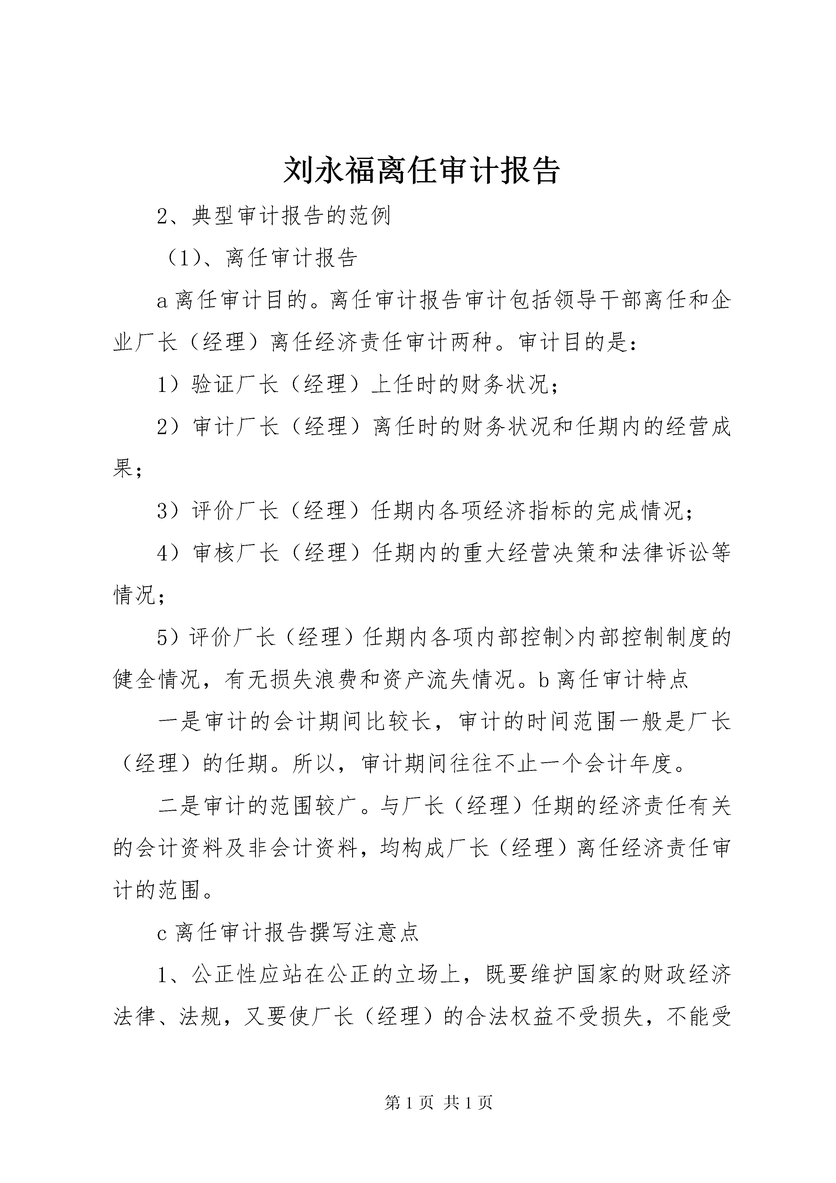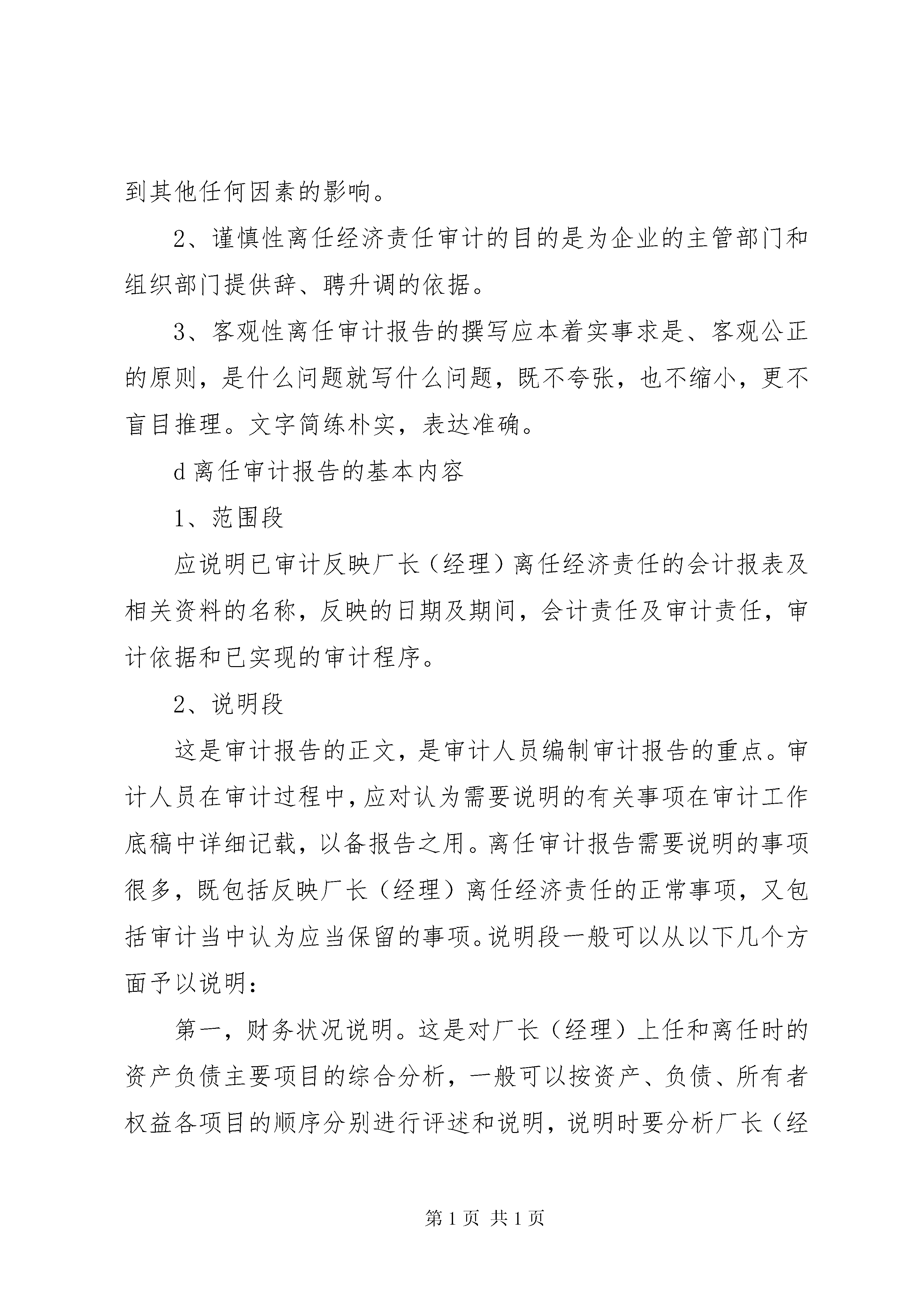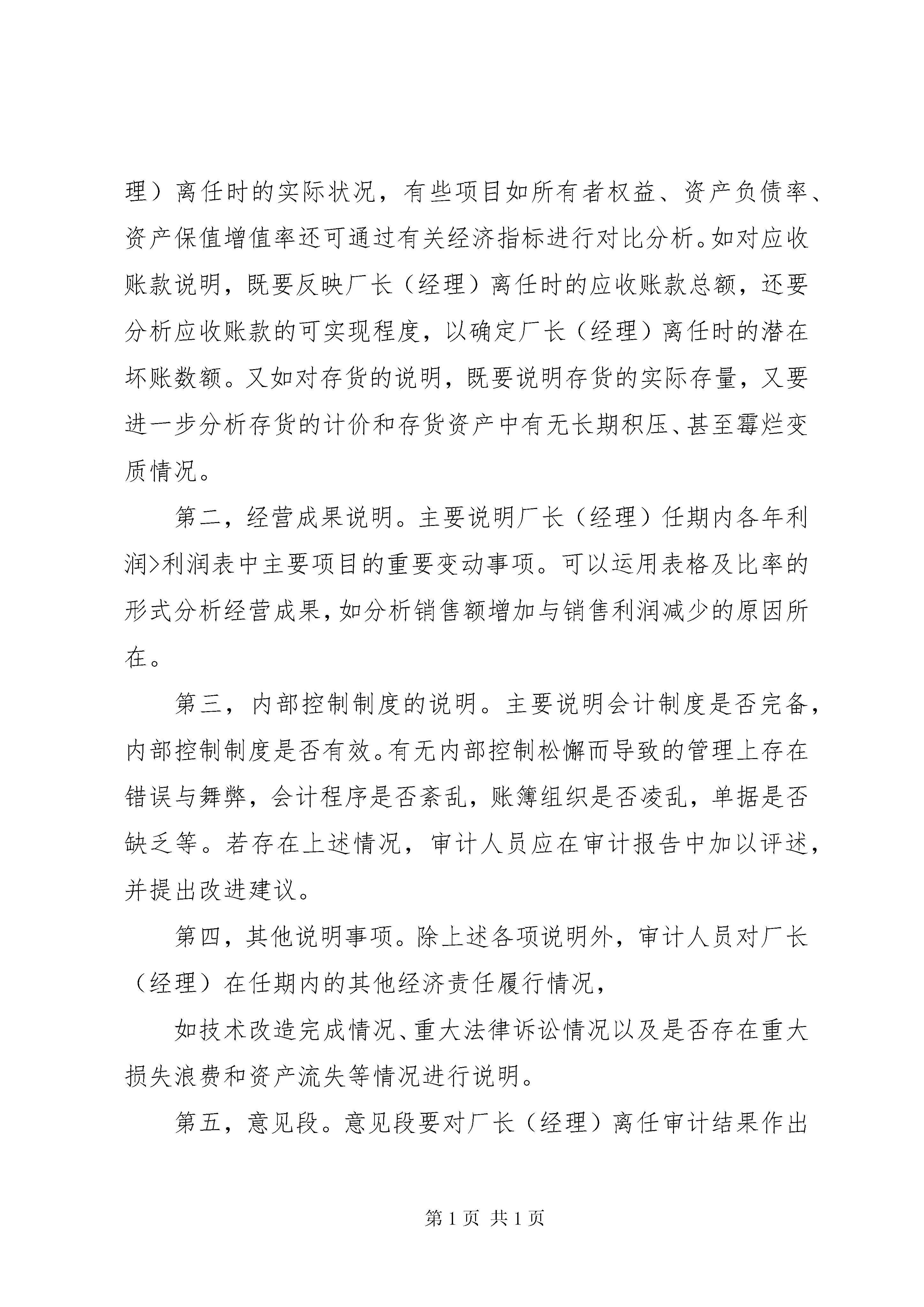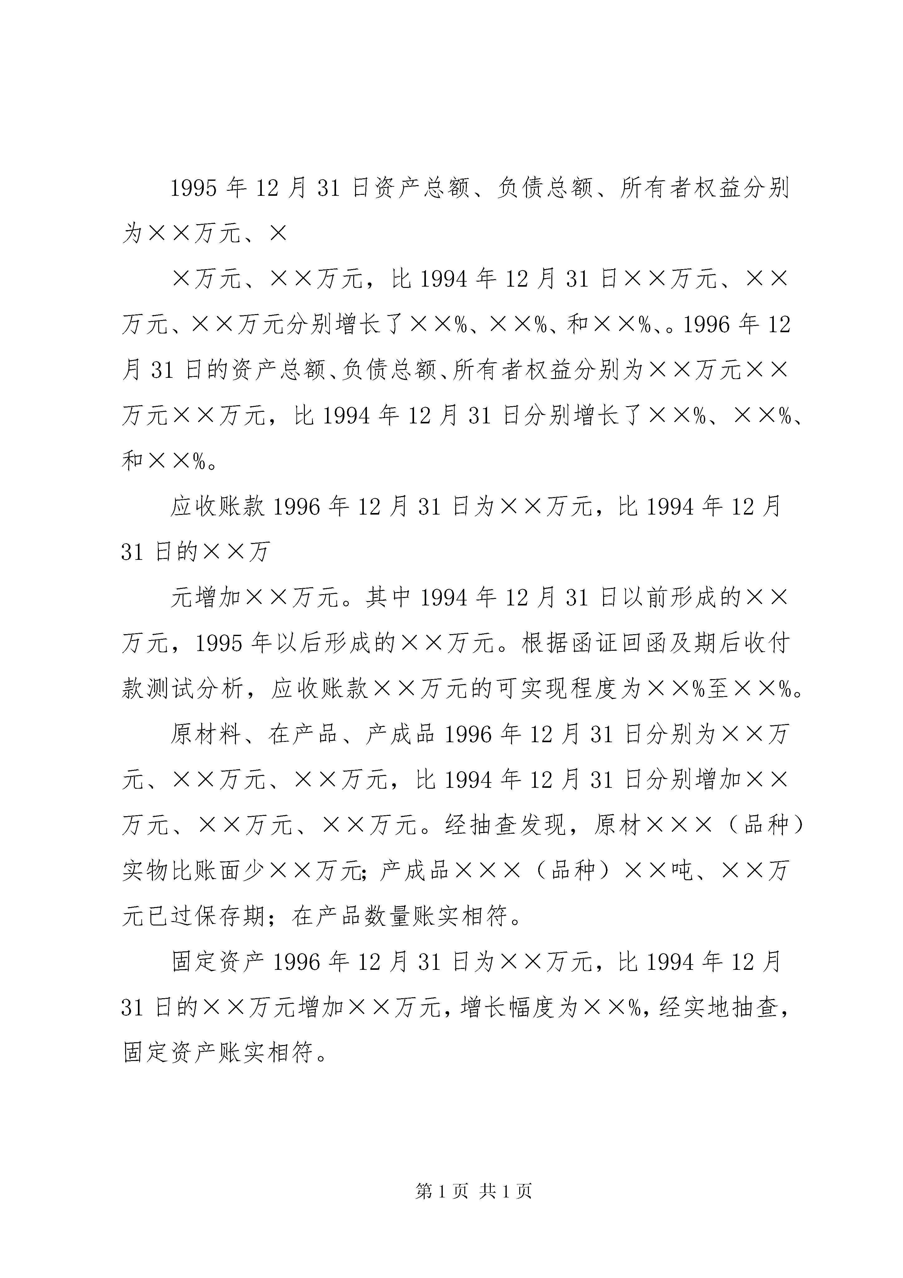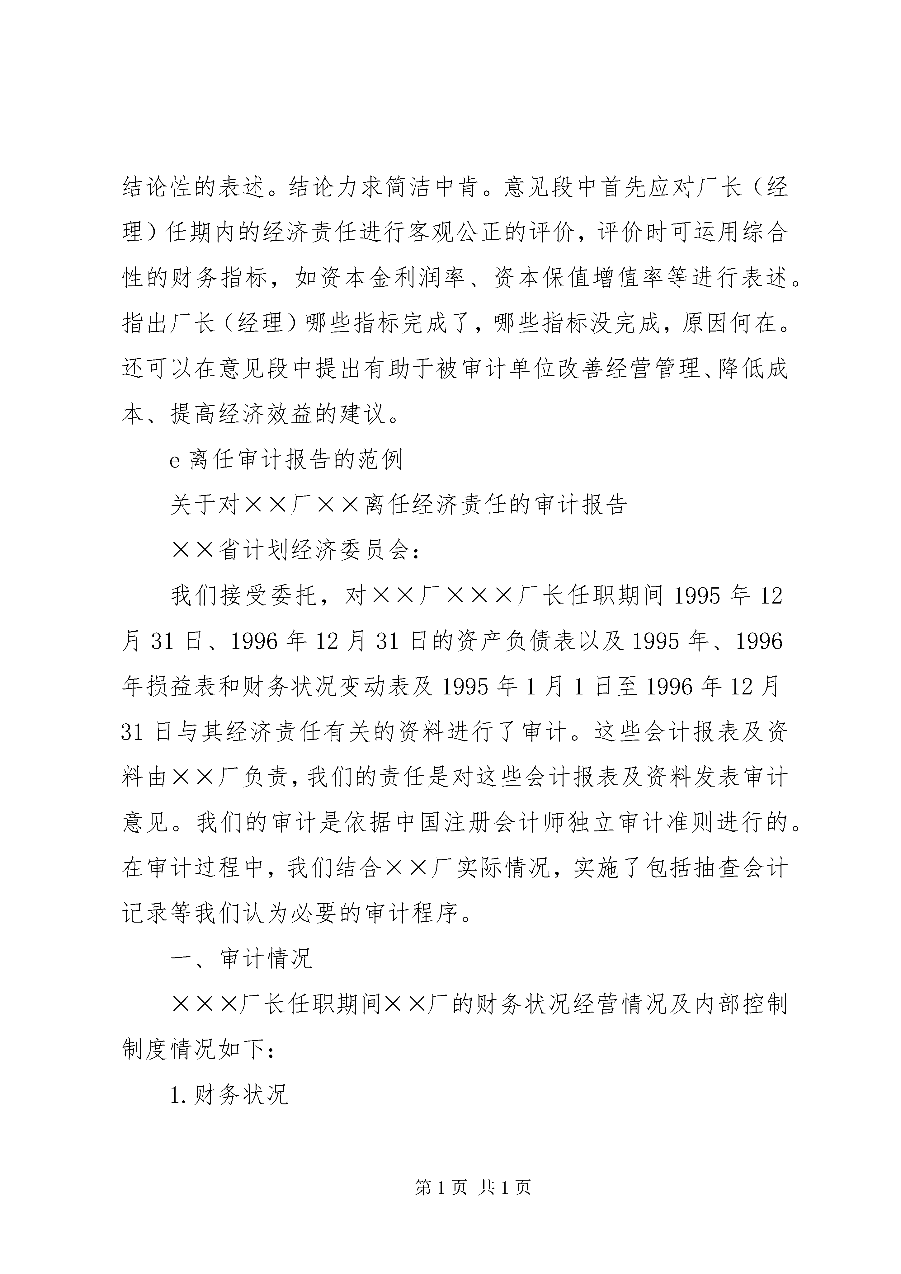 刘永福离任审计报告2、典型审计报告的范例(1)、离任审计报告a离任审计目的。离任审计报告审计包括领导干部离任和企业厂长(经理)离任经济责任审计两种。审计目的是:1)验证厂长(经理)上任时的财务状况;2)审计厂长(经理)离任时的财务状况和任期内的经营成果;3)评价厂长(经理)任期内各项经济指标的完成情况;4)审核厂长(经理)任期内的重大经营决策和法律诉讼等情况;5)评价厂长(经理)任期内各项内部控制>内部控制制度的健全情况,有无损失浪费和资产流失情况。b离任审计特点一是审计的会计期间比较长,审计的时间范围一般是厂长(经理)的任期。所以,审计期间往往不止一个会计年度。二是审计的范围较广。与厂长(经理)任期的经济责任有关的会计资料及非会计资料,均构成厂长(经理)离任经济责任审计的范围。c离任审计报告撰写注意点1、公正性应站在公正的立场上,既要维护国家的财政经济法律、法规,又要使厂长(经理)的合法权益不受损失,不能受到其他任何因素的影响。2、谨慎性离任经济责任审计的目的是为企业的主管部门和组织部门提供辞、聘升调的依据。3、客观性离任审计报告的撰写应本着实事求是、客观公正的原则,是什么问题就写什么问题,既不夸张,也不缩小,更不盲目推理。文字简练朴实,表达准确。d离任审计报告的基本内容1、范围段应说明已审计反映厂长(经理)离任经济责任的会计报表及相关资料的名称,反映的日期及期间,会计责任及审计责任,审计依据和已实现的审计程序。2、说明段这是审计报告的正文,是审计人员编制审计报告的重点。审计人员在审计过程中,应对认为需要说明的有关事项在审计工作底稿中详细记载,以备报告之用。离任审计报告需要说明的事项很多,既包括反映厂长(经理)离任经济责任的正常事项,又包括审计当中认为应当保留的事项。说明段一般可以从以下几个方面予以说明:第一,财务状况说明。这是对厂长(经理)上任和离任时的资产负债主要项目的综合分析,一般可以按资产、负债、所有者权益各项目的顺序分别进行评述和说明,说明时要分析厂长(经理)离任时的实际状况,有些项目如所有者权益、资产负债率、资产保值增值率还可通过有关经济指标进行对比分析。如对应收账款说明,既要反映厂长(经理)离任时的应收账款总额,还要分析应收账款的可实现程度,以确定厂长(经理)离任时的潜在坏账数额。又如对存货的说明,既要说明存货的实际存量,又要进一步分析存货的计价和存货资产中有无长期积压、甚至霉烂变质情况。第二,经营成果说明。主要说明厂长(经理)任期内各年利润>利润表中主要项目的重要变动事项。可以运用表格及比率的形式分析经营成果,如分析销售额增加与销售利润减少的原因所在。第三,内部控制制度的说明。主要说明会计制度是否完备,内部控制制度是否有效。有无内部控制松懈而导致的管理上存在错误与舞弊,会计程序是否紊乱,账簿组织是否凌乱,单据是否缺乏等。若存在上述情况,审计人员应在审计报告中加以评述,并提出改进建议。第四,其他说明事项。除上述各项说明外,审计人员对厂长(经理)在任期内的其他经济责任履行情况,如技术改造完成情况、重大法律诉讼情况以及是否存在重大损失浪费和资产流失等情况进行说明。第五,意见段。意见段要对厂长(经理)离任审计结果作出结论性的表述。结论力求简洁中肯。意见段中首先应对厂长(经理)任期内的经济责任进行客观公正的评价,评价时可运用综合性的财务指标,如资本金利润率、资本保值增值率等进行表述。指出厂长(经理)哪些指标完成了,哪些指标没完成,原因何在。还可以在意见段中提出有助于被审计单位改善经营管理、降低成本、提高经济效益的建议。e离任审计报告的范例关于对××厂××离任经济责任的审计报告××省计划经济委员会:我们接受委托,对××厂×××厂长任职期间1995年12月31日、1996年12月31日的资产负债表以及1995年、1996年损益表和财务状况变动表及1995年1月1日至1996年12月31日与其经济责任有关的资料进行了审计。这些会计报表及资料由××厂负责,我们的责任是对这些会计报表及资料发表审计意见。我们的审计是依据中国注册会计师独立审计准则进行的。在审计过程中,我们结合××厂实际情况,实施了包括抽查会计记录等我们认为必要的审计程序。一、审计情况×××厂长任职期间××厂的财务状况经营情况及内部控制制度情况如下:1.财务状况1995年12月31日资产总额、负债总额、所有者权益分别为××万元、××万元、××万元,比1994年12月31日××万元、××万元、××万元分别增长了××%、××%、和××%、。1996年12月31日的资产总额、负债总额、所有者权益分别为××万元××万元××万元,比1994年12月31日分别增长了××%、××%、和××%。应收账款1996年12月31日为××万元,比1994年12月3