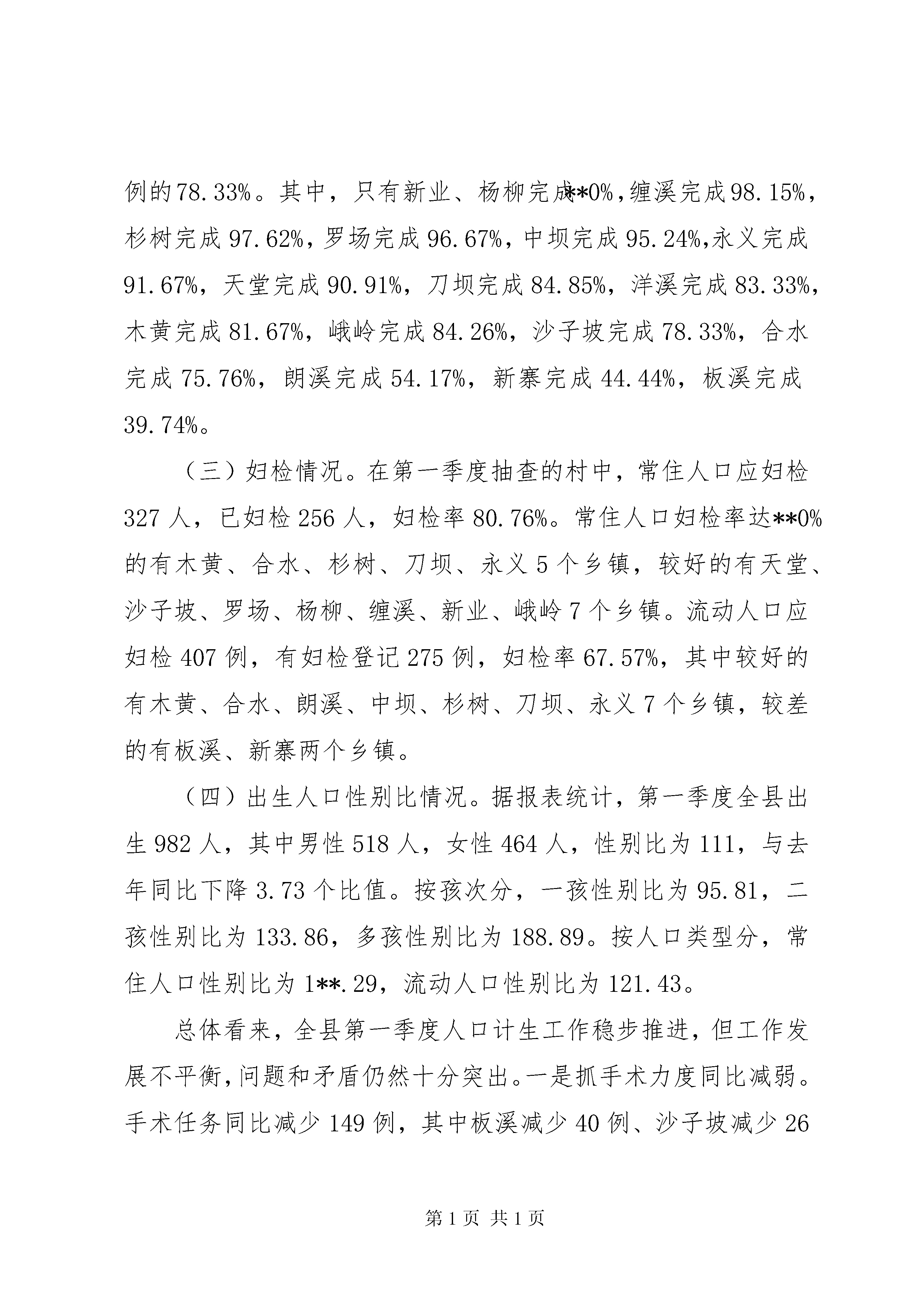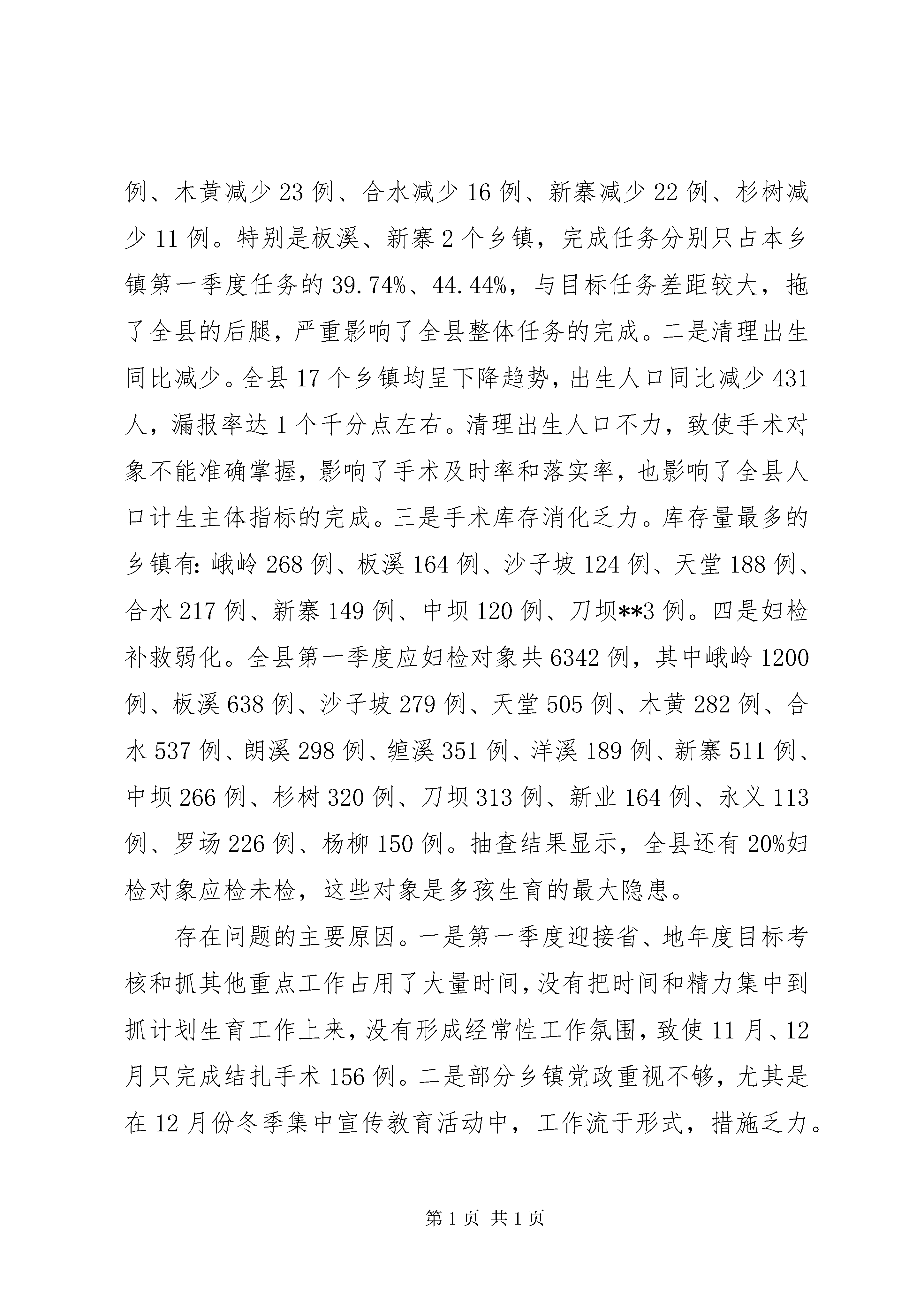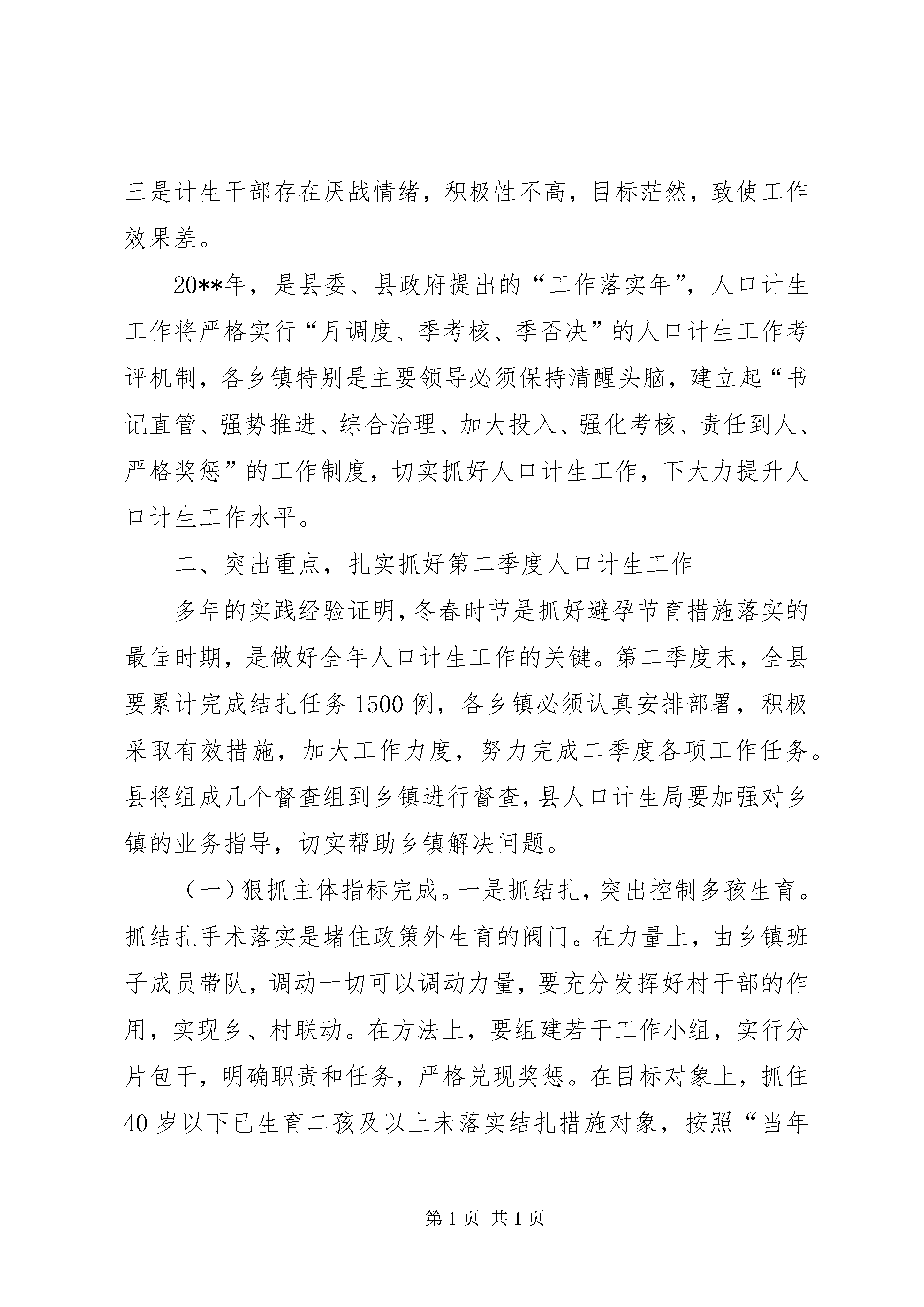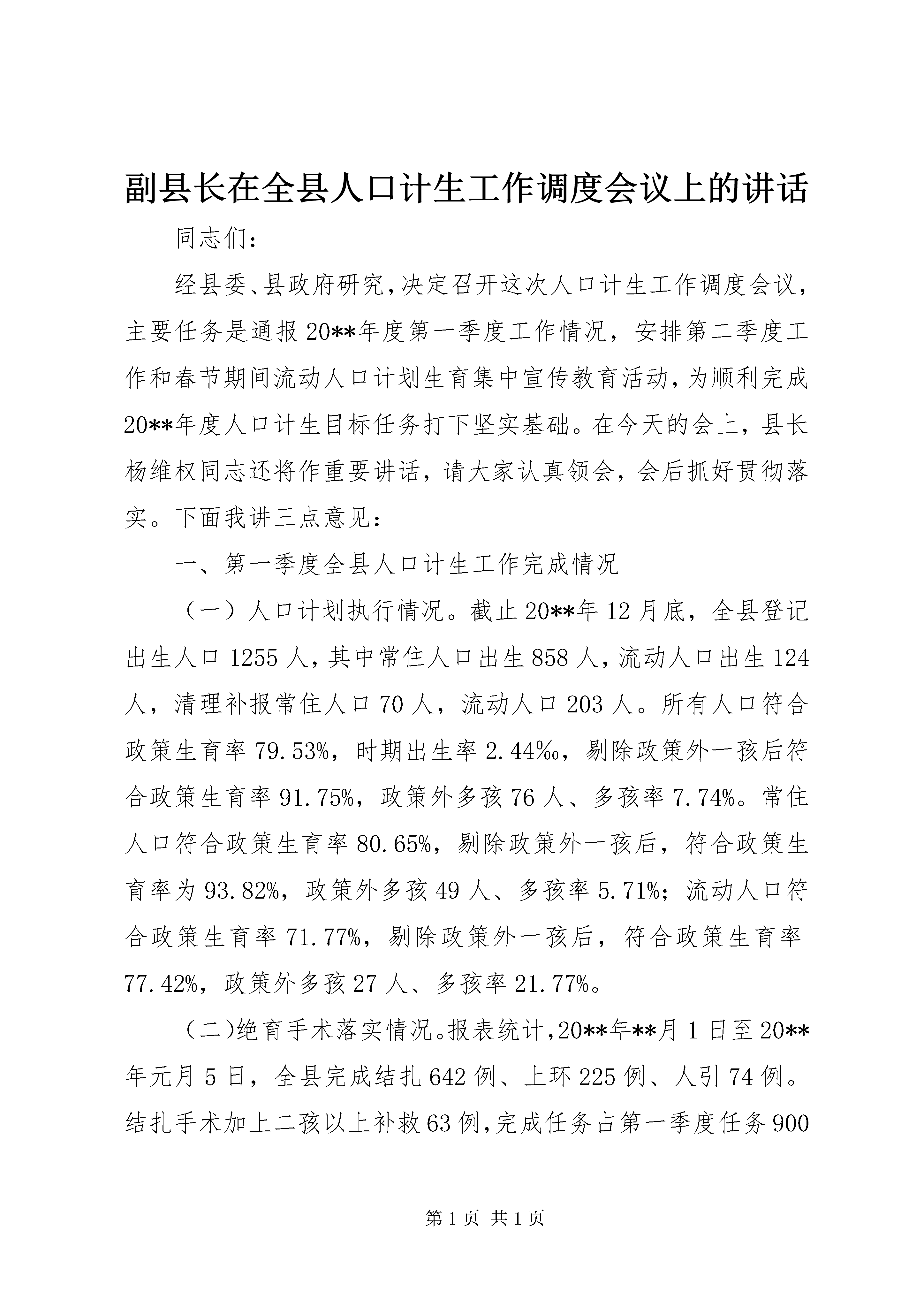 副县长在全县人口计生工作调度会议上的讲话同志们:经县委、县政府研究,决定召开这次人口计生工作调度会议,主要任务是通报20**年度第一季度工作情况,安排第二季度工作和春节期间流动人口计划生育集中宣传教育活动,为顺利完成20**年度人口计生目标任务打下坚实基础。在今天的会上,县长杨维权同志还将作重要讲话,请大家认真领会,会后抓好贯彻落实。下面我讲三点意见:一、第一季度全县人口计生工作完成情况(一)人口计划执行情况。截止20**年12月底,全县登记出生人口1255人,其中常住人口出生858人,流动人口出生124人,清理补报常住人口70人,流动人口203人。所有人口符合政策生育率79.53%,时期出生率2.44‰,剔除政策外一孩后符合政策生育率91.75%,政策外多孩76人、多孩率7.74%。常住人口符合政策生育率80.65%,剔除政策外一孩后,符合政策生育率为93.82%,政策外多孩49人、多孩率5.71%;流动人口符合政策生育率71.77%,剔除政策外一孩后,符合政策生育率77.42%,政策外多孩27人、多孩率21.77%。(二)绝育手术落实情况。报表统计,20**年**月1日至20**年元月5日,全县完成结扎642例、上环225例、人引74例。结扎手术加上二孩以上补救63例,完成任务占第一季度任务900例的78.33%。其中,只有新业、杨柳完成**0%,缠溪完成98.15%,杉树完成97.62%,罗场完成96.67%,中坝完成95.24%,永义完成91.67%,天堂完成90.91%,刀坝完成84.85%,洋溪完成83.33%,木黄完成81.67%,峨岭完成84.26%,沙子坡完成78.33%,合水完成75.76%,朗溪完成54.17%,新寨完成44.44%,板溪完成39.74%。(三)妇检情况。在第一季度抽查的村中,常住人口应妇检327人,已妇检256人,妇检率80.76%。常住人口妇检率达**0%的有木黄、合水、杉树、刀坝、永义5个乡镇,较好的有天堂、沙子坡、罗场、杨柳、缠溪、新业、峨岭7个乡镇。流动人口应妇检407例,有妇检登记275例,妇检率67.57%,其中较好的有木黄、合水、朗溪、中坝、杉树、刀坝、永义7个乡镇,较差的有板溪、新寨两个乡镇。(四)出生人口性别比情况。据报表统计,第一季度全县出生982人,其中男性518人,女性464人,性别比为111,与去年同比下降3.73个比值。按孩次分,一孩性别比为95.81,二孩性别比为133.86,多孩性别比为188.89。按人口类型分,常住人口性别比为1**.29,流动人口性别比为121.43。总体看来,全县第一季度人口计生工作稳步推进,但工作发展不平衡,问题和矛盾仍然十分突出。一是抓手术力度同比减弱。手术任务同比减少149例,其中板溪减少40例、沙子坡减少26例、木黄减少23例、合水减少16例、新寨减少22例、杉树减少11例。特别是板溪、新寨2个乡镇,完成任务分别只占本乡镇第一季度任务的39.74%、44.44%,与目标任务差距较大,拖了全县的后腿,严重影响了全县整体任务的完成。二是清理出生同比减少。全县17个乡镇均呈下降趋势,出生人口同比减少431人,漏报率达1个千分点左右。清理出生人口不力,致使手术对象不能准确掌握,影响了手术及时率和落实率,也影响了全县人口计生主体指标的完成。三是手术库存消化乏力。库存量最多的乡镇有:峨岭268例、板溪164例、沙子坡124例、天堂188例、合水217例、新寨149例、中坝120例、刀坝**3例。四是妇检补救弱化。全县第一季度应妇检对象共6342例,其中峨岭1200例、板溪638例、沙子坡279例、天堂505例、木黄282例、合水537例、朗溪298例、缠溪351例、洋溪189例、新寨511例、中坝266例、杉树320例、刀坝313例、新业164例、永义113例、罗场226例、杨柳150例。抽查结果显示,全县还有20%妇检对象应检未检,这些对象是多孩生育的最大隐患。存在问题的主要原因。一是第一季度迎接省、地年度目标考核和抓其他重点工作占用了大量时间,没有把时间和精力集中到抓计划生育工作上来,没有形成经常性工作氛围,致使11月、12月只完成结扎手术156例。二是部分乡镇党政重视不够,尤其是在12月份冬季集中宣传教育活动中,工作流于形式,措施乏力。三是计生干部存在厌战情绪,积极性不高,目标茫然,致使工作效果差。20**年,是县委、县政府提出的“工作落实年”,人口计生工作将严格实行“月调度、季考核、季否决”的人口计生工作考评机制,各乡镇特别是主要领导必须保持清醒头脑,建立起“书记直管、强势推进、综合治理、加大投入、强化考核、责任到人、严格奖惩”的工作制度,切实抓好人口计生工作,下大力提升人口计生工作水平。二、突出重点,