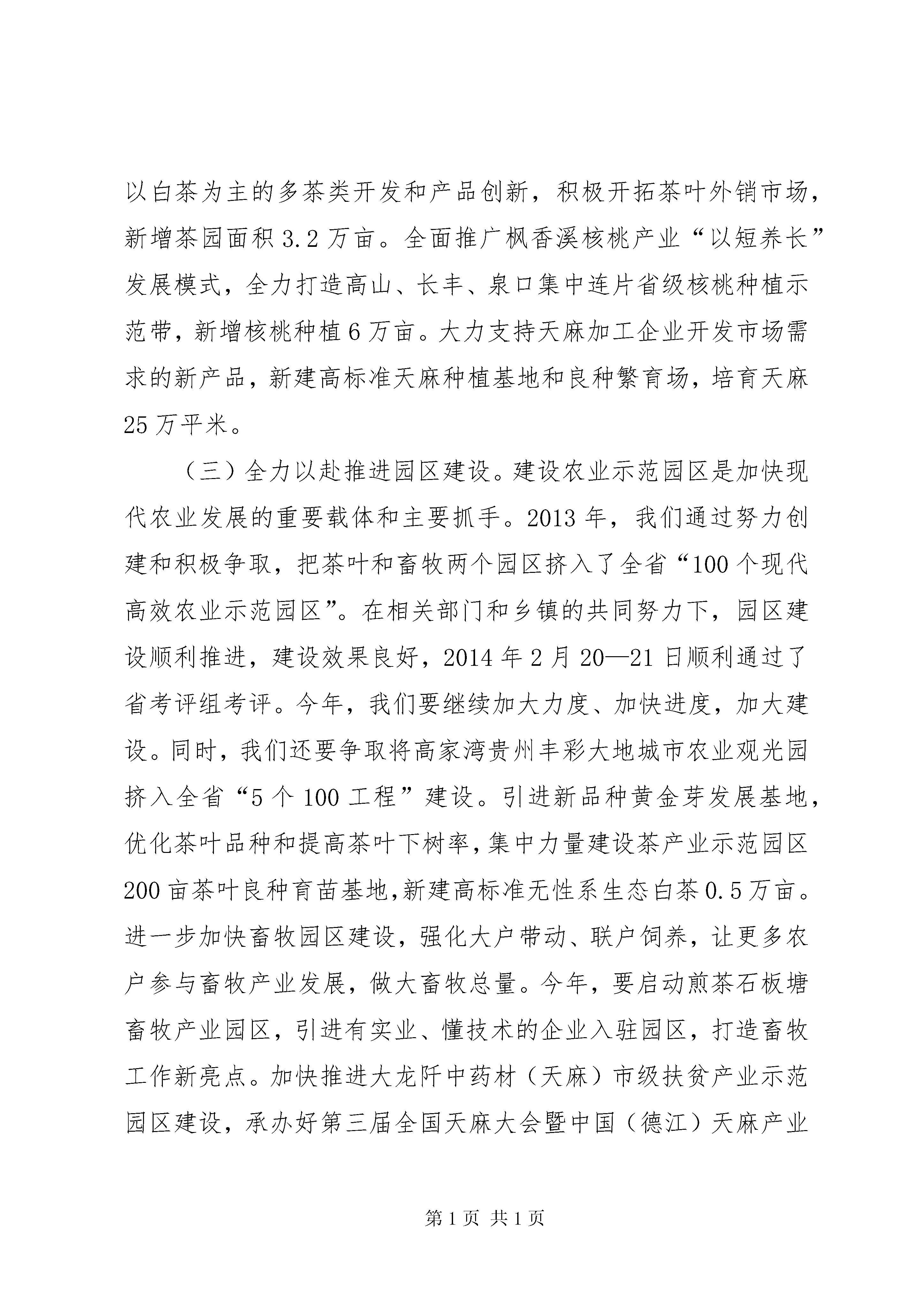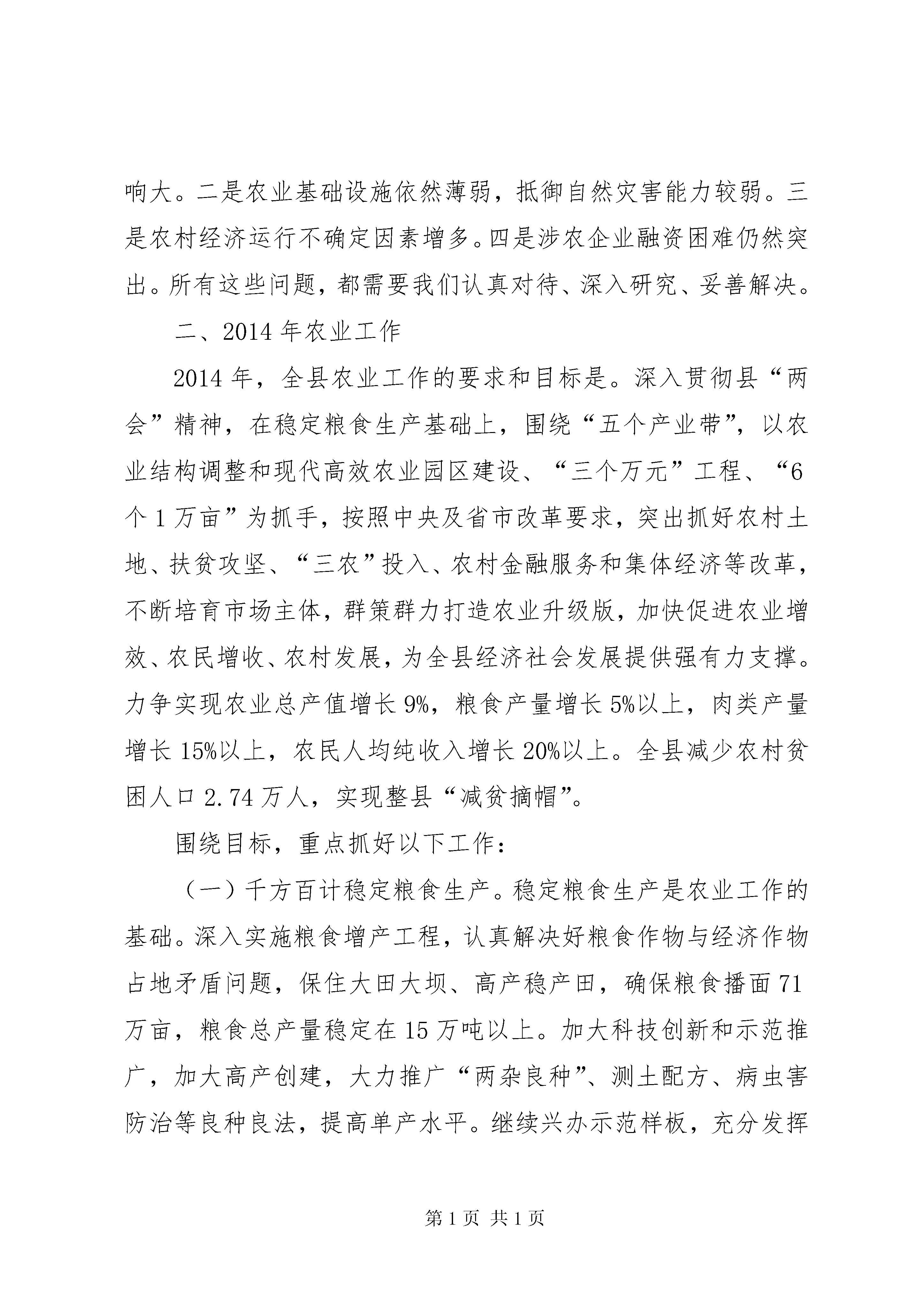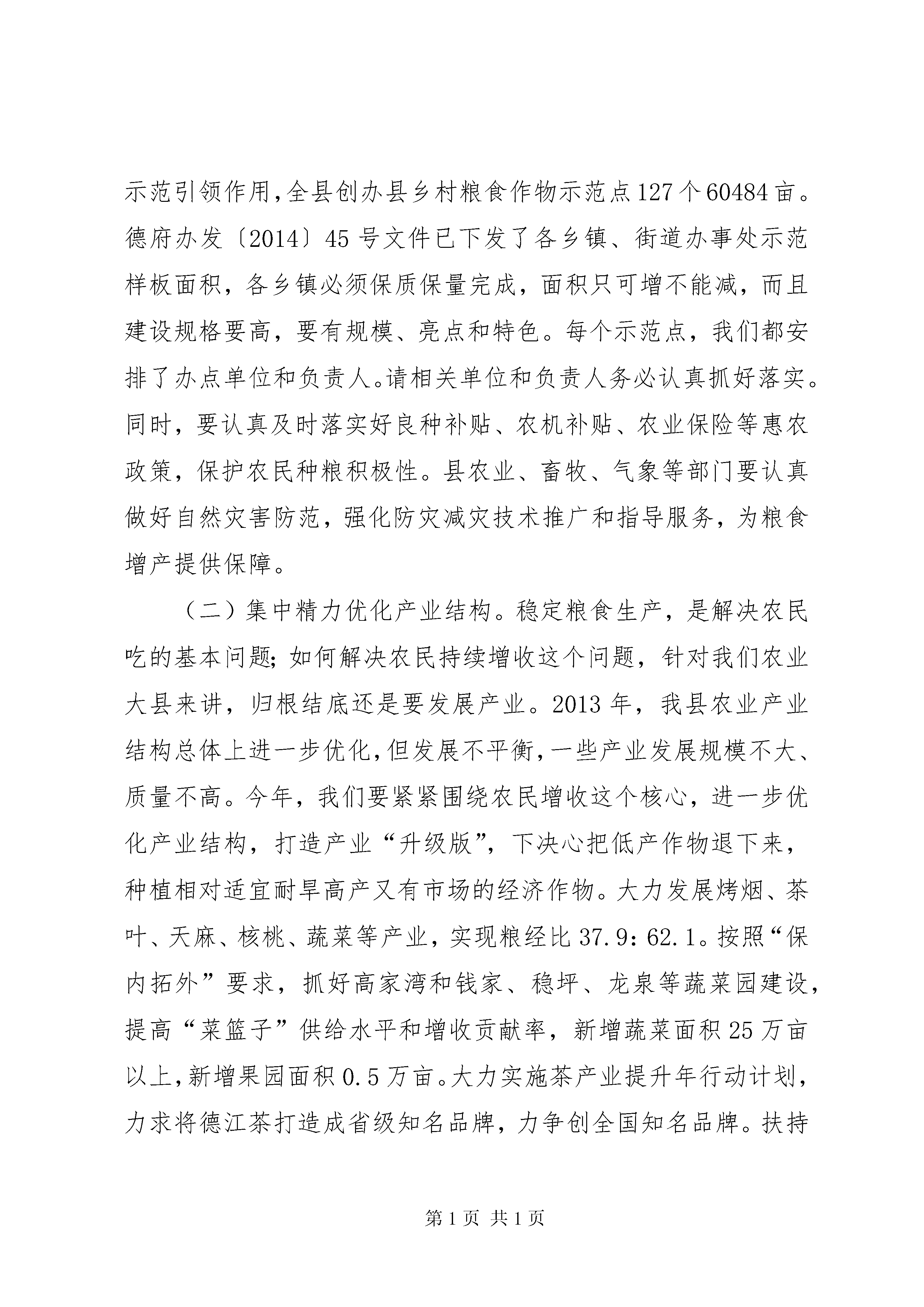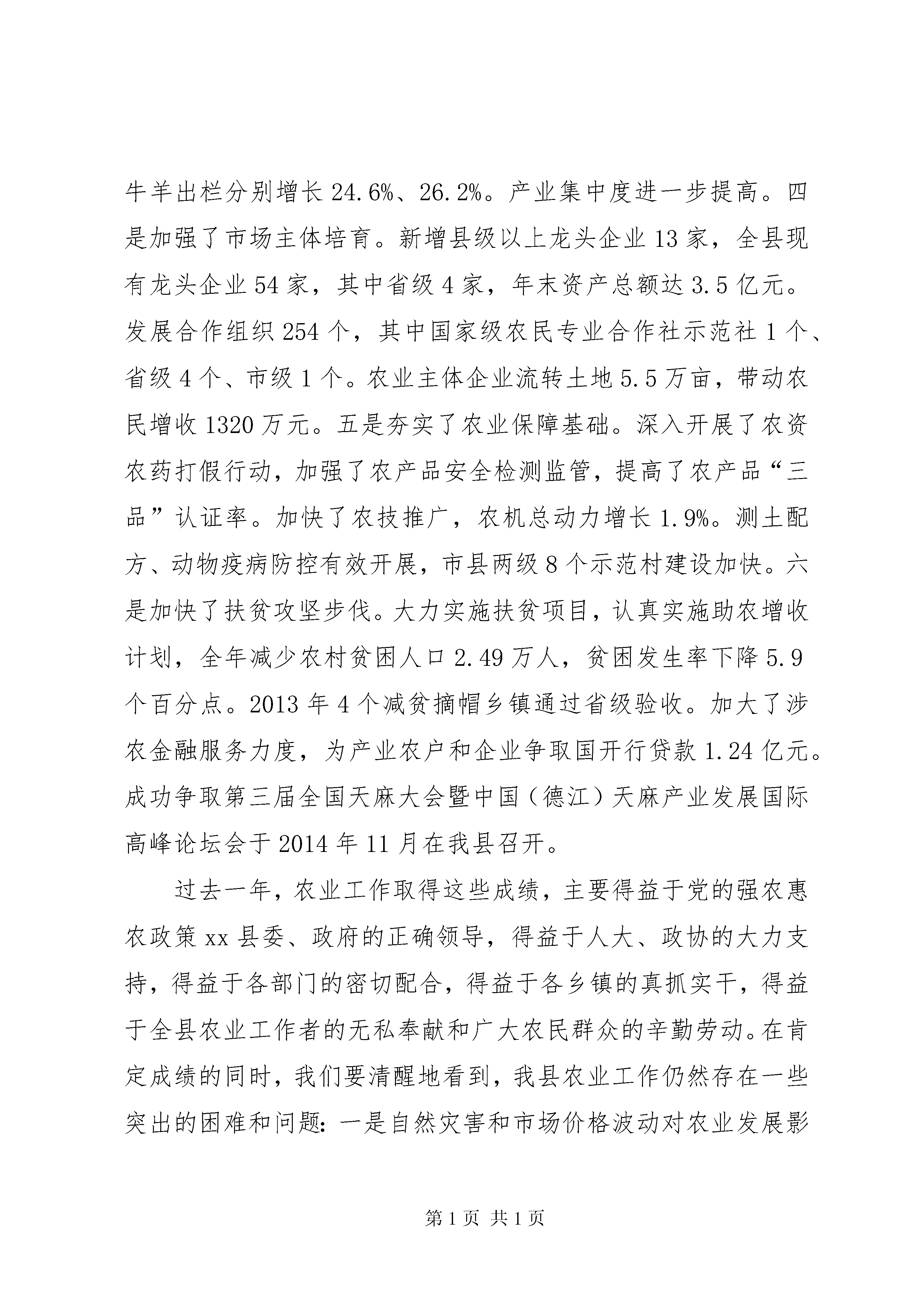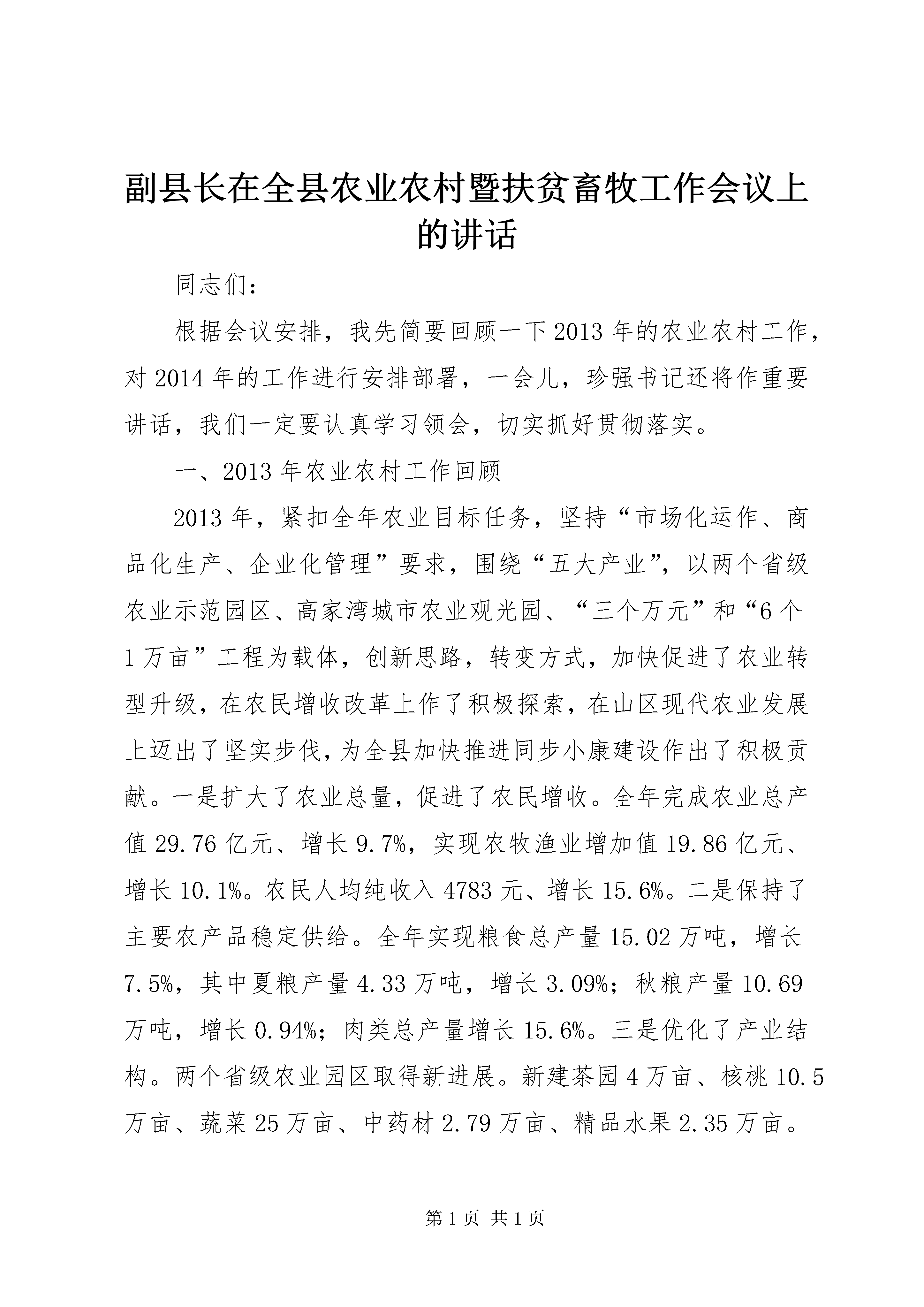 副县长在全县农业农村暨扶贫畜牧工作会议上的讲话同志们:根据会议安排,我先简要回顾一下2013年的农业农村工作,对2014年的工作进行安排部署,一会儿,珍强书记还将作重要讲话,我们一定要认真学习领会,切实抓好贯彻落实。一、2013年农业农村工作回顾2013年,紧扣全年农业目标任务,坚持“市场化运作、商品化生产、企业化管理”要求,围绕“五大产业”,以两个省级农业示范园区、高家湾城市农业观光园、“三个万元”和“6个1万亩”工程为载体,创新思路,转变方式,加快促进了农业转型升级,在农民增收改革上作了积极探索,在山区现代农业发展上迈出了坚实步伐,为全县加快推进同步小康建设作出了积极贡献。一是扩大了农业总量,促进了农民增收。全年完成农业总产值29.76亿元、增长9.7%,实现农牧渔业增加值19.86亿元、增长10.1%。农民人均纯收入4783元、增长15.6%。二是保持了主要农产品稳定供给。全年实现粮食总产量15.02万吨,增长7.5%,其中夏粮产量4.33万吨,增长3.09%;秋粮产量10.69万吨,增长0.94%;肉类总产量增长15.6%。三是优化了产业结构。两个省级农业园区取得新进展。新建茶园4万亩、核桃10.5万亩、蔬菜25万亩、中药材2.79万亩、精品水果2.35万亩。牛羊出栏分别增长24.6%、26.2%。产业集中度进一步提高。四是加强了市场主体培育。新增县级以上龙头企业13家,全县现有龙头企业54家,其中省级4家,年末资产总额达3.5亿元。发展合作组织254个,其中国家级农民专业合作社示范社1个、省级4个、市级1个。农业主体企业流转土地5.5万亩,带动农民增收1320万元。五是夯实了农业保障基础。深入开展了农资农药打假行动,加强了农产品安全检测监管,提高了农产品“三品”认证率。加快了农技推广,农机总动力增长1.9%。测土配方、动物疫病防控有效开展,市县两级8个示范村建设加快。六是加快了扶贫攻坚步伐。大力实施扶贫项目,认真实施助农增收计划,全年减少农村贫困人口2.49万人,贫困发生率下降5.9个百分点。2013年4个减贫摘帽乡镇通过省级验收。加大了涉农金融服务力度,为产业农户和企业争取国开行贷款1.24亿元。成功争取第三届全国天麻大会暨中国(德江)天麻产业发展国际高峰论坛会于2014年11月在我县召开。过去一年,农业工作取得这些成绩,主要得益于党的强农惠农政策xx县委、政府的正确领导,得益于人大、政协的大力支持,得益于各部门的密切配合,得益于各乡镇的真抓实干,得益于全县农业工作者的无私奉献和广大农民群众的辛勤劳动。在肯定成绩的同时,我们要清醒地看到,我县农业工作仍然存在一些突出的困难和问题:一是自然灾害和市场价格波动对农业发展影响大。二是农业基础设施依然薄弱,抵御自然灾害能力较弱。三是农村经济运行不确定因素增多。四是涉农企业融资困难仍然突出。所有这些问题,都需要我们认真对待、深入研究、妥善解决。二、2014年农业工作2014年,全县农业工作的要求和目标是。深入贯彻县“两会”精神,在稳定粮食生产基础上,围绕“五个产业带”,以农业结构调整和现代高效农业园区建设、“三个万元”工程、“6个1万亩”为抓手,按照中央及省市改革要求,突出抓好农村土地、扶贫攻坚、“三农”投入、农村金融服务和集体经济等改革,不断培育市场主体,群策群力打造农业升级版,加快促进农业增效、农民增收、农村发展,为全县经济社会发展提供强有力支撑。力争实现农业总产值增长9%,粮食产量增长5%以上,肉类产量增长15%以上,农民人均纯收入增长20%以上。全县减少农村贫困人口2.74万人,实现整县“减贫摘帽”。围绕目标,重点抓好以下工作:(一)千方百计稳定粮食生产。稳定粮食生产是农业工作的基础。深入实施粮食增产工程,认真解决好粮食作物与经济作物占地矛盾问题,保住大田大坝、高产稳产田,确保粮食播面71万亩,粮食总产量稳定在15万吨以上。加大科技创新和示范推广,加大高产创建,大力推广“两杂良种”、测土配方、病虫害防治等良种良法,提高单产水平。继续兴办示范样板,充分发挥示范引领作用,全县创办县乡村粮食作物示范点127个60484亩。德府办发〔2014〕45号文件已下发了各乡镇、街道办事处示范样板面积,各乡镇必须保质保量完成,面积只可增不能减,而且建设规格要高,要有规模、亮点和特色。每个示范点,我们都安排了办点单位和负责人。请相关单位和负责人务必认真抓好落实。同时,要认真及时落实好良种补贴、农机补贴、农业保险等惠农政策,保护农民种粮积极性。县农业、畜牧、气象等部门要认真做好自然灾害防范,强化防灾减灾技术推广和指导服务,为粮食增产提供保障。(二)集中精力优化产业结构。稳定粮食生产,是解决农民吃的基本问题;如何解决农民持续增收这个问题,针对我们农业大县来讲,归根结