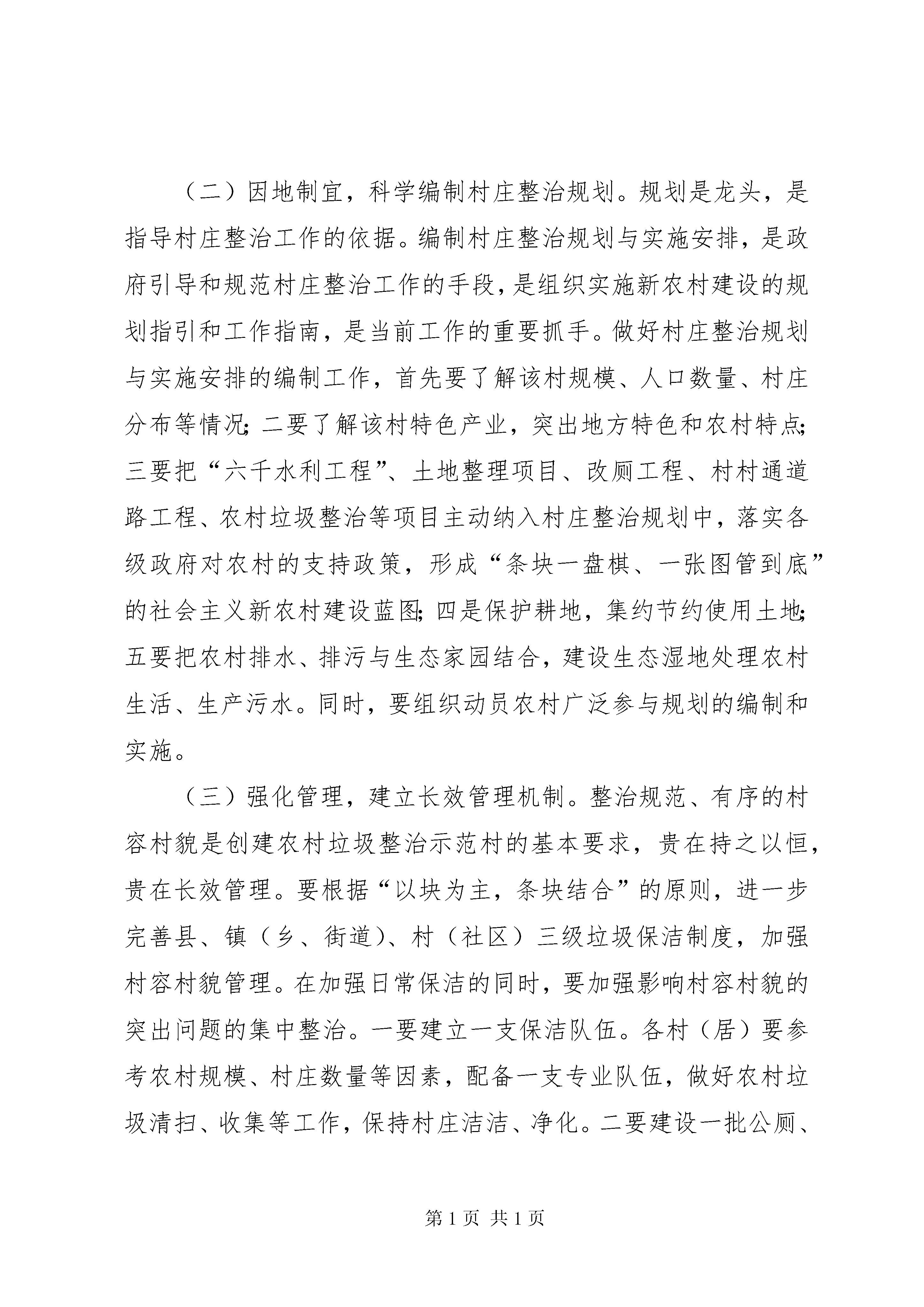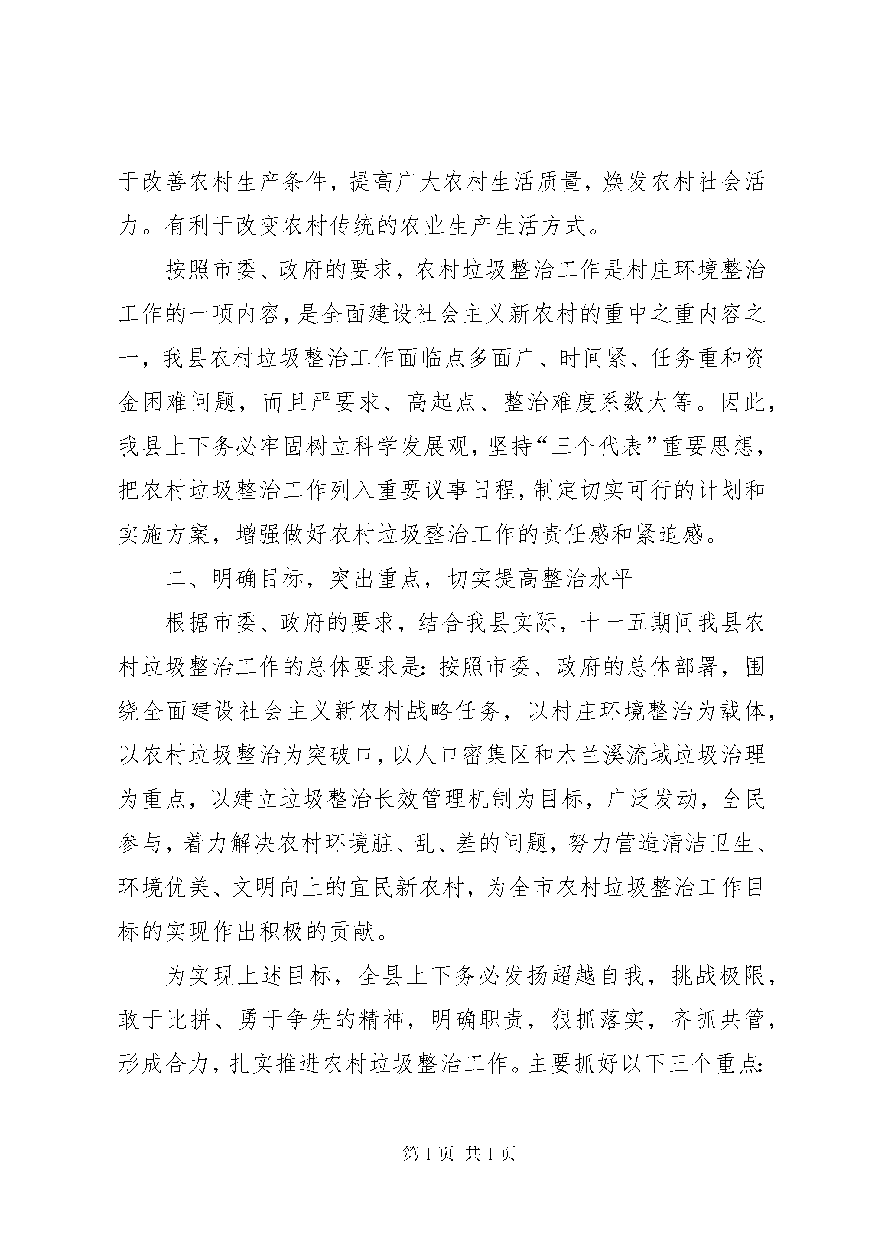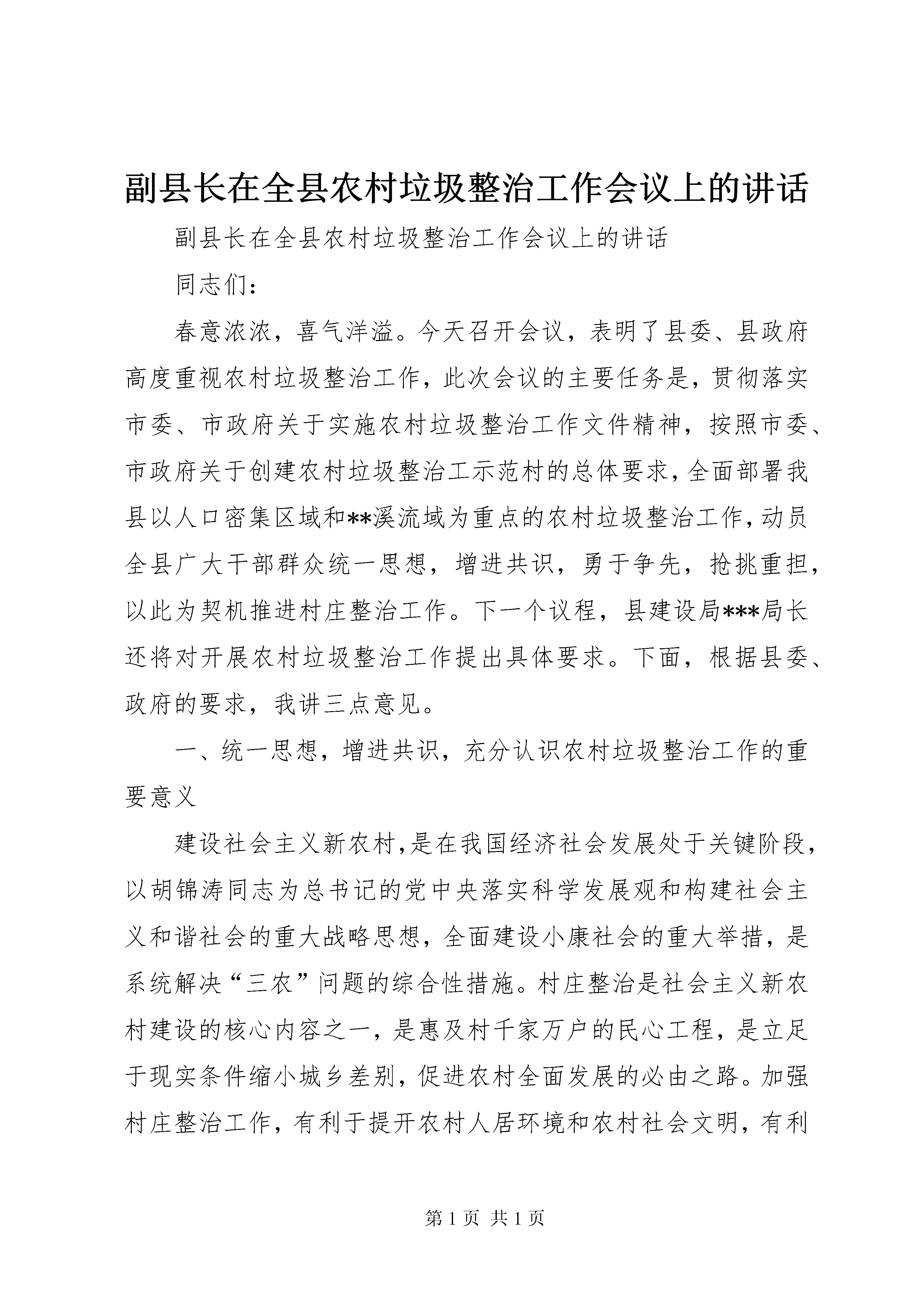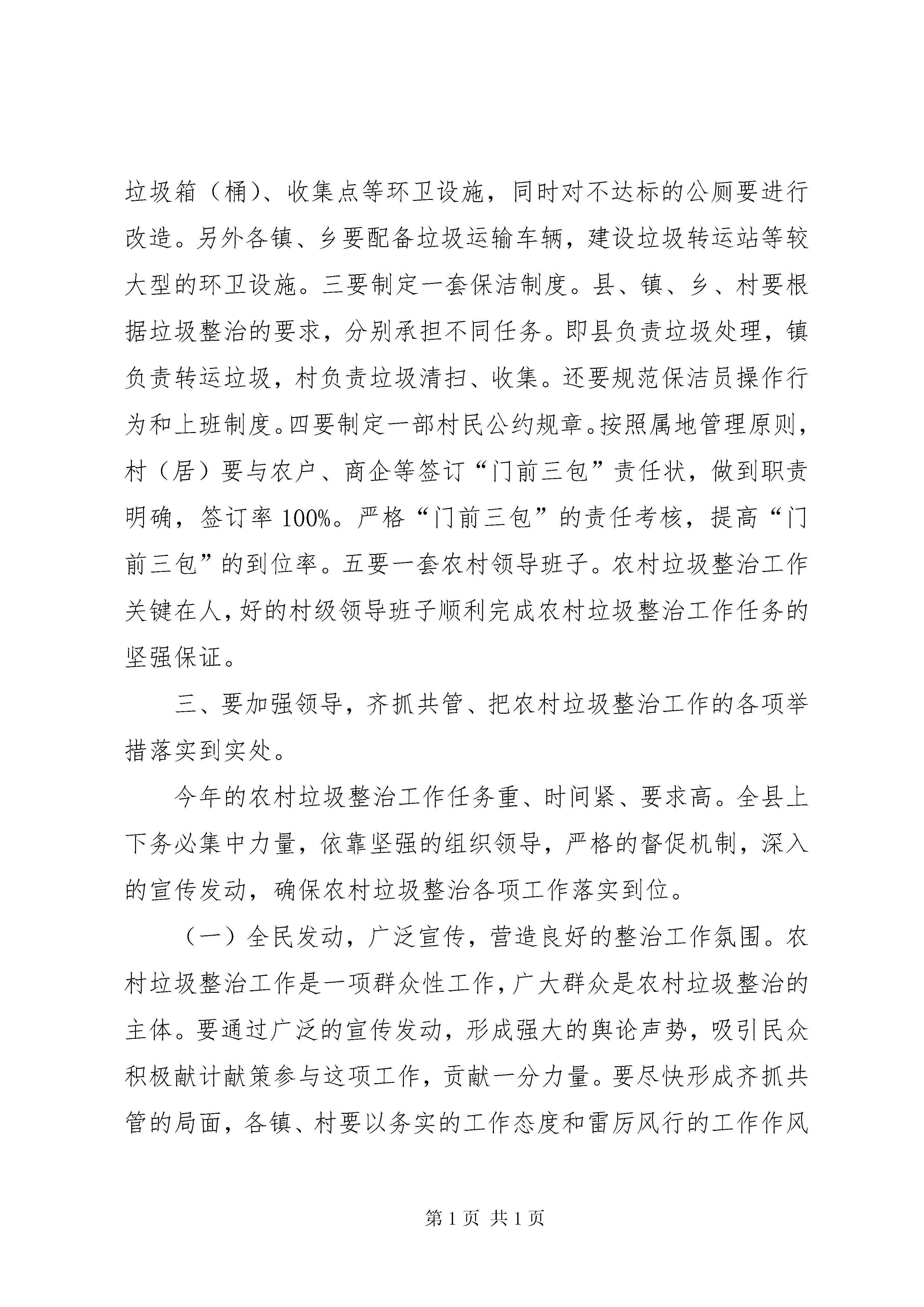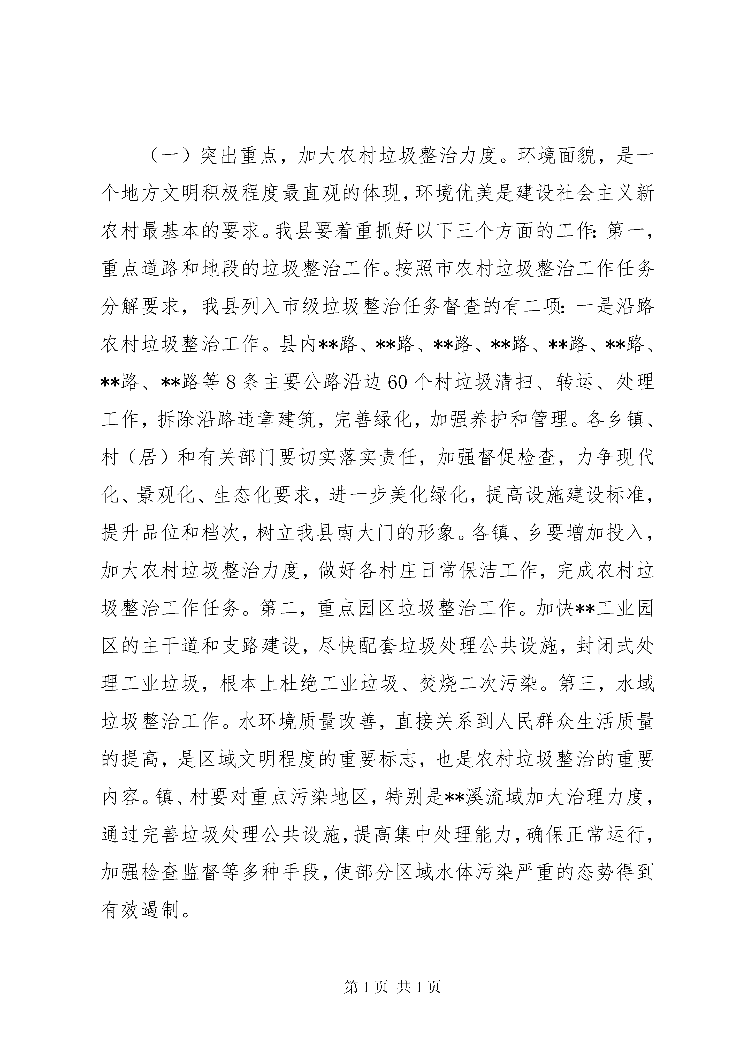副县长在全县农村垃圾整治工作会议上的讲话副县长在全县农村垃圾整治工作会议上的讲话同志们:春意浓浓,喜气洋溢。今天召开会议,表明了县委、县政府高度重视农村垃圾整治工作,此次会议的主要任务是,贯彻落实市委、市政府关于实施农村垃圾整治工作文件精神,按照市委、市政府关于创建农村垃圾整治工示范村的总体要求,全面部署我县以人口密集区域和**溪流域为重点的农村垃圾整治工作,动员全县广大干部群众统一思想,增进共识,勇于争先,抢挑重担,以此为契机推进村庄整治工作。下一个议程,县建设局***局长还将对开展农村垃圾整治工作提出具体要求。下面,根据县委、政府的要求,我讲三点意见。一、统一思想,增进共识,充分认识农村垃圾整治工作的重要意义建设社会主义新农村,是在我国经济社会发展处于关键阶段,以胡锦涛同志为总书记的党中央落实科学发展观和构建社会主义和谐社会的重大战略思想,全面建设小康社会的重大举措,是系统解决“三农”问题的综合性措施。村庄整治是社会主义新农村建设的核心内容之一,是惠及村千家万户的民心工程,是立足于现实条件缩小城乡差别,促进农村全面发展的必由之路。加强村庄整治工作,有利于提开农村人居环境和农村社会文明,有利于改善农村生产条件,提高广大农村生活质量,焕发农村社会活力。有利于改变农村传统的农业生产生活方式。按照市委、政府的要求,农村垃圾整治工作是村庄环境整治工作的一项内容,是全面建设社会主义新农村的重中之重内容之一,我县农村垃圾整治工作面临点多面广、时间紧、任务重和资金困难问题,而且严要求、高起点、整治难度系数大等。因此,我县上下务必牢固树立科学发展观,坚持“三个代表”重要思想,把农村垃圾整治工作列入重要议事日程,制定切实可行的计划和实施方案,增强做好农村垃圾整治工作的责任感和紧迫感。二、明确目标,突出重点,切实提高整治水平根据市委、政府的要求,结合我县实际,十一五期间我县农村垃圾整治工作的总体要求是:按照市委、政府的总体部署,围绕全面建设社会主义新农村战略任务,以村庄环境整治为载体,以农村垃圾整治为突破口,以人口密集区和木兰溪流域垃圾治理为重点,以建立垃圾整治长效管理机制为目标,广泛发动,全民参与,着力解决农村环境脏、乱、差的问题,努力营造清洁卫生、环境优美、文明向上的宜民新农村,为全市农村垃圾整治工作目标的实现作出积极的贡献。为实现上述目标,全县上下务必发扬超越自我,挑战极限,敢于比拼、勇于争先的精神,明确职责,狠抓落实,齐抓共管,形成合力,扎实推进农村垃圾整治工作。主要抓好以下三个重点:(一)突出重点,加大农村垃圾整治力度。环境面貌,是一个地方文明积极程度最直观的体现,环境优美是建设社会主义新农村最基本的要求。我县要着重抓好以下三个方面的工作:第一,重点道路和地段的垃圾整治工作。按照市农村垃圾整治工作任务分解要求,我县列入市级垃圾整治任务督查的有二项:一是沿路农村垃圾整治工作。县内**路、**路、**路、**路、**路、**路、**路、**路等8条主要公路沿边60个村垃圾清扫、转运、处理工作,拆除沿路违章建筑,完善绿化,加强养护和管理。各乡镇、村(居)和有关部门要切实落实责任,加强督促检查,力争现代化、景观化、生态化要求,进一步美化绿化,提高设施建设标准,提升品位和档次,树立我县南大门的形象。各镇、乡要增加投入,加大农村垃圾整治力度,做好各村庄日常保洁工作,完成农村垃圾整治工作任务。第二,重点园区垃圾整治工作。加快**工业园区的主干道和支路建设,尽快配套垃圾处理公共设施,封闭式处理工业垃圾,根本上杜绝工业垃圾、焚烧二次污染。第三,水域垃圾整治工作。水环境质量改善,直接关系到人民群众生活质量的提高,是区域文明程度的重要标志,也是农村垃圾整治的重要内容。镇、村要对重点污染地区,特别是**溪流域加大治理力度,通过完善垃圾处理公共设施,提高集中处理能力,确保正常运行,加强检查监督等多种手段,使部分区域水体污染严重的态势得到有效遏制。(二)因地制宜,科学编制村庄整治规划。规划是龙头,是指导村庄整治工作的依据。编制村庄整治规划与实施安排,是政府引导和规范村庄整治工作的手段,是组织实施新农村建设的规划指引和工作指南,是当前工作的重要抓手。做好村庄整治规划与实施安排的编制工作,首先要了解该村规模、人口数量、村庄分布等情况;二要了解该村特色产业,突出地方特色和农村特点;三要把“六千水利工程”、土地整理项目、改厕工程、村村通道路工程、农村垃圾整治等项目主动纳入村庄整治规划中,落实各级政府对农村的支持政策,形成“条块一盘棋、一张图管到底”的社会主义新农村建设蓝图;四是保护耕地,集约节约使用土地;五要把农村排水、排污与生态家园结合,建设生态湿地处理农村生活、生产污水。同时,要组织动员农村广泛参与规划的编制和实施。(三)强化管理,建立长效