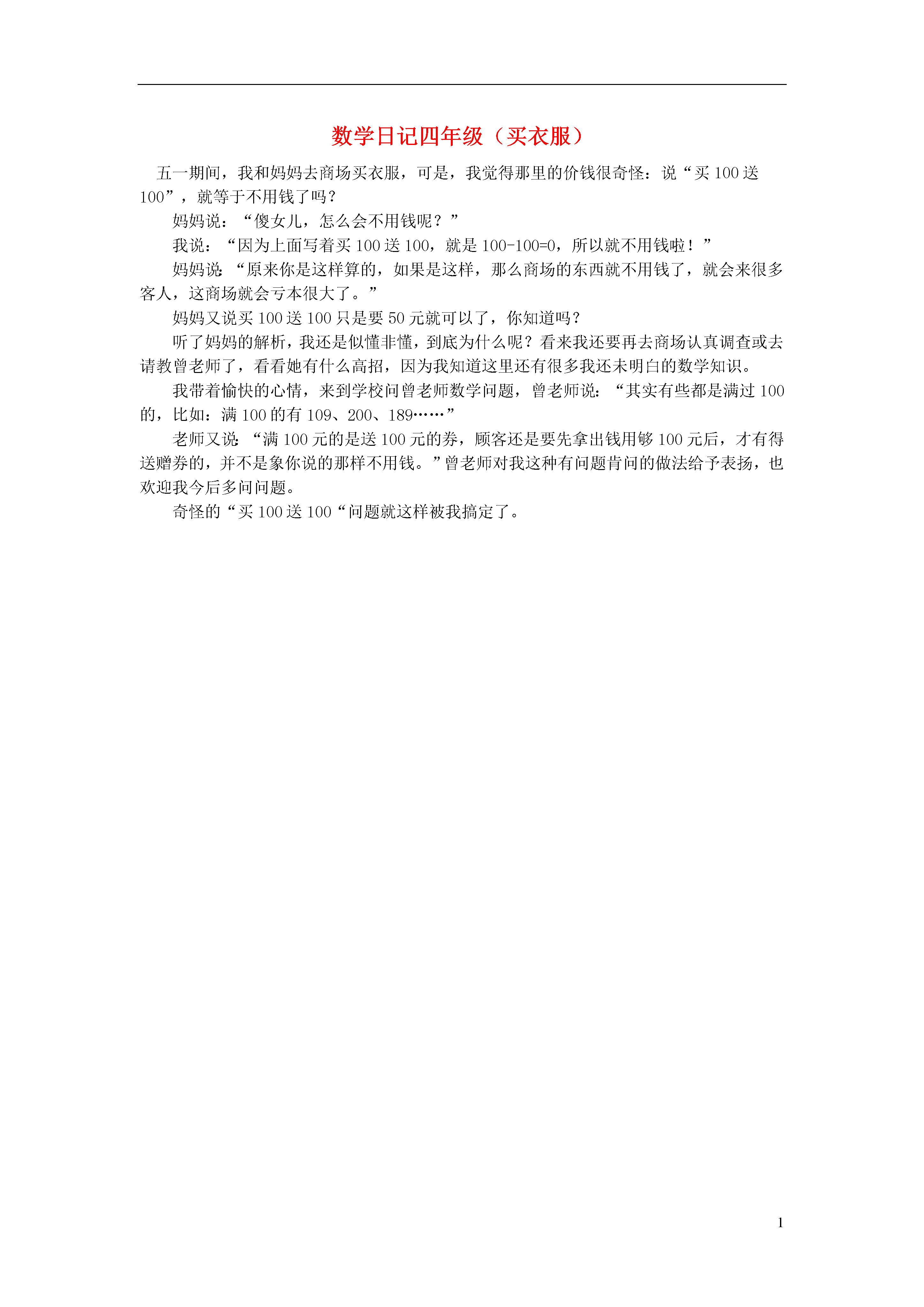 1数学日记四年级(买衣服)五一期间,我和妈妈去商场买衣服,可是,我觉得那里的价钱很奇怪:说“买100送100”,就等于不用钱了吗?妈妈说:“傻女儿,怎么会不用钱呢?”我说:“因为上面写着买100送100,就是100-100=0,所以就不用钱啦!”妈妈说:“原来你是这样算的,如果是这样,那么商场的东西就不用钱了,就会来很多客人,这商场就会亏本很大了。”妈妈又说买100送100只是要50元就可以了,你知道吗?听了妈妈的解析,我还是似懂非懂,到底为什么呢?看来我还要再去商场认真调查或去请教曾老师了,看看她有什么高招,因为我知道这里还有很多我还未明白的数学知识。我带着愉快的心情,来到学校问曾老师数学问题,曾老师说:“其实有些都是满过100的,比如:满100的有109、200、189……”老师又说:“满100元的是送100元的券,顾客还是要先拿出钱用够100元后,才有得送赠券的,并不是象你说的那样不用钱。”曾老师对我这种有问题肯问的做法给予表扬,也欢迎我今后多问问题。奇怪的“买100送100“问题就这样被我搞定了。