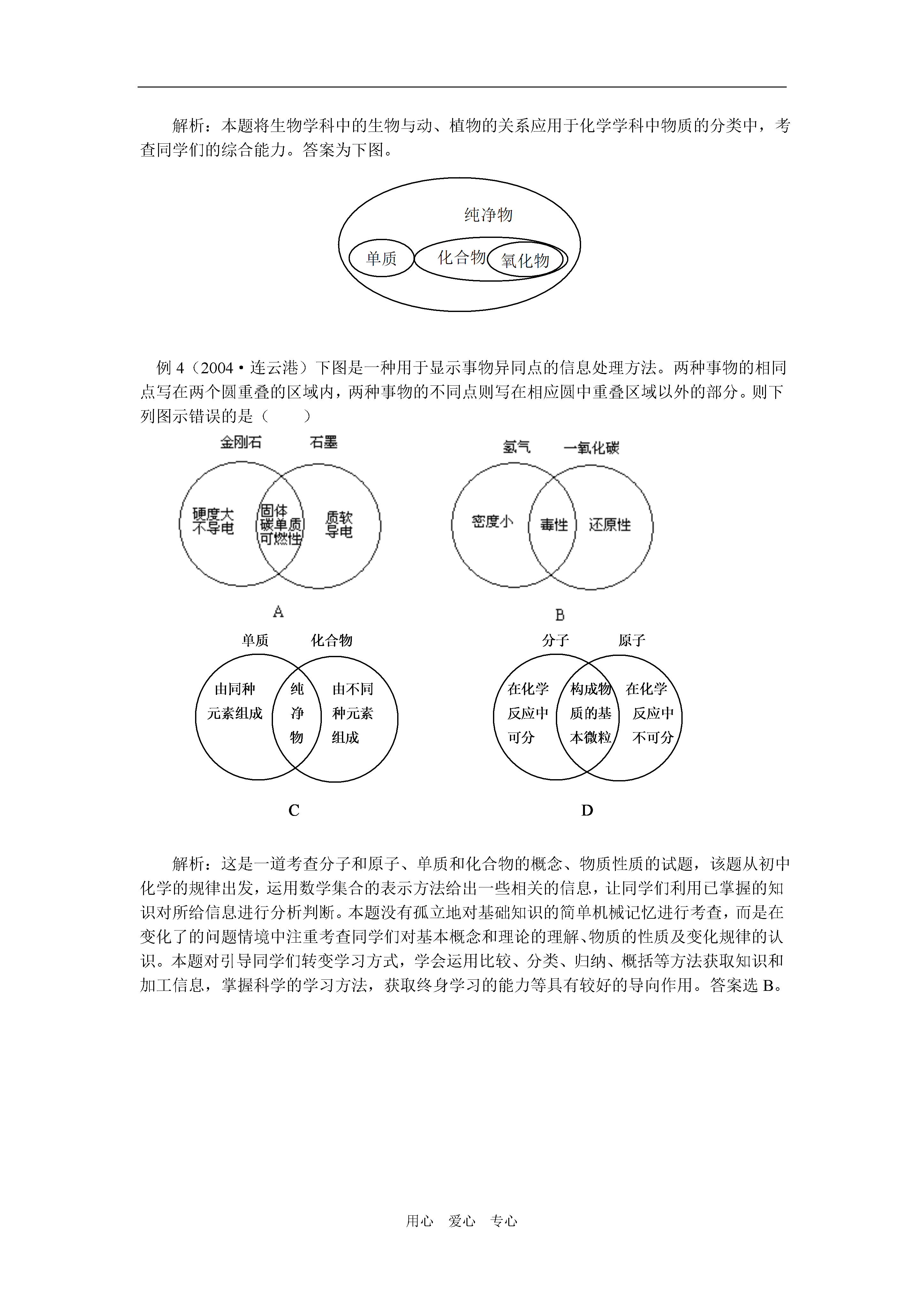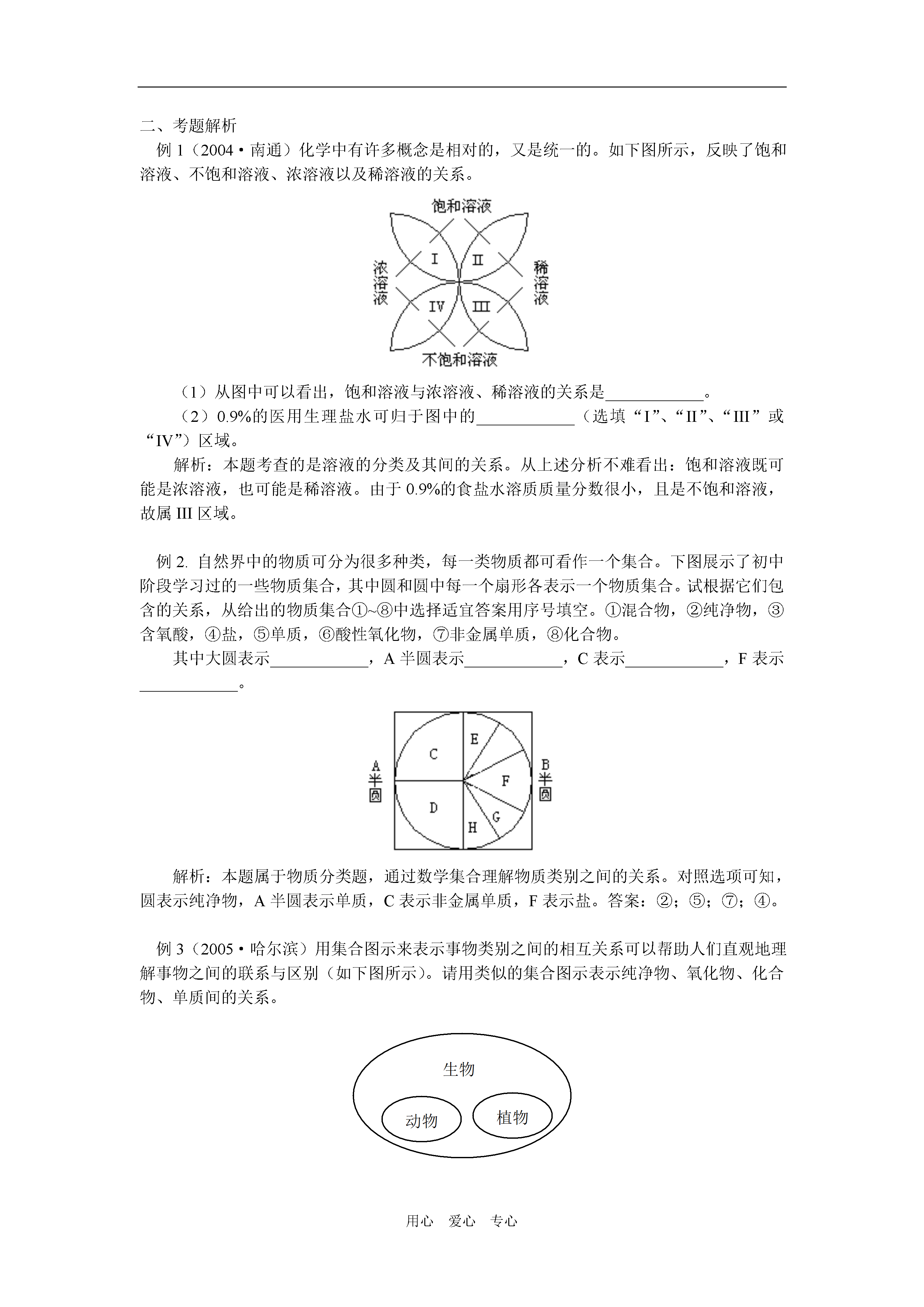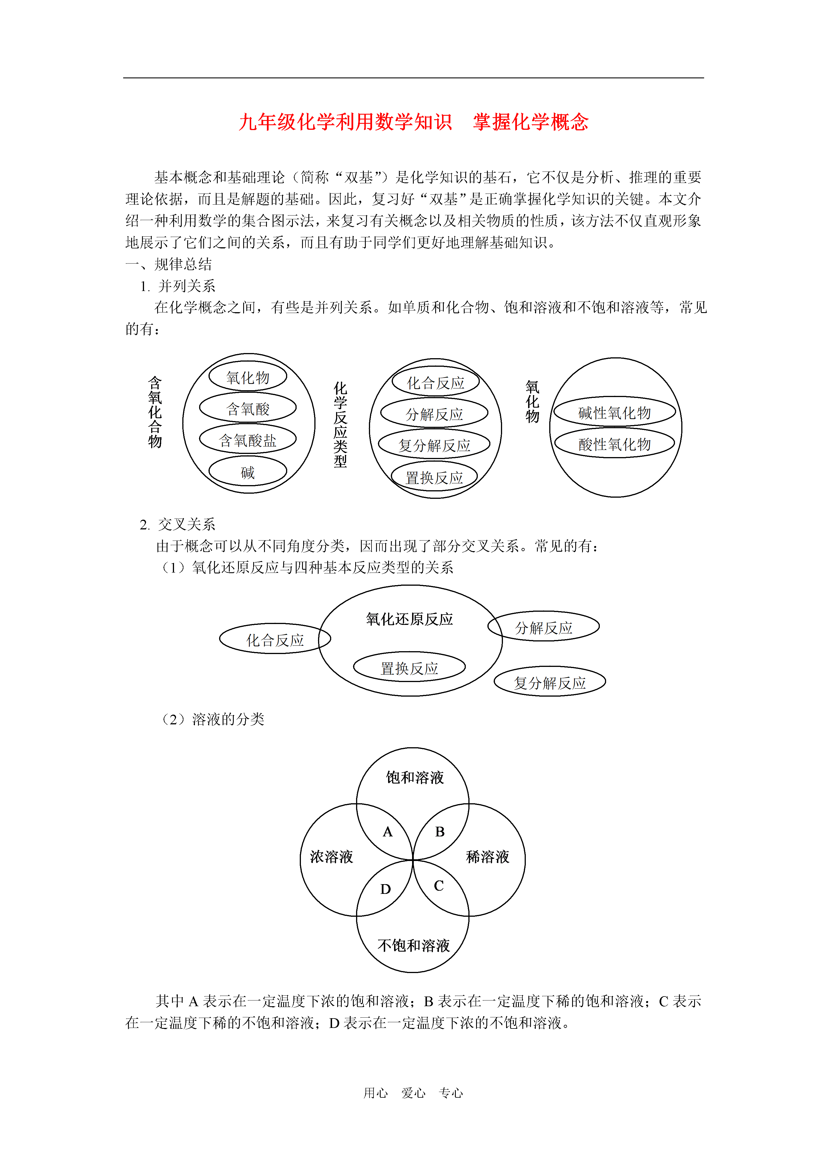 用心爱心专心九年级化学利用数学知识掌握化学概念基本概念和基础理论(简称“双基”)是化学知识的基石,它不仅是分析、推理的重要理论依据,而且是解题的基础。因此,复习好“双基”是正确掌握化学知识的关键。本文介绍一种利用数学的集合图示法,来复习有关概念以及相关物质的性质,该方法不仅直观形象地展示了它们之间的关系,而且有助于同学们更好地理解基础知识。一、规律总结1.并列关系在化学概念之间,有些是并列关系。如单质和化合物、饱和溶液和不饱和溶液等,常见的有:2.交叉关系由于概念可以从不同角度分类,因而出现了部分交叉关系。常见的有:(1)氧化还原反应与四种基本反应类型的关系(2)溶液的分类其中A表示在一定温度下浓的饱和溶液;B表示在一定温度下稀的饱和溶液;C表示在一定温度下稀的不饱和溶液;D表示在一定温度下浓的不饱和溶液。二、考题解析例1(2004·南通)化学中有许多概念是相对的,又是统一的。如下图所示,反映了饱和溶液、不饱和溶液、浓溶液以及稀溶液的关系。(1)从图中可以看出,饱和溶液与浓溶液、稀溶液的关系是____________。(2)0.9%的医用生理盐水可归于图中的____________(选填“I”、“II”、“III”或“IV”)区域。解析:本题考查的是溶液的分类及其间的关系。从上述分析不难看出:饱和溶液既可能是浓溶液,也可能是稀溶液。由于0.9%的食盐水溶质质量分数很小,且是不饱和溶液,故属III区域。例2.自然界中的物质可分为很多种类,每一类物质都可看作一个集合。下图展示了初中阶段学习过的一些物质集合,其中圆和圆中每一个扇形各表示一个物质集合。试根据它们包含的关系,从给出的物质集合①~⑧中选择适宜答案用序号填空。①混合物,②纯净物,③含氧酸,④盐,⑤单质,⑥酸性氧化物,⑦非金属单质,⑧化合物。其中大圆表示____________,A半圆表示____________,C表示____________,F表示____________。解析:本题属于物质分类题,通过数学集合理解物质类别之间的关系。对照选项可知,圆表示纯净物,A半圆表示单质,C表示非金属单质,F表示盐。答案:②;⑤;⑦;④。例3(2005·哈尔滨)用集合图示来表示事物类别之间的相互关系可以帮助人们直观地理解事物之间的联系与区别(如下图所示)。请用类似的集合图示表示纯净物、氧化物、化合物、单质间的关系。解析:本题将生物学科中的生物与动、植物的关系应用于化学学科中物质的分类中,考查同学们的综合能力。答案为下图。例4(2004·连云港)下图是一种用于显示事物异同点的信息处理方法。两种事物的相同点写在两个圆重叠的区域内,两种事物的不同点则写在相应圆中重叠区域以外的部分。则下列图示错误的是()解析:这是一道考查分子和原子、单质和化合物的概念、物质性质的试题,该题从初中化学的规律出发,运用数学集合的表示方法给出一些相关的信息,让同学们利用已掌握的知识对所给信息进行分析判断。本题没有孤立地对基础知识的简单机械记忆进行考查,而是在变化了的问题情境中注重考查同学们对基本概念和理论的理解、物质的性质及变化规律的认识。本题对引导同学们转变学习方式,学会运用比较、分类、归纳、概括等方法获取知识和加工信息,掌握科学的学习方法,获取终身学习的能力等具有较好的导向作用。答案选B。