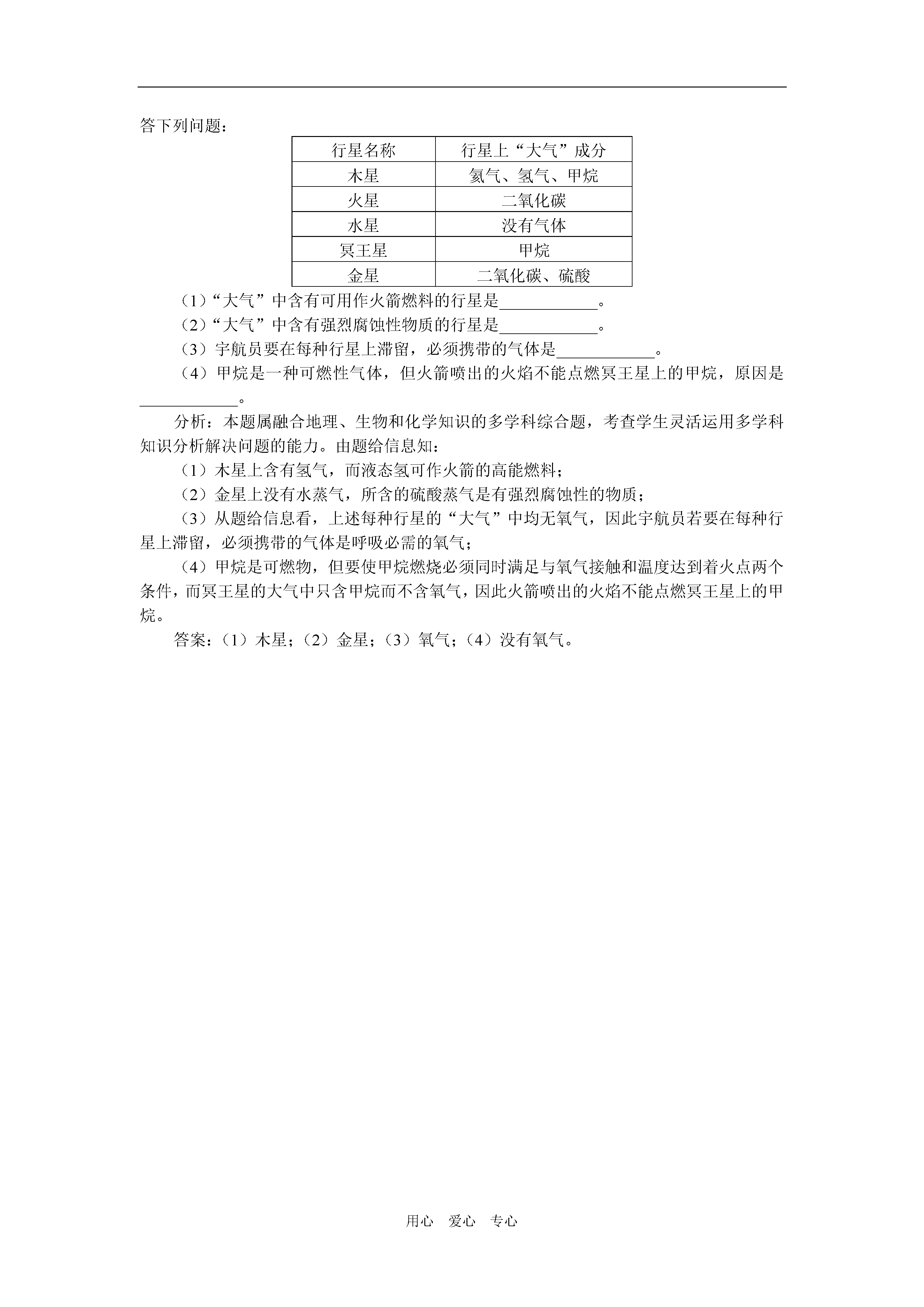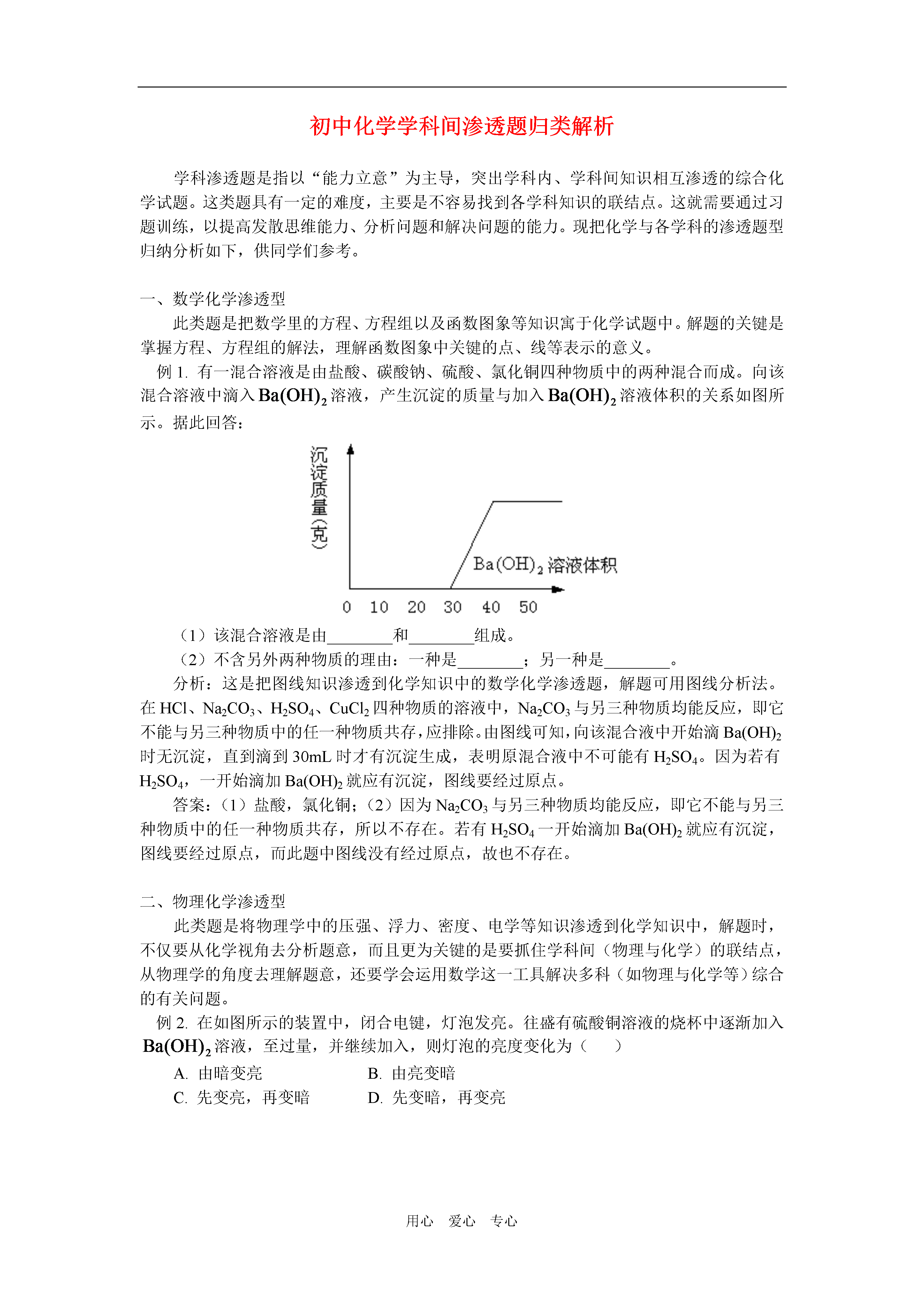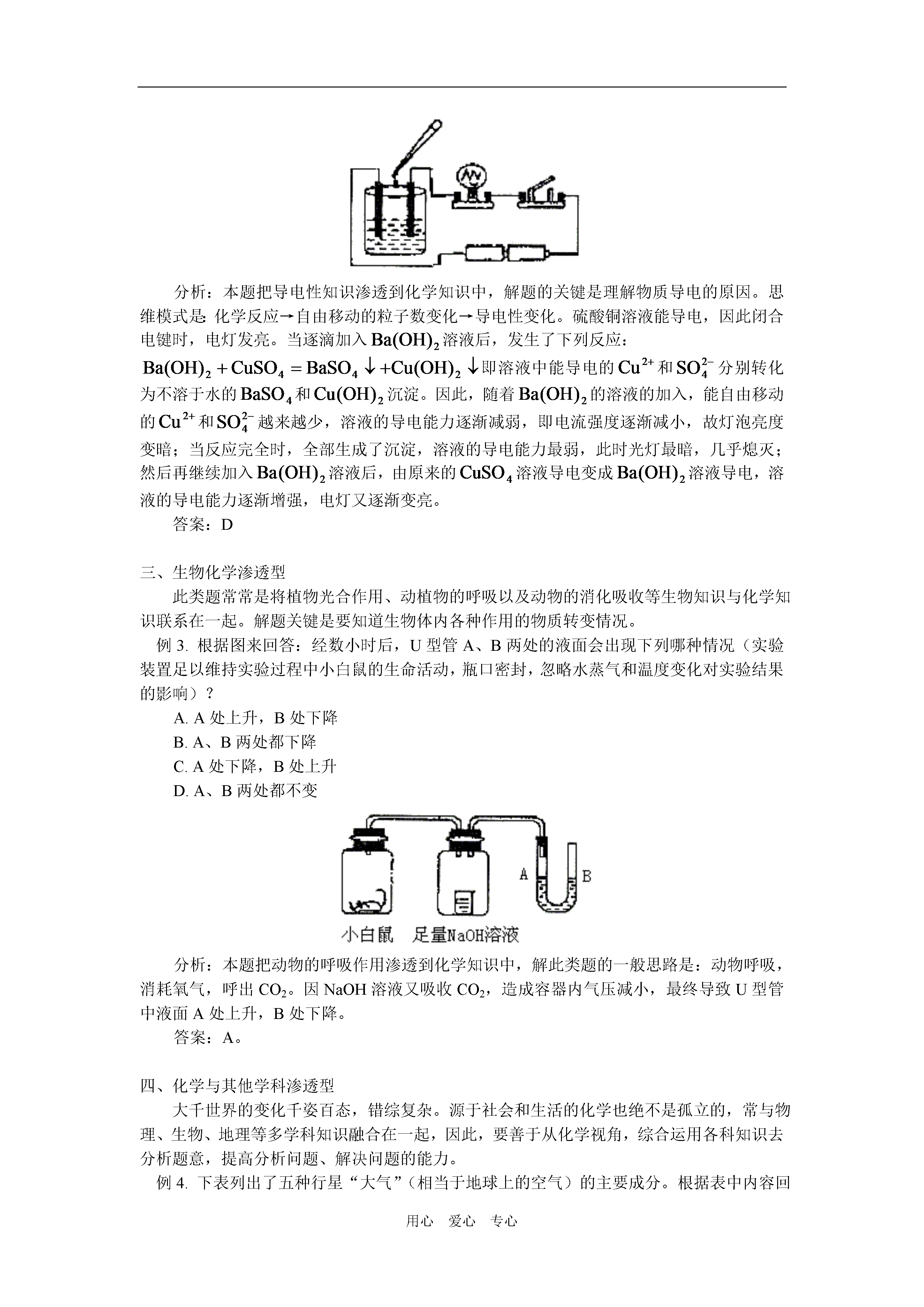 用心爱心专心初中化学学科间渗透题归类解析学科渗透题是指以“能力立意”为主导,突出学科内、学科间知识相互渗透的综合化学试题。这类题具有一定的难度,主要是不容易找到各学科知识的联结点。这就需要通过习题训练,以提高发散思维能力、分析问题和解决问题的能力。现把化学与各学科的渗透题型归纳分析如下,供同学们参考。一、数学化学渗透型此类题是把数学里的方程、方程组以及函数图象等知识寓于化学试题中。解题的关键是掌握方程、方程组的解法,理解函数图象中关键的点、线等表示的意义。例1.有一混合溶液是由盐酸、碳酸钠、硫酸、氯化铜四种物质中的两种混合而成。向该混合溶液中滴入溶液,产生沉淀的质量与加入溶液体积的关系如图所示。据此回答:(1)该混合溶液是由________和________组成。(2)不含另外两种物质的理由:一种是________;另一种是________。分析:这是把图线知识渗透到化学知识中的数学化学渗透题,解题可用图线分析法。在HCl、Na2CO3、H2SO4、CuCl2四种物质的溶液中,Na2CO3与另三种物质均能反应,即它不能与另三种物质中的任一种物质共存,应排除。由图线可知,向该混合液中开始滴Ba(OH)2时无沉淀,直到滴到30mL时才有沉淀生成,表明原混合液中不可能有H2SO4。因为若有H2SO4,一开始滴加Ba(OH)2就应有沉淀,图线要经过原点。答案:(1)盐酸,氯化铜;(2)因为Na2CO3与另三种物质均能反应,即它不能与另三种物质中的任一种物质共存,所以不存在。若有H2SO4一开始滴加Ba(OH)2就应有沉淀,图线要经过原点,而此题中图线没有经过原点,故也不存在。二、物理化学渗透型此类题是将物理学中的压强、浮力、密度、电学等知识渗透到化学知识中,解题时,不仅要从化学视角去分析题意,而且更为关键的是要抓住学科间(物理与化学)的联结点,从物理学的角度去理解题意,还要学会运用数学这一工具解决多科(如物理与化学等)综合的有关问题。例2.在如图所示的装置中,闭合电键,灯泡发亮。往盛有硫酸铜溶液的烧杯中逐渐加入溶液,至过量,并继续加入,则灯泡的亮度变化为()A.由暗变亮B.由亮变暗C.先变亮,再变暗D.先变暗,再变亮分析:本题把导电性知识渗透到化学知识中,解题的关键是理解物质导电的原因。思维模式是:化学反应→自由移动的粒子数变化→导电性变化。硫酸铜溶液能导电,因此闭合电键时,电灯发亮。当逐滴加入溶液后,发生了下列反应:即溶液中能导电的和分别转化为不溶于水的和沉淀。因此,随着的溶液的加入,能自由移动的和越来越少,溶液的导电能力逐渐减弱,即电流强度逐渐减小,故灯泡亮度变暗;当反应完全时,全部生成了沉淀,溶液的导电能力最弱,此时光灯最暗,几乎熄灭;然后再继续加入溶液后,由原来的溶液导电变成溶液导电,溶液的导电能力逐渐增强,电灯又逐渐变亮。答案:D三、生物化学渗透型此类题常常是将植物光合作用、动植物的呼吸以及动物的消化吸收等生物知识与化学知识联系在一起。解题关键是要知道生物体内各种作用的物质转变情况。例3.根据图来回答:经数小时后,U型管A、B两处的液面会出现下列哪种情况(实验装置足以维持实验过程中小白鼠的生命活动,瓶口密封,忽略水蒸气和温度变化对实验结果的影响)?A.A处上升,B处下降B.A、B两处都下降C.A处下降,B处上升D.A、B两处都不变分析:本题把动物的呼吸作用渗透到化学知识中,解此类题的一般思路是:动物呼吸,消耗氧气,呼出CO2。因NaOH溶液又吸收CO2,造成容器内气压减小,最终导致U型管中液面A处上升,B处下降。答案:A。四、化学与其他学科渗透型大千世界的变化千姿百态,错综复杂。源于社会和生活的化学也绝不是孤立的,常与物理、生物、地理等多学科知识融合在一起,因此,要善于从化学视角,综合运用各科知识去分析题意,提高分析问题、解决问题的能力。例4.下表列出了五种行星“大气”(相当于地球上的空气)的主要成分。根据表中内容回答下列问题:行星名称行星上“大气”成分木星氦气、氢气、甲烷火星二氧化碳水星没有气体冥王星甲烷金星二氧化碳、硫酸(1)“大气”中含有可用作火箭燃料的行星是____________。(2)“大气”中含有强烈腐蚀性物质的行星是____________。(3)宇航员要在每种行星上滞留,必须携带的气体是____________。(4)甲烷是一种可燃性气体,但火箭喷出的火焰不能点燃冥王星上的甲烷,原因是____________。分析:本题属融合地理、生物和化学知识的多学科综合题,考查学生灵活运用多学科知识分析解决问题的能力。由题给信息知:(1)木星上含有氢气,而液态氢可作火箭的高能燃料;(2)金星上没有水蒸气,所含的硫酸蒸气是