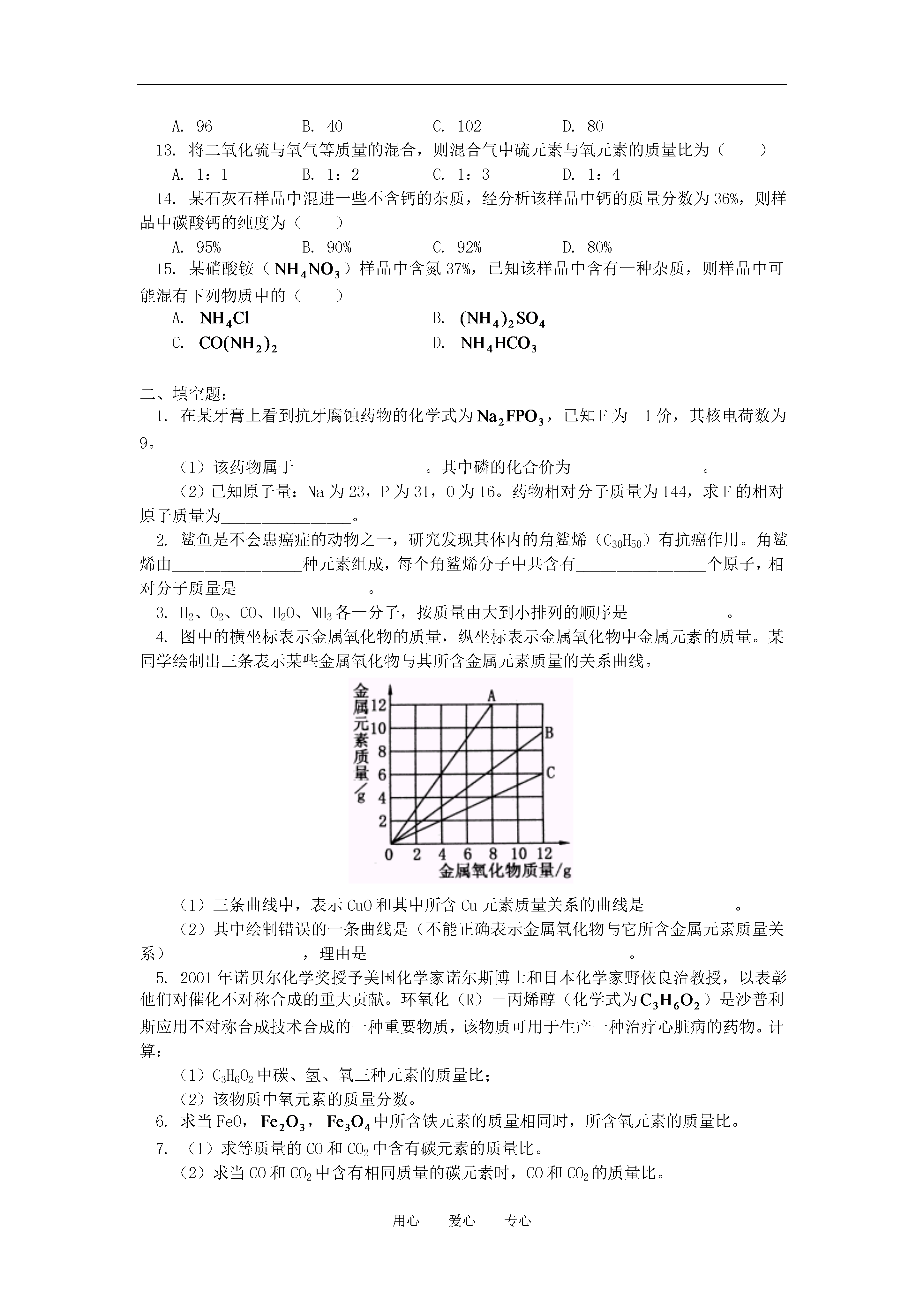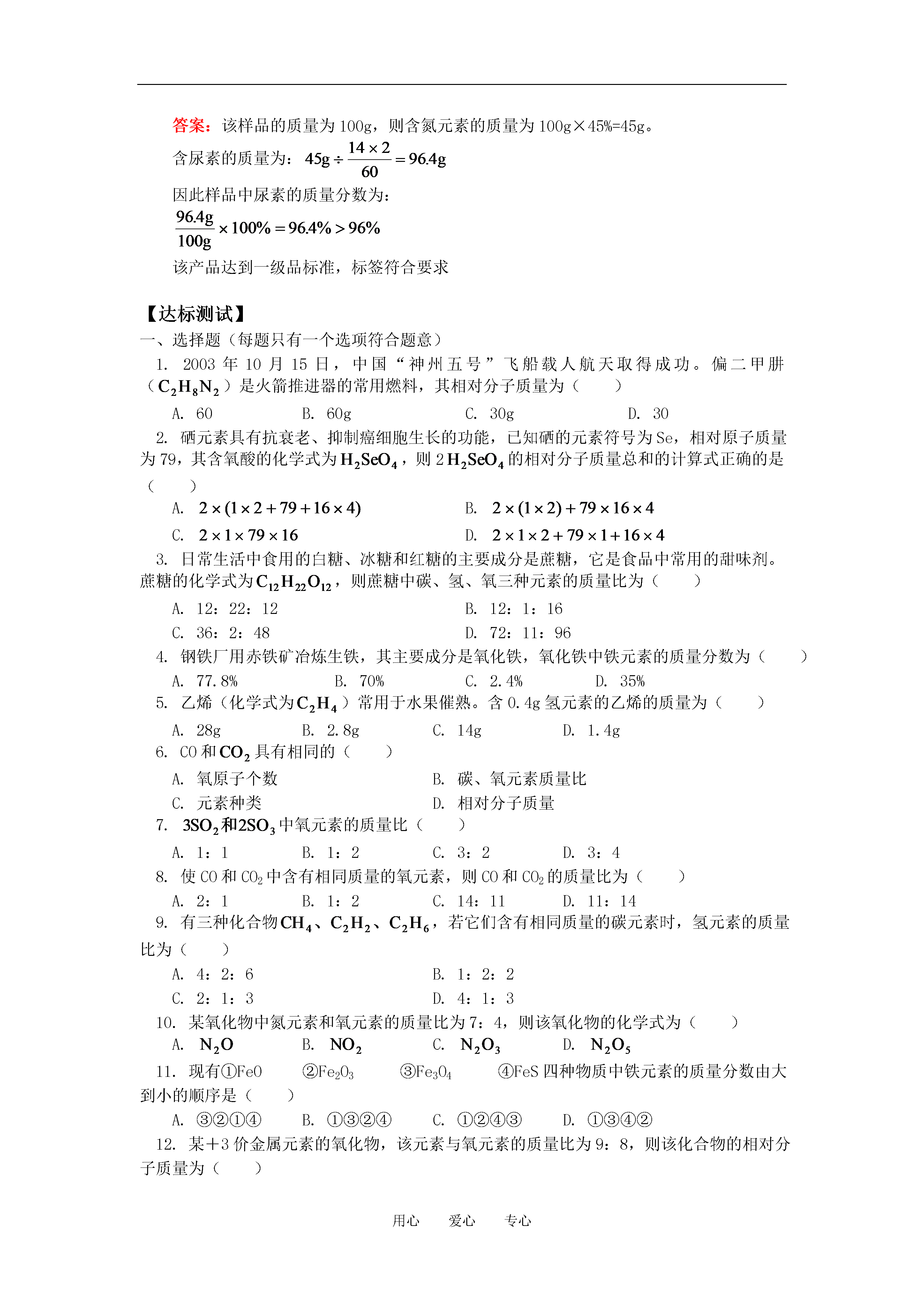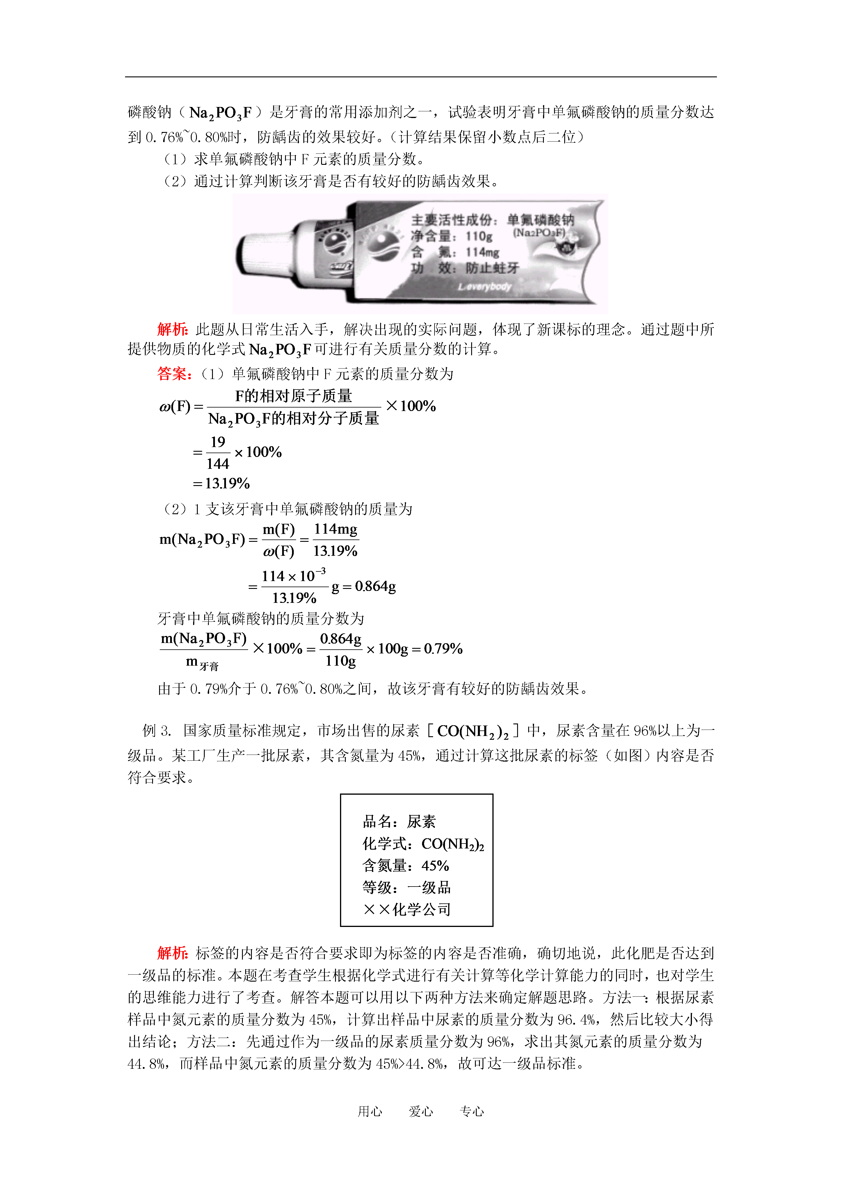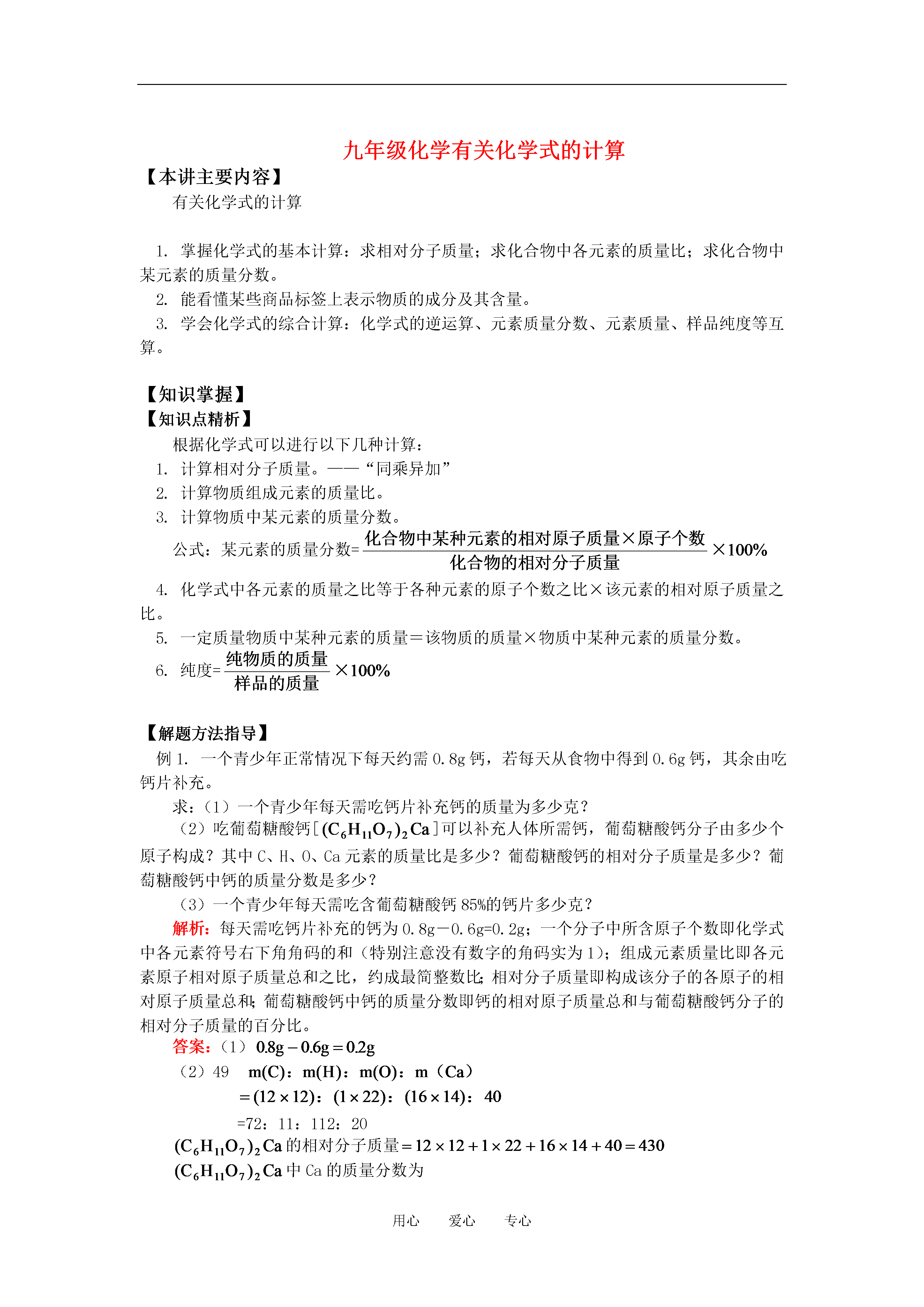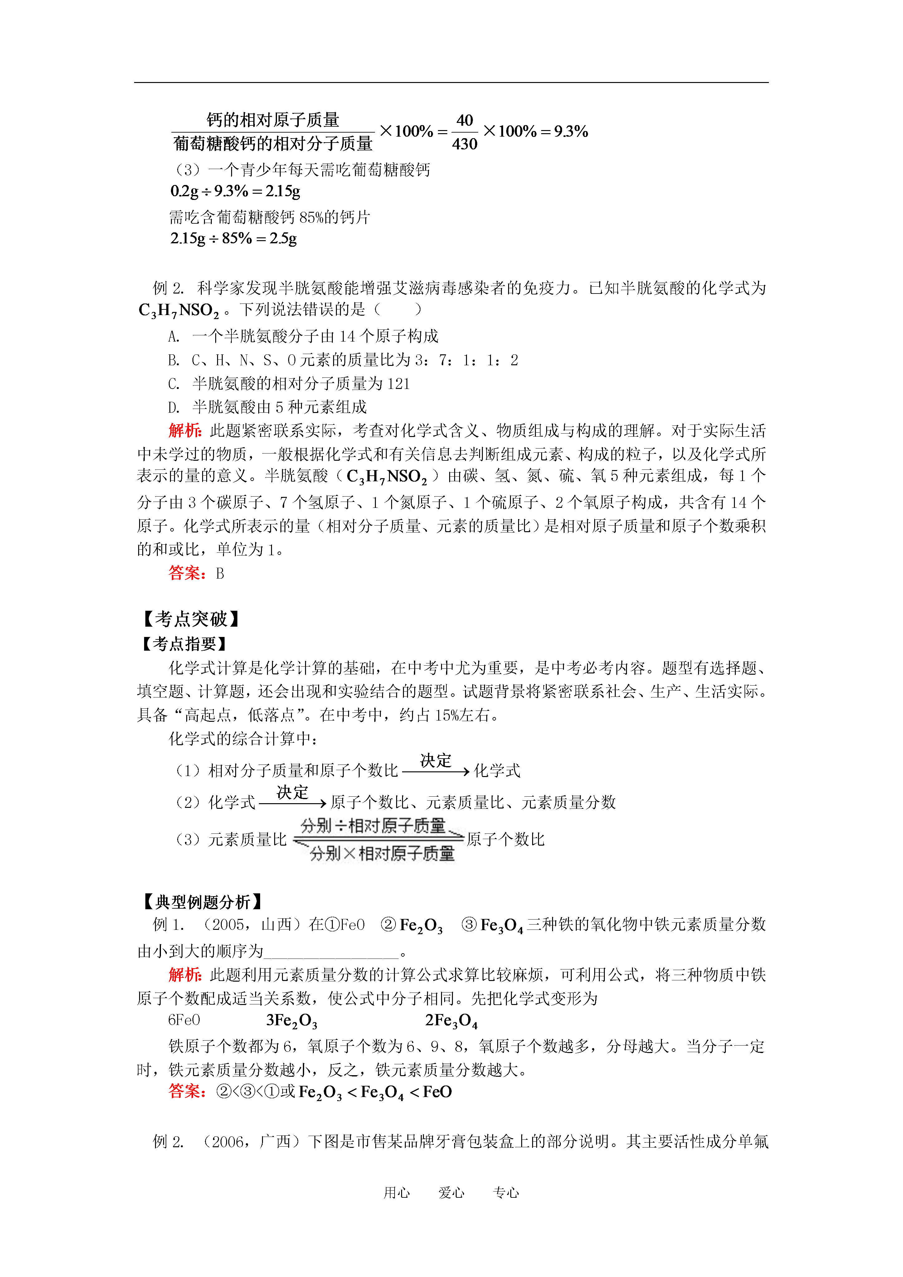 用心爱心专心九年级化学有关化学式的计算【本讲主要内容】有关化学式的计算1.掌握化学式的基本计算:求相对分子质量;求化合物中各元素的质量比;求化合物中某元素的质量分数。2.能看懂某些商品标签上表示物质的成分及其含量。3.学会化学式的综合计算:化学式的逆运算、元素质量分数、元素质量、样品纯度等互算。【知识掌握】【知识点精析】根据化学式可以进行以下几种计算:1.计算相对分子质量。——“同乘异加”2.计算物质组成元素的质量比。3.计算物质中某元素的质量分数。公式:某元素的质量分数=4.化学式中各元素的质量之比等于各种元素的原子个数之比×该元素的相对原子质量之比。5.一定质量物质中某种元素的质量=该物质的质量×物质中某种元素的质量分数。6.纯度=【解题方法指导】例1.一个青少年正常情况下每天约需0.8g钙,若每天从食物中得到0.6g钙,其余由吃钙片补充。求:(1)一个青少年每天需吃钙片补充钙的质量为多少克?(2)吃葡萄糖酸钙[]可以补充人体所需钙,葡萄糖酸钙分子由多少个原子构成?其中C、H、O、Ca元素的质量比是多少?葡萄糖酸钙的相对分子质量是多少?葡萄糖酸钙中钙的质量分数是多少?(3)一个青少年每天需吃含葡萄糖酸钙85%的钙片多少克?解析:每天需吃钙片补充的钙为0.8g-0.6g=0.2g;一个分子中所含原子个数即化学式中各元素符号右下角角码的和(特别注意没有数字的角码实为1);组成元素质量比即各元素原子相对原子质量总和之比,约成最简整数比;相对分子质量即构成该分子的各原子的相对原子质量总和;葡萄糖酸钙中钙的质量分数即钙的相对原子质量总和与葡萄糖酸钙分子的相对分子质量的百分比。答案:(1)(2)49=72:11:112:20的相对分子质量中Ca的质量分数为(3)一个青少年每天需吃葡萄糖酸钙需吃含葡萄糖酸钙85%的钙片例2.科学家发现半胱氨酸能增强艾滋病毒感染者的免疫力。已知半胱氨酸的化学式为。下列说法错误的是()A.一个半胱氨酸分子由14个原子构成B.C、H、N、S、O元素的质量比为3:7:1:1:2C.半胱氨酸的相对分子质量为121D.半胱氨酸由5种元素组成解析:此题紧密联系实际,考查对化学式含义、物质组成与构成的理解。对于实际生活中未学过的物质,一般根据化学式和有关信息去判断组成元素、构成的粒子,以及化学式所表示的量的意义。半胱氨酸()由碳、氢、氮、硫、氧5种元素组成,每1个分子由3个碳原子、7个氢原子、1个氮原子、1个硫原子、2个氧原子构成,共含有14个原子。化学式所表示的量(相对分子质量、元素的质量比)是相对原子质量和原子个数乘积的和或比,单位为1。答案:B【考点突破】【考点指要】化学式计算是化学计算的基础,在中考中尤为重要,是中考必考内容。题型有选择题、填空题、计算题,还会出现和实验结合的题型。试题背景将紧密联系社会、生产、生活实际。具备“高起点,低落点”。在中考中,约占15%左右。化学式的综合计算中:(1)相对分子质量和原子个数比化学式(2)化学式原子个数比、元素质量比、元素质量分数(3)元素质量比原子个数比【典型例题分析】例1.(2005,山西)在①FeO②③三种铁的氧化物中铁元素质量分数由小到大的顺序为_________________。解析:此题利用元素质量分数的计算公式求算比较麻烦,可利用公式,将三种物质中铁原子个数配成适当关系数,使公式中分子相同。先把化学式变形为6FeO铁原子个数都为6,氧原子个数为6、9、8,氧原子个数越多,分母越大。当分子一定时,铁元素质量分数越小,反之,铁元素质量分数越大。答案:②<③<①或例2.(2006,广西)下图是市售某品牌牙膏包装盒上的部分说明。其主要活性成分单氟磷酸钠()是牙膏的常用添加剂之一,试验表明牙膏中单氟磷酸钠的质量分数达到0.76%~0.80%时,防龋齿的效果较好。(计算结果保留小数点后二位)(1)求单氟磷酸钠中F元素的质量分数。(2)通过计算判断该牙膏是否有较好的防龋齿效果。解析:此题从日常生活入手,解决出现的实际问题,体现了新课标的理念。通过题中所提供物质的化学式可进行有关质量分数的计算。答案:(1)单氟磷酸钠中F元素的质量分数为(2)1支该牙膏中单氟磷酸钠的质量为牙膏中单氟磷酸钠的质量分数为由于0.79%介于0.76%~0.80%之间,故该牙膏有较好的防龋齿效果。例3.国家质量标准规定,市场出售的尿素[]中,尿素含量在96%以上为一级品。某工厂生产一批尿素,其含氮量为45%,通过计算这批尿素的标签(如图)内容是否符合要求。解析:标签的内容是否符合要求即为标签的内容是否准确,确切地说,此化肥是否达到一级品