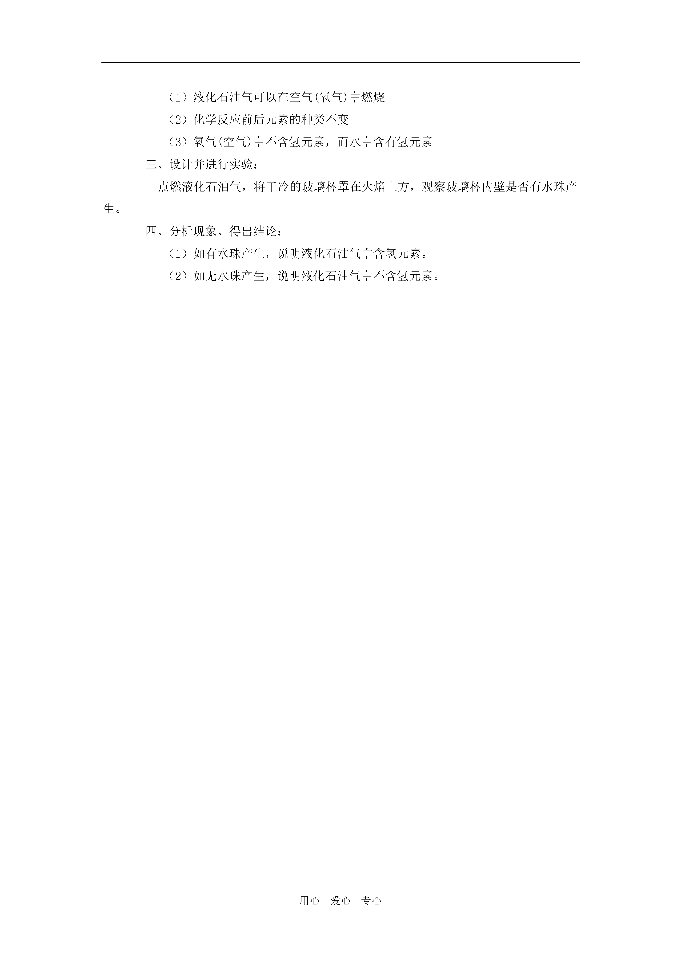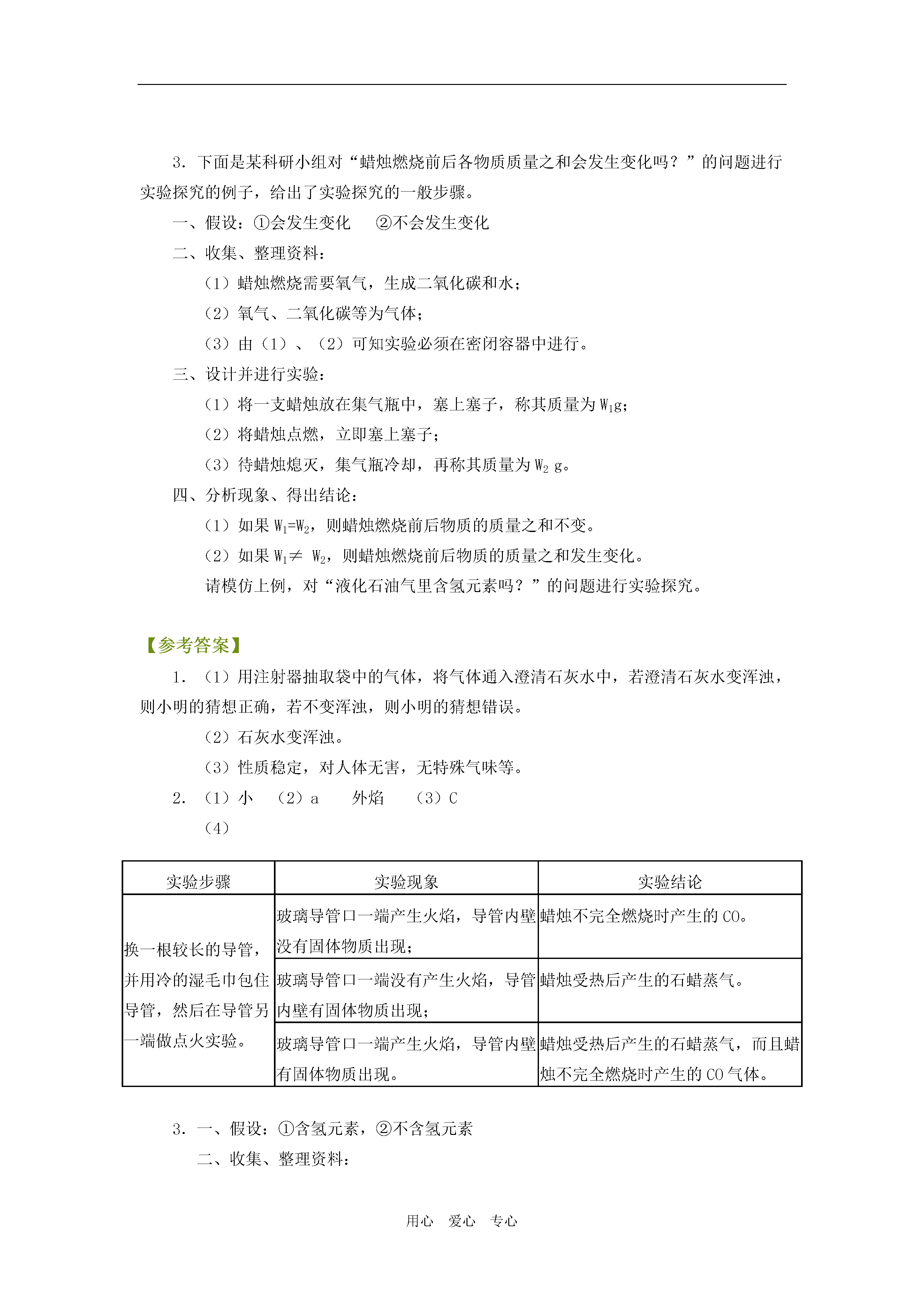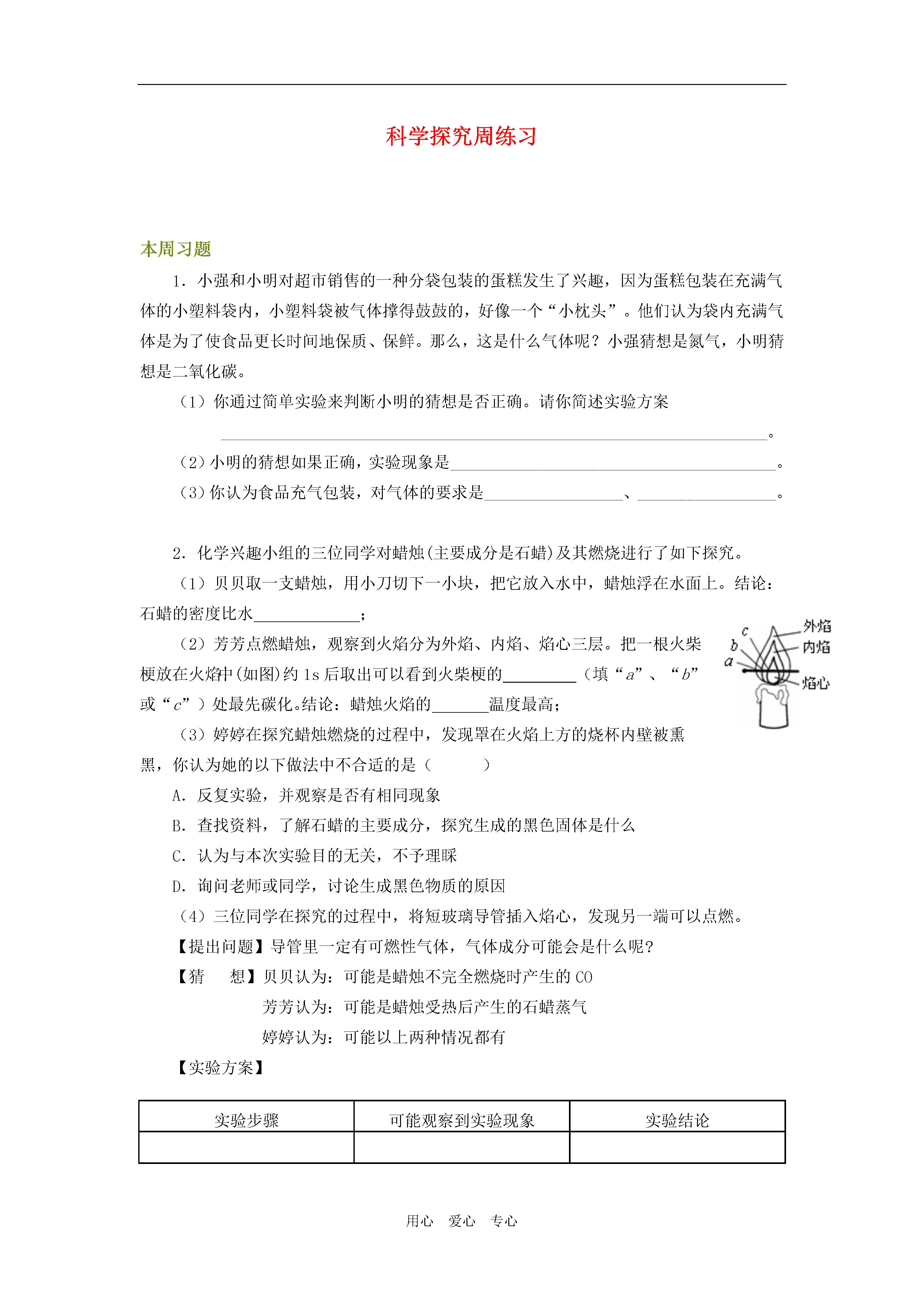 用心爱心专心科学探究周练习本周习题1.小强和小明对超市销售的一种分袋包装的蛋糕发生了兴趣,因为蛋糕包装在充满气体的小塑料袋内,小塑料袋被气体撑得鼓鼓的,好像一个“小枕头”。他们认为袋内充满气体是为了使食品更长时间地保质、保鲜。那么,这是什么气体呢?小强猜想是氮气,小明猜想是二氧化碳。(1)你通过简单实验来判断小明的猜想是否正确。请你简述实验方案___________________________________________________________________。(2)小明的猜想如果正确,实验现象是________________________________________。(3)你认为食品充气包装,对气体的要求是_________________、_________________。2.化学兴趣小组的三位同学对蜡烛(主要成分是石蜡)及其燃烧进行了如下探究。(1)贝贝取一支蜡烛,用小刀切下一小块,把它放入水中,蜡烛浮在水面上。结论:石蜡的密度比水;(2)芳芳点燃蜡烛,观察到火焰分为外焰、内焰、焰心三层。把一根火柴梗放在火焰中(如图)约1s后取出可以看到火柴梗的(填“a”、“b”或“c”)处最先碳化。结论:蜡烛火焰的温度最高;(3)婷婷在探究蜡烛燃烧的过程中,发现罩在火焰上方的烧杯内壁被熏黑,你认为她的以下做法中不合适的是()A.反复实验,并观察是否有相同现象B.查找资料,了解石蜡的主要成分,探究生成的黑色固体是什么C.认为与本次实验目的无关,不予理睬D.询问老师或同学,讨论生成黑色物质的原因(4)三位同学在探究的过程中,将短玻璃导管插入焰心,发现另一端可以点燃。【提出问题】导管里一定有可燃性气体,气体成分可能会是什么呢?【猜想】贝贝认为:可能是蜡烛不完全燃烧时产生的CO芳芳认为:可能是蜡烛受热后产生的石蜡蒸气婷婷认为:可能以上两种情况都有【实验方案】实验步骤可能观察到实验现象实验结论3.下面是某科研小组对“蜡烛燃烧前后各物质质量之和会发生变化吗?”的问题进行实验探究的例子,给出了实验探究的一般步骤。一、假设:①会发生变化②不会发生变化二、收集、整理资料:(1)蜡烛燃烧需要氧气,生成二氧化碳和水;(2)氧气、二氧化碳等为气体;(3)由(1)、(2)可知实验必须在密闭容器中进行。三、设计并进行实验:(1)将一支蜡烛放在集气瓶中,塞上塞子,称其质量为W1g;(2)将蜡烛点燃,立即塞上塞子;(3)待蜡烛熄灭,集气瓶冷却,再称其质量为W2g。四、分析现象、得出结论:(1)如果W1=W2,则蜡烛燃烧前后物质的质量之和不变。(2)如果W1≠W2,则蜡烛燃烧前后物质的质量之和发生变化。请模仿上例,对“液化石油气里含氢元素吗?”的问题进行实验探究。【参考答案】1.(1)用注射器抽取袋中的气体,将气体通入澄清石灰水中,若澄清石灰水变浑浊,则小明的猜想正确,若不变浑浊,则小明的猜想错误。(2)石灰水变浑浊。(3)性质稳定,对人体无害,无特殊气味等。2.(1)小(2)a外焰(3)C(4)实验步骤实验现象实验结论换一根较长的导管,并用冷的湿毛巾包住导管,然后在导管另一端做点火实验。玻璃导管口一端产生火焰,导管内壁没有固体物质出现;蜡烛不完全燃烧时产生的CO。玻璃导管口一端没有产生火焰,导管内壁有固体物质出现;蜡烛受热后产生的石蜡蒸气。玻璃导管口一端产生火焰,导管内壁有固体物质出现。蜡烛受热后产生的石蜡蒸气,而且蜡烛不完全燃烧时产生的CO气体。3.一、假设:①含氢元素,②不含氢元素二、收集、整理资料:(1)液化石油气可以在空气(氧气)中燃烧(2)化学反应前后元素的种类不变(3)氧气(空气)中不含氢元素,而水中含有氢元素三、设计并进行实验:点燃液化石油气,将干冷的玻璃杯罩在火焰上方,观察玻璃杯内壁是否有水珠产生。四、分析现象、得出结论:(1)如有水珠产生,说明液化石油气中含氢元素。(2)如无水珠产生,说明液化石油气中不含氢元素。