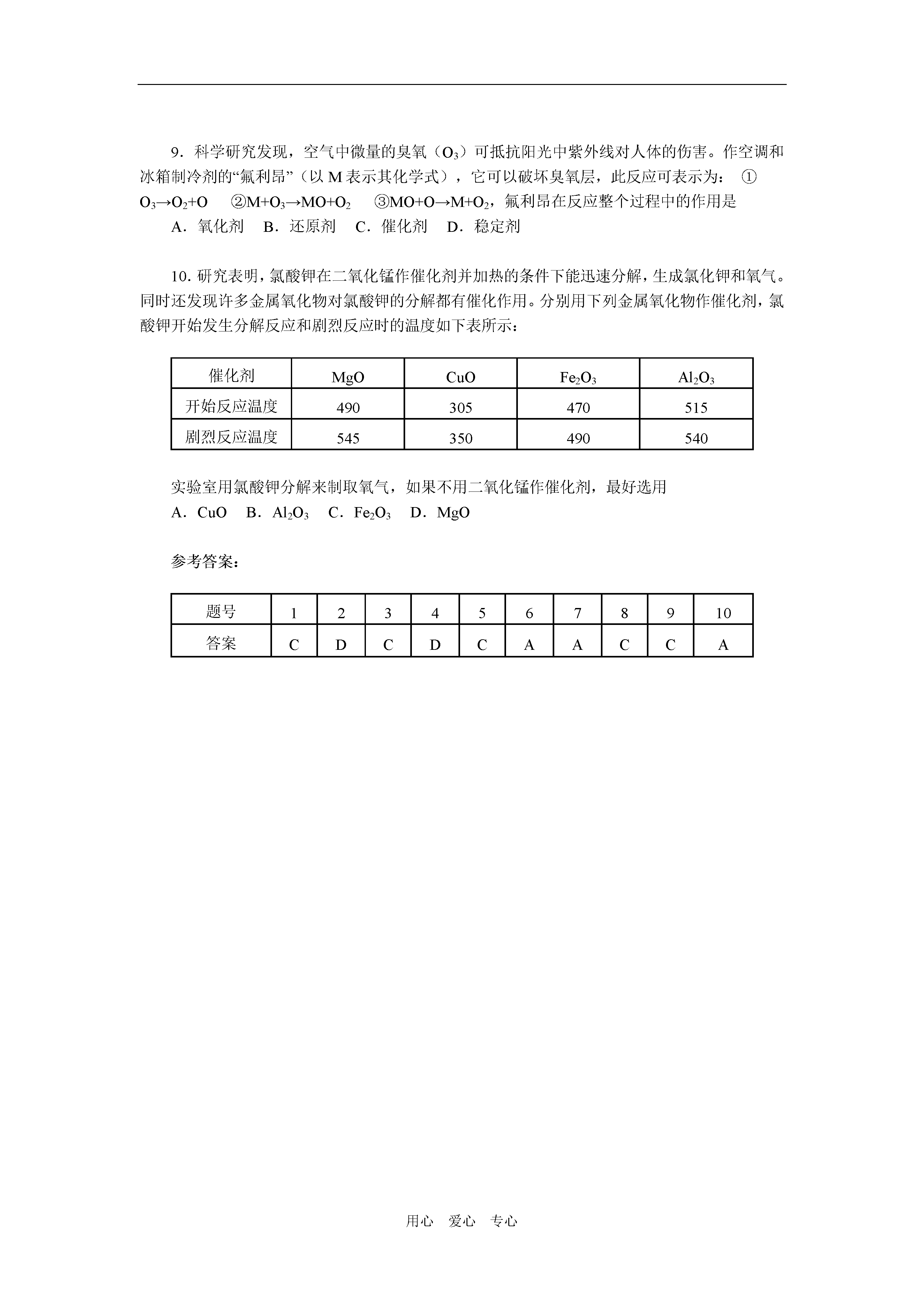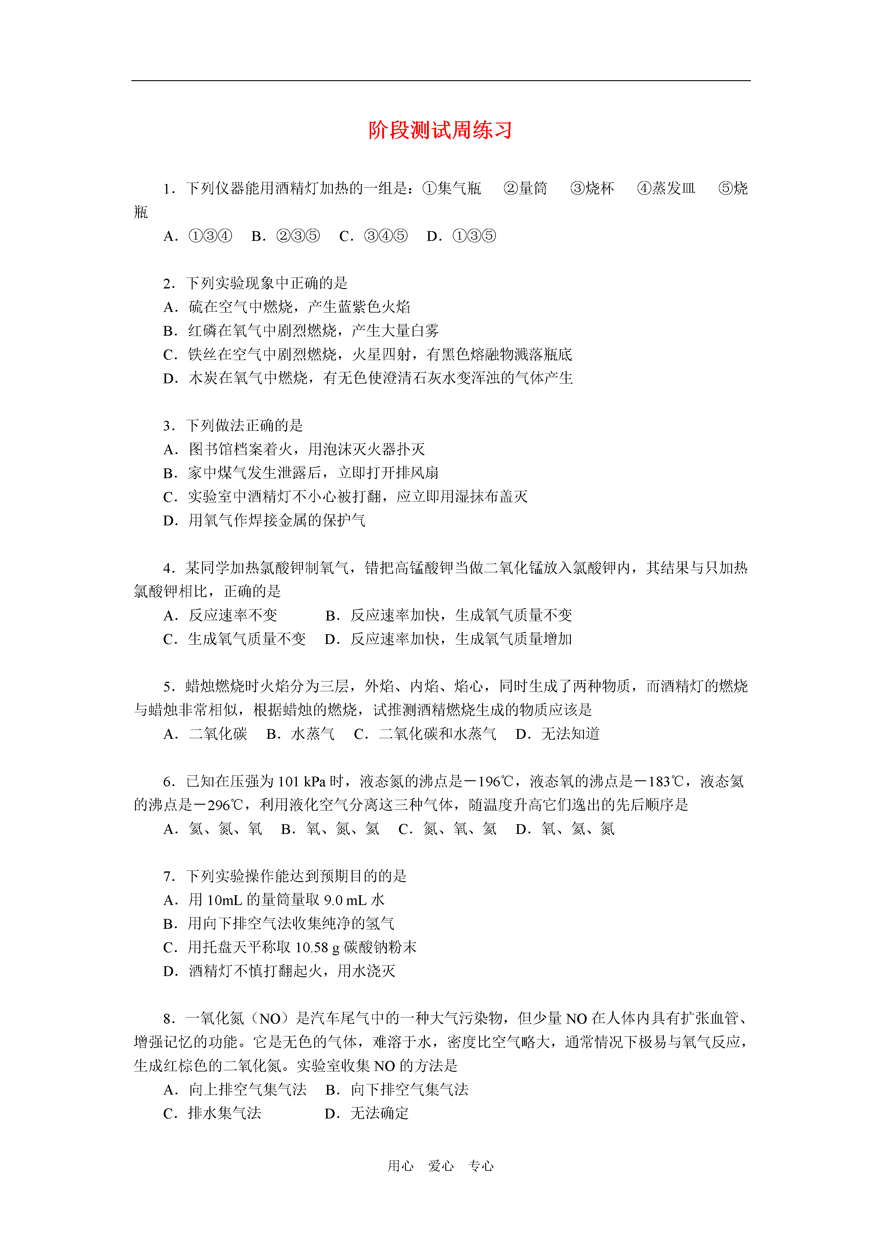 用心爱心专心阶段测试周练习1.下列仪器能用酒精灯加热的一组是:①集气瓶②量筒③烧杯④蒸发皿⑤烧瓶A.①③④B.②③⑤C.③④⑤D.①③⑤2.下列实验现象中正确的是A.硫在空气中燃烧,产生蓝紫色火焰B.红磷在氧气中剧烈燃烧,产生大量白雾C.铁丝在空气中剧烈燃烧,火星四射,有黑色熔融物溅落瓶底D.木炭在氧气中燃烧,有无色使澄清石灰水变浑浊的气体产生3.下列做法正确的是A.图书馆档案着火,用泡沫灭火器扑灭B.家中煤气发生泄露后,立即打开排风扇C.实验室中酒精灯不小心被打翻,应立即用湿抹布盖灭D.用氧气作焊接金属的保护气4.某同学加热氯酸钾制氧气,错把高锰酸钾当做二氧化锰放入氯酸钾内,其结果与只加热氯酸钾相比,正确的是A.反应速率不变B.反应速率加快,生成氧气质量不变C.生成氧气质量不变D.反应速率加快,生成氧气质量增加5.蜡烛燃烧时火焰分为三层,外焰、内焰、焰心,同时生成了两种物质,而酒精灯的燃烧与蜡烛非常相似,根据蜡烛的燃烧,试推测酒精燃烧生成的物质应该是A.二氧化碳B.水蒸气C.二氧化碳和水蒸气D.无法知道6.已知在压强为101kPa时,液态氮的沸点是-196℃,液态氧的沸点是-183℃,液态氦的沸点是-296℃,利用液化空气分离这三种气体,随温度升高它们逸出的先后顺序是A.氦、氮、氧B.氧、氮、氦C.氮、氧、氦D.氧、氦、氮7.下列实验操作能达到预期目的的是A.用10mL的量筒量取9.0mL水B.用向下排空气法收集纯净的氢气C.用托盘天平称取10.58g碳酸钠粉末D.酒精灯不慎打翻起火,用水浇灭8.一氧化氮(NO)是汽车尾气中的一种大气污染物,但少量NO在人体内具有扩张血管、增强记忆的功能。它是无色的气体,难溶于水,密度比空气略大,通常情况下极易与氧气反应,生成红棕色的二氧化氮。实验室收集NO的方法是A.向上排空气集气法B.向下排空气集气法C.排水集气法D.无法确定9.科学研究发现,空气中微量的臭氧(O3)可抵抗阳光中紫外线对人体的伤害。作空调和冰箱制冷剂的“氟利昂”(以M表示其化学式),它可以破坏臭氧层,此反应可表示为:①O3→O2+O②M+O3→MO+O2③MO+O→M+O2,氟利昂在反应整个过程中的作用是A.氧化剂B.还原剂C.催化剂D.稳定剂10.研究表明,氯酸钾在二氧化锰作催化剂并加热的条件下能迅速分解,生成氯化钾和氧气。同时还发现许多金属氧化物对氯酸钾的分解都有催化作用。分别用下列金属氧化物作催化剂,氯酸钾开始发生分解反应和剧烈反应时的温度如下表所示:催化剂MgOCuOFe2O3Al2O3开始反应温度490305470515剧烈反应温度545350490540实验室用氯酸钾分解来制取氧气,如果不用二氧化锰作催化剂,最好选用A.CuOB.Al2O3C.Fe2O3D.MgO参考答案:题号12345678910答案CDCDCAACCA