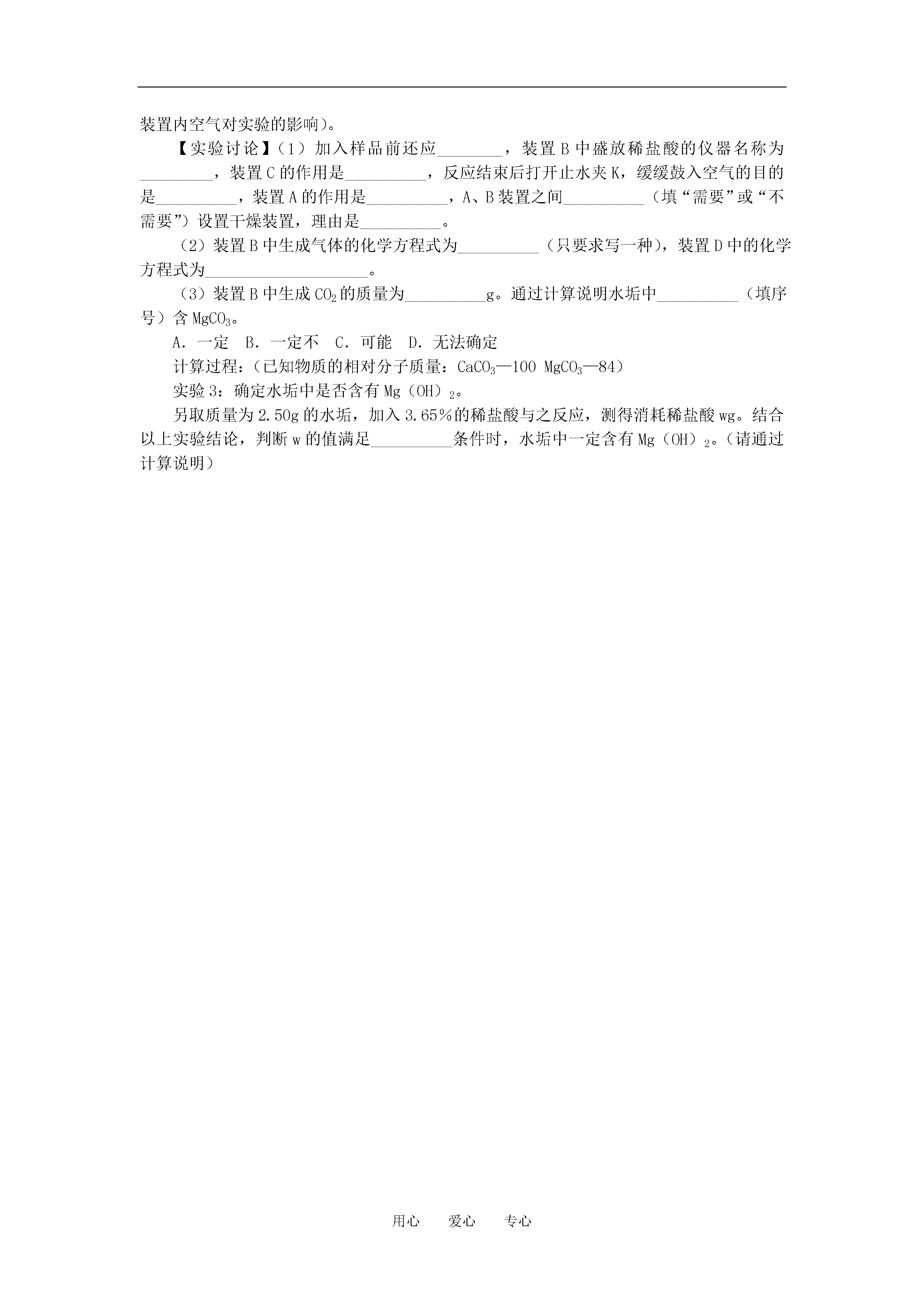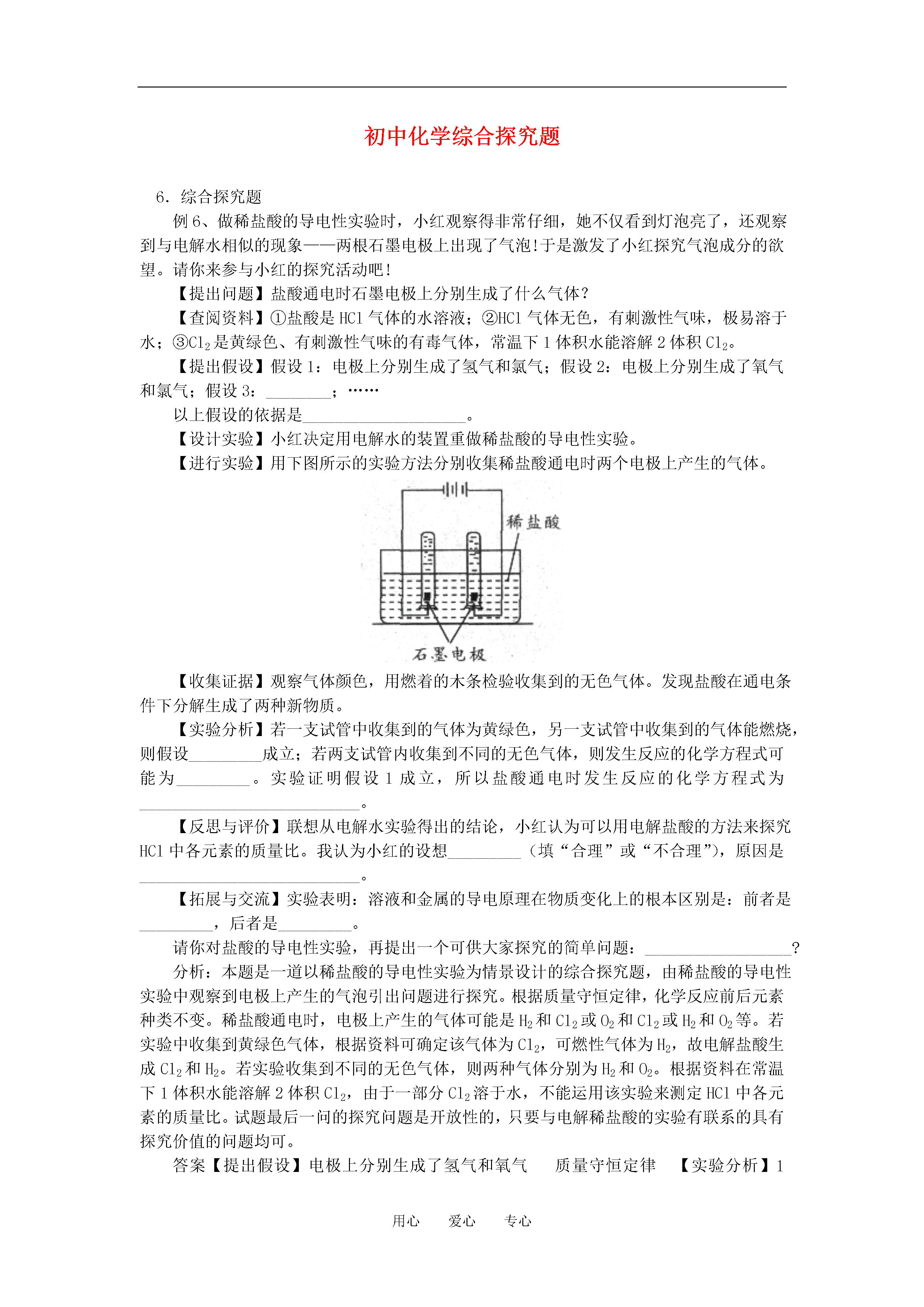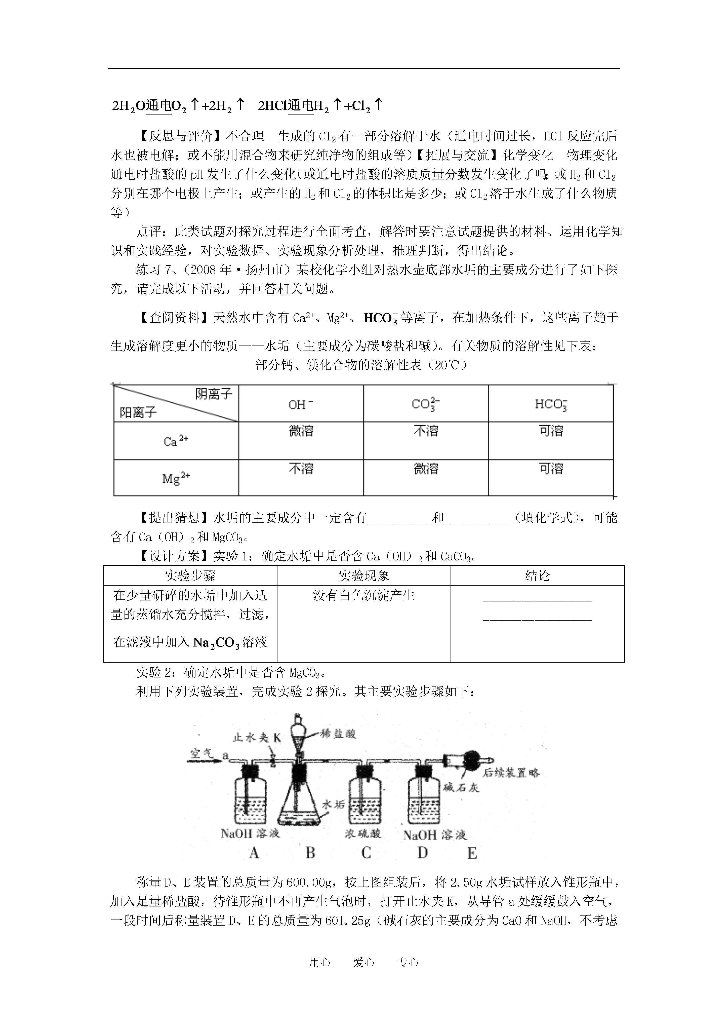 用心爱心专心初中化学综合探究题6.综合探究题例6、做稀盐酸的导电性实验时,小红观察得非常仔细,她不仅看到灯泡亮了,还观察到与电解水相似的现象——两根石墨电极上出现了气泡!于是激发了小红探究气泡成分的欲望。请你来参与小红的探究活动吧!【提出问题】盐酸通电时石墨电极上分别生成了什么气体?【查阅资料】①盐酸是HCl气体的水溶液;②HCl气体无色,有刺激性气味,极易溶于水;③Cl2是黄绿色、有刺激性气味的有毒气体,常温下1体积水能溶解2体积Cl2。【提出假设】假设1:电极上分别生成了氢气和氯气;假设2:电极上分别生成了氧气和氯气;假设3:________;……以上假设的依据是____________________。【设计实验】小红决定用电解水的装置重做稀盐酸的导电性实验。【进行实验】用下图所示的实验方法分别收集稀盐酸通电时两个电极上产生的气体。【收集证据】观察气体颜色,用燃着的木条检验收集到的无色气体。发现盐酸在通电条件下分解生成了两种新物质。【实验分析】若一支试管中收集到的气体为黄绿色,另一支试管中收集到的气体能燃烧,则假设_________成立;若两支试管内收集到不同的无色气体,则发生反应的化学方程式可能为_________。实验证明假设1成立,所以盐酸通电时发生反应的化学方程式为___________________________。【反思与评价】联想从电解水实验得出的结论,小红认为可以用电解盐酸的方法来探究HCl中各元素的质量比。我认为小红的设想_________(填“合理”或“不合理”),原因是___________________________。【拓展与交流】实验表明:溶液和金属的导电原理在物质变化上的根本区别是:前者是_________,后者是_________。请你对盐酸的导电性实验,再提出一个可供大家探究的简单问题:__________________?分析:本题是一道以稀盐酸的导电性实验为情景设计的综合探究题,由稀盐酸的导电性实验中观察到电极上产生的气泡引出问题进行探究。根据质量守恒定律,化学反应前后元素种类不变。稀盐酸通电时,电极上产生的气体可能是H2和Cl2或O2和Cl2或H2和O2等。若实验中收集到黄绿色气体,根据资料可确定该气体为Cl2,可燃性气体为H2,故电解盐酸生成Cl2和H2。若实验收集到不同的无色气体,则两种气体分别为H2和O2。根据资料在常温下1体积水能溶解2体积Cl2,由于一部分Cl2溶于水,不能运用该实验来测定HCl中各元素的质量比。试题最后一问的探究问题是开放性的,只要与电解稀盐酸的实验有联系的具有探究价值的问题均可。答案【提出假设】电极上分别生成了氢气和氧气质量守恒定律【实验分析】1【反思与评价】不合理生成的Cl2有一部分溶解于水(通电时间过长,HCl反应完后水也被电解;或不能用混合物来研究纯净物的组成等)【拓展与交流】化学变化物理变化通电时盐酸的pH发生了什么变化(或通电时盐酸的溶质质量分数发生变化了吗;或H2和Cl2分别在哪个电极上产生;或产生的H2和Cl2的体积比是多少;或Cl2溶于水生成了什么物质等)点评:此类试题对探究过程进行全面考查,解答时要注意试题提供的材料、运用化学知识和实践经验,对实验数据、实验现象分析处理,推理判断,得出结论。练习7、(2008年·扬州市)某校化学小组对热水壶底部水垢的主要成分进行了如下探究,请完成以下活动,并回答相关问题。【查阅资料】天然水中含有Ca2+、Mg2+、等离子,在加热条件下,这些离子趋于生成溶解度更小的物质——水垢(主要成分为碳酸盐和碱)。有关物质的溶解性见下表:部分钙、镁化合物的溶解性表(20℃)【提出猜想】水垢的主要成分中一定含有__________和__________(填化学式),可能含有Ca(OH)2和MgCO3。【设计方案】实验1:确定水垢中是否含Ca(OH)2和CaCO3。实验步骤实验现象结论在少量研碎的水垢中加入适量的蒸馏水充分搅拌,过滤,在滤液中加入溶液没有白色沉淀产生__________________________________实验2:确定水垢中是否含MgCO3。利用下列实验装置,完成实验2探究。其主要实验步骤如下:称量D、E装置的总质量为600.00g,按上图组装后,将2.50g水垢试样放入锥形瓶中,加入足量稀盐酸,待锥形瓶中不再产生气泡时,打开止水夹K,从导管a处缓缓鼓入空气,一段时间后称量装置D、E的总质量为601.25g(碱石灰的主要成分为CaO和NaOH,不考虑装置内空气对实验的影响)。【实验讨论】(1)加入样品前还应________,装置B中盛放稀盐酸的仪器名称为_________,装置C的作用是__________,反应结