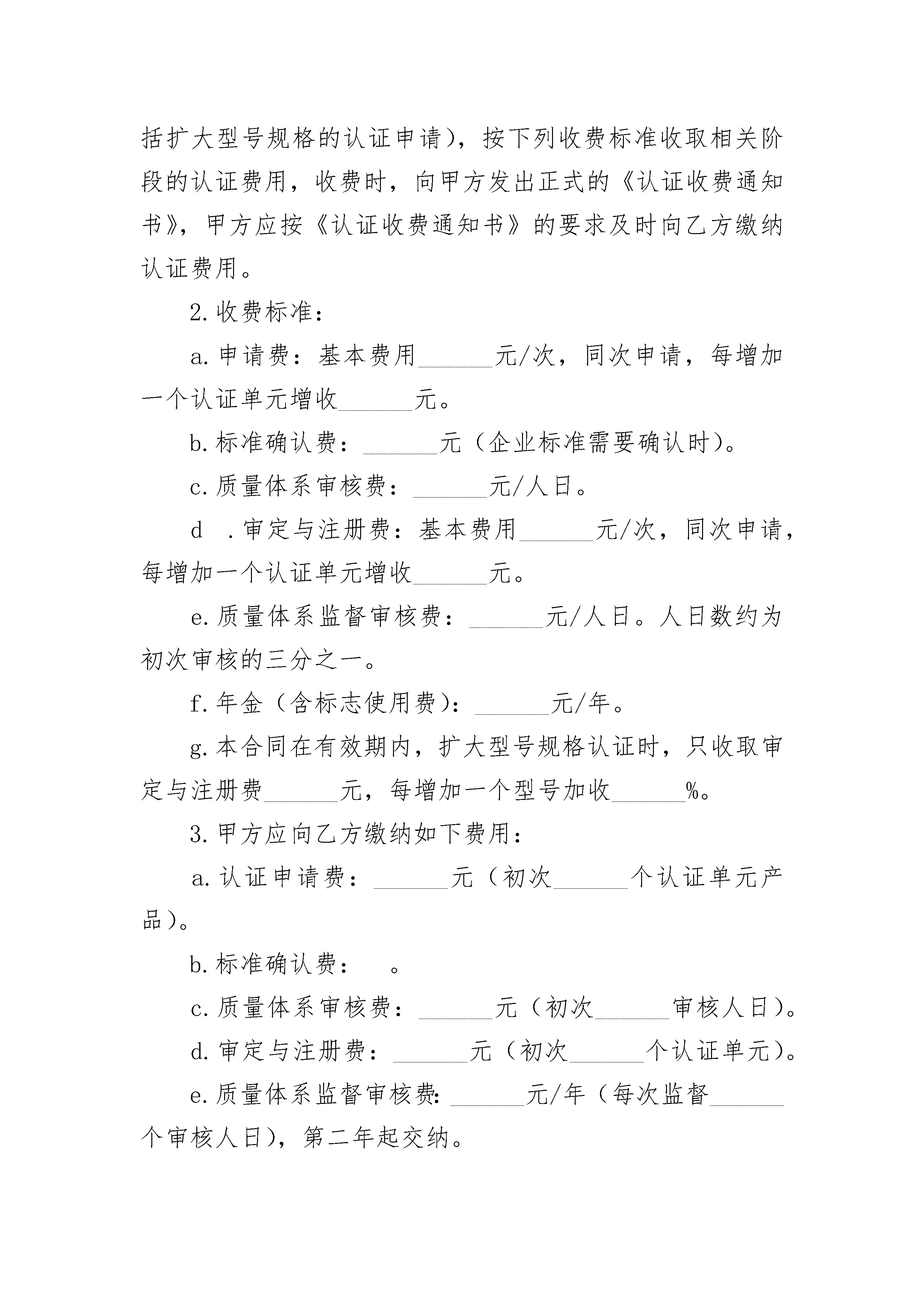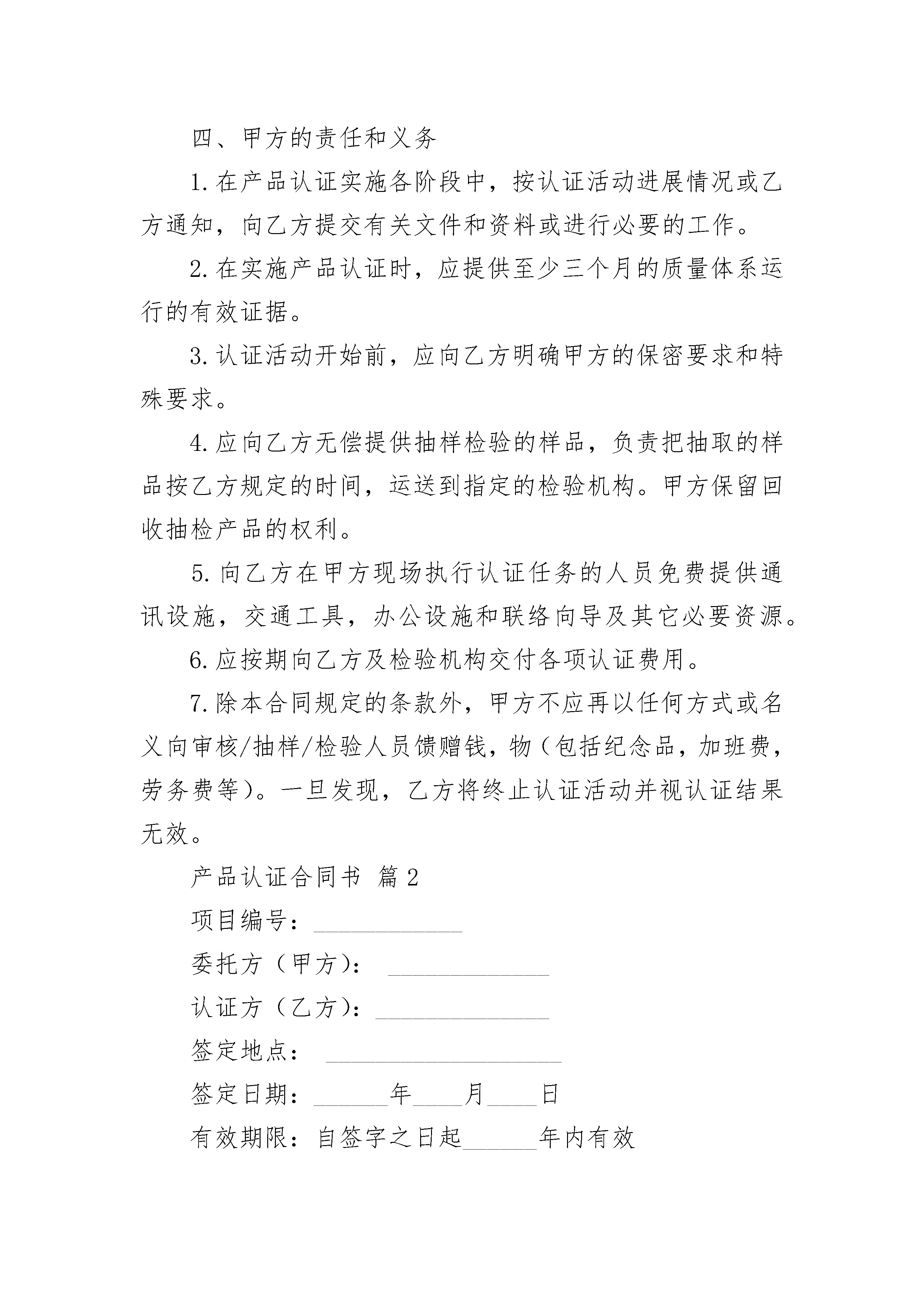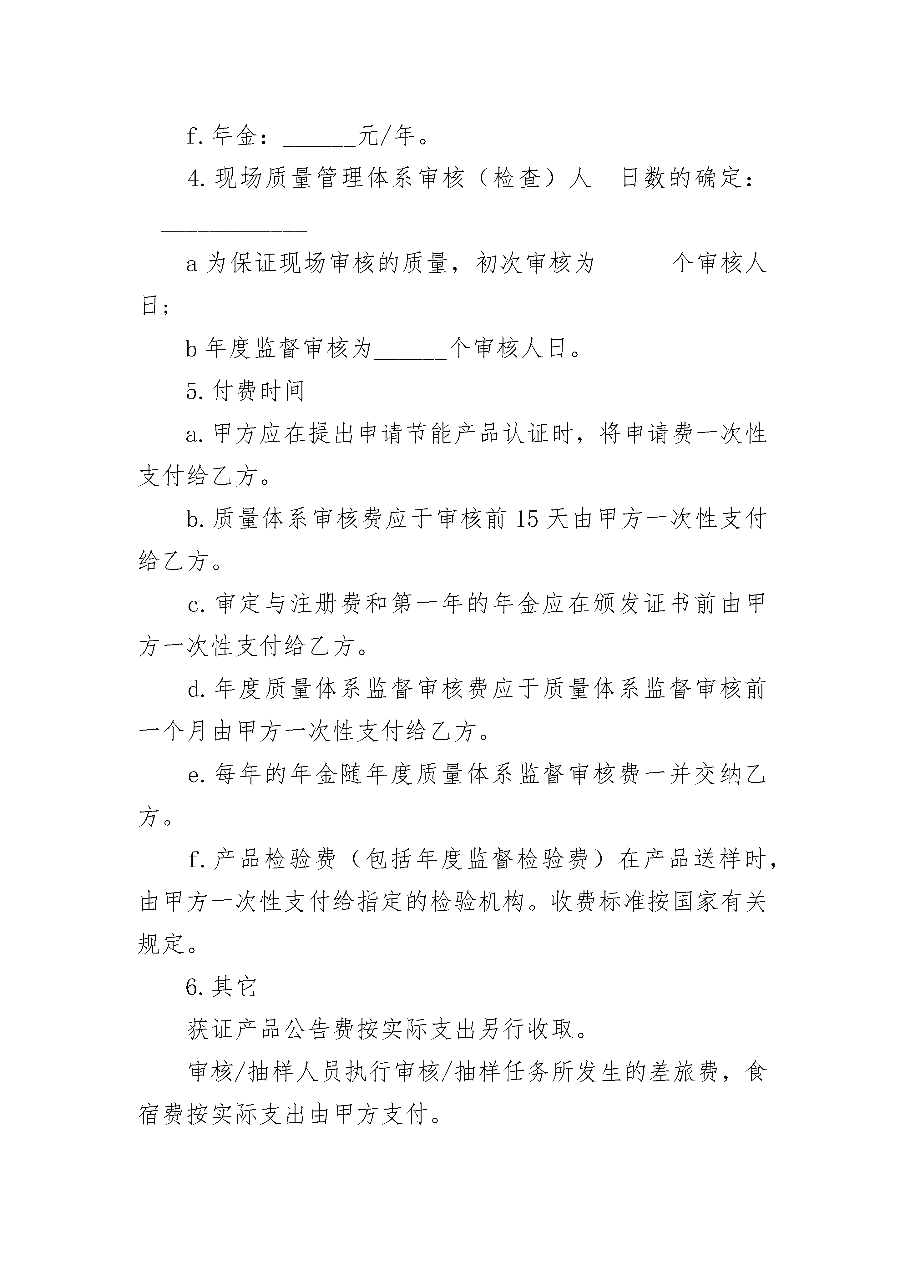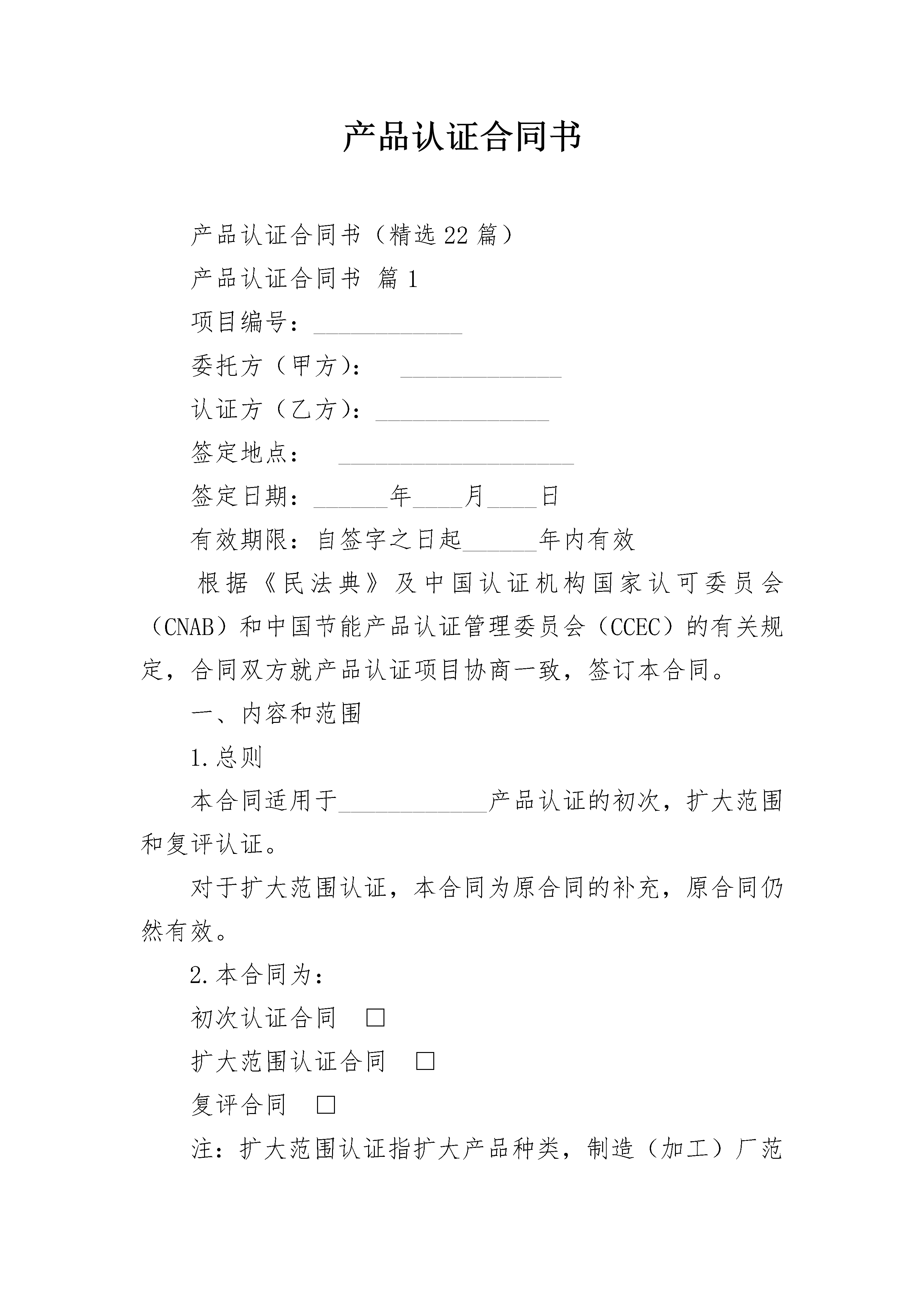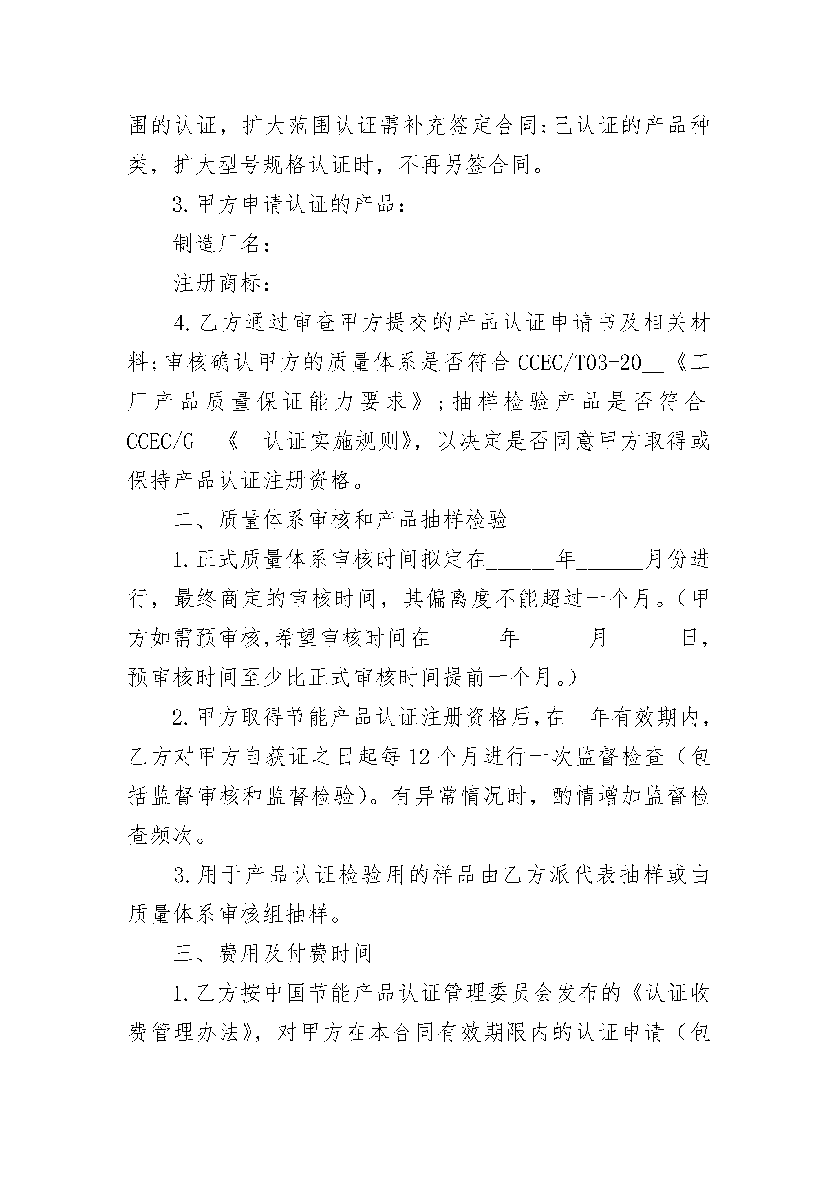 产品认证合同书产品认证合同书(精选22篇)产品认证合同书篇1项目编号:____________委托方(甲方):_____________认证方(乙方):______________签定地点:___________________签定日期:______年____月____日有效期限:自签字之日起______年内有效根据《民法典》及中国认证机构国家认可委员会(CNAB)和中国节能产品认证管理委员会(CCEC)的有关规定,合同双方就产品认证项目协商一致,签订本合同。一、内容和范围1.总则本合同适用于____________产品认证的初次,扩大范围和复评认证。对于扩大范围认证,本合同为原合同的补充,原合同仍然有效。2.本合同为:初次认证合同□扩大范围认证合同□复评合同□注:扩大范围认证指扩大产品种类,制造(加工)厂范围的认证,扩大范围认证需补充签定合同;已认证的产品种类,扩大型号规格认证时,不再另签合同。3.甲方申请认证的产品:制造厂名:注册商标:4.乙方通过审查甲方提交的产品认证申请书及相关材料;审核确认甲方的质量体系是否符合CCEC/T03-20__《工厂产品质量保证能力要求》;抽样检验产品是否符合CCEC/G《认证实施规则》,以决定是否同意甲方取得或保持产品认证注册资格。二、质量体系审核和产品抽样检验1.正式质量体系审核时间拟定在______年______月份进行,最终商定的审核时间,其偏离度不能超过一个月。(甲方如需预审核,希望审核时间在______年______月______日,预审核时间至少比正式审核时间提前一个月。)2.甲方取得节能产品认证注册资格后,在年有效期内,乙方对甲方自获证之日起每12个月进行一次监督检查(包括监督审核和监督检验)。有异常情况时,酌情增加监督检查频次。3.用于产品认证检验用的样品由乙方派代表抽样或由质量体系审核组抽样。三、费用及付费时间1.乙方按中国节能产品认证管理委员会发布的《认证收费管理办法》,对甲方在本合同有效期限内的认证申请(包括扩大型号规格的认证申请),按下列收费标准收取相关阶段的认证费用,收费时,向甲方发出正式的《认证收费通知书》,甲方应按《认证收费通知书》的要求及时向乙方缴纳认证费用。2.收费标准:a.申请费:基本费用______元/次,同次申请,每增加一个认证单元增收______元。b.标准确认费:______元(企业标准需要确认时)。c.质量体系审核费:______元/人日。d.审定与注册费:基本费用______元/次,同次申请,每增加一个认证单元增收______元。e.质量体系监督审核费:______元/人日。人日数约为初次审核的三分之一。f.年金(含标志使用费):______元/年。g.本合同在有效期内,扩大型号规格认证时,只收取审定与注册费______元,每增加一个型号加收______%。3.甲方应向乙方缴纳如下费用:a.认证申请费:______元(初次______个认证单元产品)。b.标准确认费:。c.质量体系审核费:______元(初次______审核人日)。d.审定与注册费:______元(初次______个认证单元)。e.质量体系监督审核费:______元/年(每次监督______个审核人日),第二年起交纳。f.年金:______元/年。4.现场质量管理体系审核(检查)人日数的确定:____________a为保证现场审核的质量,初次审核为______个审核人日;b年度监督审核为______个审核人日。5.付费时间a.甲方应在提出申请节能产品认证时,将申请费一次性支付给乙方。b.质量体系审核费应于审核前15天由甲方一次性支付给乙方。c.审定与注册费和第一年的年金应在颁发证书前由甲方一次性支付给乙方。d.年度质量体系监督审核费应于质量体系监督审核前一个月由甲方一次性支付给乙方。e.每年的年金随年度质量体系监督审核费一并交纳乙方。f.产品检验费(包括年度监督检验费)在产品送样时,由甲方一次性支付给指定的检验机构。收费标准按国家有关规定。6.其它获证产品公告费按实际支出另行收取。审核/抽样人员执行审核/抽样任务所发生的差旅费,食宿费按实际支出由甲方支付。四、甲方的责任和义务1.在产品认证实施各阶段中,按认证活动进展情况或乙方通知,向乙方提交有关文件和资料或进行必要的工作。2.在实施产品认证时,应提供至少三个月的质量体系运行的有效证据。3.认证活动开始前,应向乙方明确甲方的保密要求和特殊要求。4.应向乙方无偿提供抽样检验的样品,负责把抽取的样品按乙方规定的时间,运送到指定的检验机构。甲方保留回收抽检产品的权利。5.向乙方在甲方现场执行认证任务的人员免费提供通讯设施,交通工具,办公设施和联络向导及其它必要资源。6.应按期向乙方及检验机构交付各项认证