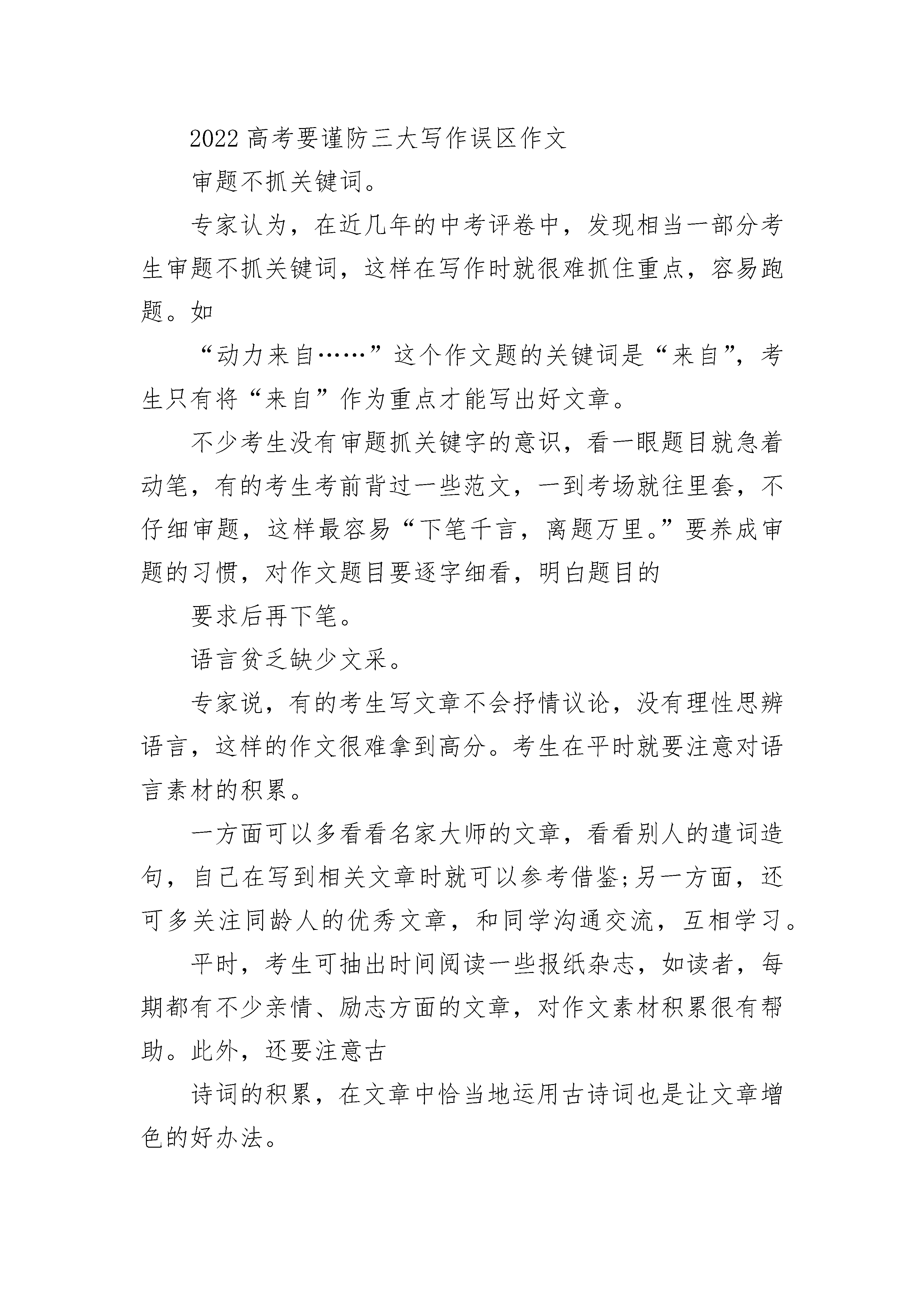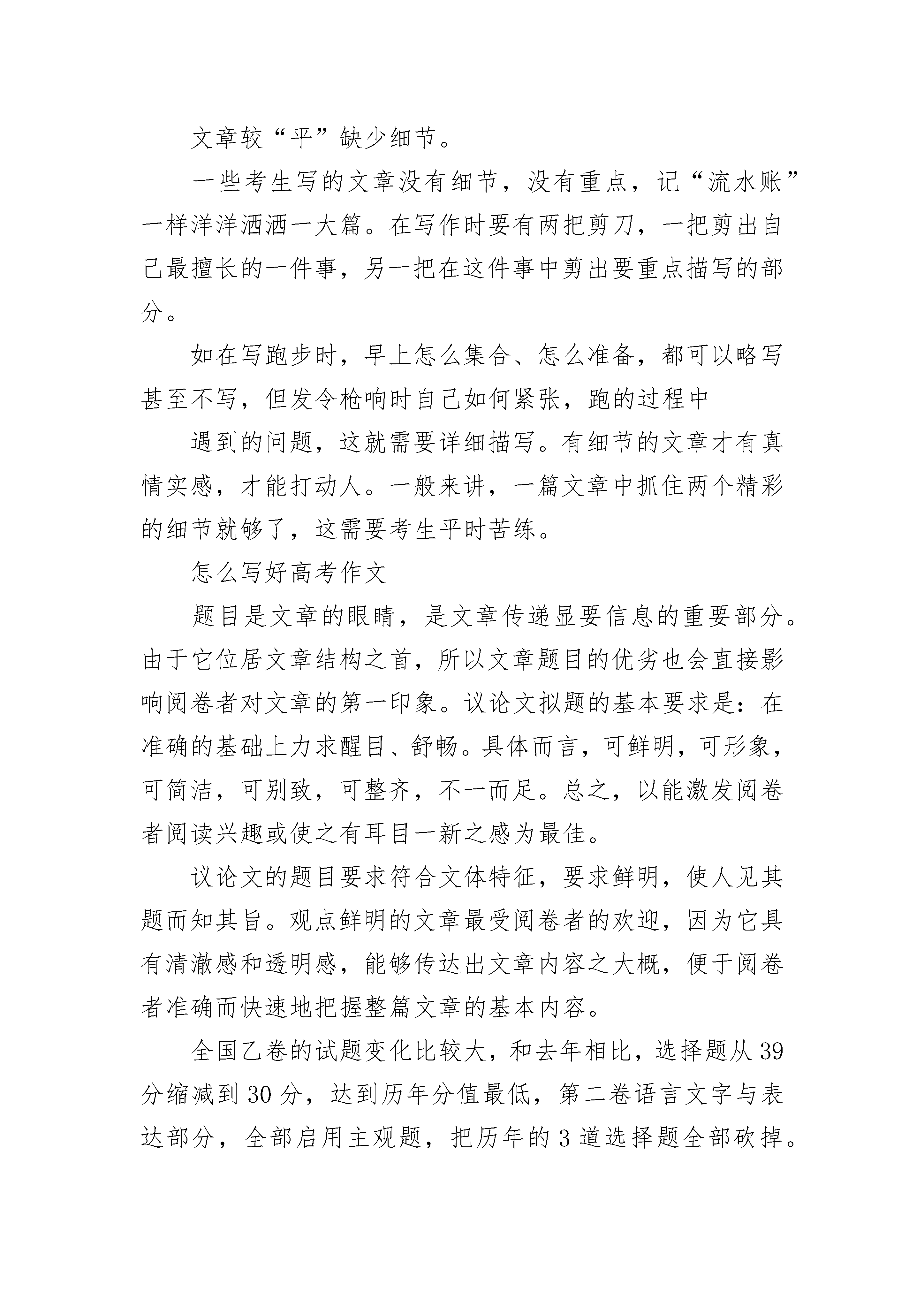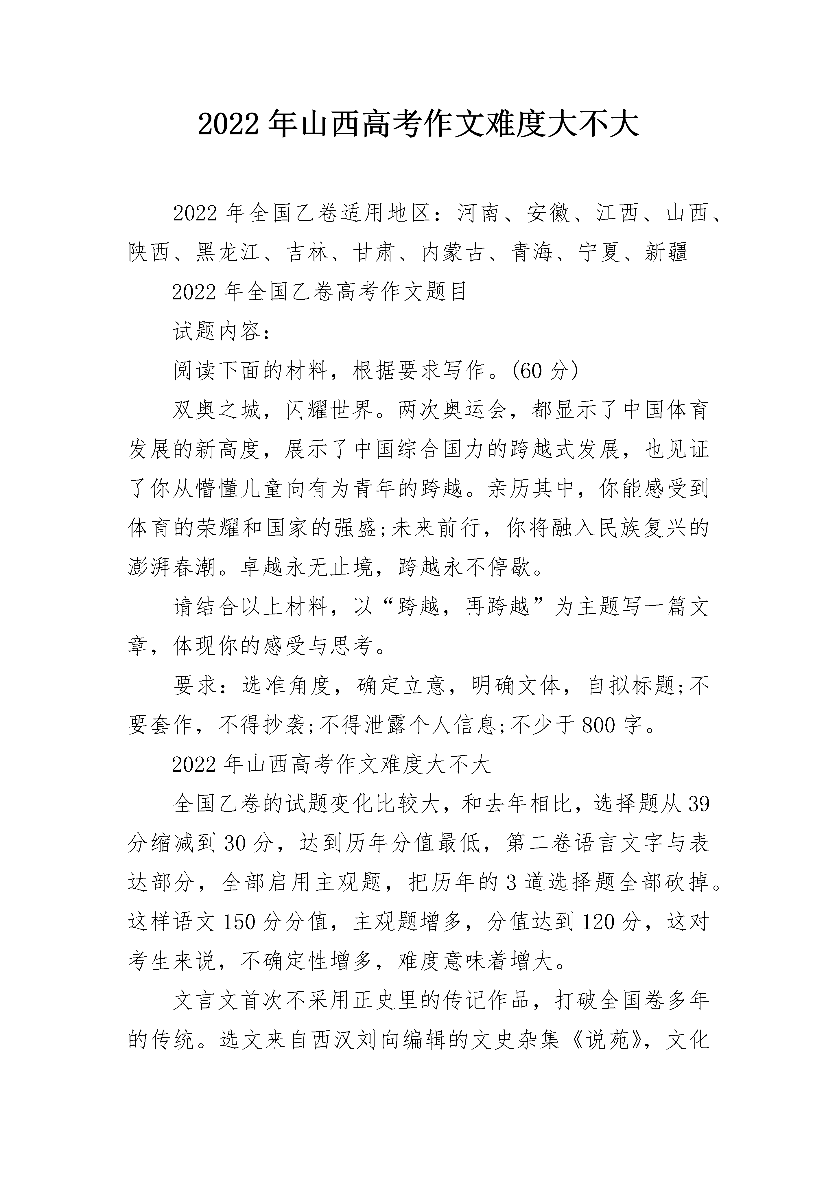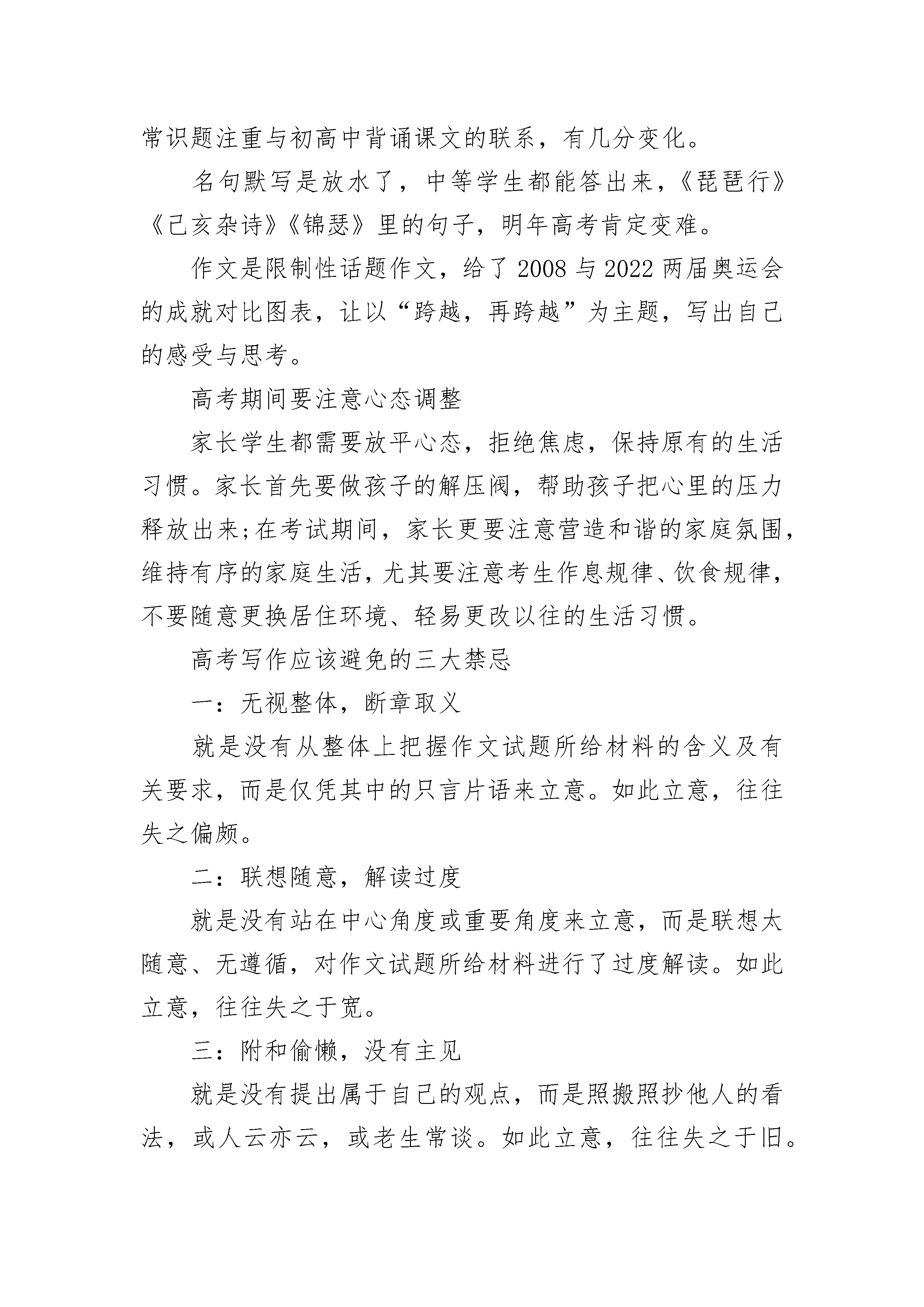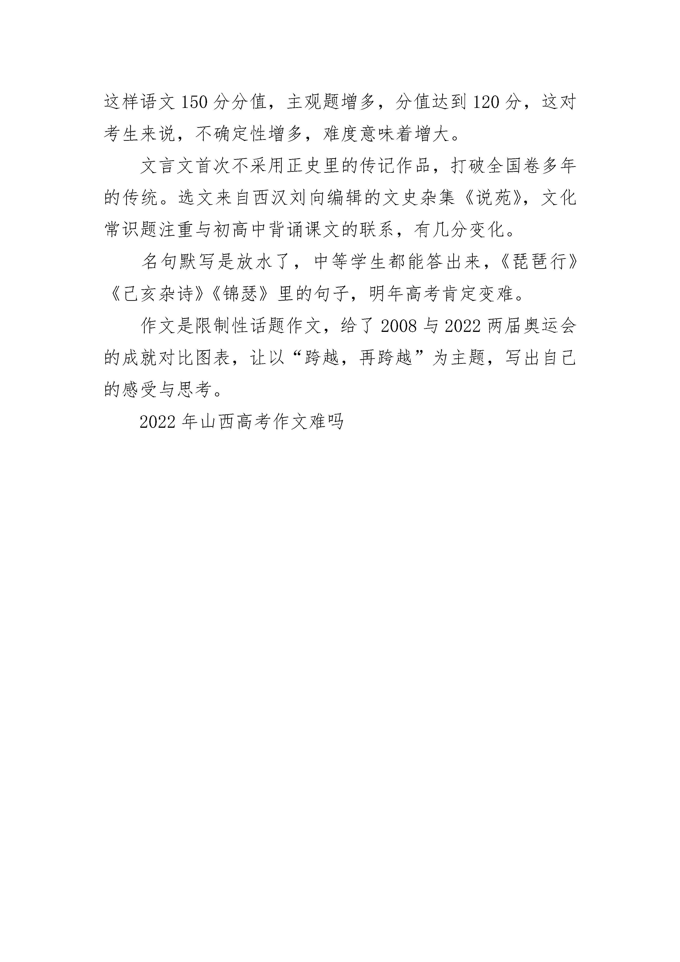 2022年山西高考作文难度大不大2022年全国乙卷适用地区:河南、安徽、江西、山西、陕西、黑龙江、吉林、甘肃、内蒙古、青海、宁夏、新疆2022年全国乙卷高考作文题目试题内容:阅读下面的材料,根据要求写作。(60分)双奥之城,闪耀世界。两次奥运会,都显示了中国体育发展的新高度,展示了中国综合国力的跨越式发展,也见证了你从懵懂儿童向有为青年的跨越。亲历其中,你能感受到体育的荣耀和国家的强盛;未来前行,你将融入民族复兴的澎湃春潮。卓越永无止境,跨越永不停歇。请结合以上材料,以“跨越,再跨越”为主题写一篇文章,体现你的感受与思考。要求:选准角度,确定立意,明确文体,自拟标题;不要套作,不得抄袭;不得泄露个人信息;不少于800字。2022年山西高考作文难度大不大全国乙卷的试题变化比较大,和去年相比,选择题从39分缩减到30分,达到历年分值最低,第二卷语言文字与表达部分,全部启用主观题,把历年的3道选择题全部砍掉。这样语文150分分值,主观题增多,分值达到120分,这对考生来说,不确定性增多,难度意味着增大。文言文首次不采用正史里的传记作品,打破全国卷多年的传统。选文来自西汉刘向编辑的文史杂集《说苑》,文化常识题注重与初高中背诵课文的联系,有几分变化。名句默写是放水了,中等学生都能答出来,《琵琶行》《己亥杂诗》《锦瑟》里的句子,明年高考肯定变难。作文是限制性话题作文,给了2008与2022两届奥运会的成就对比图表,让以“跨越,再跨越”为主题,写出自己的感受与思考。高考期间要注意心态调整家长学生都需要放平心态,拒绝焦虑,保持原有的生活习惯。家长首先要做孩子的解压阀,帮助孩子把心里的压力释放出来;在考试期间,家长更要注意营造和谐的家庭氛围,维持有序的家庭生活,尤其要注意考生作息规律、饮食规律,不要随意更换居住环境、轻易更改以往的生活习惯。高考写作应该避免的三大禁忌一:无视整体,断章取义就是没有从整体上把握作文试题所给材料的含义及有关要求,而是仅凭其中的只言片语来立意。如此立意,往往失之偏颇。二:联想随意,解读过度就是没有站在中心角度或重要角度来立意,而是联想太随意、无遵循,对作文试题所给材料进行了过度解读。如此立意,往往失之于宽。三:附和偷懒,没有主见就是没有提出属于自己的观点,而是照搬照抄他人的看法,或人云亦云,或老生常谈。如此立意,往往失之于旧。2022高考要谨防三大写作误区作文审题不抓关键词。专家认为,在近几年的中考评卷中,发现相当一部分考生审题不抓关键词,这样在写作时就很难抓住重点,容易跑题。如“动力来自……”这个作文题的关键词是“来自”,考生只有将“来自”作为重点才能写出好文章。不少考生没有审题抓关键字的意识,看一眼题目就急着动笔,有的考生考前背过一些范文,一到考场就往里套,不仔细审题,这样最容易“下笔千言,离题万里。”要养成审题的习惯,对作文题目要逐字细看,明白题目的要求后再下笔。语言贫乏缺少文采。专家说,有的考生写文章不会抒情议论,没有理性思辨语言,这样的作文很难拿到高分。考生在平时就要注意对语言素材的积累。一方面可以多看看名家大师的文章,看看别人的遣词造句,自己在写到相关文章时就可以参考借鉴;另一方面,还可多关注同龄人的优秀文章,和同学沟通交流,互相学习。平时,考生可抽出时间阅读一些报纸杂志,如读者,每期都有不少亲情、励志方面的文章,对作文素材积累很有帮助。此外,还要注意古诗词的积累,在文章中恰当地运用古诗词也是让文章增色的好办法。文章较“平”缺少细节。一些考生写的文章没有细节,没有重点,记“流水账”一样洋洋洒洒一大篇。在写作时要有两把剪刀,一把剪出自己最擅长的一件事,另一把在这件事中剪出要重点描写的部分。如在写跑步时,早上怎么集合、怎么准备,都可以略写甚至不写,但发令枪响时自己如何紧张,跑的过程中遇到的问题,这就需要详细描写。有细节的文章才有真情实感,才能打动人。一般来讲,一篇文章中抓住两个精彩的细节就够了,这需要考生平时苦练。怎么写好高考作文题目是文章的眼睛,是文章传递显要信息的重要部分。由于它位居文章结构之首,所以文章题目的优劣也会直接影响阅卷者对文章的第一印象。议论文拟题的基本要求是:在准确的基础上力求醒目、舒畅。具体而言,可鲜明,可形象,可简洁,可别致,可整齐,不一而足。总之,以能激发阅卷者阅读兴趣或使之有耳目一新之感为最佳。议论文的题目要求符合文体特征,要求鲜明,使人见其题而知其旨。观点鲜明的文章最受阅卷者的欢迎,因为它具有清澈感和透明感,能够传达出文章内容之大概,便于阅卷者准确而快速地把握整篇文章的基本内容。全国乙卷的试题变化比较大,和去年相比,选择题从39分缩减到30分,达到历年分值最低,第二卷语言文字与表达部分,全部启用主观题,把历年的3道选择题全部砍掉。这样语文150分分值,主观题增多,分值达到120分