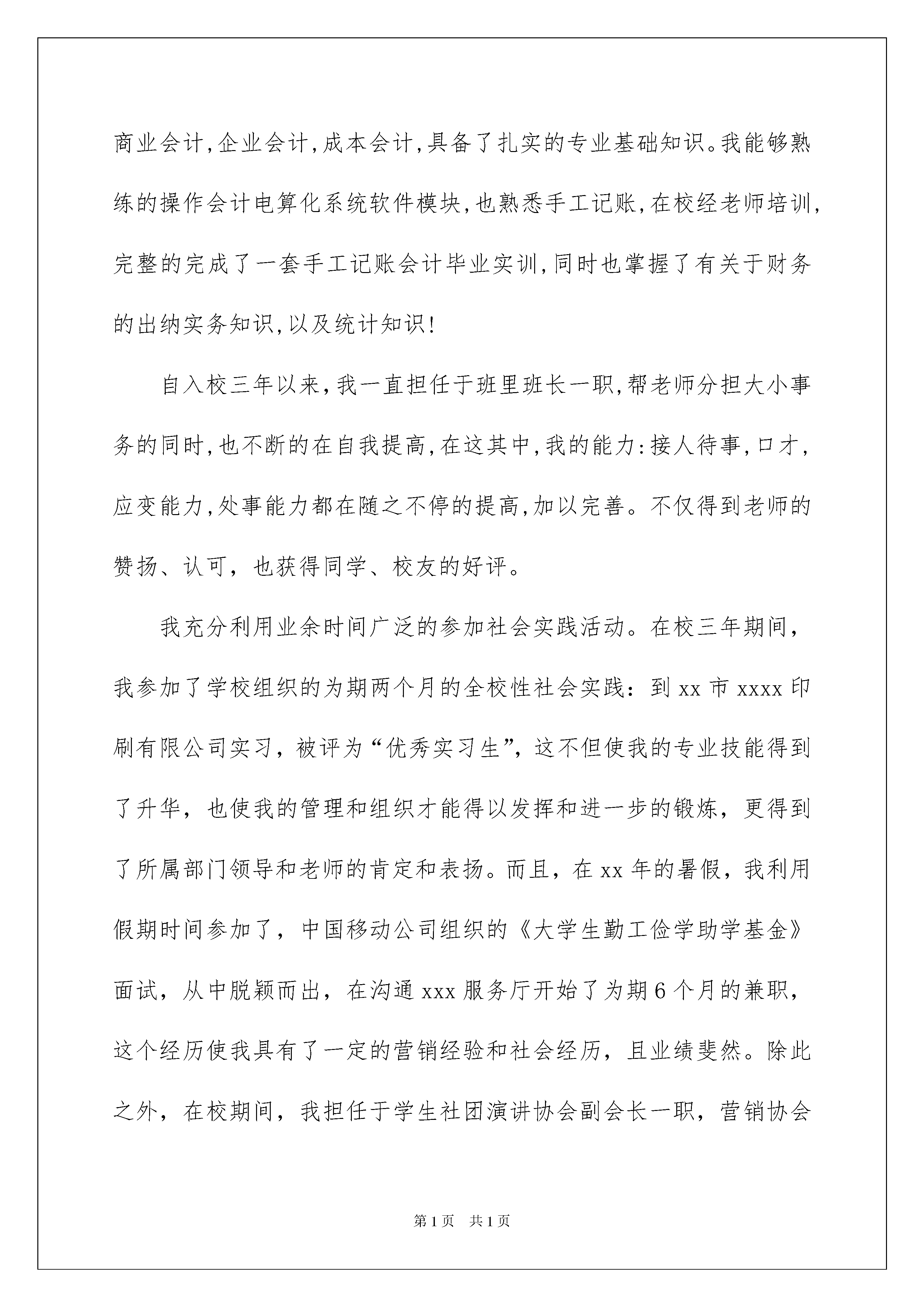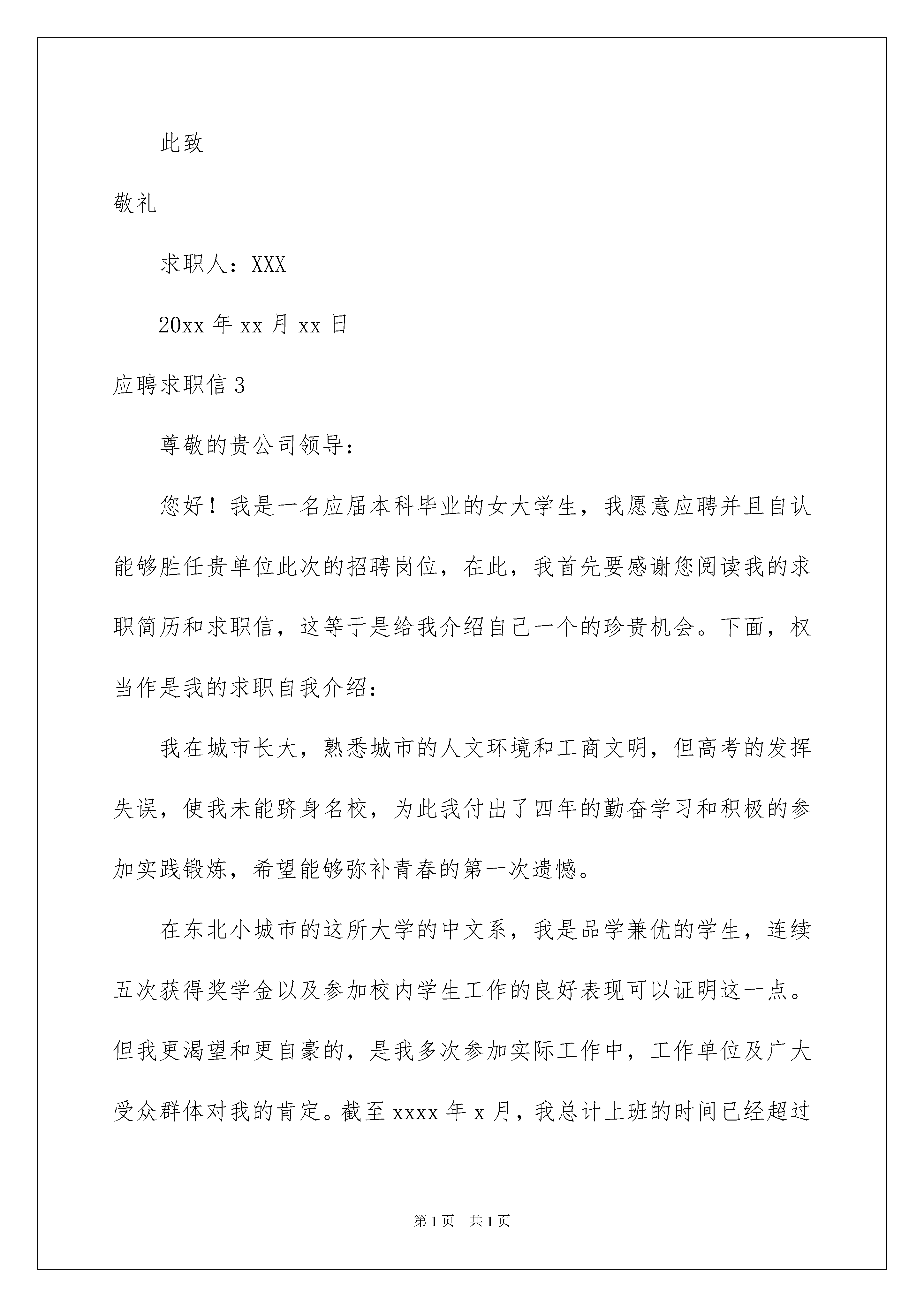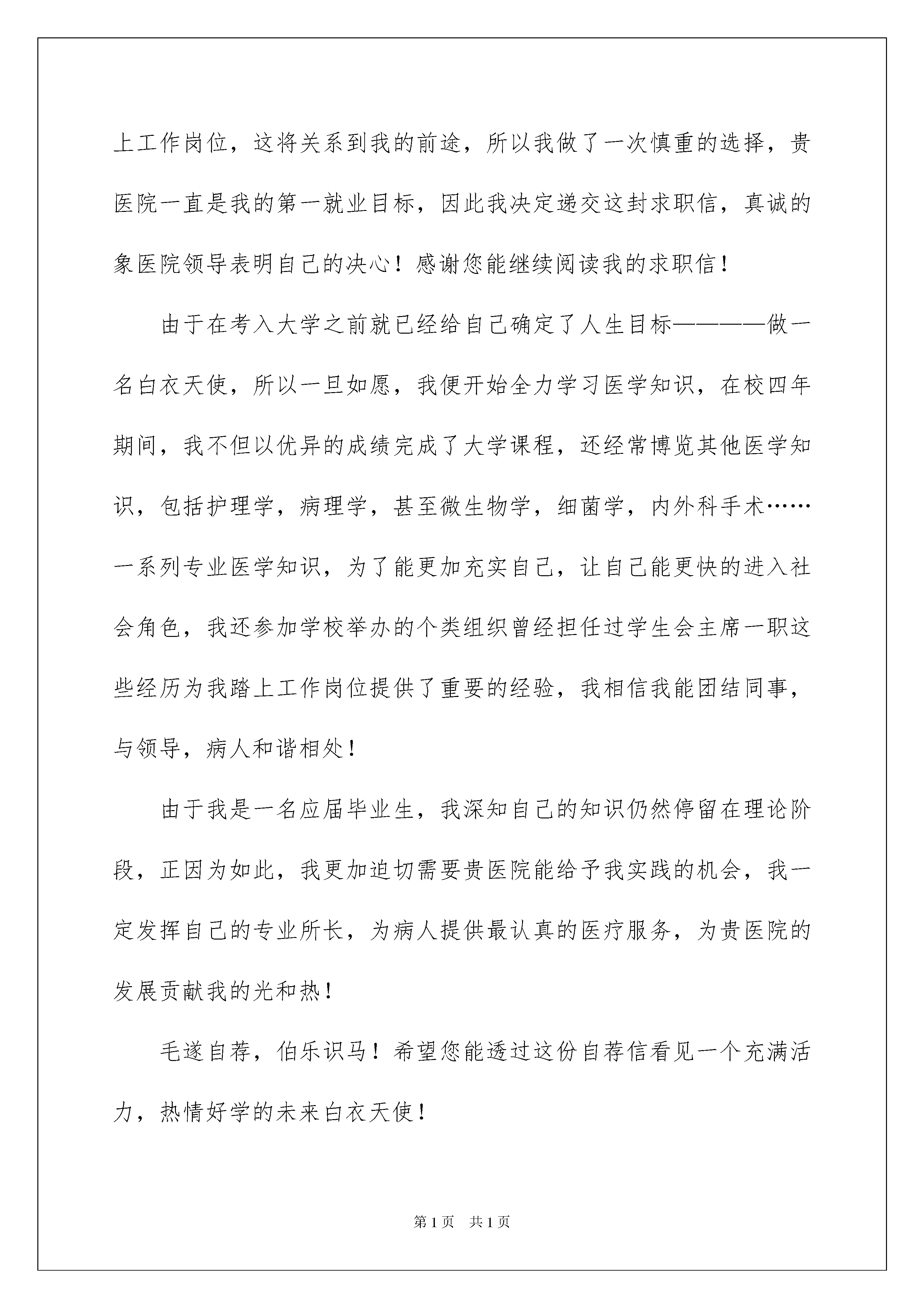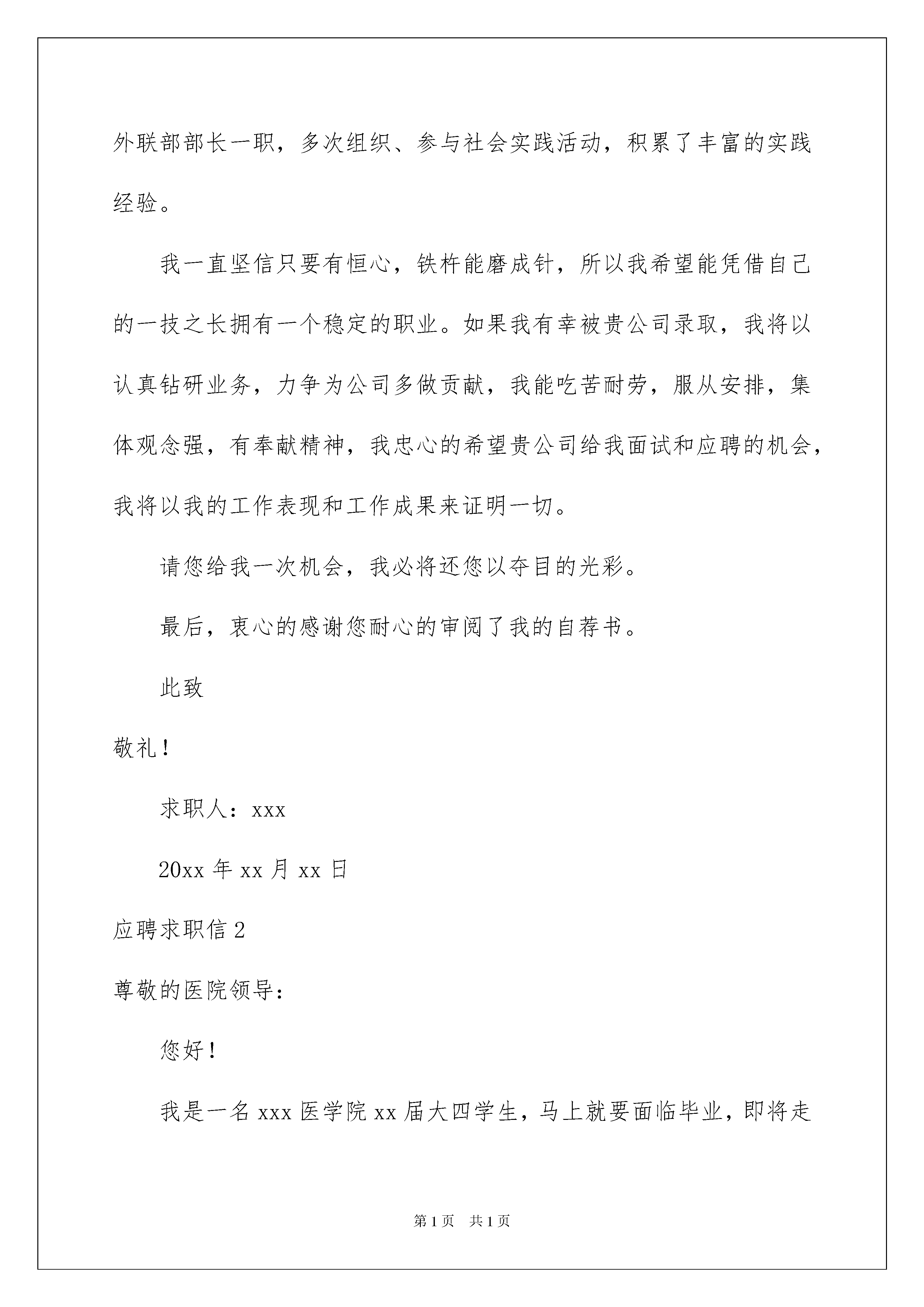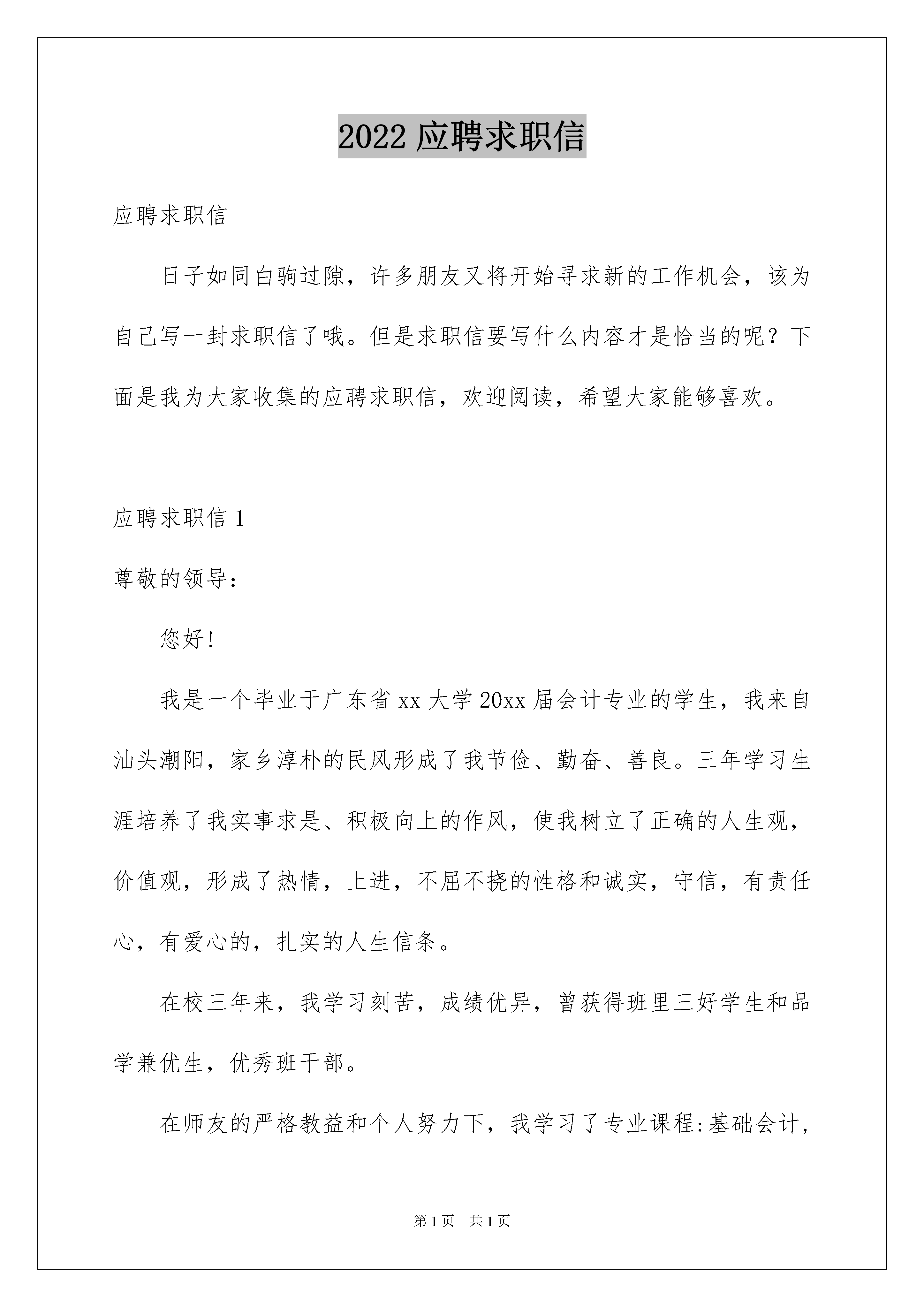 2022应聘求职信应聘求职信日子如同白驹过隙,许多朋友又将开始寻求新的工作机会,该为自己写一封求职信了哦。但是求职信要写什么内容才是恰当的呢?下面是我为大家收集的应聘求职信,欢迎阅读,希望大家能够喜欢。应聘求职信1尊敬的领导:您好!我是一个毕业于广东省xx大学20xx届会计专业的学生,我来自汕头潮阳,家乡淳朴的民风形成了我节俭、勤奋、善良。三年学习生涯培养了我实事求是、积极向上的作风,使我树立了正确的人生观,价值观,形成了热情,上进,不屈不挠的性格和诚实,守信,有责任心,有爱心的,扎实的人生信条。在校三年来,我学习刻苦,成绩优异,曾获得班里三好学生和品学兼优生,优秀班干部。在师友的严格教益和个人努力下,我学习了专业课程:基础会计,商业会计,企业会计,成本会计,具备了扎实的专业基础知识。我能够熟练的操作会计电算化系统软件模块,也熟悉手工记账,在校经老师培训,完整的完成了一套手工记账会计毕业实训,同时也掌握了有关于财务的出纳实务知识,以及统计知识!自入校三年以来,我一直担任于班里班长一职,帮老师分担大小事务的同时,也不断的在自我提高,在这其中,我的能力:接人待事,口才,应变能力,处事能力都在随之不停的提高,加以完善。不仅得到老师的赞扬、认可,也获得同学、校友的好评。我充分利用业余时间广泛的参加社会实践活动。在校三年期间,我参加了学校组织的为期两个月的全校性社会实践:到xx市xxxx印刷有限公司实习,被评为“优秀实习生”,这不但使我的专业技能得到了升华,也使我的管理和组织才能得以发挥和进一步的锻炼,更得到了所属部门领导和老师的肯定和表扬。而且,在xx年的暑假,我利用假期时间参加了,中国移动公司组织的《大学生勤工俭学助学基金》面试,从中脱颖而出,在沟通xxx服务厅开始了为期6个月的兼职,这个经历使我具有了一定的营销经验和社会经历,且业绩斐然。除此之外,在校期间,我担任于学生社团演讲协会副会长一职,营销协会外联部部长一职,多次组织、参与社会实践活动,积累了丰富的实践经验。我一直坚信只要有恒心,铁杵能磨成针,所以我希望能凭借自己的一技之长拥有一个稳定的职业。如果我有幸被贵公司录取,我将以认真钻研业务,力争为公司多做贡献,我能吃苦耐劳,服从安排,集体观念强,有奉献精神,我忠心的希望贵公司给我面试和应聘的机会,我将以我的工作表现和工作成果来证明一切。请您给我一次机会,我必将还您以夺目的光彩。最后,衷心的感谢您耐心的审阅了我的自荐书。此致敬礼!求职人:xxx20xx年xx月xx日应聘求职信2尊敬的医院领导:您好!我是一名xxx医学院xx届大四学生,马上就要面临毕业,即将走上工作岗位,这将关系到我的前途,所以我做了一次慎重的选择,贵医院一直是我的第一就业目标,因此我决定递交这封求职信,真诚的象医院领导表明自己的决心!感谢您能继续阅读我的求职信!由于在考入大学之前就已经给自己确定了人生目标————做一名白衣天使,所以一旦如愿,我便开始全力学习医学知识,在校四年期间,我不但以优异的成绩完成了大学课程,还经常博览其他医学知识,包括护理学,病理学,甚至微生物学,细菌学,内外科手术……一系列专业医学知识,为了能更加充实自己,让自己能更快的进入社会角色,我还参加学校举办的个类组织曾经担任过学生会主席一职这些经历为我踏上工作岗位提供了重要的经验,我相信我能团结同事,与领导,病人和谐相处!由于我是一名应届毕业生,我深知自己的知识仍然停留在理论阶段,正因为如此,我更加迫切需要贵医院能给予我实践的机会,我一定发挥自己的专业所长,为病人提供最认真的医疗服务,为贵医院的发展贡献我的光和热!毛遂自荐,伯乐识马!希望您能透过这份自荐信看见一个充满活力,热情好学的未来白衣天使!此致敬礼求职人:XXX20xx年xx月xx日应聘求职信3尊敬的贵公司领导:您好!我是一名应届本科毕业的女大学生,我愿意应聘并且自认能够胜任贵单位此次的招聘岗位,在此,我首先要感谢您阅读我的求职简历和求职信,这等于是给我介绍自己一个的珍贵机会。下面,权当作是我的求职自我介绍:我在城市长大,熟悉城市的人文环境和工商文明,但高考的发挥失误,使我未能跻身名校,为此我付出了四年的勤奋学习和积极的参加实践锻炼,希望能够弥补青春的第一次遗憾。在东北小城市的这所大学的中文系,我是品学兼优的学生,连续五次获得奖学金以及参加校内学生工作的良好表现可以证明这一点。但我更渴望和更自豪的,是我多次参加实际工作中,工作单位及广大受众群体对我的肯定。截至xxxx年x月,我总计上班的时间已经超过13个月,其中主要是在《北方经济周报》做社会新闻策划和采访记者。《北方经济周报》是一份