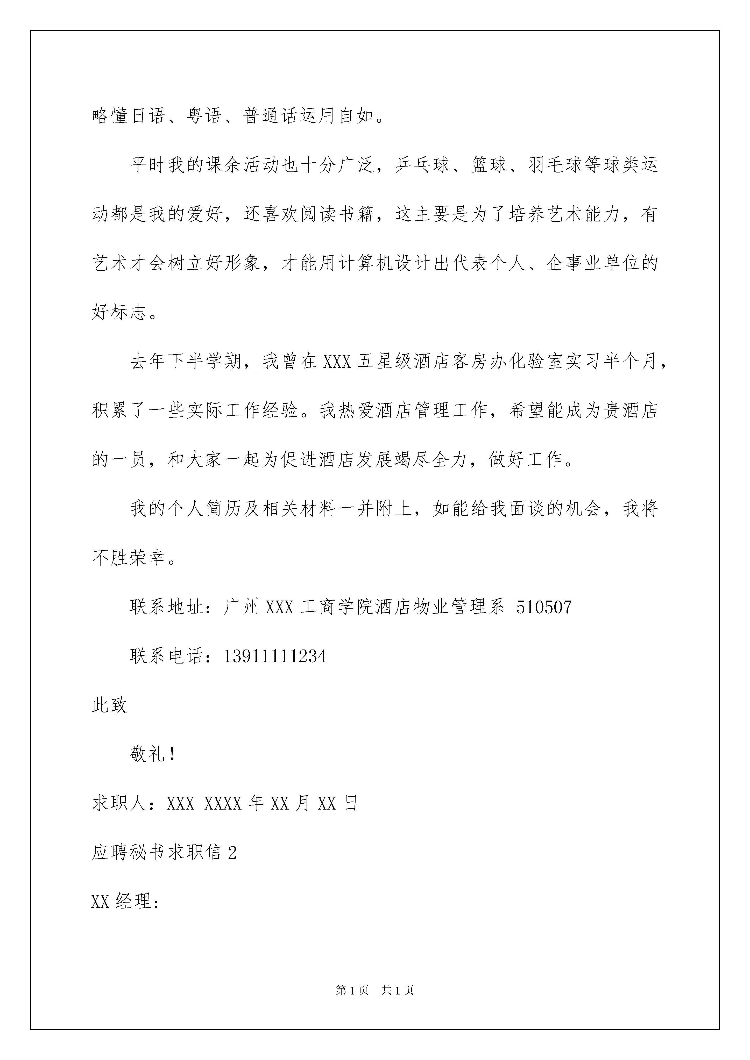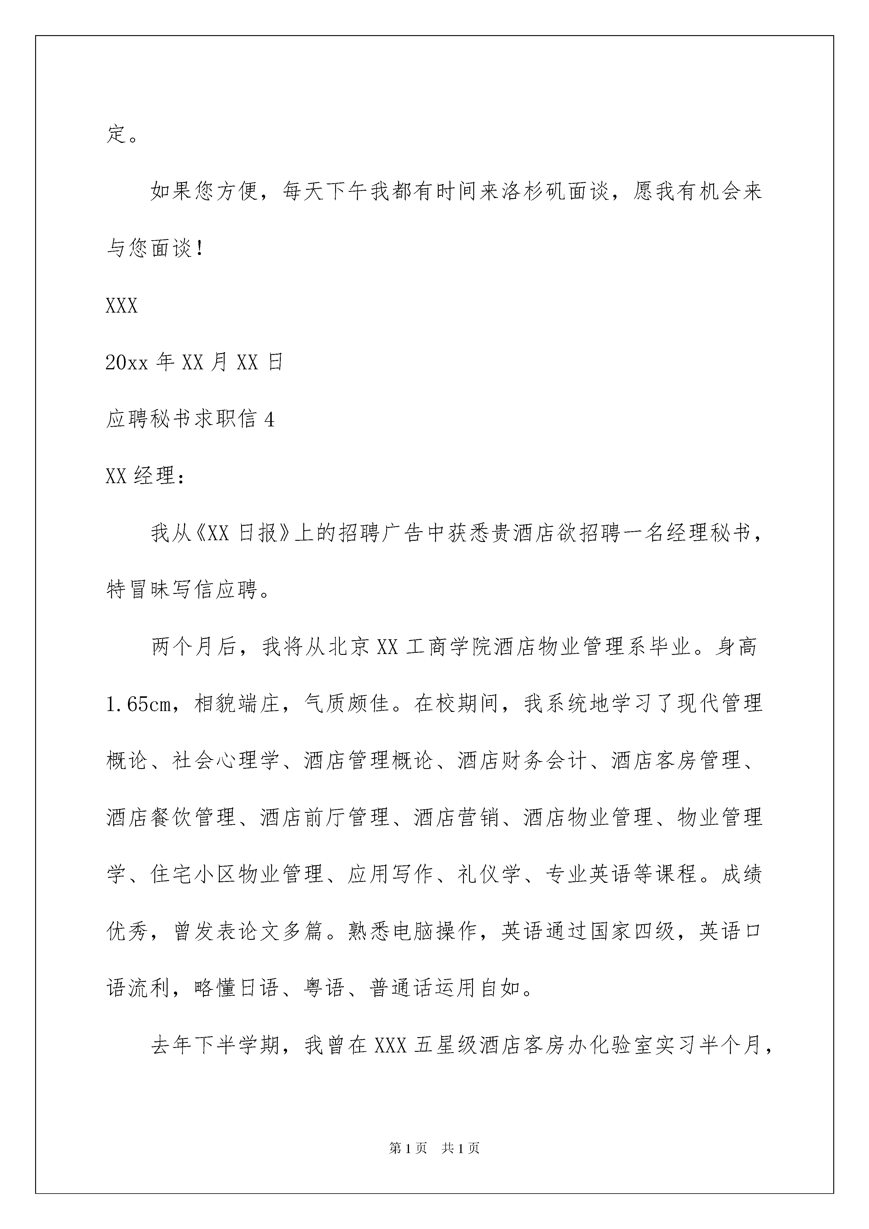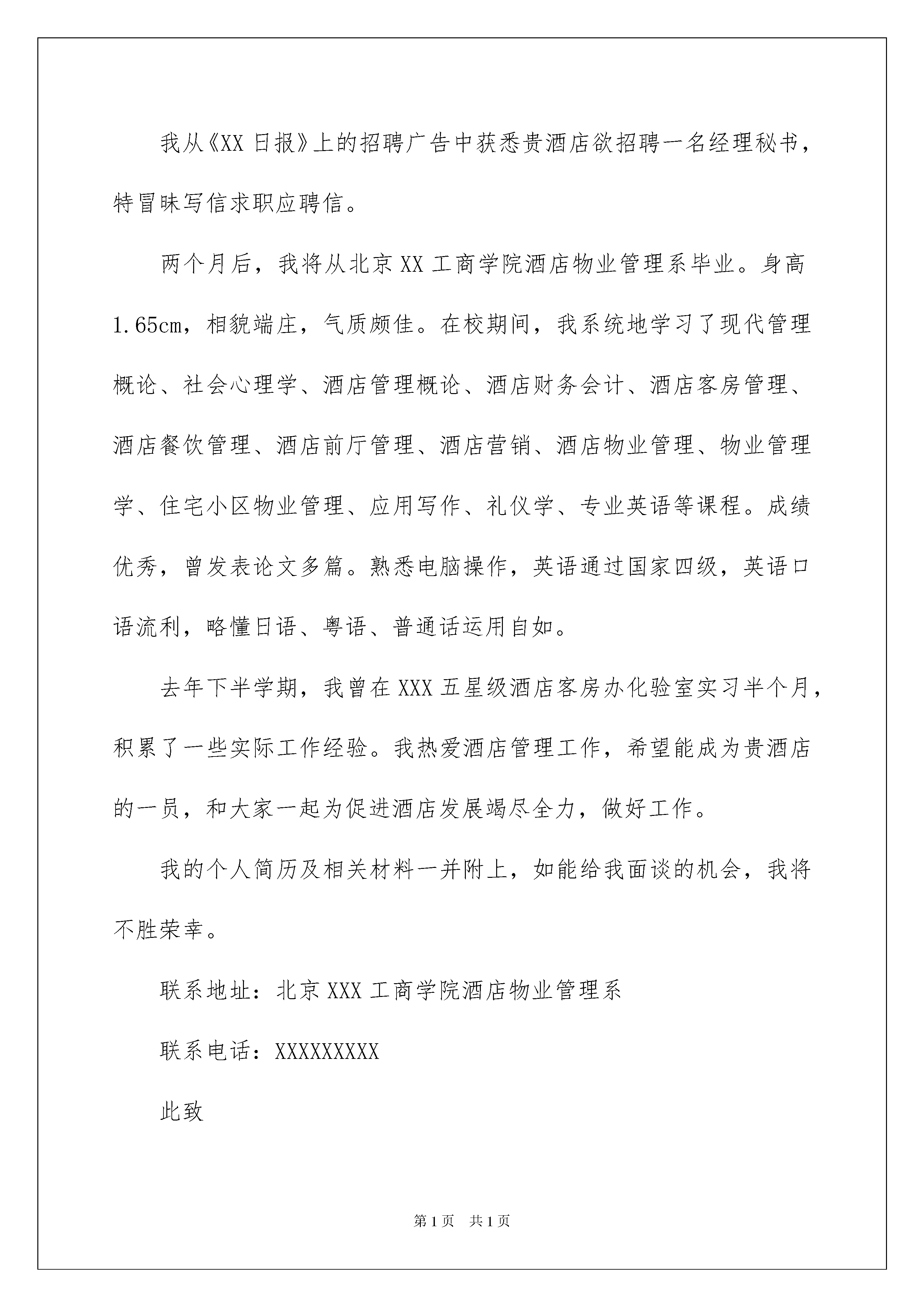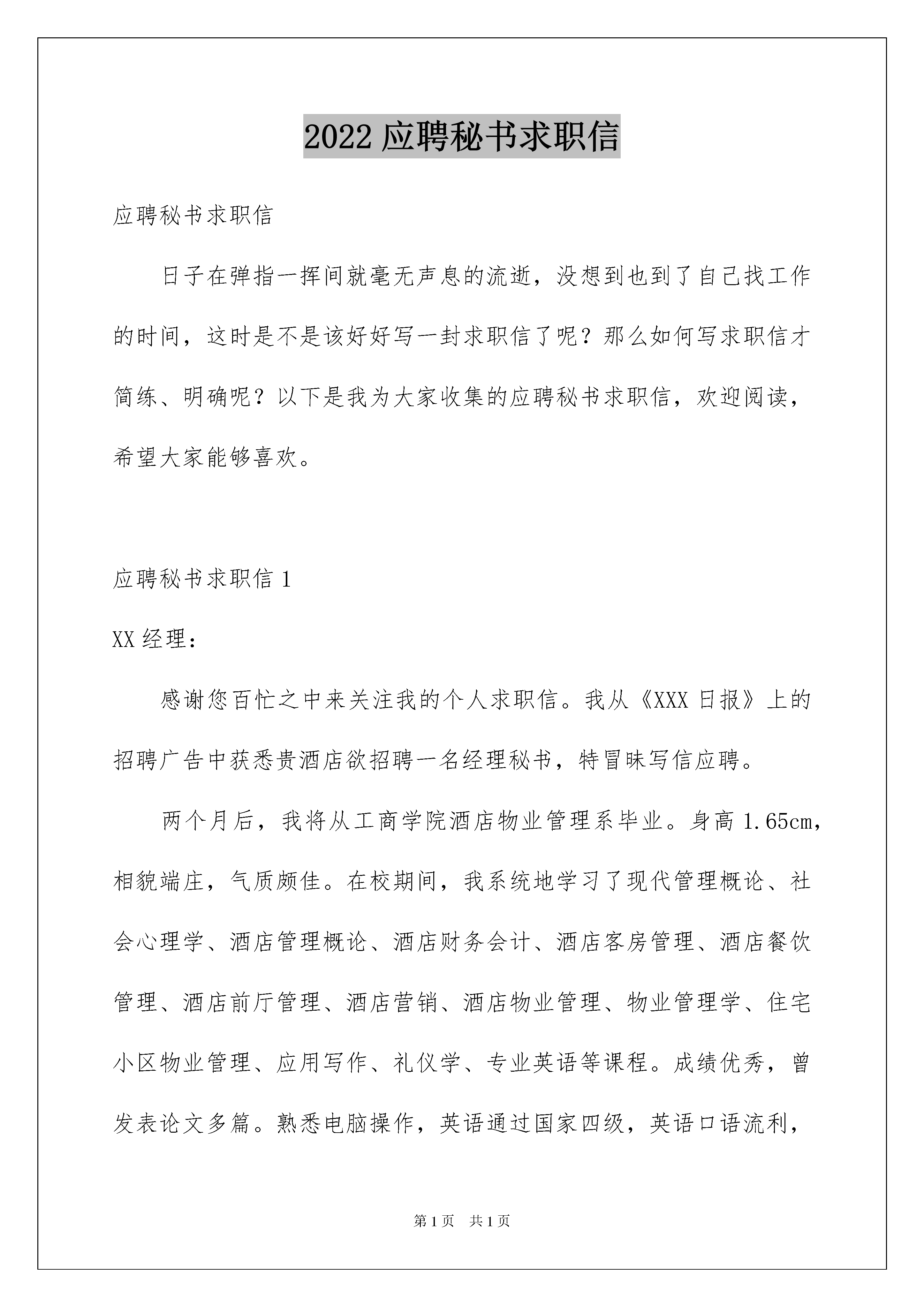 2022应聘秘书求职信应聘秘书求职信日子在弹指一挥间就毫无声息的流逝,没想到也到了自己找工作的时间,这时是不是该好好写一封求职信了呢?那么如何写求职信才简练、明确呢?以下是我为大家收集的应聘秘书求职信,欢迎阅读,希望大家能够喜欢。应聘秘书求职信1XX经理:感谢您百忙之中来关注我的个人求职信。我从《XXX日报》上的招聘广告中获悉贵酒店欲招聘一名经理秘书,特冒昧写信应聘。两个月后,我将从工商学院酒店物业管理系毕业。身高1.65cm,相貌端庄,气质颇佳。在校期间,我系统地学习了现代管理概论、社会心理学、酒店管理概论、酒店财务会计、酒店客房管理、酒店餐饮管理、酒店前厅管理、酒店营销、酒店物业管理、物业管理学、住宅小区物业管理、应用写作、礼仪学、专业英语等课程。成绩优秀,曾发表论文多篇。熟悉电脑操作,英语通过国家四级,英语口语流利,略懂日语、粤语、普通话运用自如。平时我的课余活动也十分广泛,乒乓球、篮球、羽毛球等球类运动都是我的爱好,还喜欢阅读书籍,这主要是为了培养艺术能力,有艺术才会树立好形象,才能用计算机设计出代表个人、企事业单位的好标志。去年下半学期,我曾在XXX五星级酒店客房办化验室实习半个月,积累了一些实际工作经验。我热爱酒店管理工作,希望能成为贵酒店的一员,和大家一起为促进酒店发展竭尽全力,做好工作。我的个人简历及相关材料一并附上,如能给我面谈的机会,我将不胜荣幸。联系地址:广州XXX工商学院酒店物业管理系510507联系电话:13911111234此致敬礼!求职人:XXXXXXX年XX月XX日应聘秘书求职信2XX经理:我从《XX日报》上的招聘广告中获悉贵酒店欲招聘一名经理秘书,特冒昧写信求职应聘信。两个月后,我将从北京XX工商学院酒店物业管理系毕业。身高1.65cm,相貌端庄,气质颇佳。在校期间,我系统地学习了现代管理概论、社会心理学、酒店管理概论、酒店财务会计、酒店客房管理、酒店餐饮管理、酒店前厅管理、酒店营销、酒店物业管理、物业管理学、住宅小区物业管理、应用写作、礼仪学、专业英语等课程。成绩优秀,曾发表论文多篇。熟悉电脑操作,英语通过国家四级,英语口语流利,略懂日语、粤语、普通话运用自如。去年下半学期,我曾在XXX五星级酒店客房办化验室实习半个月,积累了一些实际工作经验。我热爱酒店管理工作,希望能成为贵酒店的一员,和大家一起为促进酒店发展竭尽全力,做好工作。我的个人简历及相关材料一并附上,如能给我面谈的机会,我将不胜荣幸。联系地址:北京XXX工商学院酒店物业管理系联系电话:XXXXXXXXX此致敬礼!求职人:xxx日期:20xx年xx月xx日应聘秘书求职信3尊敬的莱文先生:爱迪思·温特丝小姐告诉我贵公司缺一位秘书,我想申请这个职位。我知道你需要一位速写很快,又能处理大量信件的秘书。我毕业于富特黑专科学校,专学速写。毕业后先后在一家干货零售公司、一家保险公司做过秘书。我的书写速度每分钟145个字。在我现在的工作中,我每天要处理40到60封信件。不论是富特黑专科学校求学时还是在现在的工作中,我都训练自己不用他人指导而能独立处理日常信件。我在现在的西南人寿保险公司的工作也干得不错。但我最近刚拿了学位,想干一份有挑战性的收获不菲的工作。爱迪思·温特丝小姐对工作的热情更让我确信我会喜欢这份工作。内附的简历有助您做决定。如果您方便,每天下午我都有时间来洛杉矶面谈,愿我有机会来与您面谈!XXX20xx年XX月XX日应聘秘书求职信4XX经理:我从《XX日报》上的招聘广告中获悉贵酒店欲招聘一名经理秘书,特冒昧写信应聘。两个月后,我将从北京XX工商学院酒店物业管理系毕业。身高1.65cm,相貌端庄,气质颇佳。在校期间,我系统地学习了现代管理概论、社会心理学、酒店管理概论、酒店财务会计、酒店客房管理、酒店餐饮管理、酒店前厅管理、酒店营销、酒店物业管理、物业管理学、住宅小区物业管理、应用写作、礼仪学、专业英语等课程。成绩优秀,曾发表论文多篇。熟悉电脑操作,英语通过国家四级,英语口语流利,略懂日语、粤语、普通话运用自如。去年下半学期,我曾在XXX五星级酒店客房办化验室实习半个月,积累了一些实际工作经验。我热爱酒店管理工作,希望能成为贵酒店的一员,和大家一起为促进酒店发展竭尽全力,做好工作。我的个人简历及相关材料一并附上,如能给我面谈的机会,我将不胜荣幸。求职人:XXX联系电话:XXX联系地址:XXXXXXXX年XX月XX日应聘秘书求职信5XX经理:我从《XXX日报》上的招聘广告中获悉贵酒店欲招聘一名经理秘书,特冒昧写信应聘。两个月后,我将从工商学院酒店物业管理系毕业。身高1.65cm,相貌
