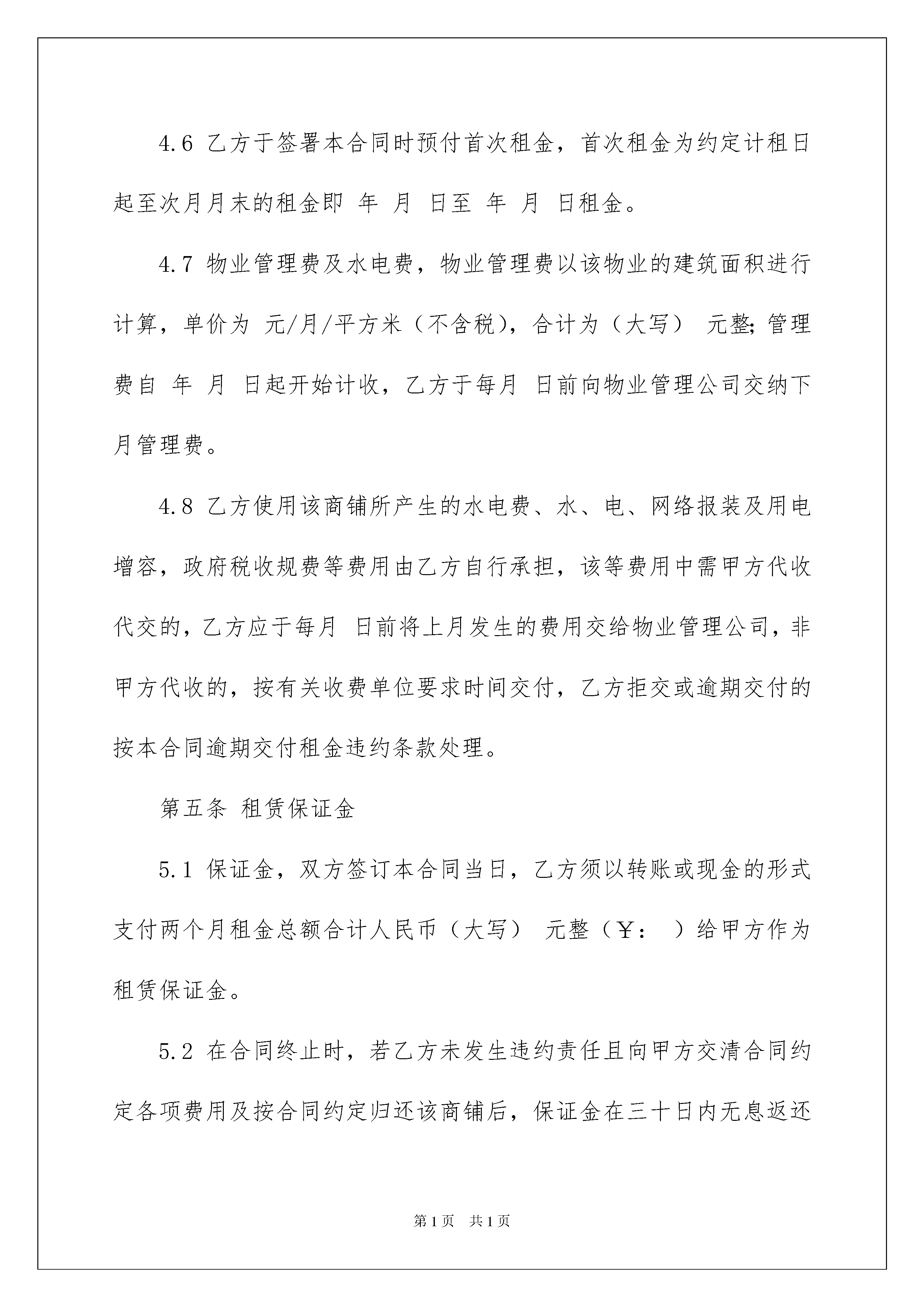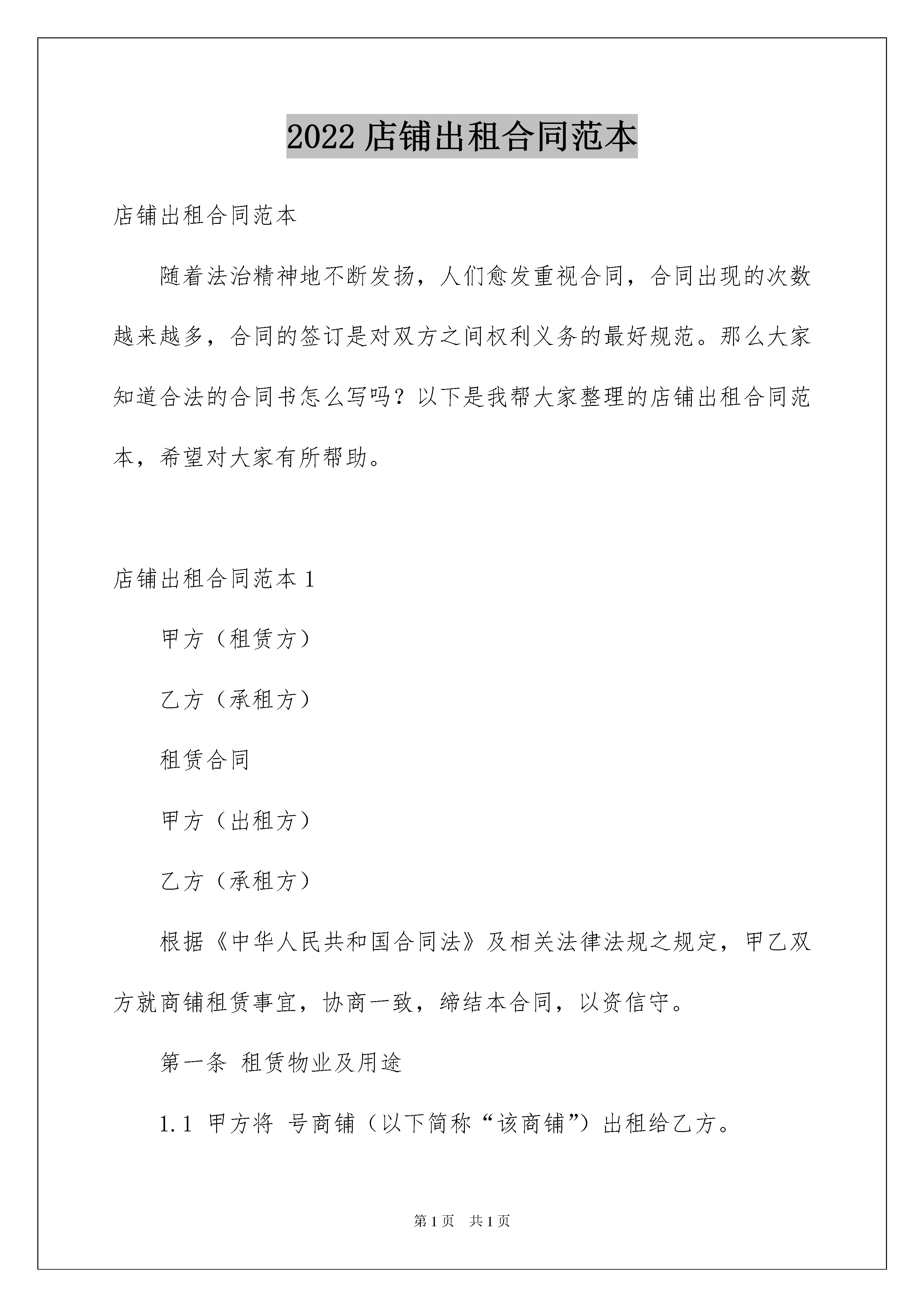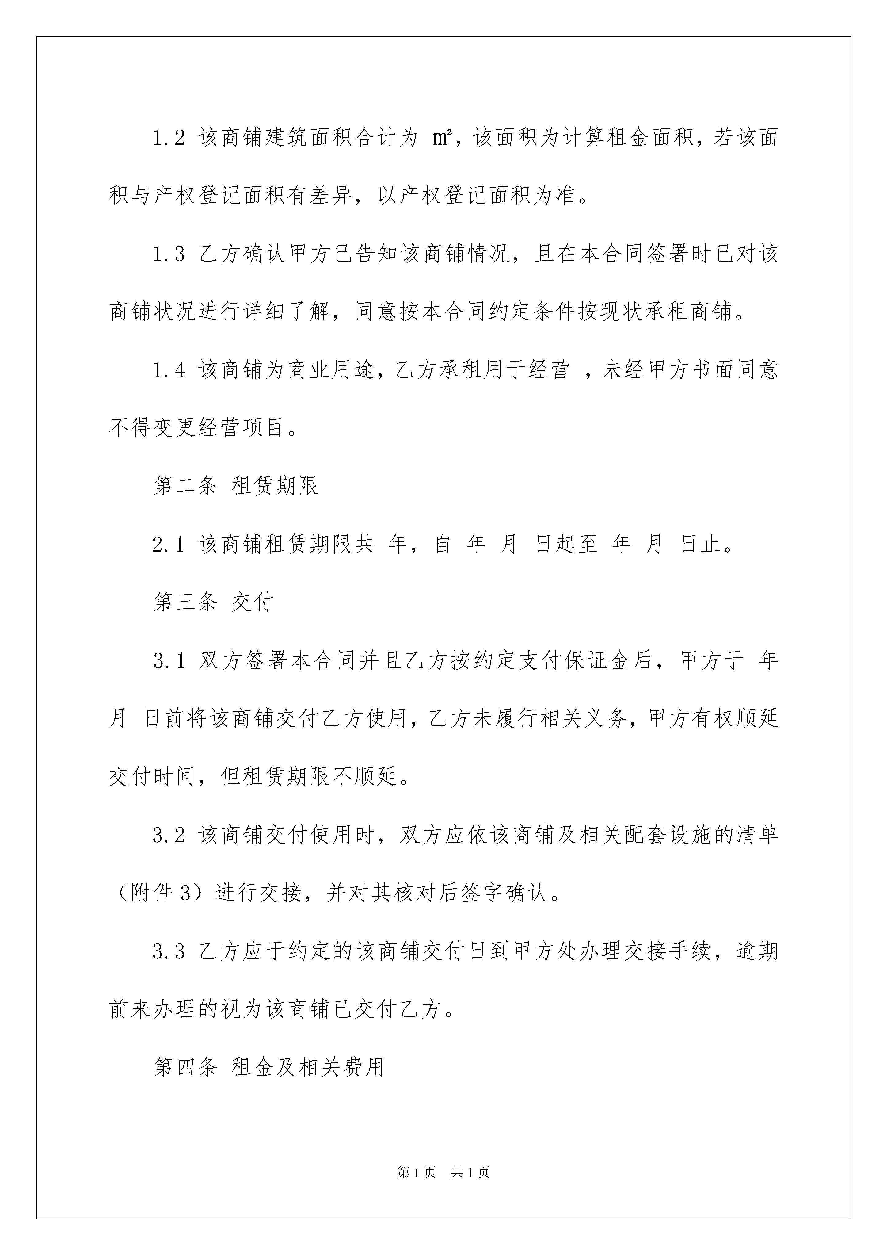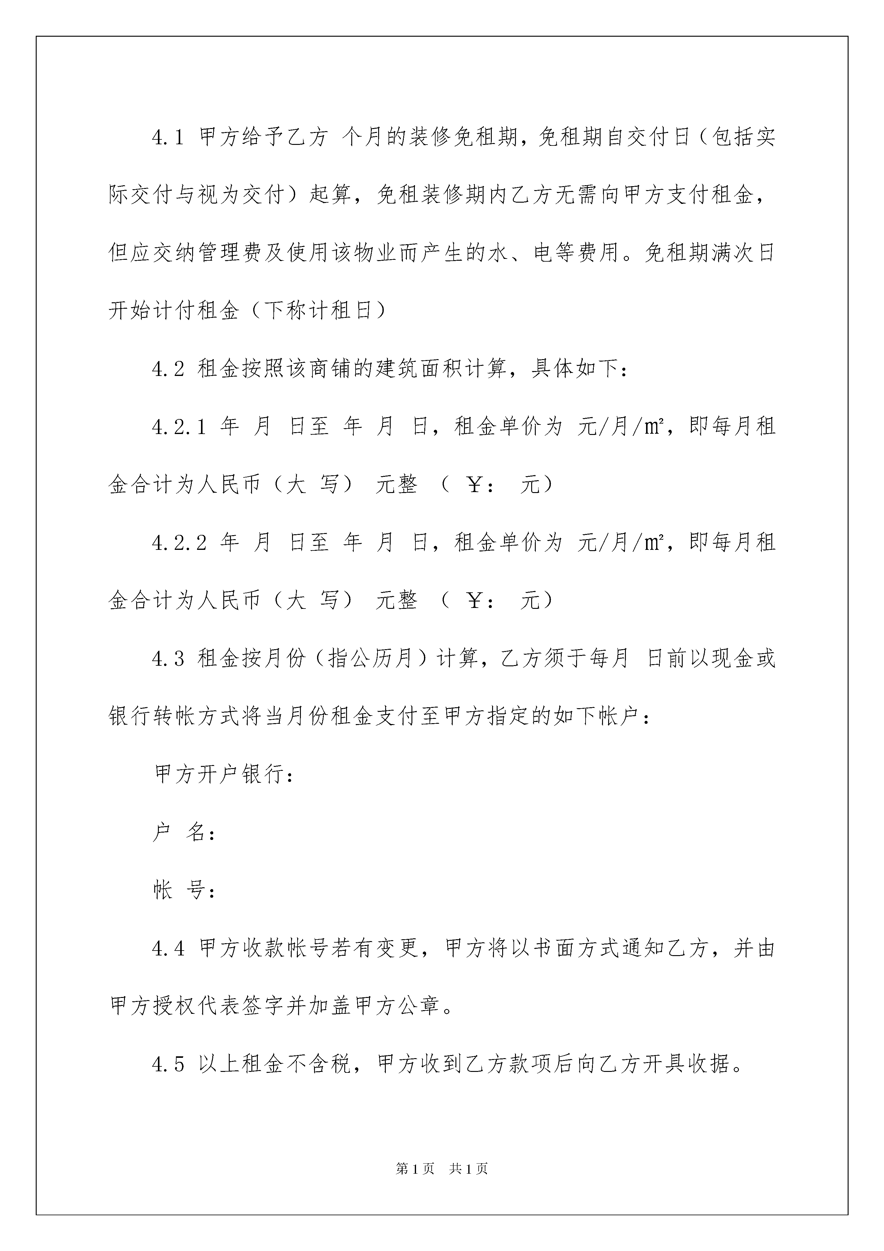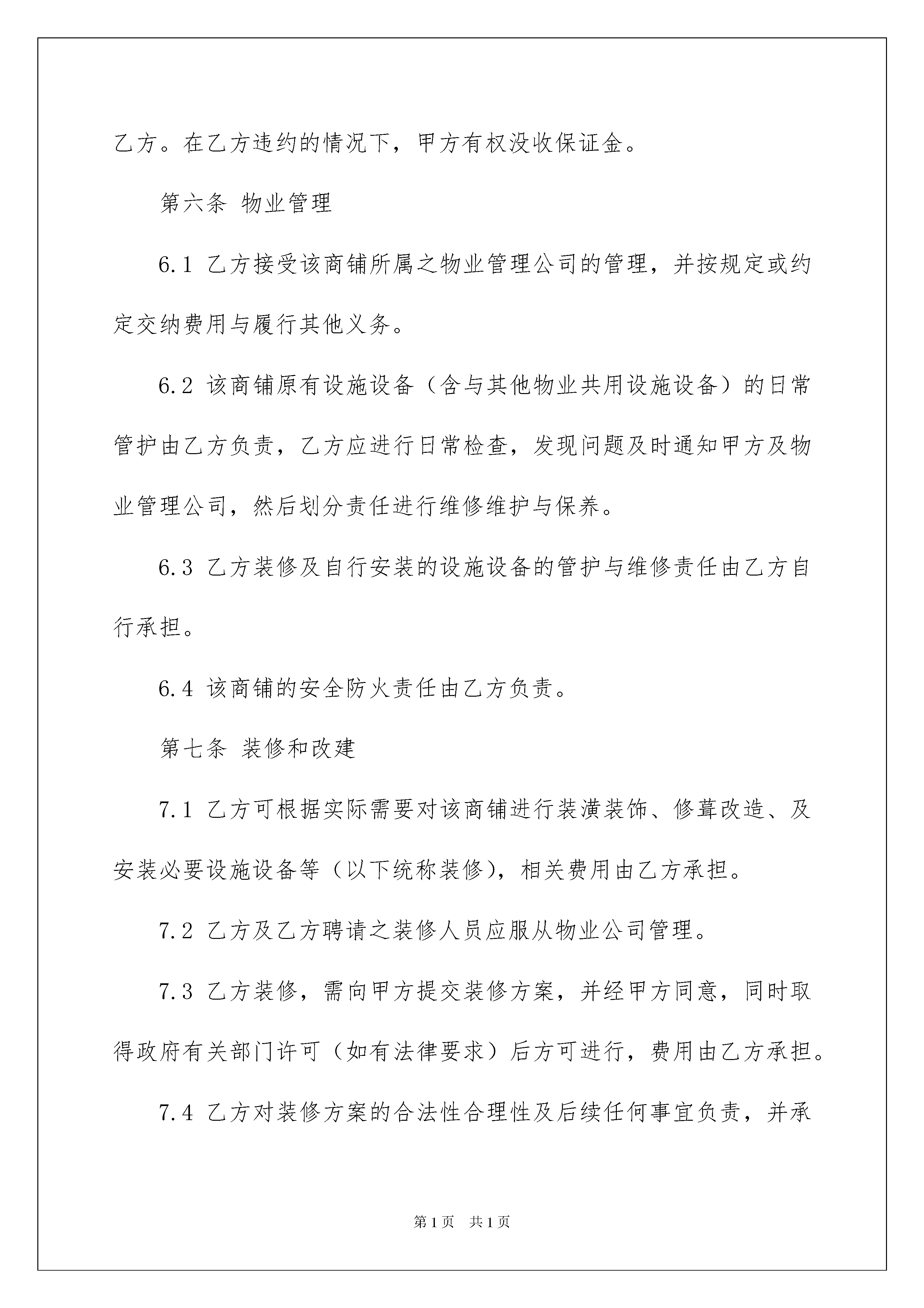 2022店铺出租合同范本店铺出租合同范本随着法治精神地不断发扬,人们愈发重视合同,合同出现的次数越来越多,合同的签订是对双方之间权利义务的最好规范。那么大家知道合法的合同书怎么写吗?以下是我帮大家整理的店铺出租合同范本,希望对大家有所帮助。店铺出租合同范本1甲方(租赁方)乙方(承租方)租赁合同甲方(出租方)乙方(承租方)根据《中华人民共和国合同法》及相关法律法规之规定,甲乙双方就商铺租赁事宜,协商一致,缔结本合同,以资信守。第一条租赁物业及用途1.1甲方将号商铺(以下简称“该商铺”)出租给乙方。1.2该商铺建筑面积合计为㎡,该面积为计算租金面积,若该面积与产权登记面积有差异,以产权登记面积为准。1.3乙方确认甲方已告知该商铺情况,且在本合同签署时已对该商铺状况进行详细了解,同意按本合同约定条件按现状承租商铺。1.4该商铺为商业用途,乙方承租用于经营,未经甲方书面同意不得变更经营项目。第二条租赁期限2.1该商铺租赁期限共年,自年月日起至年月日止。第三条交付3.1双方签署本合同并且乙方按约定支付保证金后,甲方于年月日前将该商铺交付乙方使用,乙方未履行相关义务,甲方有权顺延交付时间,但租赁期限不顺延。3.2该商铺交付使用时,双方应依该商铺及相关配套设施的清单(附件3)进行交接,并对其核对后签字确认。3.3乙方应于约定的该商铺交付日到甲方处办理交接手续,逾期前来办理的视为该商铺已交付乙方。第四条租金及相关费用4.1甲方给予乙方个月的装修免租期,免租期自交付日(包括实际交付与视为交付)起算,免租装修期内乙方无需向甲方支付租金,但应交纳管理费及使用该物业而产生的水、电等费用。免租期满次日开始计付租金(下称计租日)4.2租金按照该商铺的建筑面积计算,具体如下:4.2.1年月日至年月日,租金单价为元/月/㎡,即每月租金合计为人民币(大写)元整(¥:元)4.2.2年月日至年月日,租金单价为元/月/㎡,即每月租金合计为人民币(大写)元整(¥:元)4.3租金按月份(指公历月)计算,乙方须于每月日前以现金或银行转帐方式将当月份租金支付至甲方指定的如下帐户:甲方开户银行:户名:帐号:4.4甲方收款帐号若有变更,甲方将以书面方式通知乙方,并由甲方授权代表签字并加盖甲方公章。4.5以上租金不含税,甲方收到乙方款项后向乙方开具收据。4.6乙方于签署本合同时预付首次租金,首次租金为约定计租日起至次月月末的租金即年月日至年月日租金。4.7物业管理费及水电费,物业管理费以该物业的建筑面积进行计算,单价为元/月/平方米(不含税),合计为(大写)元整;管理费自年月日起开始计收,乙方于每月日前向物业管理公司交纳下月管理费。4.8乙方使用该商铺所产生的水电费、水、电、网络报装及用电增容,政府税收规费等费用由乙方自行承担,该等费用中需甲方代收代交的,乙方应于每月日前将上月发生的费用交给物业管理公司,非甲方代收的,按有关收费单位要求时间交付,乙方拒交或逾期交付的按本合同逾期交付租金违约条款处理。第五条租赁保证金5.1保证金,双方签订本合同当日,乙方须以转账或现金的形式支付两个月租金总额合计人民币(大写)元整(¥:)给甲方作为租赁保证金。5.2在合同终止时,若乙方未发生违约责任且向甲方交清合同约定各项费用及按合同约定归还该商铺后,保证金在三十日内无息返还乙方。在乙方违约的情况下,甲方有权没收保证金。第六条物业管理6.1乙方接受该商铺所属之物业管理公司的管理,并按规定或约定交纳费用与履行其他义务。6.2该商铺原有设施设备(含与其他物业共用设施设备)的日常管护由乙方负责,乙方应进行日常检查,发现问题及时通知甲方及物业管理公司,然后划分责任进行维修维护与保养。6.3乙方装修及自行安装的设施设备的管护与维修责任由乙方自行承担。6.4该商铺的安全防火责任由乙方负责。第七条装修和改建7.1乙方可根据实际需要对该商铺进行装潢装饰、修葺改造、及安装必要设施设备等(以下统称装修),相关费用由乙方承担。7.2乙方及乙方聘请之装修人员应服从物业公司管理。7.3乙方装修,需向甲方提交装修方案,并经甲方同意,同时取得政府有关部门许可(如有法律要求)后方可进行,费用由乙方承担。7.4乙方对装修方案的合法性合理性及后续任何事宜负责,并承担相应责任;甲方同意乙方装修方案,并不代表其同意对该装修方案产生的任何纠纷、损害及损失等负责或承担责任,因乙方装修产生的纠纷或责任由乙方独立承担。7.5乙方的装修作业不得影响该商铺整体建筑的框架结构,不得影响其安全性。否则由乙方负责赔偿所引致的一切损失,并由其承担相关的法律责任。7.6装修作业应尽量封闭作业,装修过程中不