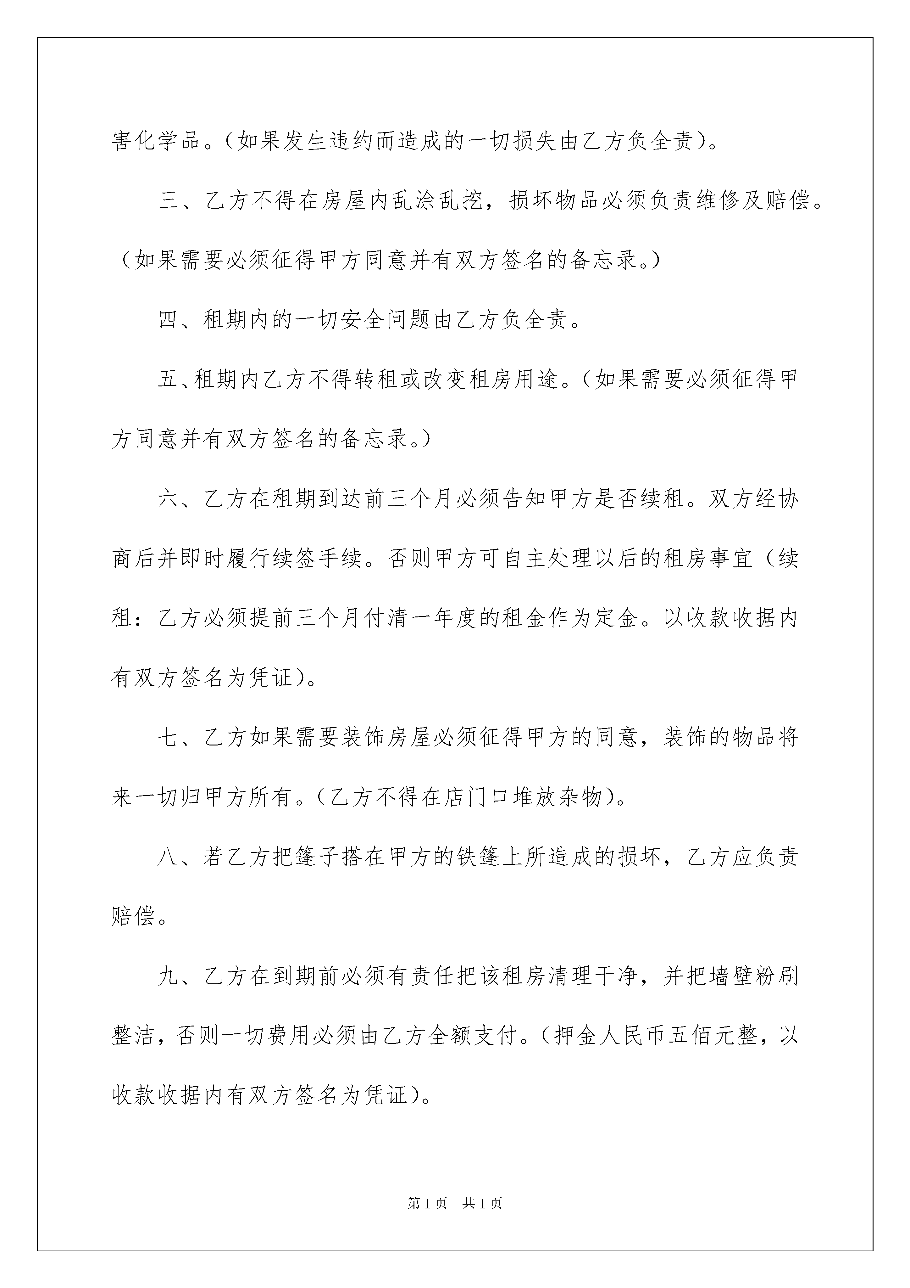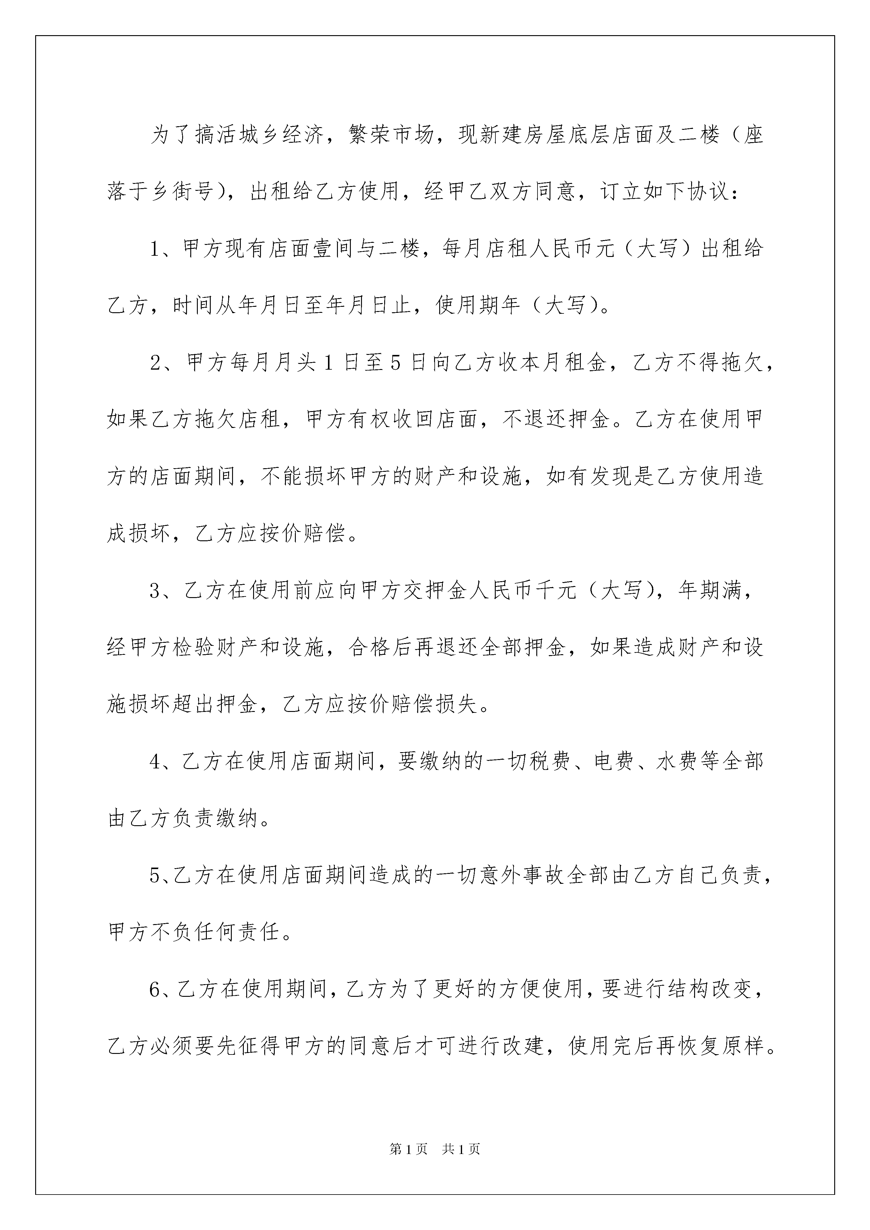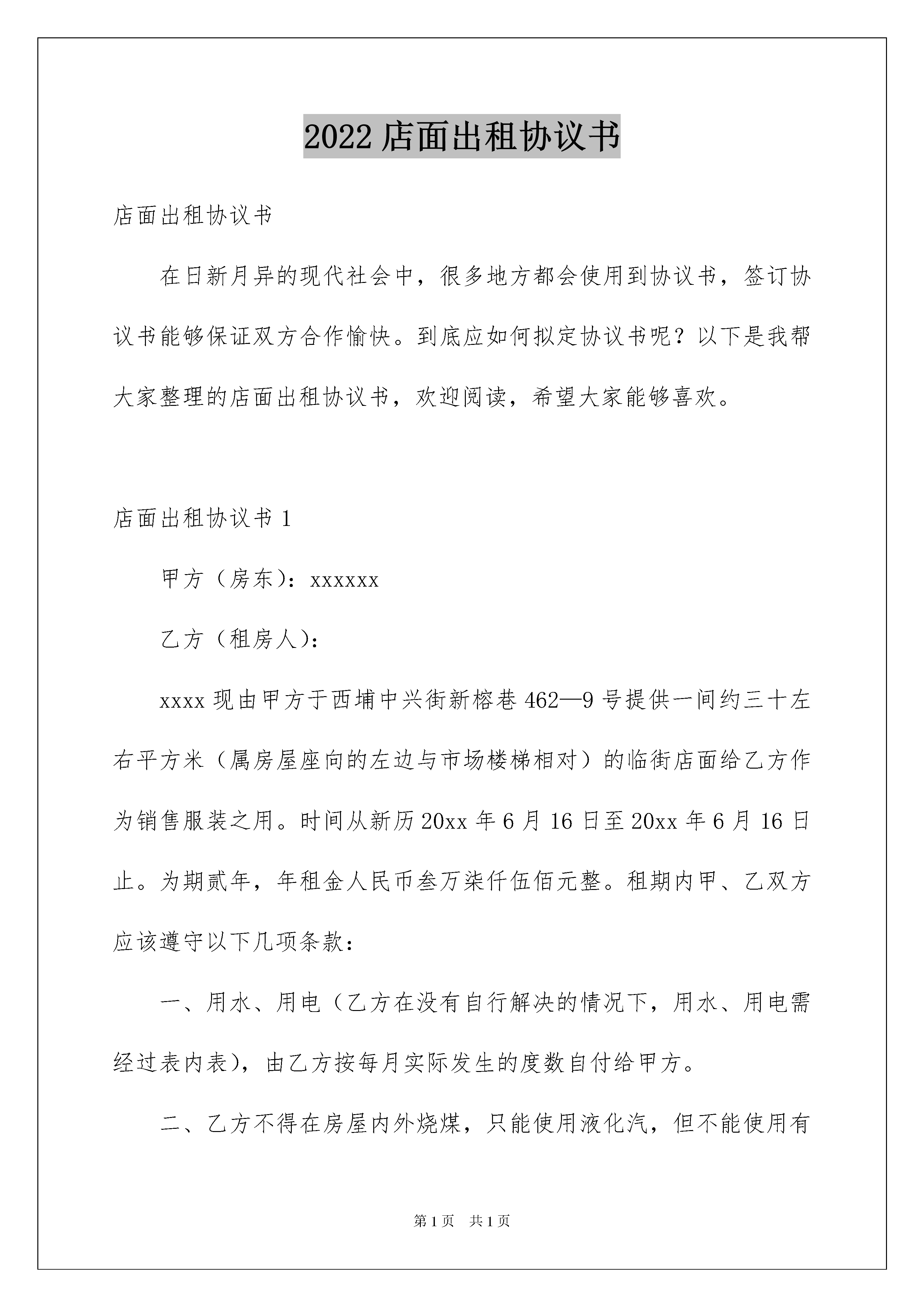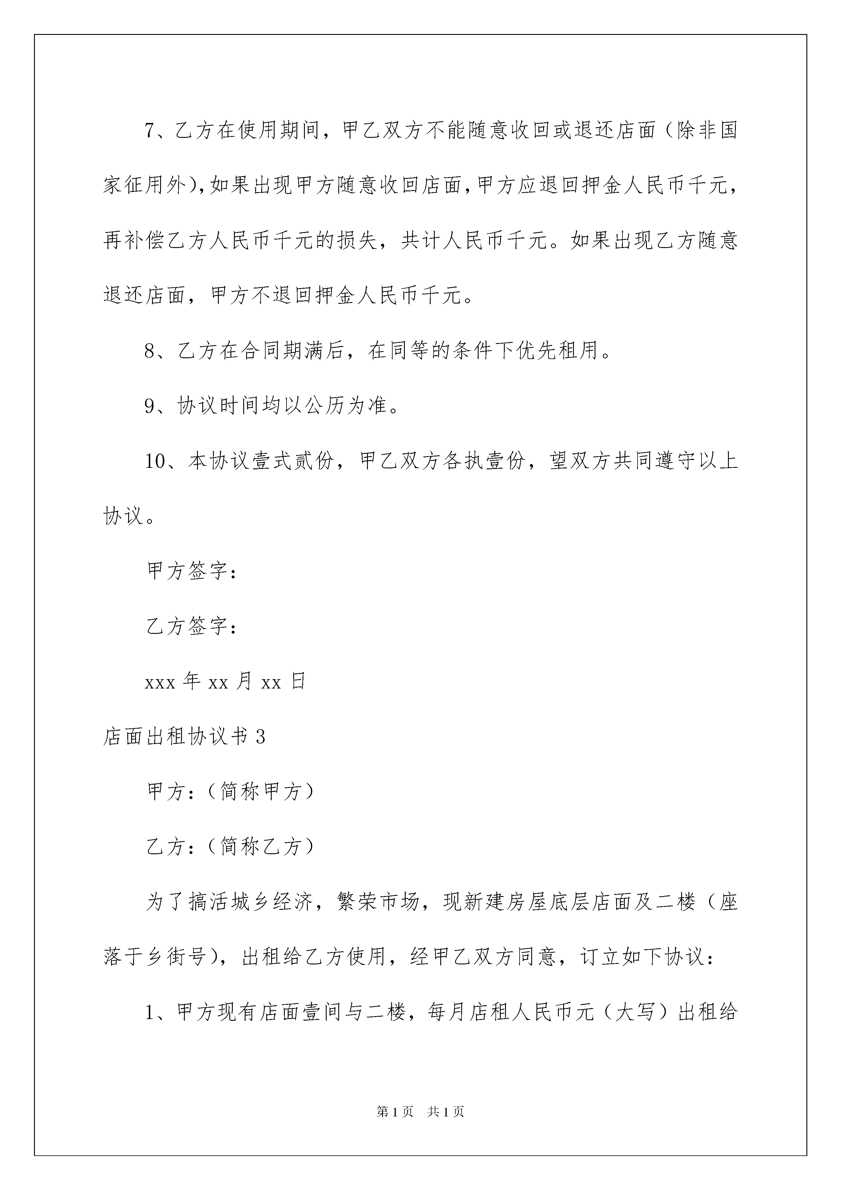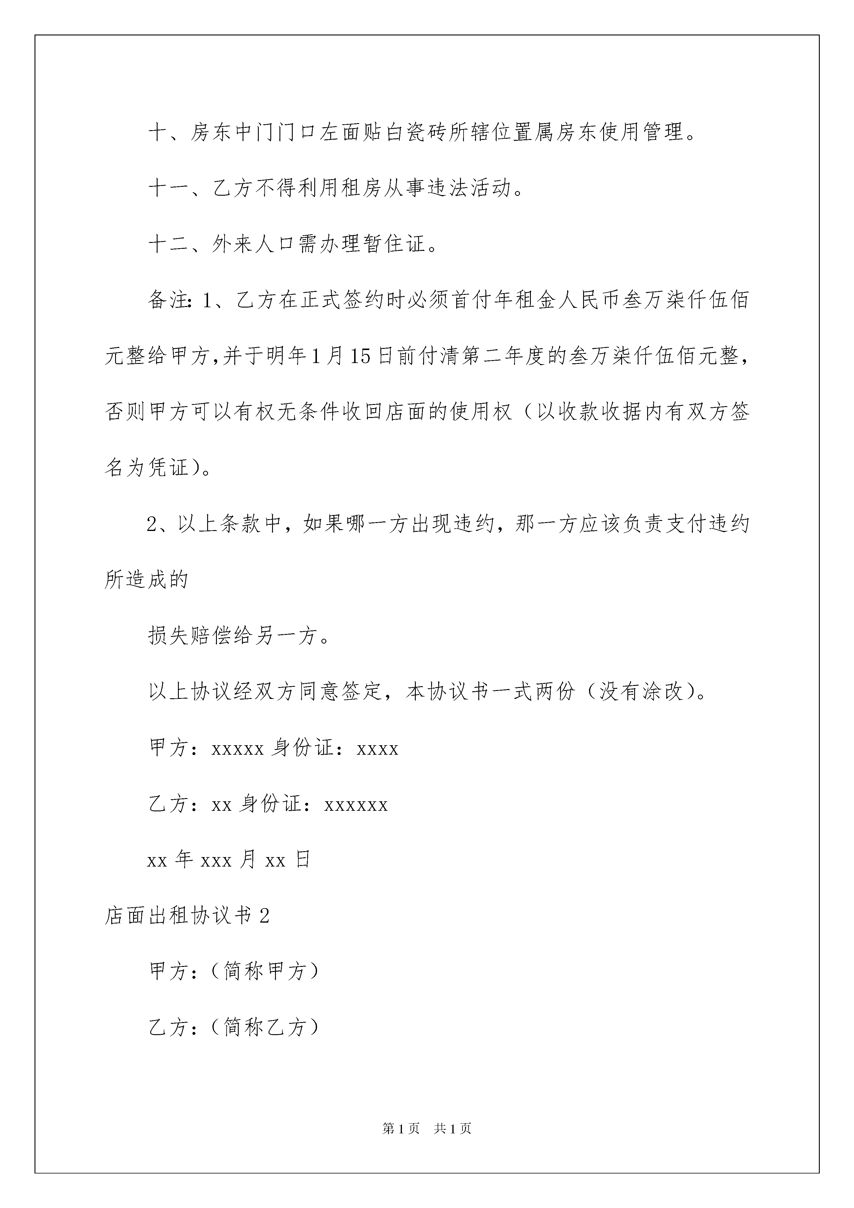 2022店面出租协议书店面出租协议书在日新月异的现代社会中,很多地方都会使用到协议书,签订协议书能够保证双方合作愉快。到底应如何拟定协议书呢?以下是我帮大家整理的店面出租协议书,欢迎阅读,希望大家能够喜欢。店面出租协议书1甲方(房东):xxxxxx乙方(租房人):xxxx现由甲方于西埔中兴街新榕巷462—9号提供一间约三十左右平方米(属房屋座向的左边与市场楼梯相对)的临街店面给乙方作为销售服装之用。时间从新历20xx年6月16日至20xx年6月16日止。为期贰年,年租金人民币叁万柒仟伍佰元整。租期内甲、乙双方应该遵守以下几项条款:一、用水、用电(乙方在没有自行解决的情况下,用水、用电需经过表内表),由乙方按每月实际发生的度数自付给甲方。二、乙方不得在房屋内外烧煤,只能使用液化汽,但不能使用有害化学品。(如果发生违约而造成的一切损失由乙方负全责)。三、乙方不得在房屋内乱涂乱挖,损坏物品必须负责维修及赔偿。(如果需要必须征得甲方同意并有双方签名的备忘录。)四、租期内的一切安全问题由乙方负全责。五、租期内乙方不得转租或改变租房用途。(如果需要必须征得甲方同意并有双方签名的备忘录。)六、乙方在租期到达前三个月必须告知甲方是否续租。双方经协商后并即时履行续签手续。否则甲方可自主处理以后的租房事宜(续租:乙方必须提前三个月付清一年度的租金作为定金。以收款收据内有双方签名为凭证)。七、乙方如果需要装饰房屋必须征得甲方的同意,装饰的物品将来一切归甲方所有。(乙方不得在店门口堆放杂物)。八、若乙方把篷子搭在甲方的铁篷上所造成的损坏,乙方应负责赔偿。九、乙方在到期前必须有责任把该租房清理干净,并把墙壁粉刷整洁,否则一切费用必须由乙方全额支付。(押金人民币五佰元整,以收款收据内有双方签名为凭证)。十、房东中门门口左面贴白瓷砖所辖位置属房东使用管理。十一、乙方不得利用租房从事违法活动。十二、外来人口需办理暂住证。备注:1、乙方在正式签约时必须首付年租金人民币叁万柒仟伍佰元整给甲方,并于明年1月15日前付清第二年度的叁万柒仟伍佰元整,否则甲方可以有权无条件收回店面的使用权(以收款收据内有双方签名为凭证)。2、以上条款中,如果哪一方出现违约,那一方应该负责支付违约所造成的损失赔偿给另一方。以上协议经双方同意签定,本协议书一式两份(没有涂改)。甲方:xxxxx身份证:xxxx乙方:xx身份证:xxxxxxxx年xxx月xx日店面出租协议书2甲方:(简称甲方)乙方:(简称乙方)为了搞活城乡经济,繁荣市场,现新建房屋底层店面及二楼(座落于乡街号),出租给乙方使用,经甲乙双方同意,订立如下协议:1、甲方现有店面壹间与二楼,每月店租人民币元(大写)出租给乙方,时间从年月日至年月日止,使用期年(大写)。2、甲方每月月头1日至5日向乙方收本月租金,乙方不得拖欠,如果乙方拖欠店租,甲方有权收回店面,不退还押金。乙方在使用甲方的店面期间,不能损坏甲方的财产和设施,如有发现是乙方使用造成损坏,乙方应按价赔偿。3、乙方在使用前应向甲方交押金人民币千元(大写),年期满,经甲方检验财产和设施,合格后再退还全部押金,如果造成财产和设施损坏超出押金,乙方应按价赔偿损失。4、乙方在使用店面期间,要缴纳的一切税费、电费、水费等全部由乙方负责缴纳。5、乙方在使用店面期间造成的一切意外事故全部由乙方自己负责,甲方不负任何责任。6、乙方在使用期间,乙方为了更好的方便使用,要进行结构改变,乙方必须要先征得甲方的同意后才可进行改建,使用完后再恢复原样。7、乙方在使用期间,甲乙双方不能随意收回或退还店面(除非国家征用外),如果出现甲方随意收回店面,甲方应退回押金人民币千元,再补偿乙方人民币千元的损失,共计人民币千元。如果出现乙方随意退还店面,甲方不退回押金人民币千元。8、乙方在合同期满后,在同等的条件下优先租用。9、协议时间均以公历为准。10、本协议壹式贰份,甲乙双方各执壹份,望双方共同遵守以上协议。甲方签字:乙方签字:xxx年xx月xx日店面出租协议书3甲方:(简称甲方)乙方:(简称乙方)为了搞活城乡经济,繁荣市场,现新建房屋底层店面及二楼(座落于乡街号),出租给乙方使用,经甲乙双方同意,订立如下协议:1、甲方现有店面壹间与二楼,每月店租人民币元(大写)出租给乙方,时间从xxxx年xx月xx日至xxxx年xx月xx日止,使用期年(大写)。2、甲方每月月头1日至5日向乙方收本月租金,乙方不得拖欠,如果乙方拖欠店租,甲方有权收回店面,不退还押金。乙方在使用甲方的店面期间,不能损坏甲方的财产和设施,如有发现是乙方使用造成损坏,乙方应按价赔偿。3、乙