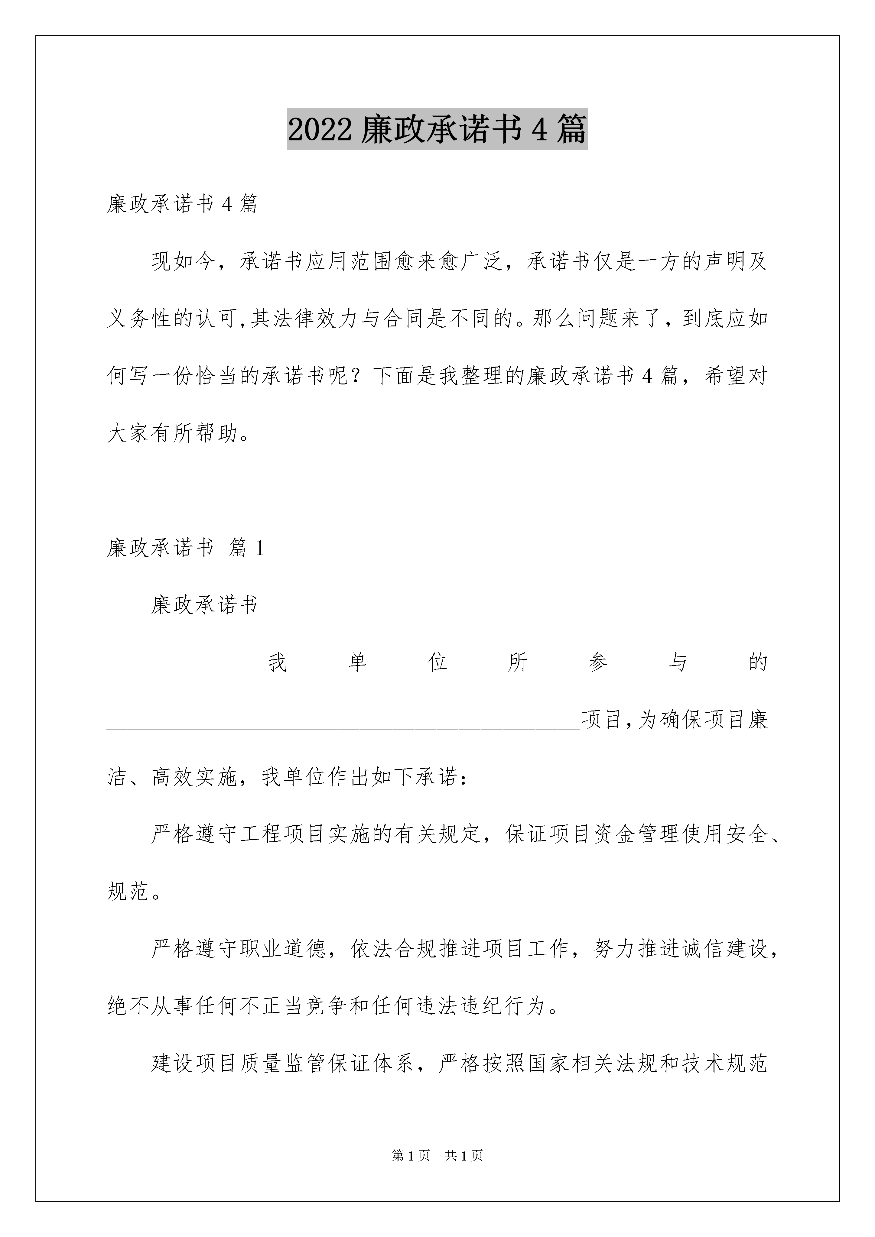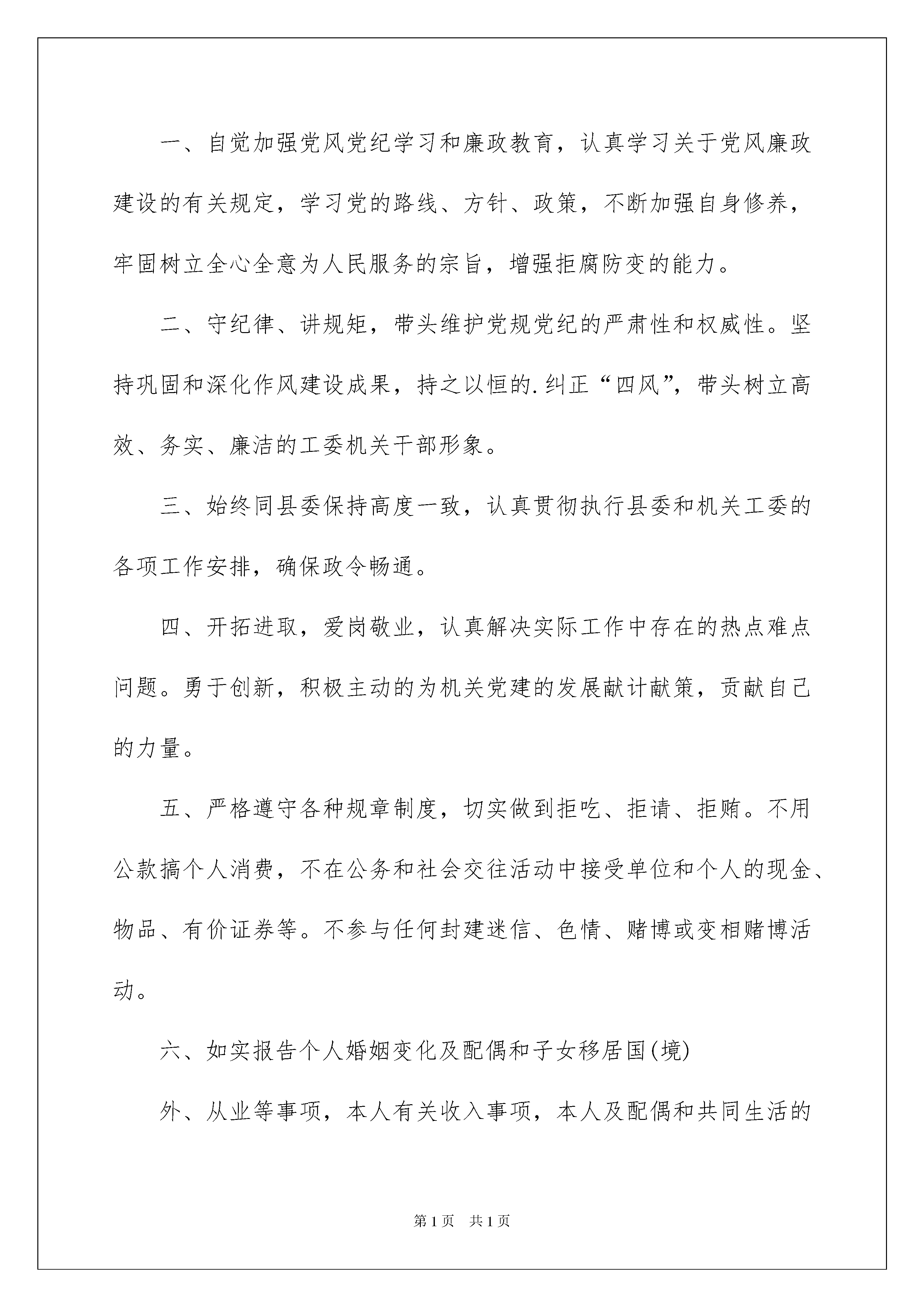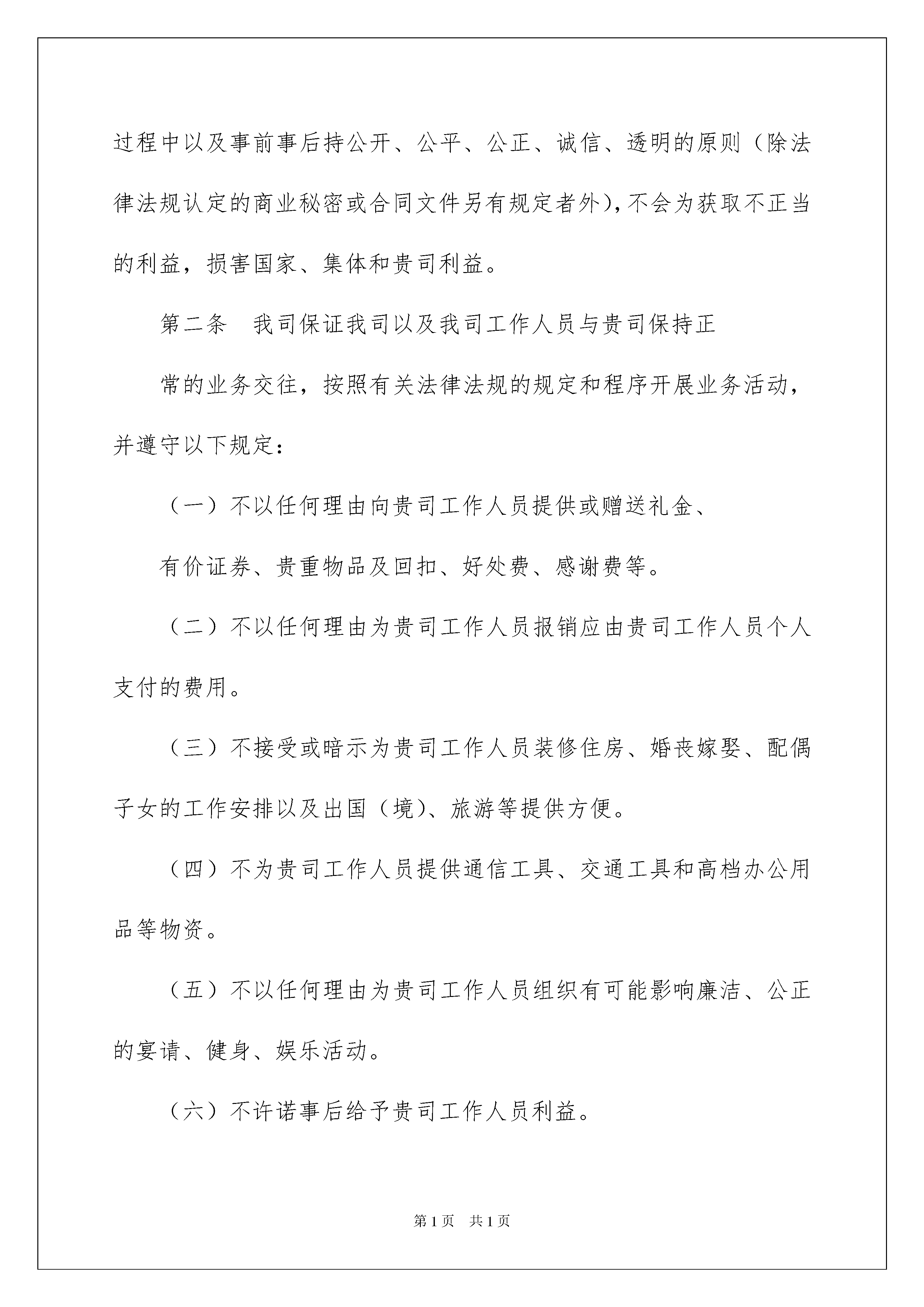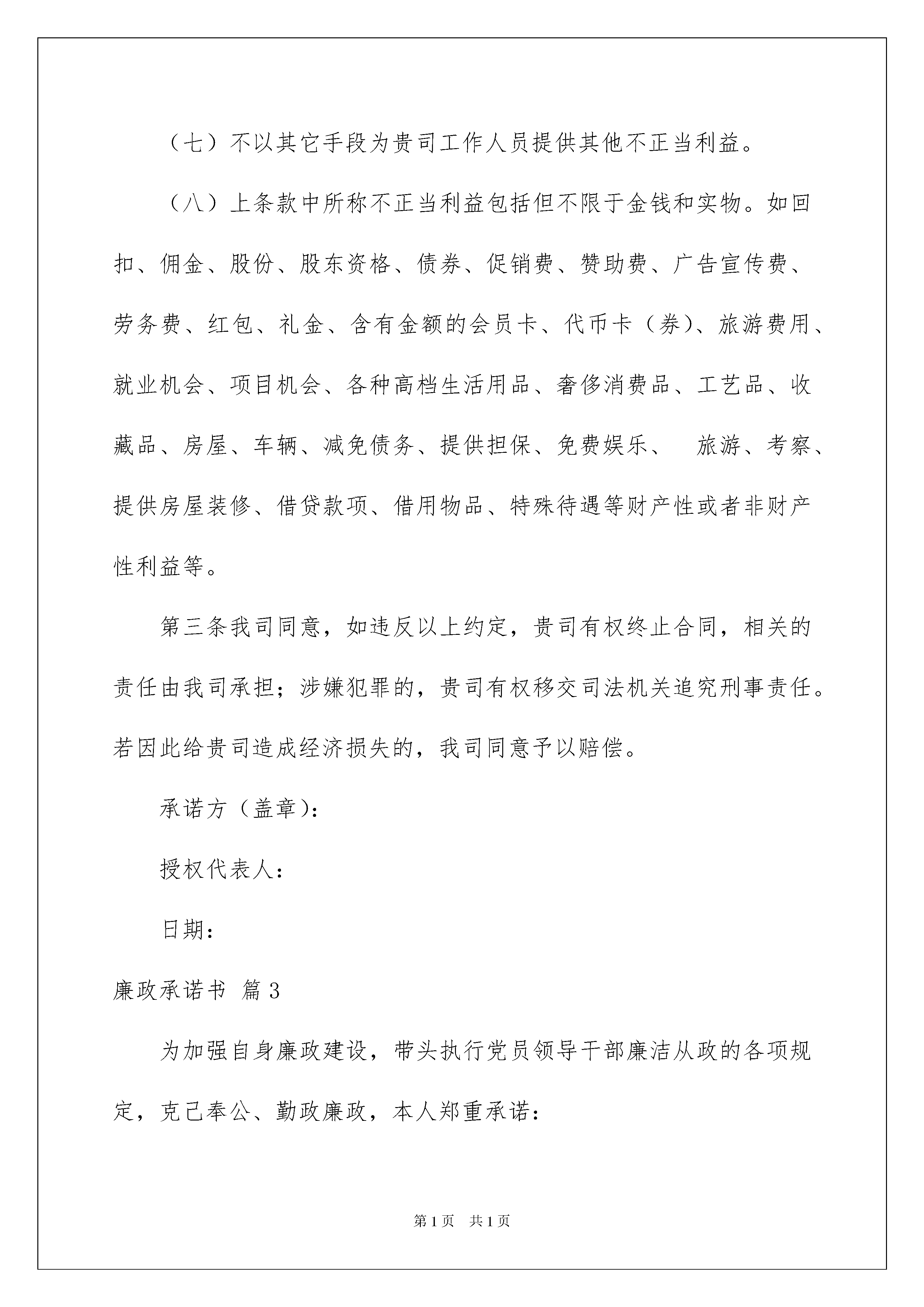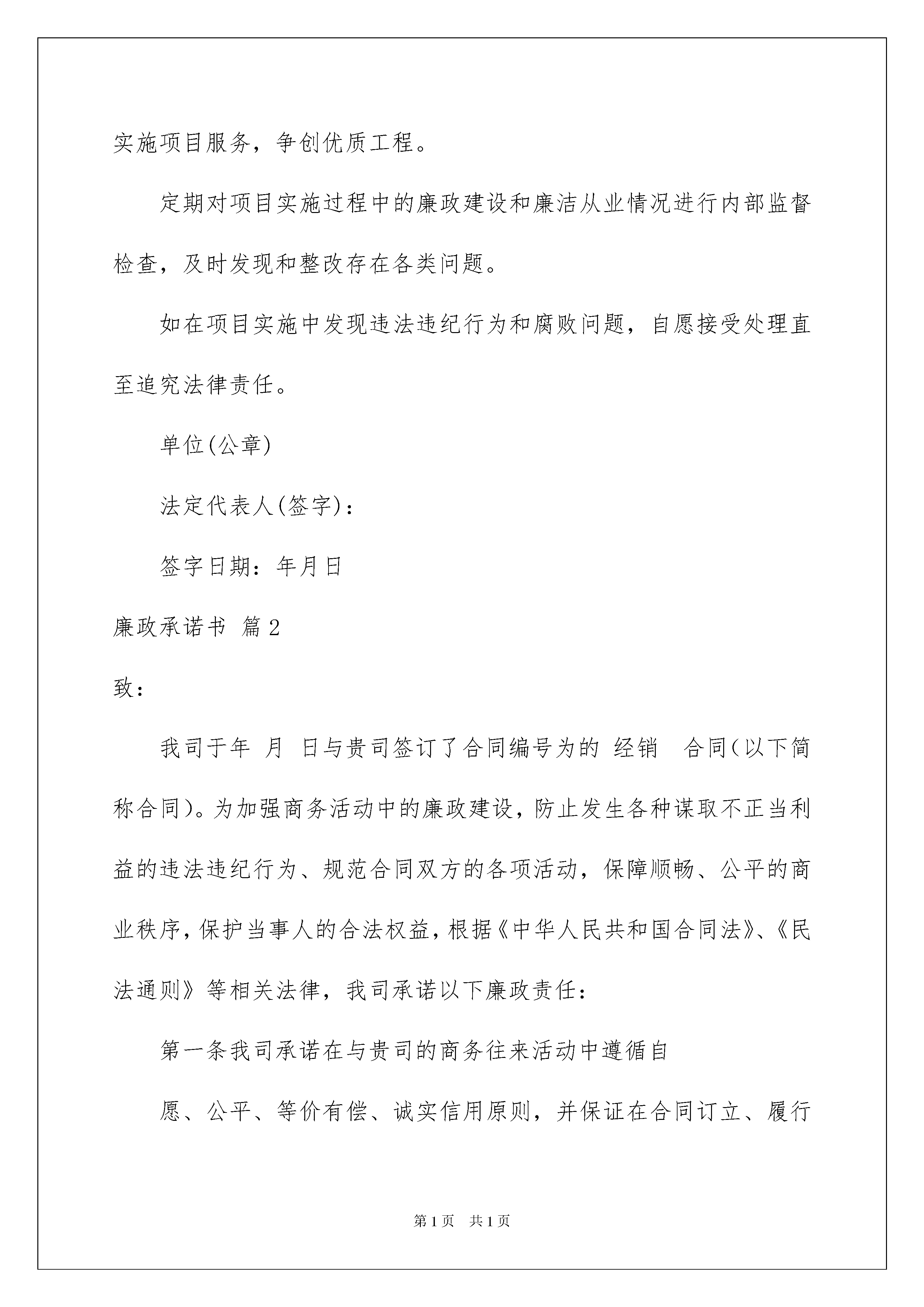 2022廉政承诺书4篇廉政承诺书4篇现如今,承诺书应用范围愈来愈广泛,承诺书仅是一方的声明及义务性的认可,其法律效力与合同是不同的。那么问题来了,到底应如何写一份恰当的承诺书呢?下面是我整理的廉政承诺书4篇,希望对大家有所帮助。廉政承诺书篇1廉政承诺书我单位所参与的___________________________________________项目,为确保项目廉洁、高效实施,我单位作出如下承诺:严格遵守工程项目实施的有关规定,保证项目资金管理使用安全、规范。严格遵守职业道德,依法合规推进项目工作,努力推进诚信建设,绝不从事任何不正当竞争和任何违法违纪行为。建设项目质量监管保证体系,严格按照国家相关法规和技术规范实施项目服务,争创优质工程。定期对项目实施过程中的廉政建设和廉洁从业情况进行内部监督检查,及时发现和整改存在各类问题。如在项目实施中发现违法违纪行为和腐败问题,自愿接受处理直至追究法律责任。单位(公章)法定代表人(签字):签字日期:年月日廉政承诺书篇2致:我司于年月日与贵司签订了合同编号为的经销合同(以下简称合同)。为加强商务活动中的廉政建设,防止发生各种谋取不正当利益的违法违纪行为、规范合同双方的各项活动,保障顺畅、公平的商业秩序,保护当事人的合法权益,根据《中华人民共和国合同法》、《民法通则》等相关法律,我司承诺以下廉政责任:第一条我司承诺在与贵司的商务往来活动中遵循自愿、公平、等价有偿、诚实信用原则,并保证在合同订立、履行过程中以及事前事后持公开、公平、公正、诚信、透明的原则(除法律法规认定的商业秘密或合同文件另有规定者外),不会为获取不正当的利益,损害国家、集体和贵司利益。第二条我司保证我司以及我司工作人员与贵司保持正常的业务交往,按照有关法律法规的规定和程序开展业务活动,并遵守以下规定:(一)不以任何理由向贵司工作人员提供或赠送礼金、有价证券、贵重物品及回扣、好处费、感谢费等。(二)不以任何理由为贵司工作人员报销应由贵司工作人员个人支付的费用。(三)不接受或暗示为贵司工作人员装修住房、婚丧嫁娶、配偶子女的工作安排以及出国(境)、旅游等提供方便。(四)不为贵司工作人员提供通信工具、交通工具和高档办公用品等物资。(五)不以任何理由为贵司工作人员组织有可能影响廉洁、公正的宴请、健身、娱乐活动。(六)不许诺事后给予贵司工作人员利益。(七)不以其它手段为贵司工作人员提供其他不正当利益。(八)上条款中所称不正当利益包括但不限于金钱和实物。如回扣、佣金、股份、股东资格、债券、促销费、赞助费、广告宣传费、劳务费、红包、礼金、含有金额的会员卡、代币卡(券)、旅游费用、就业机会、项目机会、各种高档生活用品、奢侈消费品、工艺品、收藏品、房屋、车辆、减免债务、提供担保、免费娱乐、旅游、考察、提供房屋装修、借贷款项、借用物品、特殊待遇等财产性或者非财产性利益等。第三条我司同意,如违反以上约定,贵司有权终止合同,相关的责任由我司承担;涉嫌犯罪的,贵司有权移交司法机关追究刑事责任。若因此给贵司造成经济损失的,我司同意予以赔偿。承诺方(盖章):授权代表人:日期:廉政承诺书篇3为加强自身廉政建设,带头执行党员领导干部廉洁从政的各项规定,克己奉公、勤政廉政,本人郑重承诺:一、自觉加强党风党纪学习和廉政教育,认真学习关于党风廉政建设的有关规定,学习党的路线、方针、政策,不断加强自身修养,牢固树立全心全意为人民服务的宗旨,增强拒腐防变的能力。二、守纪律、讲规矩,带头维护党规党纪的严肃性和权威性。坚持巩固和深化作风建设成果,持之以恒的.纠正“四风”,带头树立高效、务实、廉洁的工委机关干部形象。三、始终同县委保持高度一致,认真贯彻执行县委和机关工委的各项工作安排,确保政令畅通。四、开拓进取,爱岗敬业,认真解决实际工作中存在的热点难点问题。勇于创新,积极主动的为机关党建的发展献计献策,贡献自己的力量。五、严格遵守各种规章制度,切实做到拒吃、拒请、拒贿。不用公款搞个人消费,不在公务和社会交往活动中接受单位和个人的现金、物品、有价证券等。不参与任何封建迷信、色情、赌博或变相赌博活动。六、如实报告个人婚姻变化及配偶和子女移居国(境)外、从业等事项,本人有关收入事项,本人及配偶和共同生活的子女房产、投资等事项。七、不违反领导干部廉洁自律的其他规定。主管领导:承诺时间:承诺人:年月日廉政承诺书篇4为了加强会计诚信建设,提高职业道德和专业技术水平,促进会计工作,规范会计行为,本人作如下承诺:1、按规定填制、审核记账凭证,内容完整,印章齐全。2、按规定设置会计账簿,正确使用会计科目,账簿封面与启用表内容填写齐