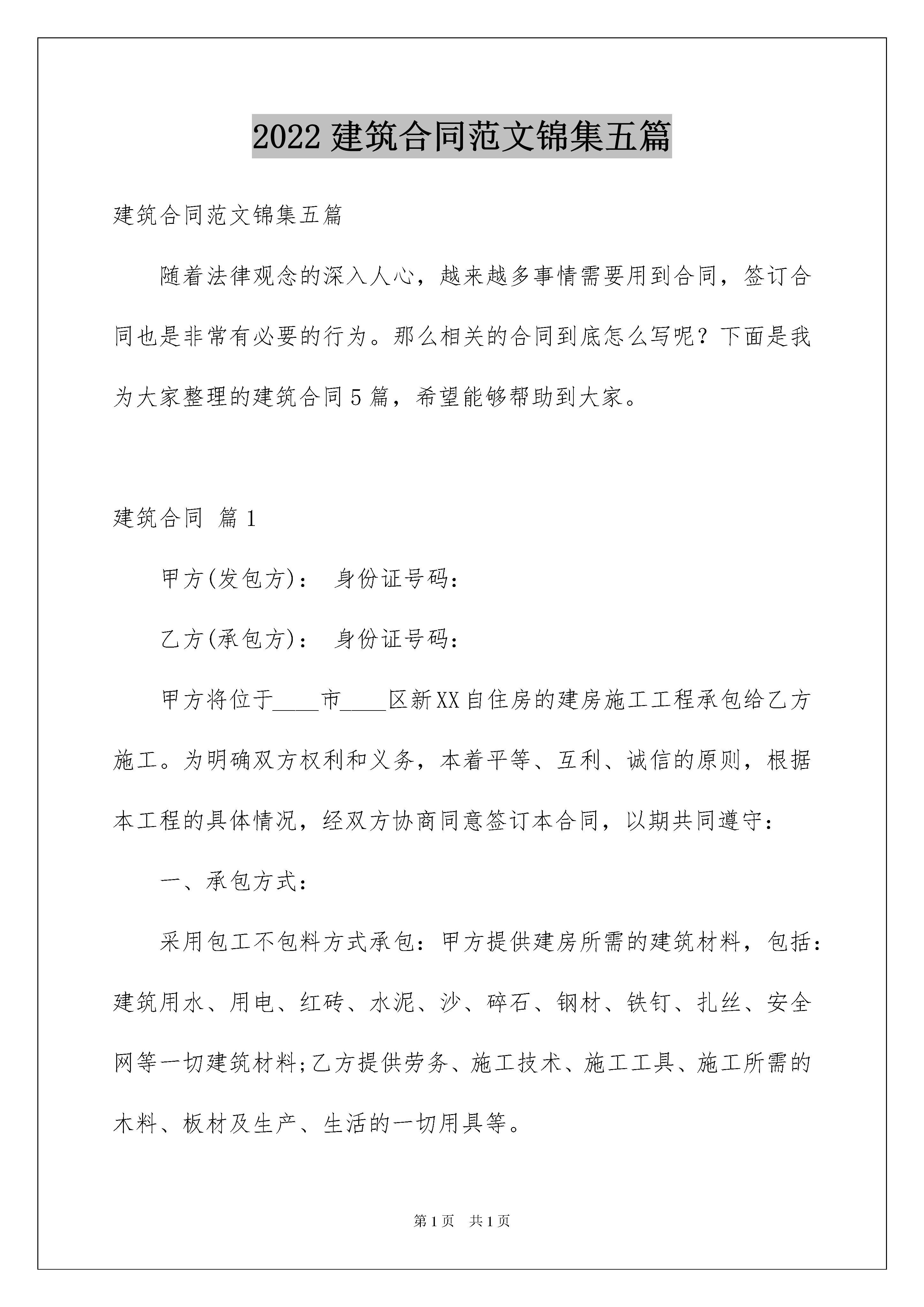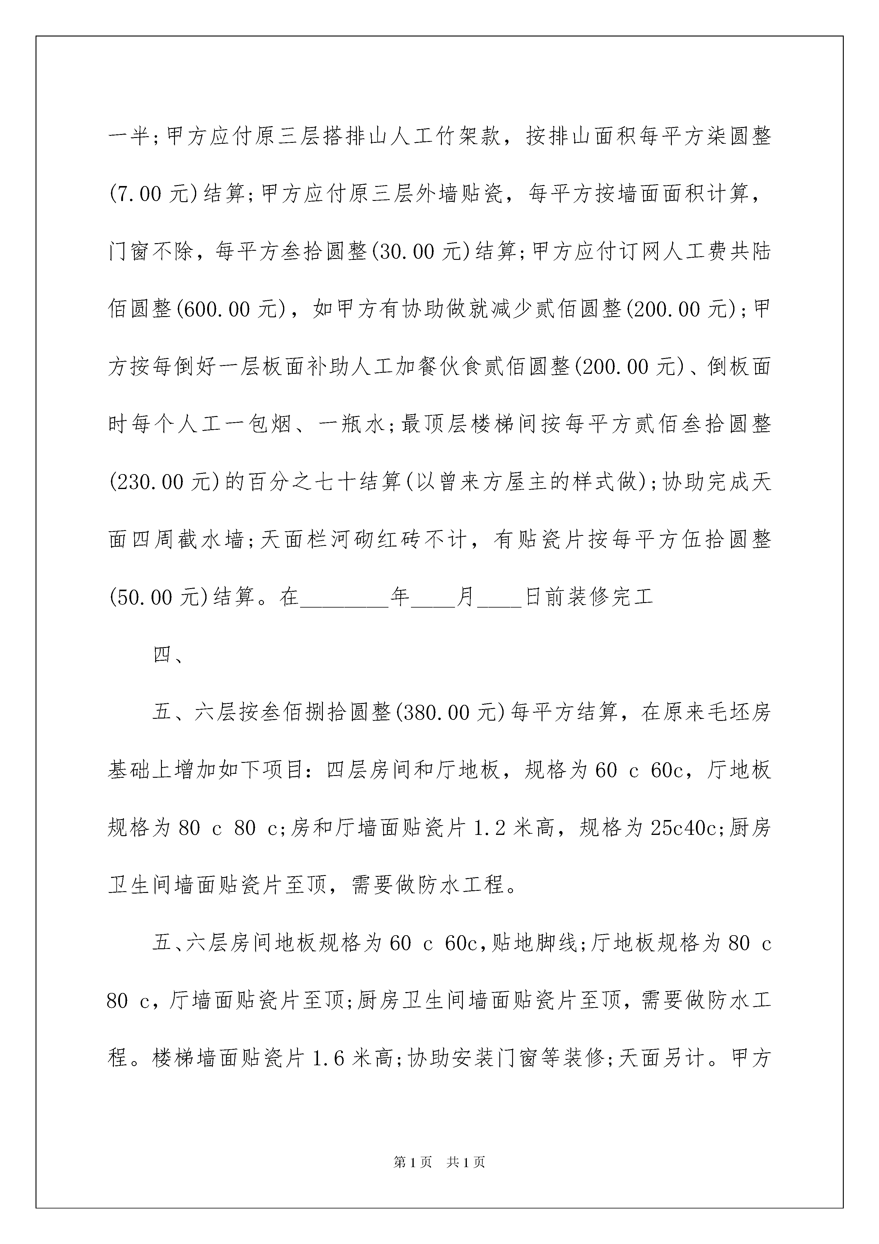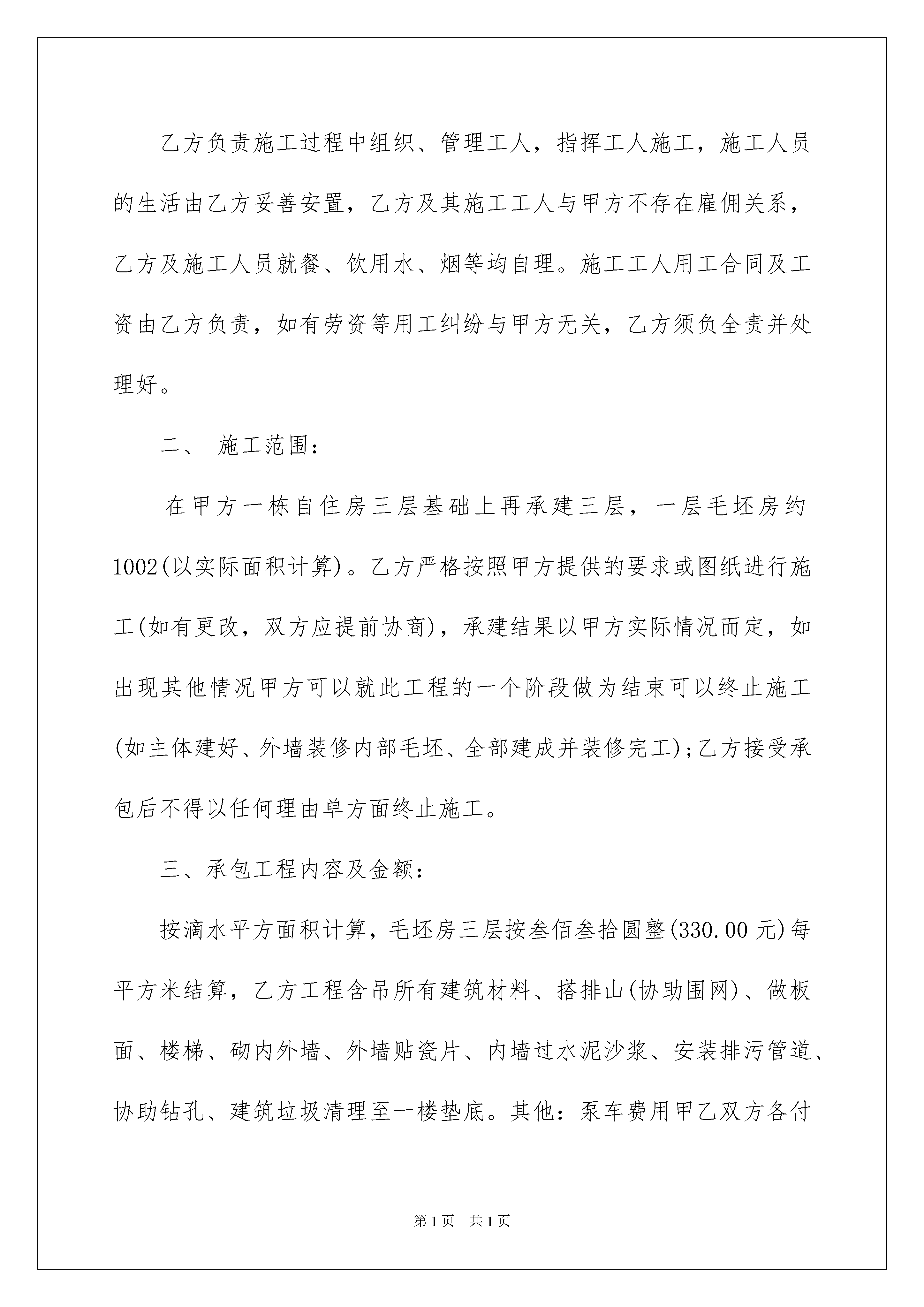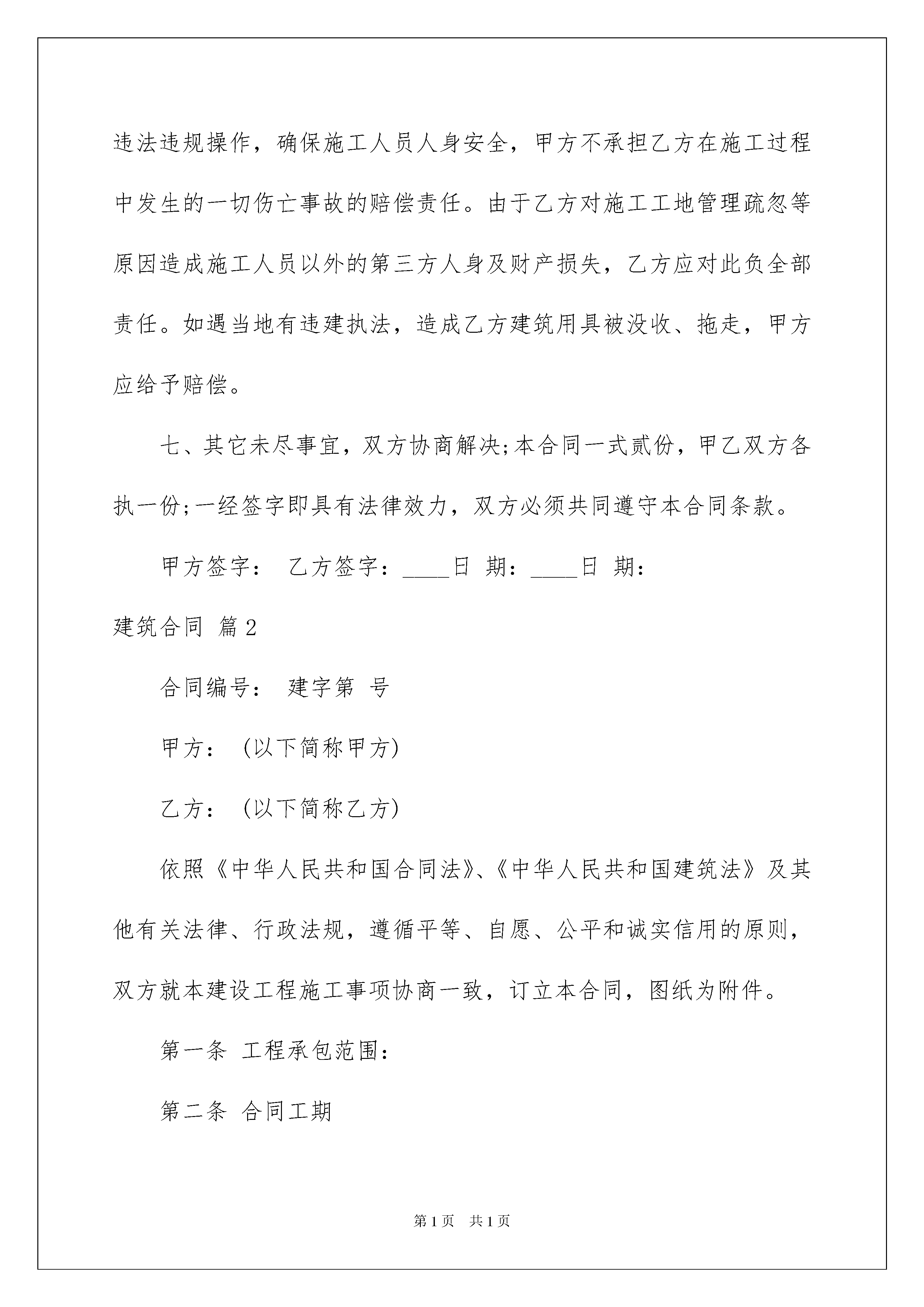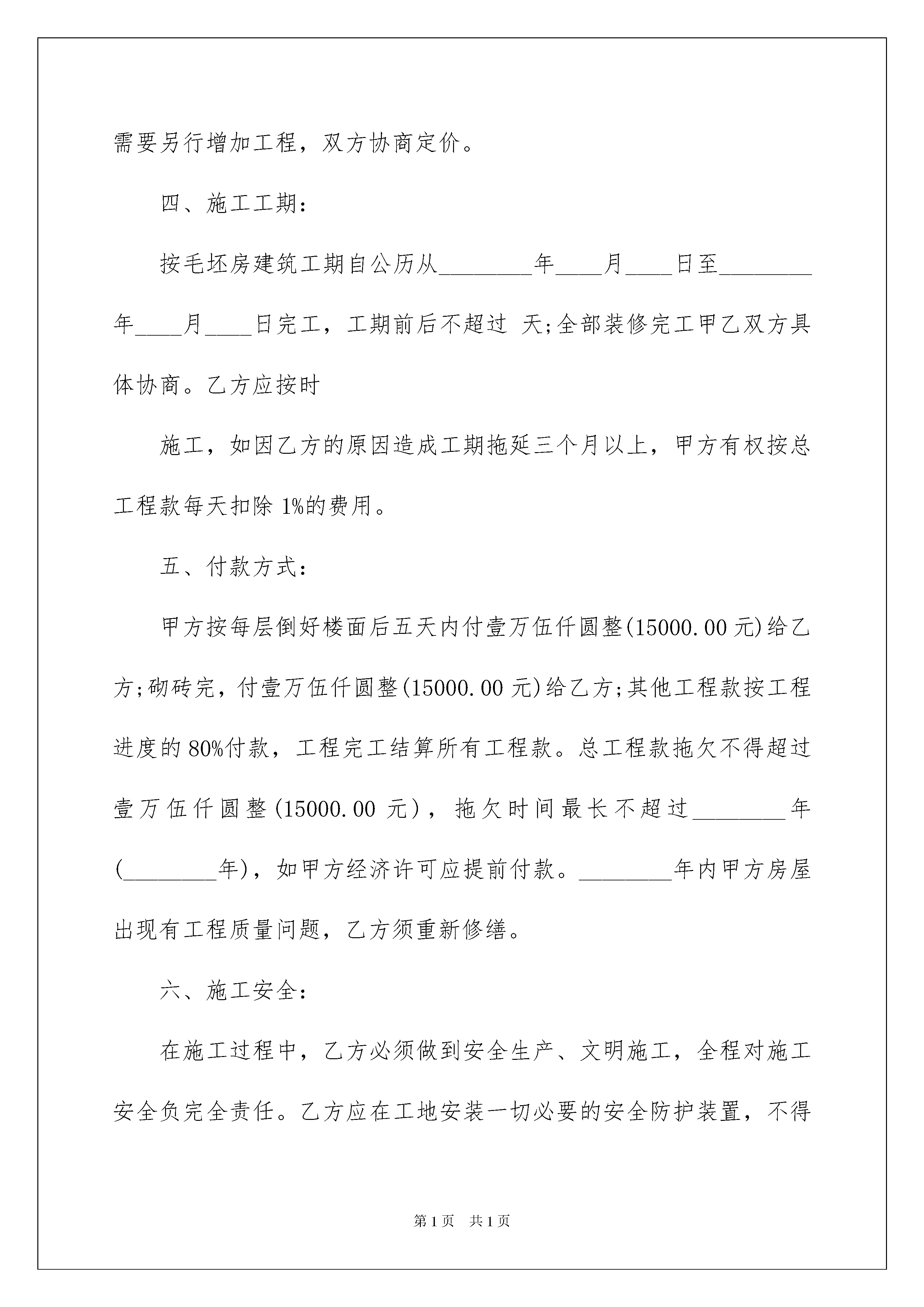 2022建筑合同范文锦集五篇建筑合同范文锦集五篇随着法律观念的深入人心,越来越多事情需要用到合同,签订合同也是非常有必要的行为。那么相关的合同到底怎么写呢?下面是我为大家整理的建筑合同5篇,希望能够帮助到大家。建筑合同篇1甲方(发包方):身份证号码:乙方(承包方):身份证号码:甲方将位于____市____区新XX自住房的建房施工工程承包给乙方施工。为明确双方权利和义务,本着平等、互利、诚信的原则,根据本工程的具体情况,经双方协商同意签订本合同,以期共同遵守:一、承包方式:采用包工不包料方式承包:甲方提供建房所需的建筑材料,包括:建筑用水、用电、红砖、水泥、沙、碎石、钢材、铁钉、扎丝、安全网等一切建筑材料;乙方提供劳务、施工技术、施工工具、施工所需的木料、板材及生产、生活的一切用具等。乙方负责施工过程中组织、管理工人,指挥工人施工,施工人员的生活由乙方妥善安置,乙方及其施工工人与甲方不存在雇佣关系,乙方及施工人员就餐、饮用水、烟等均自理。施工工人用工合同及工资由乙方负责,如有劳资等用工纠纷与甲方无关,乙方须负全责并处理好。二、施工范围:在甲方一栋自住房三层基础上再承建三层,一层毛坯房约1002(以实际面积计算)。乙方严格按照甲方提供的要求或图纸进行施工(如有更改,双方应提前协商),承建结果以甲方实际情况而定,如出现其他情况甲方可以就此工程的一个阶段做为结束可以终止施工(如主体建好、外墙装修内部毛坯、全部建成并装修完工);乙方接受承包后不得以任何理由单方面终止施工。三、承包工程内容及金额:按滴水平方面积计算,毛坯房三层按叁佰叁拾圆整(330.00元)每平方米结算,乙方工程含吊所有建筑材料、搭排山(协助围网)、做板面、楼梯、砌内外墙、外墙贴瓷片、内墙过水泥沙浆、安装排污管道、协助钻孔、建筑垃圾清理至一楼垫底。其他:泵车费用甲乙双方各付一半;甲方应付原三层搭排山人工竹架款,按排山面积每平方柒圆整(7.00元)结算;甲方应付原三层外墙贴瓷,每平方按墙面面积计算,门窗不除,每平方叁拾圆整(30.00元)结算;甲方应付订网人工费共陆佰圆整(600.00元),如甲方有协助做就减少贰佰圆整(200.00元);甲方按每倒好一层板面补助人工加餐伙食贰佰圆整(200.00元)、倒板面时每个人工一包烟、一瓶水;最顶层楼梯间按每平方贰佰叁拾圆整(230.00元)的百分之七十结算(以曾来方屋主的样式做);协助完成天面四周截水墙;天面栏河砌红砖不计,有贴瓷片按每平方伍拾圆整(50.00元)结算。在________年____月____日前装修完工四、五、六层按叁佰捌拾圆整(380.00元)每平方结算,在原来毛坯房基础上增加如下项目:四层房间和厅地板,规格为60c60c,厅地板规格为80c80c;房和厅墙面贴瓷片1.2米高,规格为25c40c;厨房卫生间墙面贴瓷片至顶,需要做防水工程。五、六层房间地板规格为60c60c,贴地脚线;厅地板规格为80c80c,厅墙面贴瓷片至顶;厨房卫生间墙面贴瓷片至顶,需要做防水工程。楼梯墙面贴瓷片1.6米高;协助安装门窗等装修;天面另计。甲方需要另行增加工程,双方协商定价。四、施工工期:按毛坯房建筑工期自公历从________年____月____日至________年____月____日完工,工期前后不超过天;全部装修完工甲乙双方具体协商。乙方应按时施工,如因乙方的原因造成工期拖延三个月以上,甲方有权按总工程款每天扣除1%的费用。五、付款方式:甲方按每层倒好楼面后五天内付壹万伍仟圆整(15000.00元)给乙方;砌砖完,付壹万伍仟圆整(15000.00元)给乙方;其他工程款按工程进度的80%付款,工程完工结算所有工程款。总工程款拖欠不得超过壹万伍仟圆整(15000.00元),拖欠时间最长不超过________年(________年),如甲方经济许可应提前付款。________年内甲方房屋出现有工程质量问题,乙方须重新修缮。六、施工安全:在施工过程中,乙方必须做到安全生产、文明施工,全程对施工安全负完全责任。乙方应在工地安装一切必要的安全防护装置,不得违法违规操作,确保施工人员人身安全,甲方不承担乙方在施工过程中发生的一切伤亡事故的赔偿责任。由于乙方对施工工地管理疏忽等原因造成施工人员以外的第三方人身及财产损失,乙方应对此负全部责任。如遇当地有违建执法,造成乙方建筑用具被没收、拖走,甲方应给予赔偿。七、其它未尽事宜,双方协商解决;本合同一式贰份,甲乙双方各执一份;一经签字即具有法律效力,双方必须共同遵守本合同条款。甲方签字:乙方签字:____日期:____日期:建筑合同篇2合同
