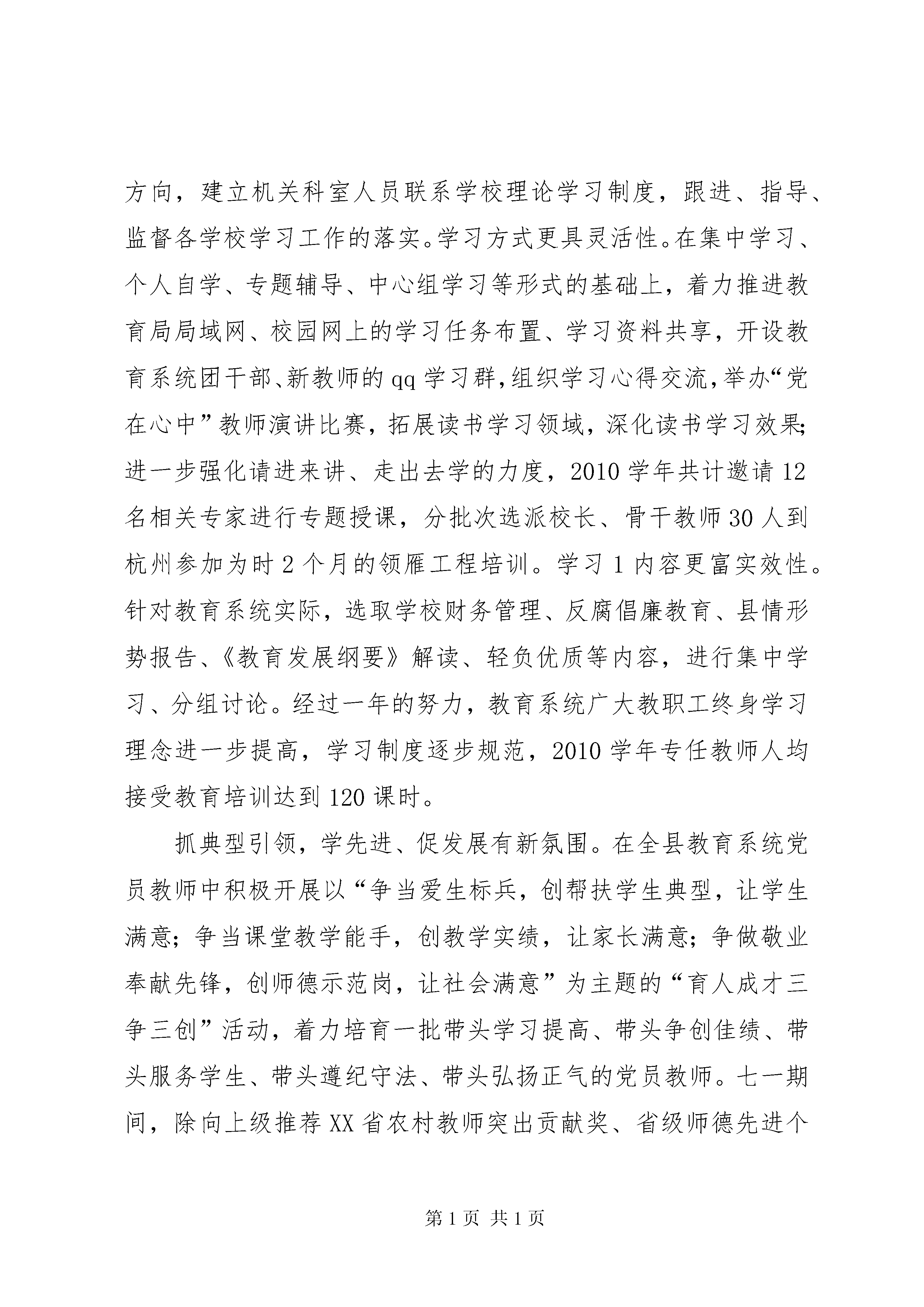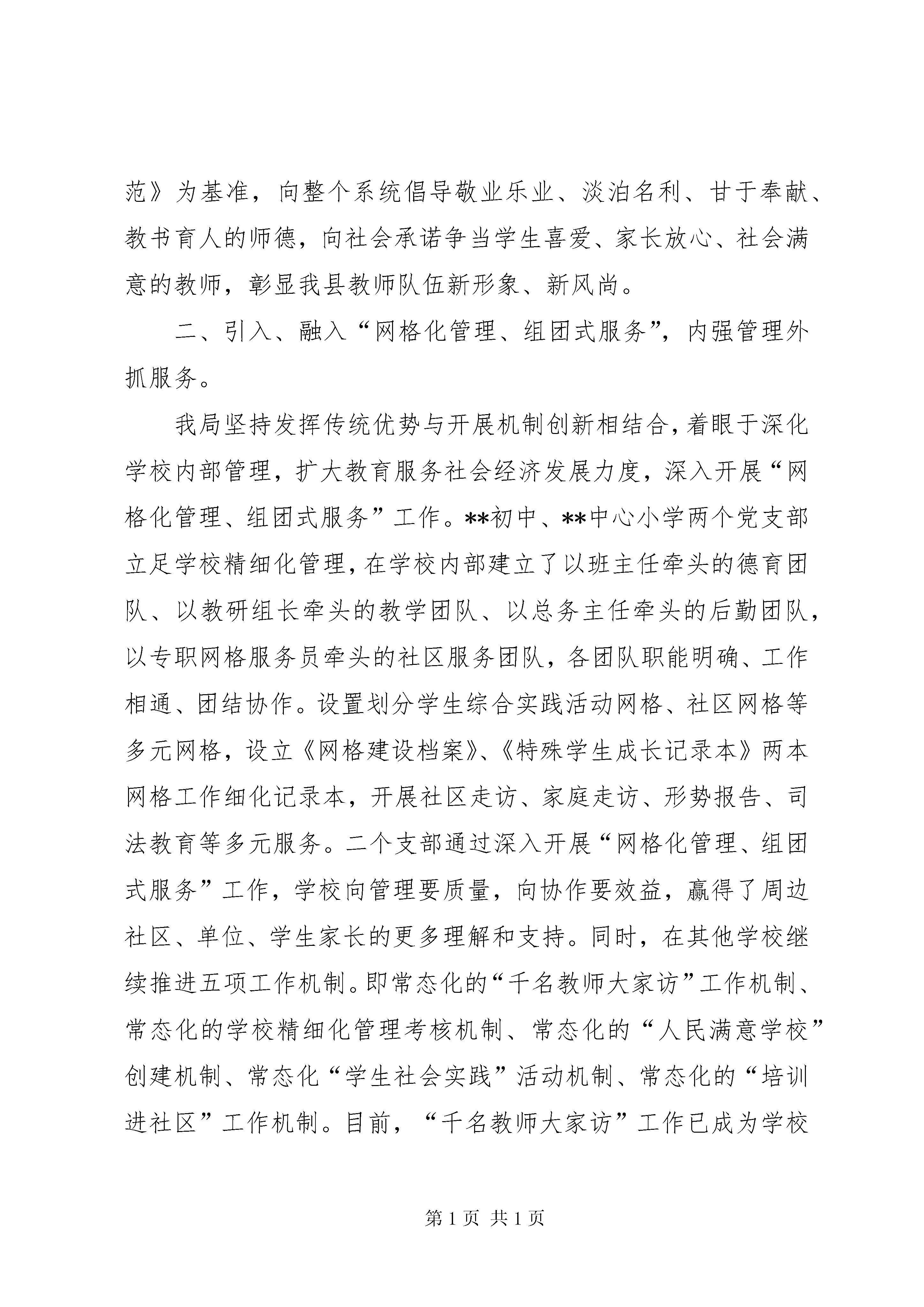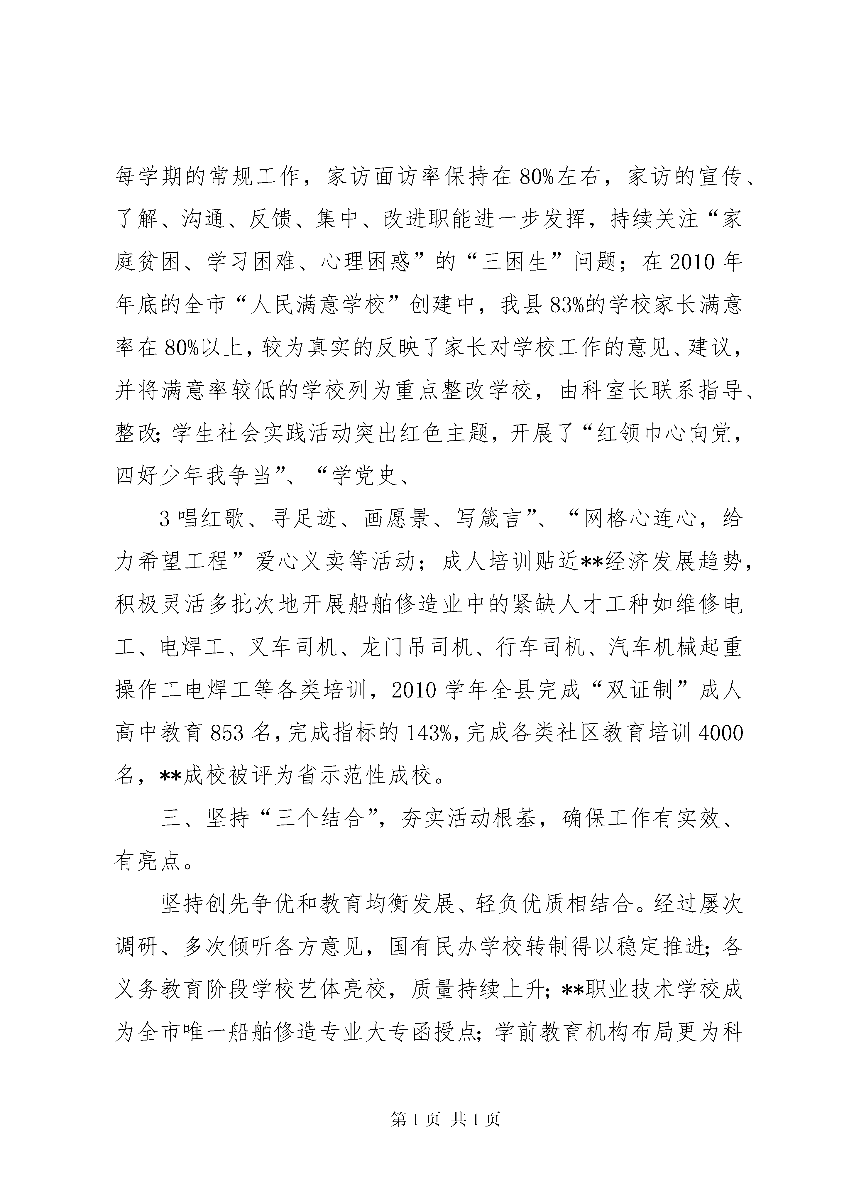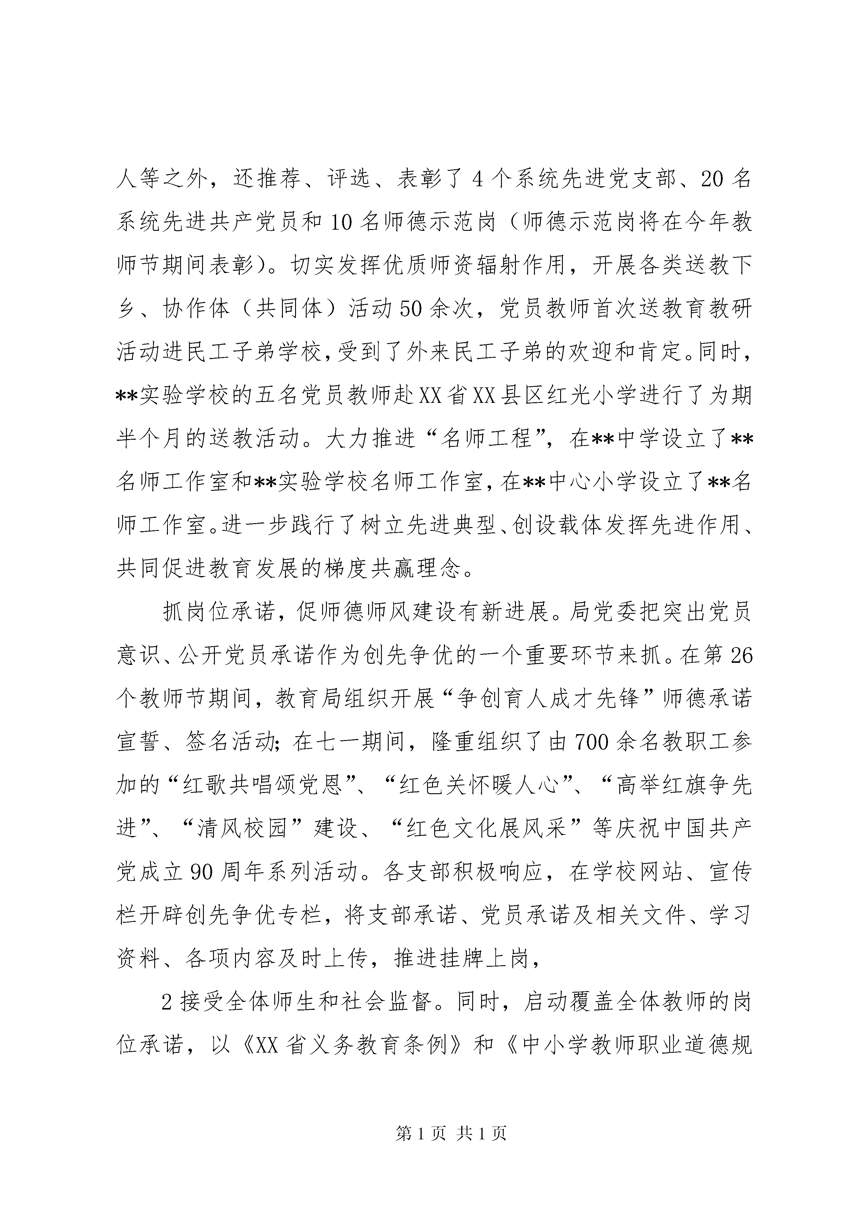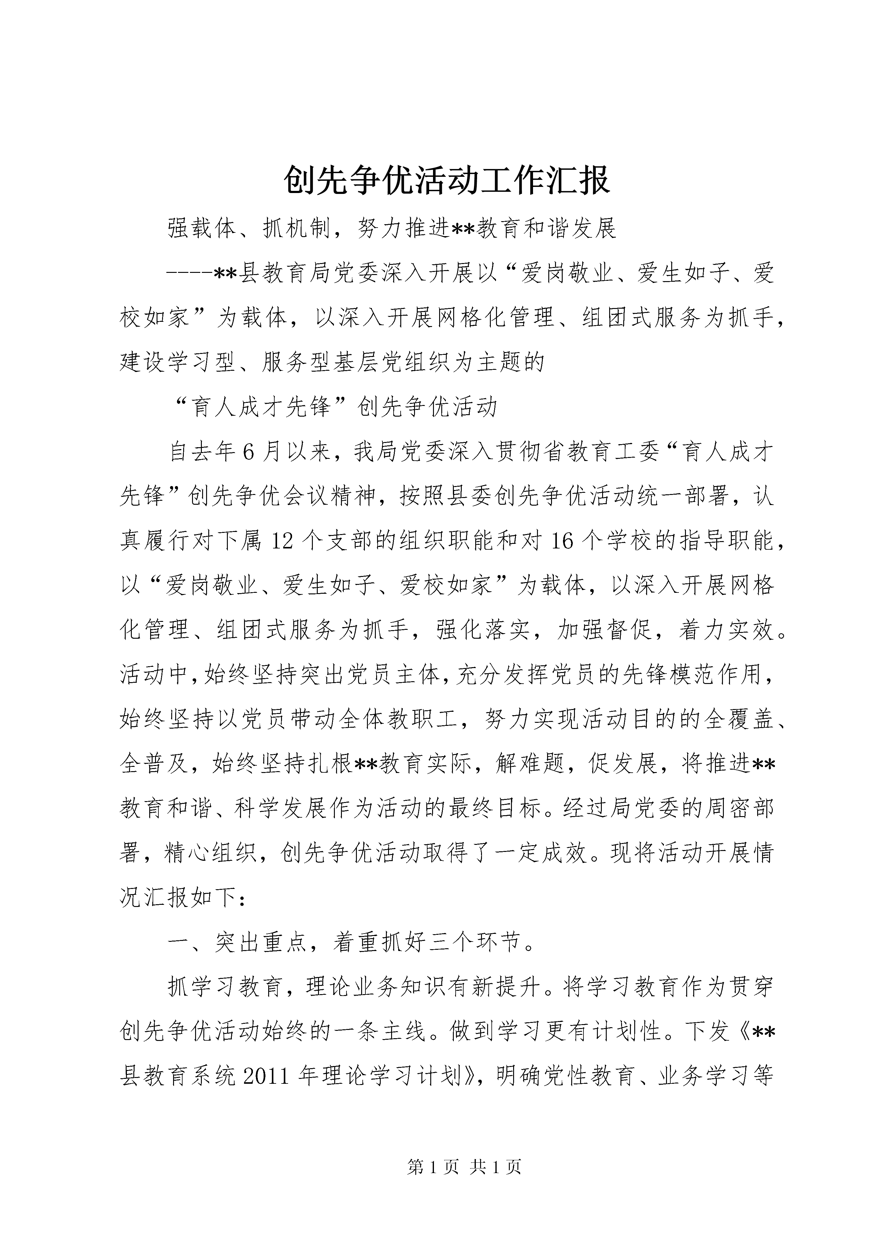 创先争优活动工作汇报强载体、抓机制,努力推进**教育和谐发展----**县教育局党委深入开展以“爱岗敬业、爱生如子、爱校如家”为载体,以深入开展网格化管理、组团式服务为抓手,建设学习型、服务型基层党组织为主题的“育人成才先锋”创先争优活动自去年6月以来,我局党委深入贯彻省教育工委“育人成才先锋”创先争优会议精神,按照县委创先争优活动统一部署,认真履行对下属12个支部的组织职能和对16个学校的指导职能,以“爱岗敬业、爱生如子、爱校如家”为载体,以深入开展网格化管理、组团式服务为抓手,强化落实,加强督促,着力实效。活动中,始终坚持突出党员主体,充分发挥党员的先锋模范作用,始终坚持以党员带动全体教职工,努力实现活动目的的全覆盖、全普及,始终坚持扎根**教育实际,解难题,促发展,将推进**教育和谐、科学发展作为活动的最终目标。经过局党委的周密部署,精心组织,创先争优活动取得了一定成效。现将活动开展情况汇报如下:一、突出重点,着重抓好三个环节。抓学习教育,理论业务知识有新提升。将学习教育作为贯穿创先争优活动始终的一条主线。做到学习更有计划性。下发《**县教育系统2011年理论学习计划》,明确党性教育、业务学习等方向,建立机关科室人员联系学校理论学习制度,跟进、指导、监督各学校学习工作的落实。学习方式更具灵活性。在集中学习、个人自学、专题辅导、中心组学习等形式的基础上,着力推进教育局局域网、校园网上的学习任务布置、学习资料共享,开设教育系统团干部、新教师的qq学习群,组织学习心得交流,举办“党在心中”教师演讲比赛,拓展读书学习领域,深化读书学习效果;进一步强化请进来讲、走出去学的力度,2010学年共计邀请12名相关专家进行专题授课,分批次选派校长、骨干教师30人到杭州参加为时2个月的领雁工程培训。学习1内容更富实效性。针对教育系统实际,选取学校财务管理、反腐倡廉教育、县情形势报告、《教育发展纲要》解读、轻负优质等内容,进行集中学习、分组讨论。经过一年的努力,教育系统广大教职工终身学习理念进一步提高,学习制度逐步规范,2010学年专任教师人均接受教育培训达到120课时。抓典型引领,学先进、促发展有新氛围。在全县教育系统党员教师中积极开展以“争当爱生标兵,创帮扶学生典型,让学生满意;争当课堂教学能手,创教学实绩,让家长满意;争做敬业奉献先锋,创师德示范岗,让社会满意”为主题的“育人成才三争三创”活动,着力培育一批带头学习提高、带头争创佳绩、带头服务学生、带头遵纪守法、带头弘扬正气的党员教师。七一期间,除向上级推荐XX省农村教师突出贡献奖、省级师德先进个人等之外,还推荐、评选、表彰了4个系统先进党支部、20名系统先进共产党员和10名师德示范岗(师德示范岗将在今年教师节期间表彰)。切实发挥优质师资辐射作用,开展各类送教下乡、协作体(共同体)活动50余次,党员教师首次送教育教研活动进民工子弟学校,受到了外来民工子弟的欢迎和肯定。同时,**实验学校的五名党员教师赴XX省XX县区红光小学进行了为期半个月的送教活动。大力推进“名师工程”,在**中学设立了**名师工作室和**实验学校名师工作室,在**中心小学设立了**名师工作室。进一步践行了树立先进典型、创设载体发挥先进作用、共同促进教育发展的梯度共赢理念。抓岗位承诺,促师德师风建设有新进展。局党委把突出党员意识、公开党员承诺作为创先争优的一个重要环节来抓。在第26个教师节期间,教育局组织开展“争创育人成才先锋”师德承诺宣誓、签名活动;在七一期间,隆重组织了由700余名教职工参加的“红歌共唱颂党恩”、“红色关怀暖人心”、“高举红旗争先进”、“清风校园”建设、“红色文化展风采”等庆祝中国共产党成立90周年系列活动。各支部积极响应,在学校网站、宣传栏开辟创先争优专栏,将支部承诺、党员承诺及相关文件、学习资料、各项内容及时上传,推进挂牌上岗,2接受全体师生和社会监督。同时,启动覆盖全体教师的岗位承诺,以《XX省义务教育条例》和《中小学教师职业道德规范》为基准,向整个系统倡导敬业乐业、淡泊名利、甘于奉献、教书育人的师德,向社会承诺争当学生喜爱、家长放心、社会满意的教师,彰显我县教师队伍新形象、新风尚。二、引入、融入“网格化管理、组团式服务”,内强管理外抓服务。我局坚持发挥传统优势与开展机制创新相结合,着眼于深化学校内部管理,扩大教育服务社会经济发展力度,深入开展“网格化管理、组团式服务”工作。**初中、**中心小学两个党支部立足学校精细化管理,在学校内部建立了以班主任牵头的德育团队、以教研组长牵头的教学团队、以总务主任牵头的后勤团队,以专职网格服务员牵头的社区服务团队,各团队职能明确、工作相通、团结协作。设置划分学生综合实践活动网格、社区网格等多元网格,设立《网格建设档案》、《特殊学生成
