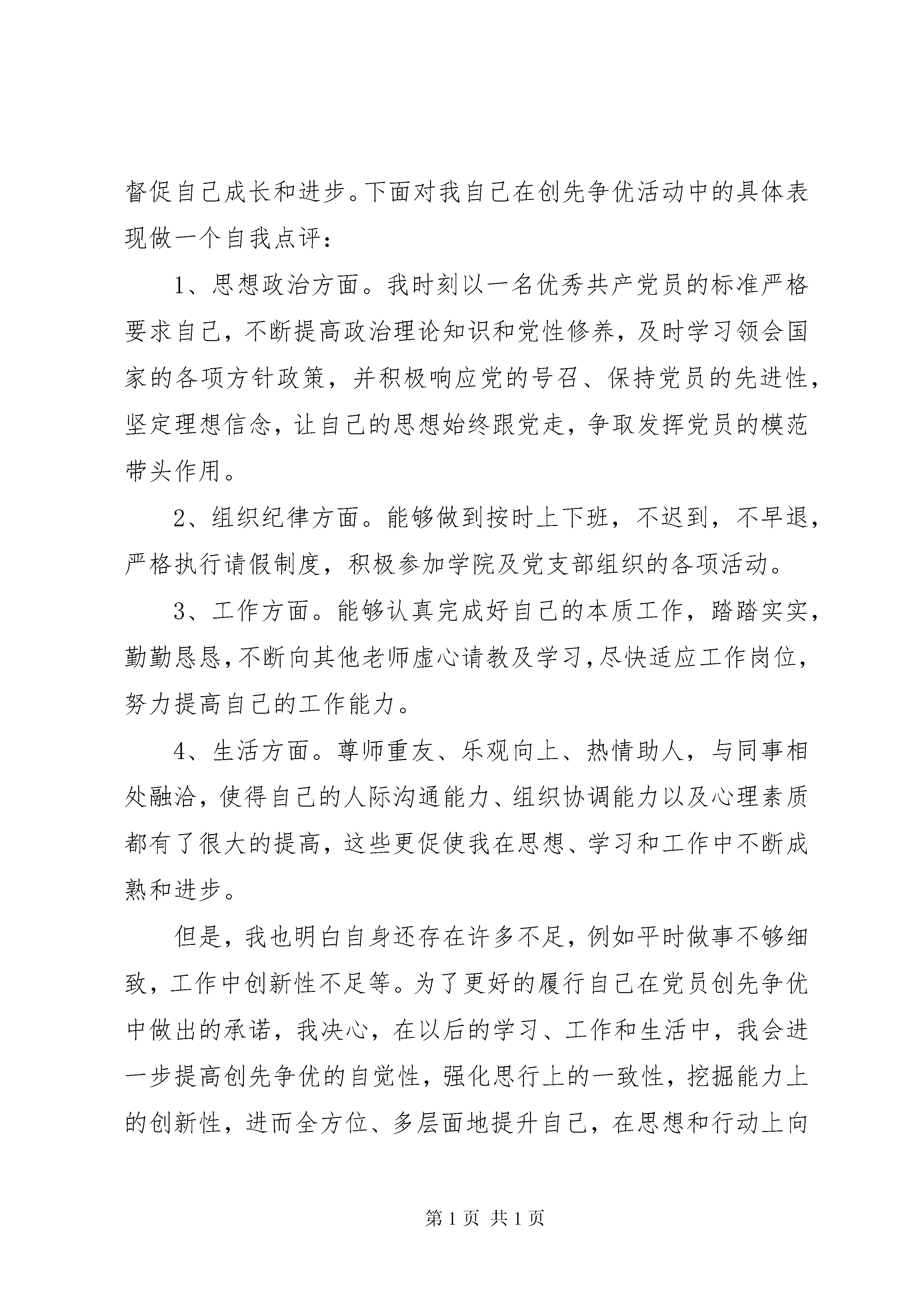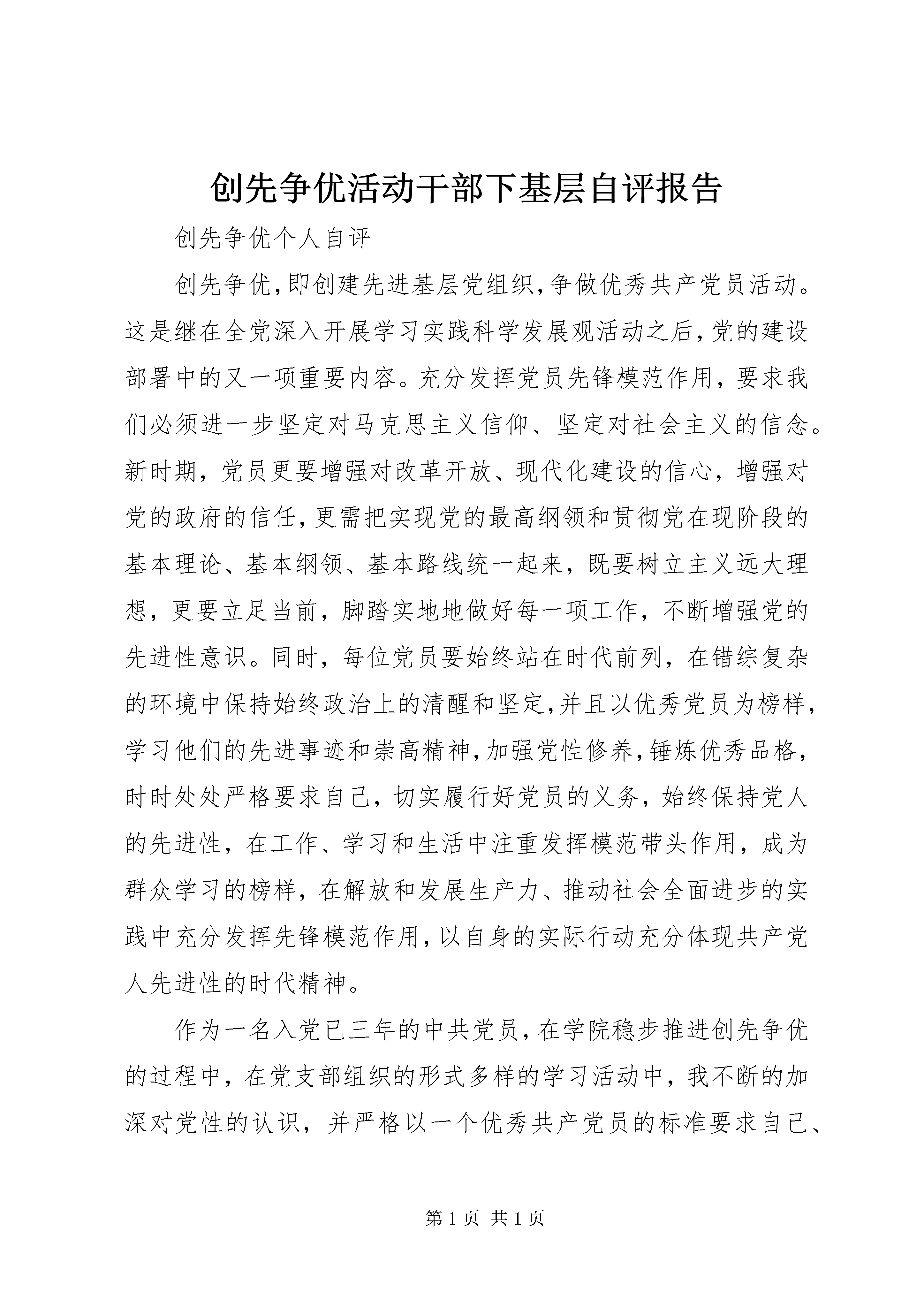 创先争优活动干部下基层自评报告创先争优个人自评创先争优,即创建先进基层党组织,争做优秀共产党员活动。这是继在全党深入开展学习实践科学发展观活动之后,党的建设部署中的又一项重要内容。充分发挥党员先锋模范作用,要求我们必须进一步坚定对马克思主义信仰、坚定对社会主义的信念。新时期,党员更要增强对改革开放、现代化建设的信心,增强对党的政府的信任,更需把实现党的最高纲领和贯彻党在现阶段的基本理论、基本纲领、基本路线统一起来,既要树立主义远大理想,更要立足当前,脚踏实地地做好每一项工作,不断增强党的先进性意识。同时,每位党员要始终站在时代前列,在错综复杂的环境中保持始终政治上的清醒和坚定,并且以优秀党员为榜样,学习他们的先进事迹和崇高精神,加强党性修养,锤炼优秀品格,时时处处严格要求自己,切实履行好党员的义务,始终保持党人的先进性,在工作、学习和生活中注重发挥模范带头作用,成为群众学习的榜样,在解放和发展生产力、推动社会全面进步的实践中充分发挥先锋模范作用,以自身的实际行动充分体现共产党人先进性的时代精神。作为一名入党已三年的中共党员,在学院稳步推进创先争优的过程中,在党支部组织的形式多样的学习活动中,我不断的加深对党性的认识,并严格以一个优秀共产党员的标准要求自己、督促自己成长和进步。下面对我自己在创先争优活动中的具体表现做一个自我点评:1、思想政治方面。我时刻以一名优秀共产党员的标准严格要求自己,不断提高政治理论知识和党性修养,及时学习领会国家的各项方针政策,并积极响应党的号召、保持党员的先进性,坚定理想信念,让自己的思想始终跟党走,争取发挥党员的模范带头作用。2、组织纪律方面。能够做到按时上下班,不迟到,不早退,严格执行请假制度,积极参加学院及党支部组织的各项活动。3、工作方面。能够认真完成好自己的本质工作,踏踏实实,勤勤恳恳,不断向其他老师虚心请教及学习,尽快适应工作岗位,努力提高自己的工作能力。4、生活方面。尊师重友、乐观向上、热情助人,与同事相处融洽,使得自己的人际沟通能力、组织协调能力以及心理素质都有了很大的提高,这些更促使我在思想、学习和工作中不断成熟和进步。但是,我也明白自身还存在许多不足,例如平时做事不够细致,工作中创新性不足等。为了更好的履行自己在党员创先争优中做出的承诺,我决心,在以后的学习、工作和生活中,我会进一步提高创先争优的自觉性,强化思行上的一致性,挖掘能力上的创新性,进而全方位、多层面地提升自己,在思想和行动上向更高、更远、更深的境界迈进。××2011年12月30日
