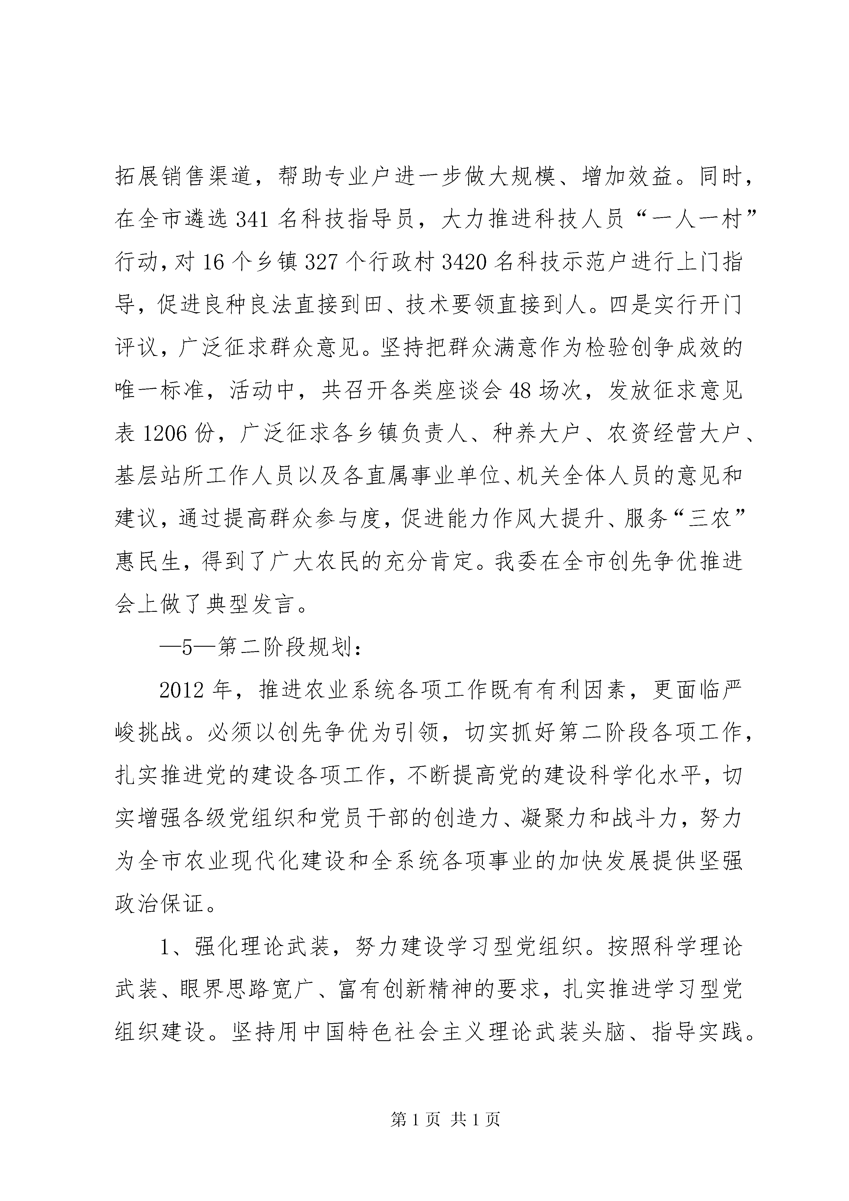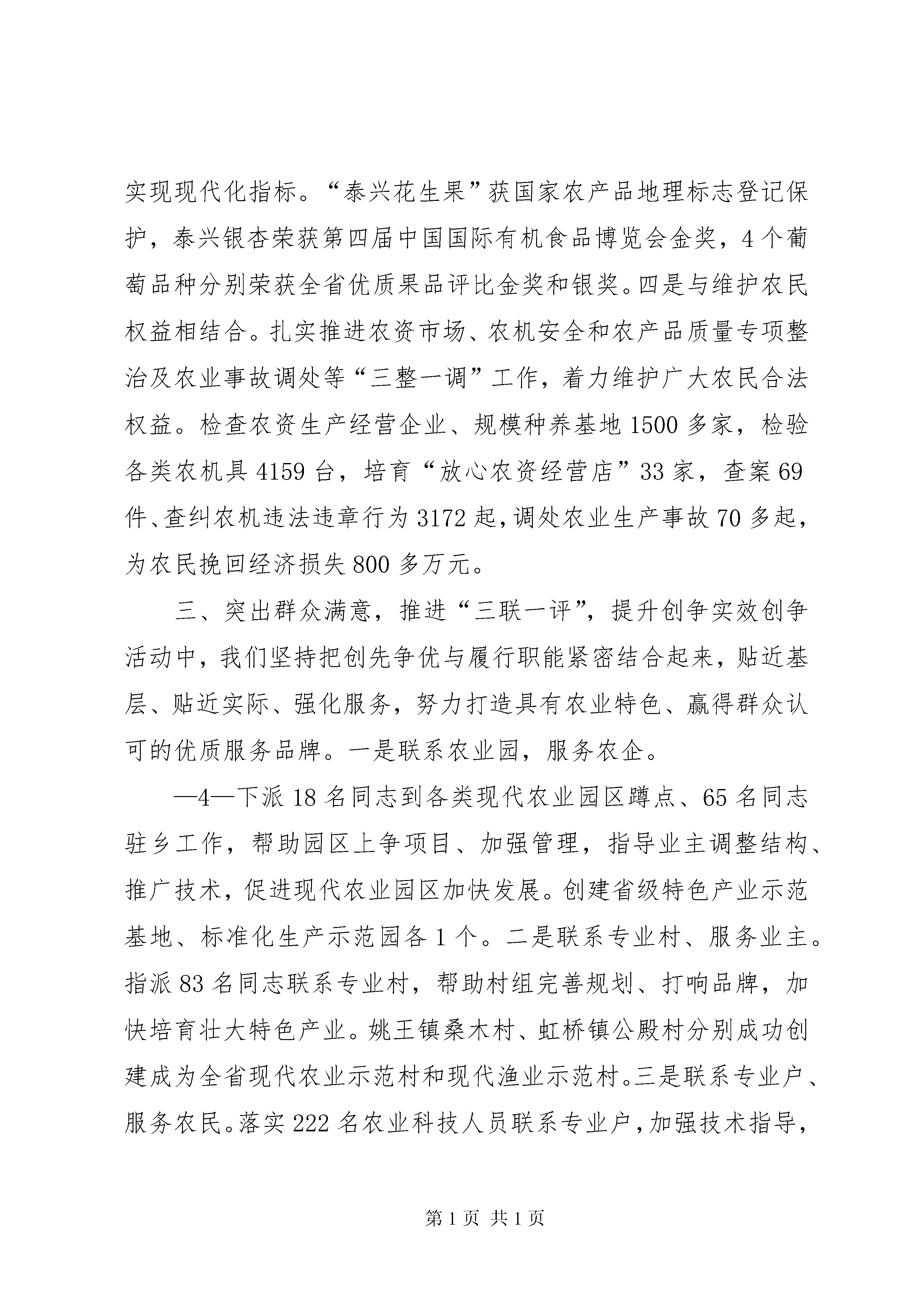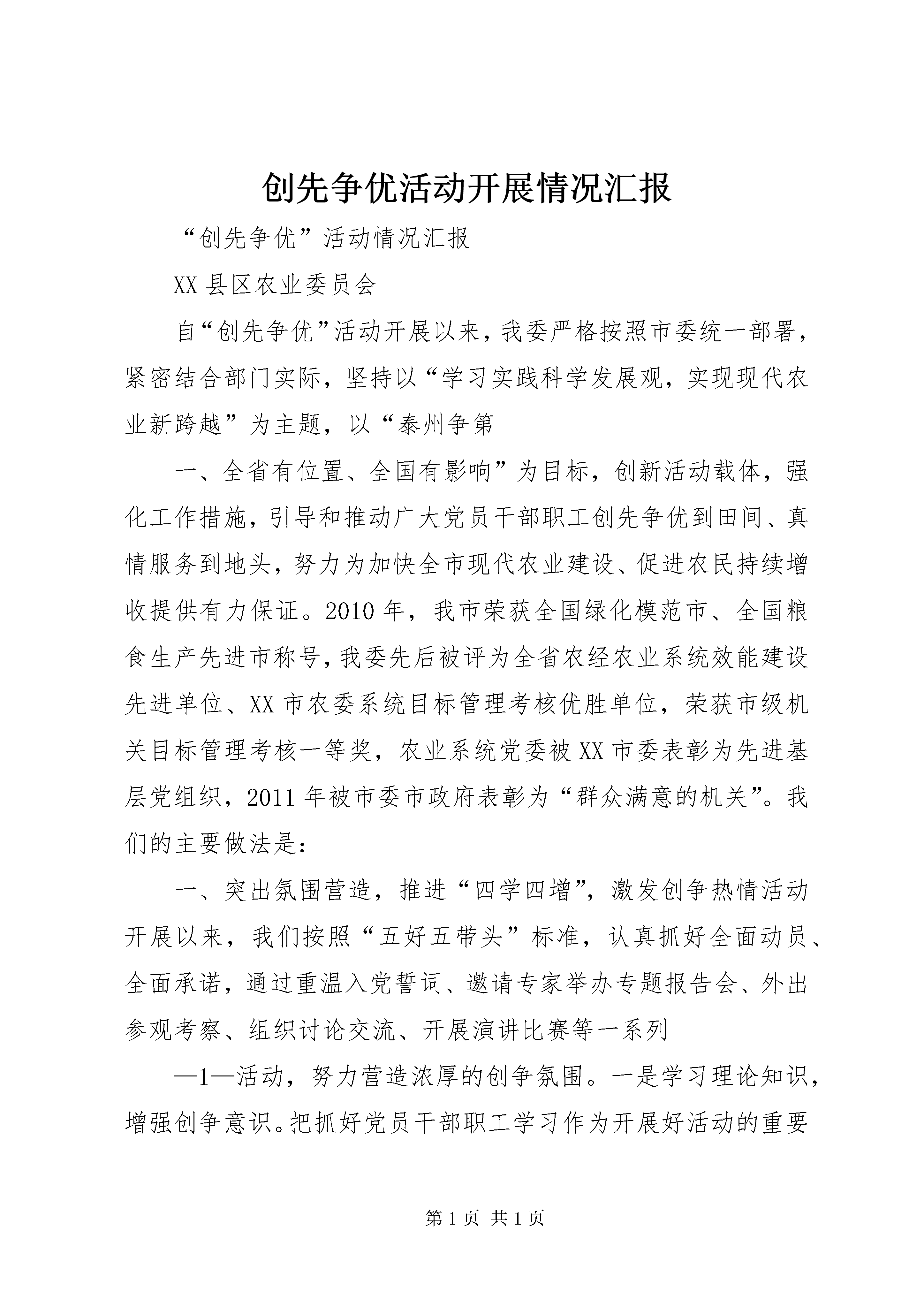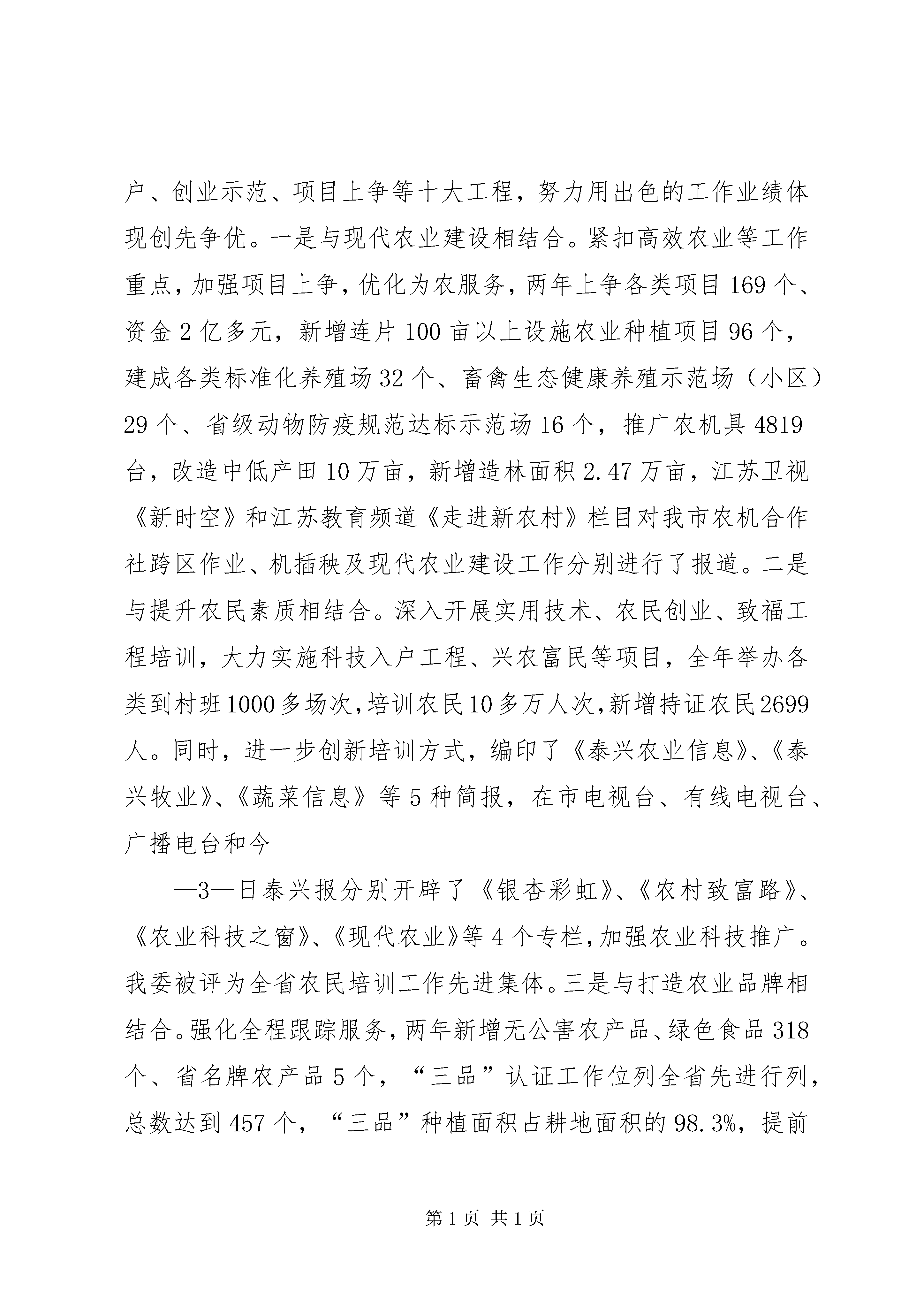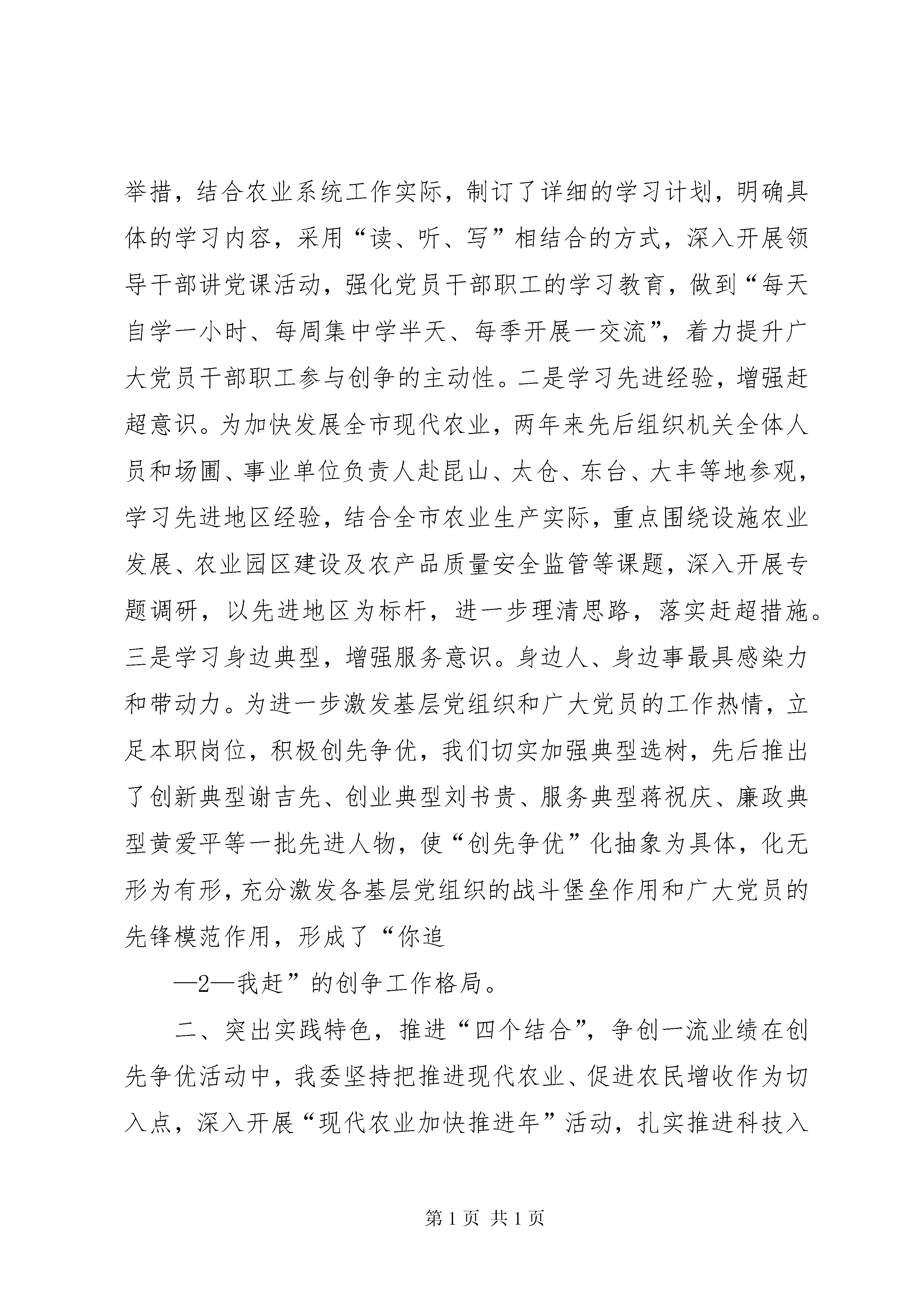 创先争优活动开展情况汇报“创先争优”活动情况汇报XX县区农业委员会自“创先争优”活动开展以来,我委严格按照市委统一部署,紧密结合部门实际,坚持以“学习实践科学发展观,实现现代农业新跨越”为主题,以“泰州争第一、全省有位置、全国有影响”为目标,创新活动载体,强化工作措施,引导和推动广大党员干部职工创先争优到田间、真情服务到地头,努力为加快全市现代农业建设、促进农民持续增收提供有力保证。2010年,我市荣获全国绿化模范市、全国粮食生产先进市称号,我委先后被评为全省农经农业系统效能建设先进单位、XX市农委系统目标管理考核优胜单位,荣获市级机关目标管理考核一等奖,农业系统党委被XX市委表彰为先进基层党组织,2011年被市委市政府表彰为“群众满意的机关”。我们的主要做法是:一、突出氛围营造,推进“四学四增”,激发创争热情活动开展以来,我们按照“五好五带头”标准,认真抓好全面动员、全面承诺,通过重温入党誓词、邀请专家举办专题报告会、外出参观考察、组织讨论交流、开展演讲比赛等一系列—1—活动,努力营造浓厚的创争氛围。一是学习理论知识,增强创争意识。把抓好党员干部职工学习作为开展好活动的重要举措,结合农业系统工作实际,制订了详细的学习计划,明确具体的学习内容,采用“读、听、写”相结合的方式,深入开展领导干部讲党课活动,强化党员干部职工的学习教育,做到“每天自学一小时、每周集中学半天、每季开展一交流”,着力提升广大党员干部职工参与创争的主动性。二是学习先进经验,增强赶超意识。为加快发展全市现代农业,两年来先后组织机关全体人员和场圃、事业单位负责人赴昆山、太仓、东台、大丰等地参观,学习先进地区经验,结合全市农业生产实际,重点围绕设施农业发展、农业园区建设及农产品质量安全监管等课题,深入开展专题调研,以先进地区为标杆,进一步理清思路,落实赶超措施。三是学习身边典型,增强服务意识。身边人、身边事最具感染力和带动力。为进一步激发基层党组织和广大党员的工作热情,立足本职岗位,积极创先争优,我们切实加强典型选树,先后推出了创新典型谢吉先、创业典型刘书贵、服务典型蒋祝庆、廉政典型黄爱平等一批先进人物,使“创先争优”化抽象为具体,化无形为有形,充分激发各基层党组织的战斗堡垒作用和广大党员的先锋模范作用,形成了“你追—2—我赶”的创争工作格局。二、突出实践特色,推进“四个结合”,争创一流业绩在创先争优活动中,我委坚持把推进现代农业、促进农民增收作为切入点,深入开展“现代农业加快推进年”活动,扎实推进科技入户、创业示范、项目上争等十大工程,努力用出色的工作业绩体现创先争优。一是与现代农业建设相结合。紧扣高效农业等工作重点,加强项目上争,优化为农服务,两年上争各类项目169个、资金2亿多元,新增连片100亩以上设施农业种植项目96个,建成各类标准化养殖场32个、畜禽生态健康养殖示范场(小区)29个、省级动物防疫规范达标示范场16个,推广农机具4819台,改造中低产田10万亩,新增造林面积2.47万亩,江苏卫视《新时空》和江苏教育频道《走进新农村》栏目对我市农机合作社跨区作业、机插秧及现代农业建设工作分别进行了报道。二是与提升农民素质相结合。深入开展实用技术、农民创业、致福工程培训,大力实施科技入户工程、兴农富民等项目,全年举办各类到村班1000多场次,培训农民10多万人次,新增持证农民2699人。同时,进一步创新培训方式,编印了《泰兴农业信息》、《泰兴牧业》、《蔬菜信息》等5种简报,在市电视台、有线电视台、广播电台和今—3—日泰兴报分别开辟了《银杏彩虹》、《农村致富路》、《农业科技之窗》、《现代农业》等4个专栏,加强农业科技推广。我委被评为全省农民培训工作先进集体。三是与打造农业品牌相结合。强化全程跟踪服务,两年新增无公害农产品、绿色食品318个、省名牌农产品5个,“三品”认证工作位列全省先进行列,总数达到457个,“三品”种植面积占耕地面积的98.3%,提前实现现代化指标。“泰兴花生果”获国家农产品地理标志登记保护,泰兴银杏荣获第四届中国国际有机食品博览会金奖,4个葡萄品种分别荣获全省优质果品评比金奖和银奖。四是与维护农民权益相结合。扎实推进农资市场、农机安全和农产品质量专项整治及农业事故调处等“三整一调”工作,着力维护广大农民合法权益。检查农资生产经营企业、规模种养基地1500多家,检验各类农机具4159台,培育“放心农资经营店”33家,查案69件、查纠农机违法违章行为3172起,调处农业生产事故70多起,为农民挽回经济损失800多万元。三、突出群众满意,推进“三联一评”,提升创争实效创争活动中,我们坚持把创先争优与履行职能紧密结合起来,贴近基层、贴近实际、强化服务,努力打造具有农业特色、赢得群众认可的优质服务品牌。一是联系农业园,服务