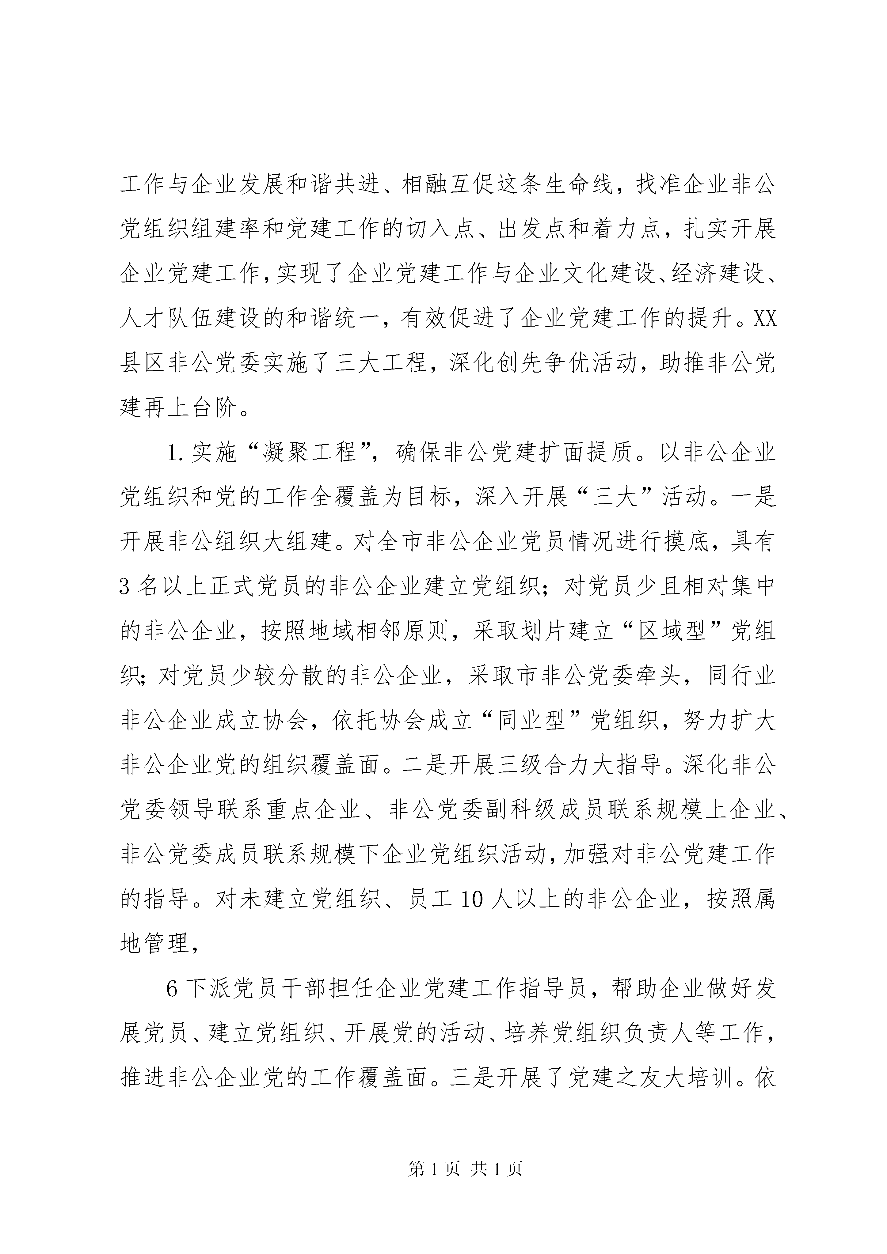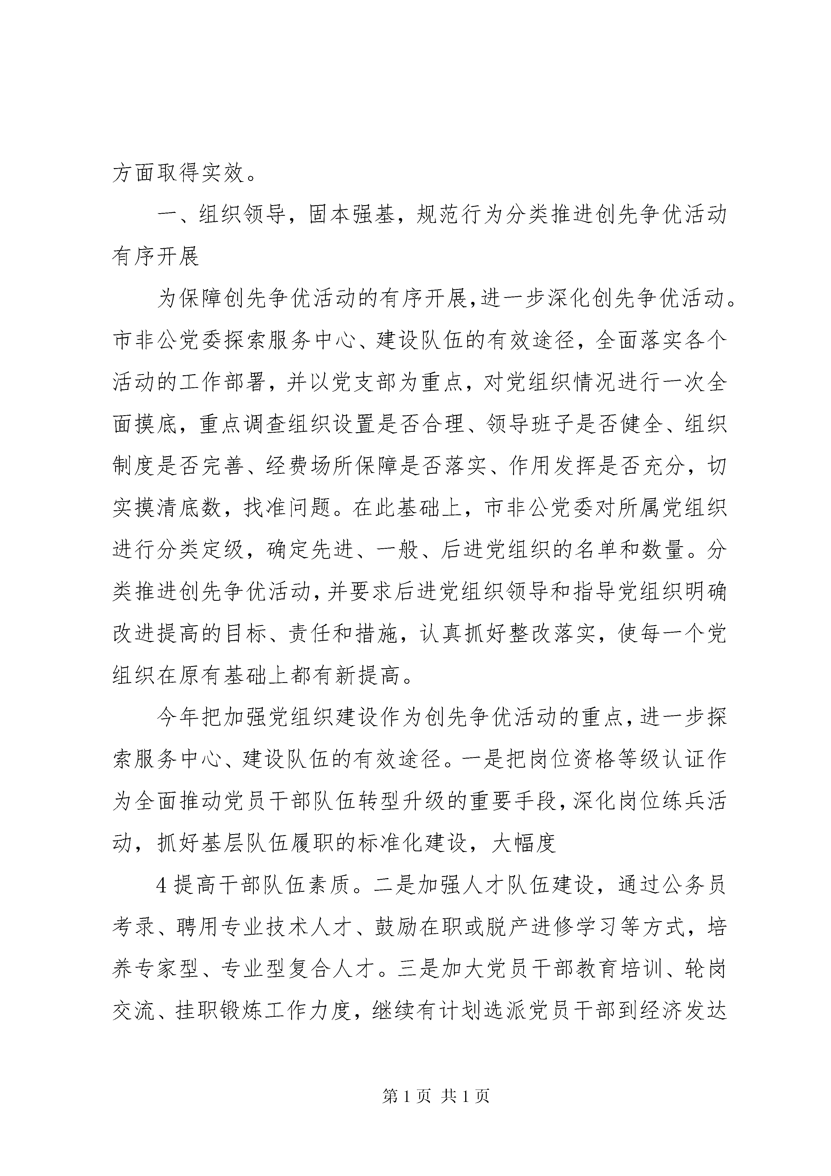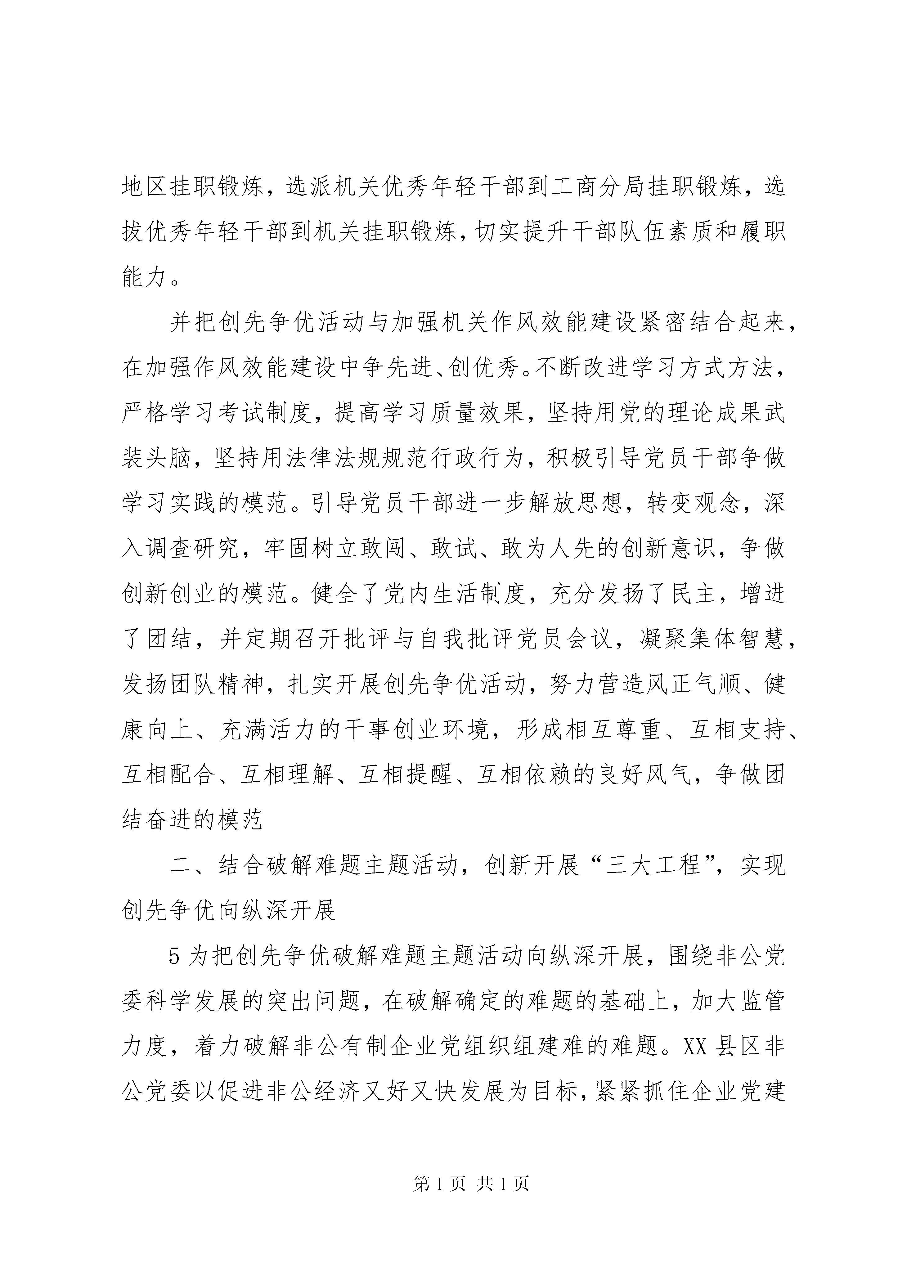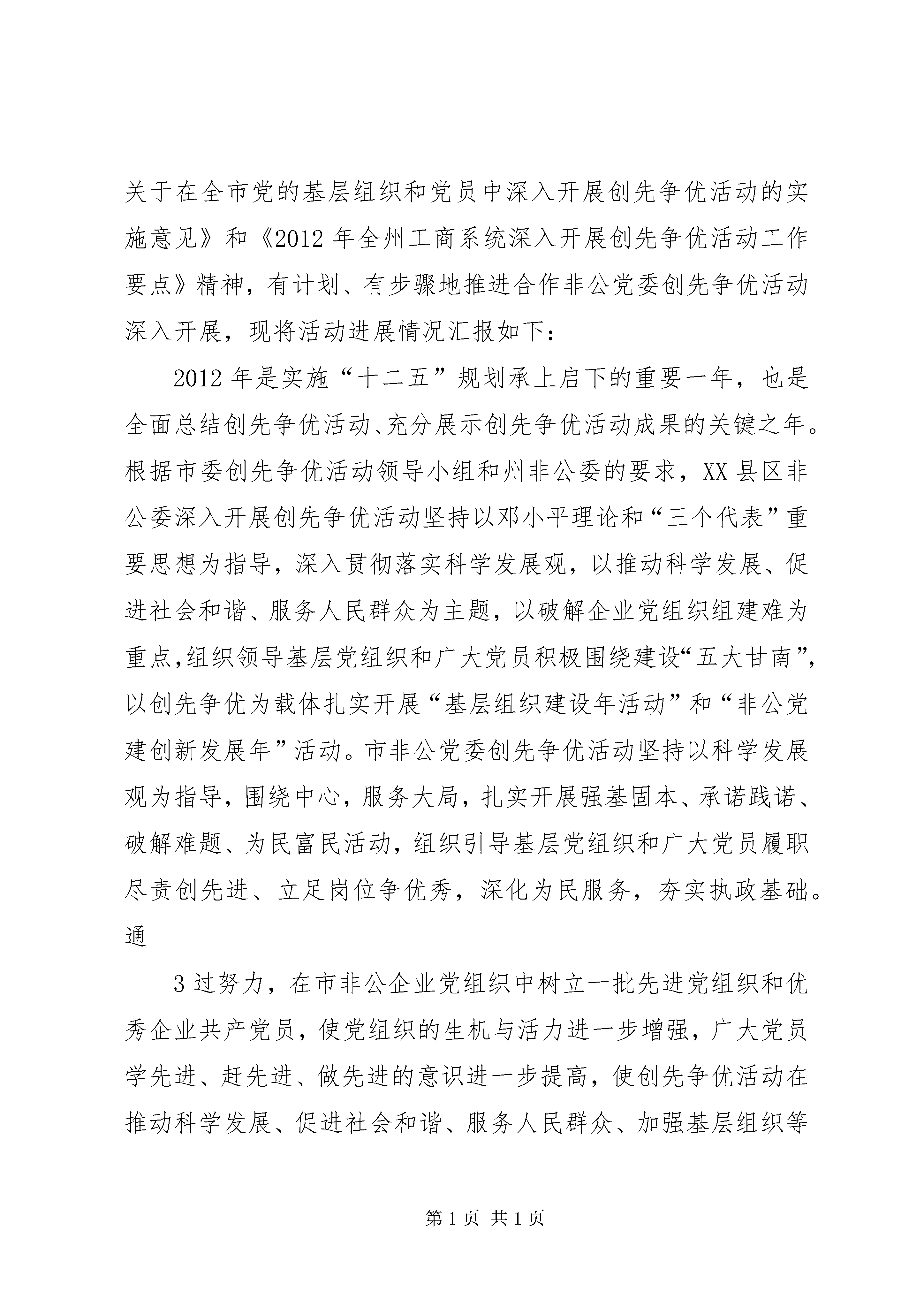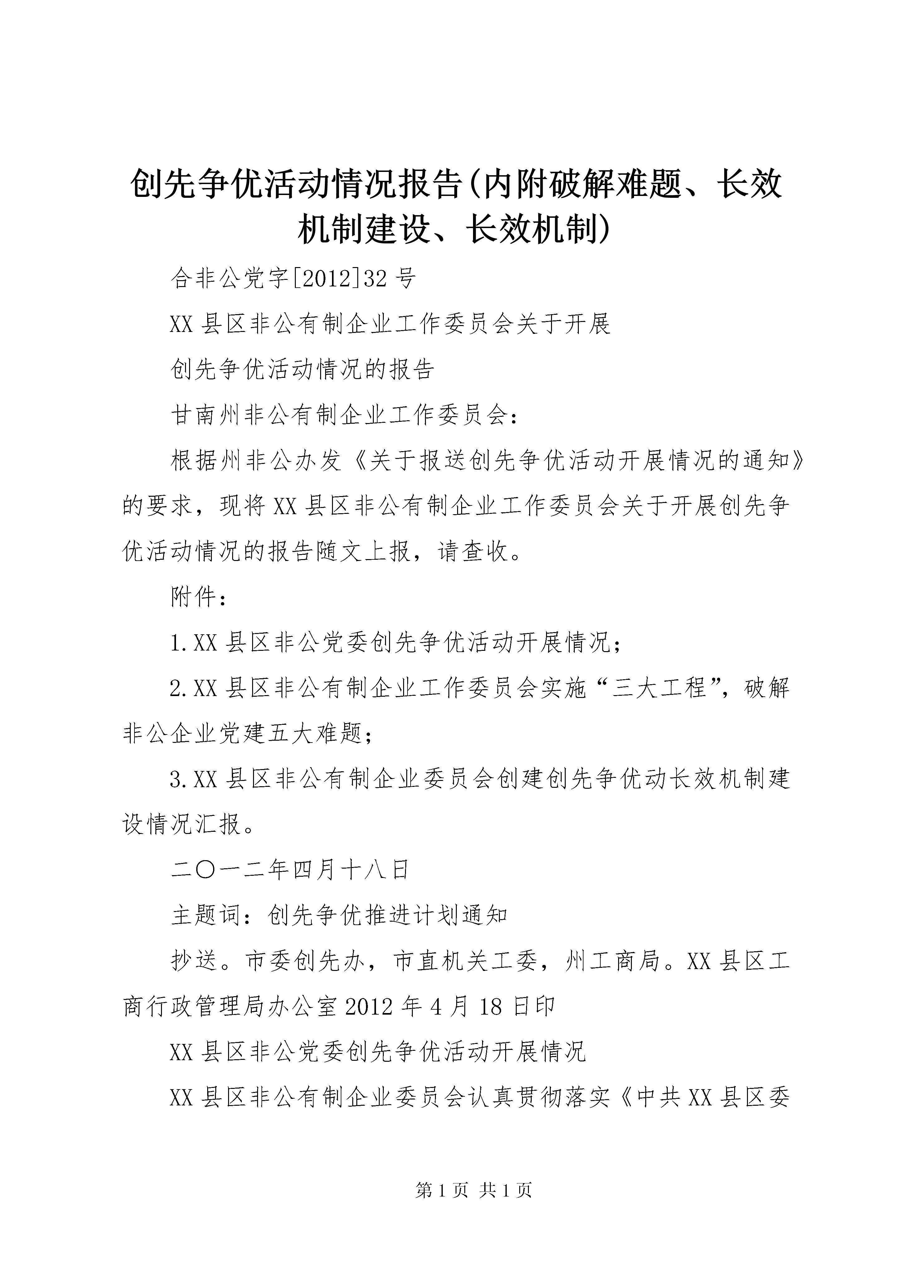 创先争优活动情况报告(内附破解难题、长效机制建设、长效机制)合非公党字[2012]32号XX县区非公有制企业工作委员会关于开展创先争优活动情况的报告甘南州非公有制企业工作委员会:根据州非公办发《关于报送创先争优活动开展情况的通知》的要求,现将XX县区非公有制企业工作委员会关于开展创先争优活动情况的报告随文上报,请查收。附件:1.XX县区非公党委创先争优活动开展情况;2.XX县区非公有制企业工作委员会实施“三大工程”,破解非公企业党建五大难题;3.XX县区非公有制企业委员会创建创先争优动长效机制建设情况汇报。二○一二年四月十八日主题词:创先争优推进计划通知抄送。市委创先办,市直机关工委,州工商局。XX县区工商行政管理局办公室2012年4月18日印XX县区非公党委创先争优活动开展情况XX县区非公有制企业委员会认真贯彻落实《中共XX县区委关于在全市党的基层组织和党员中深入开展创先争优活动的实施意见》和《2012年全州工商系统深入开展创先争优活动工作要点》精神,有计划、有步骤地推进合作非公党委创先争优活动深入开展,现将活动进展情况汇报如下:2012年是实施“十二五”规划承上启下的重要一年,也是全面总结创先争优活动、充分展示创先争优活动成果的关键之年。根据市委创先争优活动领导小组和州非公委的要求,XX县区非公委深入开展创先争优活动坚持以邓小平理论和“三个代表”重要思想为指导,深入贯彻落实科学发展观,以推动科学发展、促进社会和谐、服务人民群众为主题,以破解企业党组织组建难为重点,组织领导基层党组织和广大党员积极围绕建设“五大甘南”,以创先争优为载体扎实开展“基层组织建设年活动”和“非公党建创新发展年”活动。市非公党委创先争优活动坚持以科学发展观为指导,围绕中心,服务大局,扎实开展强基固本、承诺践诺、破解难题、为民富民活动,组织引导基层党组织和广大党员履职尽责创先进、立足岗位争优秀,深化为民服务,夯实执政基础。通3过努力,在市非公企业党组织中树立一批先进党组织和优秀企业共产党员,使党组织的生机与活力进一步增强,广大党员学先进、赶先进、做先进的意识进一步提高,使创先争优活动在推动科学发展、促进社会和谐、服务人民群众、加强基层组织等方面取得实效。一、组织领导,固本强基,规范行为分类推进创先争优活动有序开展为保障创先争优活动的有序开展,进一步深化创先争优活动。市非公党委探索服务中心、建设队伍的有效途径,全面落实各个活动的工作部署,并以党支部为重点,对党组织情况进行一次全面摸底,重点调查组织设置是否合理、领导班子是否健全、组织制度是否完善、经费场所保障是否落实、作用发挥是否充分,切实摸清底数,找准问题。在此基础上,市非公党委对所属党组织进行分类定级,确定先进、一般、后进党组织的名单和数量。分类推进创先争优活动,并要求后进党组织领导和指导党组织明确改进提高的目标、责任和措施,认真抓好整改落实,使每一个党组织在原有基础上都有新提高。今年把加强党组织建设作为创先争优活动的重点,进一步探索服务中心、建设队伍的有效途径。一是把岗位资格等级认证作为全面推动党员干部队伍转型升级的重要手段,深化岗位练兵活动,抓好基层队伍履职的标准化建设,大幅度4提高干部队伍素质。二是加强人才队伍建设,通过公务员考录、聘用专业技术人才、鼓励在职或脱产进修学习等方式,培养专家型、专业型复合人才。三是加大党员干部教育培训、轮岗交流、挂职锻炼工作力度,继续有计划选派党员干部到经济发达地区挂职锻炼,选派机关优秀年轻干部到工商分局挂职锻炼,选拔优秀年轻干部到机关挂职锻炼,切实提升干部队伍素质和履职能力。并把创先争优活动与加强机关作风效能建设紧密结合起来,在加强作风效能建设中争先进、创优秀。不断改进学习方式方法,严格学习考试制度,提高学习质量效果,坚持用党的理论成果武装头脑,坚持用法律法规规范行政行为,积极引导党员干部争做学习实践的模范。引导党员干部进一步解放思想,转变观念,深入调查研究,牢固树立敢闯、敢试、敢为人先的创新意识,争做创新创业的模范。健全了党内生活制度,充分发扬了民主,增进了团结,并定期召开批评与自我批评党员会议,凝聚集体智慧,发扬团队精神,扎实开展创先争优活动,努力营造风正气顺、健康向上、充满活力的干事创业环境,形成相互尊重、互相支持、互相配合、互相理解、互相提醒、互相依赖的良好风气,争做团结奋进的模范二、结合破解难题主题活动,创新开展“三大工程”,实现创先争优向纵深开展5为把创先争优破解难题主题活动向纵深开展,围绕非公党委科学发展的突出问题,在破解确定的难题的基础上,加大监管力度,着力破解非公有制企业党组织组建难的难题。XX县区非公党委以促进非公经济又好又快发展为目标,紧紧抓住企业党建工作与企业发展和谐共进、相融互促这条生命线,找准企业非公党组织组建