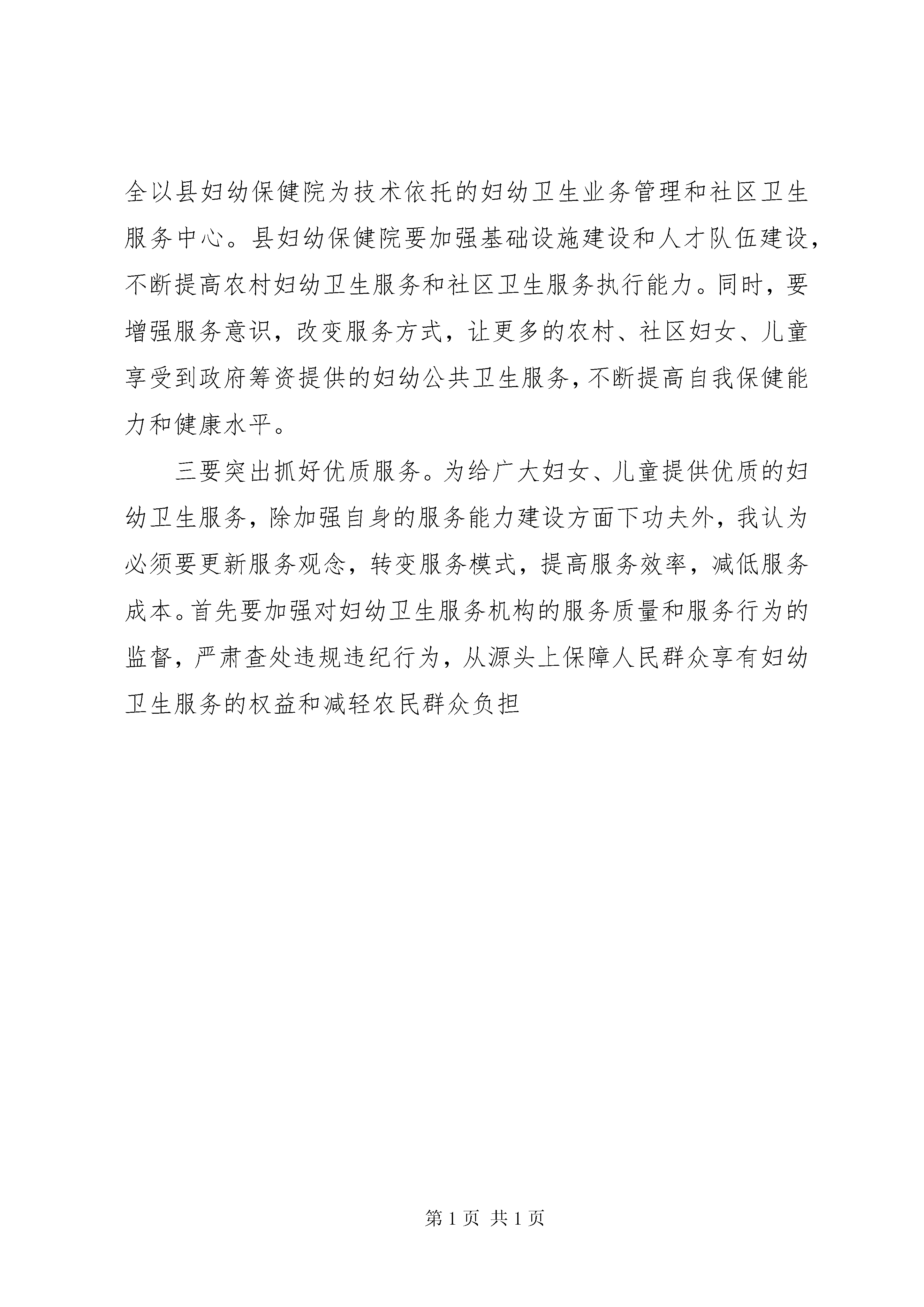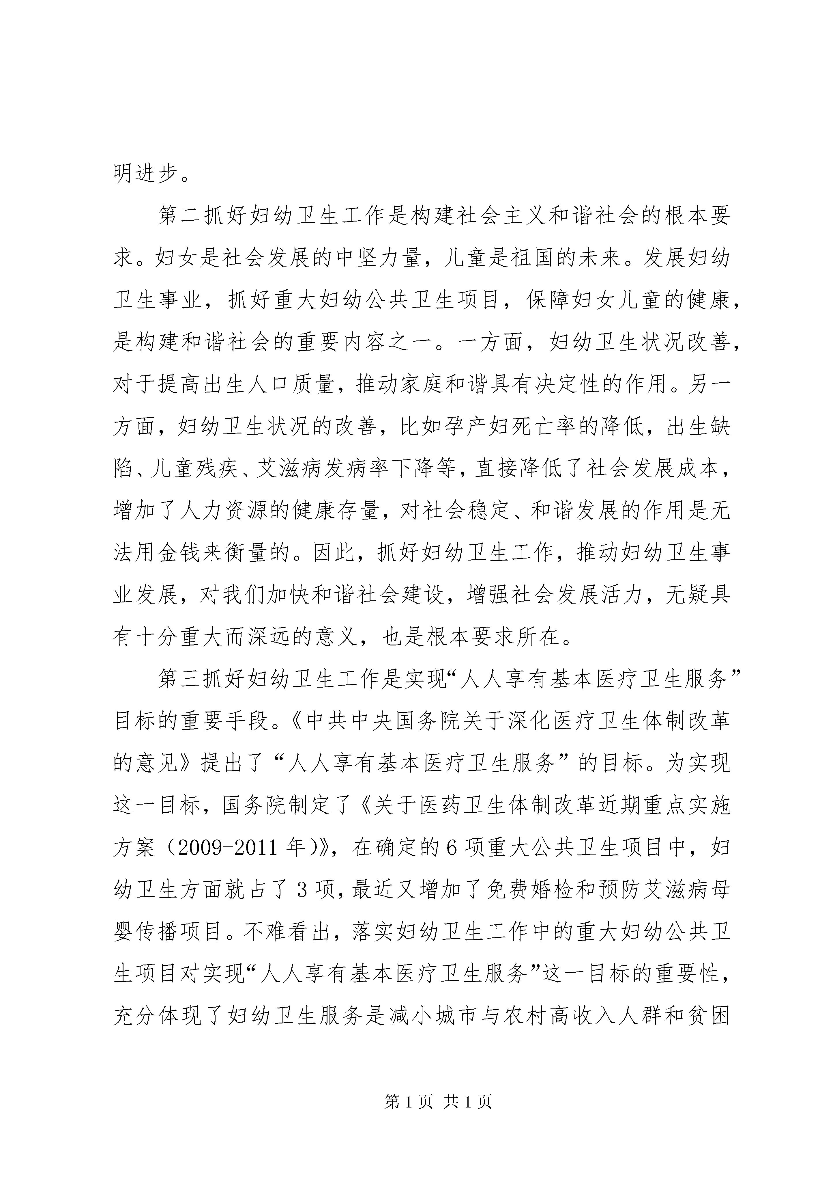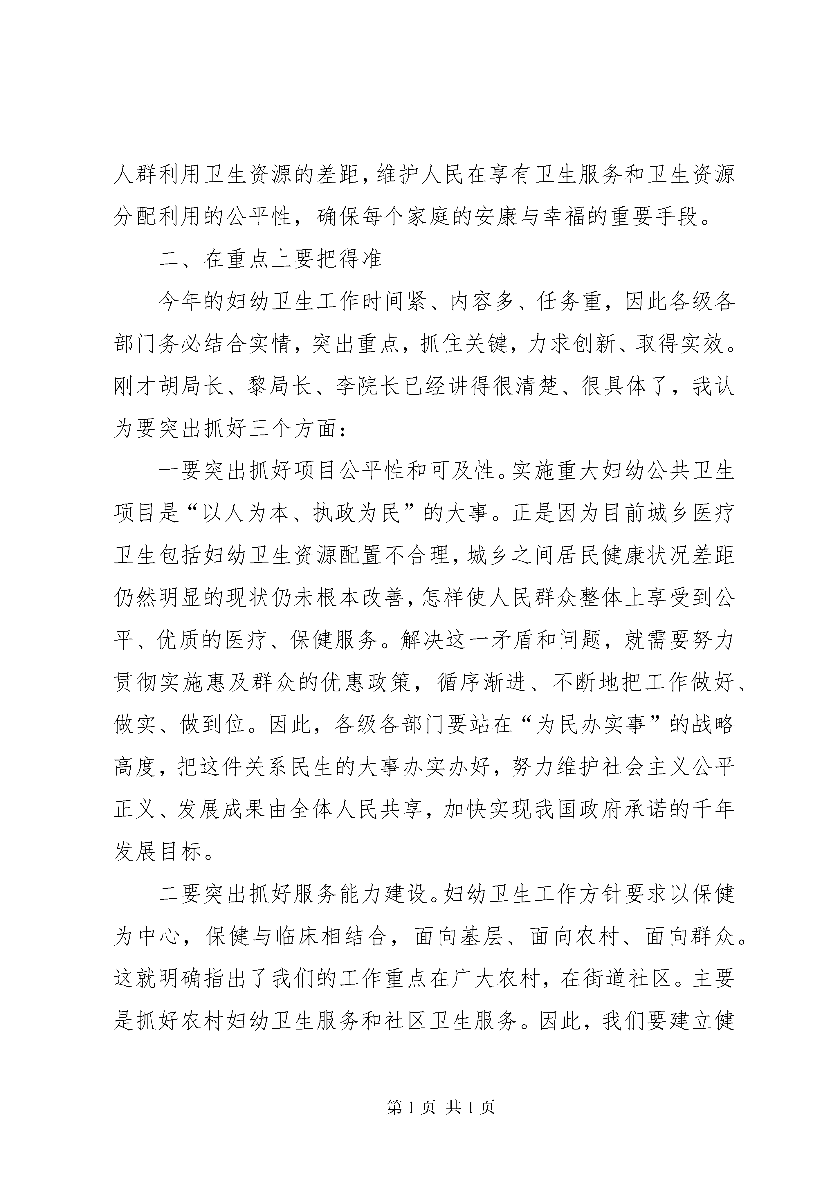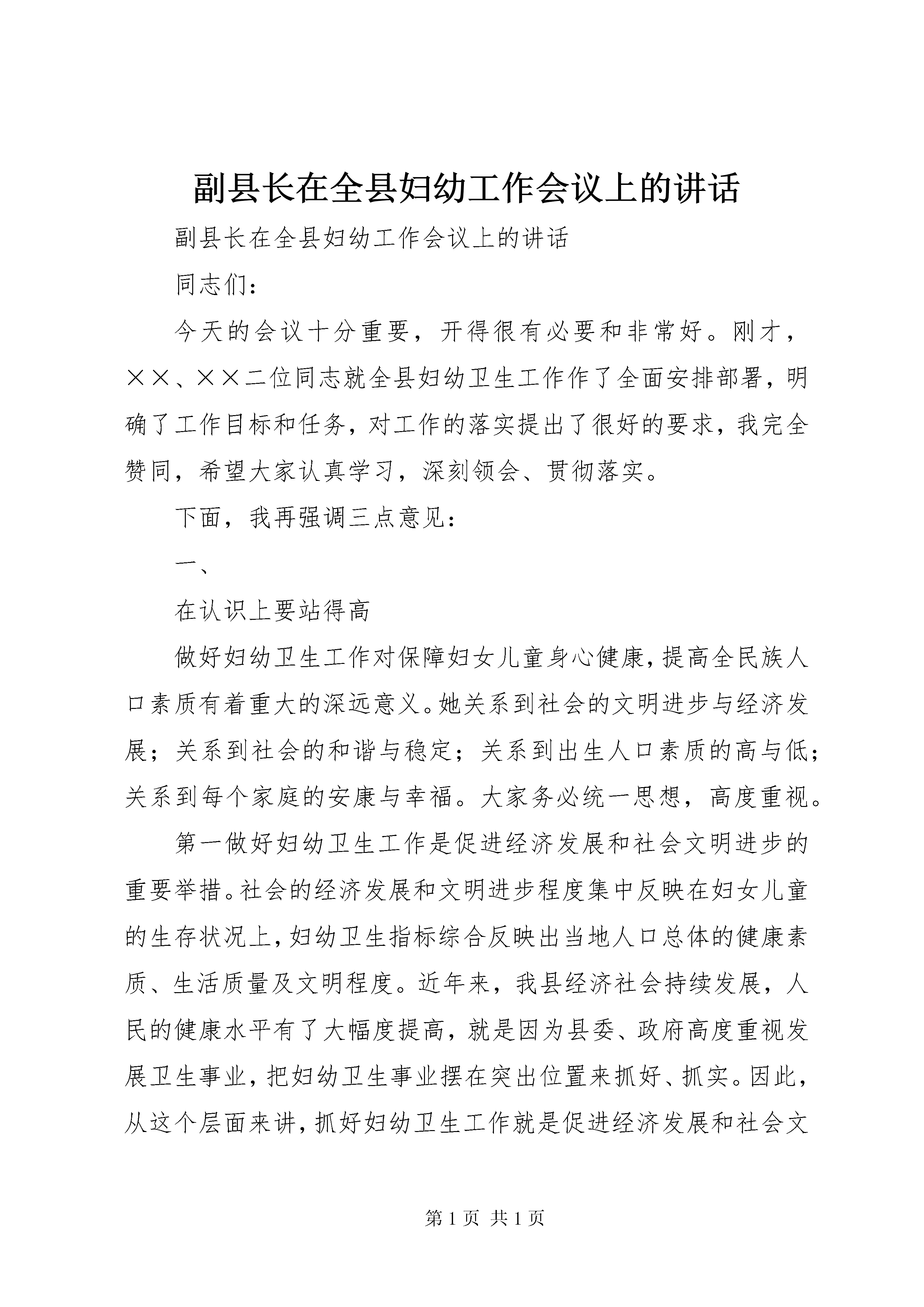 副县长在全县妇幼工作会议上的讲话副县长在全县妇幼工作会议上的讲话同志们:今天的会议十分重要,开得很有必要和非常好。刚才,××、××二位同志就全县妇幼卫生工作作了全面安排部署,明确了工作目标和任务,对工作的落实提出了很好的要求,我完全赞同,希望大家认真学习,深刻领会、贯彻落实。下面,我再强调三点意见:一、在认识上要站得高做好妇幼卫生工作对保障妇女儿童身心健康,提高全民族人口素质有着重大的深远意义。她关系到社会的文明进步与经济发展;关系到社会的和谐与稳定;关系到出生人口素质的高与低;关系到每个家庭的安康与幸福。大家务必统一思想,高度重视。第一做好妇幼卫生工作是促进经济发展和社会文明进步的重要举措。社会的经济发展和文明进步程度集中反映在妇女儿童的生存状况上,妇幼卫生指标综合反映出当地人口总体的健康素质、生活质量及文明程度。近年来,我县经济社会持续发展,人民的健康水平有了大幅度提高,就是因为县委、政府高度重视发展卫生事业,把妇幼卫生事业摆在突出位置来抓好、抓实。因此,从这个层面来讲,抓好妇幼卫生工作就是促进经济发展和社会文明进步。第二抓好妇幼卫生工作是构建社会主义和谐社会的根本要求。妇女是社会发展的中坚力量,儿童是祖国的未来。发展妇幼卫生事业,抓好重大妇幼公共卫生项目,保障妇女儿童的健康,是构建和谐社会的重要内容之一。一方面,妇幼卫生状况改善,对于提高出生人口质量,推动家庭和谐具有决定性的作用。另一方面,妇幼卫生状况的改善,比如孕产妇死亡率的降低,出生缺陷、儿童残疾、艾滋病发病率下降等,直接降低了社会发展成本,增加了人力资源的健康存量,对社会稳定、和谐发展的作用是无法用金钱来衡量的。因此,抓好妇幼卫生工作,推动妇幼卫生事业发展,对我们加快和谐社会建设,增强社会发展活力,无疑具有十分重大而深远的意义,也是根本要求所在。第三抓好妇幼卫生工作是实现“人人享有基本医疗卫生服务”目标的重要手段。《中共中央国务院关于深化医疗卫生体制改革的意见》提出了“人人享有基本医疗卫生服务”的目标。为实现这一目标,国务院制定了《关于医药卫生体制改革近期重点实施方案(2009-2011年)》,在确定的6项重大公共卫生项目中,妇幼卫生方面就占了3项,最近又增加了免费婚检和预防艾滋病母婴传播项目。不难看出,落实妇幼卫生工作中的重大妇幼公共卫生项目对实现“人人享有基本医疗卫生服务”这一目标的重要性,充分体现了妇幼卫生服务是减小城市与农村高收入人群和贫困人群利用卫生资源的差距,维护人民在享有卫生服务和卫生资源分配利用的公平性,确保每个家庭的安康与幸福的重要手段。二、在重点上要把得准今年的妇幼卫生工作时间紧、内容多、任务重,因此各级各部门务必结合实情,突出重点,抓住关键,力求创新、取得实效。刚才胡局长、黎局长、李院长已经讲得很清楚、很具体了,我认为要突出抓好三个方面:一要突出抓好项目公平性和可及性。实施重大妇幼公共卫生项目是“以人为本、执政为民”的大事。正是因为目前城乡医疗卫生包括妇幼卫生资源配置不合理,城乡之间居民健康状况差距仍然明显的现状仍未根本改善,怎样使人民群众整体上享受到公平、优质的医疗、保健服务。解决这一矛盾和问题,就需要努力贯彻实施惠及群众的优惠政策,循序渐进、不断地把工作做好、做实、做到位。因此,各级各部门要站在“为民办实事”的战略高度,把这件关系民生的大事办实办好,努力维护社会主义公平正义、发展成果由全体人民共享,加快实现我国政府承诺的千年发展目标。二要突出抓好服务能力建设。妇幼卫生工作方针要求以保健为中心,保健与临床相结合,面向基层、面向农村、面向群众。这就明确指出了我们的工作重点在广大农村,在街道社区。主要是抓好农村妇幼卫生服务和社区卫生服务。因此,我们要建立健全以县妇幼保健院为技术依托的妇幼卫生业务管理和社区卫生服务中心。县妇幼保健院要加强基础设施建设和人才队伍建设,不断提高农村妇幼卫生服务和社区卫生服务执行能力。同时,要增强服务意识,改变服务方式,让更多的农村、社区妇女、儿童享受到政府筹资提供的妇幼公共卫生服务,不断提高自我保健能力和健康水平。三要突出抓好优质服务。为给广大妇女、儿童提供优质的妇幼卫生服务,除加强自身的服务能力建设方面下功夫外,我认为必须要更新服务观念,转变服务模式,提高服务效率,减低服务成本。首先要加强对妇幼卫生服务机构的服务质量和服务行为的监督,严肃查处违规违纪行为,从源头上保障人民群众享有妇幼卫生服务的权益和减轻农民群众负担